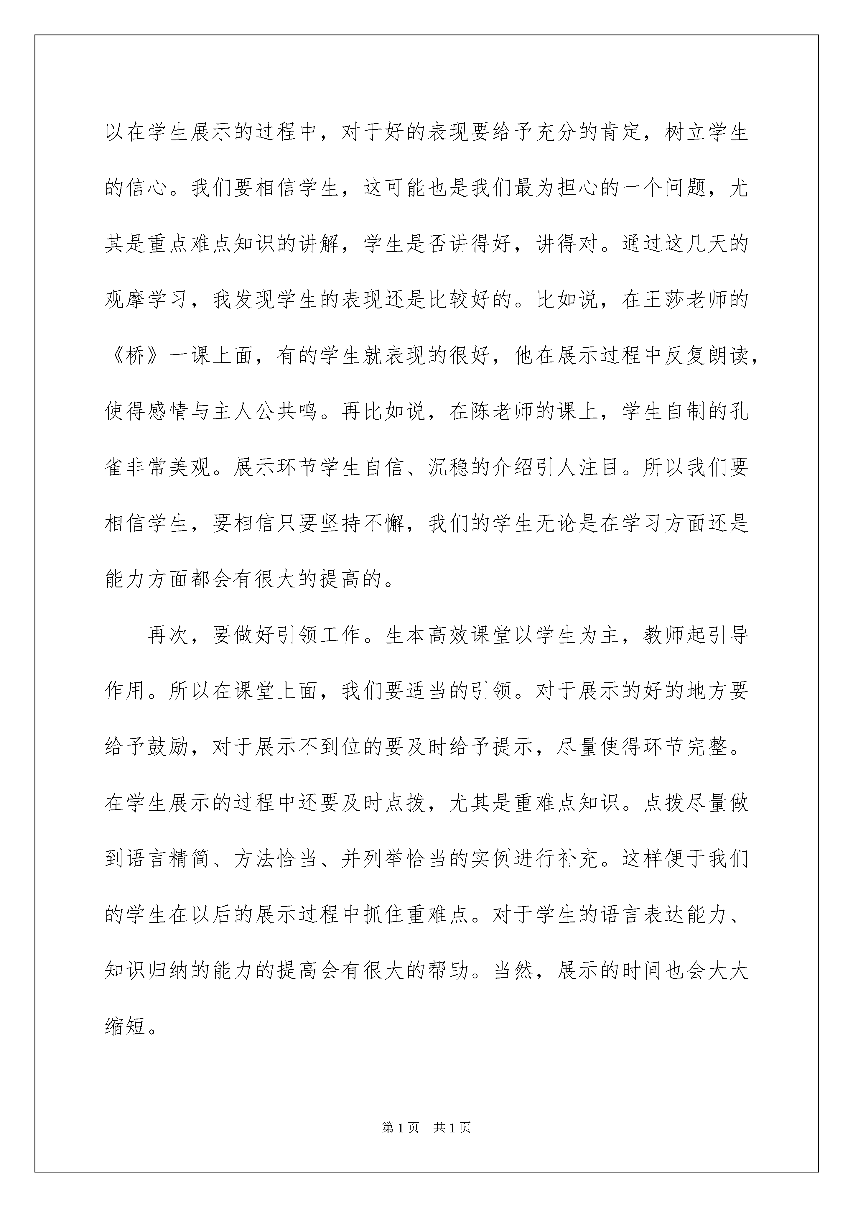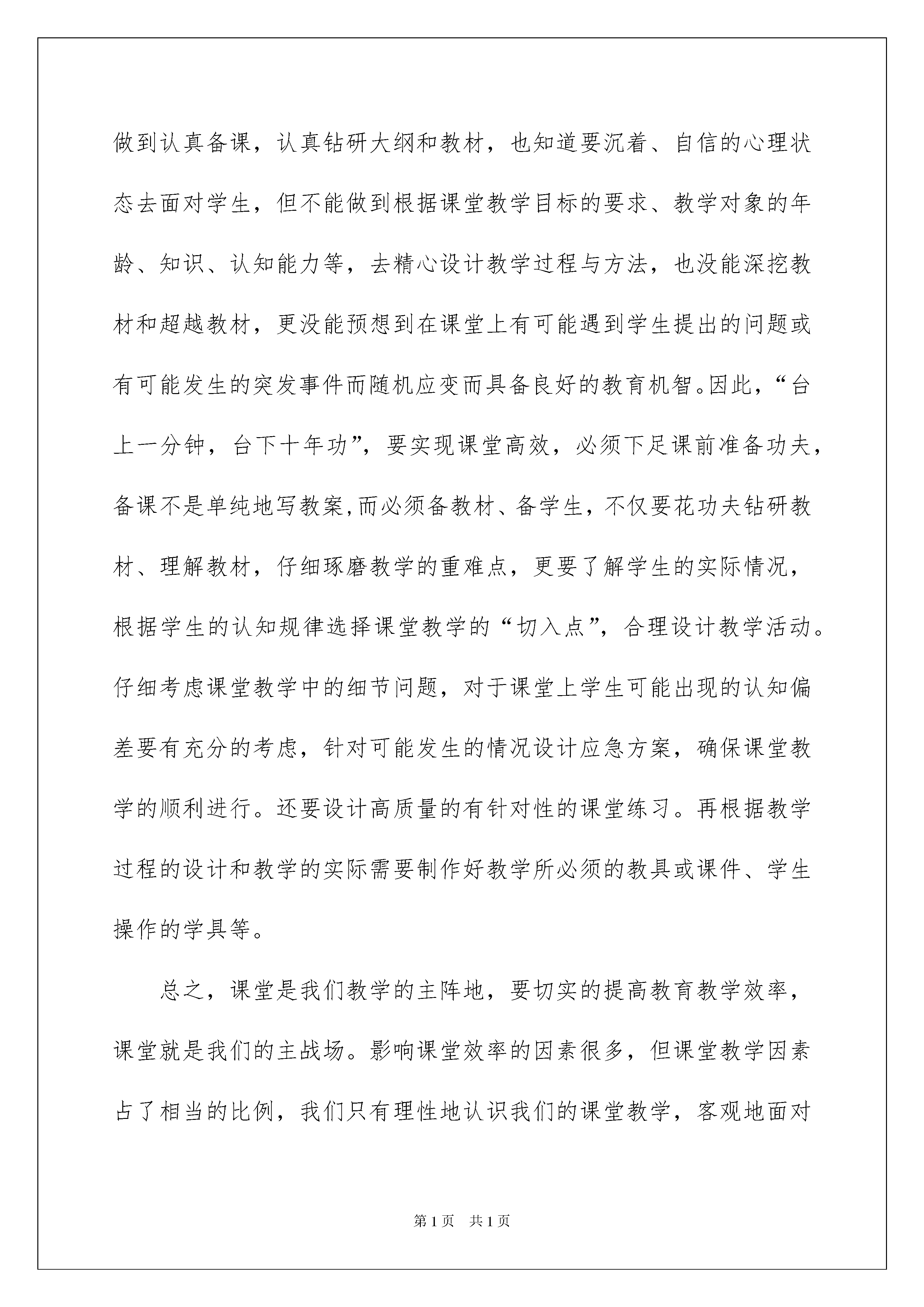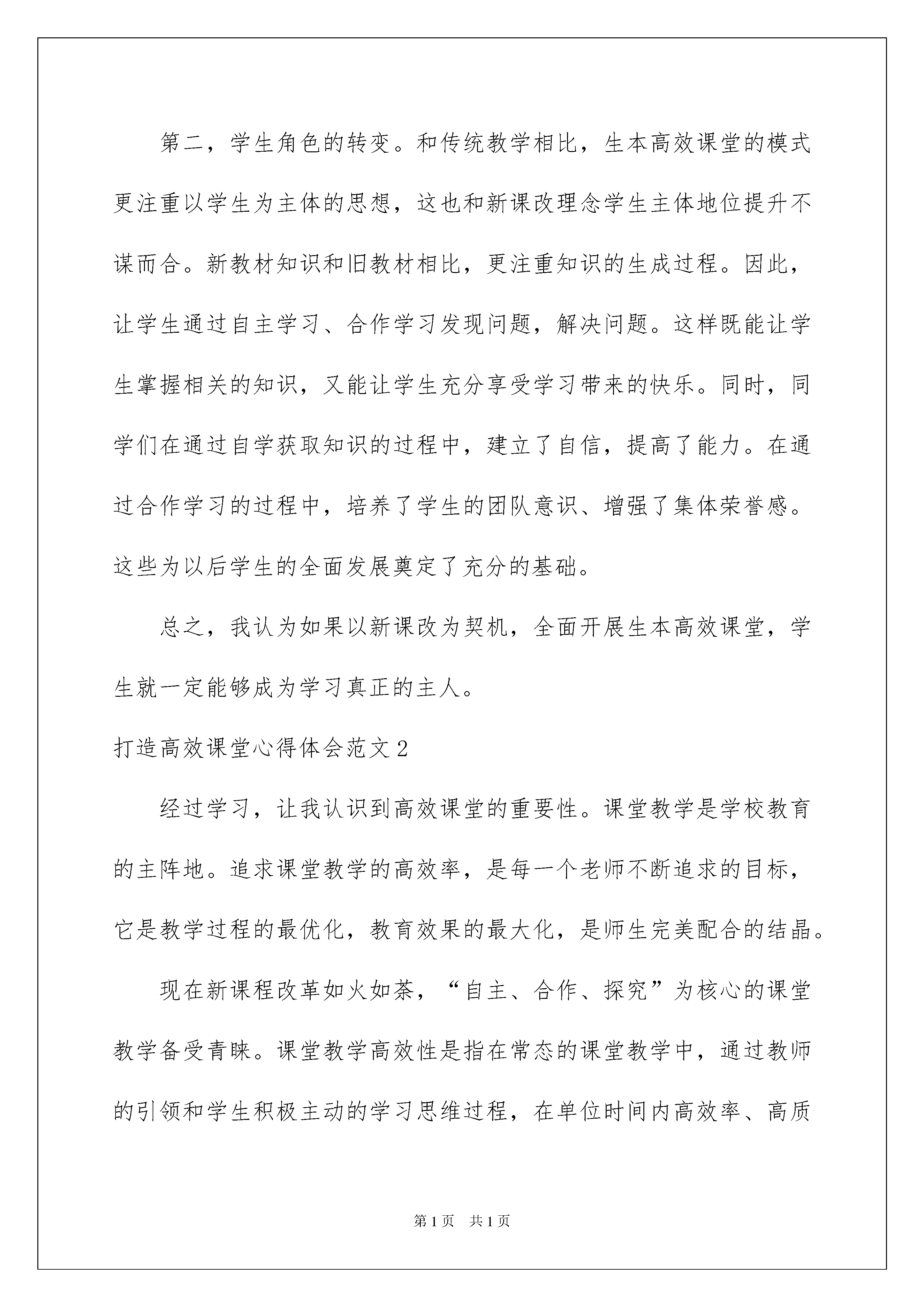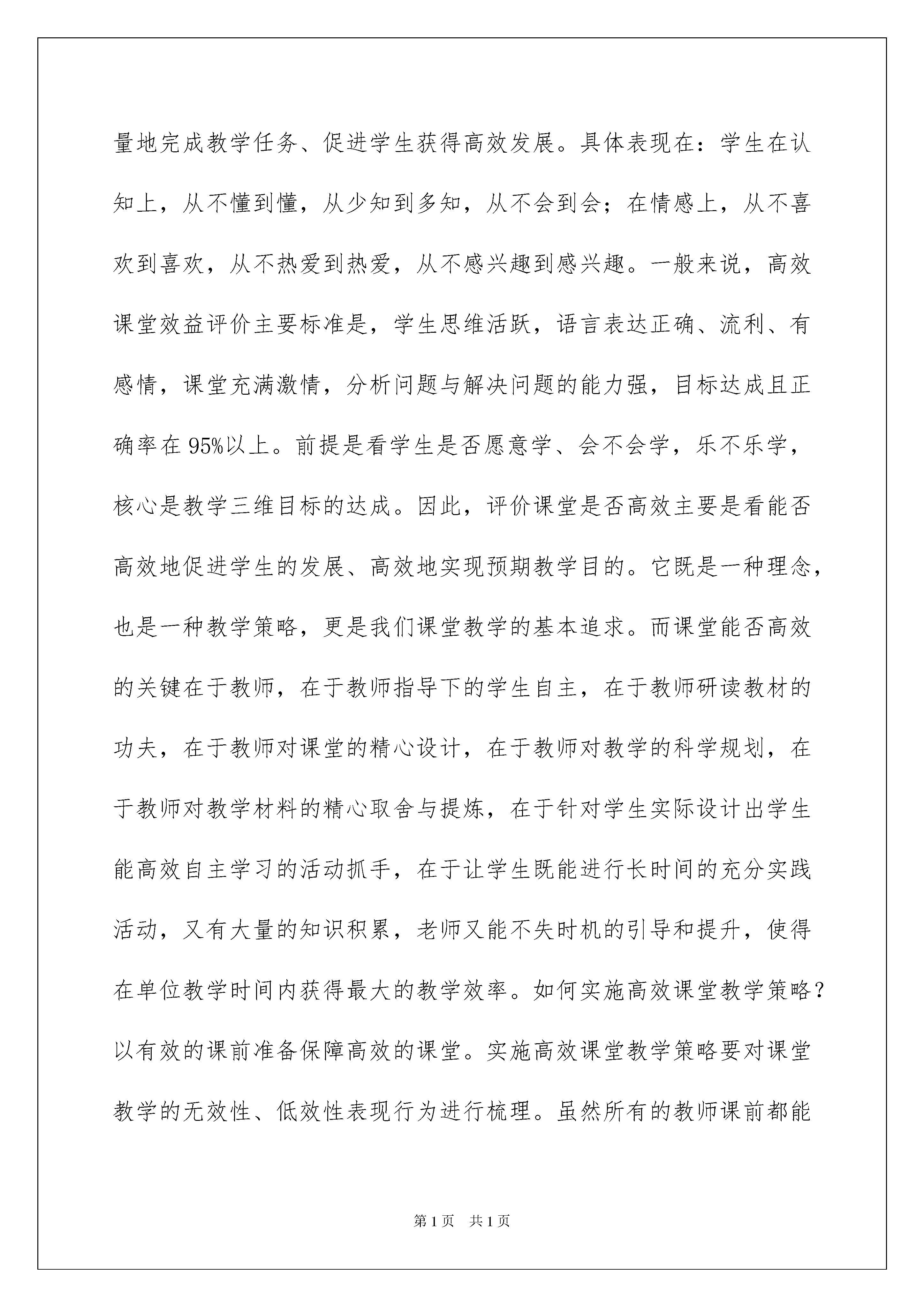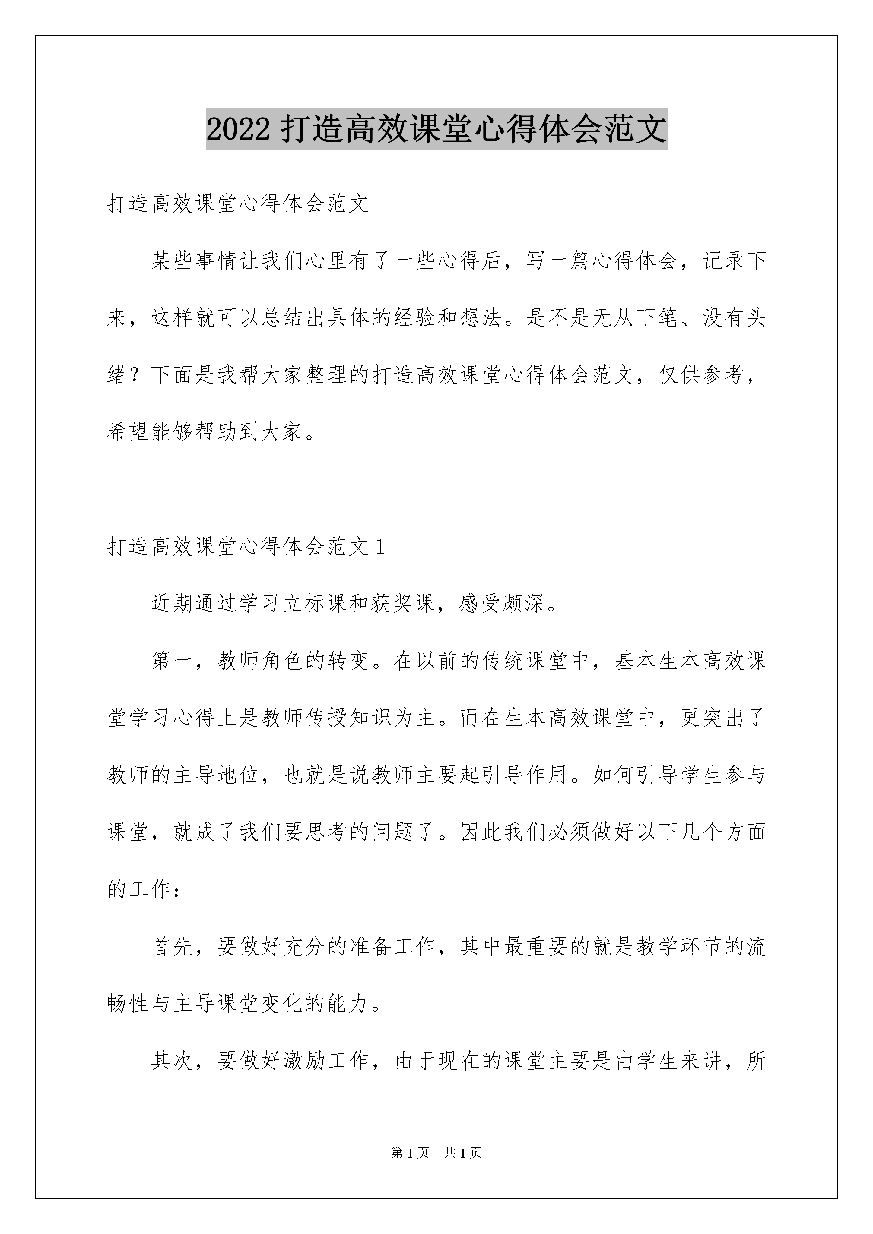 2022打造高效课堂心得体会范文打造高效课堂心得体会范文某些事情让我们心里有了一些心得后,写一篇心得体会,记录下来,这样就可以总结出具体的经验和想法。是不是无从下笔、没有头绪?下面是我帮大家整理的打造高效课堂心得体会范文,仅供参考,希望能够帮助到大家。打造高效课堂心得体会范文1近期通过学习立标课和获奖课,感受颇深。第一,教师角色的转变。在以前的传统课堂中,基本生本高效课堂学习心得上是教师传授知识为主。而在生本高效课堂中,更突出了教师的主导地位,也就是说教师主要起引导作用。如何引导学生参与课堂,就成了我们要思考的问题了。因此我们必须做好以下几个方面的工作:首先,要做好充分的准备工作,其中最重要的就是教学环节的流畅性与主导课堂变化的能力。其次,要做好激励工作,由于现在的课堂主要是由学生来讲,所以在学生展示的过程中,对于好的表现要给予充分的肯定,树立学生的信心。我们要相信学生,这可能也是我们最为担心的一个问题,尤其是重点难点知识的讲解,学生是否讲得好,讲得对。通过这几天的观摩学习,我发现学生的表现还是比较好的。比如说,在王莎老师的《桥》一课上面,有的学生就表现的很好,他在展示过程中反复朗读,使得感情与主人公共鸣。再比如说,在陈老师的课上,学生自制的孔雀非常美观。展示环节学生自信、沉稳的介绍引人注目。所以我们要相信学生,要相信只要坚持不懈,我们的学生无论是在学习方面还是能力方面都会有很大的提高的。再次,要做好引领工作。生本高效课堂以学生为主,教师起引导作用。所以在课堂上面,我们要适当的引领。对于展示的好的地方要给予鼓励,对于展示不到位的要及时给予提示,尽量使得环节完整。在学生展示的过程中还要及时点拨,尤其是重难点知识。点拨尽量做到语言精简、方法恰当、并列举恰当的实例进行补充。这样便于我们的学生在以后的展示过程中抓住重难点。对于学生的语言表达能力、知识归纳的能力的提高会有很大的帮助。当然,展示的时间也会大大缩短。第二,学生角色的转变。和传统教学相比,生本高效课堂的模式更注重以学生为主体的思想,这也和新课改理念学生主体地位提升不谋而合。新教材知识和旧教材相比,更注重知识的生成过程。因此,让学生通过自主学习、合作学习发现问题,解决问题。这样既能让学生掌握相关的知识,又能让学生充分享受学习带来的快乐。同时,同学们在通过自学获取知识的过程中,建立了自信,提高了能力。在通过合作学习的过程中,培养了学生的团队意识、增强了集体荣誉感。这些为以后学生的全面发展奠定了充分的基础。总之,我认为如果以新课改为契机,全面开展生本高效课堂,学生就一定能够成为学习真正的主人。打造高效课堂心得体会范文2经过学习,让我认识到高效课堂的重要性。课堂教学是学校教育的主阵地。追求课堂教学的高效率,是每一个老师不断追求的目标,它是教学过程的最优化,教育效果的最大化,是师生完美配合的结晶。现在新课程改革如火如荼,“自主、合作、探究”为核心的课堂教学备受青睐。课堂教学高效性是指在常态的课堂教学中,通过教师的引领和学生积极主动的学习思维过程,在单位时间内高效率、高质量地完成教学任务、促进学生获得高效发展。具体表现在:学生在认知上,从不懂到懂,从少知到多知,从不会到会;在情感上,从不喜欢到喜欢,从不热爱到热爱,从不感兴趣到感兴趣。一般来说,高效课堂效益评价主要标准是,学生思维活跃,语言表达正确、流利、有感情,课堂充满激情,分析问题与解决问题的能力强,目标达成且正确率在95%以上。前提是看学生是否愿意学、会不会学,乐不乐学,核心是教学三维目标的达成。因此,评价课堂是否高效主要是看能否高效地促进学生的发展、高效地实现预期教学目的。它既是一种理念,也是一种教学策略,更是我们课堂教学的基本追求。而课堂能否高效的关键在于教师,在于教师指导下的学生自主,在于教师研读教材的功夫,在于教师对课堂的精心设计,在于教师对教学的科学规划,在于教师对教学材料的精心取舍与提炼,在于针对学生实际设计出学生能高效自主学习的活动抓手,在于让学生既能进行长时间的充分实践活动,又有大量的知识积累,老师又能不失时机的引导和提升,使得在单位教学时间内获得最大的教学效率。如何实施高效课堂教学策略?以有效的课前准备保障高效的课堂。实施高效课堂教学策略要对课堂教学的无效性、低效性表现行为进行梳理。虽然所有的教师课前都能做到认真备课,认真钻研大纲和教材,也知道要沉着、自信的心理状态去面对学生,但不能做到根据课堂教学目标的要求、教学对象的年龄、知识、认知能力等,去精心设计教学过程与方法,也没能深挖教材和超越教材,更没能预想到在课堂上有可能遇到学生提出的问题或有可能发生的突发事件