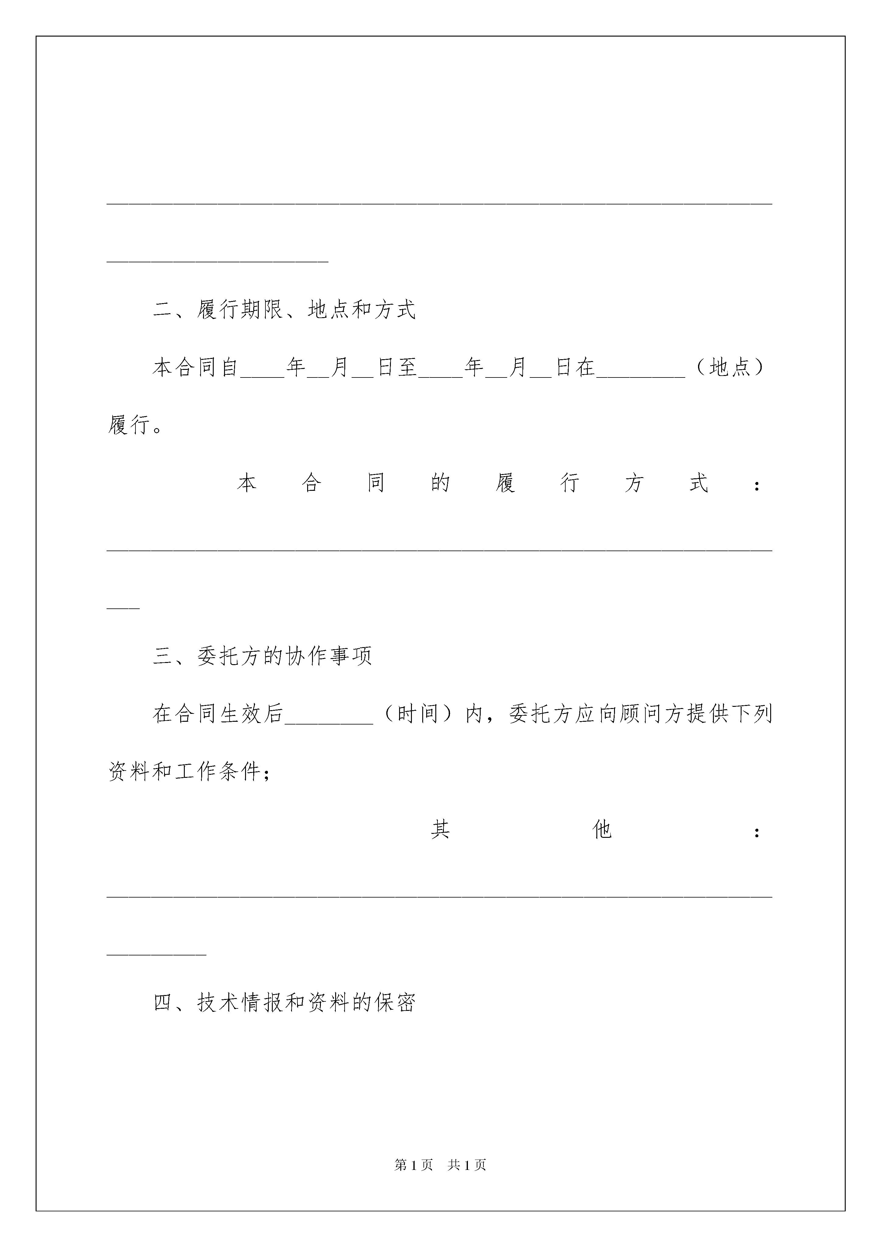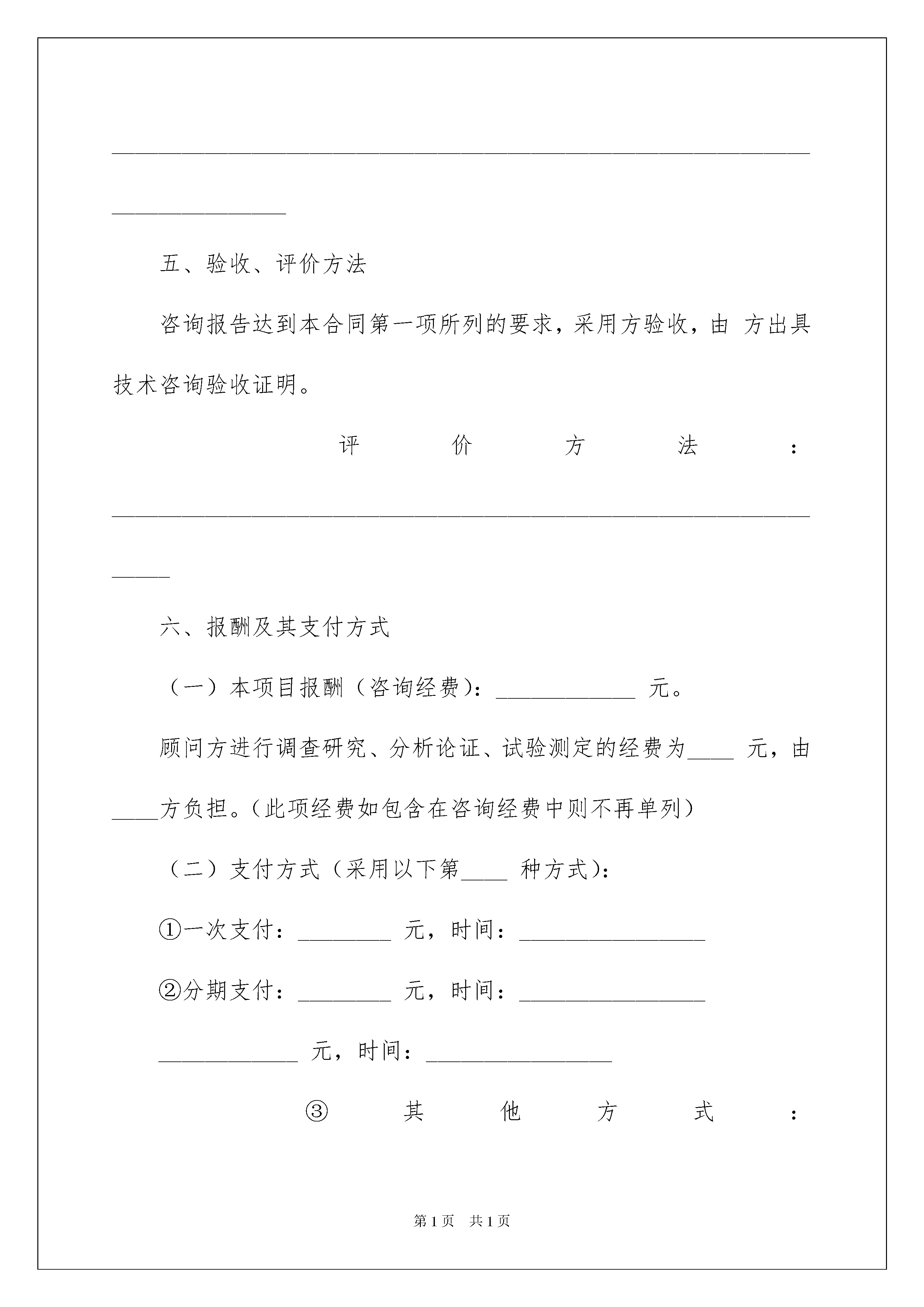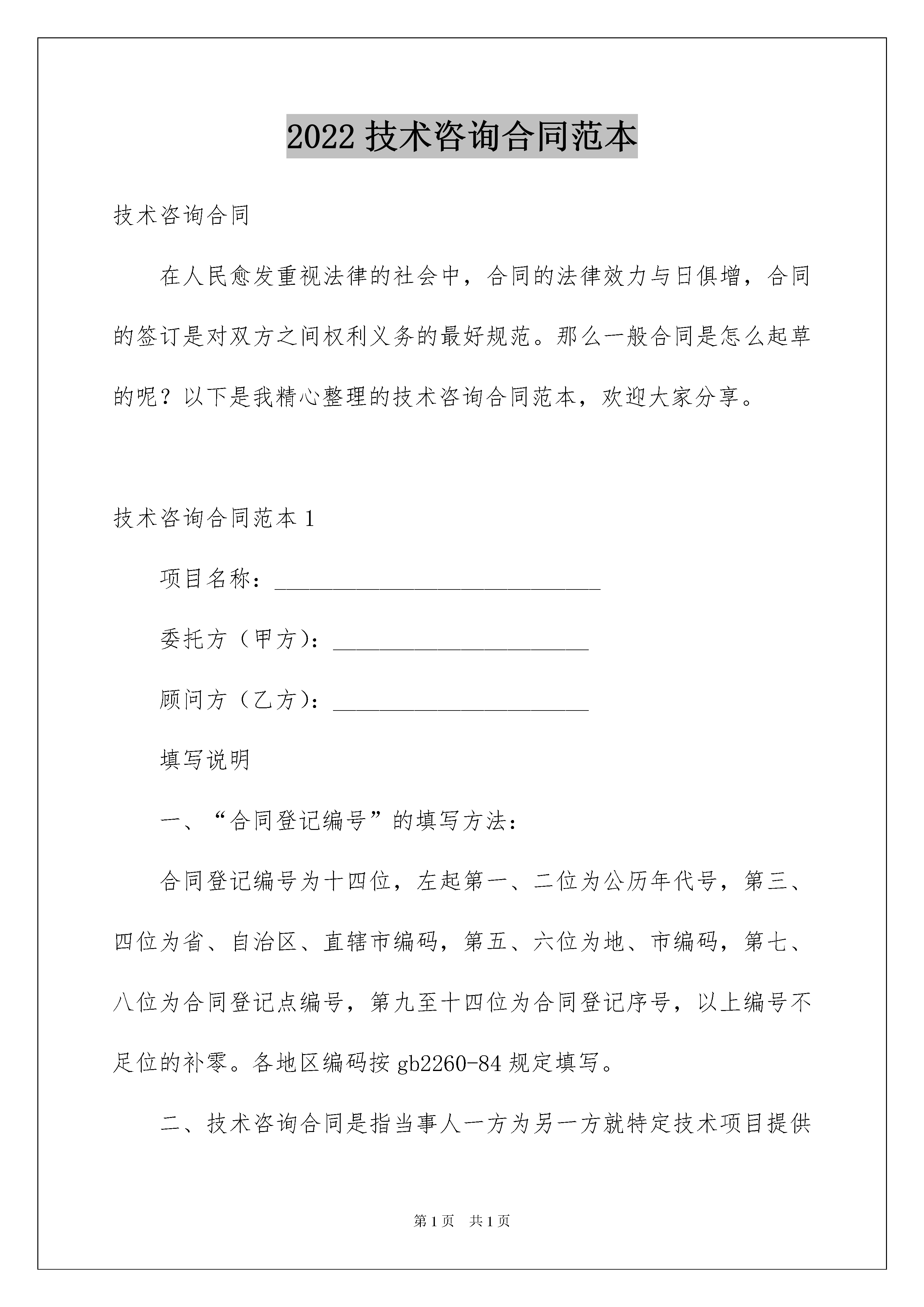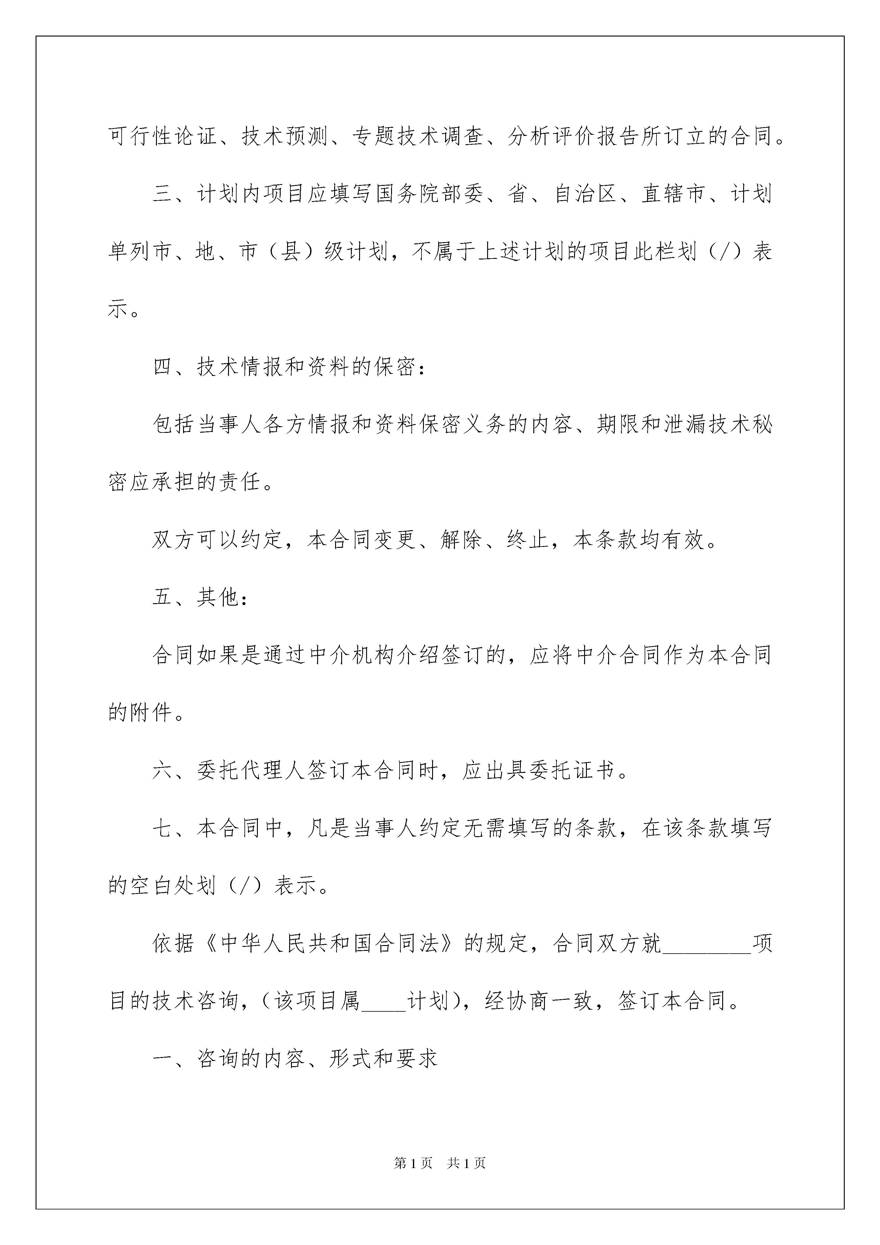 2022技术咨询合同范本技术咨询合同在人民愈发重视法律的社会中,合同的法律效力与日俱增,合同的签订是对双方之间权利义务的最好规范。那么一般合同是怎么起草的呢?以下是我精心整理的技术咨询合同范本,欢迎大家分享。技术咨询合同范本1项目名称:____________________________委托方(甲方):______________________顾问方(乙方):______________________填写说明一、“合同登记编号”的填写方法:合同登记编号为十四位,左起第一、二位为公历年代号,第三、四位为省、自治区、直辖市编码,第五、六位为地、市编码,第七、八位为合同登记点编号,第九至十四位为合同登记序号,以上编号不足位的补零。各地区编码按gb2260-84规定填写。二、技术咨询合同是指当事人一方为另一方就特定技术项目提供可行性论证、技术预测、专题技术调查、分析评价报告所订立的合同。三、计划内项目应填写国务院部委、省、自治区、直辖市、计划单列市、地、市(县)级计划,不属于上述计划的项目此栏划(/)表示。四、技术情报和资料的保密:包括当事人各方情报和资料保密义务的内容、期限和泄漏技术秘密应承担的责任。双方可以约定,本合同变更、解除、终止,本条款均有效。五、其他:合同如果是通过中介机构介绍签订的,应将中介合同作为本合同的附件。六、委托代理人签订本合同时,应出具委托证书。七、本合同中,凡是当事人约定无需填写的条款,在该条款填写的空白处划(/)表示。依据《中华人民共和国合同法》的规定,合同双方就________项目的技术咨询,(该项目属____计划),经协商一致,签订本合同。一、咨询的内容、形式和要求________________________________________________________________________________二、履行期限、地点和方式本合同自____年__月__日至____年__月__日在________(地点)履行。本合同的履行方式:_______________________________________________________________三、委托方的协作事项在合同生效后________(时间)内,委托方应向顾问方提供下列资料和工作条件;其他:_____________________________________________________________________四、技术情报和资料的保密___________________________________________________________________________五、验收、评价方法咨询报告达到本合同第一项所列的要求,采用方验收,由方出具技术咨询验收证明。评价方法:_________________________________________________________________六、报酬及其支付方式(一)本项目报酬(咨询经费):____________元。顾问方进行调查研究、分析论证、试验测定的经费为____元,由____方负担。(此项经费如包含在咨询经费中则不再单列)(二)支付方式(采用以下第____种方式):①一次支付:________元,时间:________________②分期支付:________元,时间:____________________________元,时间:________________③其他方式:________________________________________________________________七、违约金或者损失赔偿额的计算法违反本合同约定,违约方应当按_________________________________规定,承担违约责任。(一)违反本合同第____条约定,____方应当承担违约责任,承担方式和违约金额如下:(二)违反本合同第____条约定,____方应当承担违约责任,承担方式违约金额如下:(三)_______________________________________________________________________八、争议的解决办法在合同履行过程中发生争议,双方应当协商解决,也可以请求________进行调解。双方不愿协商、调解解决或者协商、调解不成的,双方商定,采用以下第()种方式解决。1.由仲裁委员会仲裁;2.向人民法院起诉。九、其他(含中介方权利、义务、服务费及其支付方式等上述条款未尽事宜):__________