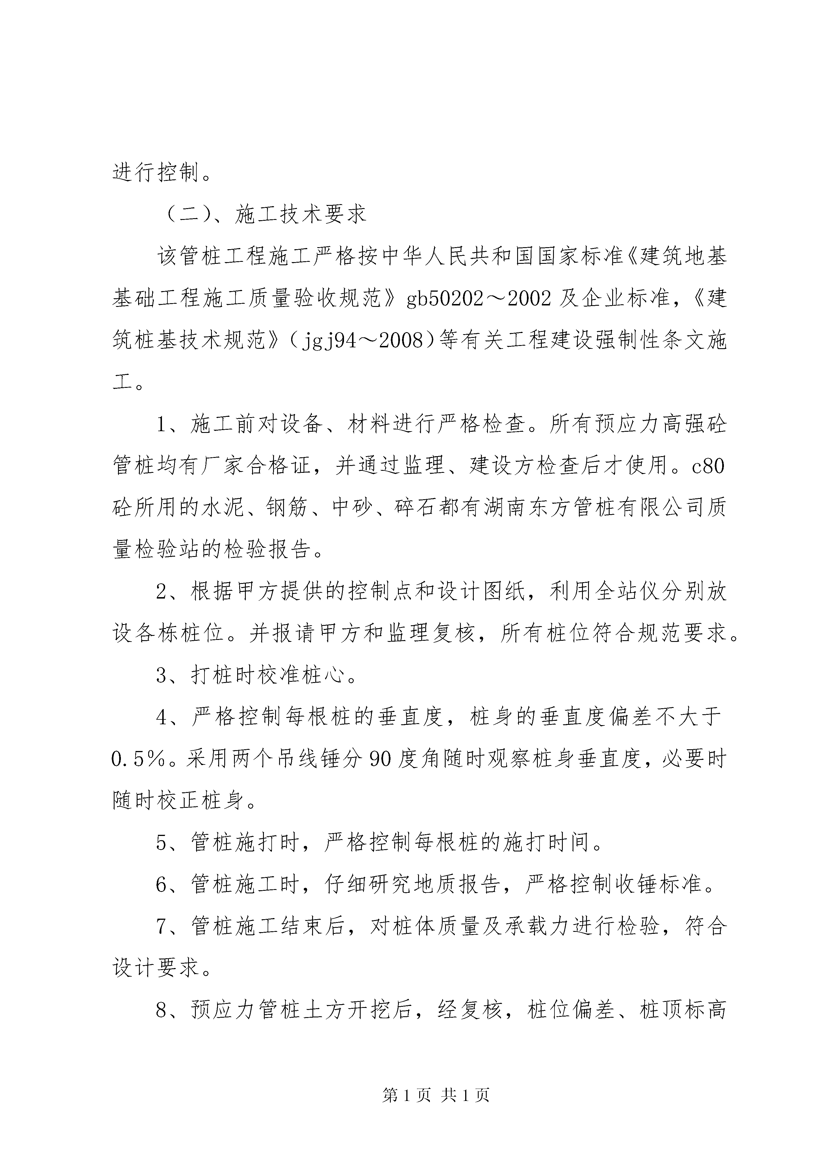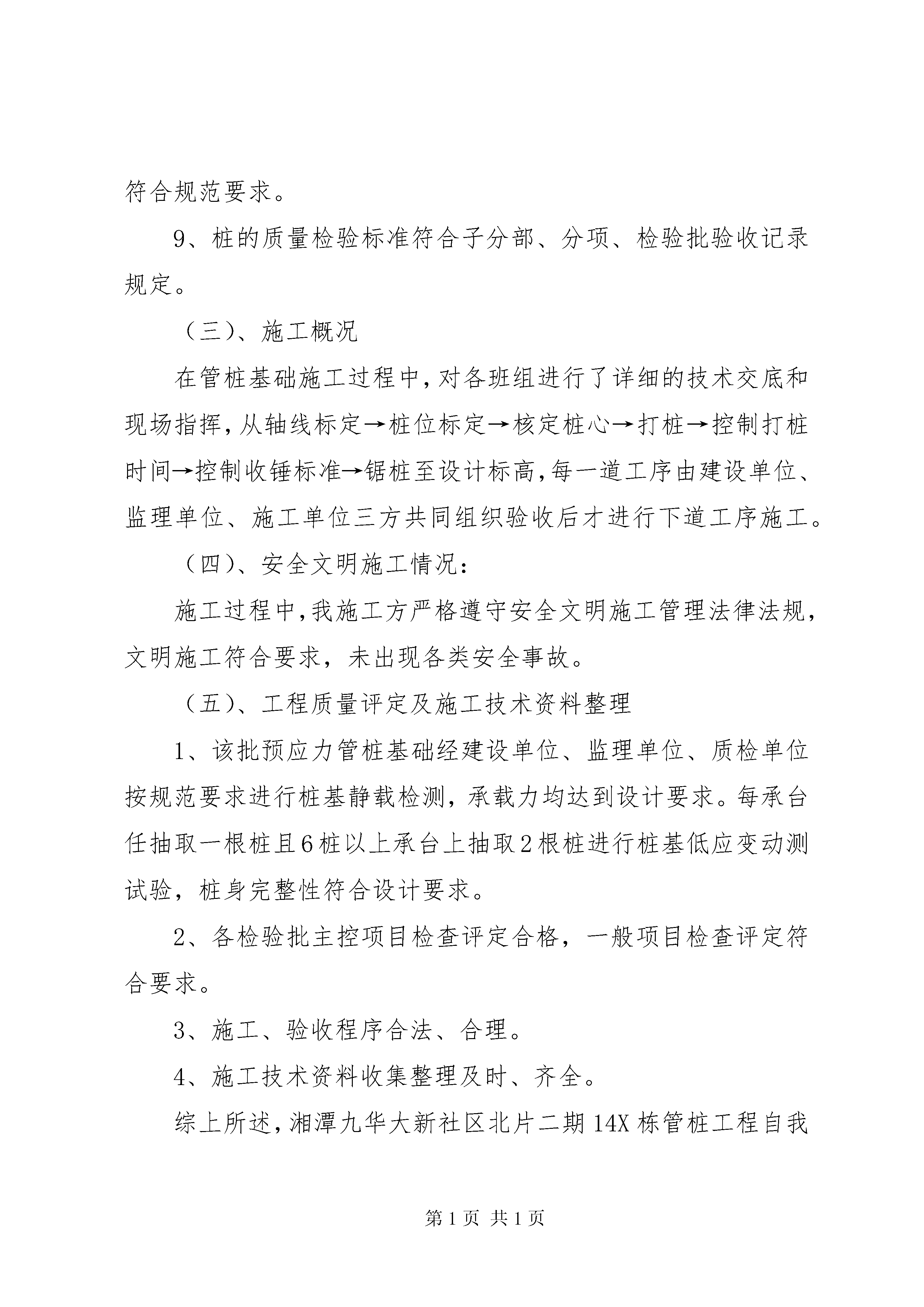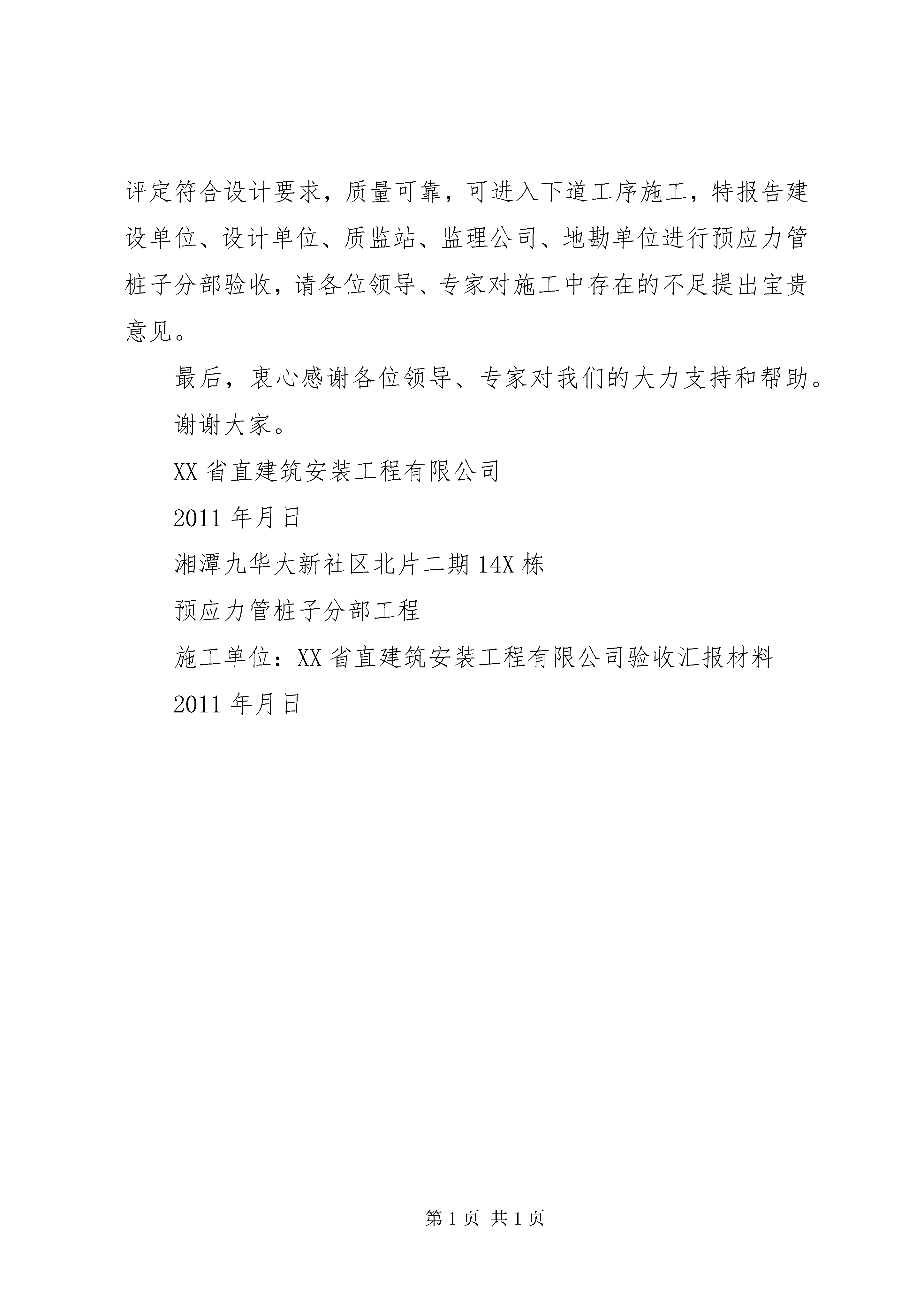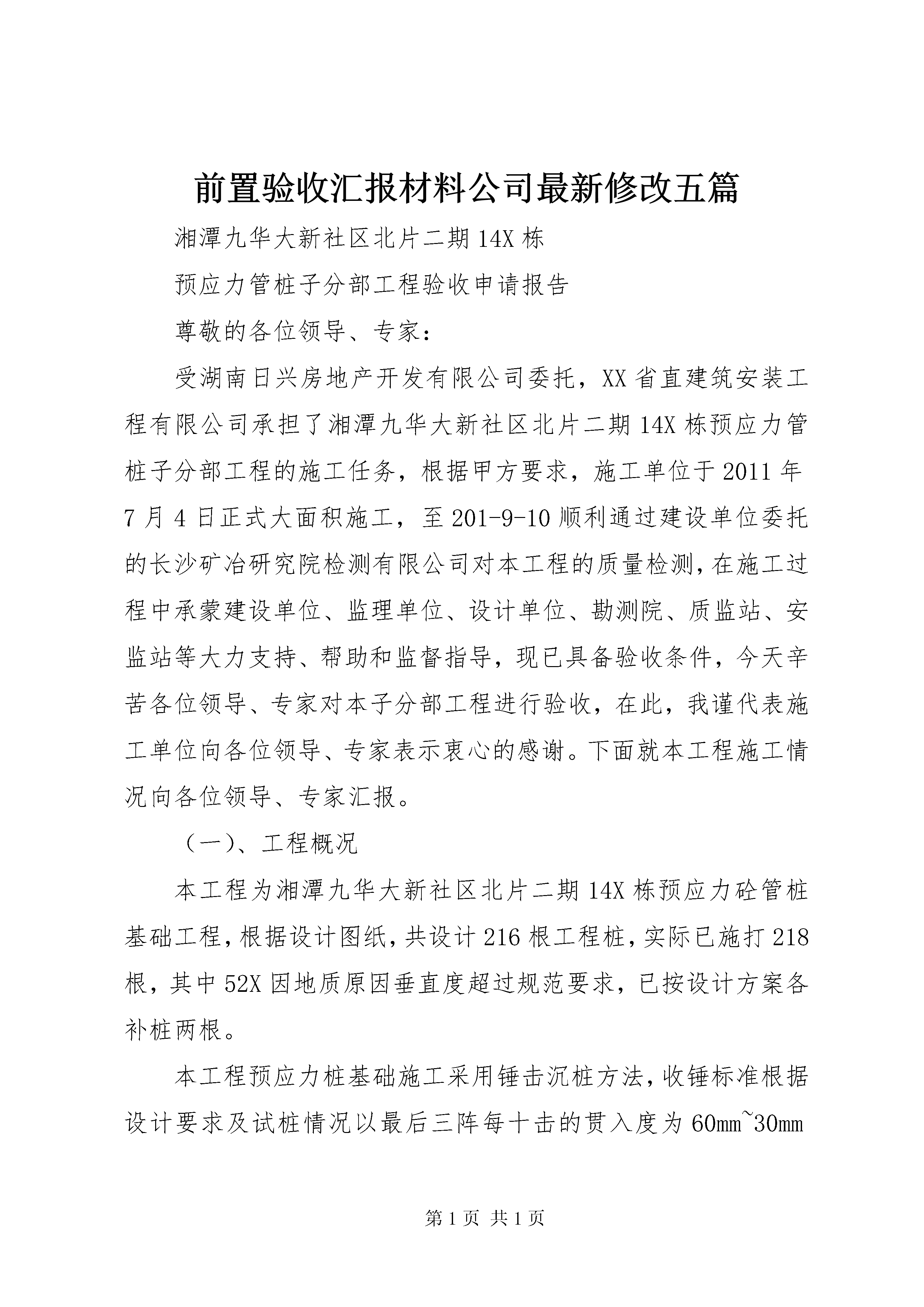 前置验收汇报材料公司最新修改五篇湘潭九华大新社区北片二期14X栋预应力管桩子分部工程验收申请报告尊敬的各位领导、专家:受湖南日兴房地产开发有限公司委托,XX省直建筑安装工程有限公司承担了湘潭九华大新社区北片二期14X栋预应力管桩子分部工程的施工任务,根据甲方要求,施工单位于2011年7月4日正式大面积施工,至201-9-10顺利通过建设单位委托的长沙矿冶研究院检测有限公司对本工程的质量检测,在施工过程中承蒙建设单位、监理单位、设计单位、勘测院、质监站、安监站等大力支持、帮助和监督指导,现已具备验收条件,今天辛苦各位领导、专家对本子分部工程进行验收,在此,我谨代表施工单位向各位领导、专家表示衷心的感谢。下面就本工程施工情况向各位领导、专家汇报。(一)、工程概况本工程为湘潭九华大新社区北片二期14X栋预应力砼管桩基础工程,根据设计图纸,共设计216根工程桩,实际已施打218根,其中52X因地质原因垂直度超过规范要求,已按设计方案各补桩两根。本工程预应力桩基础施工采用锤击沉桩方法,收锤标准根据设计要求及试桩情况以最后三阵每十击的贯入度为60mm~30mm进行控制。(二)、施工技术要求该管桩工程施工严格按中华人民共和国国家标准《建筑地基基础工程施工质量验收规范》gb50202~2002及企业标准,《建筑桩基技术规范》(jgj94~2008)等有关工程建设强制性条文施工。1、施工前对设备、材料进行严格检查。所有预应力高强砼管桩均有厂家合格证,并通过监理、建设方检查后才使用。c80砼所用的水泥、钢筋、中砂、碎石都有湖南东方管桩有限公司质量检验站的检验报告。2、根据甲方提供的控制点和设计图纸,利用全站仪分别放设各栋桩位。并报请甲方和监理复核,所有桩位符合规范要求。3、打桩时校准桩心。4、严格控制每根桩的垂直度,桩身的垂直度偏差不大于0.5%。采用两个吊线锤分90度角随时观察桩身垂直度,必要时随时校正桩身。5、管桩施打时,严格控制每根桩的施打时间。6、管桩施工时,仔细研究地质报告,严格控制收锤标准。7、管桩施工结束后,对桩体质量及承载力进行检验,符合设计要求。8、预应力管桩土方开挖后,经复核,桩位偏差、桩顶标高符合规范要求。9、桩的质量检验标准符合子分部、分项、检验批验收记录规定。(三)、施工概况在管桩基础施工过程中,对各班组进行了详细的技术交底和现场指挥,从轴线标定→桩位标定→核定桩心→打桩→控制打桩时间→控制收锤标准→锯桩至设计标高,每一道工序由建设单位、监理单位、施工单位三方共同组织验收后才进行下道工序施工。(四)、安全文明施工情况:施工过程中,我施工方严格遵守安全文明施工管理法律法规,文明施工符合要求,未出现各类安全事故。(五)、工程质量评定及施工技术资料整理1、该批预应力管桩基础经建设单位、监理单位、质检单位按规范要求进行桩基静载检测,承载力均达到设计要求。每承台任抽取一根桩且6桩以上承台上抽取2根桩进行桩基低应变动测试验,桩身完整性符合设计要求。2、各检验批主控项目检查评定合格,一般项目检查评定符合要求。3、施工、验收程序合法、合理。4、施工技术资料收集整理及时、齐全。综上所述,湘潭九华大新社区北片二期14X栋管桩工程自我评定符合设计要求,质量可靠,可进入下道工序施工,特报告建设单位、设计单位、质监站、监理公司、地勘单位进行预应力管桩子分部验收,请各位领导、专家对施工中存在的不足提出宝贵意见。最后,衷心感谢各位领导、专家对我们的大力支持和帮助。谢谢大家。XX省直建筑安装工程有限公司2011年月日湘潭九华大新社区北片二期14X栋预应力管桩子分部工程施工单位:XX省直建筑安装工程有限公司验收汇报材料2011年月日