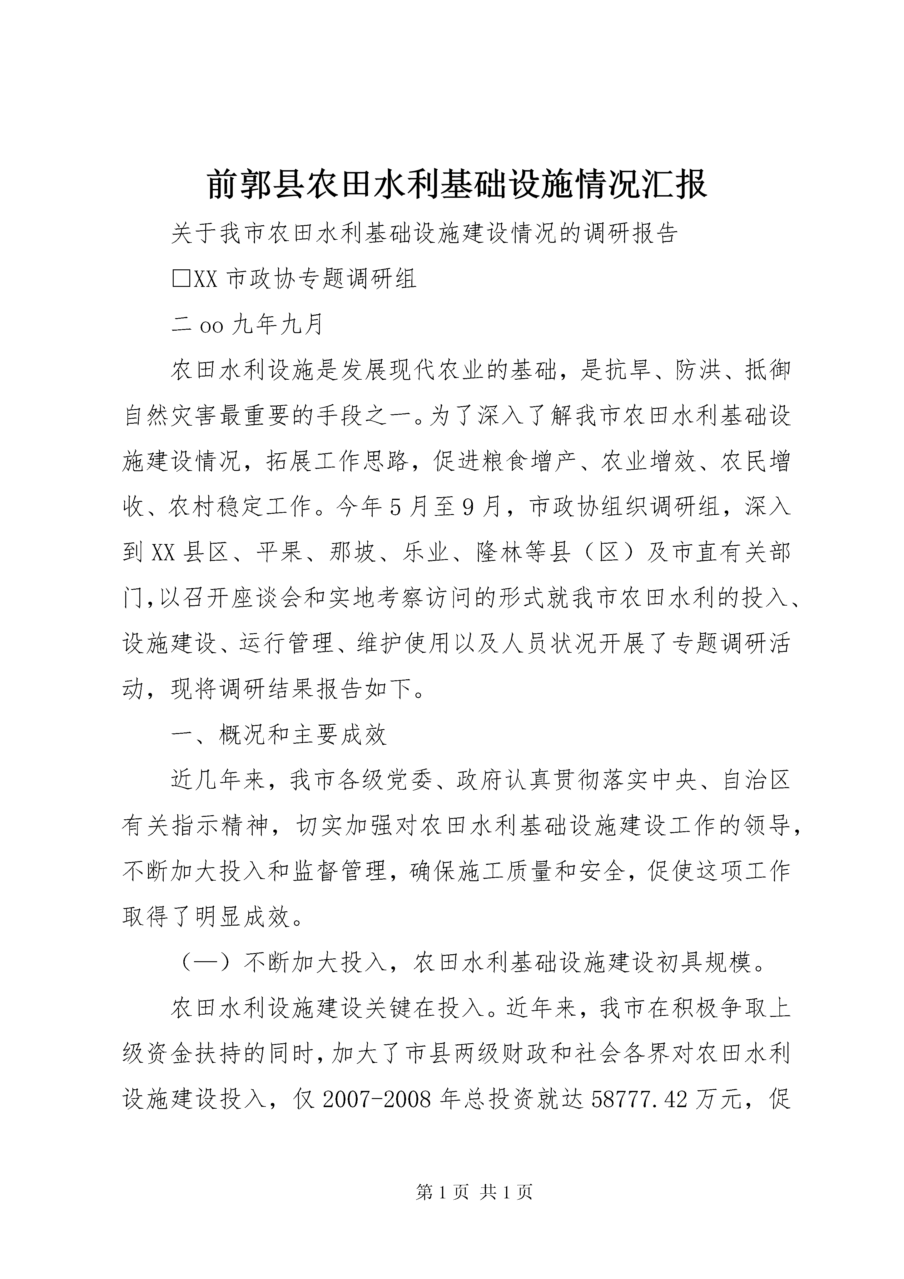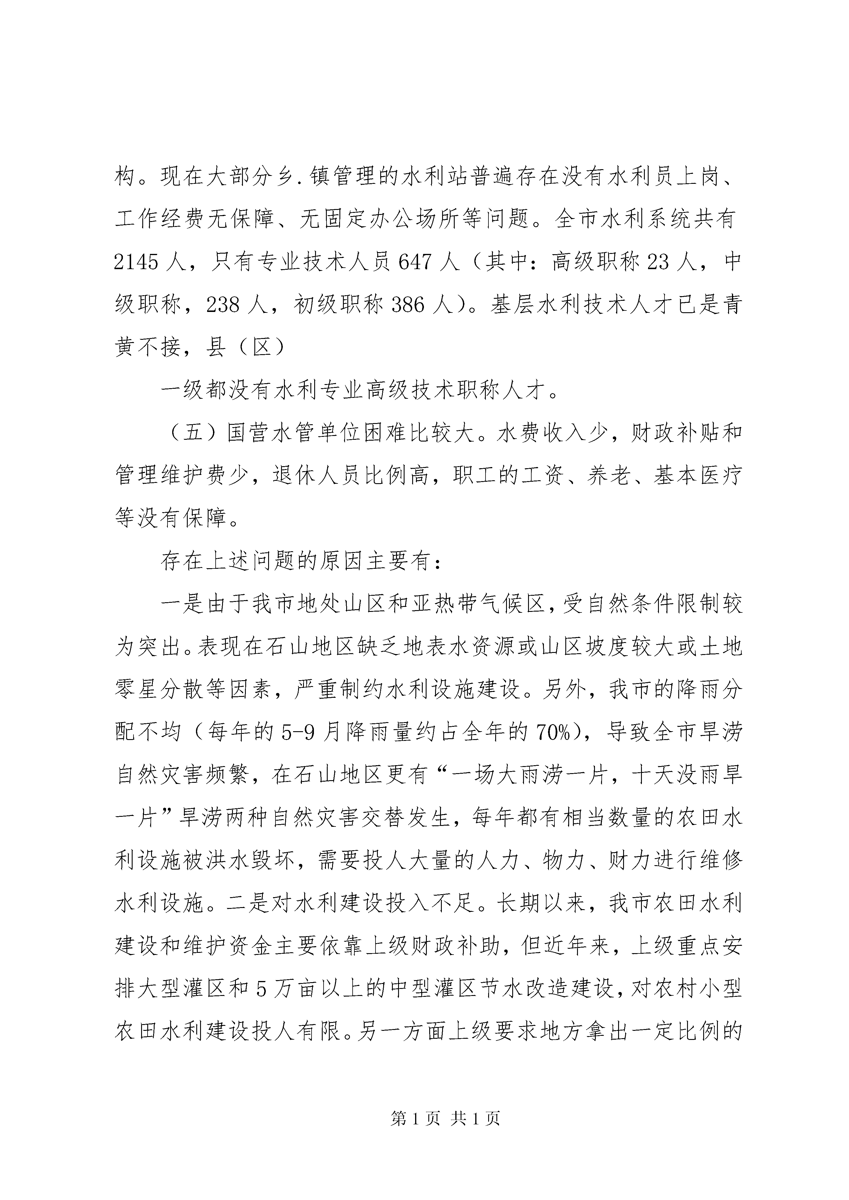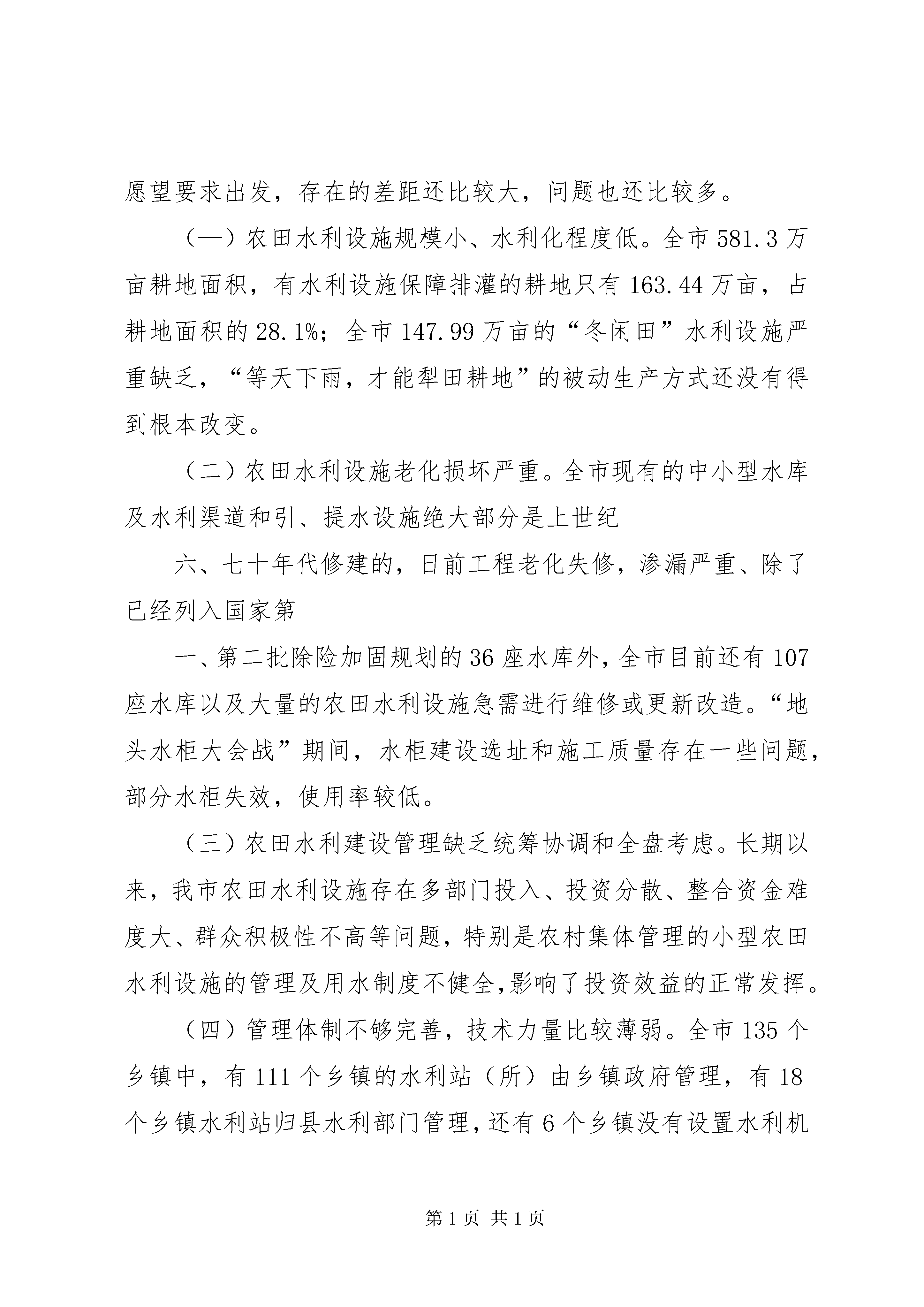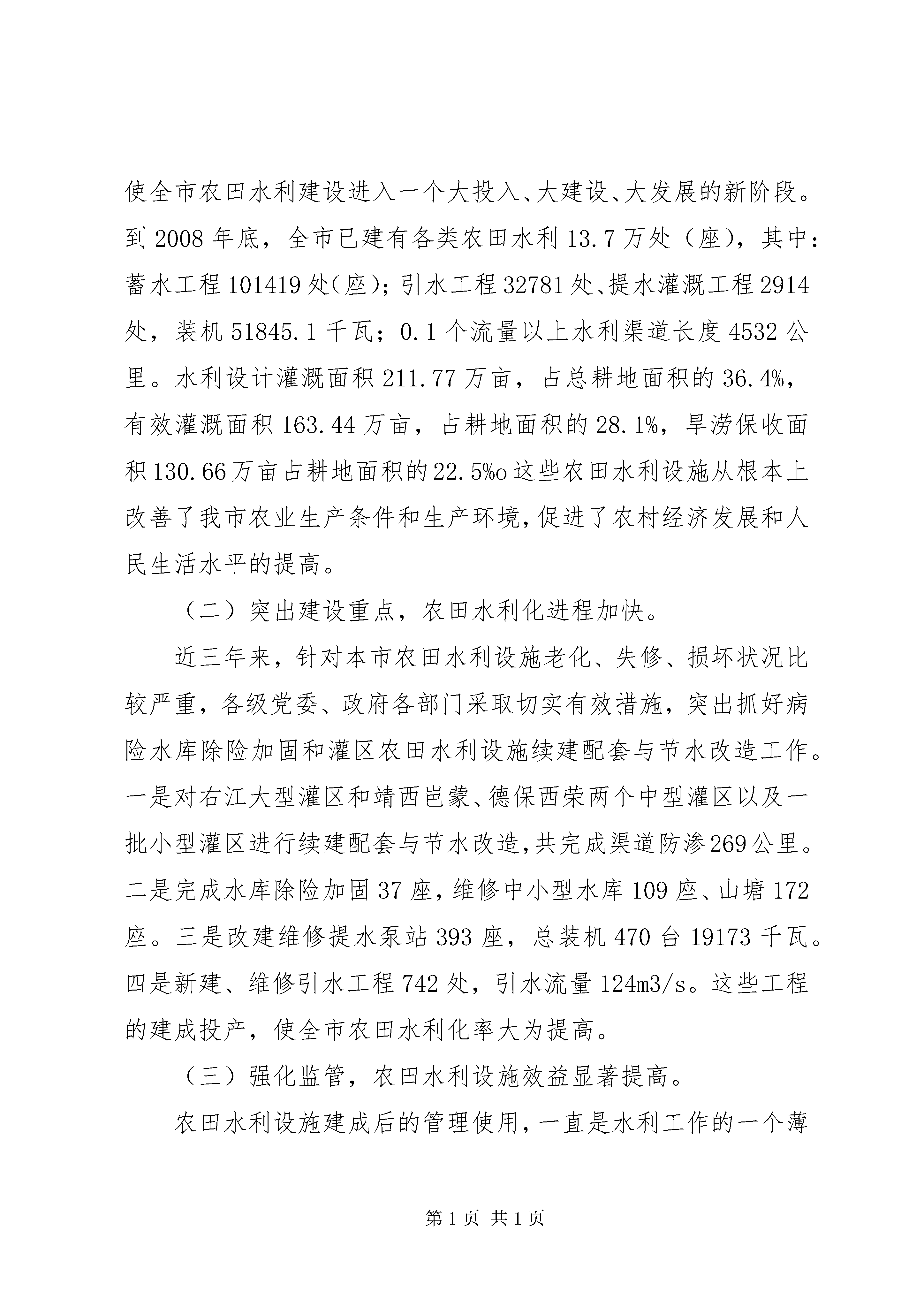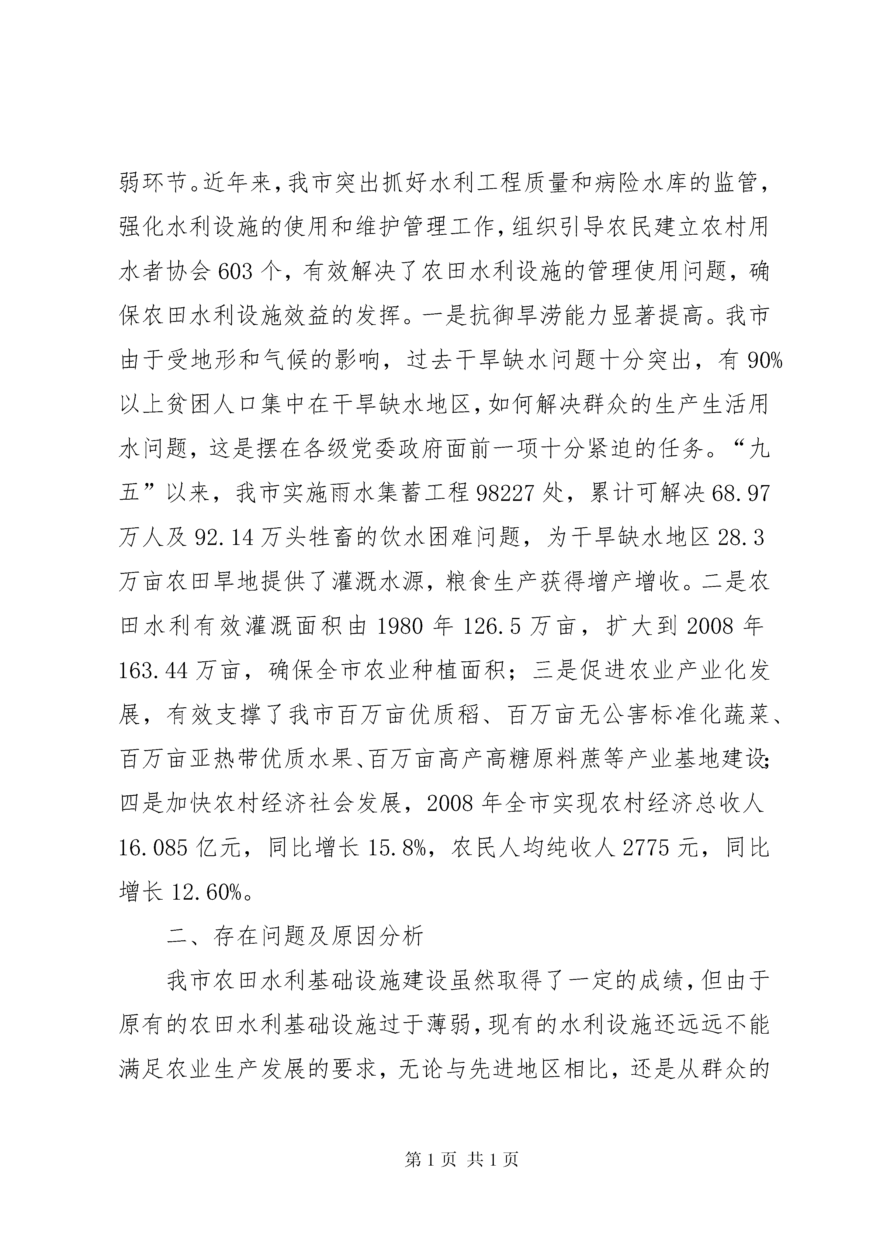 前郭县农田水利基础设施情况汇报关于我市农田水利基础设施建设情况的调研报告□XX市政协专题调研组二oo九年九月农田水利设施是发展现代农业的基础,是抗旱、防洪、抵御自然灾害最重要的手段之一。为了深入了解我市农田水利基础设施建设情况,拓展工作思路,促进粮食增产、农业增效、农民增收、农村稳定工作。今年5月至9月,市政协组织调研组,深入到XX县区、平果、那坡、乐业、隆林等县(区)及市直有关部门,以召开座谈会和实地考察访问的形式就我市农田水利的投入、设施建设、运行管理、维护使用以及人员状况开展了专题调研活动,现将调研结果报告如下。一、概况和主要成效近几年来,我市各级党委、政府认真贯彻落实中央、自治区有关指示精神,切实加强对农田水利基础设施建设工作的领导,不断加大投入和监督管理,确保施工质量和安全,促使这项工作取得了明显成效。(—)不断加大投入,农田水利基础设施建设初具规模。农田水利设施建设关键在投入。近年来,我市在积极争取上级资金扶持的同时,加大了市县两级财政和社会各界对农田水利设施建设投入,仅2007-2008年总投资就达58777.42万元,促使全市农田水利建设进入一个大投入、大建设、大发展的新阶段。到2008年底,全市已建有各类农田水利13.7万处(座),其中:蓄水工程101419处(座);引水工程32781处、提水灌溉工程2914处,装机51845.1千瓦;0.1个流量以上水利渠道长度4532公里。水利设计灌溉面积211.77万亩,占总耕地面积的36.4%,有效灌溉面积163.44万亩,占耕地面积的28.1%,旱涝保收面积130.66万亩占耕地面积的22.5%o这些农田水利设施从根本上改善了我市农业生产条件和生产环境,促进了农村经济发展和人民生活水平的提高。(二)突出建设重点,农田水利化进程加快。近三年来,针对本市农田水利设施老化、失修、损坏状况比较严重,各级党委、政府各部门采取切实有效措施,突出抓好病险水库除险加固和灌区农田水利设施续建配套与节水改造工作。一是对右江大型灌区和靖西岜蒙、德保西荣两个中型灌区以及一批小型灌区进行续建配套与节水改造,共完成渠道防渗269公里。二是完成水库除险加固37座,维修中小型水库109座、山塘172座。三是改建维修提水泵站393座,总装机470台19173千瓦。四是新建、维修引水工程742处,引水流量124m3/s。这些工程的建成投产,使全市农田水利化率大为提高。(三)强化监管,农田水利设施效益显著提高。农田水利设施建成后的管理使用,一直是水利工作的一个薄弱环节。近年来,我市突出抓好水利工程质量和病险水库的监管,强化水利设施的使用和维护管理工作,组织引导农民建立农村用水者协会603个,有效解决了农田水利设施的管理使用问题,确保农田水利设施效益的发挥。一是抗御旱涝能力显著提高。我市由于受地形和气候的影响,过去干旱缺水问题十分突出,有90%以上贫困人口集中在干旱缺水地区,如何解决群众的生产生活用水问题,这是摆在各级党委政府面前一项十分紧迫的任务。“九五”以来,我市实施雨水集蓄工程98227处,累计可解决68.97万人及92.14万头牲畜的饮水困难问题,为干旱缺水地区28.3万亩农田旱地提供了灌溉水源,粮食生产获得增产增收。二是农田水利有效灌溉面积由1980年126.5万亩,扩大到2008年163.44万亩,确保全市农业种植面积;三是促进农业产业化发展,有效支撑了我市百万亩优质稻、百万亩无公害标准化蔬菜、百万亩亚热带优质水果、百万亩高产高糖原料蔗等产业基地建设;四是加快农村经济社会发展,2008年全市实现农村经济总收人16.085亿元,同比增长15.8%,农民人均纯收人2775元,同比增长12.60%。二、存在问题及原因分析我市农田水利基础设施建设虽然取得了一定的成绩,但由于原有的农田水利基础设施过于薄弱,现有的水利设施还远远不能满足农业生产发展的要求,无论与先进地区相比,还是从群众的愿望要求出发,存在的差距还比较大,问题也还比较多。(—)农田水利设施规模小、水利化程度低。全市581.3万亩耕地面积,有水利设施保障排灌的耕地只有163.44万亩,占耕地面积的28.1%;全市147.99万亩的“冬闲田”水利设施严重缺乏,“等天下雨,才能犁田耕地”的被动生产方式还没有得到根本改变。(二)农田水利设施老化损坏严重。全市现有的中小型水库及水利渠道和引、提水设施绝大部分是上世纪六、七十年代修建的,日前工程老化失修,渗漏严重、除了已经列入国家第一、第二批除险加固规划的36座水库外,全市目前还有107座水库以及大量的农田水利设施急需进行维修或更新改造。“地头水柜大会战”期间,水柜建设选址和施工质量存在一些问题,部分水柜失效,使用率较低。(三)农田水利建设管理缺乏统筹协调和全盘考虑。长期以来,