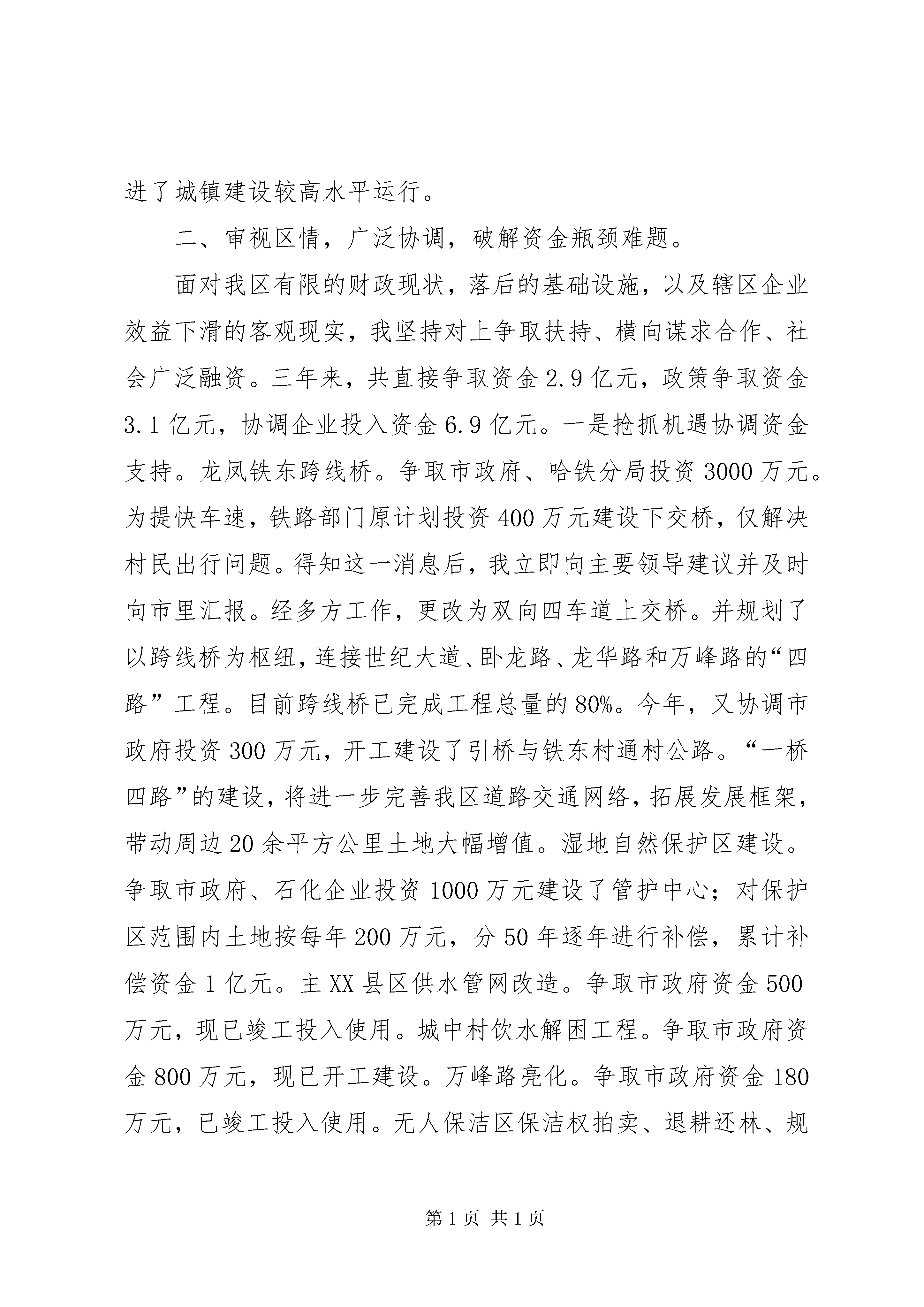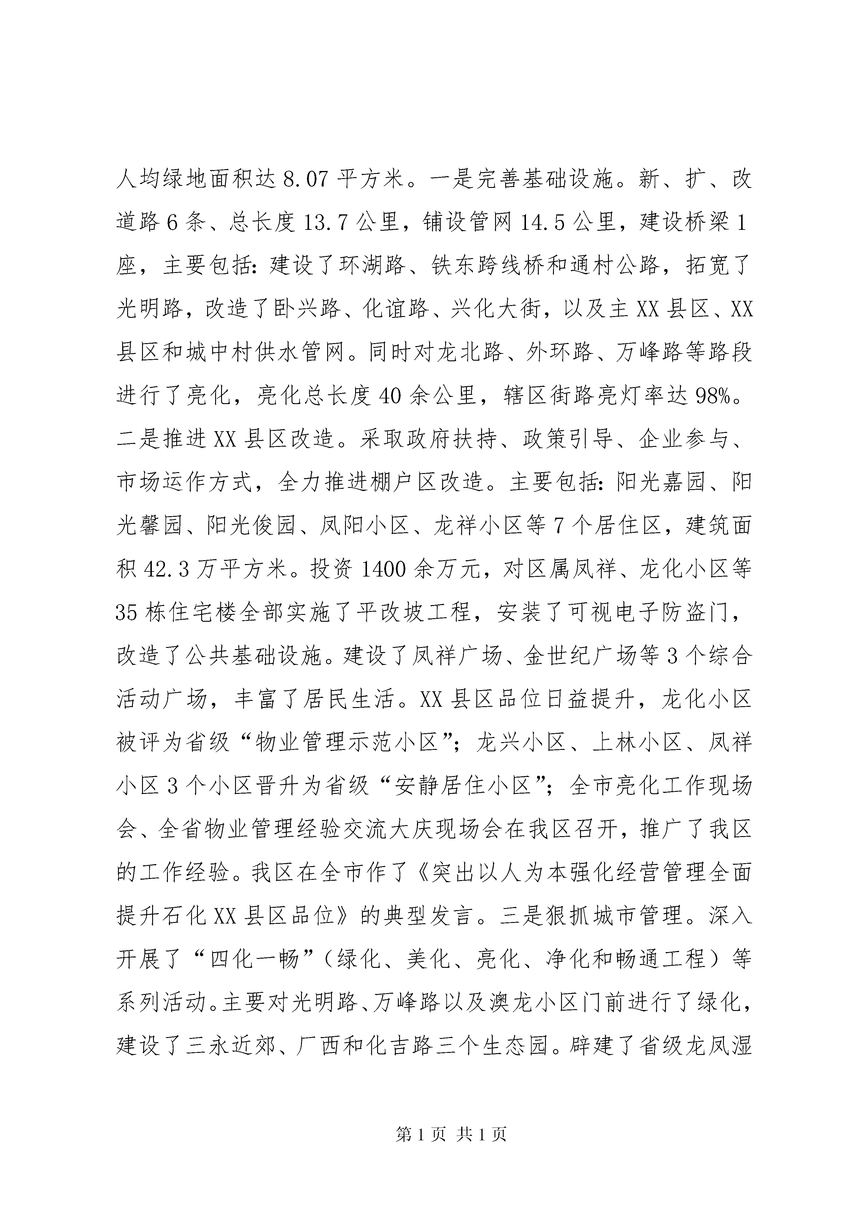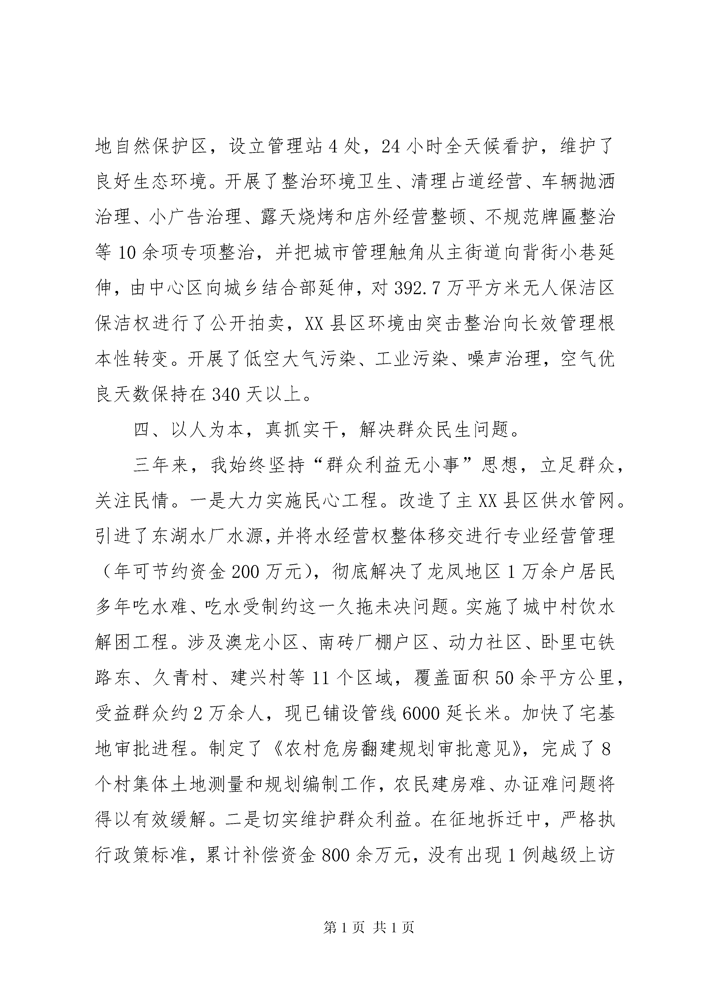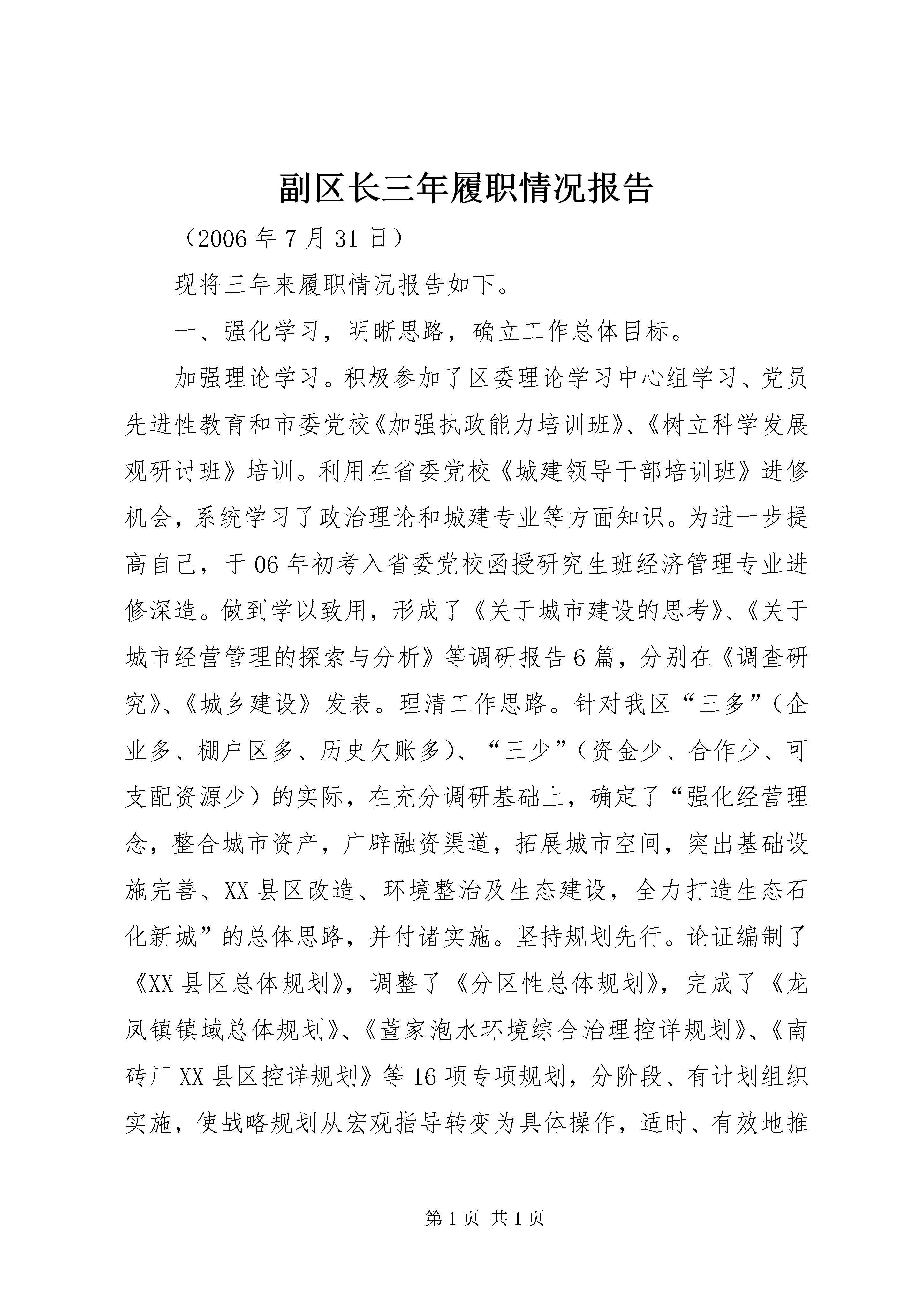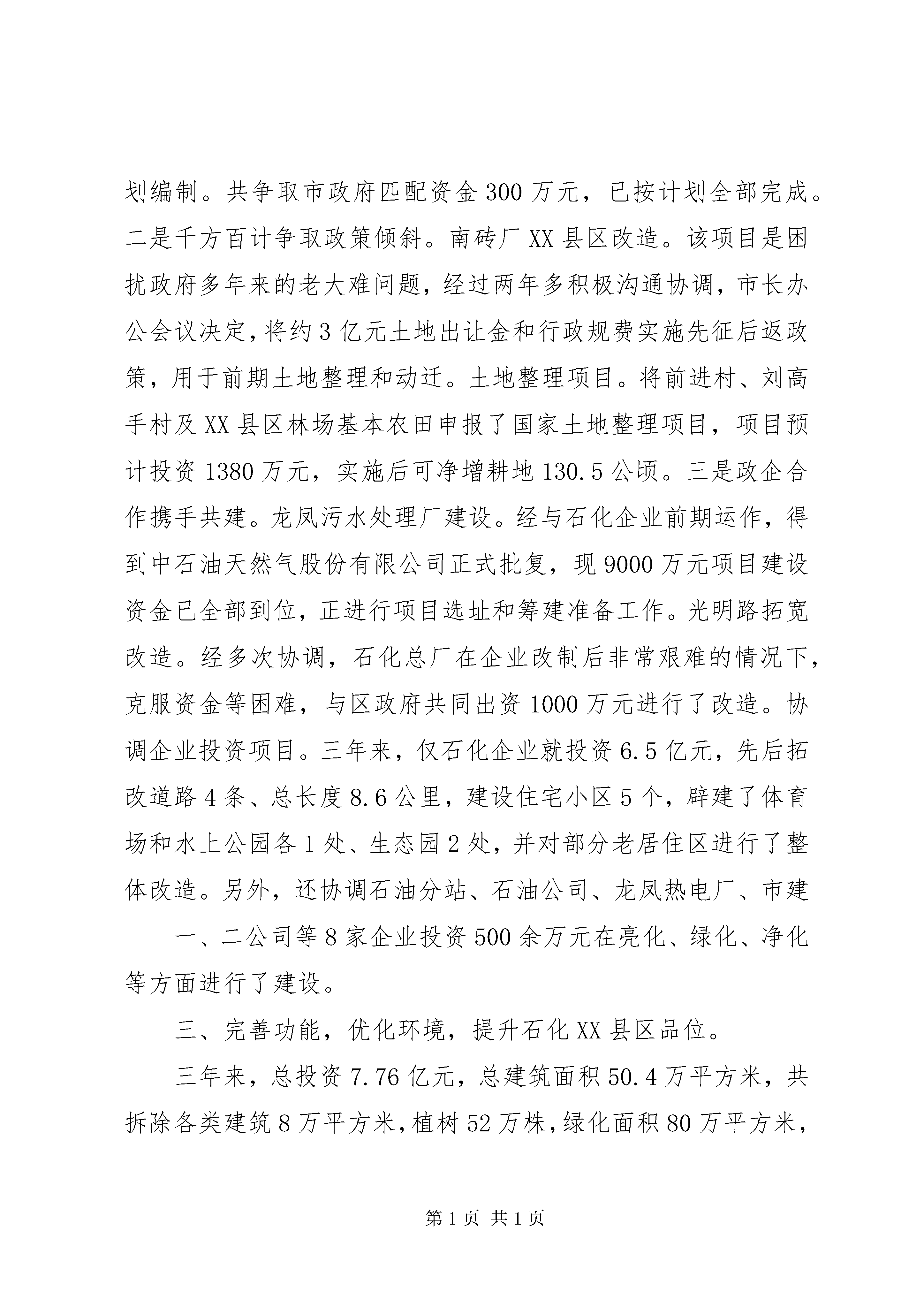 副区长三年履职情况报告(2006年7月31日)现将三年来履职情况报告如下。一、强化学习,明晰思路,确立工作总体目标。加强理论学习。积极参加了区委理论学习中心组学习、党员先进性教育和市委党校《加强执政能力培训班》、《树立科学发展观研讨班》培训。利用在省委党校《城建领导干部培训班》进修机会,系统学习了政治理论和城建专业等方面知识。为进一步提高自己,于06年初考入省委党校函授研究生班经济管理专业进修深造。做到学以致用,形成了《关于城市建设的思考》、《关于城市经营管理的探索与分析》等调研报告6篇,分别在《调查研究》、《城乡建设》发表。理清工作思路。针对我区“三多”(企业多、棚户区多、历史欠账多)、“三少”(资金少、合作少、可支配资源少)的实际,在充分调研基础上,确定了“强化经营理念,整合城市资产,广辟融资渠道,拓展城市空间,突出基础设施完善、XX县区改造、环境整治及生态建设,全力打造生态石化新城”的总体思路,并付诸实施。坚持规划先行。论证编制了《XX县区总体规划》,调整了《分区性总体规划》,完成了《龙凤镇镇域总体规划》、《董家泡水环境综合治理控详规划》、《南砖厂XX县区控详规划》等16项专项规划,分阶段、有计划组织实施,使战略规划从宏观指导转变为具体操作,适时、有效地推进了城镇建设较高水平运行。二、审视区情,广泛协调,破解资金瓶颈难题。面对我区有限的财政现状,落后的基础设施,以及辖区企业效益下滑的客观现实,我坚持对上争取扶持、横向谋求合作、社会广泛融资。三年来,共直接争取资金2.9亿元,政策争取资金3.1亿元,协调企业投入资金6.9亿元。一是抢抓机遇协调资金支持。龙凤铁东跨线桥。争取市政府、哈铁分局投资3000万元。为提快车速,铁路部门原计划投资400万元建设下交桥,仅解决村民出行问题。得知这一消息后,我立即向主要领导建议并及时向市里汇报。经多方工作,更改为双向四车道上交桥。并规划了以跨线桥为枢纽,连接世纪大道、卧龙路、龙华路和万峰路的“四路”工程。目前跨线桥已完成工程总量的80%。今年,又协调市政府投资300万元,开工建设了引桥与铁东村通村公路。“一桥四路”的建设,将进一步完善我区道路交通网络,拓展发展框架,带动周边20余平方公里土地大幅增值。湿地自然保护区建设。争取市政府、石化企业投资1000万元建设了管护中心;对保护区范围内土地按每年200万元,分50年逐年进行补偿,累计补偿资金1亿元。主XX县区供水管网改造。争取市政府资金500万元,现已竣工投入使用。城中村饮水解困工程。争取市政府资金800万元,现已开工建设。万峰路亮化。争取市政府资金180万元,已竣工投入使用。无人保洁区保洁权拍卖、退耕还林、规划编制。共争取市政府匹配资金300万元,已按计划全部完成。二是千方百计争取政策倾斜。南砖厂XX县区改造。该项目是困扰政府多年来的老大难问题,经过两年多积极沟通协调,市长办公会议决定,将约3亿元土地出让金和行政规费实施先征后返政策,用于前期土地整理和动迁。土地整理项目。将前进村、刘高手村及XX县区林场基本农田申报了国家土地整理项目,项目预计投资1380万元,实施后可净增耕地130.5公顷。三是政企合作携手共建。龙凤污水处理厂建设。经与石化企业前期运作,得到中石油天然气股份有限公司正式批复,现9000万元项目建设资金已全部到位,正进行项目选址和筹建准备工作。光明路拓宽改造。经多次协调,石化总厂在企业改制后非常艰难的情况下,克服资金等困难,与区政府共同出资1000万元进行了改造。协调企业投资项目。三年来,仅石化企业就投资6.5亿元,先后拓改道路4条、总长度8.6公里,建设住宅小区5个,辟建了体育场和水上公园各1处、生态园2处,并对部分老居住区进行了整体改造。另外,还协调石油分站、石油公司、龙凤热电厂、市建一、二公司等8家企业投资500余万元在亮化、绿化、净化等方面进行了建设。三、完善功能,优化环境,提升石化XX县区品位。三年来,总投资7.76亿元,总建筑面积50.4万平方米,共拆除各类建筑8万平方米,植树52万株,绿化面积80万平方米,人均绿地面积达8.07平方米。一是完善基础设施。新、扩、改道路6条、总长度13.7公里,铺设管网14.5公里,建设桥梁1座,主要包括:建设了环湖路、铁东跨线桥和通村公路,拓宽了光明路,改造了卧兴路、化谊路、兴化大街,以及主XX县区、XX县区和城中村供水管网。同时对龙北路、外环路、万峰路等路段进行了亮化,亮化总长度40余公里,辖区街路亮灯率达98%。二是推进XX县区改造。采取政府扶持、政策引导、企业参与、市场运作方式,全力推进棚户区改造。主要包括:阳光嘉园、阳光馨园、阳光俊园、凤阳小区、龙祥小区等7个居住区,建筑面积42.3万平方米。投资1400余万元,对区属凤祥、龙化小区等35栋住宅