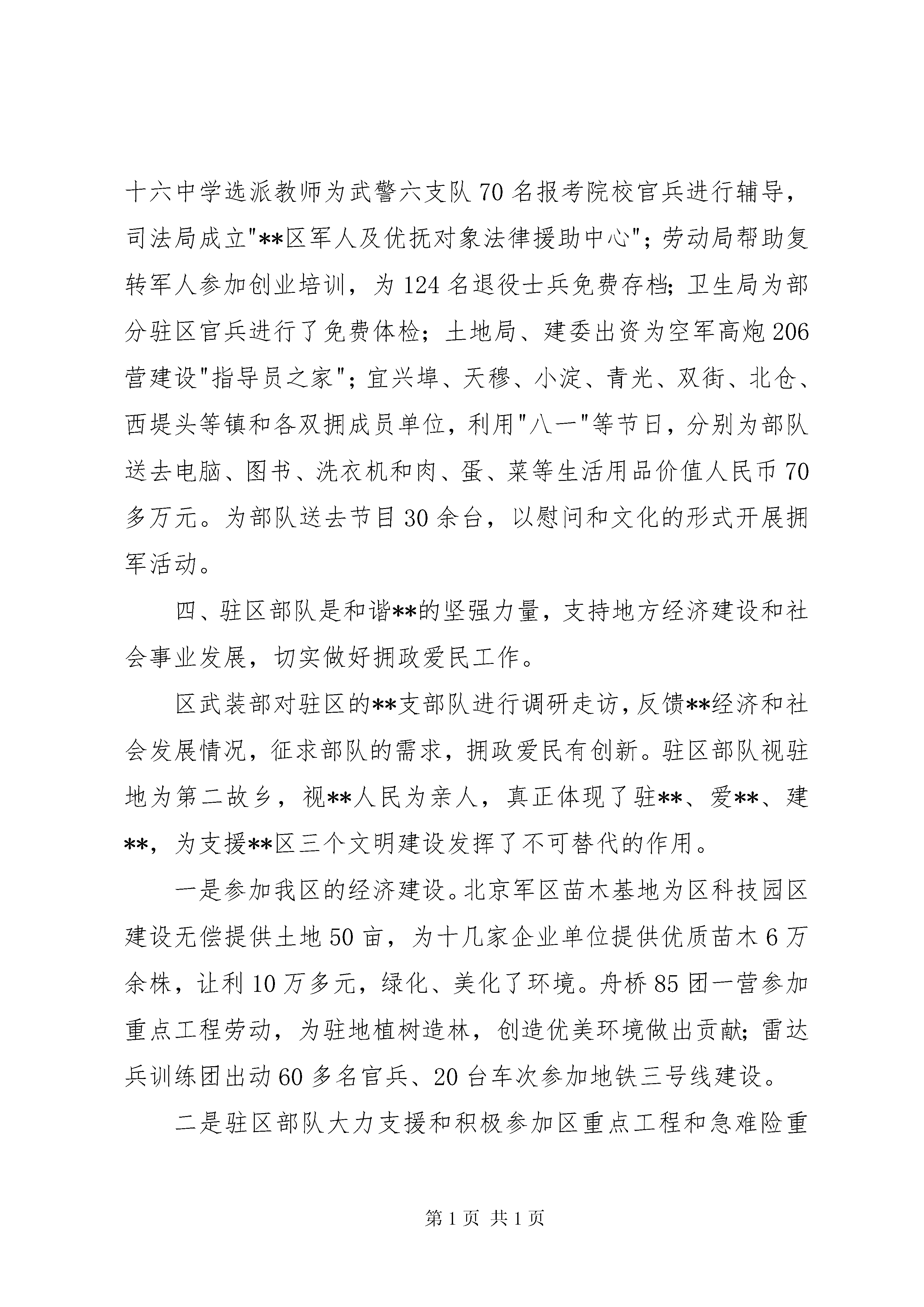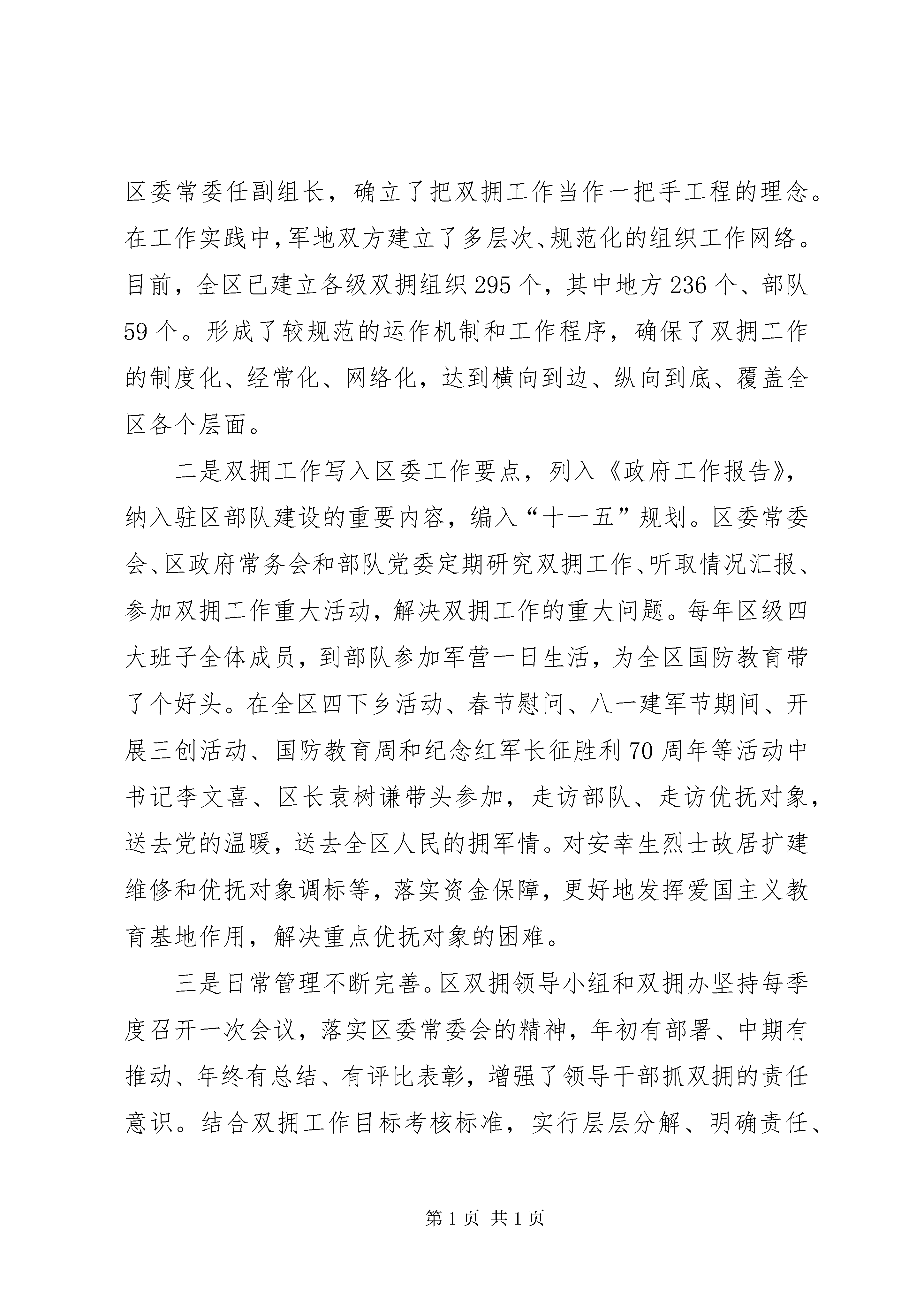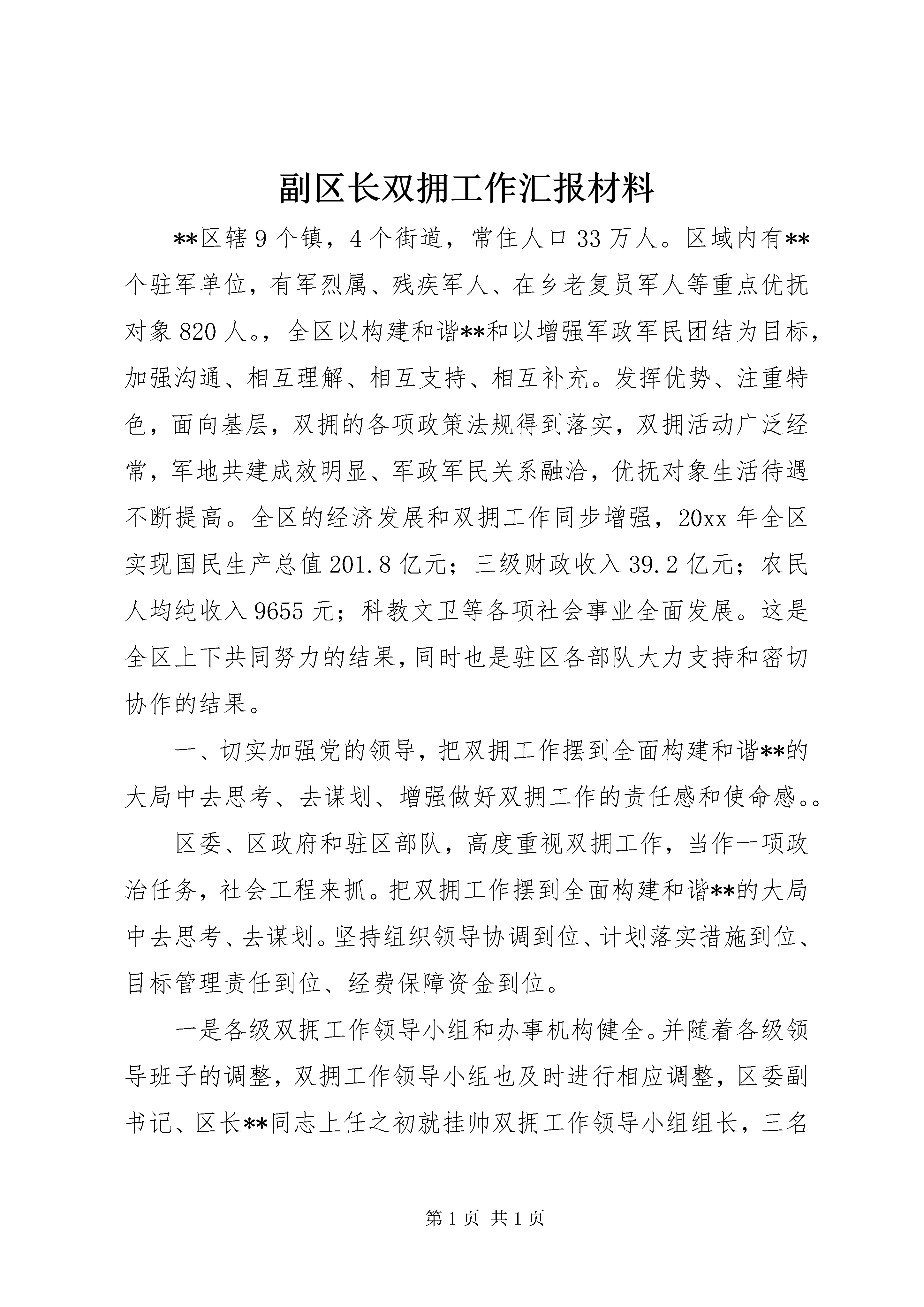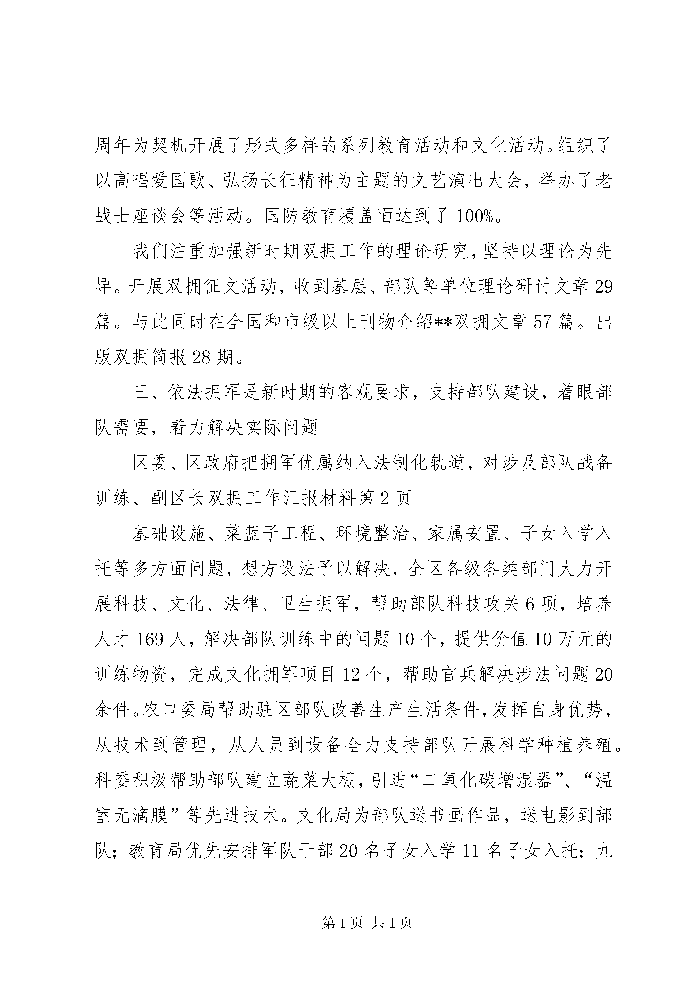 副区长双拥工作汇报材料**区辖9个镇,4个街道,常住人口33万人。区域内有**个驻军单位,有军烈属、残疾军人、在乡老复员军人等重点优抚对象820人。,全区以构建和谐**和以增强军政军民团结为目标,加强沟通、相互理解、相互支持、相互补充。发挥优势、注重特色,面向基层,双拥的各项政策法规得到落实,双拥活动广泛经常,军地共建成效明显、军政军民关系融洽,优抚对象生活待遇不断提高。全区的经济发展和双拥工作同步增强,20xx年全区实现国民生产总值201.8亿元;三级财政收入39.2亿元;农民人均纯收入9655元;科教文卫等各项社会事业全面发展。这是全区上下共同努力的结果,同时也是驻区各部队大力支持和密切协作的结果。一、切实加强党的领导,把双拥工作摆到全面构建和谐**的大局中去思考、去谋划、增强做好双拥工作的责任感和使命感。。区委、区政府和驻区部队,高度重视双拥工作,当作一项政治任务,社会工程来抓。把双拥工作摆到全面构建和谐**的大局中去思考、去谋划。坚持组织领导协调到位、计划落实措施到位、目标管理责任到位、经费保障资金到位。一是各级双拥工作领导小组和办事机构健全。并随着各级领导班子的调整,双拥工作领导小组也及时进行相应调整,区委副书记、区长**同志上任之初就挂帅双拥工作领导小组组长,三名区委常委任副组长,确立了把双拥工作当作一把手工程的理念。在工作实践中,军地双方建立了多层次、规范化的组织工作网络。目前,全区已建立各级双拥组织295个,其中地方236个、部队59个。形成了较规范的运作机制和工作程序,确保了双拥工作的制度化、经常化、网络化,达到横向到边、纵向到底、覆盖全区各个层面。二是双拥工作写入区委工作要点,列入《政府工作报告》,纳入驻区部队建设的重要内容,编入“十一五”规划。区委常委会、区政府常务会和部队党委定期研究双拥工作、听取情况汇报、参加双拥工作重大活动,解决双拥工作的重大问题。每年区级四大班子全体成员,到部队参加军营一日生活,为全区国防教育带了个好头。在全区四下乡活动、春节慰问、八一建军节期间、开展三创活动、国防教育周和纪念红军长征胜利70周年等活动中书记李文喜、区长袁树谦带头参加,走访部队、走访优抚对象,送去党的温暖,送去全区人民的拥军情。对安幸生烈士故居扩建维修和优抚对象调标等,落实资金保障,更好地发挥爱国主义教育基地作用,解决重点优抚对象的困难。三是日常管理不断完善。区双拥领导小组和双拥办坚持每季度召开一次会议,落实区委常委会的精神,年初有部署、中期有推动、年终有总结、有评比表彰,增强了领导干部抓双拥的责任意识。结合双拥工作目标考核标准,实行层层分解、明确责任、逐级落实。从军地双方抽调4名处科级干部充实到区双拥工作办公室,负责日常组织、协调、检查、指导和推动工作。四是推动双拥工作健康发展,区财政对双拥工作的投入逐年增加,一年来区财政用于双拥支出1000多万元。其中,支持部队建设万元、安置军转干部和退伍军人万元、发放和慰问优抚对象万元。各镇街委局对双拥工作也加大了投入,据统计一年用于双拥工作的资金达到多万元。双拥工作资金有保障。二、营造宣传教育浓厚氛围,全民参与形成声势,增强双拥工作意识和国防观念。我们把国防教育作为双拥基础工程来抓,坚持全面参与、活动经常,多种形式,讲求实效的方法。一年来,驻区部队和双拥成员单位制作展牌150余块,巡回展出40场次,发放宣传材料5万多份,开展了兵役法宣传、防火知识教育以及拥军优属、退役士兵安置和行业法律、知识宣传。运用生动活泼、丰富多彩的文化娱乐形式开展形象化教育,举办了国防电影周,集中放映国防教育题材和军事资料片70场次,创作演出50场讴歌国防建设和双拥工作的文艺节目。其中我区北门医院文艺小分队编排的《长征组歌》,深入部队演出十余场次,并在区委宣传部的大力支持下,委托中央电视台将《长征组歌》录成光盘,刻制1万张,发放到各驻区部队和全区机关企事业单位,小分队还通过各种途经,将《长征组歌》光盘送到边防哨所。我们以纪念红军长征胜利70周年为契机开展了形式多样的系列教育活动和文化活动。组织了以高唱爱国歌、弘扬长征精神为主题的文艺演出大会,举办了老战士座谈会等活动。国防教育覆盖面达到了100%。我们注重加强新时期双拥工作的理论研究,坚持以理论为先导。开展双拥征文活动,收到基层、部队等单位理论研讨文章29篇。与此同时在全国和市级以上刊物介绍**双拥文章57篇。出版双拥简报28期。三、依法拥军是新时期的客观要求,支持部队建设,着眼部队需要,着力解决实际问题区委、区政府把拥军优属纳入法制化轨道,对涉及部队战备训练、副区长双拥工作汇报材料基础设施、菜蓝子工程、环境整治、家属安置、子女入学入托等多方面问题,想方设法予以解决,全区各级各类部门大力开展科技、文化、法律、卫生拥军,帮