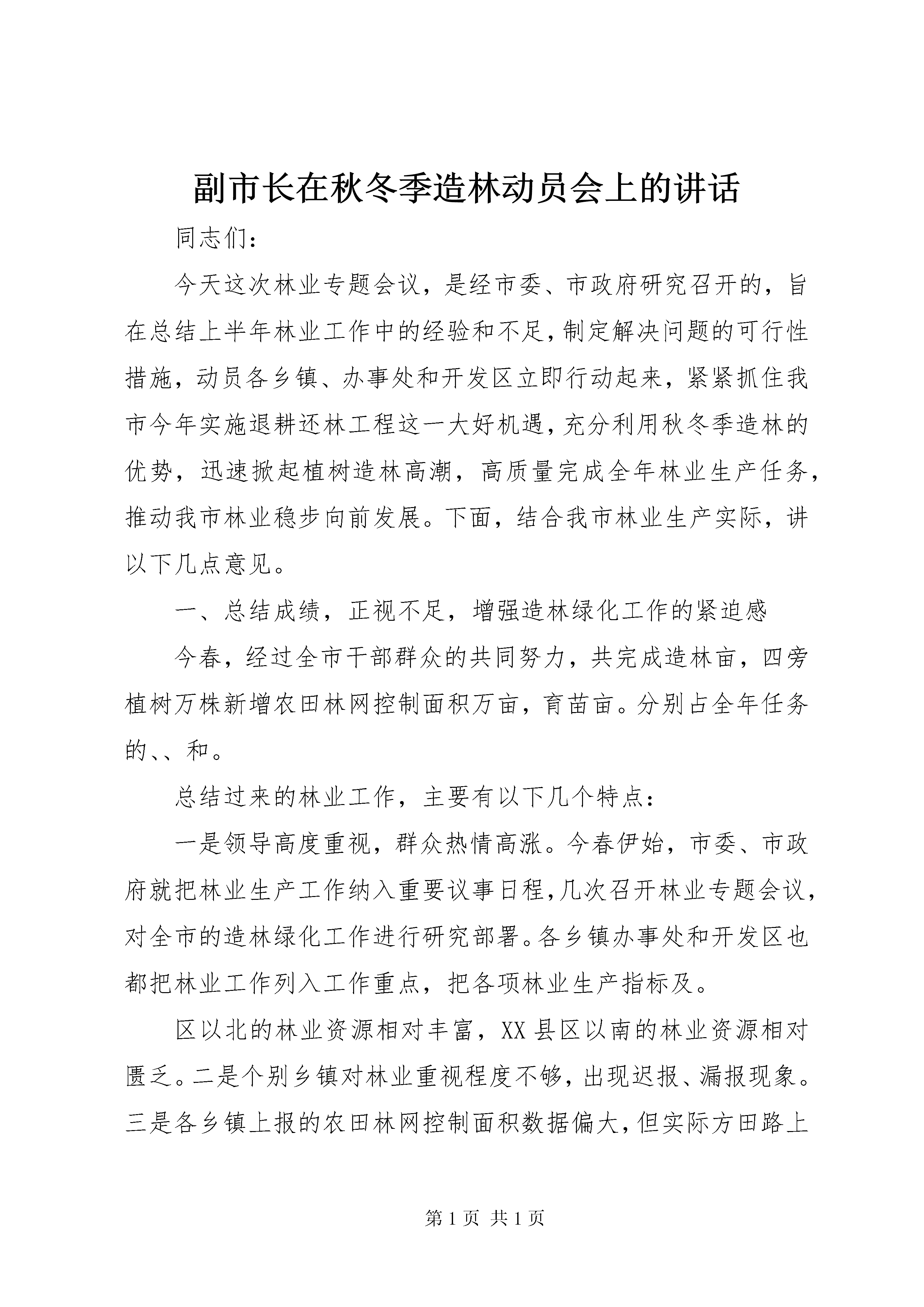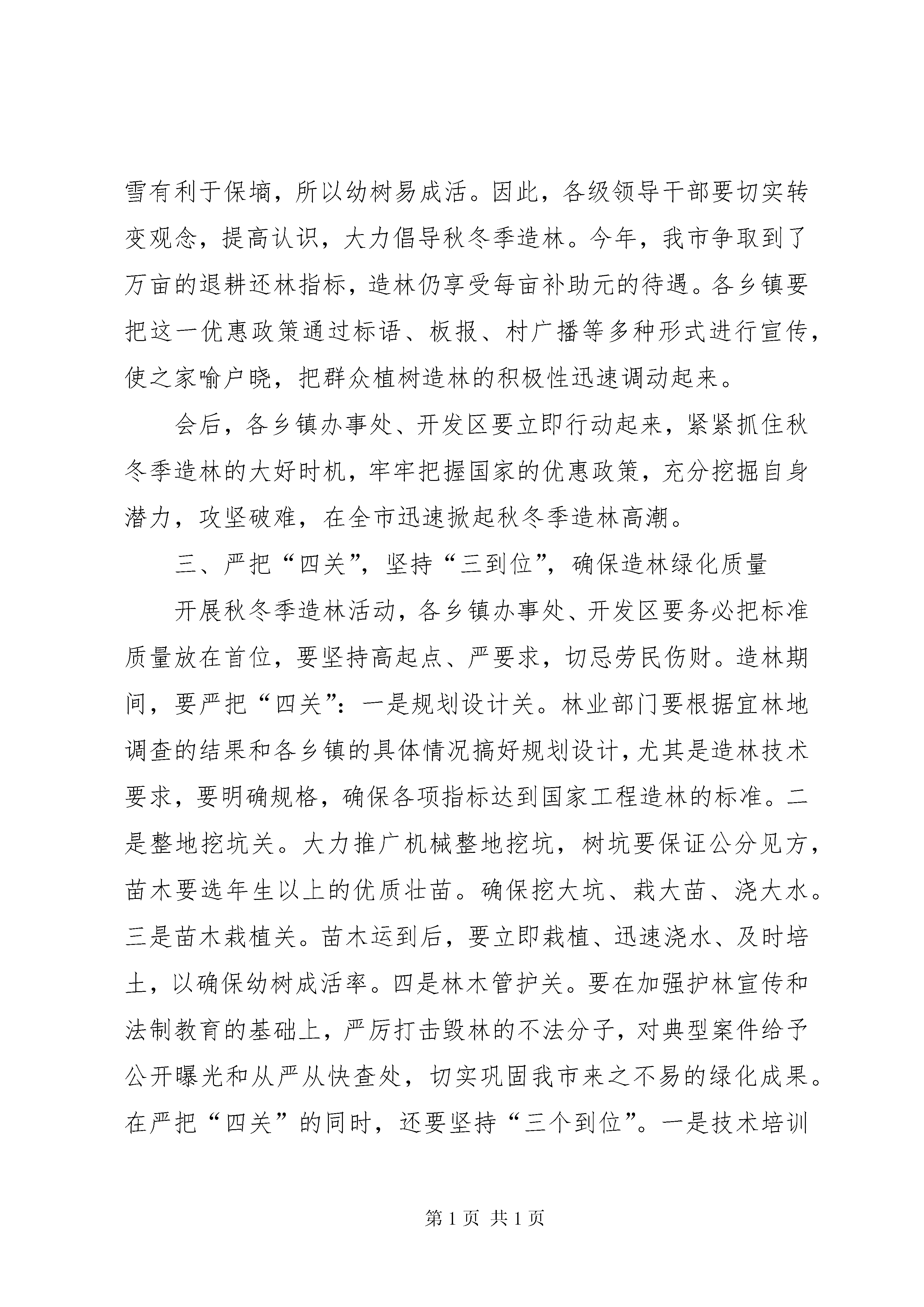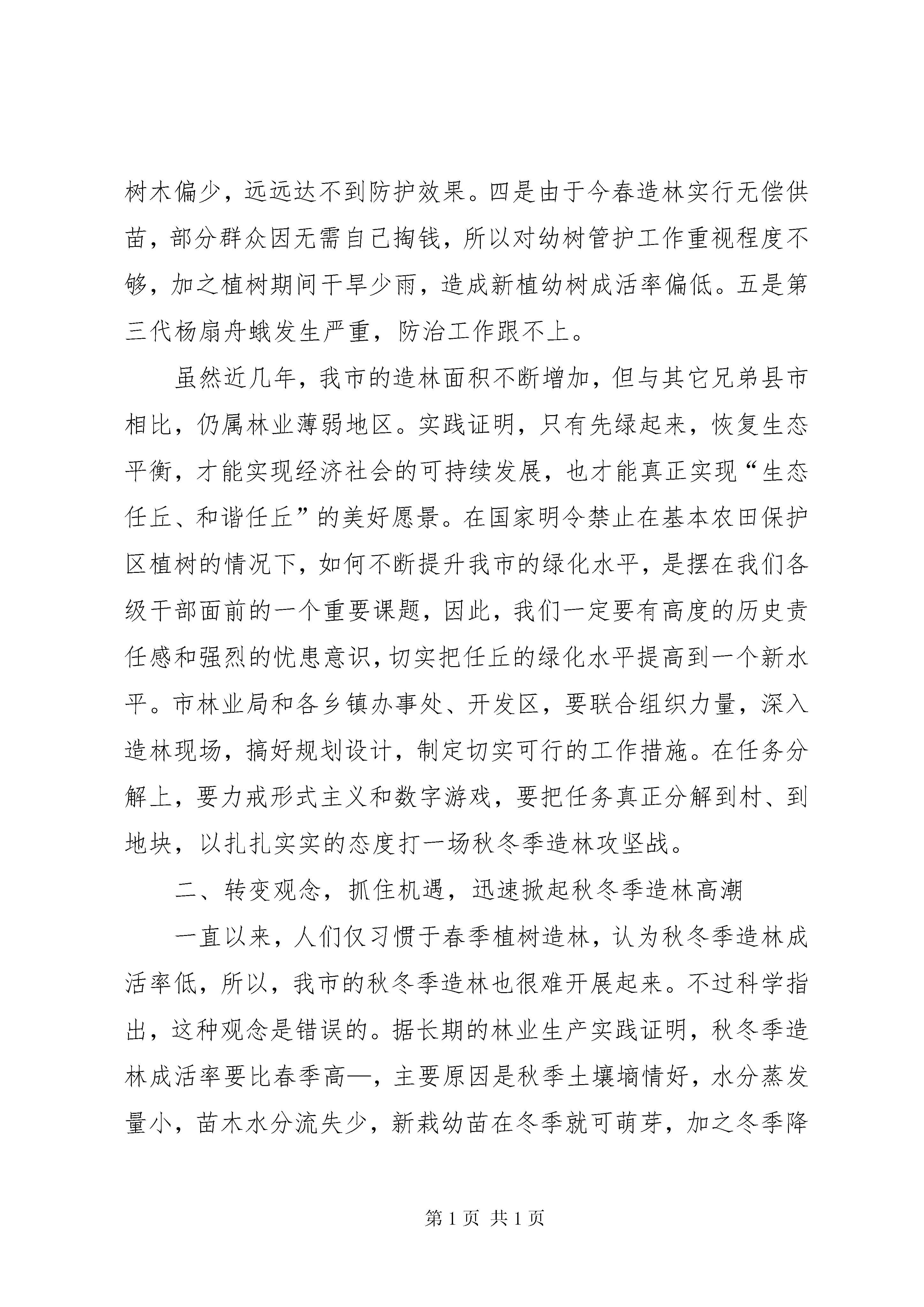 副市长在秋冬季造林动员会上的讲话同志们:今天这次林业专题会议,是经市委、市政府研究召开的,旨在总结上半年林业工作中的经验和不足,制定解决问题的可行性措施,动员各乡镇、办事处和开发区立即行动起来,紧紧抓住我市今年实施退耕还林工程这一大好机遇,充分利用秋冬季造林的优势,迅速掀起植树造林高潮,高质量完成全年林业生产任务,推动我市林业稳步向前发展。下面,结合我市林业生产实际,讲以下几点意见。一、总结成绩,正视不足,增强造林绿化工作的紧迫感今春,经过全市干部群众的共同努力,共完成造林亩,四旁植树万株新增农田林网控制面积万亩,育苗亩。分别占全年任务的、、和。总结过来的林业工作,主要有以下几个特点:一是领导高度重视,群众热情高涨。今春伊始,市委、市政府就把林业生产工作纳入重要议事日程,几次召开林业专题会议,对全市的造林绿化工作进行研究部署。各乡镇办事处和开发区也都把林业工作列入工作重点,把各项林业生产指标及。区以北的林业资源相对丰富,XX县区以南的林业资源相对匮乏。二是个别乡镇对林业重视程度不够,出现迟报、漏报现象。三是各乡镇上报的农田林网控制面积数据偏大,但实际方田路上树木偏少,远远达不到防护效果。四是由于今春造林实行无偿供苗,部分群众因无需自己掏钱,所以对幼树管护工作重视程度不够,加之植树期间干旱少雨,造成新植幼树成活率偏低。五是第三代杨扇舟蛾发生严重,防治工作跟不上。虽然近几年,我市的造林面积不断增加,但与其它兄弟县市相比,仍属林业薄弱地区。实践证明,只有先绿起来,恢复生态平衡,才能实现经济社会的可持续发展,也才能真正实现“生态任丘、和谐任丘”的美好愿景。在国家明令禁止在基本农田保护区植树的情况下,如何不断提升我市的绿化水平,是摆在我们各级干部面前的一个重要课题,因此,我们一定要有高度的历史责任感和强烈的忧患意识,切实把任丘的绿化水平提高到一个新水平。市林业局和各乡镇办事处、开发区,要联合组织力量,深入造林现场,搞好规划设计,制定切实可行的工作措施。在任务分解上,要力戒形式主义和数字游戏,要把任务真正分解到村、到地块,以扎扎实实的态度打一场秋冬季造林攻坚战。二、转变观念,抓住机遇,迅速掀起秋冬季造林高潮一直以来,人们仅习惯于春季植树造林,认为秋冬季造林成活率低,所以,我市的秋冬季造林也很难开展起来。不过科学指出,这种观念是错误的。据长期的林业生产实践证明,秋冬季造林成活率要比春季高—,主要原因是秋季土壤墒情好,水分蒸发量小,苗木水分流失少,新栽幼苗在冬季就可萌芽,加之冬季降雪有利于保墒,所以幼树易成活。因此,各级领导干部要切实转变观念,提高认识,大力倡导秋冬季造林。今年,我市争取到了万亩的退耕还林指标,造林仍享受每亩补助元的待遇。各乡镇要把这一优惠政策通过标语、板报、村广播等多种形式进行宣传,使之家喻户晓,把群众植树造林的积极性迅速调动起来。会后,各乡镇办事处、开发区要立即行动起来,紧紧抓住秋冬季造林的大好时机,牢牢把握国家的优惠政策,充分挖掘自身潜力,攻坚破难,在全市迅速掀起秋冬季造林高潮。三、严把“四关”,坚持“三到位”,确保造林绿化质量开展秋冬季造林活动,各乡镇办事处、开发区要务必把标准质量放在首位,要坚持高起点、严要求,切忌劳民伤财。造林期间,要严把“四关”:一是规划设计关。林业部门要根据宜林地调查的结果和各乡镇的具体情况搞好规划设计,尤其是造林技术要求,要明确规格,确保各项指标达到国家工程造林的标准。二是整地挖坑关。大力推广机械整地挖坑,树坑要保证公分见方,苗木要选年生以上的优质壮苗。确保挖大坑、栽大苗、浇大水。三是苗木栽植关。苗木运到后,要立即栽植、迅速浇水、及时培土,以确保幼树成活率。四是林木管护关。要在加强护林宣传和法制教育的基础上,严厉打击毁林的不法分子,对典型案件给予公开曝光和从严从快查处,切实巩固我市来之不易的绿化成果。在严把“四关”的同时,还要坚持“三个到位”。一是技术培训到位。通过举办培训班、电视讲座、发放技术资料、开展技术咨询、现场示范指导等形式,使每一位造林户熟练掌握具体的技术要领和造林规程。二是配套设施到位。造林离不开水、电等基础设施配套建设,特别是水利配套建设。首先要保证能及时浇水,才能保证栽一片,活一片,绿一片。三是检查指导到位。