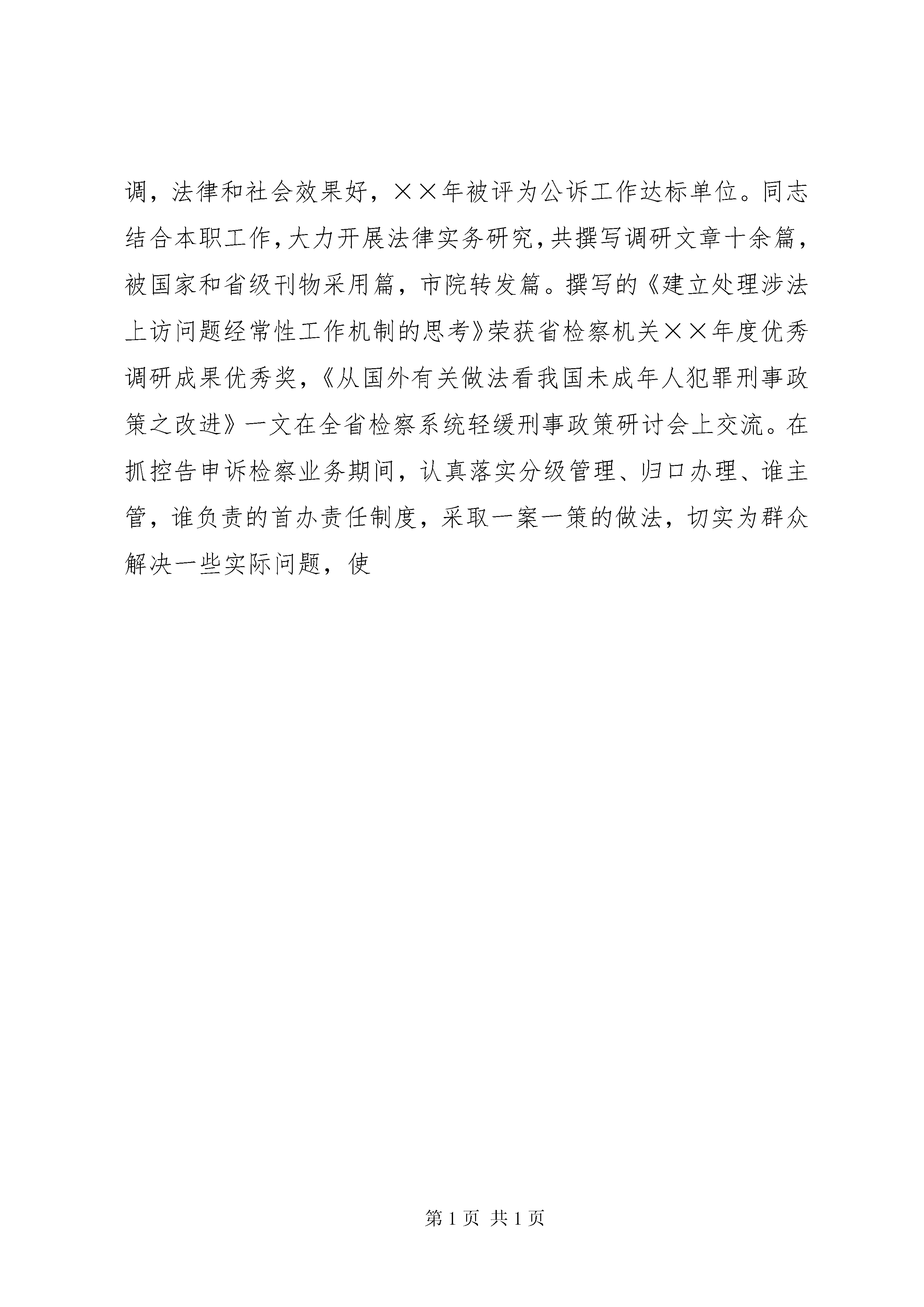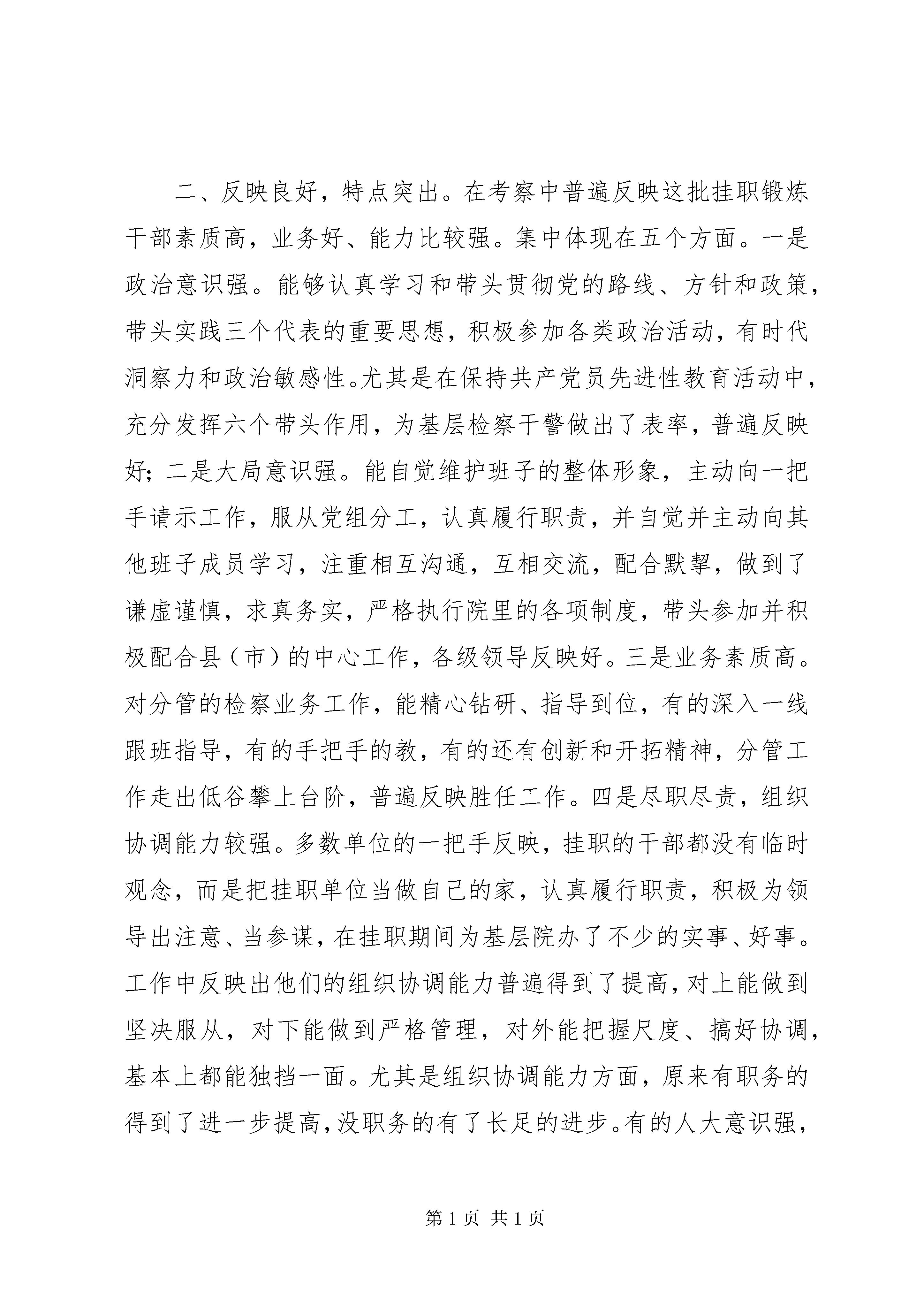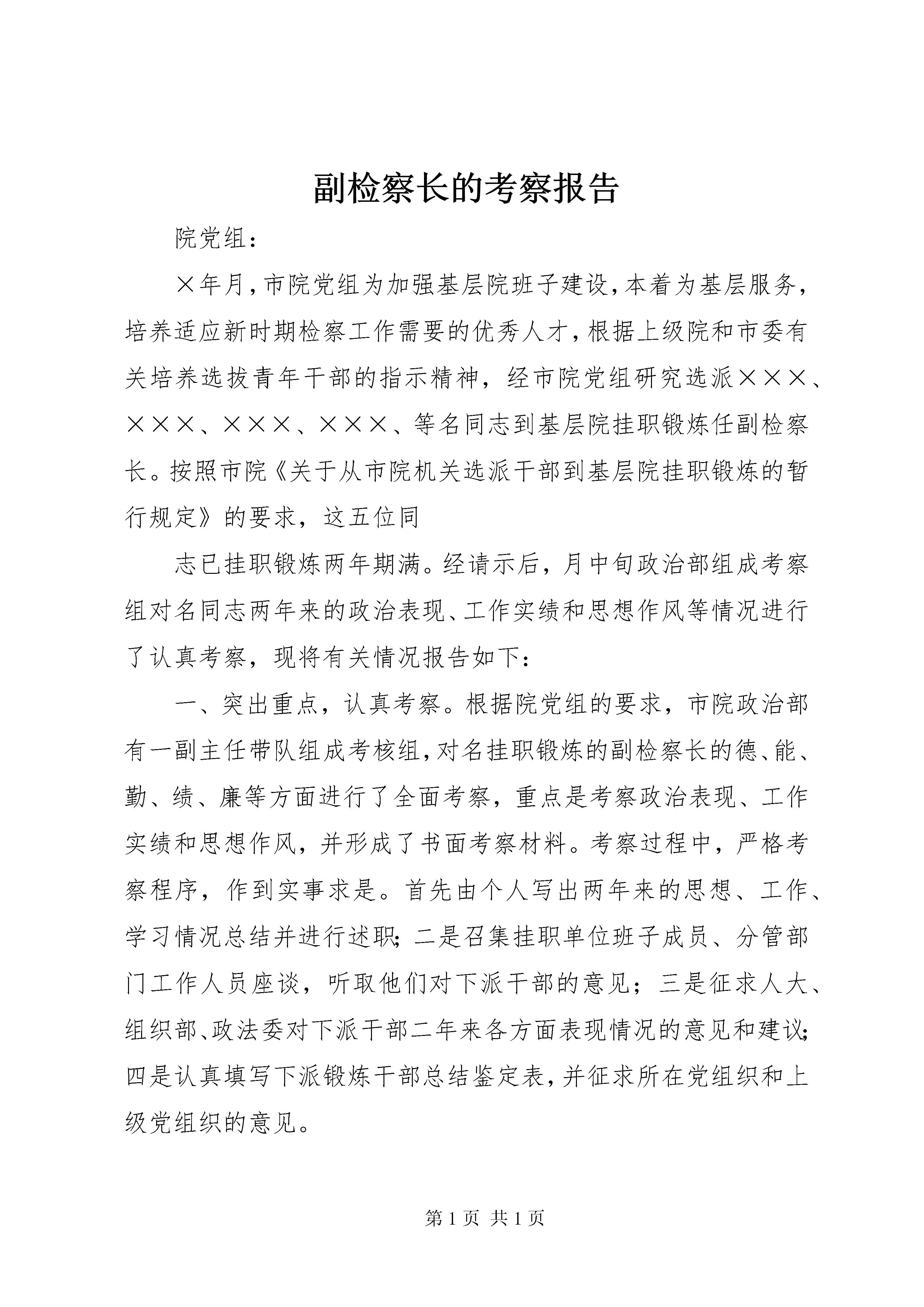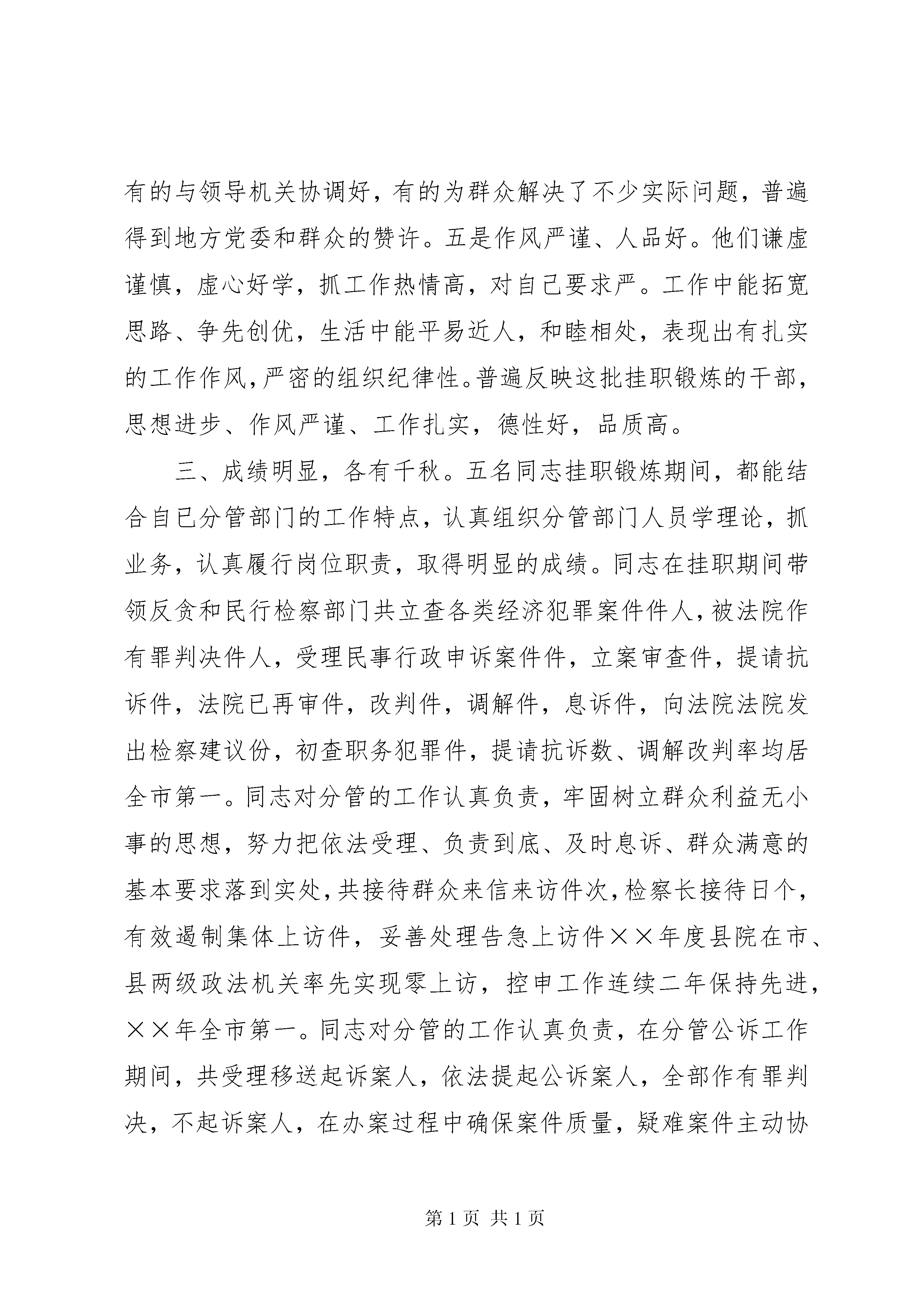 副检察长的考察报告院党组:×年月,市院党组为加强基层院班子建设,本着为基层服务,培养适应新时期检察工作需要的优秀人才,根据上级院和市委有关培养选拔青年干部的指示精神,经市院党组研究选派×××、×××、×××、×××、等名同志到基层院挂职锻炼任副检察长。按照市院《关于从市院机关选派干部到基层院挂职锻炼的暂行规定》的要求,这五位同志已挂职锻炼两年期满。经请示后,月中旬政治部组成考察组对名同志两年来的政治表现、工作实绩和思想作风等情况进行了认真考察,现将有关情况报告如下:一、突出重点,认真考察。根据院党组的要求,市院政治部有一副主任带队组成考核组,对名挂职锻炼的副检察长的德、能、勤、绩、廉等方面进行了全面考察,重点是考察政治表现、工作实绩和思想作风,并形成了书面考察材料。考察过程中,严格考察程序,作到实事求是。首先由个人写出两年来的思想、工作、学习情况总结并进行述职;二是召集挂职单位班子成员、分管部门工作人员座谈,听取他们对下派干部的意见;三是征求人大、组织部、政法委对下派干部二年来各方面表现情况的意见和建议;四是认真填写下派锻炼干部总结鉴定表,并征求所在党组织和上级党组织的意见。二、反映良好,特点突出。在考察中普遍反映这批挂职锻炼干部素质高,业务好、能力比较强。集中体现在五个方面。一是政治意识强。能够认真学习和带头贯彻党的路线、方针和政策,带头实践三个代表的重要思想,积极参加各类政治活动,有时代洞察力和政治敏感性。尤其是在保持共产党员先进性教育活动中,充分发挥六个带头作用,为基层检察干警做出了表率,普遍反映好;二是大局意识强。能自觉维护班子的整体形象,主动向一把手请示工作,服从党组分工,认真履行职责,并自觉并主动向其他班子成员学习,注重相互沟通,互相交流,配合默挈,做到了谦虚谨慎,求真务实,严格执行院里的各项制度,带头参加并积极配合县(市)的中心工作,各级领导反映好。三是业务素质高。对分管的检察业务工作,能精心钻研、指导到位,有的深入一线跟班指导,有的手把手的教,有的还有创新和开拓精神,分管工作走出低谷攀上台阶,普遍反映胜任工作。四是尽职尽责,组织协调能力较强。多数单位的一把手反映,挂职的干部都没有临时观念,而是把挂职单位当做自己的家,认真履行职责,积极为领导出注意、当参谋,在挂职期间为基层院办了不少的实事、好事。工作中反映出他们的组织协调能力普遍得到了提高,对上能做到坚决服从,对下能做到严格管理,对外能把握尺度、搞好协调,基本上都能独挡一面。尤其是组织协调能力方面,原来有职务的得到了进一步提高,没职务的有了长足的进步。有的人大意识强,有的与领导机关协调好,有的为群众解决了不少实际问题,普遍得到地方党委和群众的赞许。五是作风严谨、人品好。他们谦虚谨慎,虚心好学,抓工作热情高,对自己要求严。工作中能拓宽思路、争先创优,生活中能平易近人,和睦相处,表现出有扎实的工作作风,严密的组织纪律性。普遍反映这批挂职锻炼的干部,思想进步、作风严谨、工作扎实,德性好,品质高。三、成绩明显,各有千秋。五名同志挂职锻炼期间,都能结合自已分管部门的工作特点,认真组织分管部门人员学理论,抓业务,认真履行岗位职责,取得明显的成绩。同志在挂职期间带领反贪和民行检察部门共立查各类经济犯罪案件件人,被法院作有罪判决件人,受理民事行政申诉案件件,立案审查件,提请抗诉件,法院已再审件,改判件,调解件,息诉件,向法院法院发出检察建议份,初查职务犯罪件,提请抗诉数、调解改判率均居全市第一。同志对分管的工作认真负责,牢固树立群众利益无小事的思想,努力把依法受理、负责到底、及时息诉、群众满意的基本要求落到实处,共接待群众来信来访件次,检察长接待日个,有效遏制集体上访件,妥善处理告急上访件××年度县院在市、县两级政法机关率先实现零上访,控申工作连续二年保持先进,××年全市第一。同志对分管的工作认真负责,在分管公诉工作期间,共受理移送起诉案人,依法提起公诉案人,全部作有罪判决,不起诉案人,在办案过程中确保案件质量,疑难案件主动协调,法律和社会效果好,××年被评为公诉工作达标单位。同志结合本职工作,大力开展法律实务研究,共撰写调研文章十余篇,被国家和省级刊物采用篇,市院转发篇。撰写的《建立处理涉法上访问题经常性工作机制的思考》荣获省检察机关××年度优秀调研成果优秀奖,《从国外有关做法看我国未成年人犯罪刑事政策之改进》一文在全省检察系统轻缓刑事政策研讨会上交流。在抓控告申诉检察业务期间,认真落实分级管理、归口办理、谁主管,谁负责的首办责任制度,采取一案一策的做法,切实为群众解决一些实际问题,使