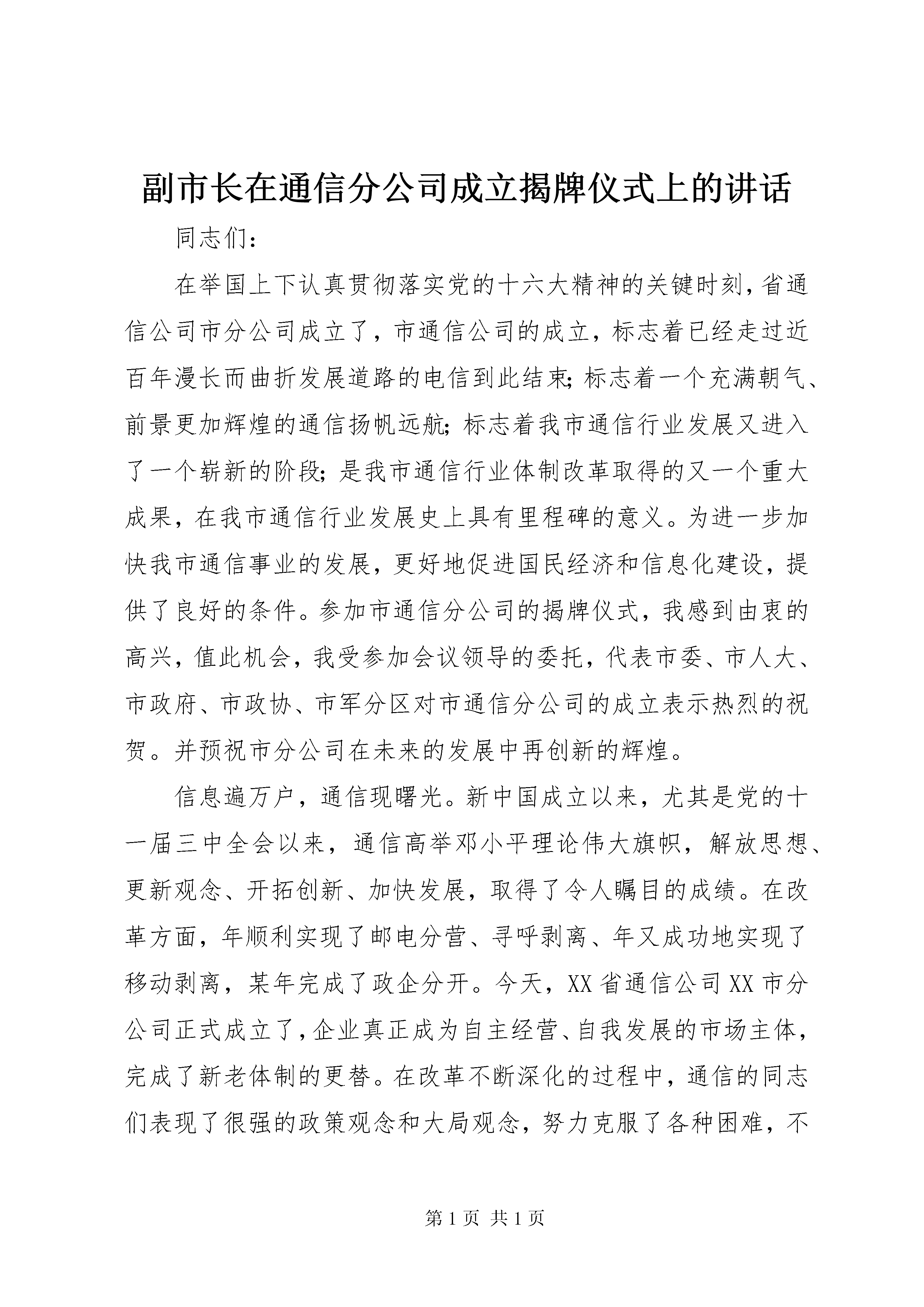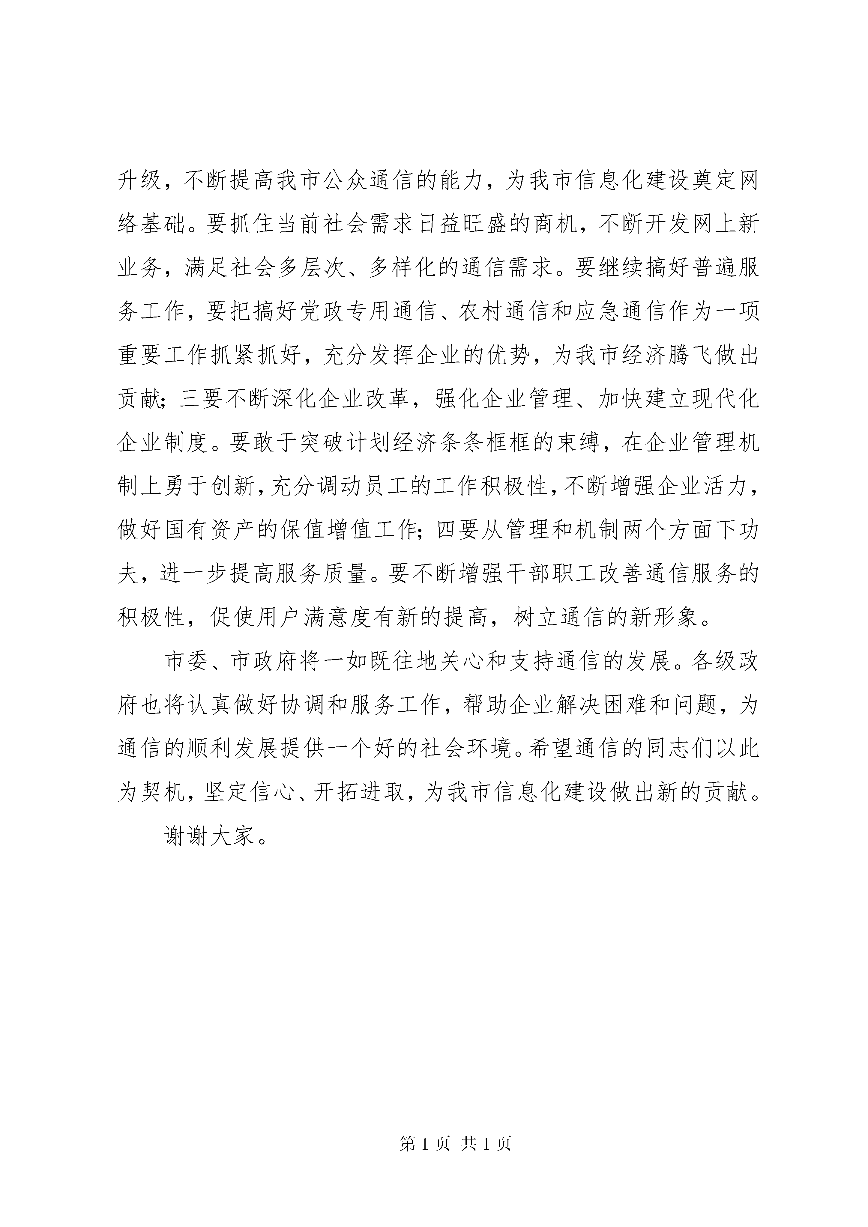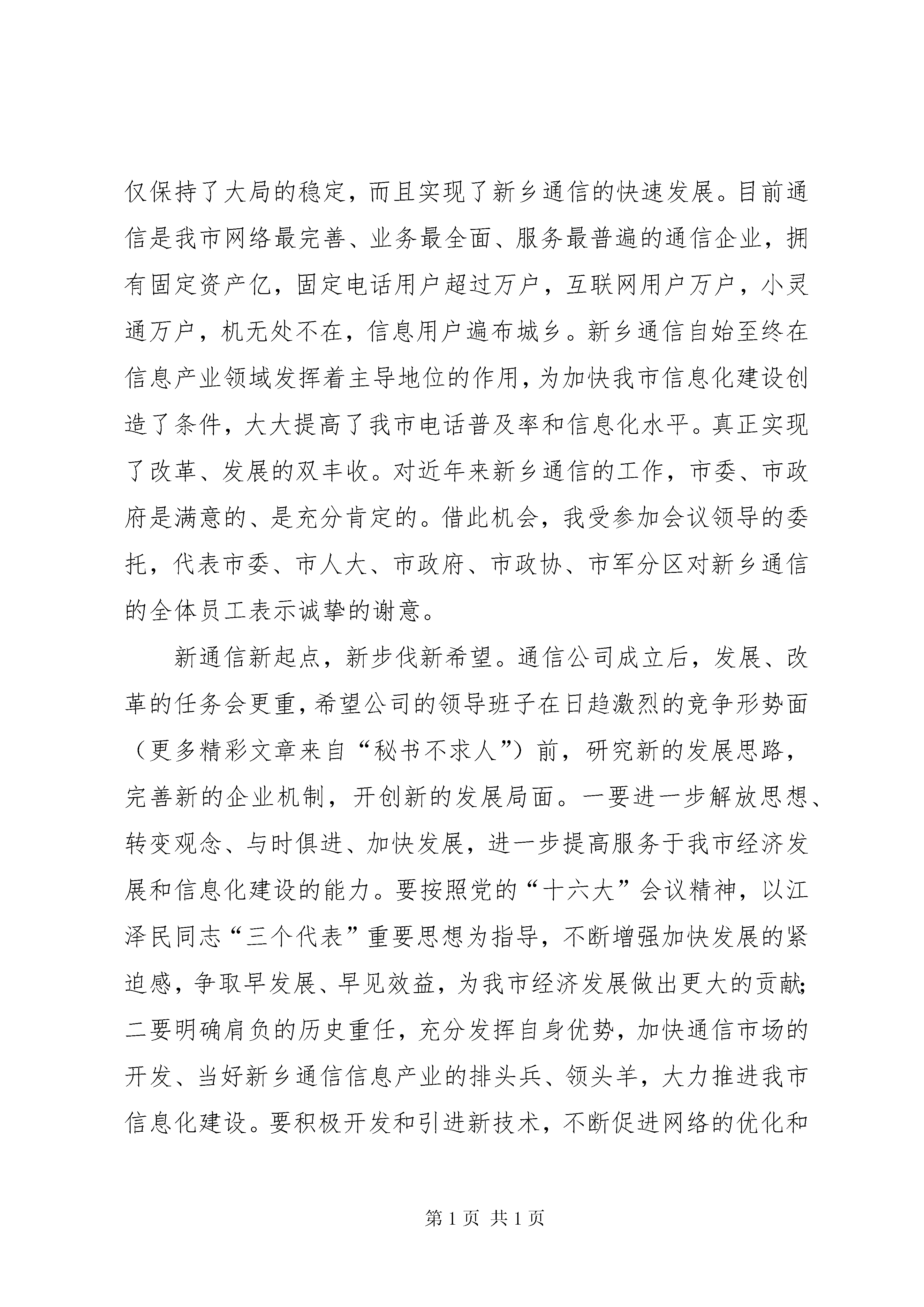 副市长在通信分公司成立揭牌仪式上的讲话同志们:在举国上下认真贯彻落实党的十六大精神的关键时刻,省通信公司市分公司成立了,市通信公司的成立,标志着已经走过近百年漫长而曲折发展道路的电信到此结束;标志着一个充满朝气、前景更加辉煌的通信扬帆远航;标志着我市通信行业发展又进入了一个崭新的阶段;是我市通信行业体制改革取得的又一个重大成果,在我市通信行业发展史上具有里程碑的意义。为进一步加快我市通信事业的发展,更好地促进国民经济和信息化建设,提供了良好的条件。参加市通信分公司的揭牌仪式,我感到由衷的高兴,值此机会,我受参加会议领导的委托,代表市委、市人大、市政府、市政协、市军分区对市通信分公司的成立表示热烈的祝贺。并预祝市分公司在未来的发展中再创新的辉煌。信息遍万户,通信现曙光。新中国成立以来,尤其是党的十一届三中全会以来,通信高举邓小平理论伟大旗帜,解放思想、更新观念、开拓创新、加快发展,取得了令人瞩目的成绩。在改革方面,年顺利实现了邮电分营、寻呼剥离、年又成功地实现了移动剥离,某年完成了政企分开。今天,XX省通信公司XX市分公司正式成立了,企业真正成为自主经营、自我发展的市场主体,完成了新老体制的更替。在改革不断深化的过程中,通信的同志们表现了很强的政策观念和大局观念,努力克服了各种困难,不仅保持了大局的稳定,而且实现了新乡通信的快速发展。目前通信是我市网络最完善、业务最全面、服务最普遍的通信企业,拥有固定资产亿,固定电话用户超过万户,互联网用户万户,小灵通万户,机无处不在,信息用户遍布城乡。新乡通信自始至终在信息产业领域发挥着主导地位的作用,为加快我市信息化建设创造了条件,大大提高了我市电话普及率和信息化水平。真正实现了改革、发展的双丰收。对近年来新乡通信的工作,市委、市政府是满意的、是充分肯定的。借此机会,我受参加会议领导的委托,代表市委、市人大、市政府、市政协、市军分区对新乡通信的全体员工表示诚挚的谢意。新通信新起点,新步伐新希望。通信公司成立后,发展、改革的任务会更重,希望公司的领导班子在日趋激烈的竞争形势面(更多精彩文章来自“秘书不求人”)前,研究新的发展思路,完善新的企业机制,开创新的发展局面。一要进一步解放思想、转变观念、与时俱进、加快发展,进一步提高服务于我市经济发展和信息化建设的能力。要按照党的“十六大”会议精神,以江泽民同志“三个代表”重要思想为指导,不断增强加快发展的紧迫感,争取早发展、早见效益,为我市经济发展做出更大的贡献;二要明确肩负的历史重任,充分发挥自身优势,加快通信市场的开发、当好新乡通信信息产业的排头兵、领头羊,大力推进我市信息化建设。要积极开发和引进新技术,不断促进网络的优化和升级,不断提高我市公众通信的能力,为我市信息化建设奠定网络基础。要抓住当前社会需求日益旺盛的商机,不断开发网上新业务,满足社会多层次、多样化的通信需求。要继续搞好普遍服务工作,要把搞好党政专用通信、农村通信和应急通信作为一项重要工作抓紧抓好,充分发挥企业的优势,为我市经济腾飞做出贡献;三要不断深化企业改革,强化企业管理、加快建立现代化企业制度。要敢于突破计划经济条条框框的束缚,在企业管理机制上勇于创新,充分调动员工的工作积极性,不断增强企业活力,做好国有资产的保值增值工作;四要从管理和机制两个方面下功夫,进一步提高服务质量。要不断增强干部职工改善通信服务的积极性,促使用户满意度有新的提高,树立通信的新形象。市委、市政府将一如既往地关心和支持通信的发展。各级政府也将认真做好协调和服务工作,帮助企业解决困难和问题,为通信的顺利发展提供一个好的社会环境。希望通信的同志们以此为契机,坚定信心、开拓进取,为我市信息化建设做出新的贡献。谢谢大家。