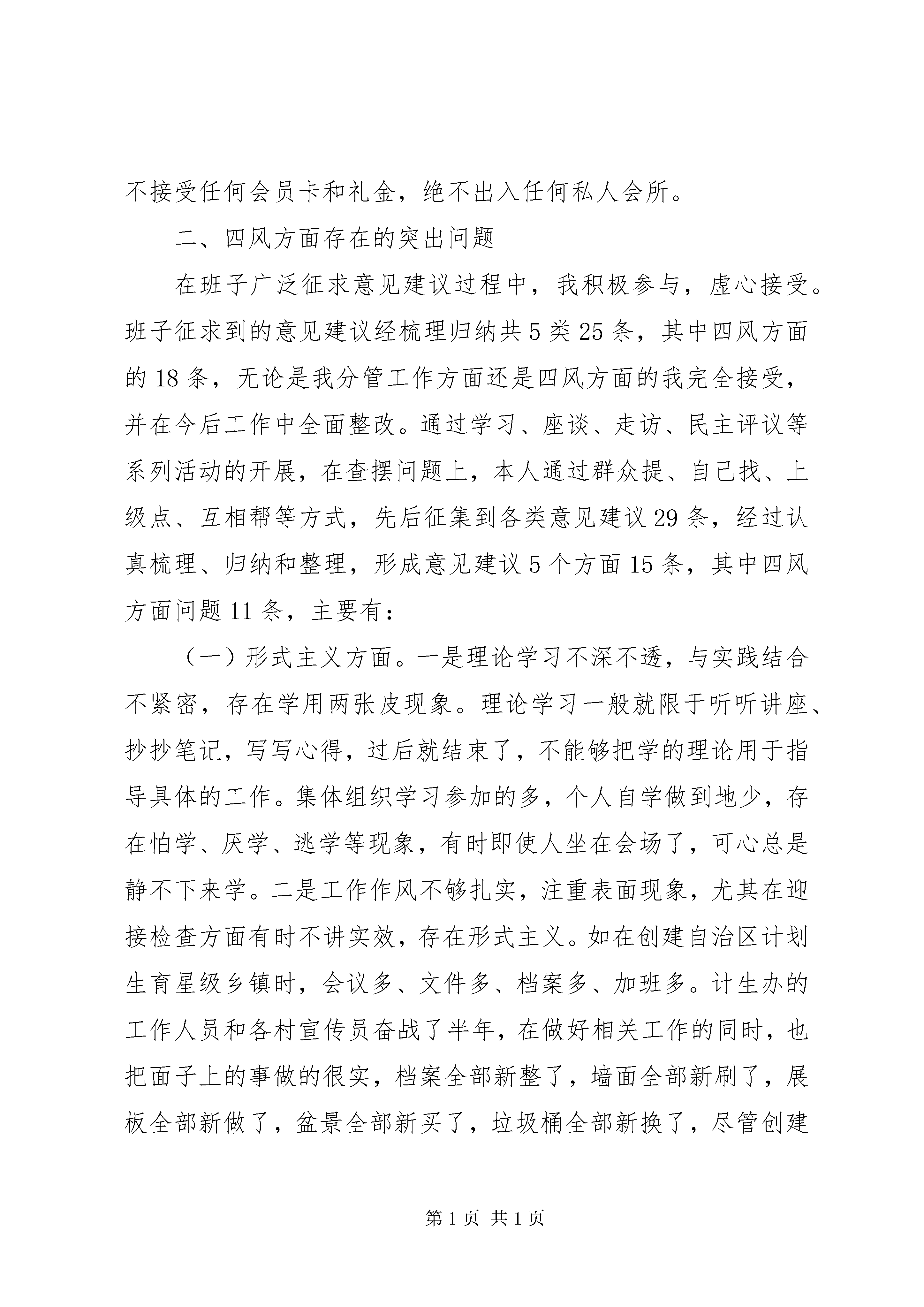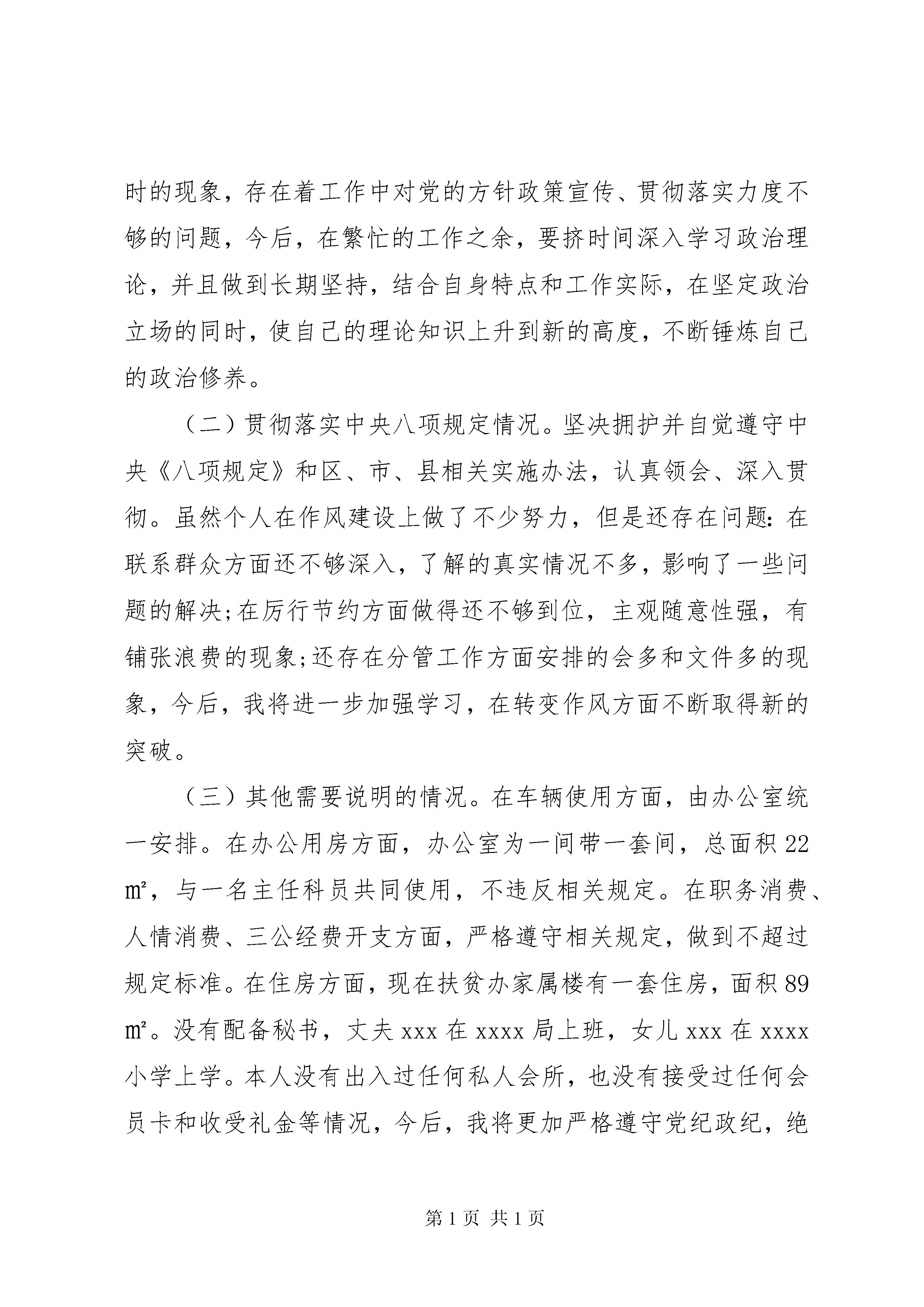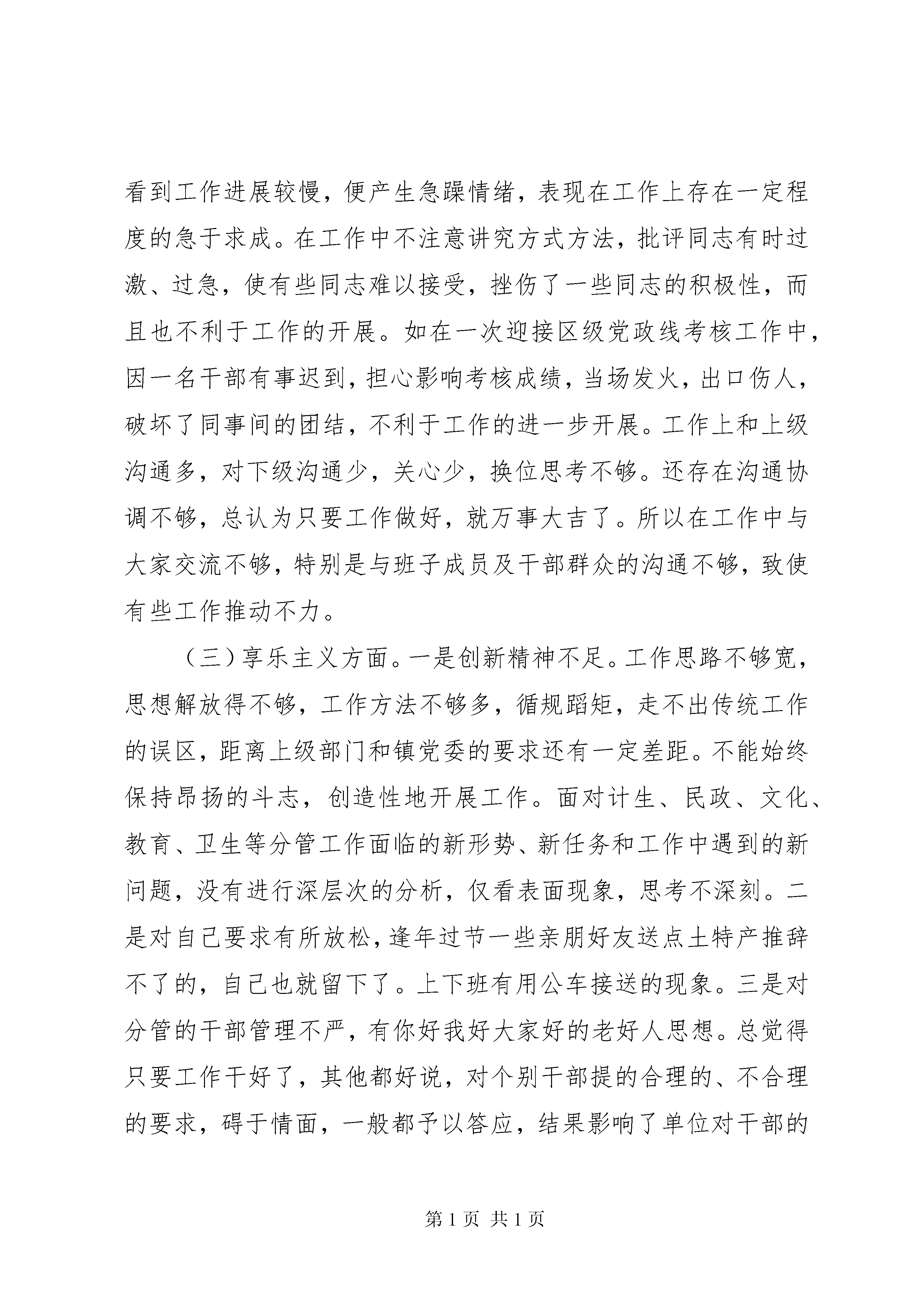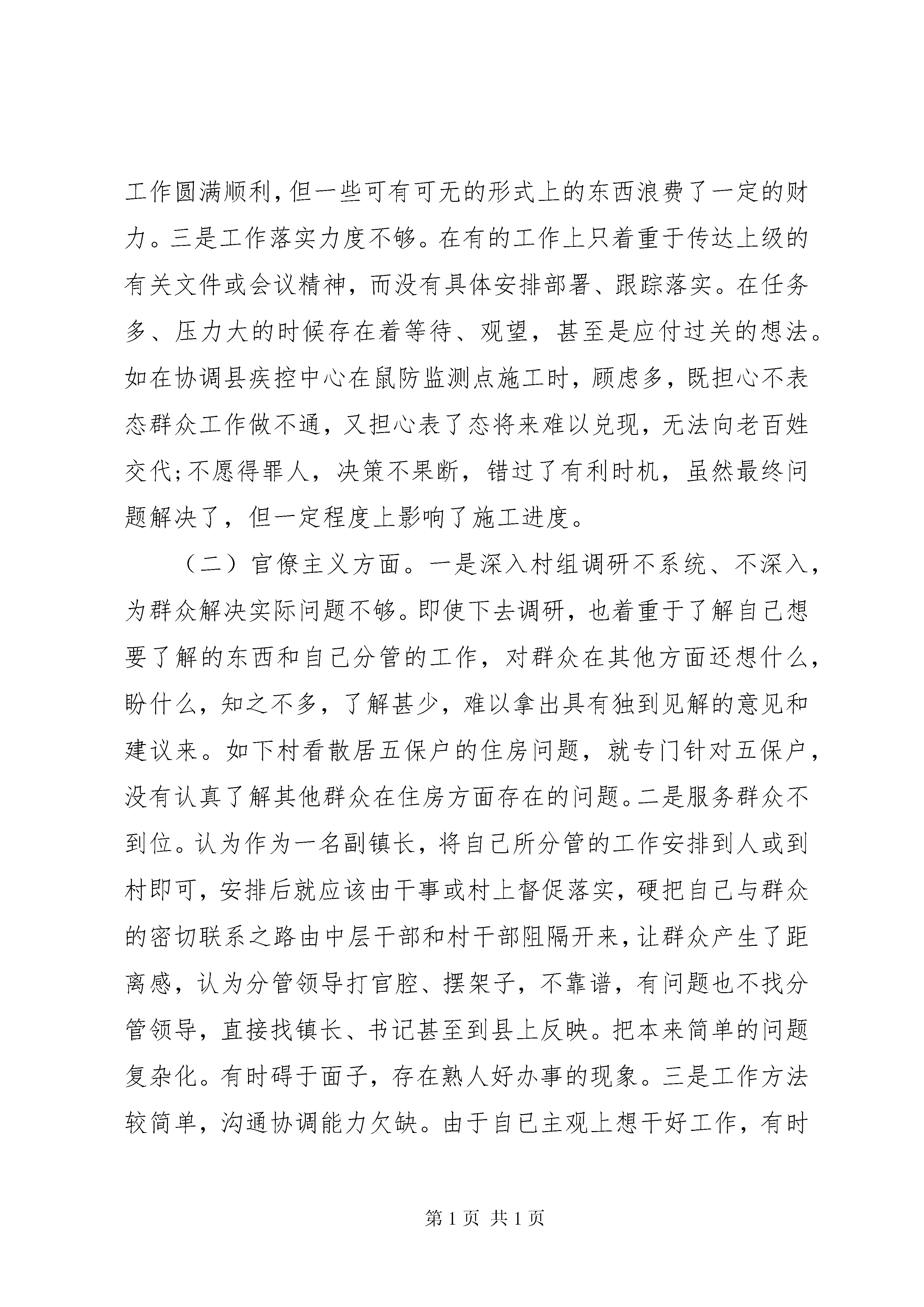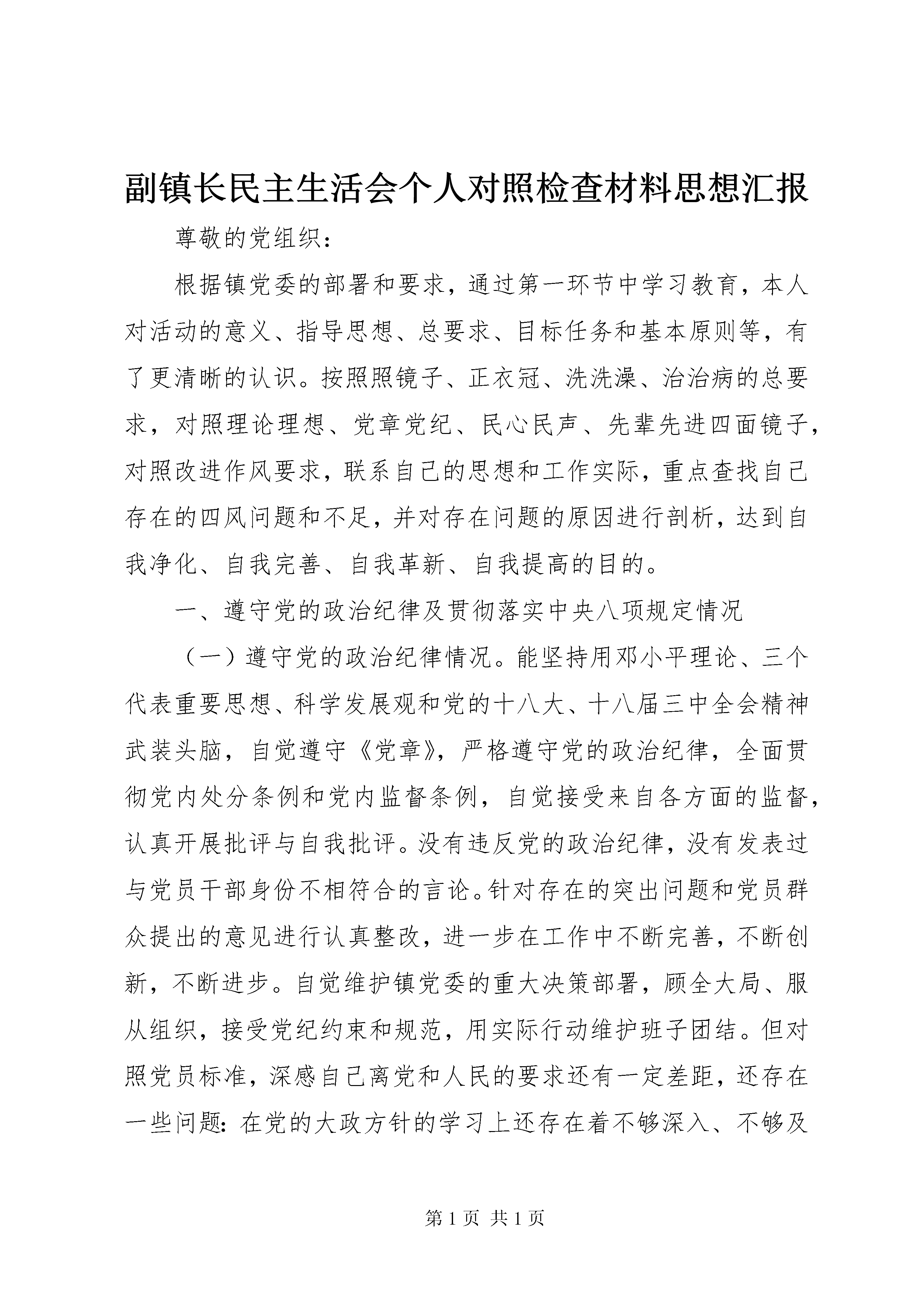 副镇长民主生活会个人对照检查材料思想汇报尊敬的党组织:根据镇党委的部署和要求,通过第一环节中学习教育,本人对活动的意义、指导思想、总要求、目标任务和基本原则等,有了更清晰的认识。按照照镜子、正衣冠、洗洗澡、治治病的总要求,对照理论理想、党章党纪、民心民声、先辈先进四面镜子,对照改进作风要求,联系自己的思想和工作实际,重点查找自己存在的四风问题和不足,并对存在问题的原因进行剖析,达到自我净化、自我完善、自我革新、自我提高的目的。一、遵守党的政治纪律及贯彻落实中央八项规定情况(一)遵守党的政治纪律情况。能坚持用邓小平理论、三个代表重要思想、科学发展观和党的十八大、十八届三中全会精神武装头脑,自觉遵守《党章》,严格遵守党的政治纪律,全面贯彻党内处分条例和党内监督条例,自觉接受来自各方面的监督,认真开展批评与自我批评。没有违反党的政治纪律,没有发表过与党员干部身份不相符合的言论。针对存在的突出问题和党员群众提出的意见进行认真整改,进一步在工作中不断完善,不断创新,不断进步。自觉维护镇党委的重大决策部署,顾全大局、服从组织,接受党纪约束和规范,用实际行动维护班子团结。但对照党员标准,深感自己离党和人民的要求还有一定差距,还存在一些问题:在党的大政方针的学习上还存在着不够深入、不够及时的现象,存在着工作中对党的方针政策宣传、贯彻落实力度不够的问题,今后,在繁忙的工作之余,要挤时间深入学习政治理论,并且做到长期坚持,结合自身特点和工作实际,在坚定政治立场的同时,使自己的理论知识上升到新的高度,不断锤炼自己的政治修养。(二)贯彻落实中央八项规定情况。坚决拥护并自觉遵守中央《八项规定》和区、市、县相关实施办法,认真领会、深入贯彻。虽然个人在作风建设上做了不少努力,但是还存在问题:在联系群众方面还不够深入,了解的真实情况不多,影响了一些问题的解决;在厉行节约方面做得还不够到位,主观随意性强,有铺张浪费的现象;还存在分管工作方面安排的会多和文件多的现象,今后,我将进一步加强学习,在转变作风方面不断取得新的突破。(三)其他需要说明的情况。在车辆使用方面,由办公室统一安排。在办公用房方面,办公室为一间带一套间,总面积22㎡,与一名主任科员共同使用,不违反相关规定。在职务消费、人情消费、三公经费开支方面,严格遵守相关规定,做到不超过规定标准。在住房方面,现在扶贫办家属楼有一套住房,面积89㎡。没有配备秘书,丈夫xxx在xxxx局上班,女儿xxx在xxxx小学上学。本人没有出入过任何私人会所,也没有接受过任何会员卡和收受礼金等情况,今后,我将更加严格遵守党纪政纪,绝不接受任何会员卡和礼金,绝不出入任何私人会所。二、四风方面存在的突出问题在班子广泛征求意见建议过程中,我积极参与,虚心接受。班子征求到的意见建议经梳理归纳共5类25条,其中四风方面的18条,无论是我分管工作方面还是四风方面的我完全接受,并在今后工作中全面整改。通过学习、座谈、走访、民主评议等系列活动的开展,在查摆问题上,本人通过群众提、自己找、上级点、互相帮等方式,先后征集到各类意见建议29条,经过认真梳理、归纳和整理,形成意见建议5个方面15条,其中四风方面问题11条,主要有:(一)形式主义方面。一是理论学习不深不透,与实践结合不紧密,存在学用两张皮现象。理论学习一般就限于听听讲座、抄抄笔记,写写心得,过后就结束了,不能够把学的理论用于指导具体的工作。集体组织学习参加的多,个人自学做到地少,存在怕学、厌学、逃学等现象,有时即使人坐在会场了,可心总是静不下来学。二是工作作风不够扎实,注重表面现象,尤其在迎接检查方面有时不讲实效,存在形式主义。如在创建自治区计划生育星级乡镇时,会议多、文件多、档案多、加班多。计生办的工作人员和各村宣传员奋战了半年,在做好相关工作的同时,也把面子上的事做的很实,档案全部新整了,墙面全部新刷了,展板全部新做了,盆景全部新买了,垃圾桶全部新换了,尽管创建工作圆满顺利,但一些可有可无的形式上的东西浪费了一定的财力。三是工作落实力度不够。在有的工作上只着重于传达上级的有关文件或会议精神,而没有具体安排部署、跟踪落实。在任务多、压力大的时候存在着等待、观望,甚至是应付过关的想法。如在协调县疾控中心在鼠防监测点施工时,顾虑多,既担心不表态群众工作做不通,又担心表了态将来难以兑现,无法向老百姓交代;不愿得罪人,决策不果断,错过了有利时机,虽然最终问题解决了,但一定程度上影响了施工进度。(二)官僚主义方面。一是深入村组调研不系统、不深入,为群众解决实际问题不够。即使下去调研,也着重于了解自己想要了解的东西和自己分管的工作,对群众在其他方面还想什么,盼什么,知之不多,了解甚少,难以拿出具有独到见解的意见和建议来。如下村看散居五保户的住房问题,就专门针对五保户