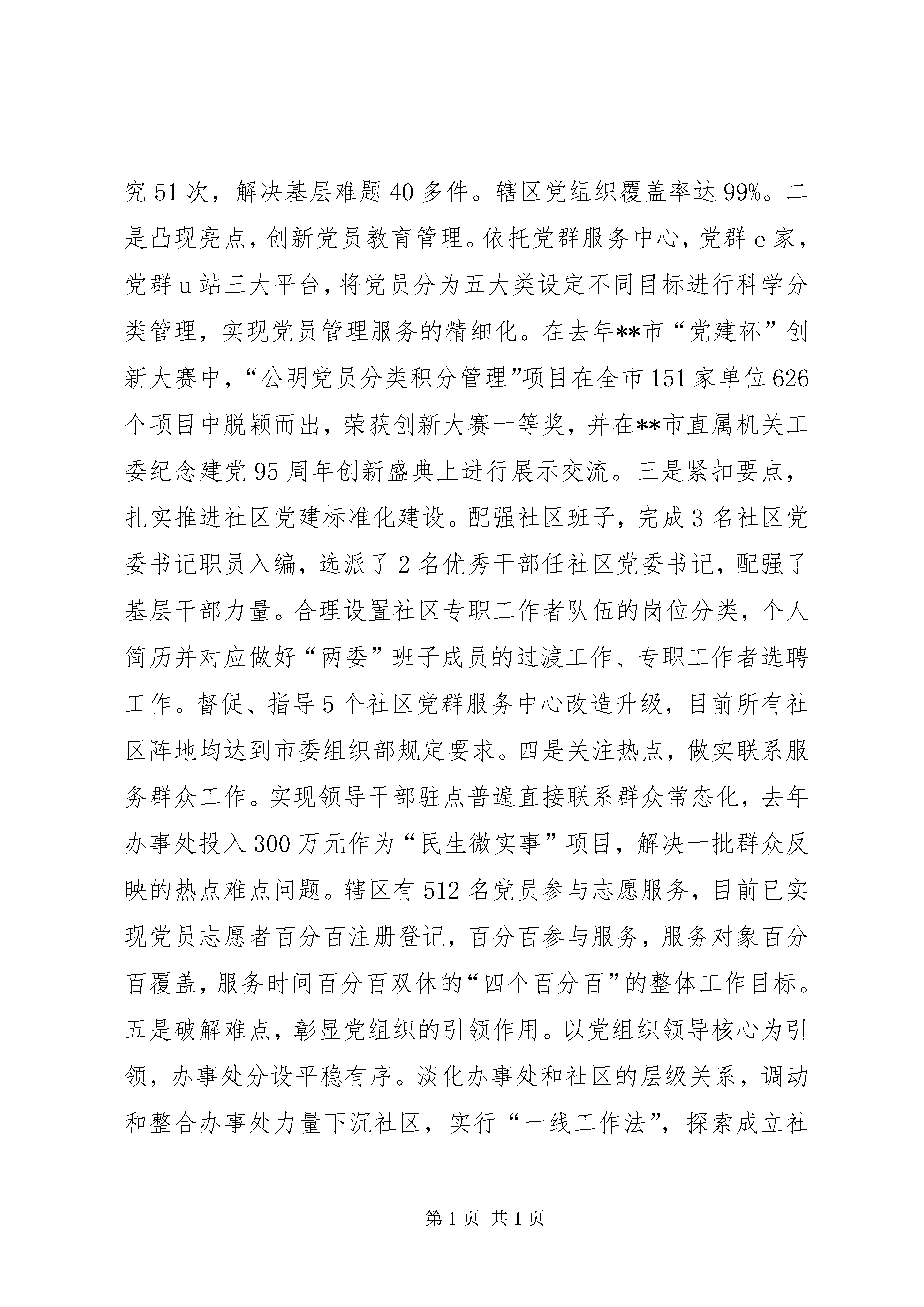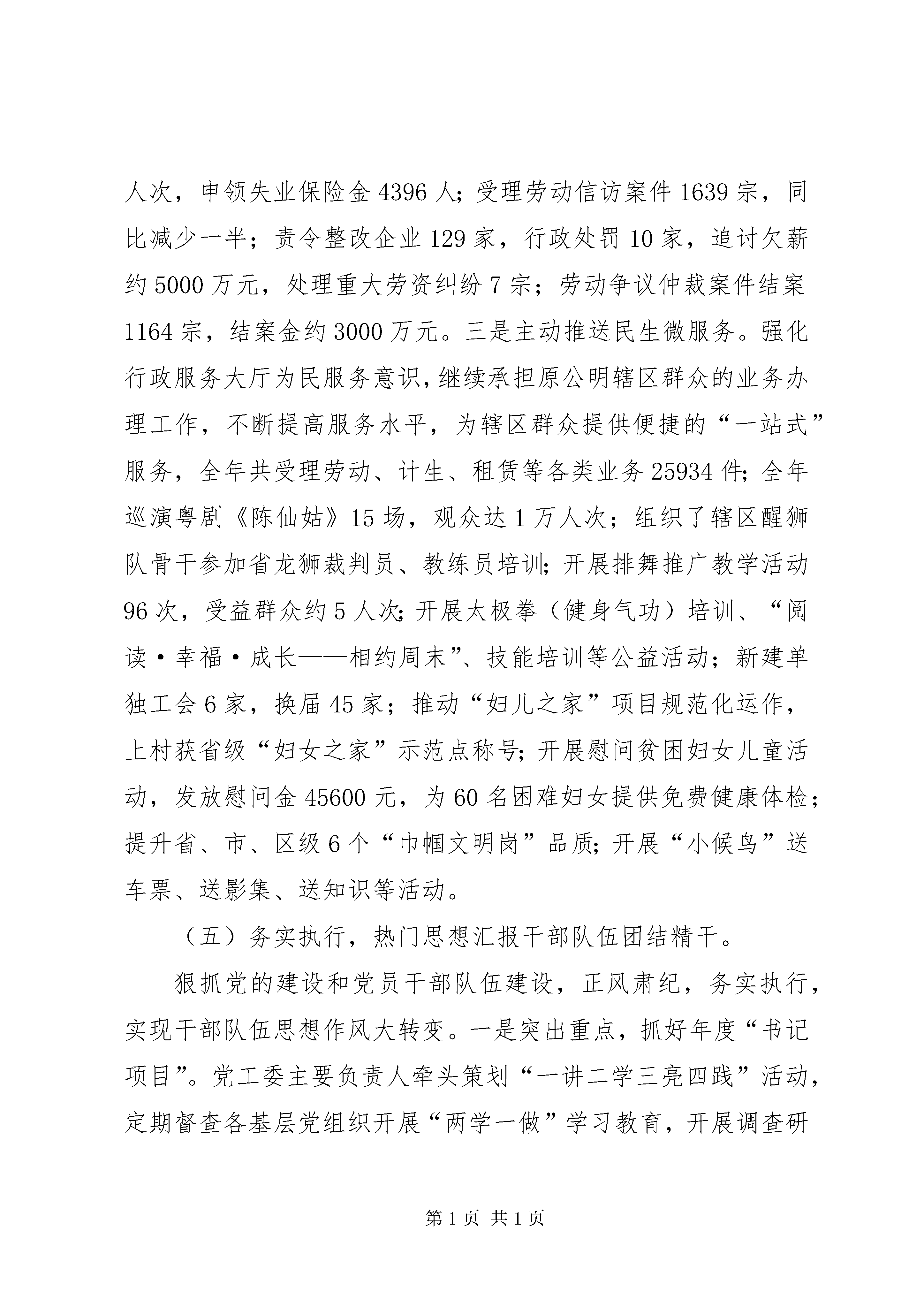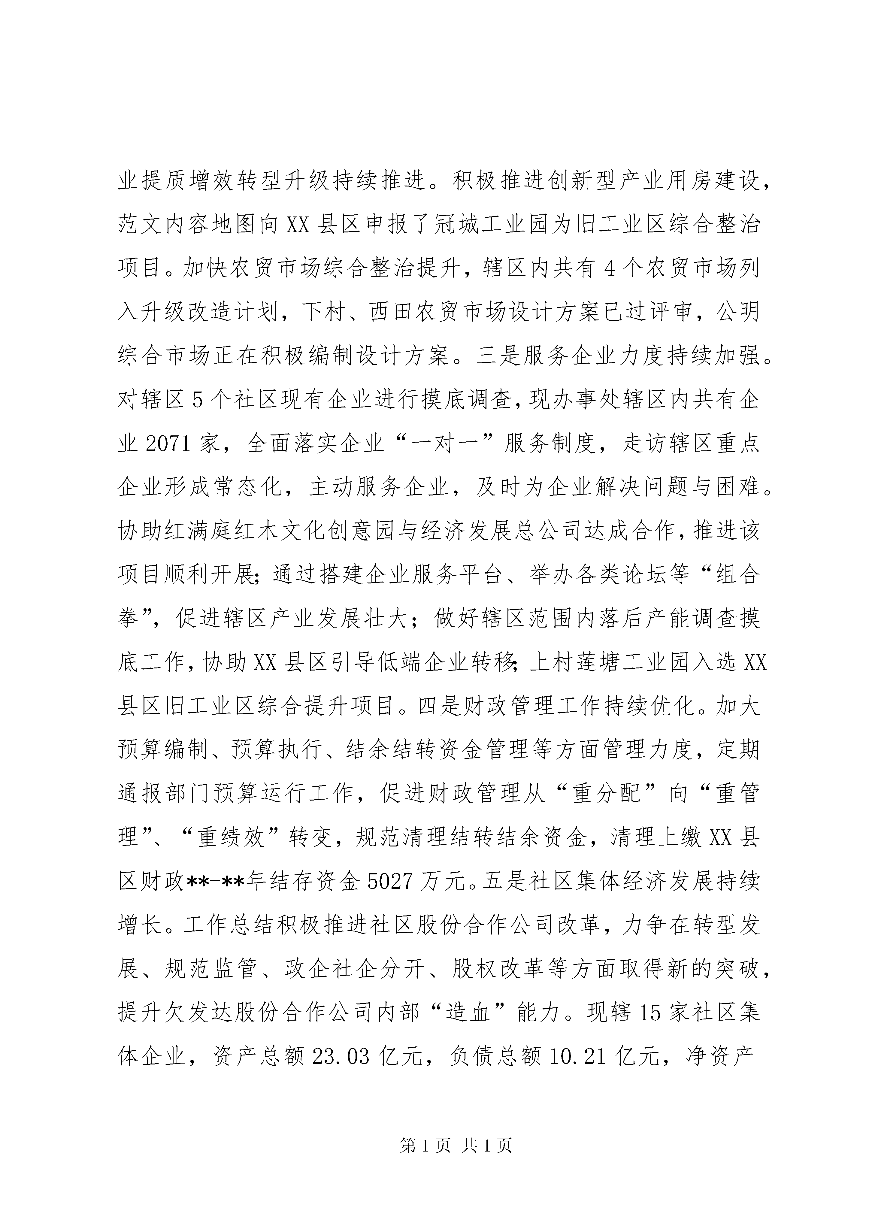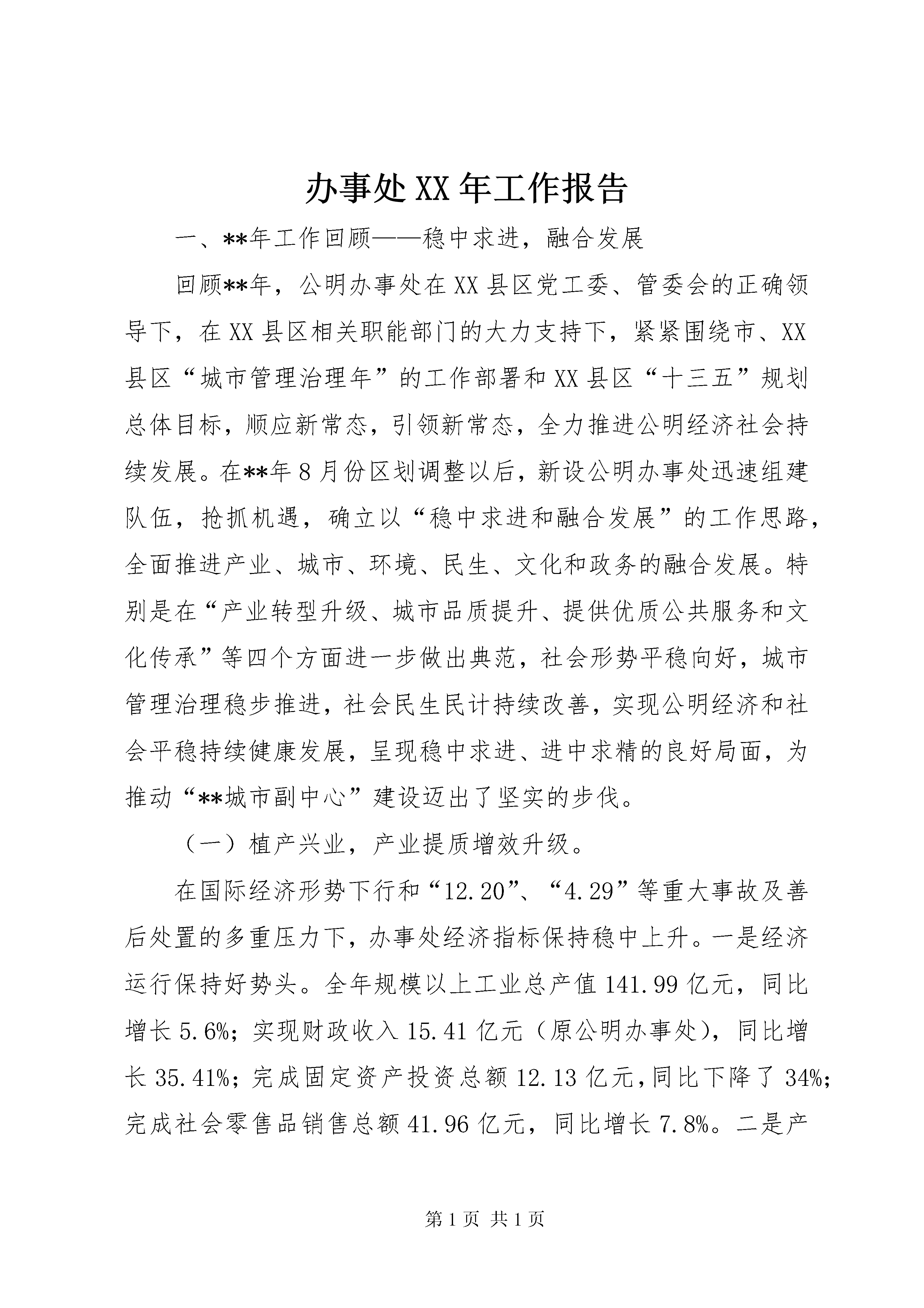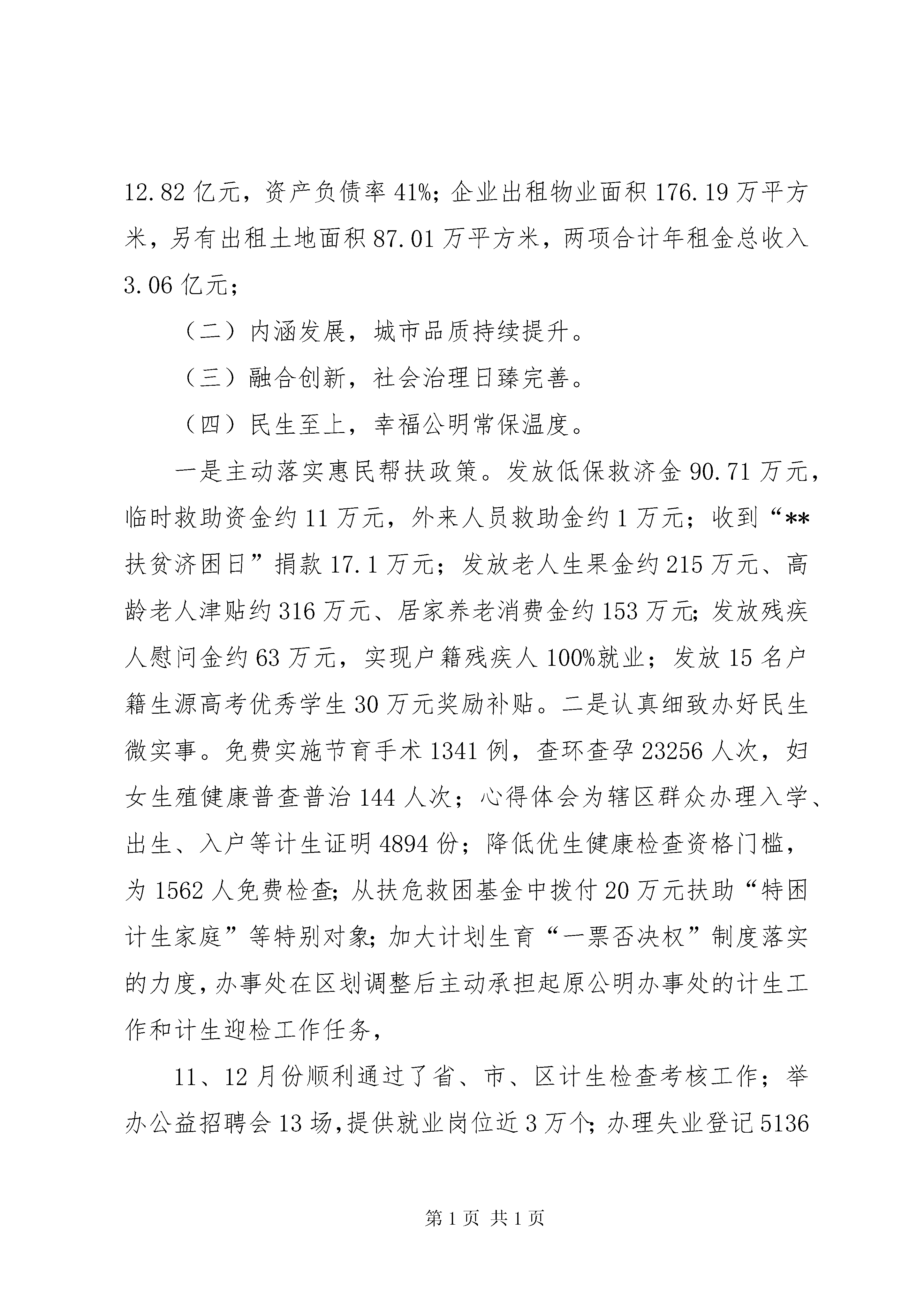 办事处XX年工作报告一、**年工作回顾——稳中求进,融合发展回顾**年,公明办事处在XX县区党工委、管委会的正确领导下,在XX县区相关职能部门的大力支持下,紧紧围绕市、XX县区“城市管理治理年”的工作部署和XX县区“十三五”规划总体目标,顺应新常态,引领新常态,全力推进公明经济社会持续发展。在**年8月份区划调整以后,新设公明办事处迅速组建队伍,抢抓机遇,确立以“稳中求进和融合发展”的工作思路,全面推进产业、城市、环境、民生、文化和政务的融合发展。特别是在“产业转型升级、城市品质提升、提供优质公共服务和文化传承”等四个方面进一步做出典范,社会形势平稳向好,城市管理治理稳步推进,社会民生民计持续改善,实现公明经济和社会平稳持续健康发展,呈现稳中求进、进中求精的良好局面,为推动“**城市副中心”建设迈出了坚实的步伐。(一)植产兴业,产业提质增效升级。在国际经济形势下行和“12.20”、“4.29”等重大事故及善后处置的多重压力下,办事处经济指标保持稳中上升。一是经济运行保持好势头。全年规模以上工业总产值141.99亿元,同比增长5.6%;实现财政收入15.41亿元(原公明办事处),同比增长35.41%;完成固定资产投资总额12.13亿元,同比下降了34%;完成社会零售品销售总额41.96亿元,同比增长7.8%。二是产业提质增效转型升级持续推进。积极推进创新型产业用房建设,范文内容地图向XX县区申报了冠城工业园为旧工业区综合整治项目。加快农贸市场综合整治提升,辖区内共有4个农贸市场列入升级改造计划,下村、西田农贸市场设计方案已过评审,公明综合市场正在积极编制设计方案。三是服务企业力度持续加强。对辖区5个社区现有企业进行摸底调查,现办事处辖区内共有企业2071家,全面落实企业“一对一”服务制度,走访辖区重点企业形成常态化,主动服务企业,及时为企业解决问题与困难。协助红满庭红木文化创意园与经济发展总公司达成合作,推进该项目顺利开展;通过搭建企业服务平台、举办各类论坛等“组合拳”,促进辖区产业发展壮大;做好辖区范围内落后产能调查摸底工作,协助XX县区引导低端企业转移;上村莲塘工业园入选XX县区旧工业区综合提升项目。四是财政管理工作持续优化。加大预算编制、预算执行、结余结转资金管理等方面管理力度,定期通报部门预算运行工作,促进财政管理从“重分配”向“重管理”、“重绩效”转变,规范清理结转结余资金,清理上缴XX县区财政**-**年结存资金5027万元。五是社区集体经济发展持续增长。工作总结积极推进社区股份合作公司改革,力争在转型发展、规范监管、政企社企分开、股权改革等方面取得新的突破,提升欠发达股份合作公司内部“造血”能力。现辖15家社区集体企业,资产总额23.03亿元,负债总额10.21亿元,净资产12.82亿元,资产负债率41%;企业出租物业面积176.19万平方米,另有出租土地面积87.01万平方米,两项合计年租金总收入3.06亿元;(二)内涵发展,城市品质持续提升。(三)融合创新,社会治理日臻完善。(四)民生至上,幸福公明常保温度。一是主动落实惠民帮扶政策。发放低保救济金90.71万元,临时救助资金约11万元,外来人员救助金约1万元;收到“**扶贫济困日”捐款17.1万元;发放老人生果金约215万元、高龄老人津贴约316万元、居家养老消费金约153万元;发放残疾人慰问金约63万元,实现户籍残疾人100%就业;发放15名户籍生源高考优秀学生30万元奖励补贴。二是认真细致办好民生微实事。免费实施节育手术1341例,查环查孕23256人次,妇女生殖健康普查普治144人次;心得体会为辖区群众办理入学、出生、入户等计生证明4894份;降低优生健康检查资格门槛,为1562人免费检查;从扶危救困基金中拨付20万元扶助“特困计生家庭”等特别对象;加大计划生育“一票否决权”制度落实的力度,办事处在区划调整后主动承担起原公明办事处的计生工作和计生迎检工作任务,11、12月份顺利通过了省、市、区计生检查考核工作;举办公益招聘会13场,提供就业岗位近3万个;办理失业登记5136人次,申领失业保险金4396人;受理劳动信访案件1639宗,同比减少一半;责令整改企业129家,行政处罚10家,追讨欠薪约5000万元,处理重大劳资纠纷7宗;劳动争议仲裁案件结案1164宗,结案金约3000万元。三是主动推送民生微服务。强化行政服务大厅为民服务意识,继续承担原公明辖区群众的业务办理工作,不断提高服务水平,为辖区群众提供便捷的“一站式”服务,全年共受理劳动、计生、租赁等各类业务25934件;全年巡演粤剧《陈仙姑》15场,观众达1万人次;组织了辖区醒狮队骨干参加省龙狮裁判员、教练员培训;开展排舞推广教学活动96次,受益群众约5人次;开展太极拳(健身