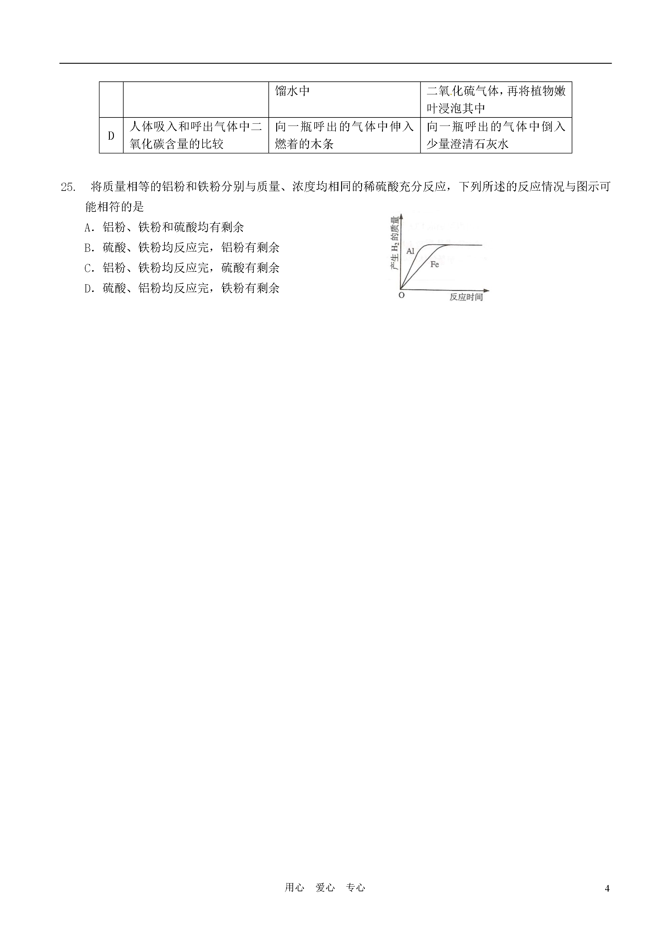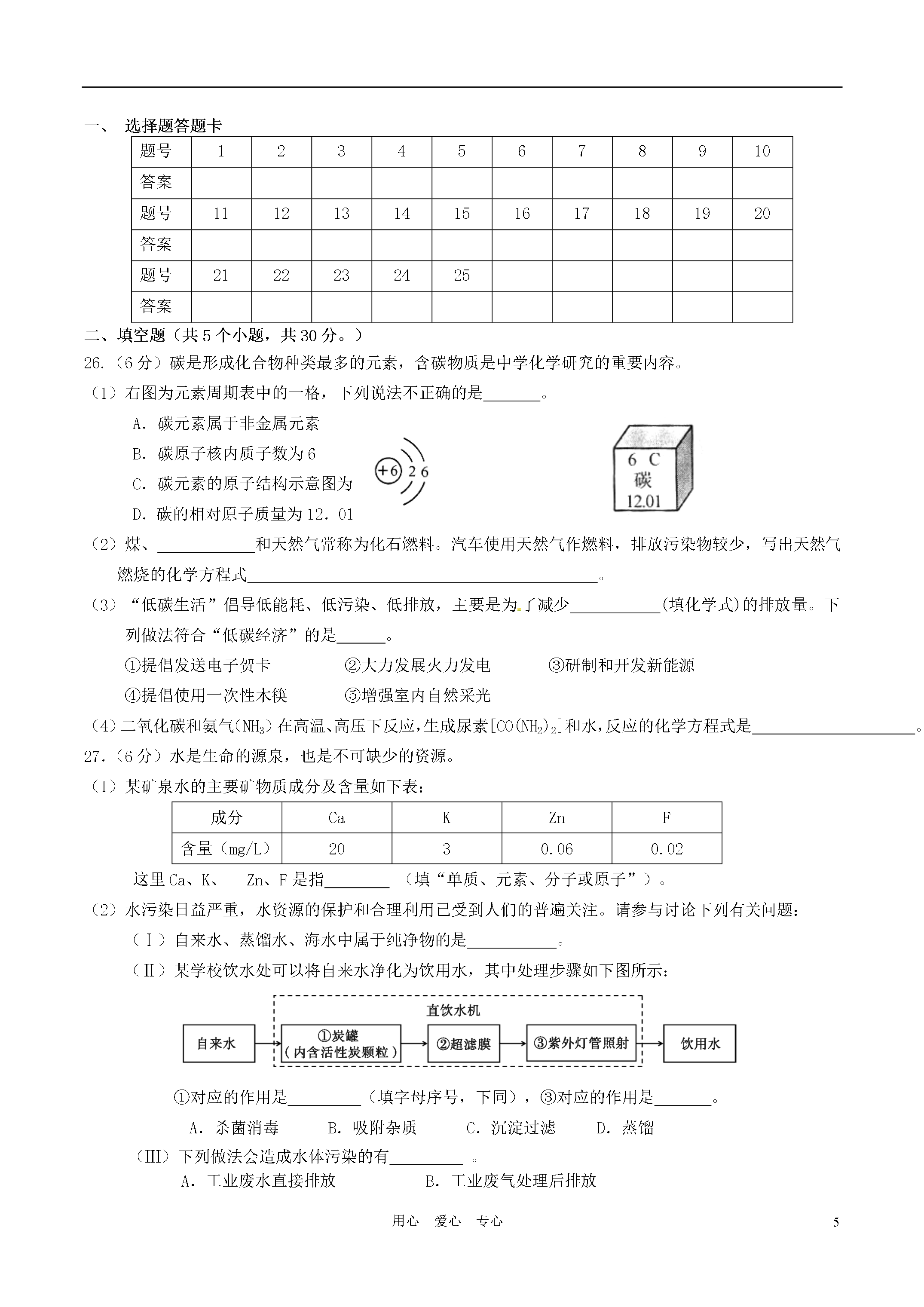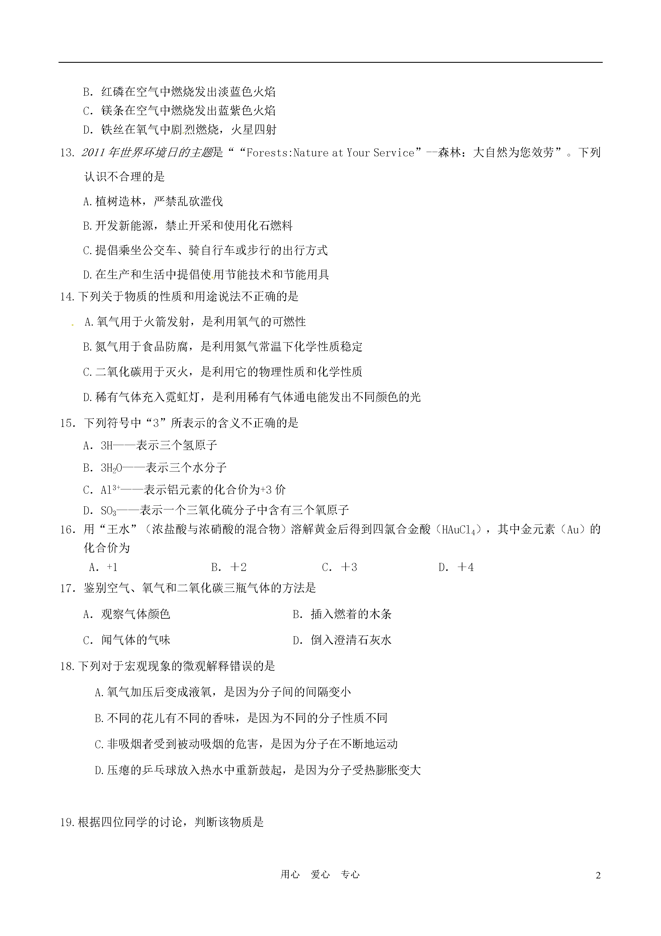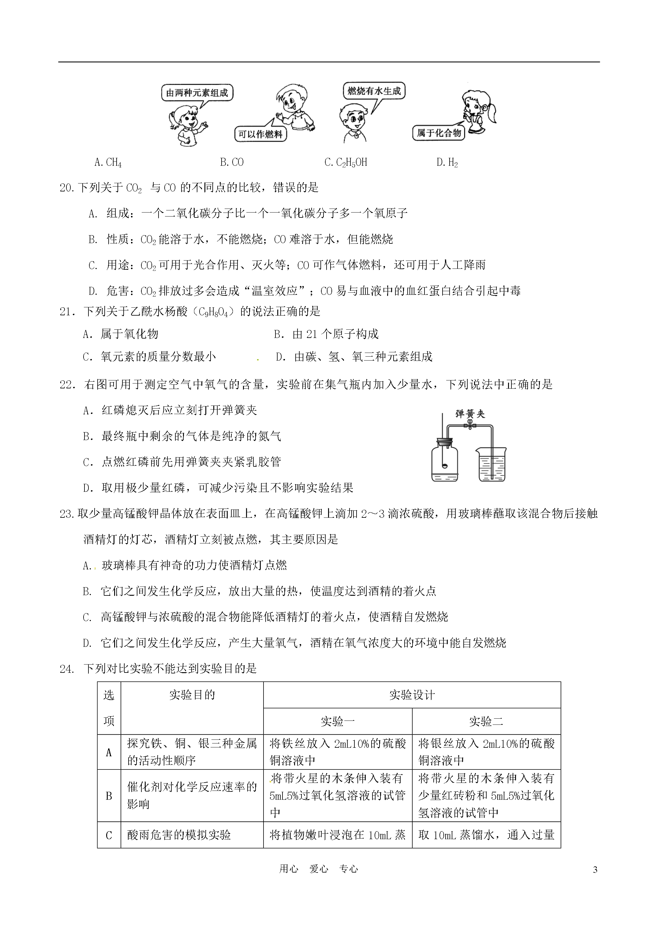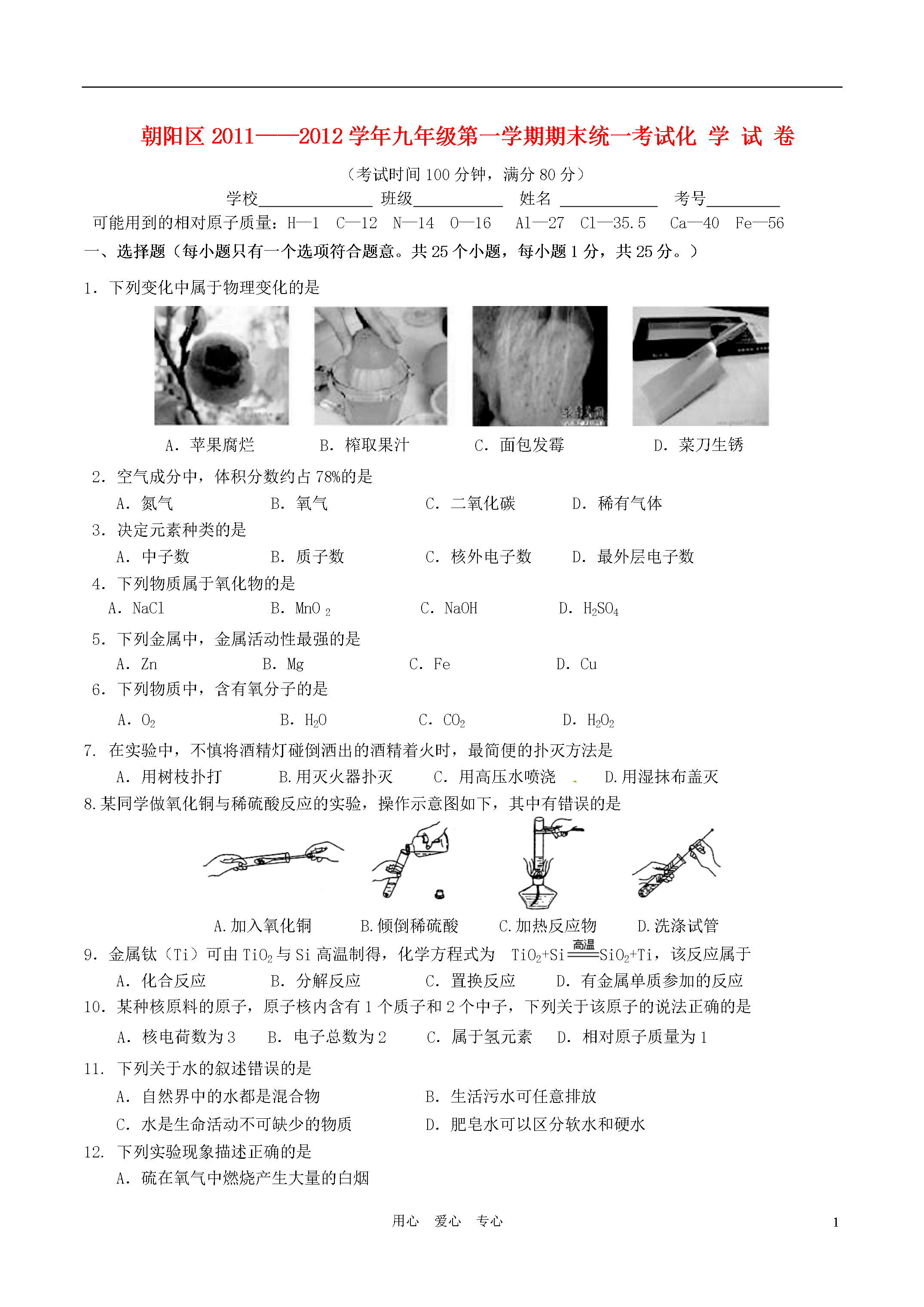 10用心爱心专心朝阳区2011——2012学年九年级第一学期期末统一考试化学试卷(考试时间100分钟,满分80分)学校班级姓名考号可能用到的相对原子质量:H—1C—12N—14O—16Al—27Cl—35.5Ca—40Fe—56一、选择题(每小题只有一个选项符合题意。共25个小题,每小题1分,共25分。)1.下列变化中属于物理变化的是A.苹果腐烂B.榨取果汁C.面包发霉D.菜刀生锈2.空气成分中,体积分数约占78%的是A.氮气B.氧气C.二氧化碳D.稀有气体3.决定元素种类的是A.中子数B.质子数C.核外电子数D.最外层电子数4.下列物质属于氧化物的是A.NaClB.MnO2C.NaOHD.H2SO45.下列金属中,金属活动性最强的是A.ZnB.MgC.FeD.Cu6.下列物质中,含有氧分子的是A.O2B.H2OC.CO2D.H2O27.在实验中,不慎将酒精灯碰倒洒出的酒精着火时,最简便的扑灭方法是A.用树枝扑打B.用灭火器扑灭C.用高压水喷浇D.用湿抹布盖灭8.某同学做氧化铜与稀硫酸反应的实验,操作示意图如下,其中有错误的是A.加入氧化铜B.倾倒稀硫酸C.加热反应物D.洗涤试管9.金属钛(Ti)可由TiO2与Si高温制得,化学方程式为TiO2+SiSiO2+Ti,该反应属于A.化合反应B.分解反应C.置换反应D.有金属单质参加的反应10.某种核原料的原子,原子核内含有1个质子和2个中子,下列关于该原子的说法正确的是A.核电荷数为3B.电子总数为2C.属于氢元素D.相对原子质量为111.下列关于水的叙述错误的是A.自然界中的水都是混合物B.生活污水可任意排放C.水是生命活动不可缺少的物质D.肥皂水可以区分软水和硬水12.下列实验现象描述正确的是A.硫在氧气中燃烧产生大量的白烟B.红磷在空气中燃烧发出淡蓝色火焰C.镁条在空气中燃烧发出蓝紫色火焰D.铁丝在氧气中剧烈燃烧,火星四射13.2011年世界环境日的主题是““Forests:NatureatYourService”--森林:大自然为您效劳”。下列认识不合理的是A.植树造林,严禁乱砍滥伐B.开发新能源,禁止开采和使用化石燃料C.提倡乘坐公交车、骑自行车或步行的出行方式D.在生产和生活中提倡使用节能技术和节能用具14.下列关于物质的性质和用途说法不正确的是A.氧气用于火箭发射,是利用氧气的可燃性B.氮气用于食品防腐,是利用氮气常温下化学性质稳定C.二氧化碳用于灭火,是利用它的物理性质和化学性质D.稀有气体充入霓虹灯,是利用稀有气体通电能发出不同颜色的光15.下列符号中“3”所表示的含义不正确的是A.3H——表示三个氢原子B.3H2O——表示三个水分子C.Al3+——表示铝元素的化合价为+3价D.SO3——表示一个三氧化硫分子中含有三个氧原子16.用“王水”(浓盐酸与浓硝酸的混合物)溶解黄金后得到四氯合金酸(HAuCl4),其中金元素(Au)的化合价为A.+1B.+2C.+3D.+417.鉴别空气、氧气和二氧化碳三瓶气体的方法是A.观察气体颜色B.插入燃着的木条C.闻气体的气味D.倒入澄清石灰水18.下列对于宏观现象的微观解释错误的是A.氧气加压后变成液氧,是因为分子间的间隔变小B.不同的花儿有不同的香味,是因为不同的分子性质不同C.非吸烟者受到被动吸烟的危害,是因为分子在不断地运动D.压瘪的乒乓球放入热水中重新鼓起,是因为分子受热膨胀变大19.根据四位同学的讨论,判断该物质是A.CH4B.COC.C2H5OHD.H220.下列关于CO2与CO的不同点的比较,错误的是A.组成:一个二氧化碳分子比一个一氧化碳分子多一个氧原子B.性质:CO2能溶于水,不能燃烧;CO难溶于水,但能燃烧C.用途:CO2可用于光合作用、灭火等;CO可作气体燃料,还可用于人工降雨D.危害:CO2排放过多会造成“温室效应”;CO易与血液中的血红蛋白结合引起中毒21.下列关于乙酰水杨酸(C9H8O4)的说法正确的是A.属于氧化物B.由21个原子构成C.氧元素的质量分数最小D.由碳、氢、氧三种元素组成22.右图可用于测定空气中氧气的含量,实验前在集气瓶内加入少量水,下列说法中正确的是A.红磷熄灭后应立刻打开弹簧夹B.最终瓶中剩余的气体是纯净的氮气C.点燃红磷前先用弹簧夹夹紧乳胶管D.取用极少量红磷,可减少污染且不影响实验结果23.取少量高锰酸钾晶体放在表面皿上,在高锰酸钾上滴加2~3滴浓硫酸,用玻璃棒蘸取该混合物后接触酒精灯的灯芯,酒精灯立刻被点燃,其主要原因是A.玻璃棒具有神奇的功力使酒精灯点燃B.它们之间发生化学反应,放出大量的热,使温度达到酒精的着火点C.高锰酸钾与浓硫酸的混合物能降低酒精灯的着火点,使酒精自发燃烧D.它们之间发生化学反应,产生大量氧气,酒精在氧气浓度大的环境中能自发燃烧24.下列对比实验不