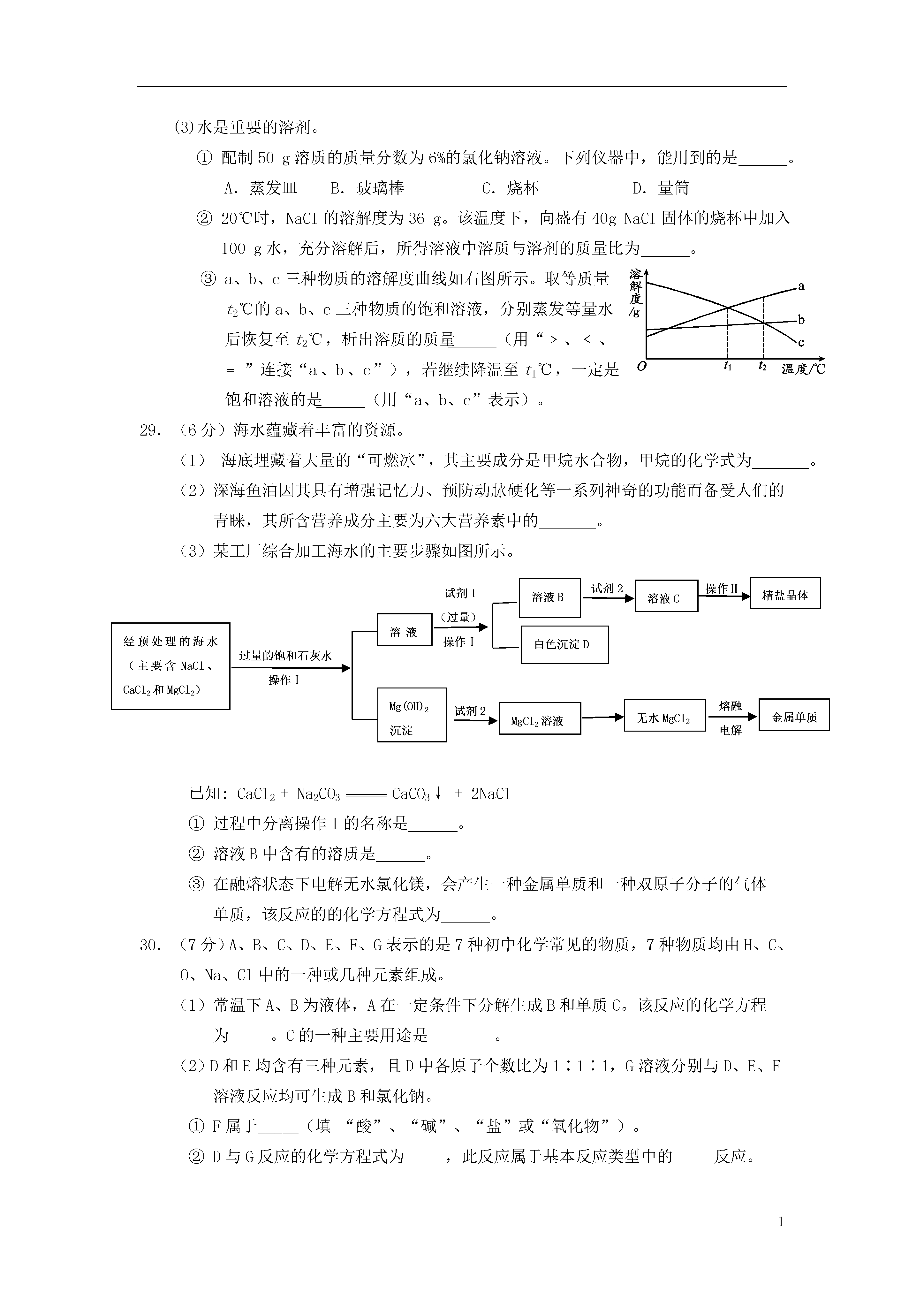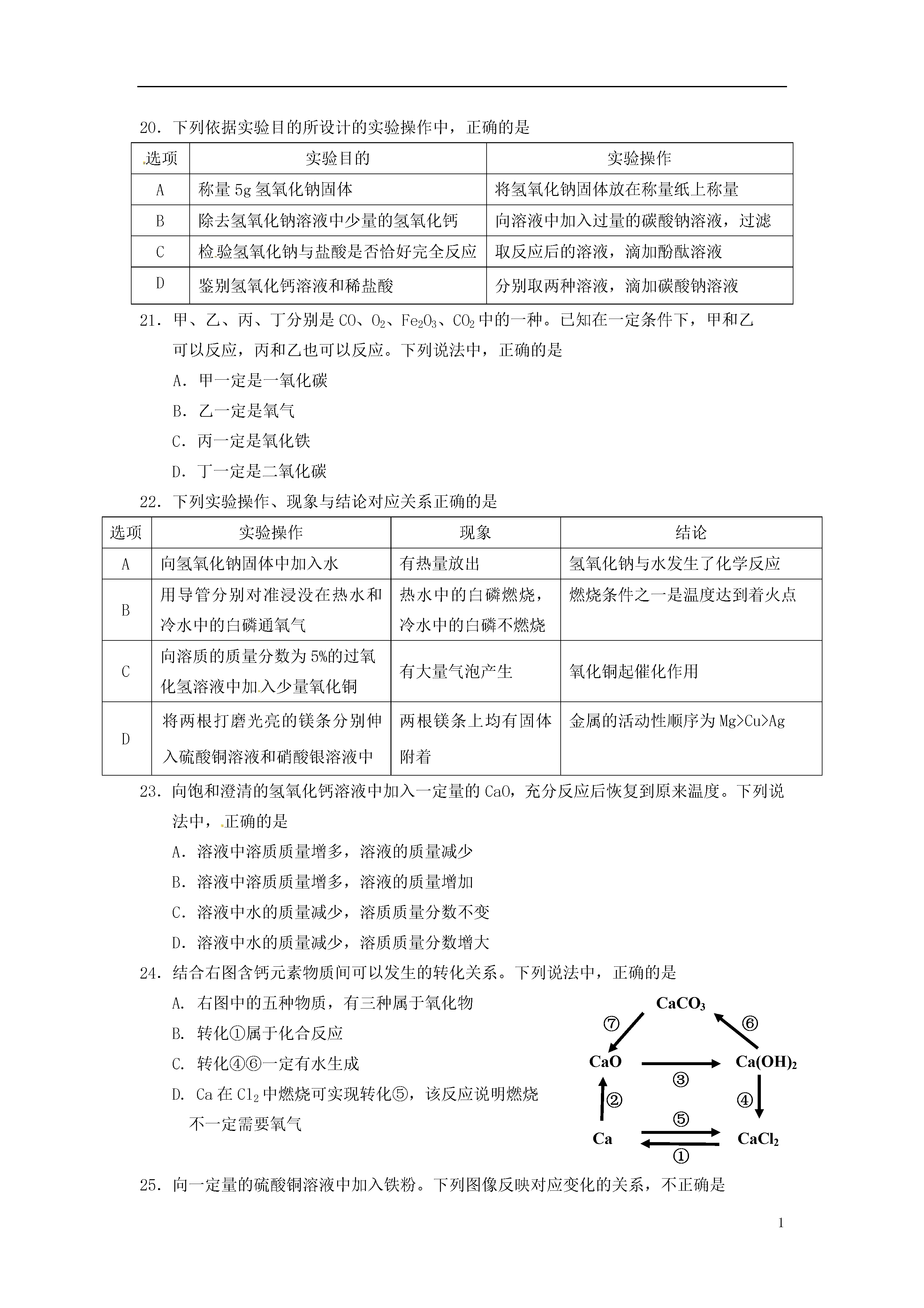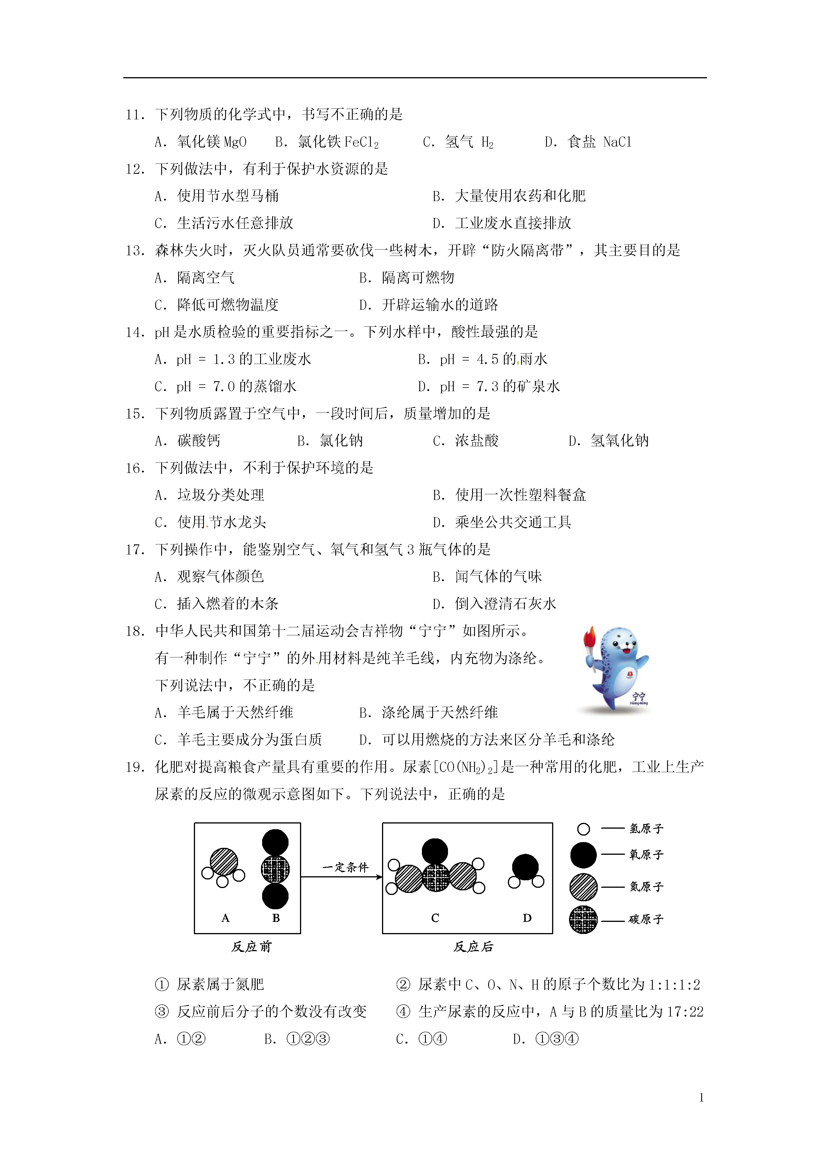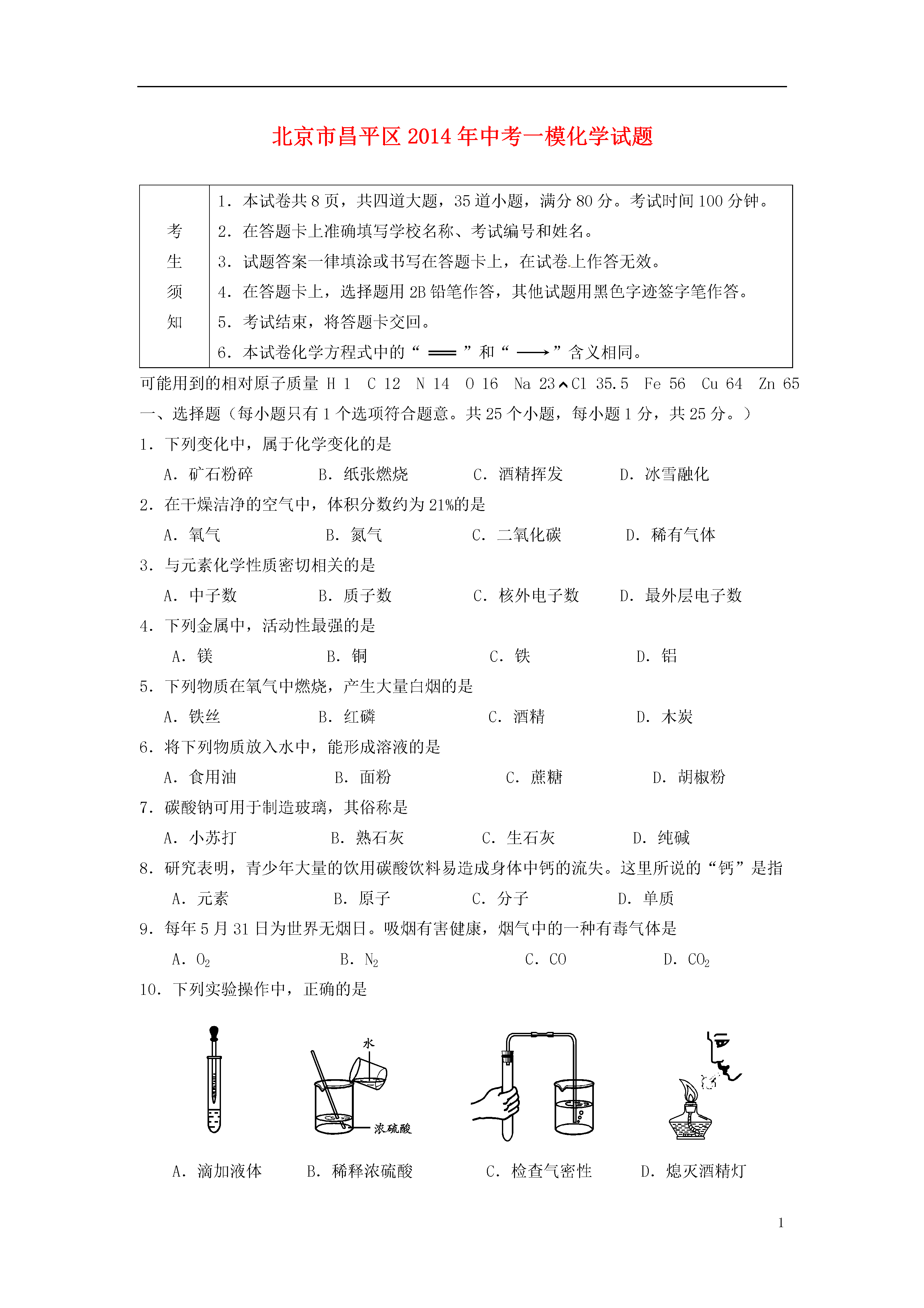 1北京市昌平区2014年中考一模化学试题考生须知1.本试卷,共四道大题,35道小题,满分80分。考试时间100分钟。2.在答题卡上准确填写学校名称、考试编号和姓名。3.试题答案一律填涂或书写在答题卡上,在试卷上作答无效。4.在答题卡上,选择题用2B铅笔作答,其他试题用黑色字迹签字笔作答。5.考试结束,将答题卡交回。6.本试卷化学方程式中的“”和“”含义相同。可能用到的相对原子质量H1C12N14O16Na23Cl35.5Fe56Cu64Zn65一、选择题(每小题只有1个选项符合题意。共25个小题,每小题1分,共25分。)1.下列变化中,属于化学变化的是A.矿石粉碎B.纸张燃烧C.酒精挥发D.冰雪融化2.在干燥洁净的空气中,体积分数约为21%的是A.氧气B.氮气C.二氧化碳D.稀有气体3.与元素化学性质密切相关的是A.中子数B.质子数C.核外电子数D.最外层电子数4.下列金属中,活动性最强的是A.镁B.铜C.铁D.铝5.下列物质在氧气中燃烧,产生大量白烟的是A.铁丝B.红磷C.酒精D.木炭6.将下列物质放入水中,能形成溶液的是A.食用油B.面粉C.蔗糖D.胡椒粉7.碳酸钠可用于制造玻璃,其俗称是A.小苏打B.熟石灰C.生石灰D.纯碱8.研究表明,青少年大量的饮用碳酸饮料易造成身体中钙的流失。这里所说的“钙”是指A.元素B.原子C.分子D.单质9.每年5月31日为世界无烟日。吸烟有害健康,烟气中的一种有毒气体是A.O2B.N2C.COD.CO210.下列实验操作中,正确的是A.滴加液体B.稀释浓硫酸C.检查气密性D.熄灭酒精灯11.下列物质的化学式中,书写不正确的是A.氧化镁MgOB.氯化铁FeCl2C.氢气H2D.食盐NaCl12.下列做法中,有利于保护水资源的是A.使用节水型马桶B.大量使用农药和化肥C.生活污水任意排放D.工业废水直接排放13.森林失火时,灭火队员通常要砍伐一些树木,开辟“防火隔离带”,其主要目的是A.隔离空气B.隔离可燃物C.降低可燃物温度D.开辟运输水的道路14.pH是水质检验的重要指标之一。下列水样中,酸性最强的是A.pH=1.3的工业废水B.pH=4.5的雨水C.pH=7.0的蒸馏水D.pH=7.3的矿泉水15.下列物质露置于空气中,一段时间后,质量增加的是A.碳酸钙B.氯化钠C.浓盐酸D.氢氧化钠16.下列做法中,不利于保护环境的是A.垃圾分类处理B.使用一次性塑料餐盒C.使用节水龙头D.乘坐公共交通工具17.下列操作中,能鉴别空气、氧气和氢气3瓶气体的是A.观察气体颜色B.闻气体的气味C.插入燃着的木条D.倒入澄清石灰水18.中华人民共和国第十二届运动会吉祥物“宁宁”如图所示。有一种制作“宁宁”的外用材料是纯羊毛线,内充物为涤纶。下列说法中,不正确的是A.羊毛属于天然纤维B.涤纶属于天然纤维C.羊毛主要成分为蛋白质D.可以用燃烧的方法来区分羊毛和涤纶19.化肥对提高粮食产量具有重要的作用。尿素[CO(NH2)2]是一种常用的化肥,工业上生产尿素的反应的微观示意图如下。下列说法中,正确的是①尿素属于氮肥②尿素中C、O、N、H的原子个数比为1:1:1:2③反应前后分子的个数没有改变④生产尿素的反应中,A与B的质量比为17:22A.①②B.①②③C.①④D.①③④20.下列依据实验目的所设计的实验操作中,正确的是选项实验目的实验操作A称量5g氢氧化钠固体将氢氧化钠固体放在称量纸上称量B除去氢氧化钠溶液中少量的氢氧化钙向溶液中加入过量的碳酸钠溶液,过滤C检验氢氧化钠与盐酸是否恰好完全反应取反应后的溶液,滴加酚酞溶液D鉴别氢氧化钙溶液和稀盐酸分别取两种溶液,滴加碳酸钠溶液21.甲、乙、丙、丁分别是CO、O2、Fe2O3、CO2中的一种。已知在一定条件下,甲和乙可以反应,丙和乙也可以反应。下列说法中,正确的是A.甲一定是一氧化碳B.乙一定是氧气C.丙一定是氧化铁D.丁一定是二氧化碳22.下列实验操作、现象与结论对应关系正确的是选项实验操作现象结论A向氢氧化钠固体中加入水有热量放出氢氧化钠与水发生了化学反应B用导管分别对准浸没在热水和冷水中的白磷通氧气热水中的白磷燃烧,冷水中的白磷不燃烧燃烧条件之一是温度达到着火点C向溶质的质量分数为5%的过氧化氢溶液中加入少量氧化铜有大量气泡产生氧化铜起催化作用D将两根打磨光亮的镁条分别伸入硫酸铜溶液和硝酸银溶液中两根镁条上均有固体附着金属的活动性顺序为Mg>Cu>Ag23.向饱和澄清的氢氧化钙溶液中加入一定量的CaO,充分反应后恢复到原来温度。下列说法中,正确的是A.溶液中溶质质量增多,溶液