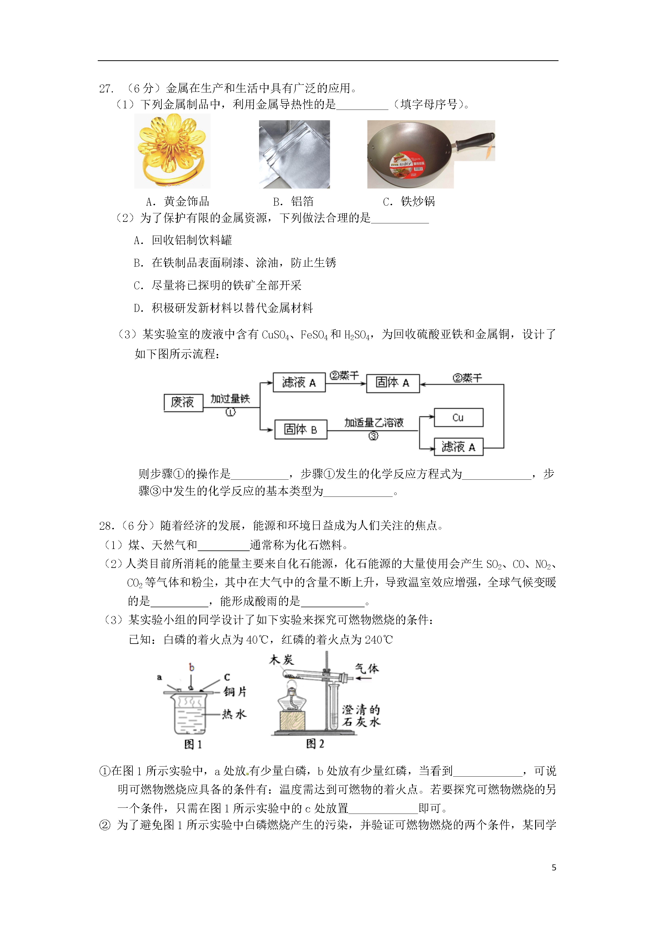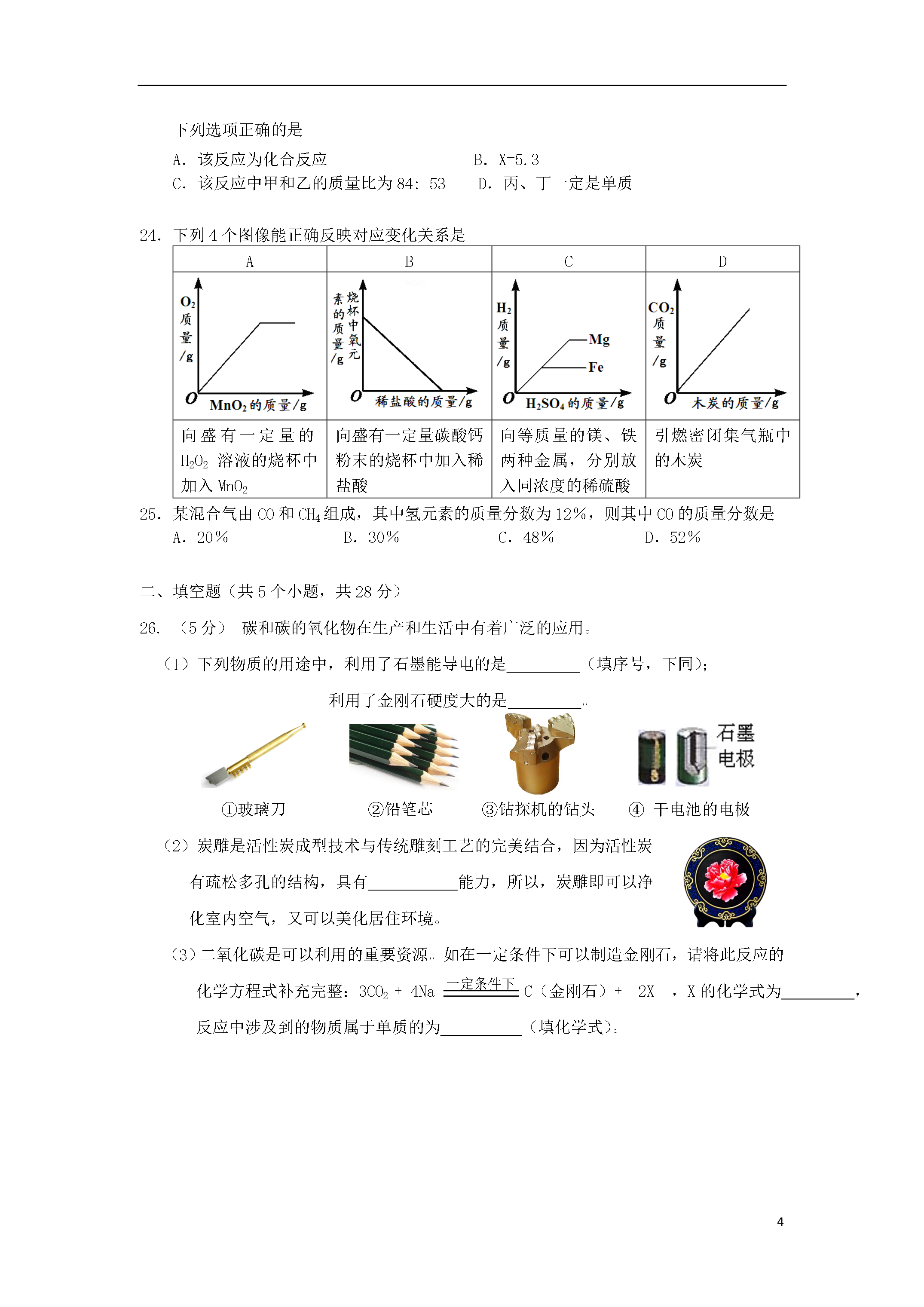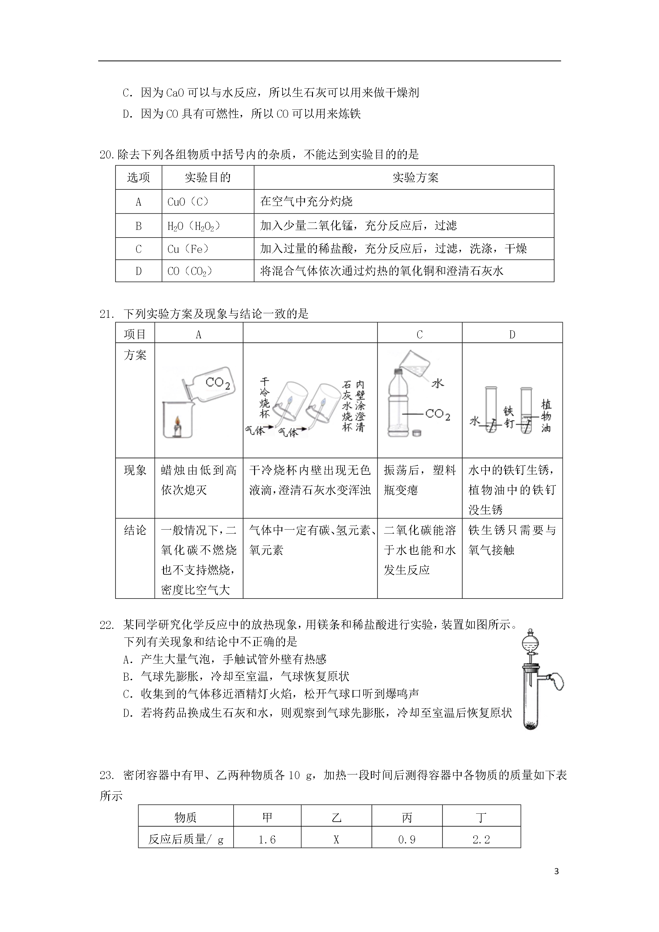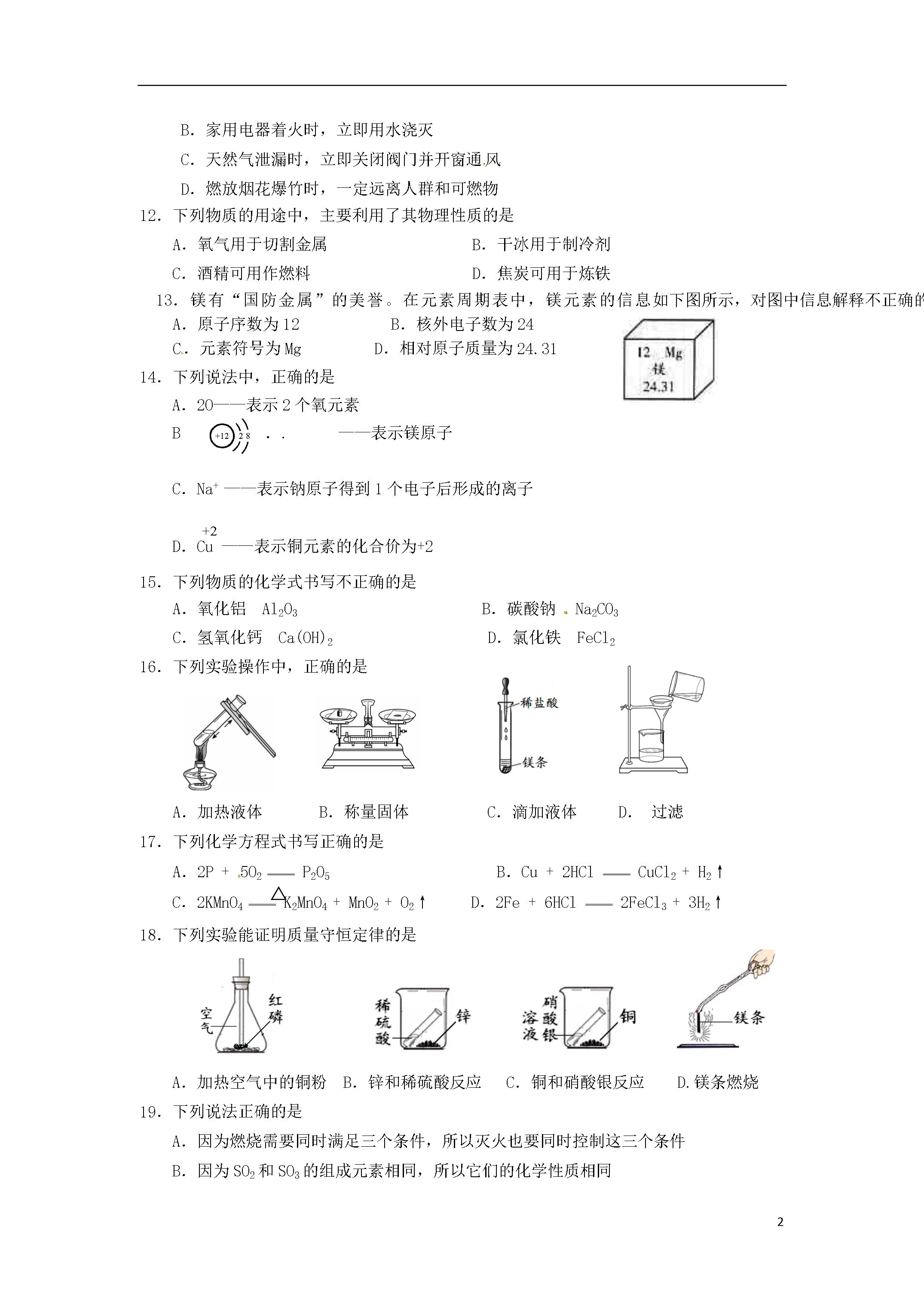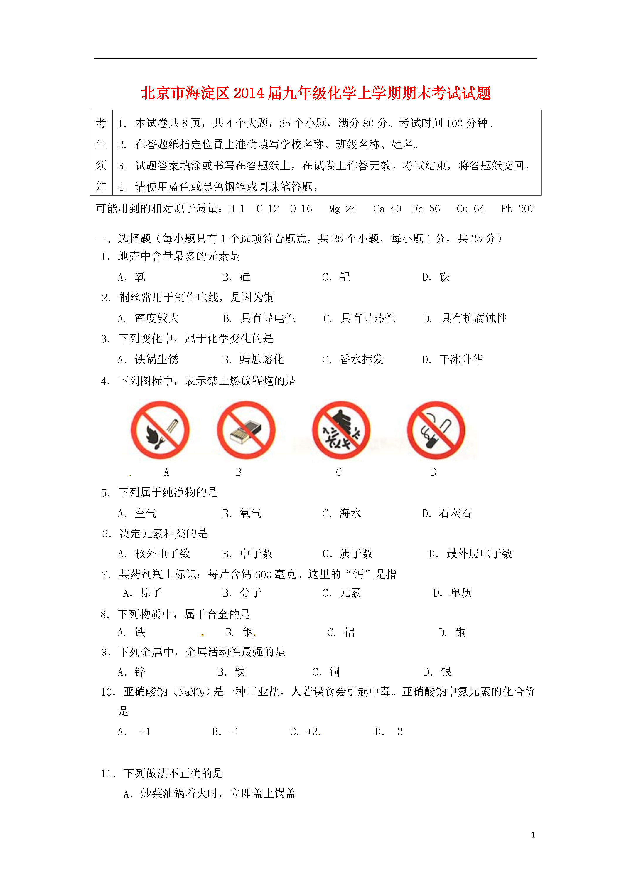 12北京市海淀区2014届九年级化学上学期期末考试试题考生须知1.本试卷,共4个大题,35个小题,满分80分。考试时间100分钟。2.在答题纸指定位置上准确填写学校名称、班级名称、姓名。3.试题答案填涂或书写在答题纸上,在试卷上作答无效。考试结束,将答题纸交回。4.请使用蓝色或黑色钢笔或圆珠笔答题。可能用到的相对原子质量:H1C12O16Mg24Ca40Fe56Cu64Pb207一、选择题(每小题只有1个选项符合题意,共25个小题,每小题1分,共25分)1.地壳中含量最多的元素是A.氧B.硅C.铝D.铁2.铜丝常用于制作电线,是因为铜A.密度较大B.具有导电性C.具有导热性D.具有抗腐蚀性3.下列变化中,属于化学变化的是A.铁锅生锈B.蜡烛熔化C.香水挥发D.干冰升华4.下列图标中,表示禁止燃放鞭炮的是ABCD5.下列属于纯净物的是A.空气B.氧气C.海水D.石灰石6.决定元素种类的是A.核外电子数B.中子数C.质子数D.最外层电子数7.某药剂瓶上标识:每片含钙600毫克。这里的“钙”是指A.原子B.分子C.元素D.单质8.下列物质中,属于合金的是A.铁B.钢C.铝D.铜9.下列金属中,金属活动性最强的是A.锌B.铁C.铜D.银10.亚硝酸钠(NaNO2)是一种工业盐,人若误食会引起中毒。亚硝酸钠中氮元素的化合价是A.+1B.-1C.+3D.-311.下列做法不正确的是A.炒菜油锅着火时,立即盖上锅盖B.家用电器着火时,立即用水浇灭C.天然气泄漏时,立即关闭阀门并开窗通风D.燃放烟花爆竹时,一定远离人群和可燃物12.下列物质的用途中,主要利用了其物理性质的是A.氧气用于切割金属B.干冰用于制冷剂C.酒精可用作燃料D.焦炭可用于炼铁13.镁有“国防金属”的美誉。在元素周期表中,镁元素的信息如下图所示,对图中信息解释不正确的是A.原子序数为12B.核外电子数为24C.元素符号为MgD.相对原子质量为24.3114.下列说法中,正确的是A.2O——表示2个氧元素B..——表示镁原子C.Na+——表示钠原子得到1个电子后形成的离子+2D.Cu——表示铜元素的化合价为+215.下列物质的化学式书写不正确的是A.氧化铝Al2O3B.碳酸钠Na2CO3C.氢氧化钙Ca(OH)2D.氯化铁FeCl216.下列实验操作中,正确的是A.加热液体B.称量固体C.滴加液体D.过滤17.下列化学方程式书写正确的是A.2P+5O2P2O5B.Cu+2HClCuCl2+H2↑C.2KMnO4K2MnO4+MnO2+O2↑D.2Fe+6HCl2FeCl3+3H2↑18.下列实验能证明质量守恒定律的是A.加热空气中的铜粉B.锌和稀硫酸反应C.铜和硝酸银反应D.镁条燃烧19.下列说法正确的是A.因为燃烧需要同时满足三个条件,所以灭火也要同时控制这三个条件B.因为SO2和SO3的组成元素相同,所以它们的化学性质相同C.因为CaO可以与水反应,所以生石灰可以用来做干燥剂D.因为CO具有可燃性,所以CO可以用来炼铁20.除去下列各组物质中括号内的杂质,不能达到实验目的的是选项实验目的实验方案ACuO(C)在空气中充分灼烧BH2O(H2O2)加入少量二氧化锰,充分反应后,过滤CCu(Fe)加入过量的稀盐酸,充分反应后,过滤,洗涤,干燥DCO(CO2)将混合气体依次通过灼热的氧化铜和澄清石灰水21.下列实验方案及现象与结论一致的是项目ACD方案现象蜡烛由低到高依次熄灭干冷烧杯内壁出现无色液滴,澄清石灰水变浑浊振荡后,塑料瓶变瘪水中的铁钉生锈,植物油中的铁钉没生锈结论一般情况下,二氧化碳不燃烧也不支持燃烧,密度比空气大气体中一定有碳、氢元素、氧元素二氧化碳能溶于水也能和水发生反应铁生锈只需要与氧气接触22.某同学研究化学反应中的放热现象,用镁条和稀盐酸进行实验,装置如图所示。下列有关现象和结论中不正确的是A.产生大量气泡,手触试管外壁有热感B.气球先膨胀,冷却至室温,气球恢复原状C.收集到的气体移近酒精灯火焰,松开气球口听到爆鸣声D.若将药品换成生石灰和水,则观察到气球先膨胀,冷却至室温后恢复原状23.密闭容器中有甲、乙两种物质各10g,加热一段时间后测得容器中各物质的质量如下表所示物质甲乙丙丁反应后质量/g1.6X0.92.2下列选项正确的是A.该反应为化合反应B.X=5.3C.该反应中甲和乙的质量比为84:53D.丙、丁一定是单质24.下列4个图像能正确反映对应变化关系是ABCD向盛有一定量的H2O2溶液的烧杯中加入MnO2向盛有一定量碳酸钙粉末的烧杯中加入稀盐酸向等质量的镁、铁两种金属,分别放入同浓度的稀硫酸引燃密闭集气瓶中的木炭25.某混合气由CO和CH4组成,其中氢元素的质量分数为12%,则其中CO的质量分数是A.20%B.30%C.48%D.52%二、填空题(共