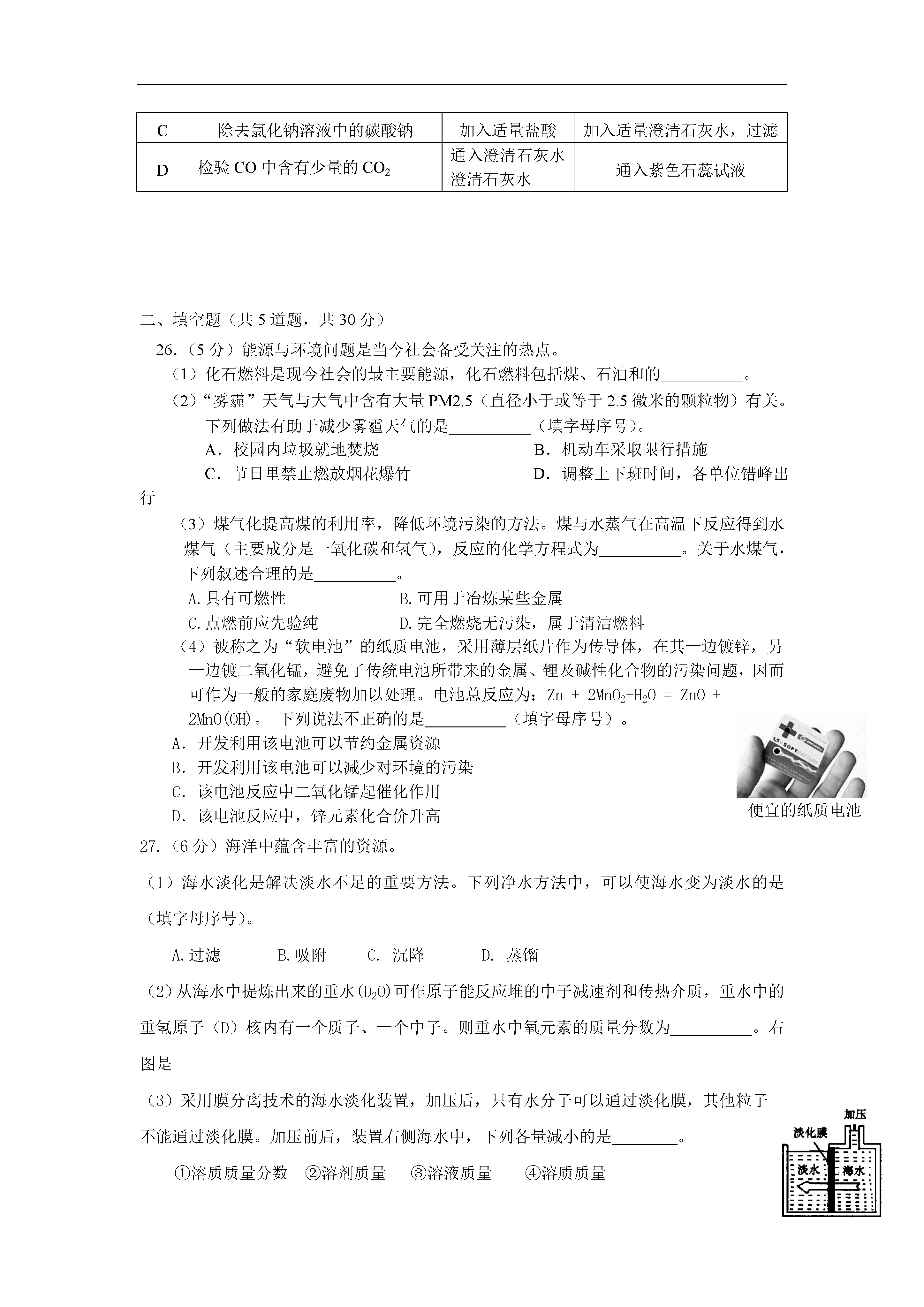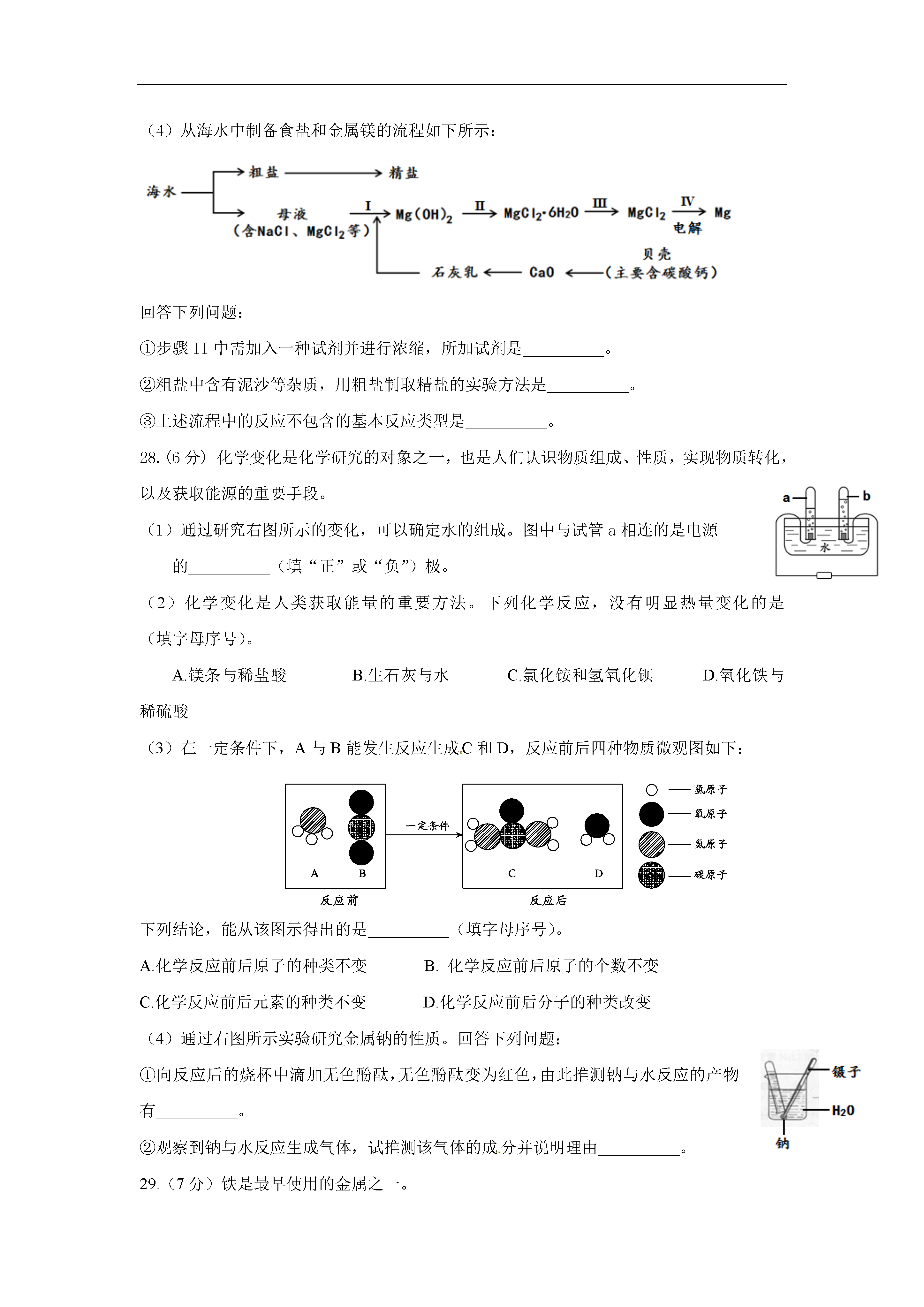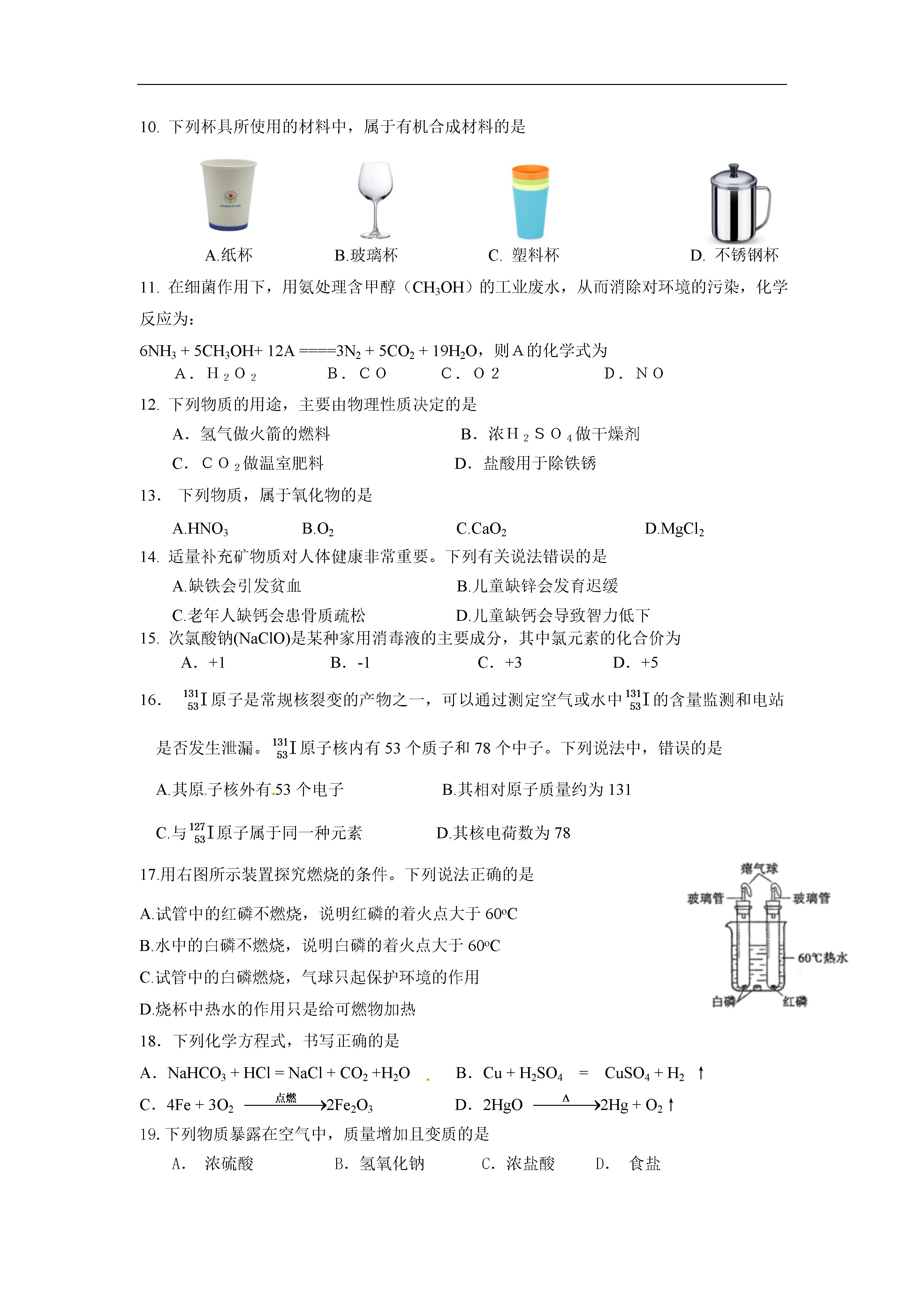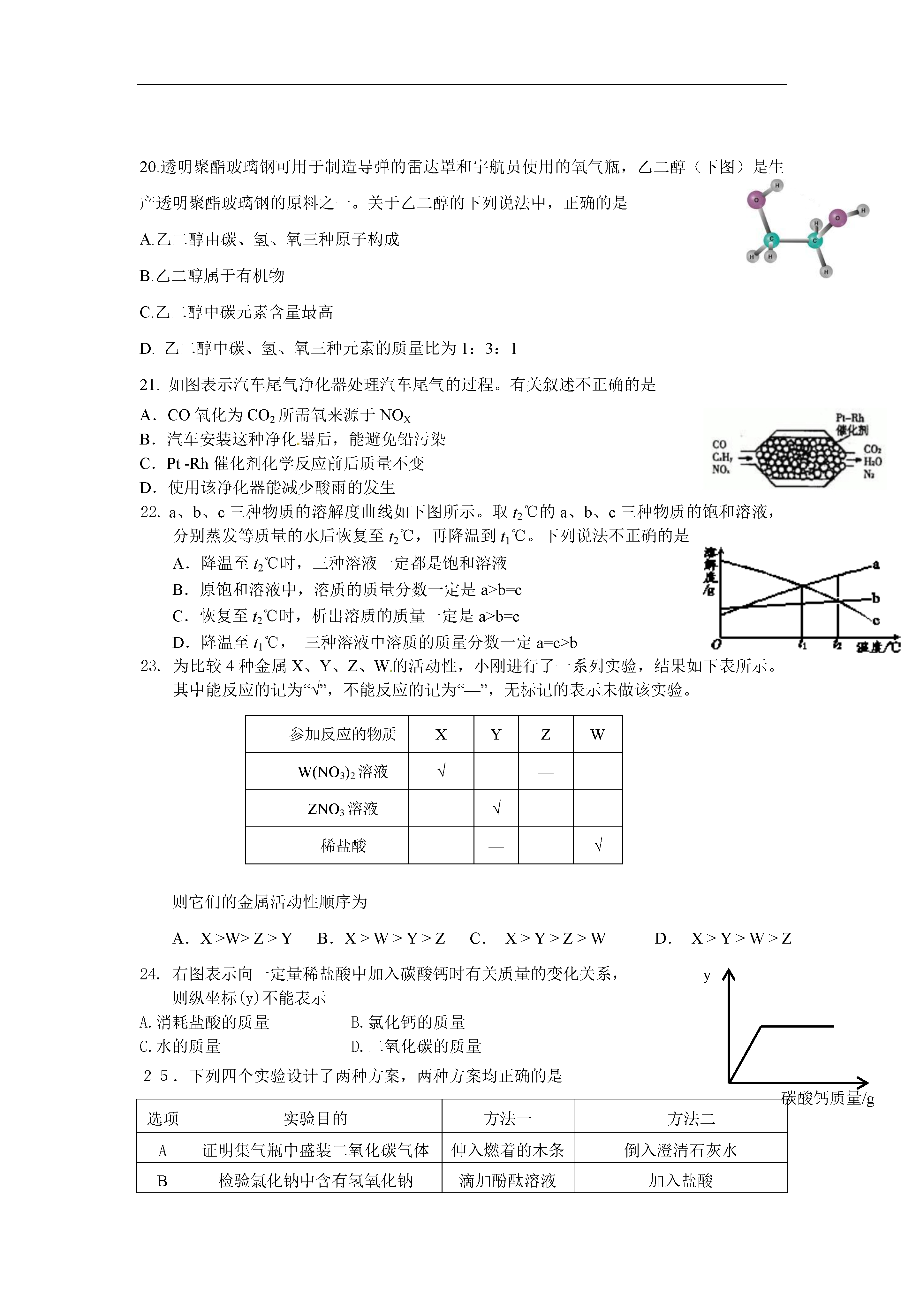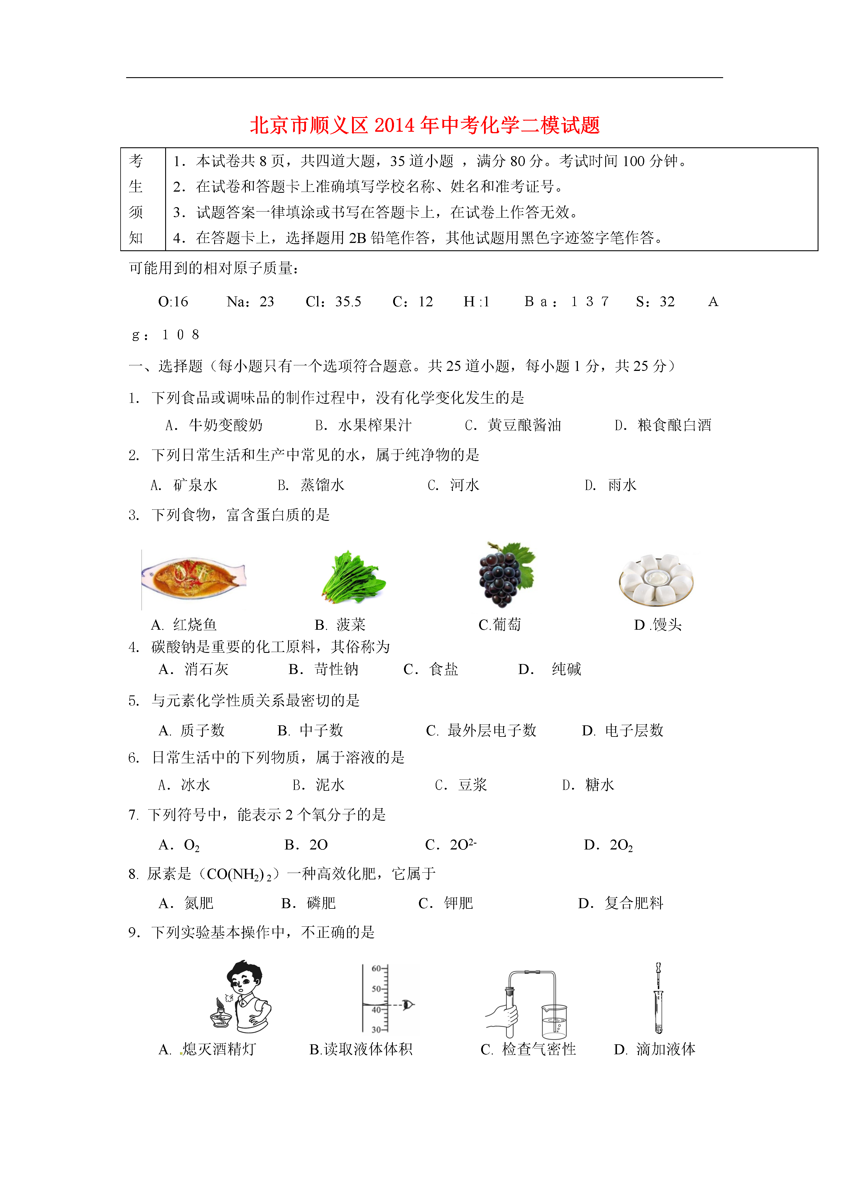 北京市顺义区2014年中考化学二模试题考生须知1.本试卷,共四道大题,35道小题,满分80分。考试时间100分钟。2.在试卷和答题卡上准确填写学校名称、姓名和准考证号。3.试题答案一律填涂或书写在答题卡上,在试卷上作答无效。4.在答题卡上,选择题用2B铅笔作答,其他试题用黑色字迹签字笔作答。可能用到的相对原子质量:O:16Na:23Cl:35.5C:12H:1Ba:137S:32Ag:108一、选择题(每小题只有一个选项符合题意。共25道小题,每小题1分,共25分)1.下列食品或调味品的制作过程中,没有化学变化发生的是A.牛奶变酸奶B.水果榨果汁C.黄豆酿酱油D.粮食酿白酒2.下列日常生活和生产中常见的水,属于纯净物的是A.矿泉水B.蒸馏水C.河水D.雨水3.下列食物,富含蛋白质的是A.红烧鱼B.菠菜C.葡萄D.馒头4.碳酸钠是重要的化工原料,其俗称为A.消石灰B.苛性钠C.食盐D.纯碱5.与元素化学性质关系最密切的是A.质子数B.中子数C.最外层电子数D.电子层数6.日常生活中的下列物质,属于溶液的是A.冰水B.泥水C.豆浆D.糖水7.下列符号中,能表示2个氧分子的是A.O2B.2OC.2O2-D.2O28.尿素是(CO(NH2)2)一种高效化肥,它属于A.氮肥B.磷肥C.钾肥D.复合肥料9.下列实验基本操作中,不正确的是A.熄灭酒精灯B.读取液体体积C.检查气密性D.滴加液体10.下列杯具所使用的材料中,属于有机合成材料的是A.纸杯B.玻璃杯C.塑料杯D.不锈钢杯11.在细菌作用下,用氨处理含甲醇(CH3OH)的工业废水,从而消除对环境的污染,化学反应为:6NH3+5CH3OH+12A====3N2+5CO2+19H2O,则A的化学式为A.H2O2B.COC.O2D.NO12.下列物质的用途,主要由物理性质决定的是A.氢气做火箭的燃料B.浓H2SO4做干燥剂C.CO2做温室肥料D.盐酸用于除铁锈13.下列物质,属于氧化物的是A.HNO3B.O2C.CaO2D.MgCl214.适量补充矿物质对人体健康非常重要。下列有关说法错误的是A.缺铁会引发贫血B.儿童缺锌会发育迟缓C.老年人缺钙会患骨质疏松D.儿童缺钙会导致智力低下15.次氯酸钠(NaClO)是某种家用消毒液的主要成分,其中氯元素的化合价为A.+1B.-1C.+3D.+516.原子是常规核裂变的产物之一,可以通过测定空气或水中的含量监测和电站是否发生泄漏。原子核内有53个质子和78个中子。下列说法中,错误的是A.其原子核外有53个电子B.其相对原子质量约为131C.与原子属于同一种元素D.其核电荷数为7817.用右图所示装置探究燃烧的条件。下列说法正确的是A.试管中的红磷不燃烧,说明红磷的着火点大于60oCB.水中的白磷不燃烧,说明白磷的着火点大于60oCC.试管中的白磷燃烧,气球只起保护环境的作用D.烧杯中热水的作用只是给可燃物加热18.下列化学方程式,书写正确的是A.NaHCO3+HCl=NaCl+CO2+H2OB.Cu+H2SO4=CuSO4+H2↑C.4Fe+3O22Fe2O3D.2HgO2Hg+O2↑19.下列物质暴露在空气中,质量增加且变质的是A.浓硫酸B.氢氧化钠C.浓盐酸D.食盐20.透明聚酯玻璃钢可用于制造导弹的雷达罩和宇航员使用的氧气瓶,乙二醇(下图)是生产透明聚酯玻璃钢的原料之一。关于乙二醇的下列说法中,正确的是A.乙二醇由碳、氢、氧三种原子构成B.乙二醇属于有机物C.乙二醇中碳元素含量最高D.乙二醇中碳、氢、氧三种元素的质量比为1:3:121.如图表示汽车尾气净化器处理汽车尾气的过程。有关叙述不正确的是A.CO氧化为CO2所需氧来源于NOXB.汽车安装这种净化器后,能避免铅污染C.Pt-Rh催化剂化学反应前后质量不变D.使用该净化器能减少酸雨的发生22.a、b、c三种物质的溶解度曲线如下图所示。取t2℃的a、b、c三种物质的饱和溶液,分别蒸发等质量的水后恢复至t2℃,再降温到t1℃。下列说法不正确的是A.降温至t2℃时,三种溶液一定都是饱和溶液B.原饱和溶液中,溶质的质量分数一定是a>b=cC.恢复至t2℃时,析出溶质的质量一定是a>b=cD.降温至t1℃,三种溶液中溶质的质量分数一定a=c>b23.为比较4种金属X、Y、Z、W的活动性,小刚进行了一系列实验,结果如下表所示。其中能反应的记为“√”,不能反应的记为“—”,无标记的表示未做该实验。参加反应的物质XYZWW(NO3)2溶液√—ZNO3溶液√稀盐酸—√则它们的金属活动性顺序为A.X>W>Z>Y