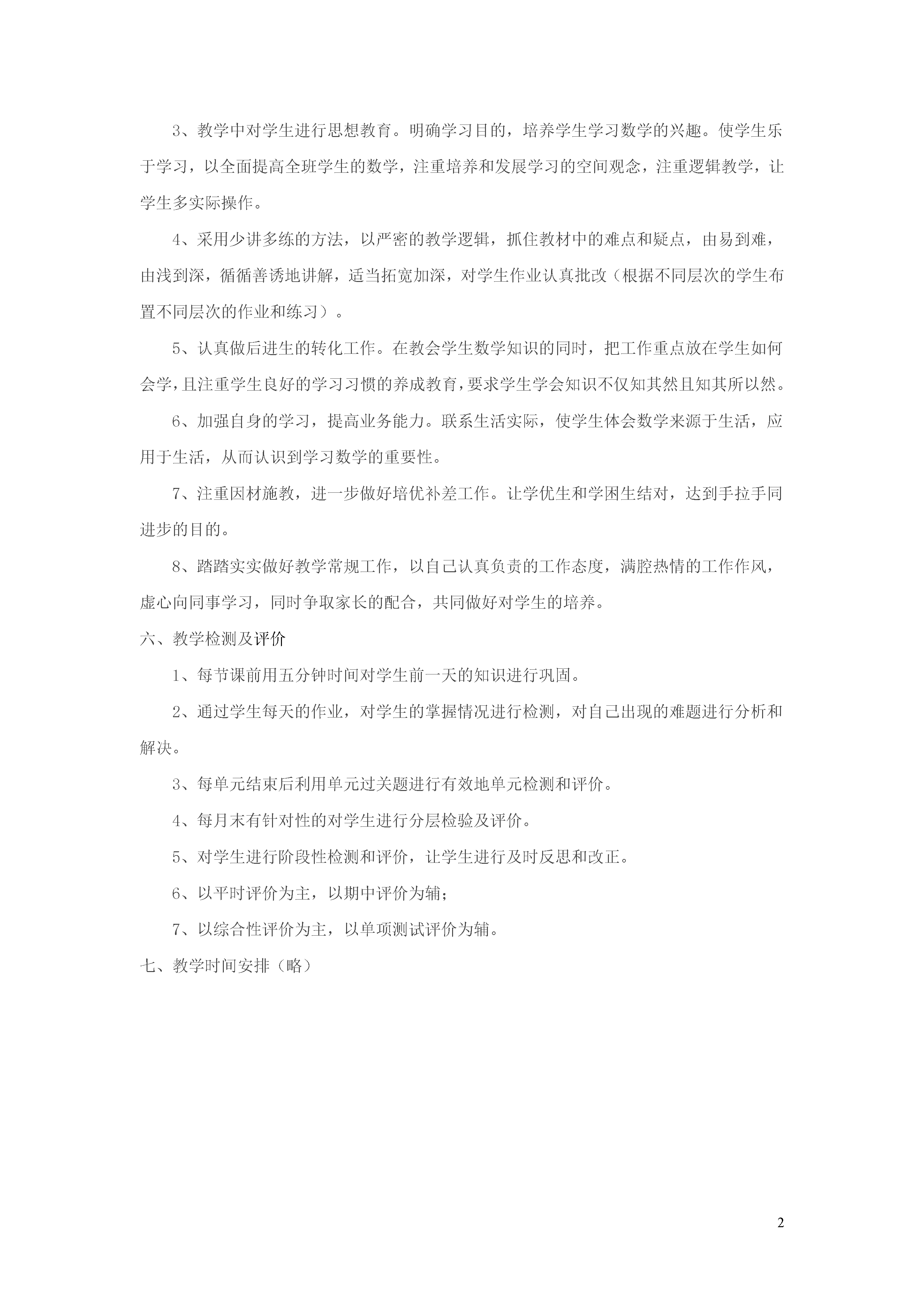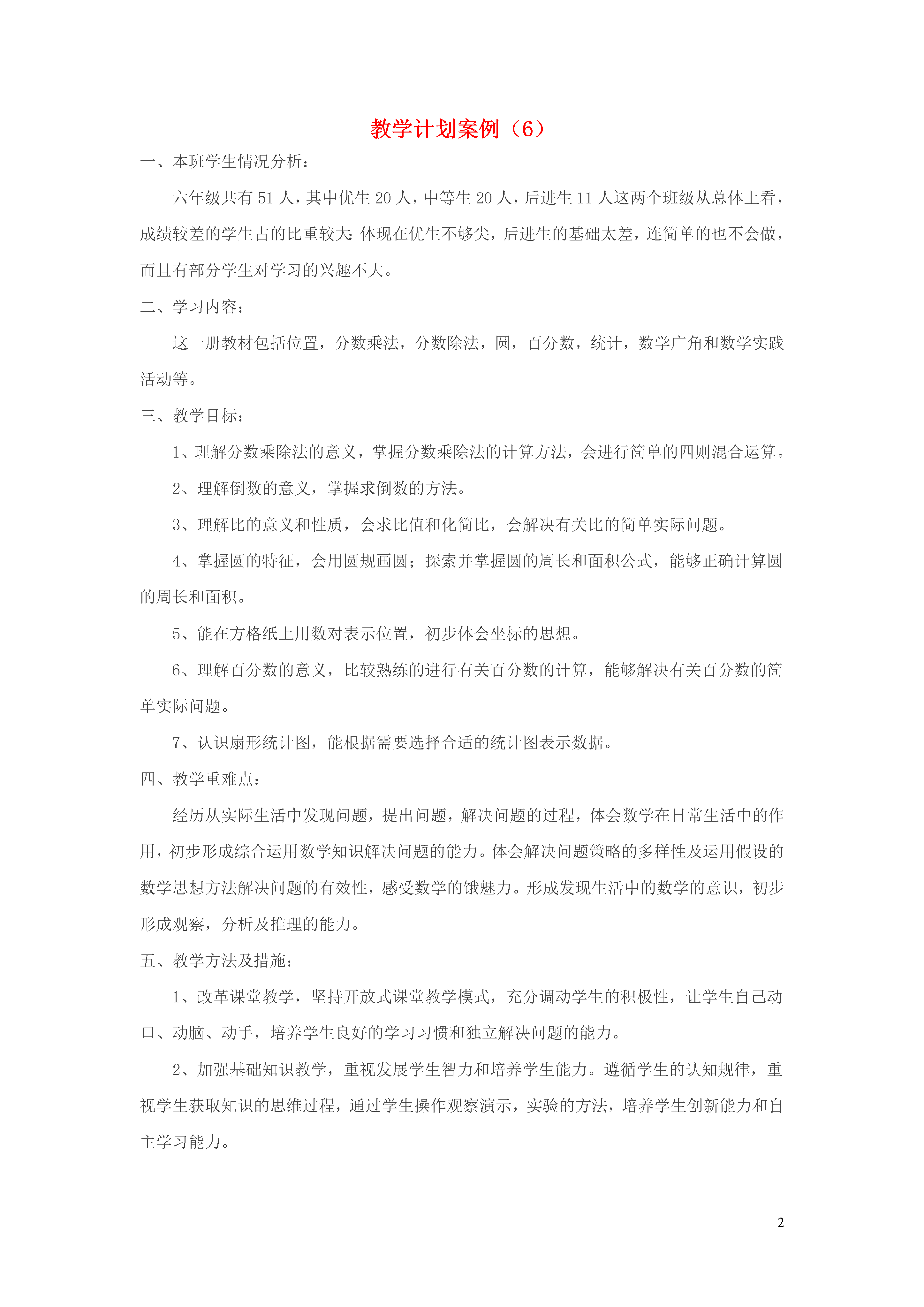 2教学计划案例(6)一、本班学生情况分析:六年级共有51人,其中优生20人,中等生20人,后进生11人这两个班级从总体上看,成绩较差的学生占的比重较大:体现在优生不够尖,后进生的基础太差,连简单的也不会做,而且有部分学生对学习的兴趣不大。二、学习内容:这一册教材包括位置,分数乘法,分数除法,圆,百分数,统计,数学广角和数学实践活动等。三、教学目标:1、理解分数乘除法的意义,掌握分数乘除法的计算方法,会进行简单的四则混合运算。2、理解倒数的意义,掌握求倒数的方法。3、理解比的意义和性质,会求比值和化简比,会解决有关比的简单实际问题。4、掌握圆的特征,会用圆规画圆;探索并掌握圆的周长和面积公式,能够正确计算圆的周长和面积。5、能在方格纸上用数对表示位置,初步体会坐标的思想。6、理解百分数的意义,比较熟练的进行有关百分数的计算,能够解决有关百分数的简单实际问题。7、认识扇形统计图,能根据需要选择合适的统计图表示数据。四、教学重难点:经历从实际生活中发现问题,提出问题,解决问题的过程,体会数学在日常生活中的作用,初步形成综合运用数学知识解决问题的能力。体会解决问题策略的多样性及运用假设的数学思想方法解决问题的有效性,感受数学的饿魅力。形成发现生活中的数学的意识,初步形成观察,分析及推理的能力。五、教学方法及措施:1、改革课堂教学,坚持开放式课堂教学模式,充分调动学生的积极性,让学生自己动口、动脑、动手,培养学生良好的学习习惯和独立解决问题的能力。2、加强基础知识教学,重视发展学生智力和培养学生能力。遵循学生的认知规律,重视学生获取知识的思维过程,通过学生操作观察演示,实验的方法,培养学生创新能力和自主学习能力。3、教学中对学生进行思想教育。明确学习目的,培养学生学习数学的兴趣。使学生乐于学习,以全面提高全班学生的数学,注重培养和发展学习的空间观念,注重逻辑教学,让学生多实际操作。4、采用少讲多练的方法,以严密的教学逻辑,抓住教材中的难点和疑点,由易到难,由浅到深,循循善诱地讲解,适当拓宽加深,对学生作业认真批改(根据不同层次的学生布置不同层次的作业和练习)。5、认真做后进生的转化工作。在教会学生数学知识的同时,把工作重点放在学生如何会学,且注重学生良好的学习习惯的养成教育,要求学生学会知识不仅知其然且知其所以然。6、加强自身的学习,提高业务能力。联系生活实际,使学生体会数学来源于生活,应用于生活,从而认识到学习数学的重要性。7、注重因材施教,进一步做好培优补差工作。让学优生和学困生结对,达到手拉手同进步的目的。8、踏踏实实做好教学常规工作,以自己认真负责的工作态度,满腔热情的工作作风,虚心向同事学习,同时争取家长的配合,共同做好对学生的培养。六、教学检测及评价1、每节课前用五分钟时间对学生前一天的知识进行巩固。2、通过学生每天的作业,对学生的掌握情况进行检测,对自己出现的难题进行分析和解决。3、每单元结束后利用单元过关题进行有效地单元检测和评价。4、每月末有针对性的对学生进行分层检验及评价。5、对学生进行阶段性检测和评价,让学生进行及时反思和改正。6、以平时评价为主,以期中评价为辅;7、以综合性评价为主,以单项测试评价为辅。七、教学时间安排(略)