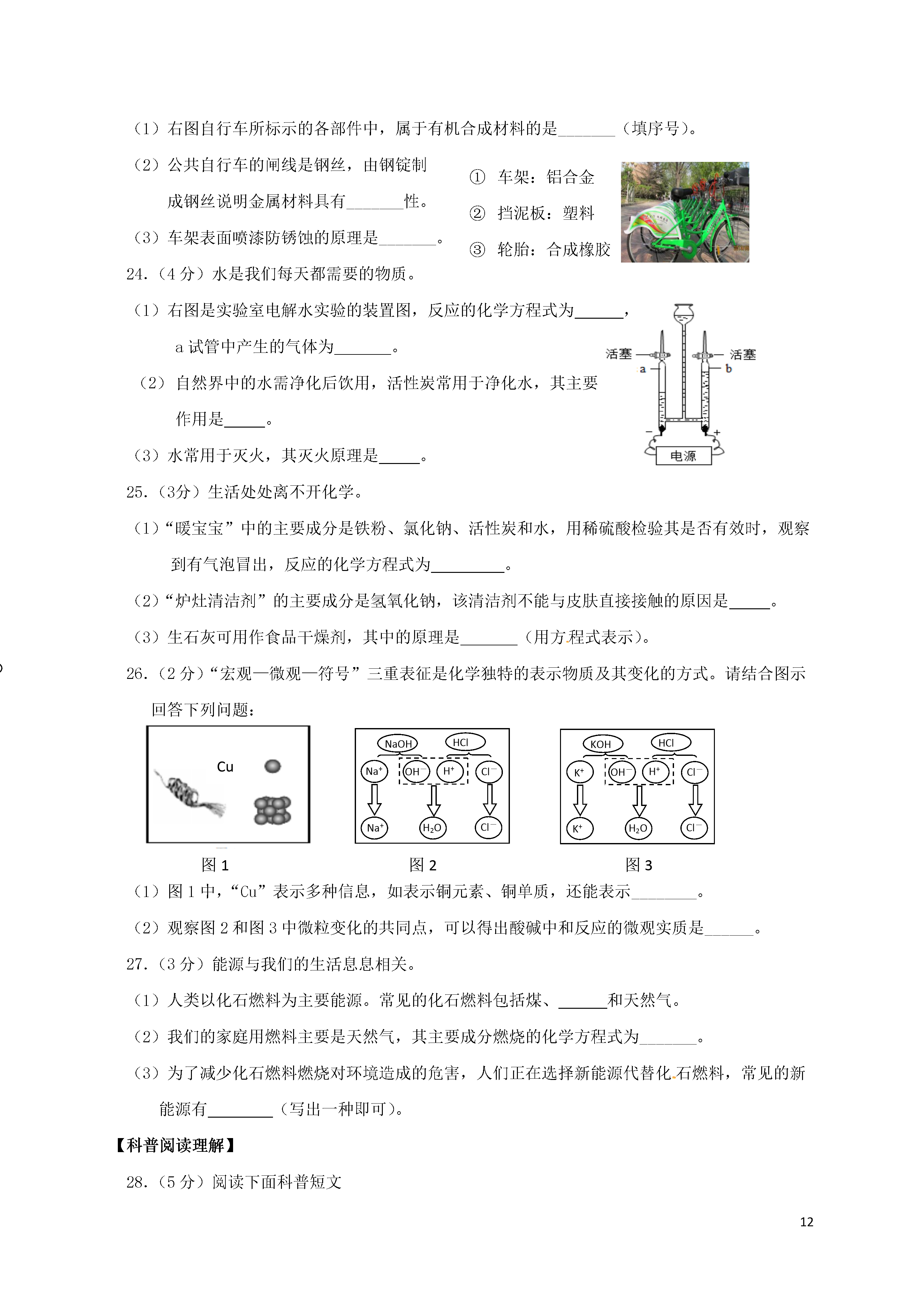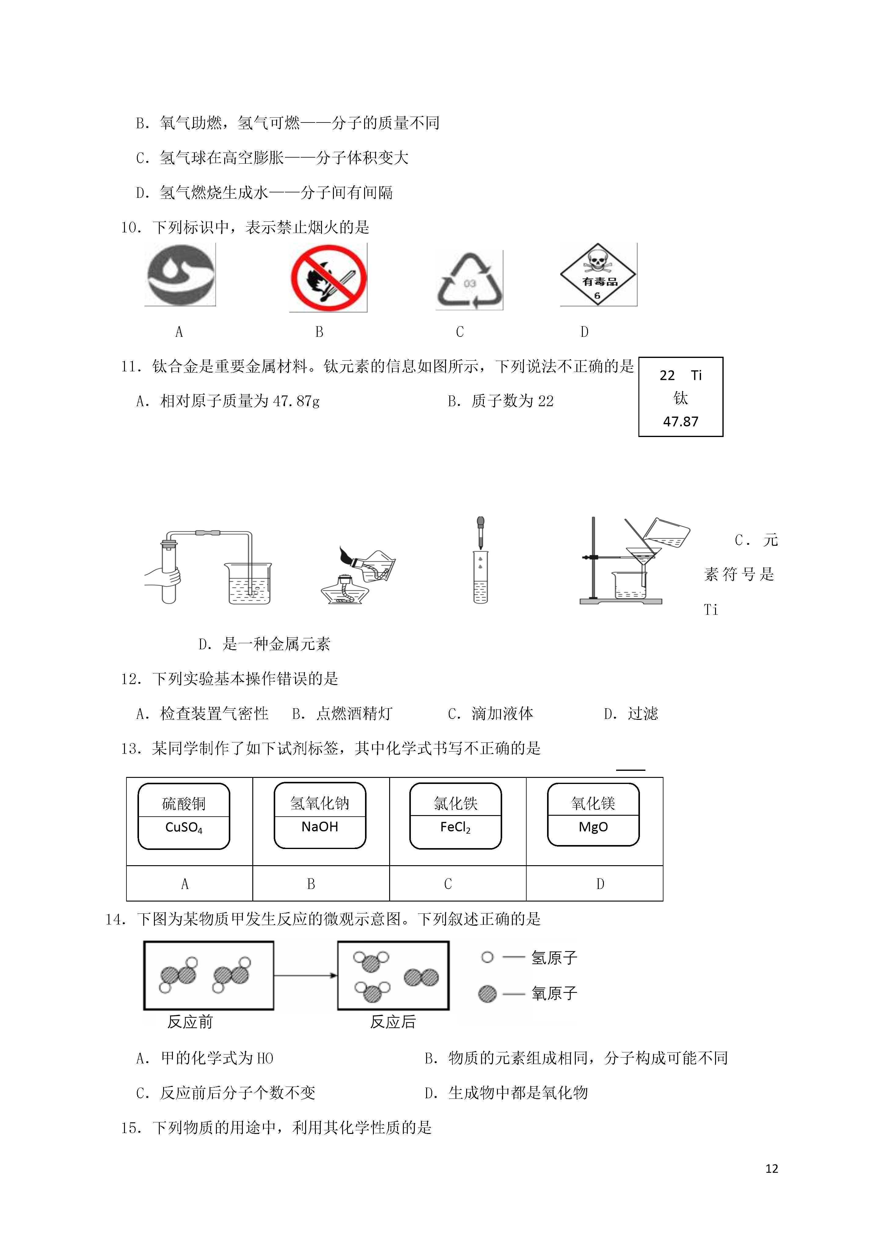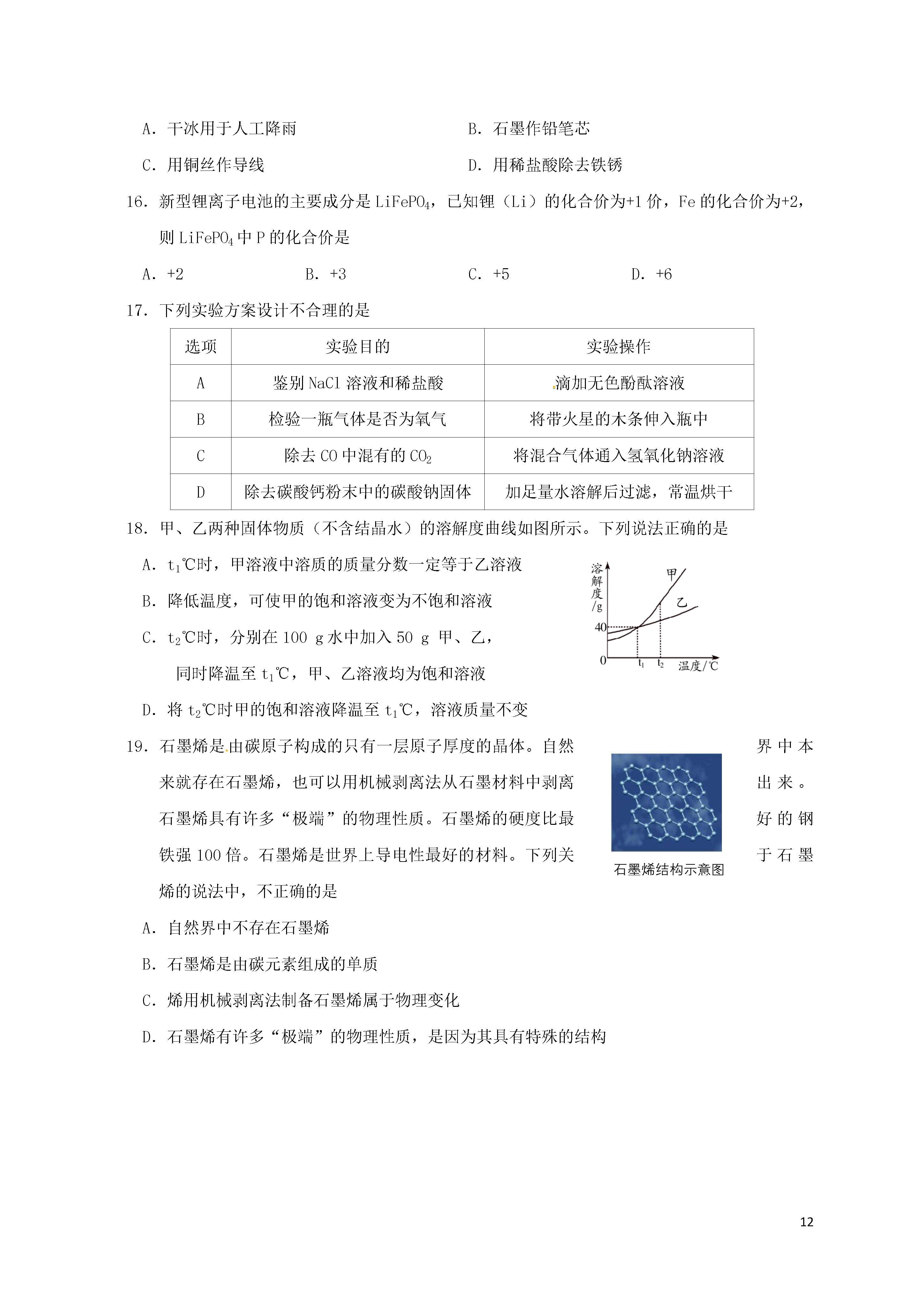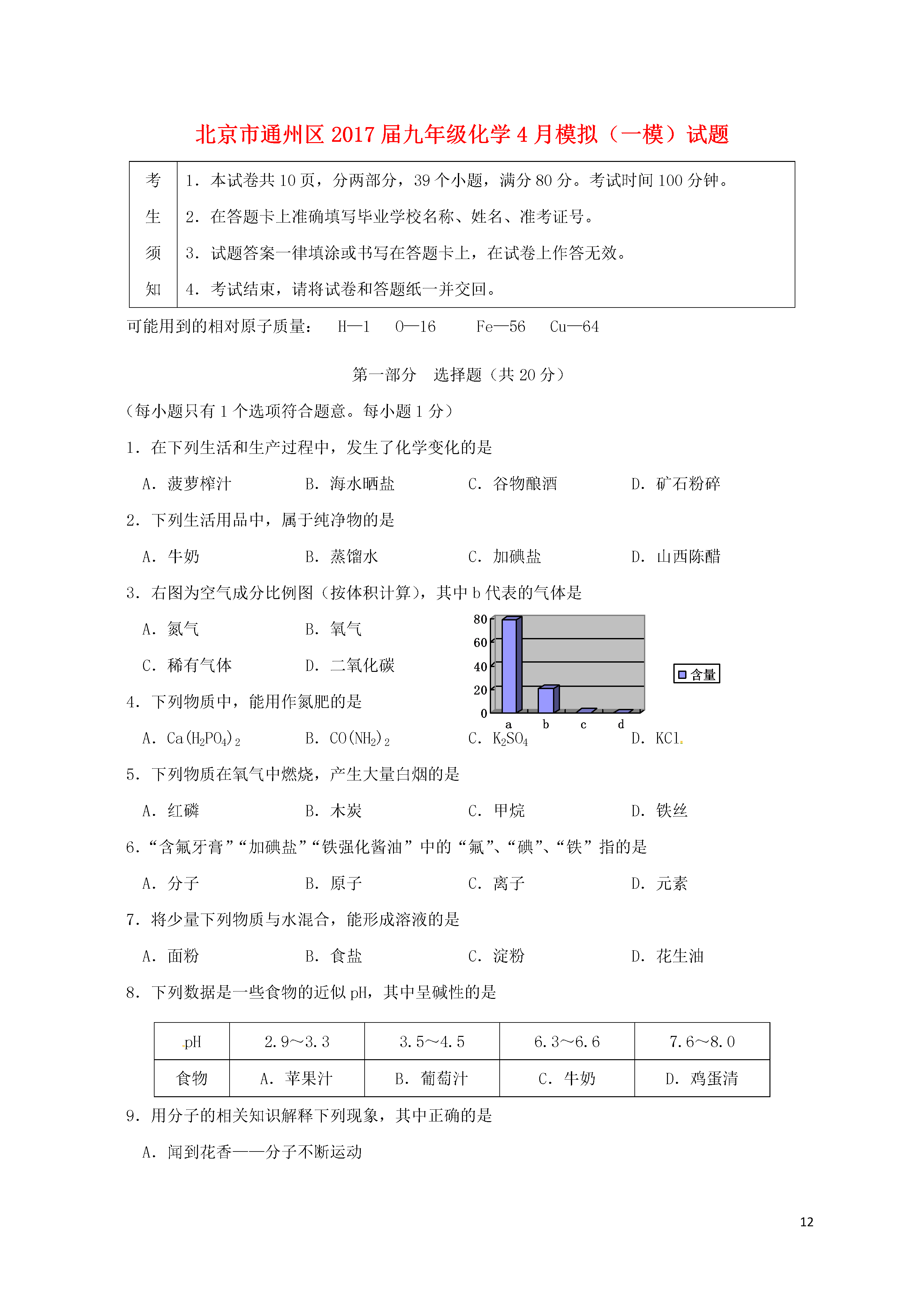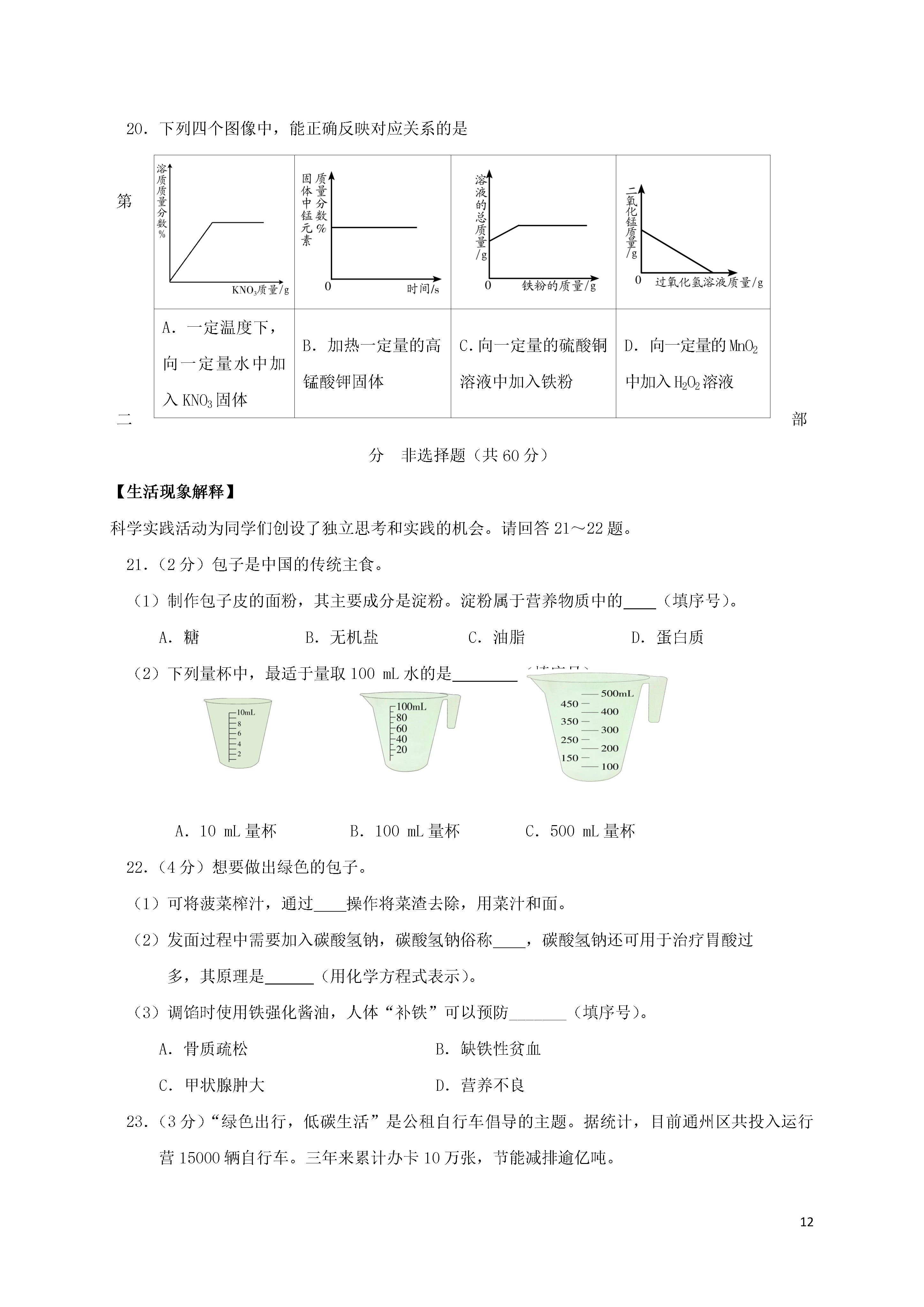 12北京市通州区2017届九年级化学4月模拟(一模)试题考生须知1.本试卷,分两部分,39个小题,满分80分。考试时间100分钟。2.在答题卡上准确填写毕业学校名称、姓名、准考证号。3.试题答案一律填涂或书写在答题卡上,在试卷上作答无效。4.考试结束,请将试卷和答题纸一并交回。可能用到的相对原子质量:H—1O—16Fe—56Cu—64第一部分选择题(共20分)(每小题只有1个选项符合题意。每小题1分)1.在下列生活和生产过程中,发生了化学变化的是A.菠萝榨汁B.海水晒盐C.谷物酿酒D.矿石粉碎2.下列生活用品中,属于纯净物的是A.牛奶B.蒸馏水C.加碘盐D.山西陈醋3.右图为空气成分比例图(按体积计算),其中b代表的气体是A.氮气B.氧气C.稀有气体D.二氧化碳4.下列物质中,能用作氮肥的是A.Ca(H2PO4)2B.CO(NH2)2C.K2SO4D.KCl5.下列物质在氧气中燃烧,产生大量白烟的是A.红磷B.木炭C.甲烷D.铁丝6.“含氟牙膏”“加碘盐”“铁强化酱油”中的“氟”、“碘”、“铁”指的是A.分子B.原子C.离子D.元素7.将少量下列物质与水混合,能形成溶液的是A.面粉B.食盐C.淀粉D.花生油8.下列数据是一些食物的近似pH,其中呈碱性的是pH2.9~3.33.5~4.56.3~6.67.6~8.0食物A.苹果汁B.葡萄汁C.牛奶D.鸡蛋清9.用分子的相关知识解释下列现象,其中正确的是A.闻到花香——分子不断运动B.氧气助燃,氢气可燃——分子的质量不同C.氢气球在高空膨胀——分子体积变大D.氢气燃烧生成水——分子间有间隔10.下列标识中,表示禁止烟火的是ABCD22Ti钛47.8711.钛合金是重要金属材料。钛元素的信息如图所示,下列说法不正确的是A.相对原子质量为47.87gB.质子数为22C.元素符号是TiD.是一种金属元素12.下列实验基本操作错误的是A.检查装置气密性B.点燃酒精灯C.滴加液体D.过滤13.某同学制作了如下试剂标签,其中化学式书写不正确的是硫酸铜CuSO4氢氧化钠NaOH氯化铁FeCl2氧化镁MgOABCD14.下图为某物质甲发生反应的微观示意图。下列叙述正确的是氢原子氧原子反应前反应后A.甲的化学式为HOB.物质的元素组成相同,分子构成可能不同C.反应前后分子个数不变D.生成物中都是氧化物15.下列物质的用途中,利用其化学性质的是A.干冰用于人工降雨B.石墨作铅笔芯C.用铜丝作导线D.用稀盐酸除去铁锈16.新型锂离子电池的主要成分是LiFePO4,已知锂(Li)的化合价为+1价,Fe的化合价为+2,则LiFePO4中P的化合价是A.+2B.+3C.+5D.+617.下列实验方案设计不合理的是选项实验目的实验操作A鉴别NaCl溶液和稀盐酸滴加无色酚酞溶液B检验一瓶气体是否为氧气将带火星的木条伸入瓶中C除去CO中混有的CO2将混合气体通入氢氧化钠溶液D除去碳酸钙粉末中的碳酸钠固体加足量水溶解后过滤,常温烘干18.甲、乙两种固体物质(不含结晶水)的溶解度曲线如图所示。下列说法正确的是A.t1℃时,甲溶液中溶质的质量分数一定等于乙溶液B.降低温度,可使甲的饱和溶液变为不饱和溶液C.t2℃时,分别在100g水中加入50g甲、乙,同时降温至t1℃,甲、乙溶液均为饱和溶液D.将t2℃时甲的饱和溶液降温至t1℃,溶液质量不变石墨烯结构示意图19.石墨烯是由碳原子构成的只有一层原子厚度的晶体。自然界中本来就存在石墨烯,也可以用机械剥离法从石墨材料中剥离出来。石墨烯具有许多“极端”的物理性质。石墨烯的硬度比最好的钢铁强100倍。石墨烯是世界上导电性最好的材料。下列关于石墨烯的说法中,不正确的是A.自然界中不存在石墨烯B.石墨烯是由碳元素组成的单质C.烯用机械剥离法制备石墨烯属于物理变化D.石墨烯有许多“极端”的物理性质,是因为其具有特殊的结构A.一定温度下,向一定量水中加入KNO3固体B.加热一定量的高锰酸钾固体C.向一定量的硫酸铜溶液中加入铁粉D.向一定量的MnO2中加入H2O2溶液20.下列四个图像中,能正确反映对应关系的是第二部分非选择题(共60分)【生活现象解释】科学实践活动为同学们创设了独立思考和实践的机会。请回答21~22题。21.(2分)包子是中国的传统主食。(1)制作包子皮的面粉,其主要成分是淀粉。淀粉属于营养物质中的(填序号)。A.糖B.无机盐C.油脂D.蛋白质(2)下列量杯中,最适于量取100mL水的是(填序号)。A.10mL量杯B.100mL量杯C.5