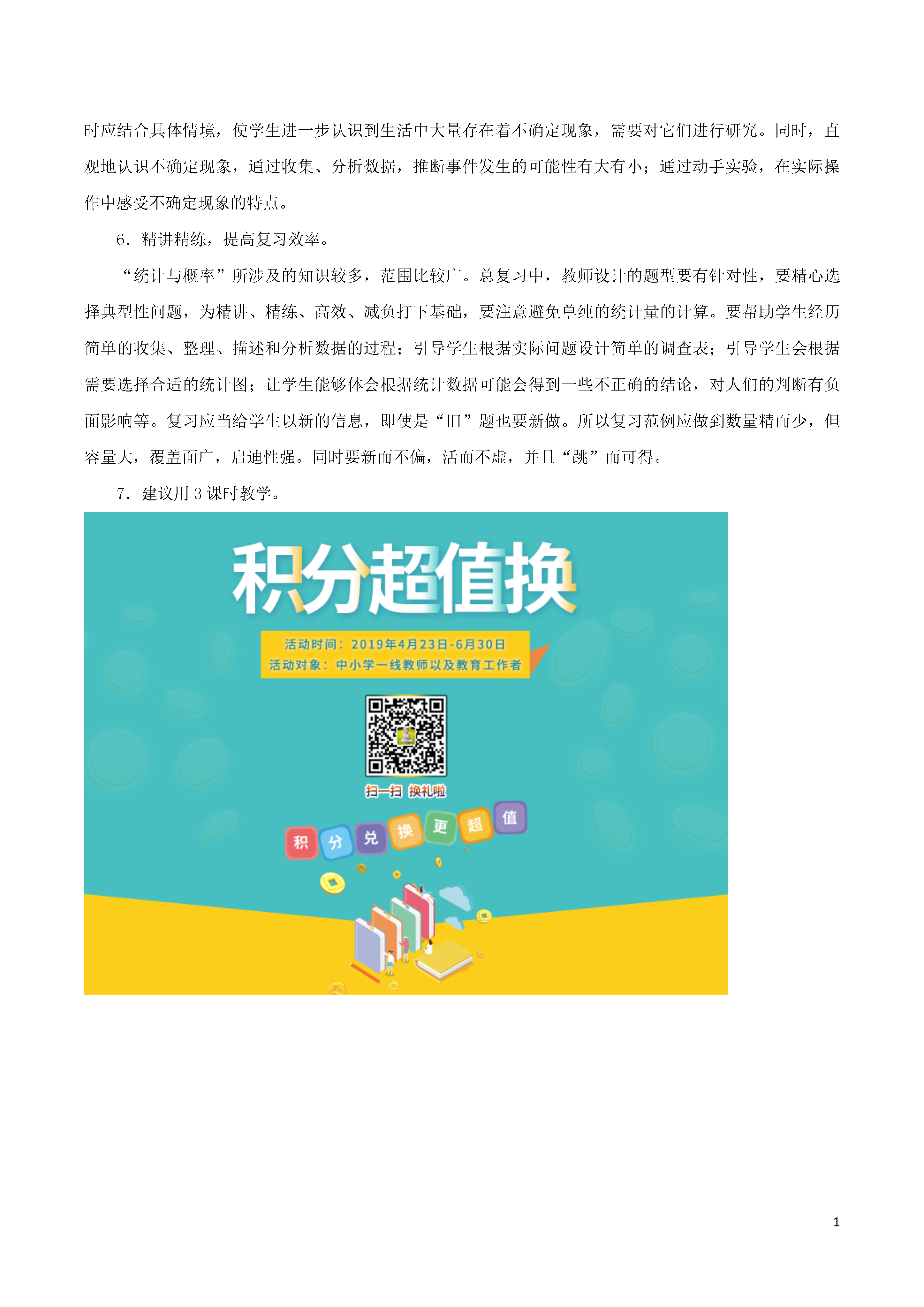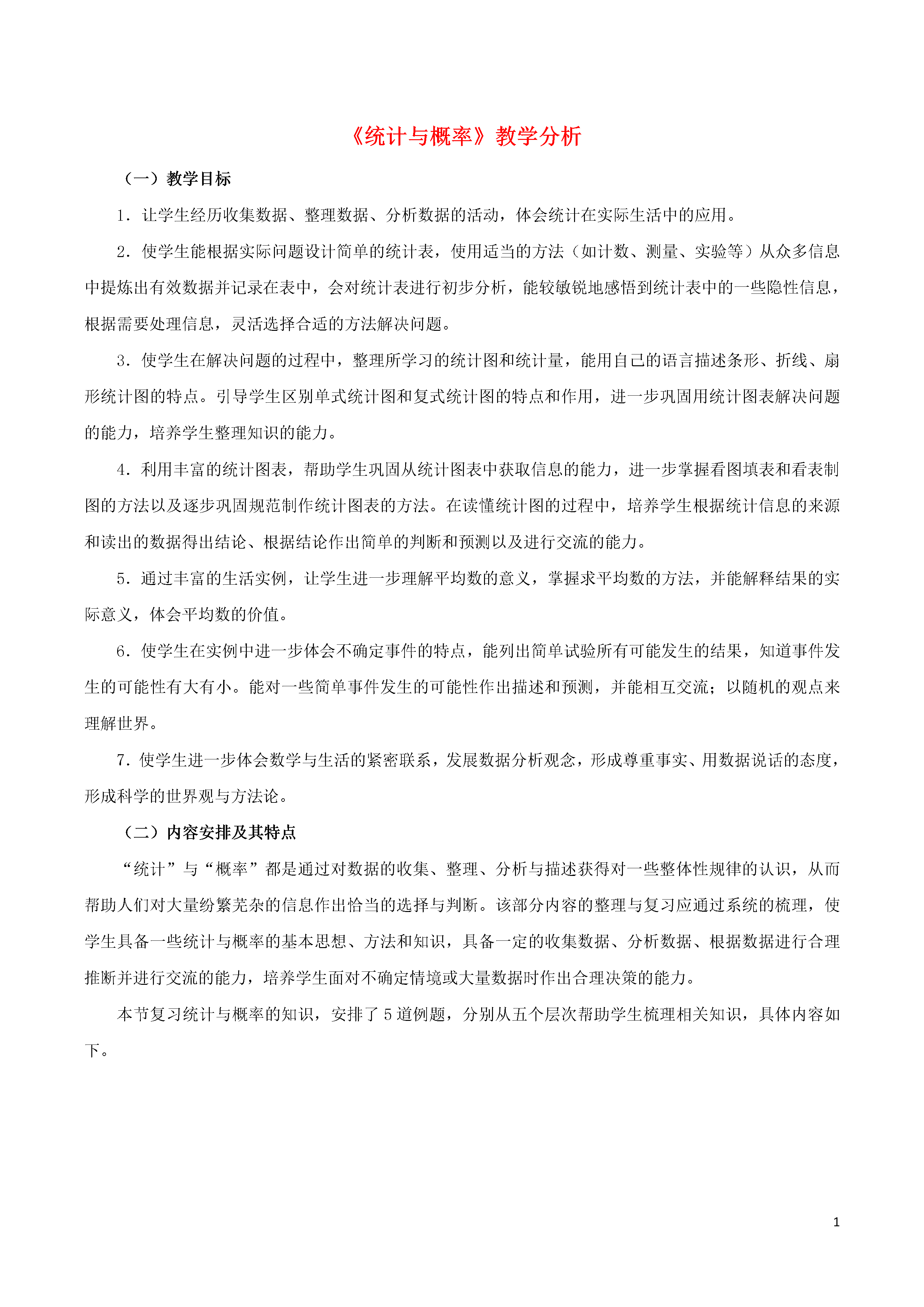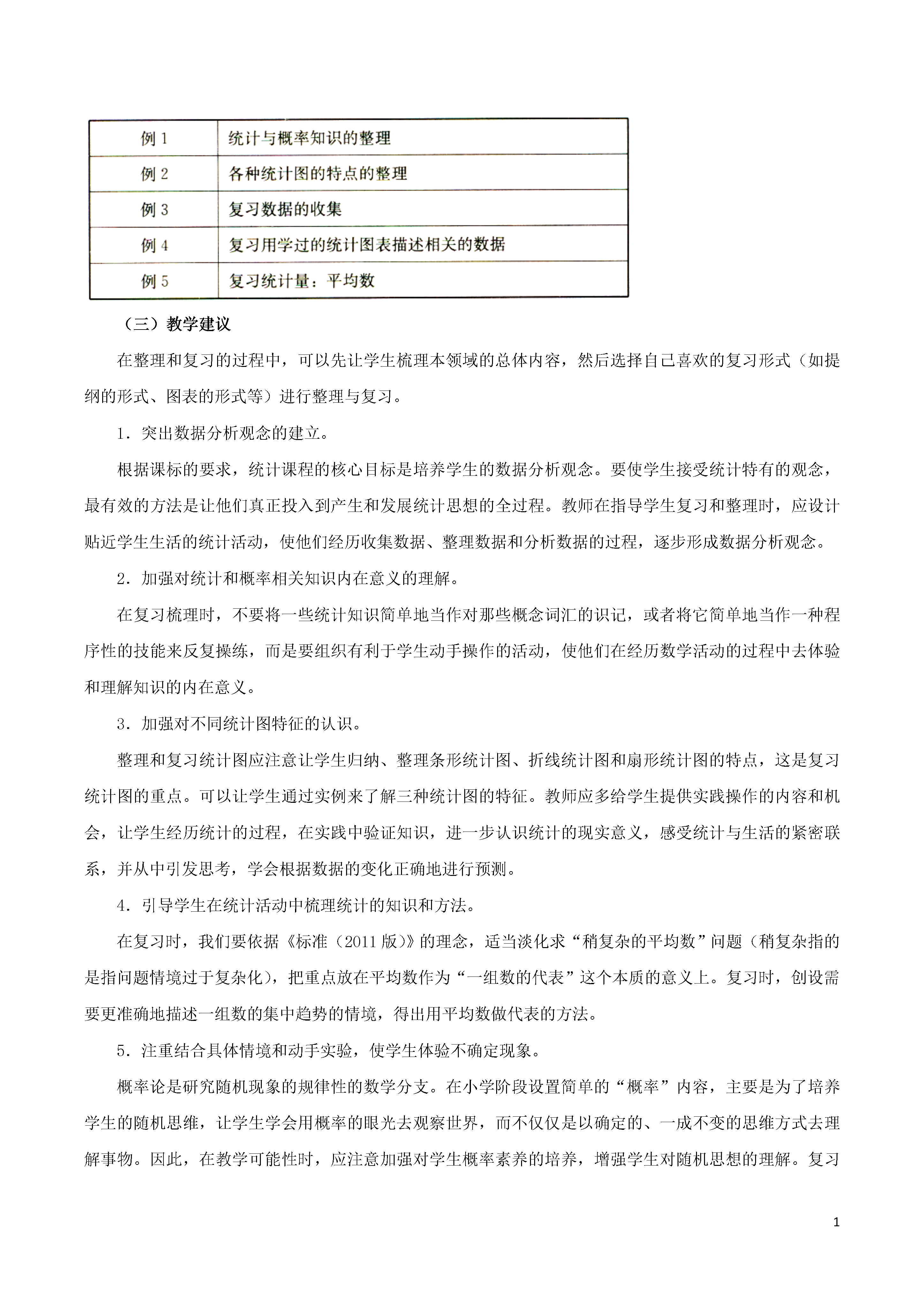 1《统计与概率》教学分析(一)教学目标1.让学生经历收集数据、整理数据、分析数据的活动,体会统计在实际生活中的应用。2.使学生能根据实际问题设计简单的统计表,使用适当的方法(如计数、测量、实验等)从众多信息中提炼出有效数据并记录在表中,会对统计表进行初步分析,能较敏锐地感悟到统计表中的一些隐性信息,根据需要处理信息,灵活选择合适的方法解决问题。3.使学生在解决问题的过程中,整理所学习的统计图和统计量,能用自己的语言描述条形、折线、扇形统计图的特点。引导学生区别单式统计图和复式统计图的特点和作用,进一步巩固用统计图表解决问题的能力,培养学生整理知识的能力。4.利用丰富的统计图表,帮助学生巩固从统计图表中获取信息的能力,进一步掌握看图填表和看表制图的方法以及逐步巩固规范制作统计图表的方法。在读懂统计图的过程中,培养学生根据统计信息的来源和读出的数据得出结论、根据结论作出简单的判断和预测以及进行交流的能力。5.通过丰富的生活实例,让学生进一步理解平均数的意义,掌握求平均数的方法,并能解释结果的实际意义,体会平均数的价值。6.使学生在实例中进一步体会不确定事件的特点,能列出简单试验所有可能发生的结果,知道事件发生的可能性有大有小。能对一些简单事件发生的可能性作出描述和预测,并能相互交流;以随机的观点来理解世界。7.使学生进一步体会数学与生活的紧密联系,发展数据分析观念,形成尊重事实、用数据说话的态度,形成科学的世界观与方法论。(二)内容安排及其特点“统计”与“概率”都是通过对数据的收集、整理、分析与描述获得对一些整体性规律的认识,从而帮助人们对大量纷繁芜杂的信息作出恰当的选择与判断。该部分内容的整理与复习应通过系统的梳理,使学生具备一些统计与概率的基本思想、方法和知识,具备一定的收集数据、分析数据、根据数据进行合理推断并进行交流的能力,培养学生面对不确定情境或大量数据时作出合理决策的能力。本节复习统计与概率的知识,安排了5道例题,分别从五个层次帮助学生梳理相关知识,具体内容如下。(三)教学建议在整理和复习的过程中,可以先让学生梳理本领域的总体内容,然后选择自己喜欢的复习形式(如提纲的形式、图表的形式等)进行整理与复习。1.突出数据分析观念的建立。根据课标的要求,统计课程的核心目标是培养学生的数据分析观念。要使学生接受统计特有的观念,最有效的方法是让他们真正投入到产生和发展统计思想的全过程。教师在指导学生复习和整理时,应设计贴近学生生活的统计活动,使他们经历收集数据、整理数据和分析数据的过程,逐步形成数据分析观念。2.加强对统计和概率相关知识内在意义的理解。在复习梳理时,不要将一些统计知识简单地当作对那些概念词汇的识记,或者将它简单地当作一种程序性的技能来反复操练,而是要组织有利于学生动手操作的活动,使他们在经历数学活动的过程中去体验和理解知识的内在意义。3.加强对不同统计图特征的认识。整理和复习统计图应注意让学生归纳、整理条形统计图、折线统计图和扇形统计图的特点,这是复习统计图的重点。可以让学生通过实例来了解三种统计图的特征。教师应多给学生提供实践操作的内容和机会,让学生经历统计的过程,在实践中验证知识,进一步认识统计的现实意义,感受统计与生活的紧密联系,并从中引发思考,学会根据数据的变化正确地进行预测。4.引导学生在统计活动中梳理统计的知识和方法。在复习时,我们要依据《标准(2011版)》的理念,适当淡化求“稍复杂的平均数”问题(稍复杂指的是指问题情境过于复杂化),把重点放在平均数作为“一组数的代表”这个本质的意义上。复习时,创设需要更准确地描述一组数的集中趋势的情境,得出用平均数做代表的方法。5.注重结合具体情境和动手实验,使学生体验不确定现象。概率论是研究随机现象的规律性的数学分支。在小学阶段设置简单的“概率”内容,主要是为了培养学生的随机思维,让学生学会用概率的眼光去观察世界,而不仅仅是以确定的、一成不变的思维方式去理解事物。因此,在教学可能性时,应注意加强对学生概率素养的培养,增强学生对随机思想的理解。复习时应结合具体情境,使学生进一步认识到生活中大量存在着不确定现象,需要对它们进行研究。同时,直观地认识不确定现象,通过收集、分析数据,推断事件发生的可能性有大有小;通过动手实验,在实际操作中感受不确定现象的特点。6.精讲精练,提高复习效率。“统计与概率”所涉及的知识较多,范围比较广。总复习中,教师设计的题型要有针对性,要精心选择典型性问题,为精讲、精练、高效、减负打下基础,要注意避免单纯的统计量的计算。要帮助学生经历简单的收集、整理、描述和分析数据的过程;引导学生根据实际问题设计简单的调查表;引导学生会根据需要选择合适的统计图;让学生能够体会根据统计数据可能会得到