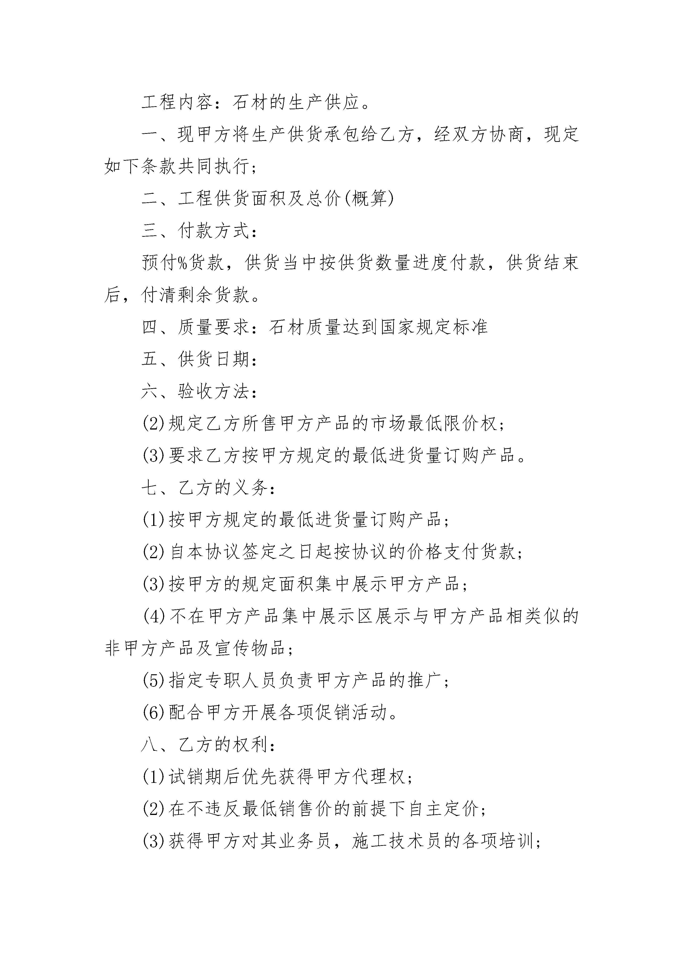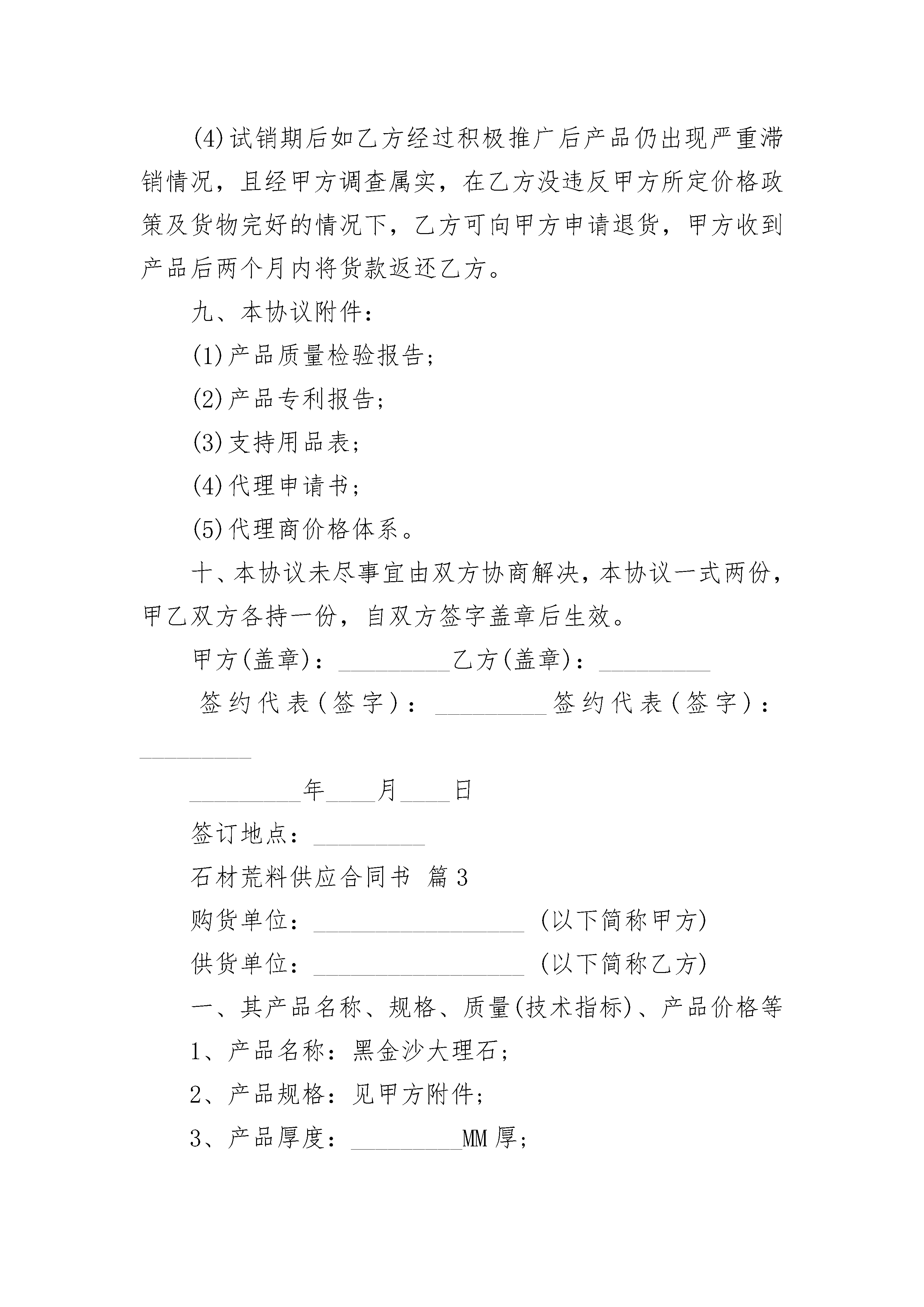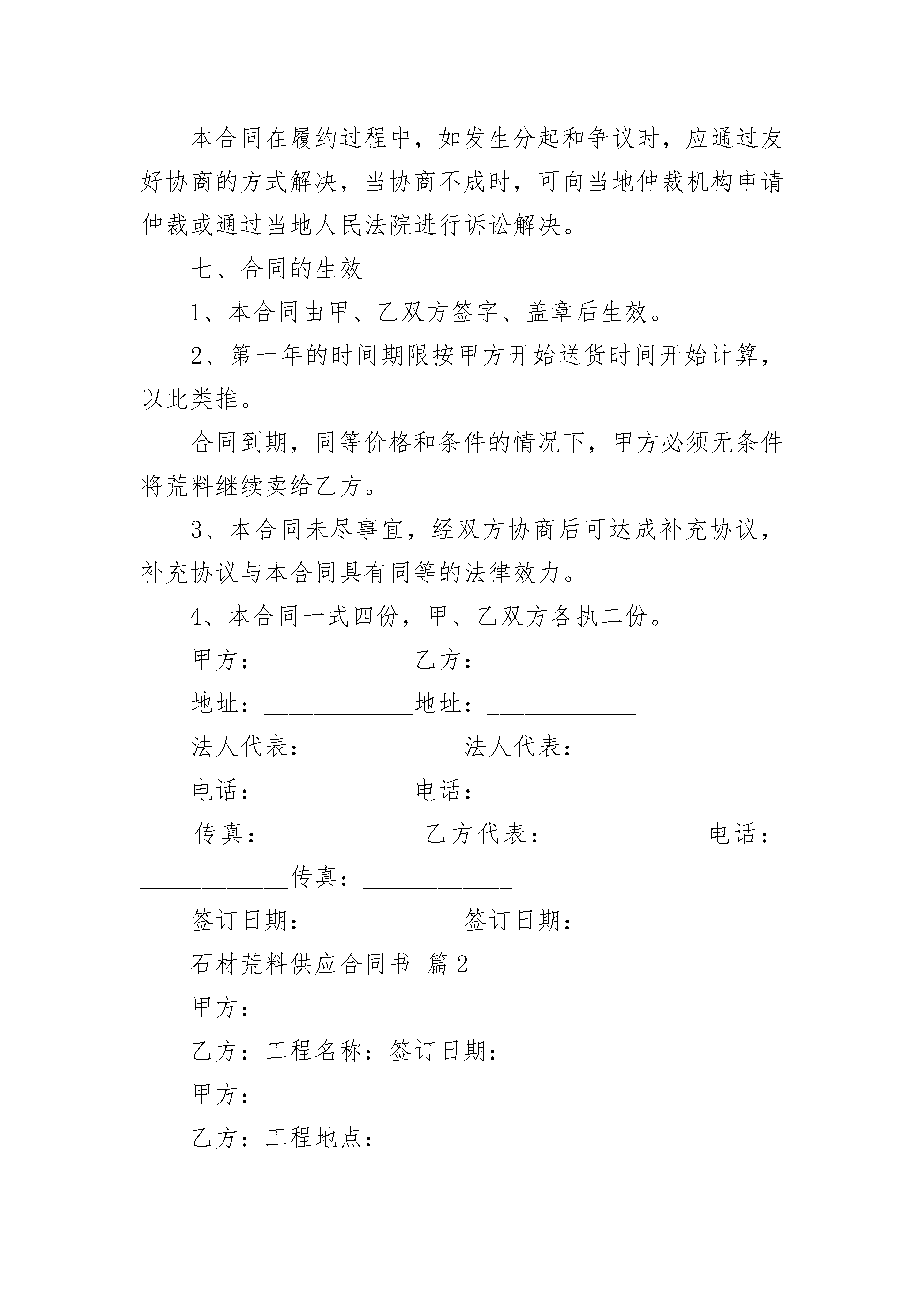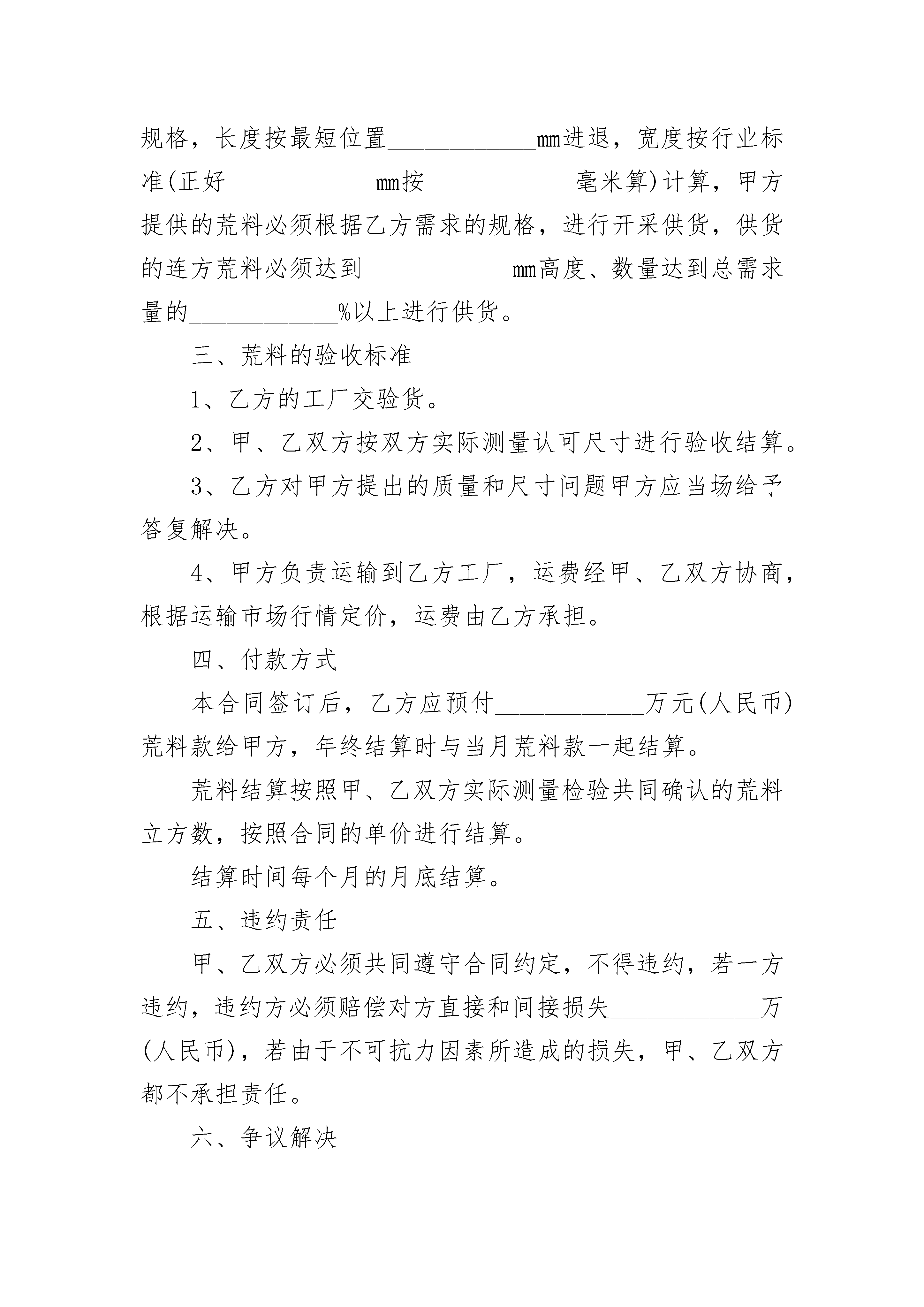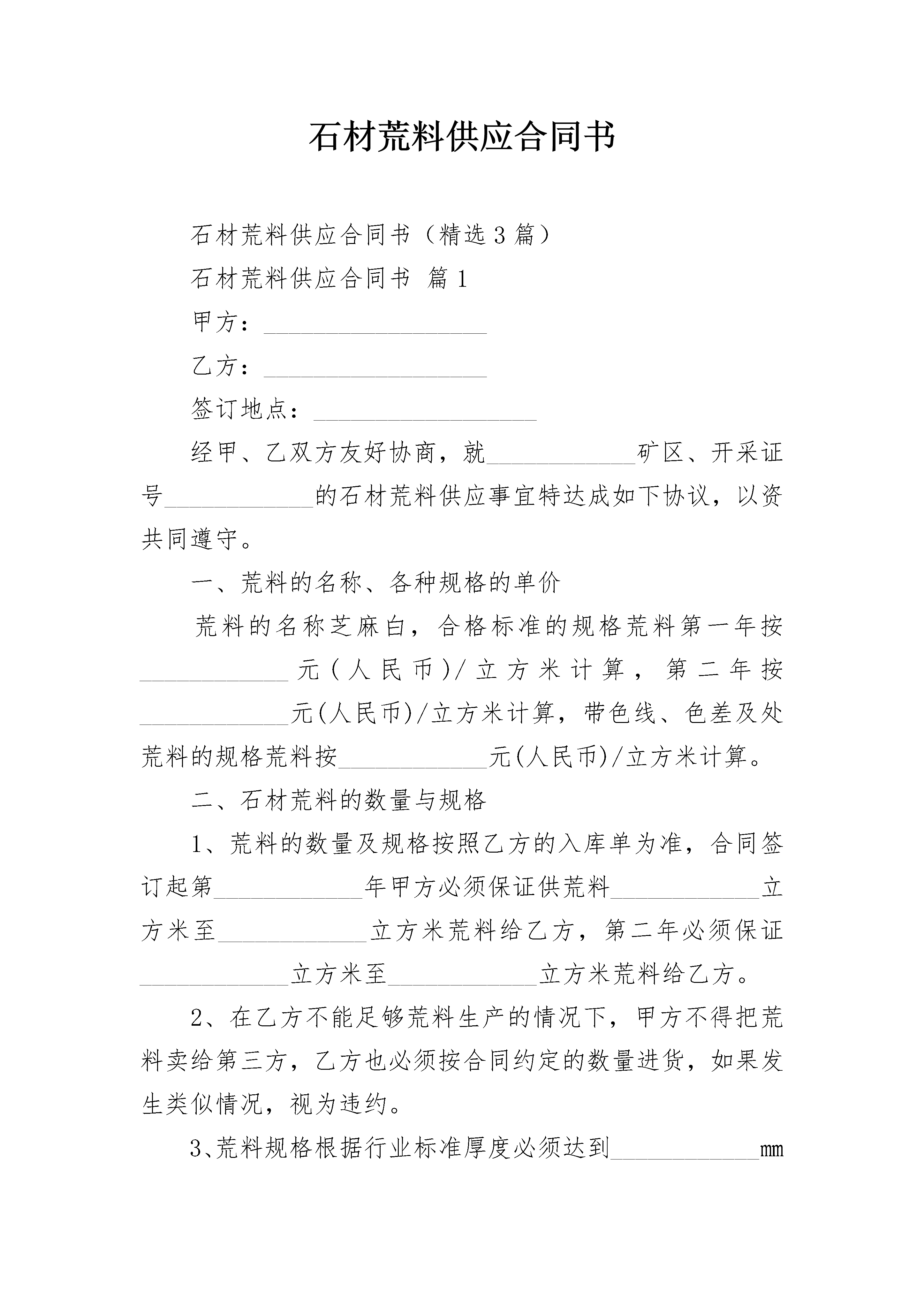 石材荒料供应合同书石材荒料供应合同书(精选3篇)石材荒料供应合同书篇1甲方:__________________乙方:__________________签订地点:__________________经甲、乙双方友好协商,就____________矿区、开采证号____________的石材荒料供应事宜特达成如下协议,以资共同遵守。一、荒料的名称、各种规格的单价荒料的名称芝麻白,合格标准的规格荒料第一年按____________元(人民币)/立方米计算,第二年按____________元(人民币)/立方米计算,带色线、色差及处荒料的规格荒料按____________元(人民币)/立方米计算。二、石材荒料的数量与规格1、荒料的数量及规格按照乙方的入库单为准,合同签订起第____________年甲方必须保证供荒料____________立方米至____________立方米荒料给乙方,第二年必须保证____________立方米至____________立方米荒料给乙方。2、在乙方不能足够荒料生产的情况下,甲方不得把荒料卖给第三方,乙方也必须按合同约定的数量进货,如果发生类似情况,视为违约。3、荒料规格根据行业标准厚度必须达到____________㎜规格,长度按最短位置____________㎜进退,宽度按行业标准(正好____________㎜按____________毫米算)计算,甲方提供的荒料必须根据乙方需求的规格,进行开采供货,供货的连方荒料必须达到____________㎜高度、数量达到总需求量的____________%以上进行供货。三、荒料的验收标准1、乙方的工厂交验货。2、甲、乙双方按双方实际测量认可尺寸进行验收结算。3、乙方对甲方提出的质量和尺寸问题甲方应当场给予答复解决。4、甲方负责运输到乙方工厂,运费经甲、乙双方协商,根据运输市场行情定价,运费由乙方承担。四、付款方式本合同签订后,乙方应预付____________万元(人民币)荒料款给甲方,年终结算时与当月荒料款一起结算。荒料结算按照甲、乙双方实际测量检验共同确认的荒料立方数,按照合同的单价进行结算。结算时间每个月的月底结算。五、违约责任甲、乙双方必须共同遵守合同约定,不得违约,若一方违约,违约方必须赔偿对方直接和间接损失____________万(人民币),若由于不可抗力因素所造成的损失,甲、乙双方都不承担责任。六、争议解决本合同在履约过程中,如发生分起和争议时,应通过友好协商的方式解决,当协商不成时,可向当地仲裁机构申请仲裁或通过当地人民法院进行诉讼解决。七、合同的生效1、本合同由甲、乙双方签字、盖章后生效。2、第一年的时间期限按甲方开始送货时间开始计算,以此类推。合同到期,同等价格和条件的情况下,甲方必须无条件将荒料继续卖给乙方。3、本合同未尽事宜,经双方协商后可达成补充协议,补充协议与本合同具有同等的法律效力。4、本合同一式四份,甲、乙双方各执二份。甲方:____________乙方:____________地址:____________地址:____________法人代表:____________法人代表:____________电话:____________电话:____________传真:____________乙方代表:____________电话:____________传真:____________签订日期:____________签订日期:____________石材荒料供应合同书篇2甲方:乙方:工程名称:签订日期:甲方:乙方:工程地点:工程内容:石材的生产供应。一、现甲方将生产供货承包给乙方,经双方协商,现定如下条款共同执行;二、工程供货面积及总价(概算)三、付款方式:预付%货款,供货当中按供货数量进度付款,供货结束后,付清剩余货款。四、质量要求:石材质量达到国家规定标准五、供货日期:六、验收方法:(2)规定乙方所售甲方产品的市场最低限价权;(3)要求乙方按甲方规定的最低进货量订购产品。七、乙方的义务:(1)按甲方规定的最低进货量订购产品;(2)自本协议签定之日起按协议的价格支付货款;(3)按甲方的规定面积集中展示甲方产品;(4)不在甲方产品集中展示区展示与甲方产品相类似的非甲方产品及宣传物品;(5)指定专职人员负责甲方产品的推广;(6)配合甲方开展各项促销活动。八、乙方的权利:(1)试销期后优先获得甲方代理权;(2)在不违反最低销售价的前提下自主定价;(3)获得甲方对其业务员,施工技术员的各项培训;(4)试销期后如乙方经过积极推广后产品仍出现严重滞销情况,且经甲方调查属实,在乙方没违反甲方所定价格政策及货物完好的情况下,乙方可向甲方申请退货,甲方收到产品后两个月内将货款返还乙方。九、本协议附件:(1)产品质量检验报告;(