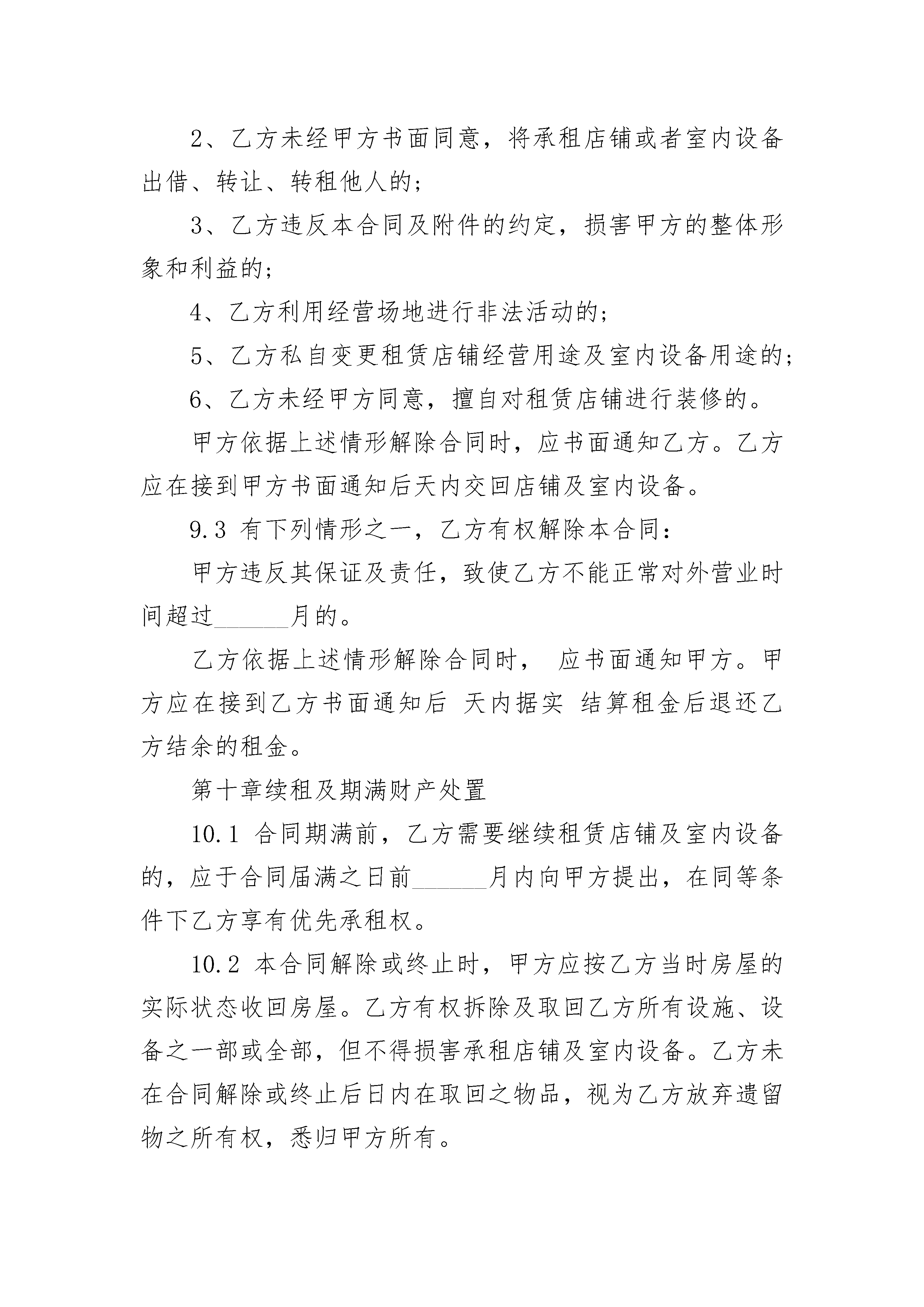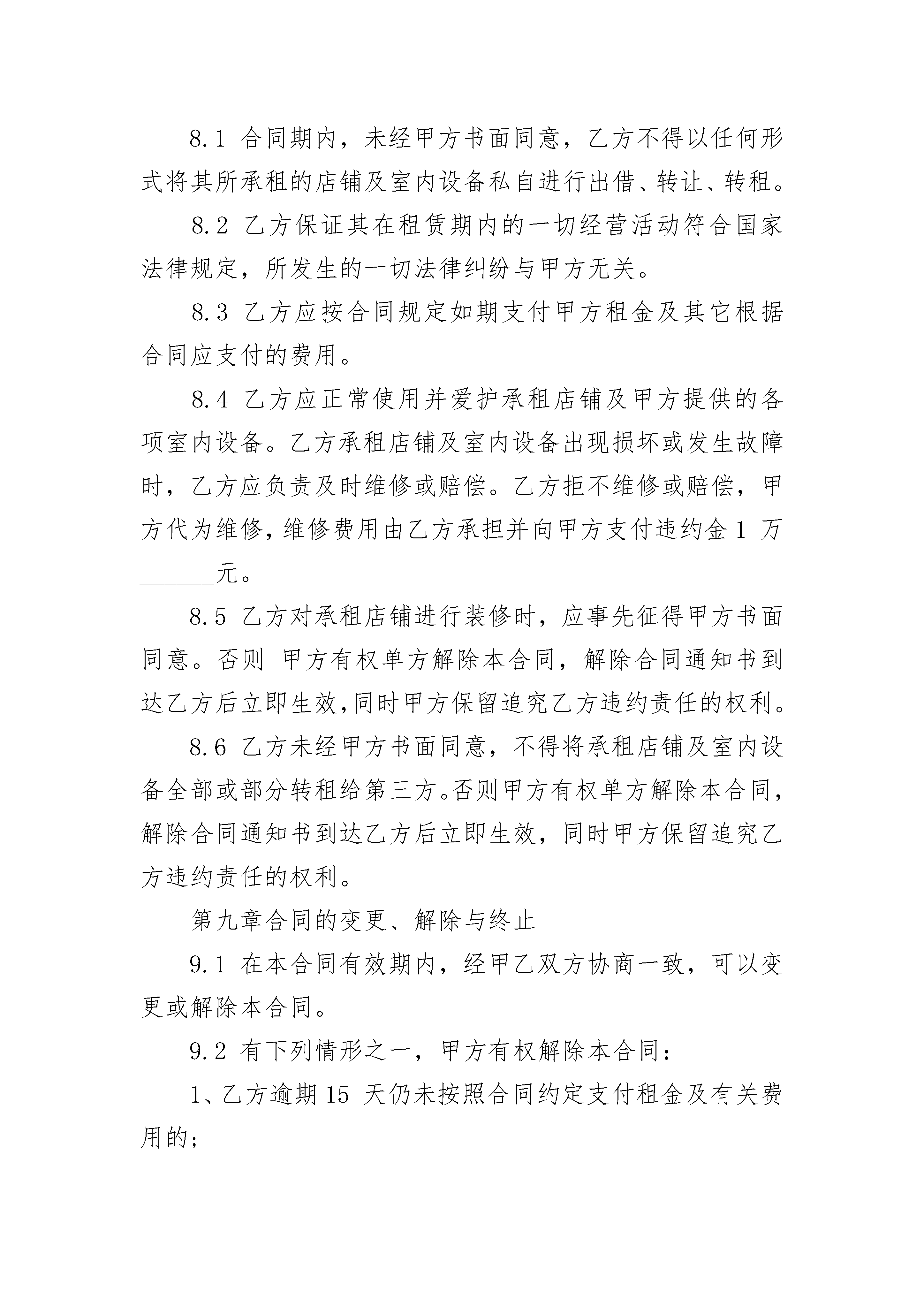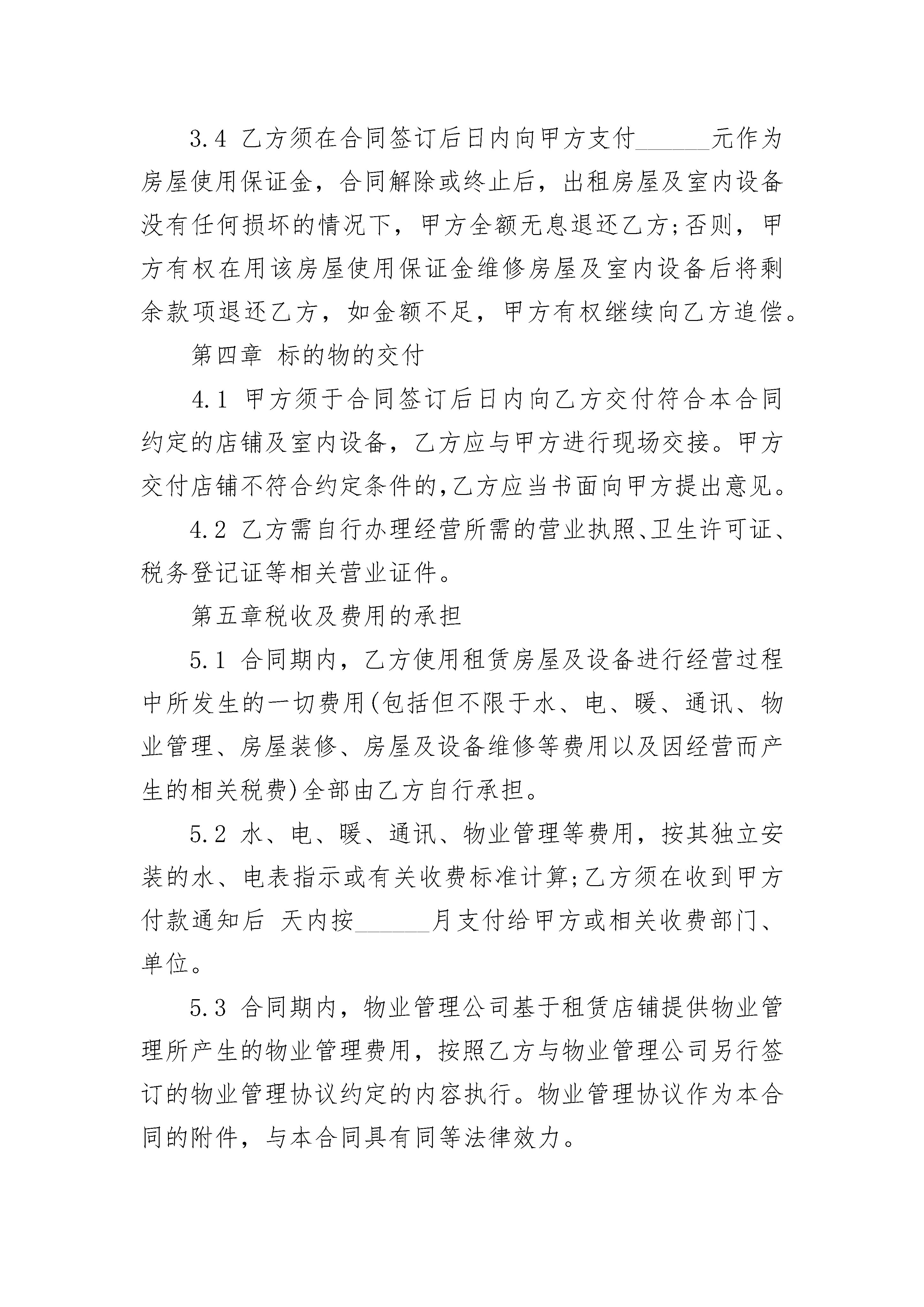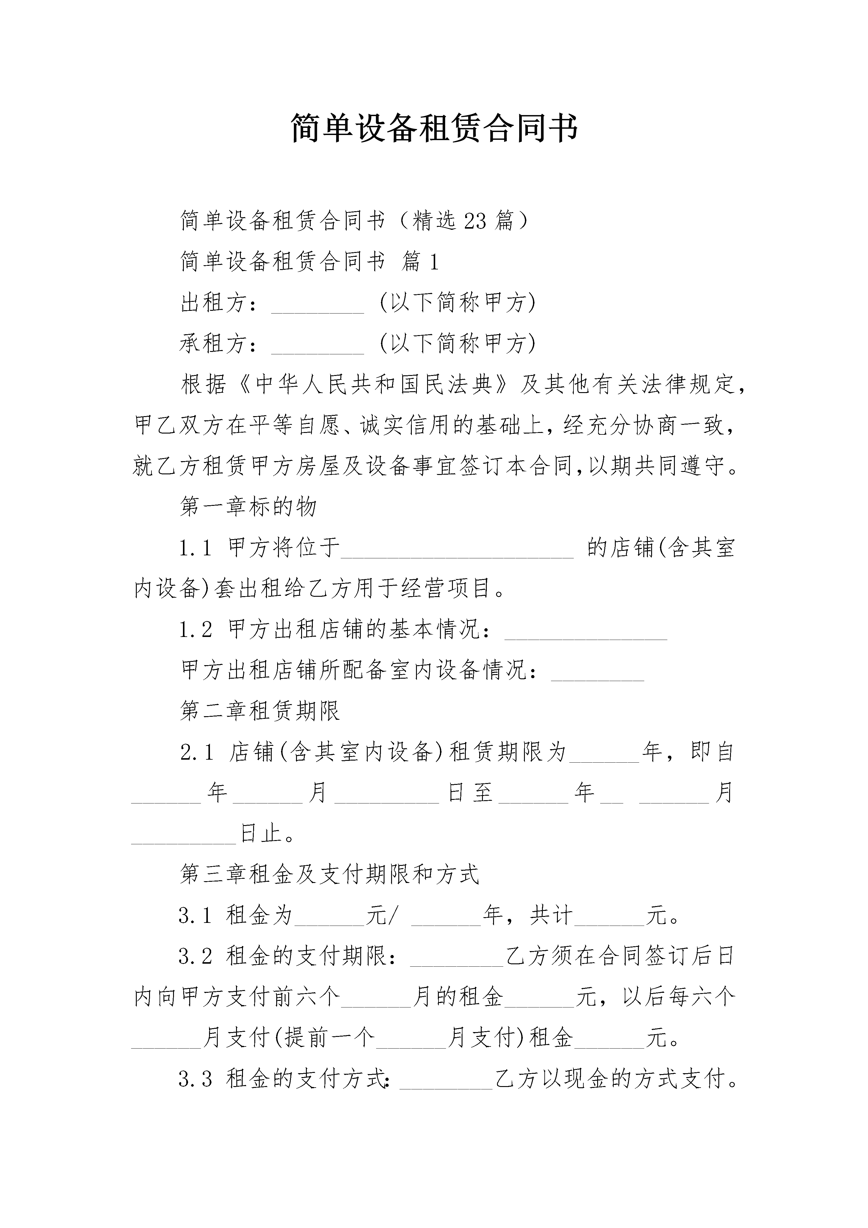 简单设备租赁合同书简单设备租赁合同书(精选23篇)简单设备租赁合同书篇1出租方:________(以下简称甲方)承租方:________(以下简称甲方)根据《中华人民共和国民法典》及其他有关法律规定,甲乙双方在平等自愿、诚实信用的基础上,经充分协商一致,就乙方租赁甲方房屋及设备事宜签订本合同,以期共同遵守。第一章标的物1.1甲方将位于____________________的店铺(含其室内设备)套出租给乙方用于经营项目。1.2甲方出租店铺的基本情况:______________甲方出租店铺所配备室内设备情况:________第二章租赁期限2.1店铺(含其室内设备)租赁期限为______年,即自______年______月_________日至______年________月_________日止。第三章租金及支付期限和方式3.1租金为______元/______年,共计______元。3.2租金的支付期限:________乙方须在合同签订后日内向甲方支付前六个______月的租金______元,以后每六个______月支付(提前一个______月支付)租金______元。3.3租金的支付方式:________乙方以现金的方式支付。3.4乙方须在合同签订后日内向甲方支付______元作为房屋使用保证金,合同解除或终止后,出租房屋及室内设备没有任何损坏的情况下,甲方全额无息退还乙方;否则,甲方有权在用该房屋使用保证金维修房屋及室内设备后将剩余款项退还乙方,如金额不足,甲方有权继续向乙方追偿。第四章标的物的交付4.1甲方须于合同签订后日内向乙方交付符合本合同约定的店铺及室内设备,乙方应与甲方进行现场交接。甲方交付店铺不符合约定条件的,乙方应当书面向甲方提出意见。4.2乙方需自行办理经营所需的营业执照、卫生许可证、税务登记证等相关营业证件。第五章税收及费用的承担5.1合同期内,乙方使用租赁房屋及设备进行经营过程中所发生的一切费用(包括但不限于水、电、暖、通讯、物业管理、房屋装修、房屋及设备维修等费用以及因经营而产生的相关税费)全部由乙方自行承担。5.2水、电、暖、通讯、物业管理等费用,按其独立安装的水、电表指示或有关收费标准计算;乙方须在收到甲方付款通知后天内按______月支付给甲方或相关收费部门、单位。5.3合同期内,物业管理公司基于租赁店铺提供物业管理所产生的物业管理费用,按照乙方与物业管理公司另行签订的物业管理协议约定的内容执行。物业管理协议作为本合同的附件,与本合同具有同等法律效力。第六章房屋的维修及装修6.1合同期内,店铺的维修除房屋的主体质量问题由甲方负责并承担费用之外,均由乙方负责并承担费用;店铺室内设备的维修均由乙方负责并承担费用。6.2合同期内,双方同意按下列规定对乙方租赁的店铺进行装修:1、乙方自行对店铺进行装修并承担费用。2、乙方装修店铺前应当将其设计的效果图、施工图、配电线路图、平面尺寸图等有关装修资料报甲方审核同意后,____________进行装修。3、乙方装修完毕后,须经甲方及有关部门验收合格后,____________开始营业。4、甲方有权对乙方在装修过程中的行为进行监督、检查,发现乙方的装修行为存在危险或安全隐患时,甲方有权制止,直到乙方消除危险或安全隐患。5、如因乙方的装修行为造成甲方或第三人的财产、人身的损害时,均由乙方承担赔偿责任。第七章甲方的保证及责任7.1甲方保证对本合同约定的店铺及室内设备具有所有权、出租权或转租权,保证乙方按本合同约定使用该店铺及室内设备期间不会受到任何第三方的阻扰和干涉。7.2合同期内,甲方确需对出租的店铺进行改建或扩建的,须事先征得乙方同意,尽量不影响乙方正常经营。第八章乙方保证及责任8.1合同期内,未经甲方书面同意,乙方不得以任何形式将其所承租的店铺及室内设备私自进行出借、转让、转租。8.2乙方保证其在租赁期内的一切经营活动符合国家法律规定,所发生的一切法律纠纷与甲方无关。8.3乙方应按合同规定如期支付甲方租金及其它根据合同应支付的费用。8.4乙方应正常使用并爱护承租店铺及甲方提供的各项室内设备。乙方承租店铺及室内设备出现损坏或发生故障时,乙方应负责及时维修或赔偿。乙方拒不维修或赔偿,甲方代为维修,维修费用由乙方承担并向甲方支付违约金1万______元。8.5乙方对承租店铺进行装修时,应事先征得甲方书面同意。否则甲方有权单方解除本合同,解除合同通知书到达乙方后立即生效,同时甲方保留追究乙方违约责任的权利。8.6乙方未经甲方书面同意,不得将承租店铺及室内设备全部或部分转租给第三方。否则甲方有权单方解除本合同,解除合同通知书到达乙方后立即生效,同时甲方保留追究乙方违约责任的权利。第九章合同的变更、解除与终止9.1在本合同有效期内,经甲乙双方协商一致,可以变更或解除