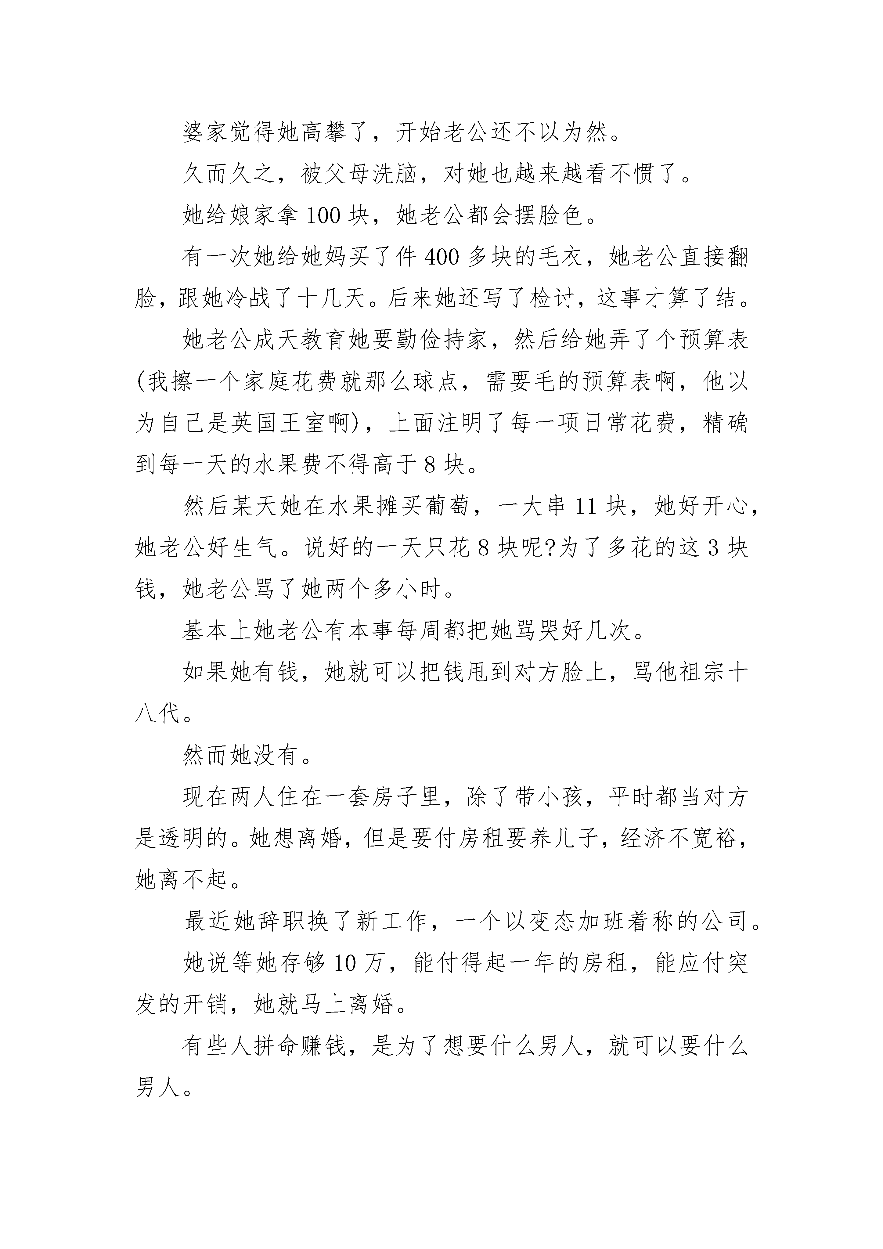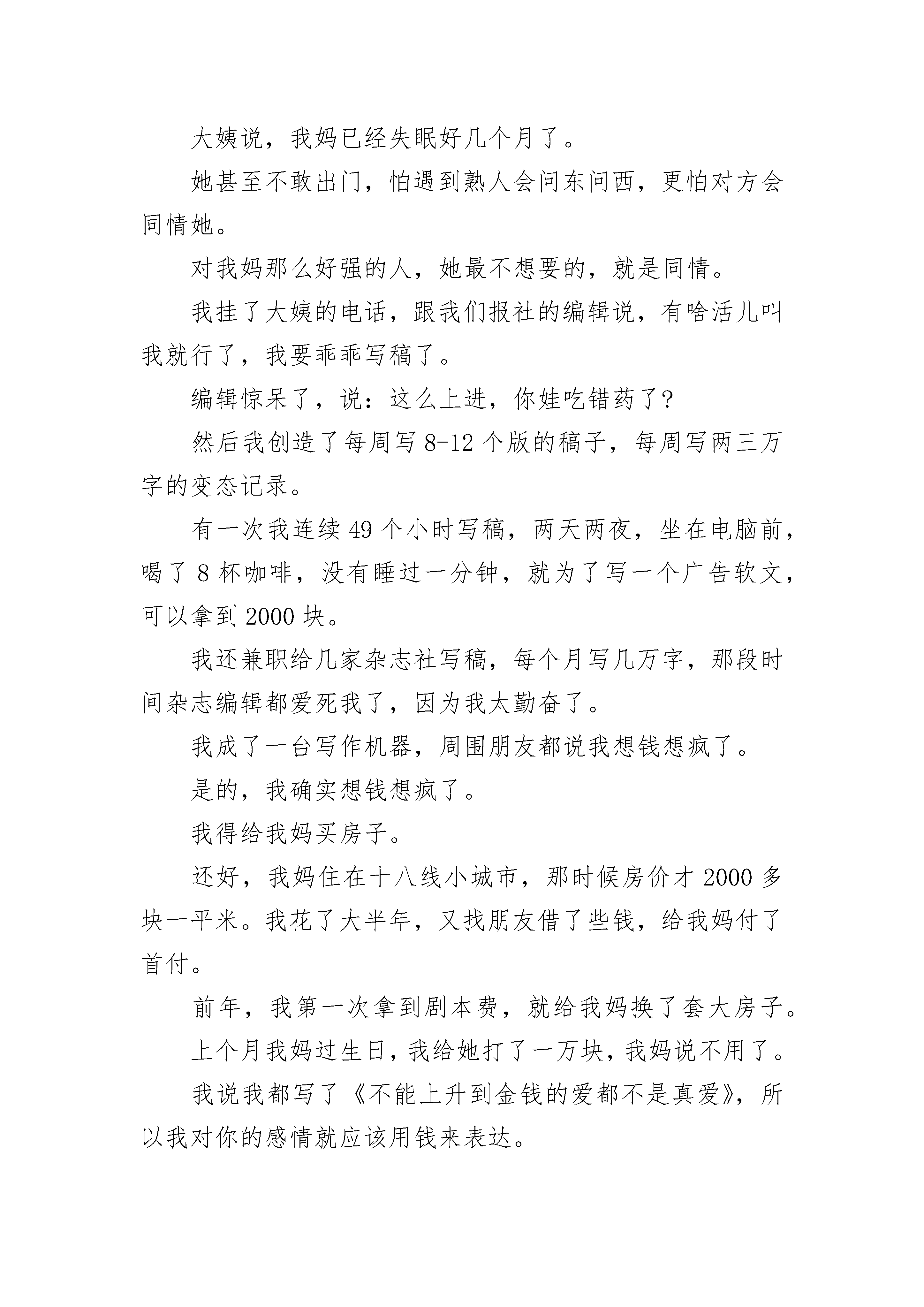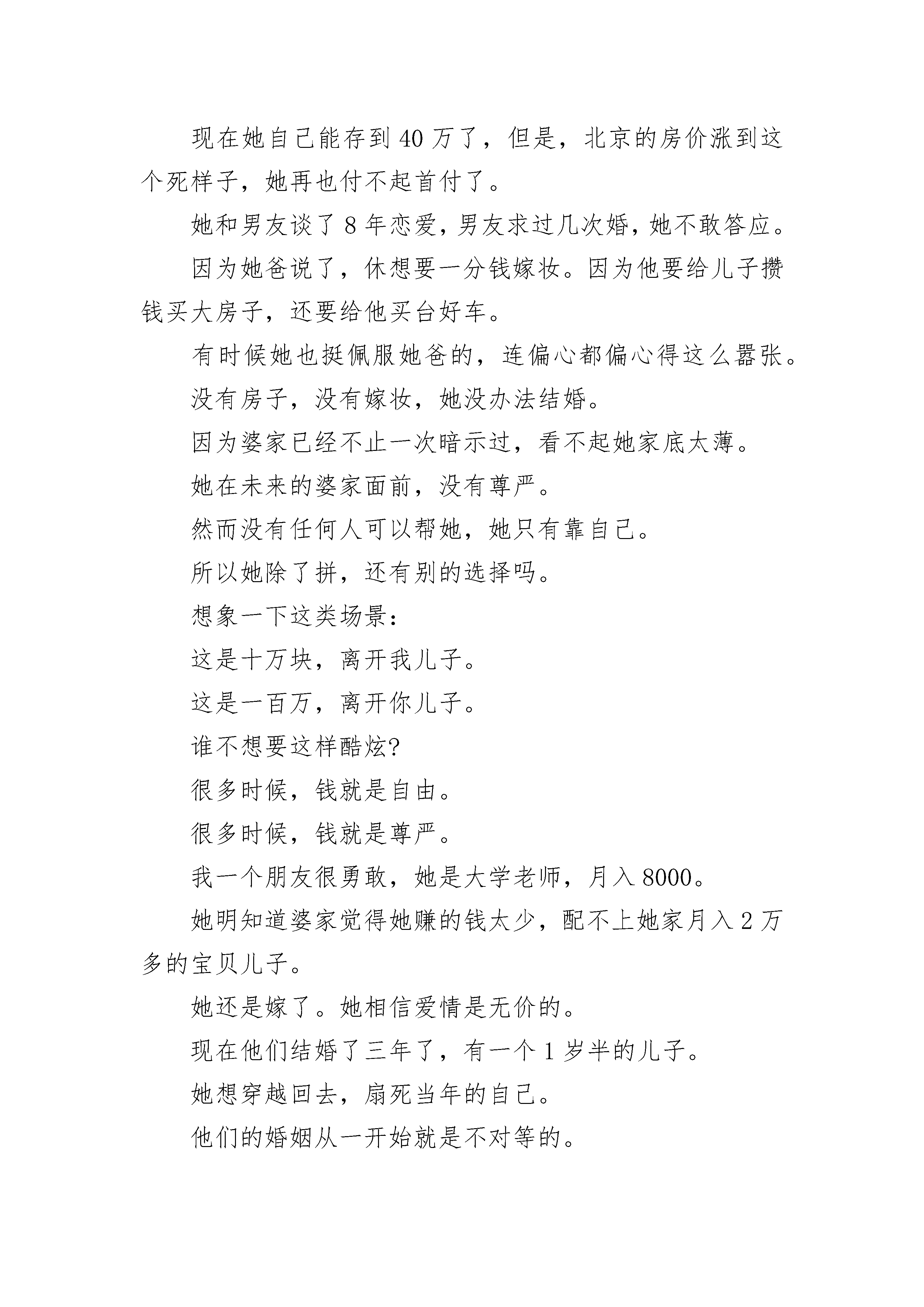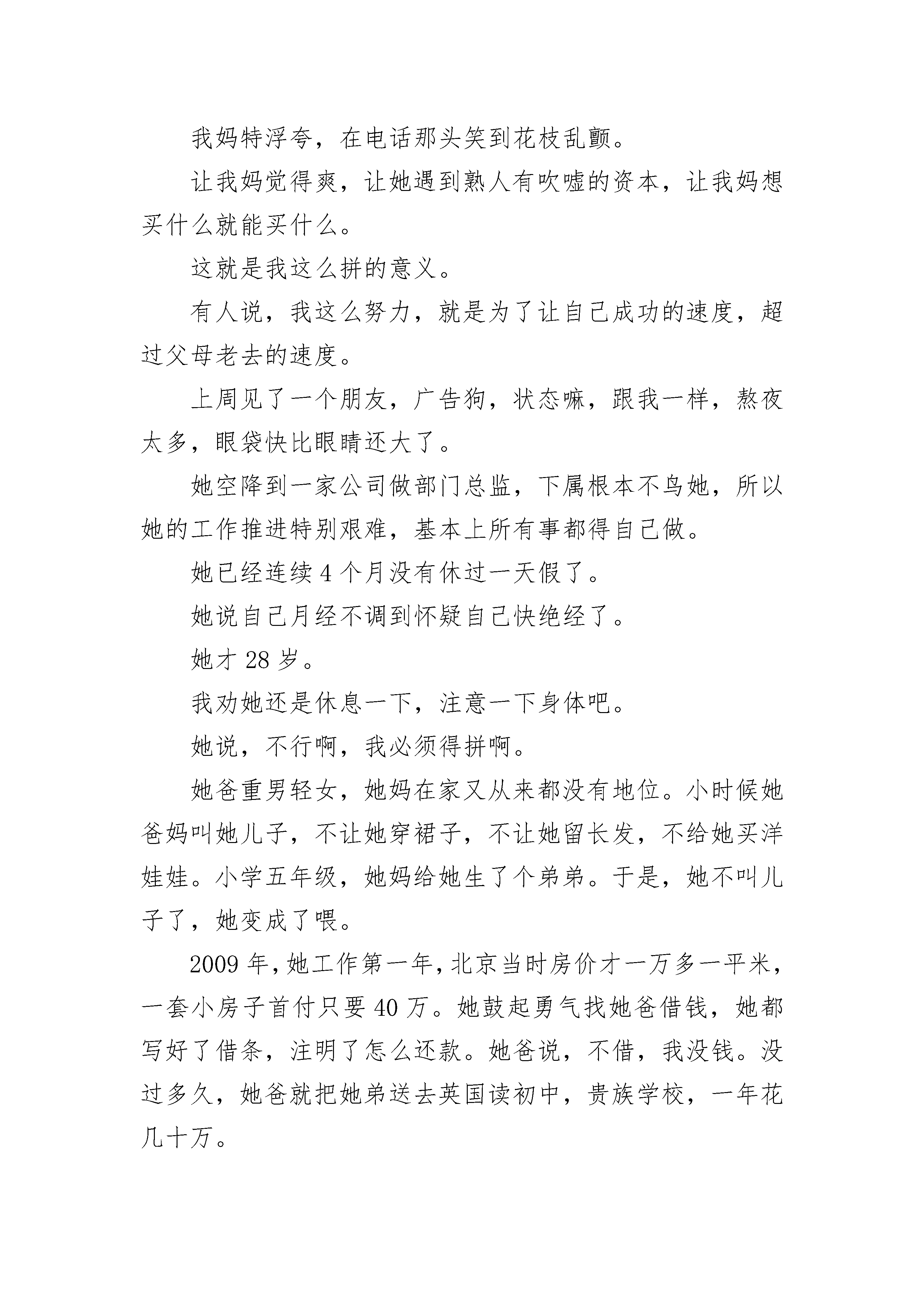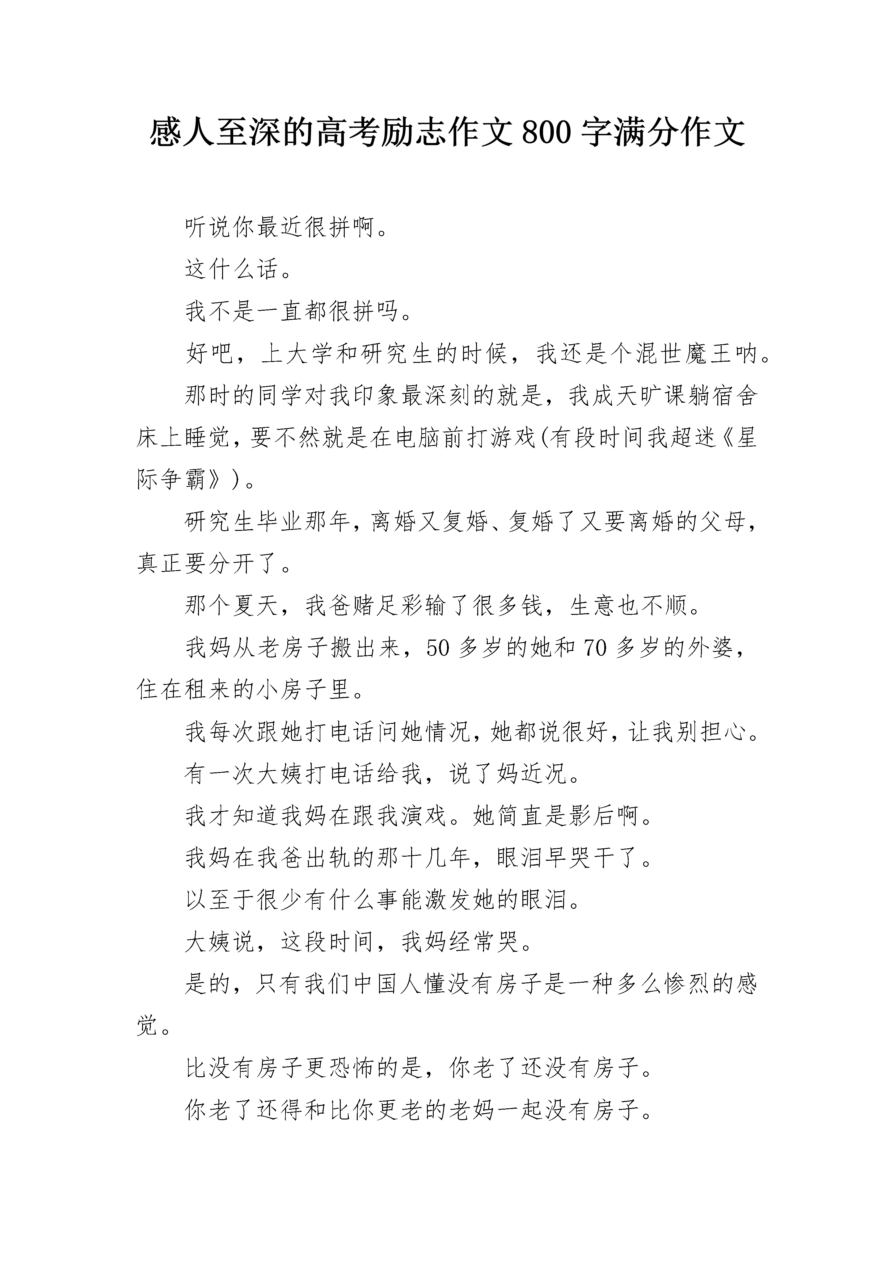 感人至深的高考励志作文800字满分作文听说你最近很拼啊。这什么话。我不是一直都很拼吗。好吧,上大学和研究生的时候,我还是个混世魔王呐。那时的同学对我印象最深刻的就是,我成天旷课躺宿舍床上睡觉,要不然就是在电脑前打游戏(有段时间我超迷《星际争霸》)。研究生毕业那年,离婚又复婚、复婚了又要离婚的父母,真正要分开了。那个夏天,我爸赌足彩输了很多钱,生意也不顺。我妈从老房子搬出来,50多岁的她和70多岁的外婆,住在租来的小房子里。我每次跟她打电话问她情况,她都说很好,让我别担心。有一次大姨打电话给我,说了妈近况。我才知道我妈在跟我演戏。她简直是影后啊。我妈在我爸出轨的那十几年,眼泪早哭干了。以至于很少有什么事能激发她的眼泪。大姨说,这段时间,我妈经常哭。是的,只有我们中国人懂没有房子是一种多么惨烈的感觉。比没有房子更恐怖的是,你老了还没有房子。你老了还得和比你更老的老妈一起没有房子。大姨说,我妈已经失眠好几个月了。她甚至不敢出门,怕遇到熟人会问东问西,更怕对方会同情她。对我妈那么好强的人,她最不想要的,就是同情。我挂了大姨的电话,跟我们报社的编辑说,有啥活儿叫我就行了,我要乖乖写稿了。编辑惊呆了,说:这么上进,你娃吃错药了?然后我创造了每周写8-12个版的稿子,每周写两三万字的变态记录。有一次我连续49个小时写稿,两天两夜,坐在电脑前,喝了8杯咖啡,没有睡过一分钟,就为了写一个广告软文,可以拿到2000块。我还兼职给几家杂志社写稿,每个月写几万字,那段时间杂志编辑都爱死我了,因为我太勤奋了。我成了一台写作机器,周围朋友都说我想钱想疯了。是的,我确实想钱想疯了。我得给我妈买房子。还好,我妈住在十八线小城市,那时候房价才2000多块一平米。我花了大半年,又找朋友借了些钱,给我妈付了首付。前年,我第一次拿到剧本费,就给我妈换了套大房子。上个月我妈过生日,我给她打了一万块,我妈说不用了。我说我都写了《不能上升到金钱的爱都不是真爱》,所以我对你的感情就应该用钱来表达。我妈特浮夸,在电话那头笑到花枝乱颤。让我妈觉得爽,让她遇到熟人有吹嘘的资本,让我妈想买什么就能买什么。这就是我这么拼的意义。有人说,我这么努力,就是为了让自己成功的速度,超过父母老去的速度。上周见了一个朋友,广告狗,状态嘛,跟我一样,熬夜太多,眼袋快比眼睛还大了。她空降到一家公司做部门总监,下属根本不鸟她,所以她的工作推进特别艰难,基本上所有事都得自己做。她已经连续4个月没有休过一天假了。她说自己月经不调到怀疑自己快绝经了。她才28岁。我劝她还是休息一下,注意一下身体吧。她说,不行啊,我必须得拼啊。她爸重男轻女,她妈在家又从来都没有地位。小时候她爸妈叫她儿子,不让她穿裙子,不让她留长发,不给她买洋娃娃。小学五年级,她妈给她生了个弟弟。于是,她不叫儿子了,她变成了喂。2009年,她工作第一年,北京当时房价才一万多一平米,一套小房子首付只要40万。她鼓起勇气找她爸借钱,她都写好了借条,注明了怎么还款。她爸说,不借,我没钱。没过多久,她爸就把她弟送去英国读初中,贵族学校,一年花几十万。现在她自己能存到40万了,但是,北京的房价涨到这个死样子,她再也付不起首付了。她和男友谈了8年恋爱,男友求过几次婚,她不敢答应。因为她爸说了,休想要一分钱嫁妆。因为他要给儿子攒钱买大房子,还要给他买台好车。有时候她也挺佩服她爸的,连偏心都偏心得这么嚣张。没有房子,没有嫁妆,她没办法结婚。因为婆家已经不止一次暗示过,看不起她家底太薄。她在未来的婆家面前,没有尊严。然而没有任何人可以帮她,她只有靠自己。所以她除了拼,还有别的选择吗。想象一下这类场景:这是十万块,离开我儿子。这是一百万,离开你儿子。谁不想要这样酷炫?很多时候,钱就是自由。很多时候,钱就是尊严。我一个朋友很勇敢,她是大学老师,月入8000。她明知道婆家觉得她赚的钱太少,配不上她家月入2万多的宝贝儿子。她还是嫁了。她相信爱情是无价的。现在他们结婚了三年了,有一个1岁半的儿子。她想穿越回去,扇死当年的自己。他们的婚姻从一开始就是不对等的。婆家觉得她高攀了,开始老公还不以为然。久而久之,被父母洗脑,对她也越来越看不惯了。她给娘家拿100块,她老公都会摆脸色。有一次她给她妈买了件400多块的毛衣,她老公直接翻脸,跟她冷战了十几天。后来她还写了检讨,这事才算了结。她老公成天教育她要勤俭持家,然后给她弄了个预算表(我擦一个家庭花费就那么球点,需要毛的预算表啊,他以为自己是英国王室啊),上面注明了每一项日常花费,精确到每一天的水果费不得高于8块。然后某天她在水果摊买葡萄,一大串11块,她好开心,她老公好生气。说好的一天只花8块呢?为了多花的这3块钱,她老公骂了她两个多小时。基本上她老公有本事每周都把她骂哭好几次。如果她有钱,她就可以把钱甩到对方脸上,骂他祖宗