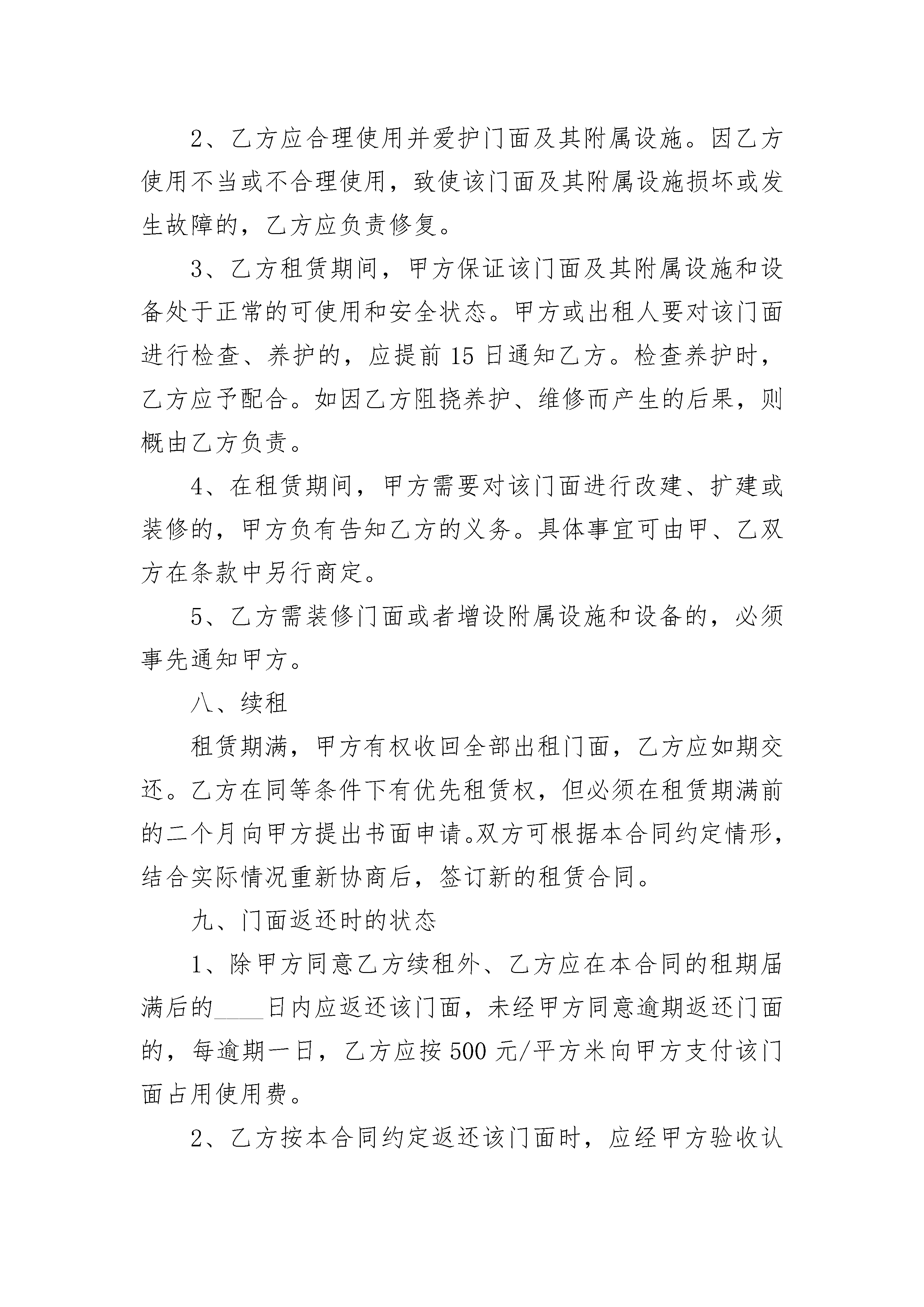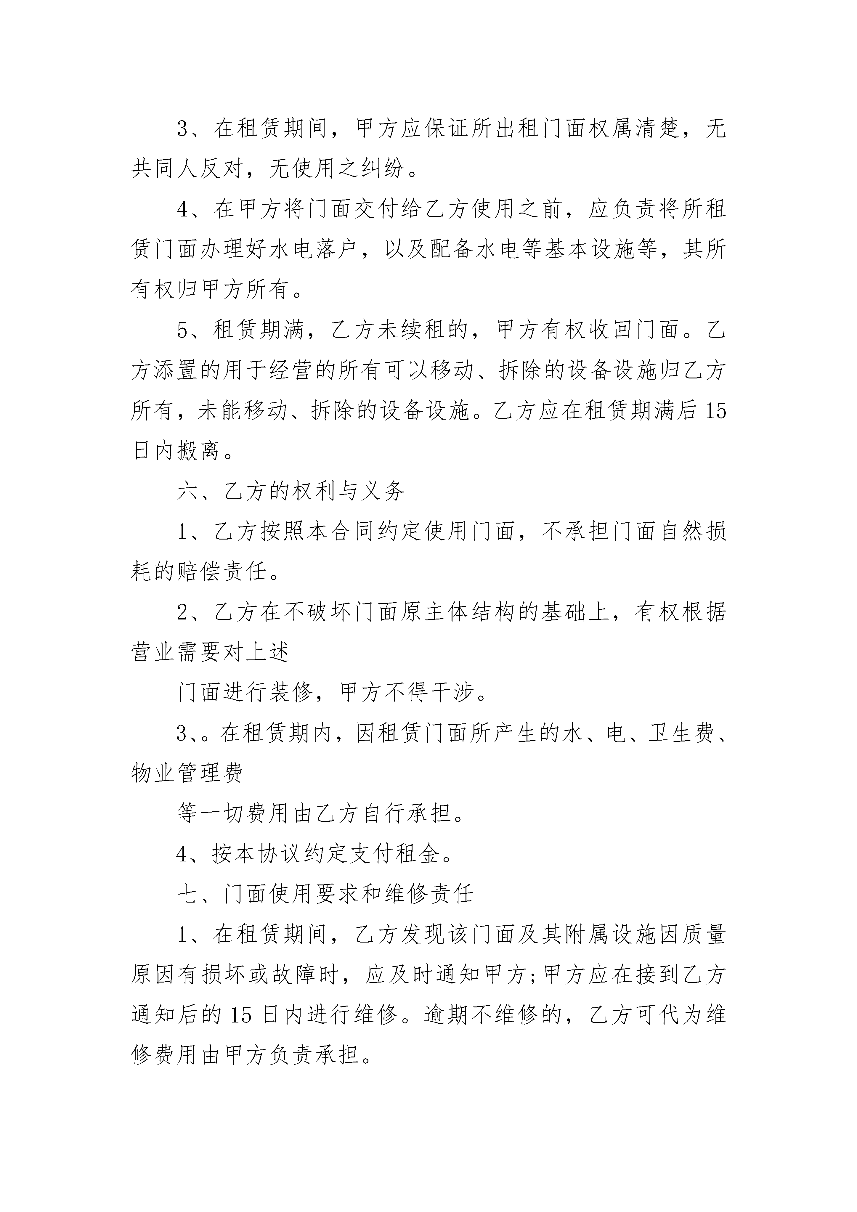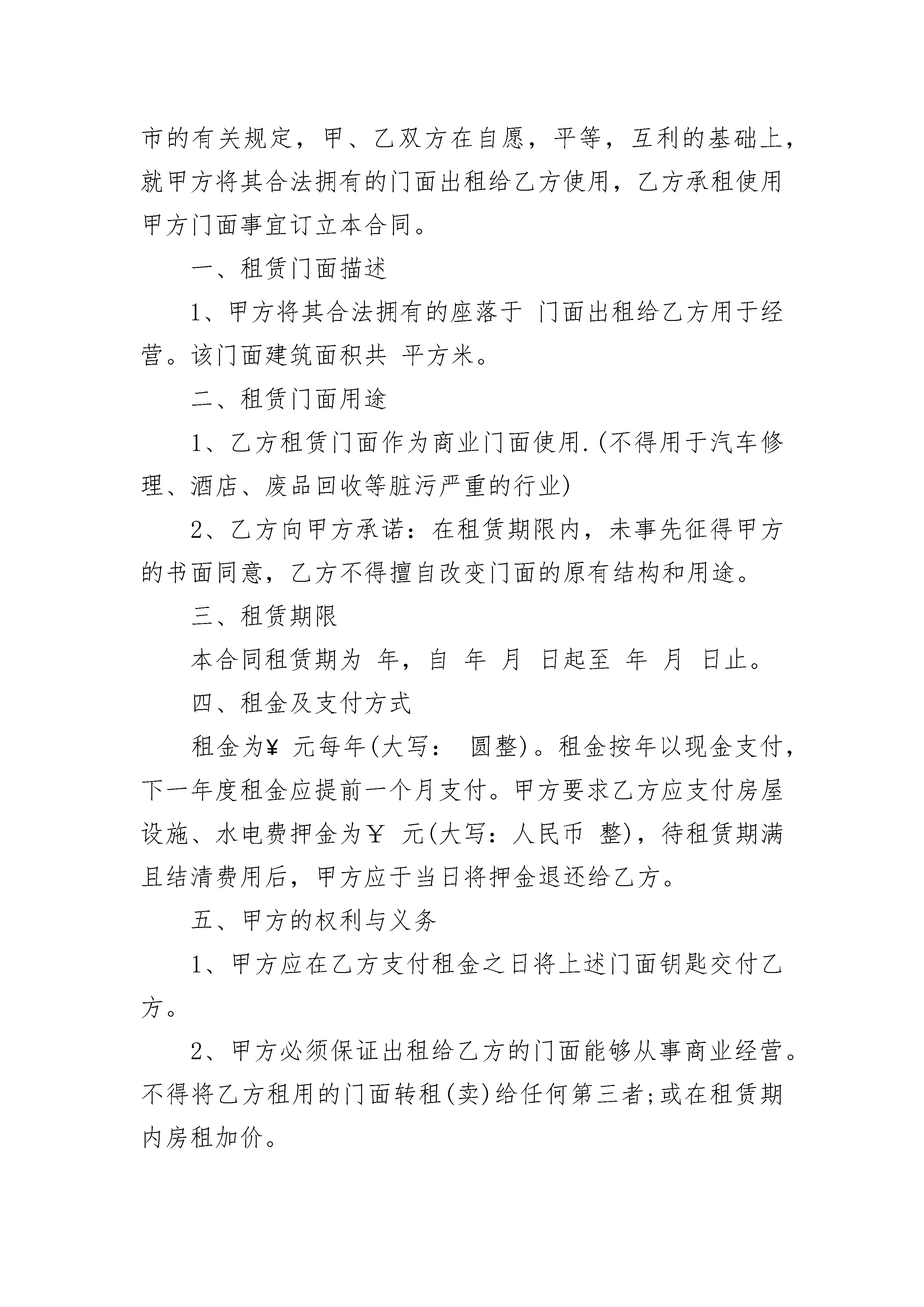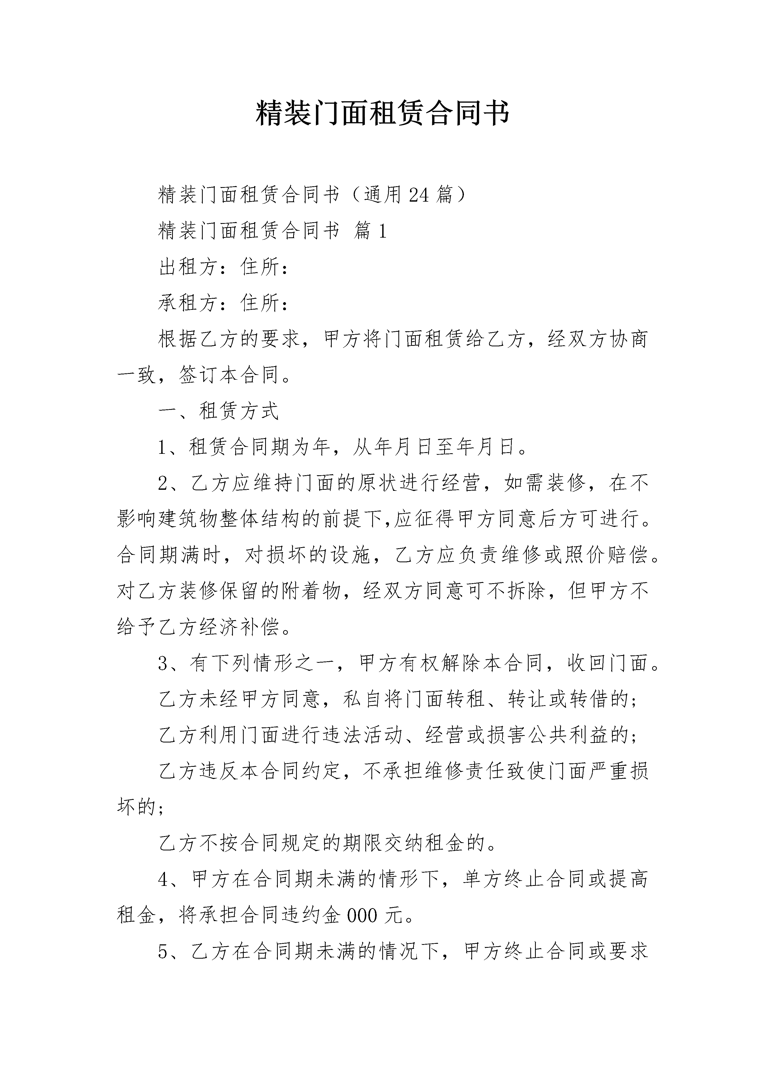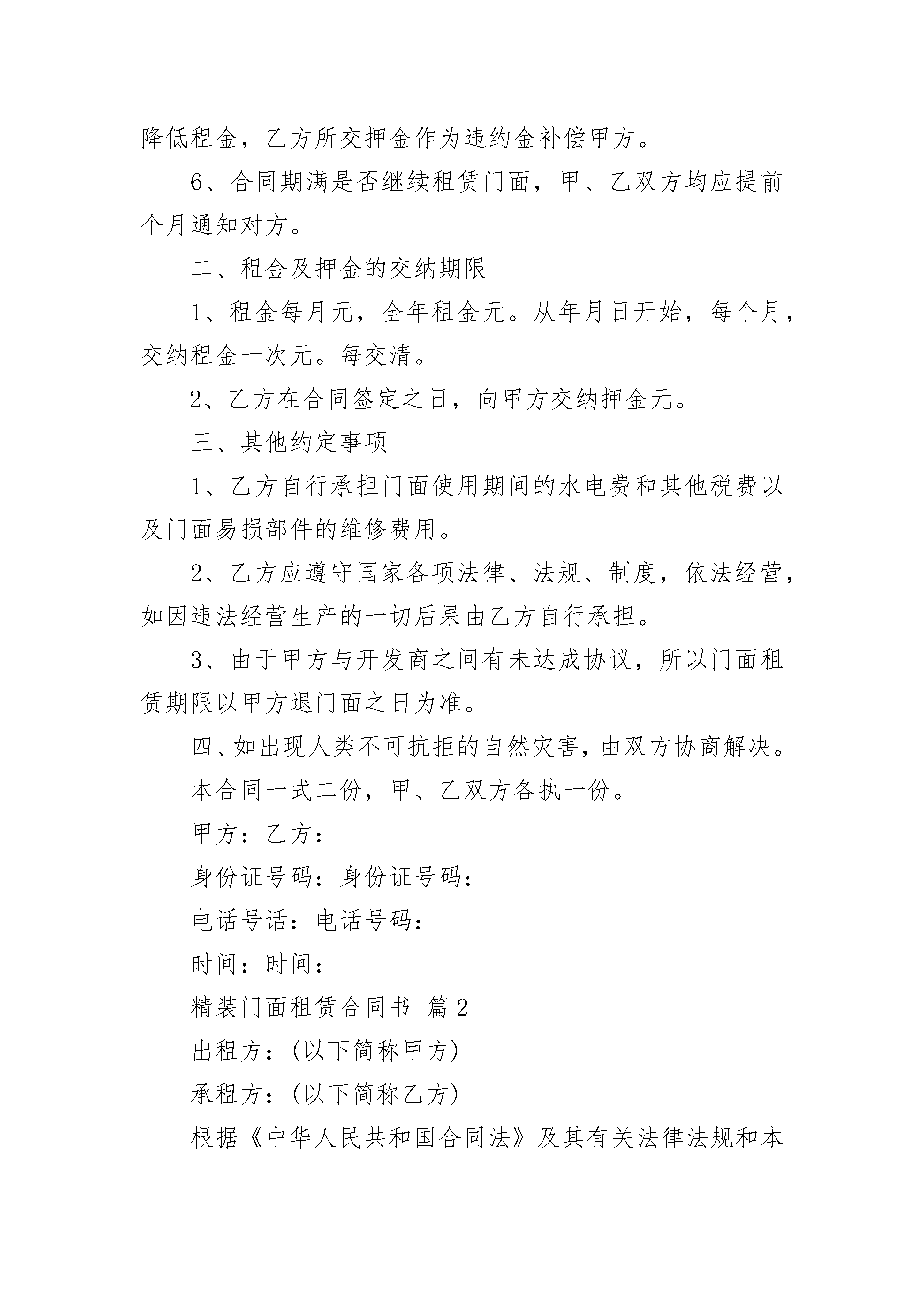 精装门面租赁合同书精装门面租赁合同书(通用24篇)精装门面租赁合同书篇1出租方:住所:承租方:住所:根据乙方的要求,甲方将门面租赁给乙方,经双方协商一致,签订本合同。一、租赁方式1、租赁合同期为年,从年月日至年月日。2、乙方应维持门面的原状进行经营,如需装修,在不影响建筑物整体结构的前提下,应征得甲方同意后方可进行。合同期满时,对损坏的设施,乙方应负责维修或照价赔偿。对乙方装修保留的附着物,经双方同意可不拆除,但甲方不给予乙方经济补偿。3、有下列情形之一,甲方有权解除本合同,收回门面。乙方未经甲方同意,私自将门面转租、转让或转借的;乙方利用门面进行违法活动、经营或损害公共利益的;乙方违反本合同约定,不承担维修责任致使门面严重损坏的;乙方不按合同规定的期限交纳租金的。4、甲方在合同期未满的情形下,单方终止合同或提高租金,将承担合同违约金000元。5、乙方在合同期未满的情况下,甲方终止合同或要求降低租金,乙方所交押金作为违约金补偿甲方。6、合同期满是否继续租赁门面,甲、乙双方均应提前个月通知对方。二、租金及押金的交纳期限1、租金每月元,全年租金元。从年月日开始,每个月,交纳租金一次元。每交清。2、乙方在合同签定之日,向甲方交纳押金元。三、其他约定事项1、乙方自行承担门面使用期间的水电费和其他税费以及门面易损部件的维修费用。2、乙方应遵守国家各项法律、法规、制度,依法经营,如因违法经营生产的一切后果由乙方自行承担。3、由于甲方与开发商之间有未达成协议,所以门面租赁期限以甲方退门面之日为准。四、如出现人类不可抗拒的自然灾害,由双方协商解决。本合同一式二份,甲、乙双方各执一份。甲方:乙方:身份证号码:身份证号码:电话号话:电话号码:时间:时间:精装门面租赁合同书篇2出租方:(以下简称甲方)承租方:(以下简称乙方)根据《中华人民共和国合同法》及其有关法律法规和本市的有关规定,甲、乙双方在自愿,平等,互利的基础上,就甲方将其合法拥有的门面出租给乙方使用,乙方承租使用甲方门面事宜订立本合同。一、租赁门面描述1、甲方将其合法拥有的座落于门面出租给乙方用于经营。该门面建筑面积共平方米。二、租赁门面用途1、乙方租赁门面作为商业门面使用.(不得用于汽车修理、酒店、废品回收等脏污严重的行业)2、乙方向甲方承诺:在租赁期限内,未事先征得甲方的书面同意,乙方不得擅自改变门面的原有结构和用途。三、租赁期限本合同租赁期为年,自年月日起至年月日止。四、租金及支付方式租金为¥元每年(大写:圆整)。租金按年以现金支付,下一年度租金应提前一个月支付。甲方要求乙方应支付房屋设施、水电费押金为¥元(大写:人民币整),待租赁期满且结清费用后,甲方应于当日将押金退还给乙方。五、甲方的权利与义务1、甲方应在乙方支付租金之日将上述门面钥匙交付乙方。2、甲方必须保证出租给乙方的门面能够从事商业经营。不得将乙方租用的门面转租(卖)给任何第三者;或在租赁期内房租加价。3、在租赁期间,甲方应保证所出租门面权属清楚,无共同人反对,无使用之纠纷。4、在甲方将门面交付给乙方使用之前,应负责将所租赁门面办理好水电落户,以及配备水电等基本设施等,其所有权归甲方所有。5、租赁期满,乙方未续租的,甲方有权收回门面。乙方添置的用于经营的所有可以移动、拆除的设备设施归乙方所有,未能移动、拆除的设备设施。乙方应在租赁期满后15日内搬离。六、乙方的权利与义务1、乙方按照本合同约定使用门面,不承担门面自然损耗的赔偿责任。2、乙方在不破坏门面原主体结构的基础上,有权根据营业需要对上述门面进行装修,甲方不得干涉。3、。在租赁期内,因租赁门面所产生的水、电、卫生费、物业管理费等一切费用由乙方自行承担。4、按本协议约定支付租金。七、门面使用要求和维修责任1、在租赁期间,乙方发现该门面及其附属设施因质量原因有损坏或故障时,应及时通知甲方;甲方应在接到乙方通知后的15日内进行维修。逾期不维修的,乙方可代为维修费用由甲方负责承担。2、乙方应合理使用并爱护门面及其附属设施。因乙方使用不当或不合理使用,致使该门面及其附属设施损坏或发生故障的,乙方应负责修复。3、乙方租赁期间,甲方保证该门面及其附属设施和设备处于正常的可使用和安全状态。甲方或出租人要对该门面进行检查、养护的,应提前15日通知乙方。检查养护时,乙方应予配合。如因乙方阻挠养护、维修而产生的后果,则概由乙方负责。4、在租赁期间,甲方需要对该门面进行改建、扩建或装修的,甲方负有告知乙方的义务。具体事宜可由甲、乙双方在条款中另行商定。5、乙方需装修门面或者增设附属设施和设备的,必须事先通知甲方。八、续租租赁期满,甲方有权收回全部出租门面,乙方应如期交还。乙方在同等条件下有优先租赁权,但必须在租赁期满前的二个月向甲方提出书面申请。双方可根据本合同约定情形,结合实际情况重新