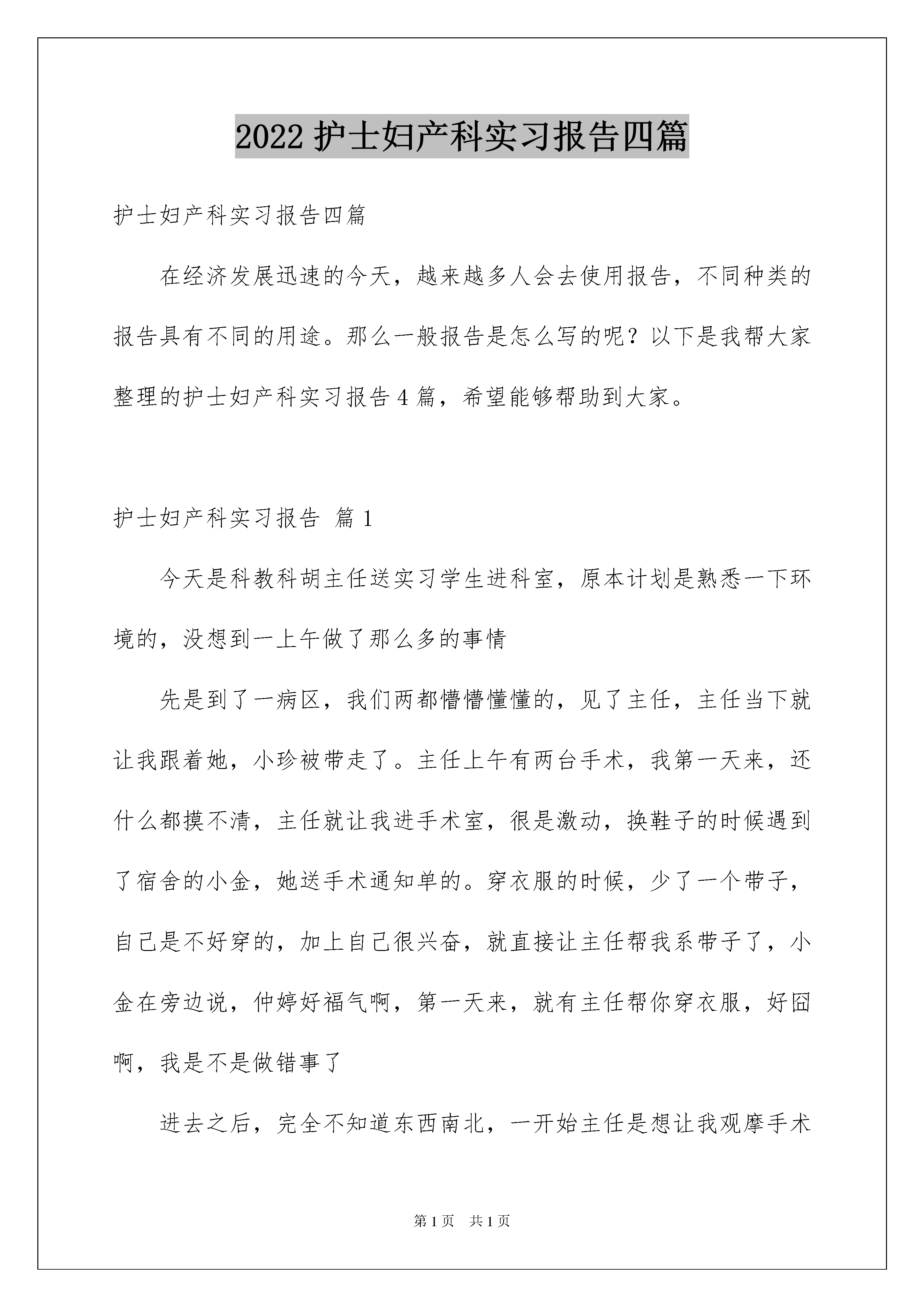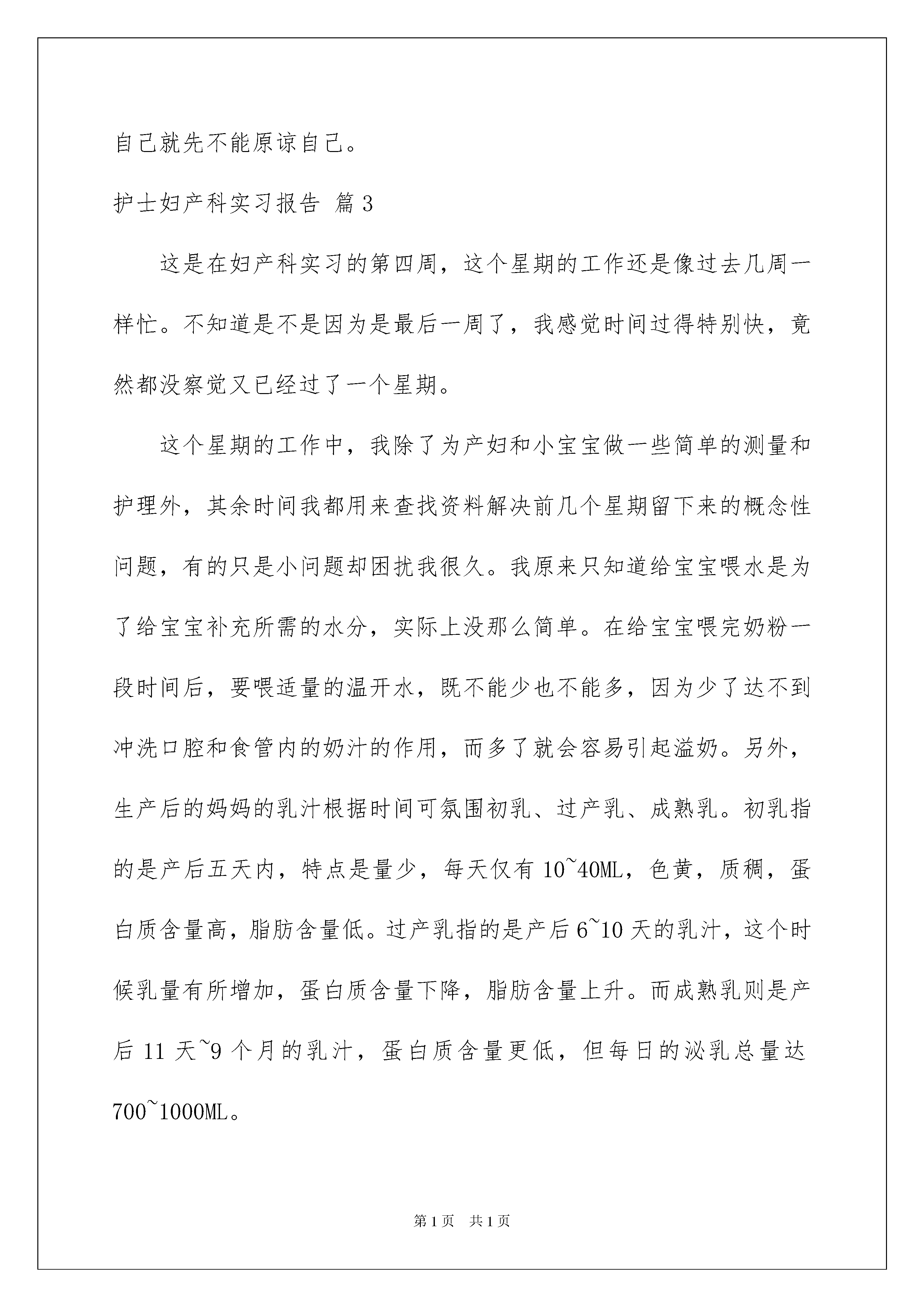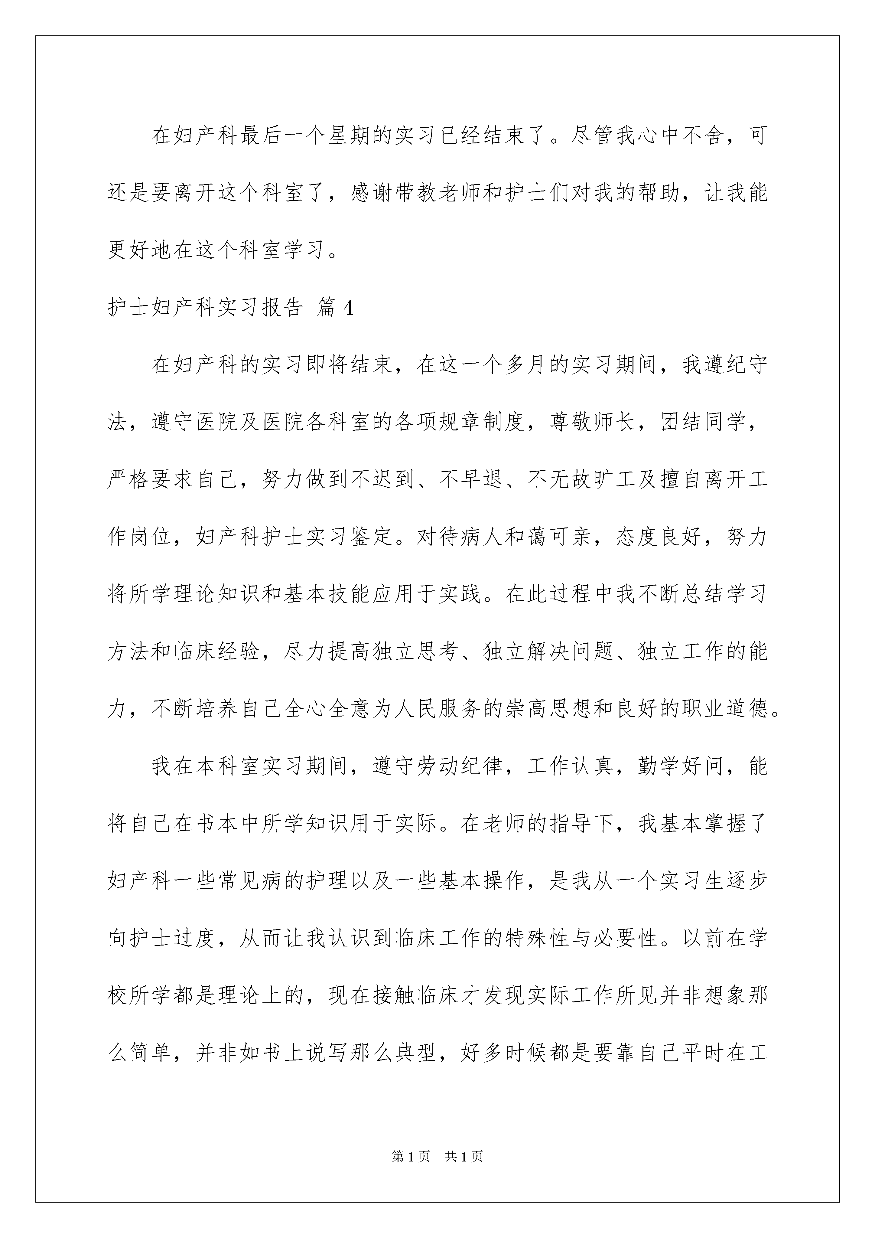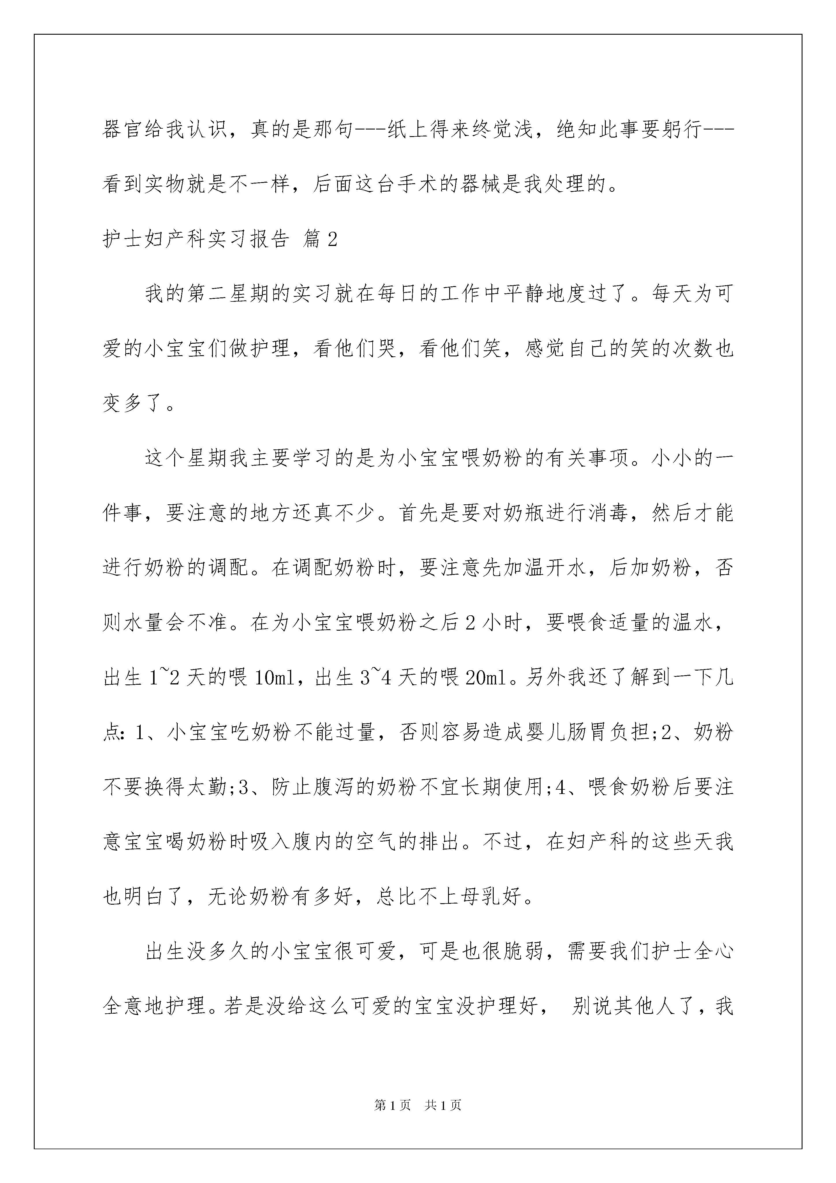 2022护士妇产科实习报告四篇护士妇产科实习报告四篇在经济发展迅速的今天,越来越多人会去使用报告,不同种类的报告具有不同的用途。那么一般报告是怎么写的呢?以下是我帮大家整理的护士妇产科实习报告4篇,希望能够帮助到大家。护士妇产科实习报告篇1今天是科教科胡主任送实习学生进科室,原本计划是熟悉一下环境的,没想到一上午做了那么多的事情先是到了一病区,我们两都懵懵懂懂的,见了主任,主任当下就让我跟着她,小珍被带走了。主任上午有两台手术,我第一天来,还什么都摸不清,主任就让我进手术室,很是激动,换鞋子的时候遇到了宿舍的小金,她送手术通知单的。穿衣服的时候,少了一个带子,自己是不好穿的,加上自己很兴奋,就直接让主任帮我系带子了,小金在旁边说,仲婷好福气啊,第一天来,就有主任帮你穿衣服,好囧啊,我是不是做错事了进去之后,完全不知道东西南北,一开始主任是想让我观摩手术的,后来可能是人手不够吧,主任让我上台,我简直激动到顶点了,但是不知道在哪里换手术衣,就拉着手术室的阿姨带我去的,估计主任会想这丫头怎么这么风风火火的啊!呵呵~~虽然没上过台,但俺还是会洗手的,(*^__^*)嘻嘻……主任给了个评价verygood~~有点得瑟,后来才知道,主任特别喜欢abc!主任说你不会晕了吧,“我胆子很大的”是我的答案,主任飘过质疑的眼神,厄~~俺不说话,待会不就知道了嘛进手术室,穿衣,带手套,洗手---然后像个木偶那样呆呆地站着,还是好激动啊!是剖腹产,开始的时候我就是傻傻地看,没啥做的`又不敢动---还是好兴奋啊!期间整理了一下血管钳----当然是很烂啦,董老师示范了一下,到底是老将就是不一样啊,缝线的时候我剪线头的,剪的很别扭,董老师口述了一下技巧我还是做得不好,最后还是董老师做了示范我才掌握的---------呵呵~~我手好笨哦一切结束,清洗器械,董老师带着我做的,布料-器械-损伤性器械的处理,当然以后只要我上台,这些就是我做了是连续上两个台的,第二个是卵巢肿瘤切除,拉拉钩--吸烟吸血--点张剪线!董老师带教意识非常强,在缝合之前,她都会找出下腹腔器官给我认识,真的是那句---纸上得来终觉浅,绝知此事要躬行---看到实物就是不一样,后面这台手术的器械是我处理的。护士妇产科实习报告篇2我的第二星期的实习就在每日的工作中平静地度过了。每天为可爱的小宝宝们做护理,看他们哭,看他们笑,感觉自己的笑的次数也变多了。这个星期我主要学习的是为小宝宝喂奶粉的有关事项。小小的一件事,要注意的地方还真不少。首先是要对奶瓶进行消毒,然后才能进行奶粉的调配。在调配奶粉时,要注意先加温开水,后加奶粉,否则水量会不准。在为小宝宝喂奶粉之后2小时,要喂食适量的温水,出生1~2天的喂10ml,出生3~4天的喂20ml。另外我还了解到一下几点:1、小宝宝吃奶粉不能过量,否则容易造成婴儿肠胃负担;2、奶粉不要换得太勤;3、防止腹泻的奶粉不宜长期使用;4、喂食奶粉后要注意宝宝喝奶粉时吸入腹内的空气的排出。不过,在妇产科的这些天我也明白了,无论奶粉有多好,总比不上母乳好。出生没多久的小宝宝很可爱,可是也很脆弱,需要我们护士全心全意地护理。若是没给这么可爱的宝宝没护理好,别说其他人了,我自己就先不能原谅自己。护士妇产科实习报告篇3这是在妇产科实习的第四周,这个星期的工作还是像过去几周一样忙。不知道是不是因为是最后一周了,我感觉时间过得特别快,竟然都没察觉又已经过了一个星期。这个星期的工作中,我除了为产妇和小宝宝做一些简单的测量和护理外,其余时间我都用来查找资料解决前几个星期留下来的概念性问题,有的只是小问题却困扰我很久。我原来只知道给宝宝喂水是为了给宝宝补充所需的水分,实际上没那么简单。在给宝宝喂完奶粉一段时间后,要喂适量的温开水,既不能少也不能多,因为少了达不到冲洗口腔和食管内的奶汁的作用,而多了就会容易引起溢奶。另外,生产后的妈妈的乳汁根据时间可氛围初乳、过产乳、成熟乳。初乳指的是产后五天内,特点是量少,每天仅有10~40ML,色黄,质稠,蛋白质含量高,脂肪含量低。过产乳指的是产后6~10天的乳汁,这个时候乳量有所增加,蛋白质含量下降,脂肪含量上升。而成熟乳则是产后11天~9个月的乳汁,蛋白质含量更低,但每日的泌乳总量达700~1000ML。在妇产科最后一个星期的实习已经结束了。尽管我心中不舍,可还是要离开这个科室了,感谢带教老师和护士们对我的帮助,让我能更好地在这个科室学习。护士妇产科实习报告篇4在妇产科的实习即将结束,在这一个多月的实习期间,我遵纪守法,遵守医院及医院各科室的各项规章制度,尊敬师长,团结同学,严格要求自己,努力做到