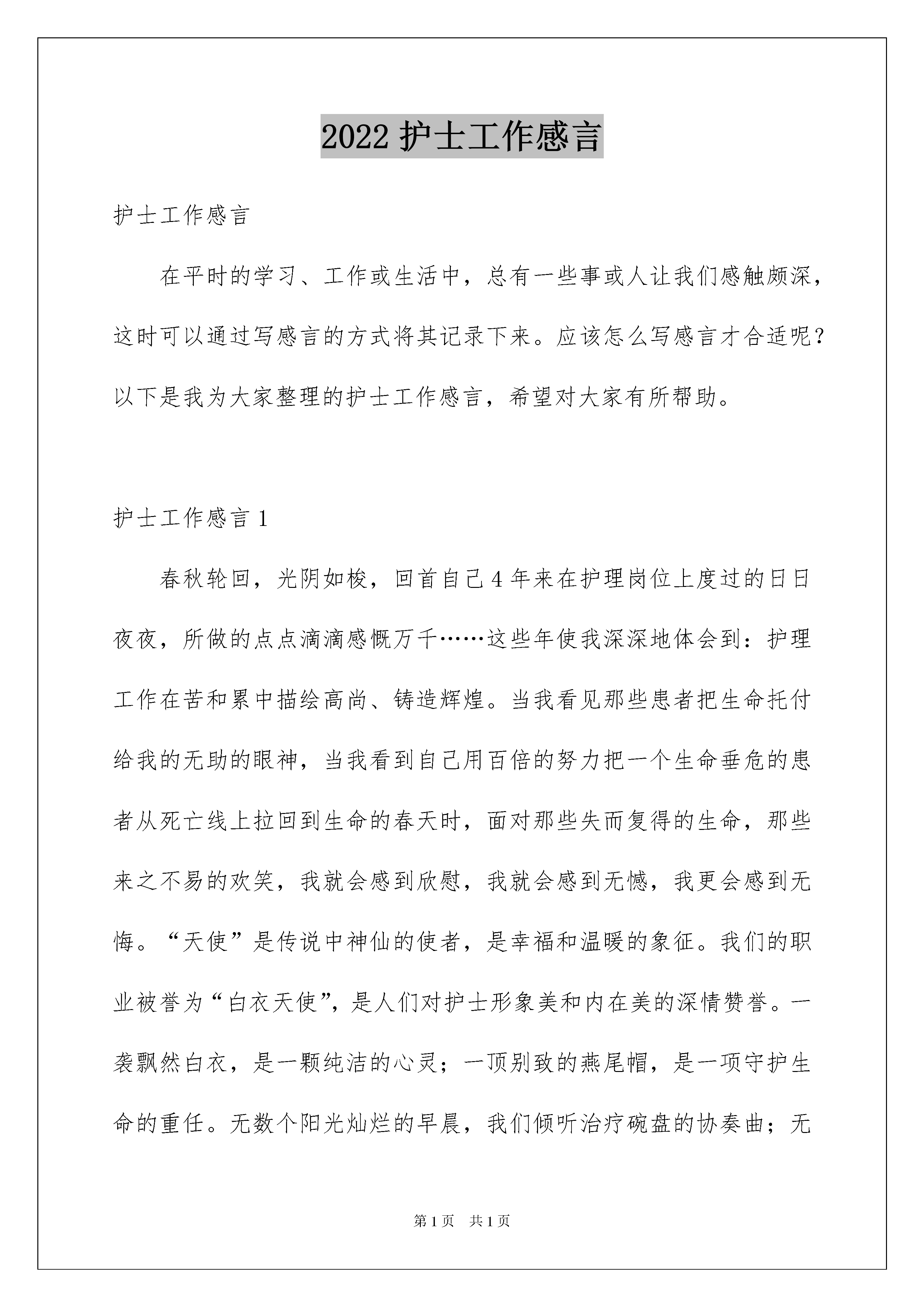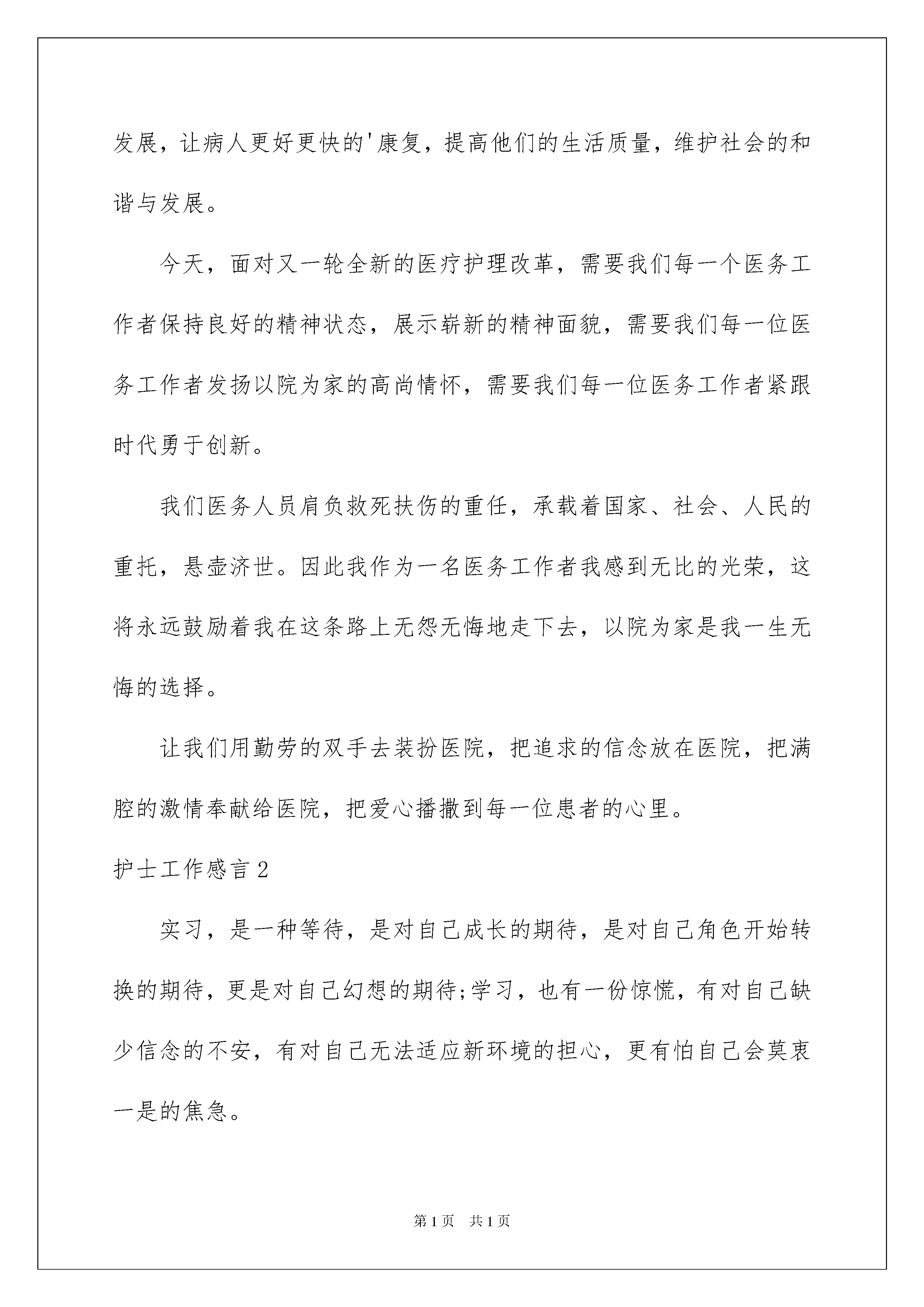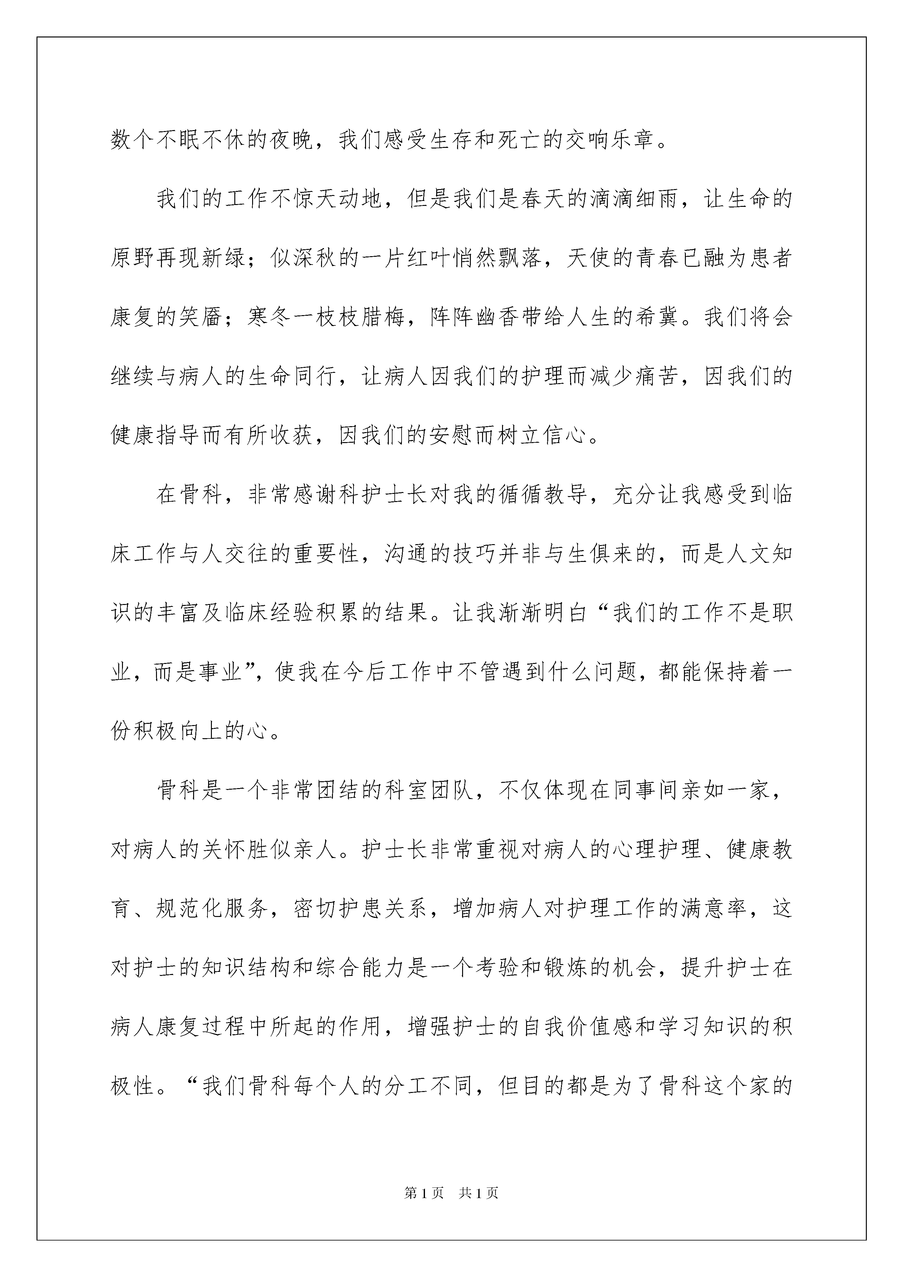 2022护士工作感言护士工作感言在平时的学习、工作或生活中,总有一些事或人让我们感触颇深,这时可以通过写感言的方式将其记录下来。应该怎么写感言才合适呢?以下是我为大家整理的护士工作感言,希望对大家有所帮助。护士工作感言1春秋轮回,光阴如梭,回首自己4年来在护理岗位上度过的日日夜夜,所做的点点滴滴感慨万千……这些年使我深深地体会到:护理工作在苦和累中描绘高尚、铸造辉煌。当我看见那些患者把生命托付给我的无助的眼神,当我看到自己用百倍的努力把一个生命垂危的患者从死亡线上拉回到生命的春天时,面对那些失而复得的生命,那些来之不易的欢笑,我就会感到欣慰,我就会感到无憾,我更会感到无悔。“天使”是传说中神仙的使者,是幸福和温暖的象征。我们的职业被誉为“白衣天使”,是人们对护士形象美和内在美的深情赞誉。一袭飘然白衣,是一颗纯洁的心灵;一顶别致的燕尾帽,是一项守护生命的重任。无数个阳光灿烂的早晨,我们倾听治疗碗盘的协奏曲;无数个不眠不休的夜晚,我们感受生存和死亡的交响乐章。我们的工作不惊天动地,但是我们是春天的滴滴细雨,让生命的原野再现新绿;似深秋的一片红叶悄然飘落,天使的青春已融为患者康复的笑靥;寒冬一枝枝腊梅,阵阵幽香带给人生的希冀。我们将会继续与病人的生命同行,让病人因我们的护理而减少痛苦,因我们的健康指导而有所收获,因我们的安慰而树立信心。在骨科,非常感谢科护士长对我的循循教导,充分让我感受到临床工作与人交往的重要性,沟通的技巧并非与生俱来的,而是人文知识的丰富及临床经验积累的结果。让我渐渐明白“我们的工作不是职业,而是事业”,使我在今后工作中不管遇到什么问题,都能保持着一份积极向上的心。骨科是一个非常团结的科室团队,不仅体现在同事间亲如一家,对病人的关怀胜似亲人。护士长非常重视对病人的心理护理、健康教育、规范化服务,密切护患关系,增加病人对护理工作的满意率,这对护士的知识结构和综合能力是一个考验和锻炼的机会,提升护士在病人康复过程中所起的作用,增强护士的自我价值感和学习知识的积极性。“我们骨科每个人的分工不同,但目的都是为了骨科这个家的发展,让病人更好更快的'康复,提高他们的生活质量,维护社会的和谐与发展。今天,面对又一轮全新的医疗护理改革,需要我们每一个医务工作者保持良好的精神状态,展示崭新的精神面貌,需要我们每一位医务工作者发扬以院为家的高尚情怀,需要我们每一位医务工作者紧跟时代勇于创新。我们医务人员肩负救死扶伤的重任,承载着国家、社会、人民的重托,悬壶济世。因此我作为一名医务工作者我感到无比的光荣,这将永远鼓励着我在这条路上无怨无悔地走下去,以院为家是我一生无悔的选择。让我们用勤劳的双手去装扮医院,把追求的信念放在医院,把满腔的激情奉献给医院,把爱心播撒到每一位患者的心里。护士工作感言2实习,是一种等待,是对自己成长的期待,是对自己角色开始转换的期待,更是对自己幻想的期待;学习,也有一份惊慌,有对自己缺少信念的不安,有对自己无法适应新环境的担心,更有怕自己会莫衷一是的焦急。带着一份希翼跟一份茫然来到了xx病院,开始了我的实习生活。从此,我的身份将从一个学生变为了一个实习护士,生活环境将从学校转为医院,接触的对象将从老师、同窗转变为医生、护士、病人。对于这三大改变,对如何做一个及格的实习护士,虽说老师对我们已是千叮咛万吩咐,可我心里还是局促不安的,怪不适应,怕被带教老师骂,畏惧自己做得比别人差怕,自己不知从何入手……第一个轮转科室是icu,我的带教老师是xx老师,她是院里的操作能手,干活麻利,动作美丽,操作标准,这无形中给了我很大压力。实习生涯的开始就让我有种挫败感,在老师眼前感到本人很微小,甚至于工作都不带头脑,只机械的履行义务,每次只想把工作做好,可越想先做好它越犯错,越错越惧怕,越怕越错,这就构成了一个恶性轮回。甚至于我都不敢自动请求做操作,可这样老师又感到我干活不主动,有时候认为冤屈了就自己大哭一场。天天面对着老师如鱼得水繁忙的身影,我心里只有怨叹,怨自己无奈将实践利用于实际,怨自己在以前见习时不好好学,愿自己笨手笨脚。可能是我适应才能差,又不会与老师沟通,进了ccu仍是处在徘徊中,但我也很感谢我的带教老师,对我很耐烦,也很关怀我。到了手术室xx老师每天都能看到我的提高,即使是一点点她也激励我,即便我很笨犯了错她也会给我讲原理,让我晓得过错的本源而不是申斥。它起到了一个领导的作用,我开端有了自己的思路,又从新有了工作的豪情,不论多苦多累只有心里舒畅,我就能够开心渡过每一天!当初我进入了第四个轮转科室骨三。本认为可以很快适应,但事实确泼了我一头冷水,感觉自己变得更傻了,