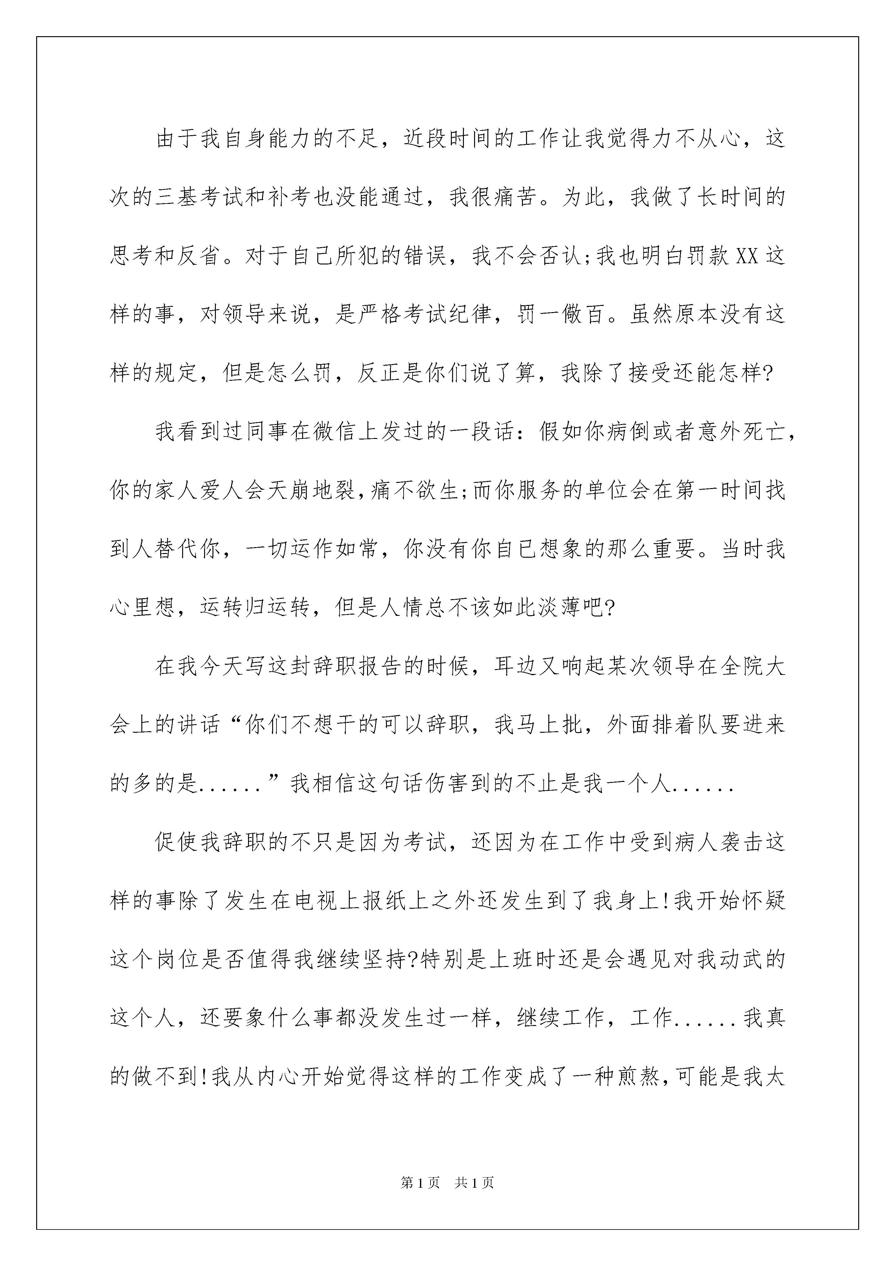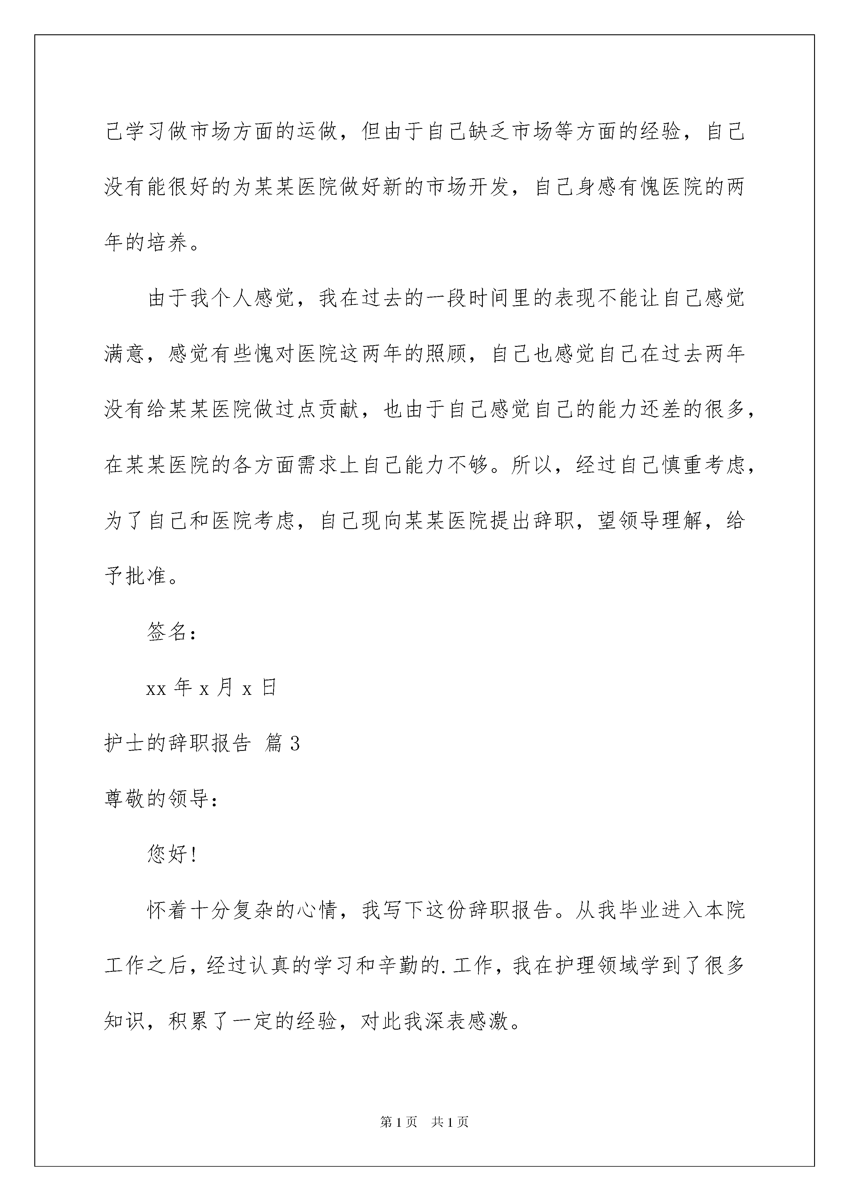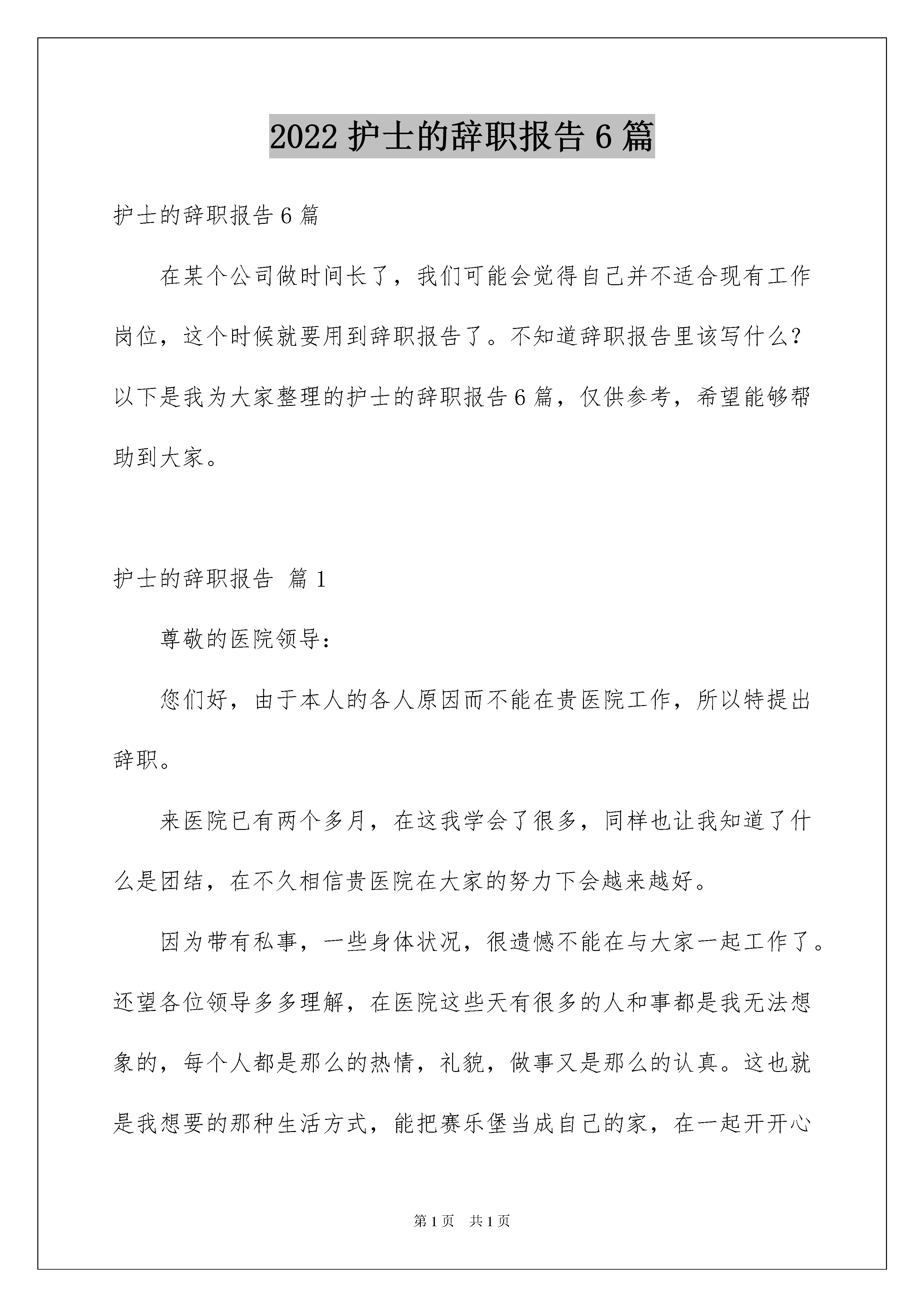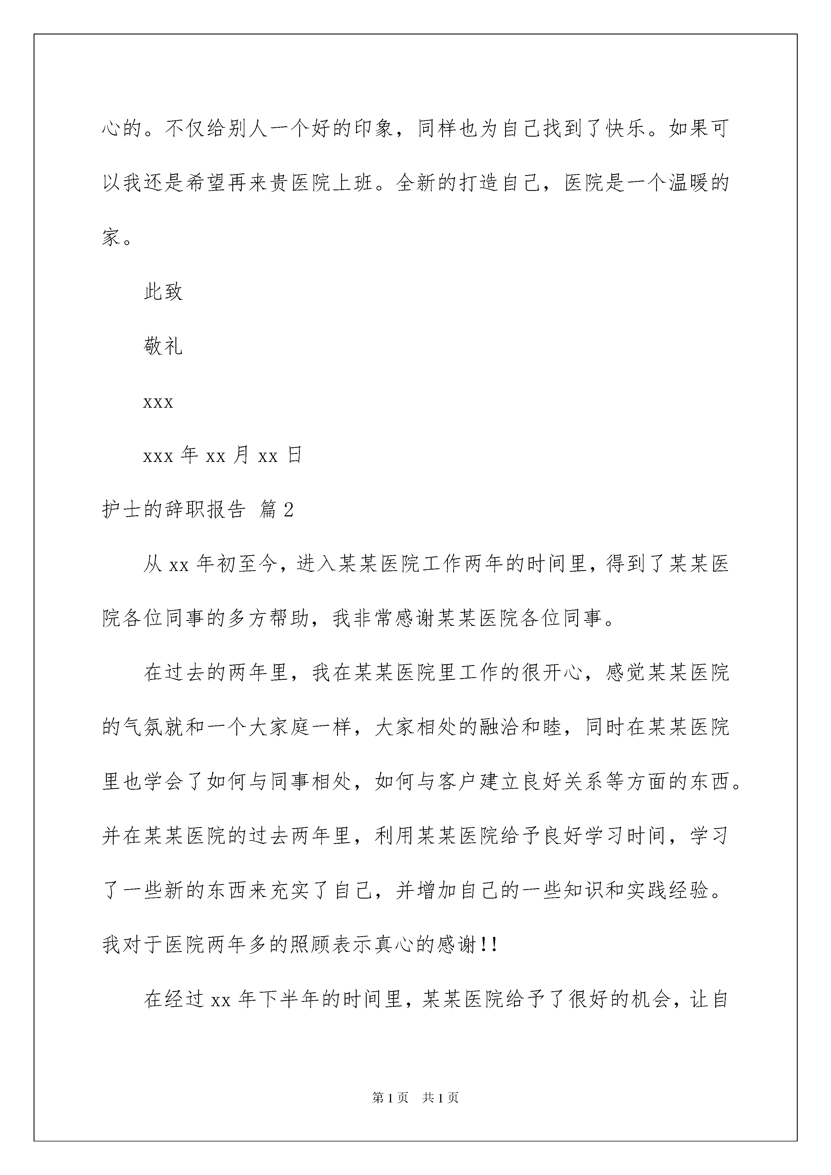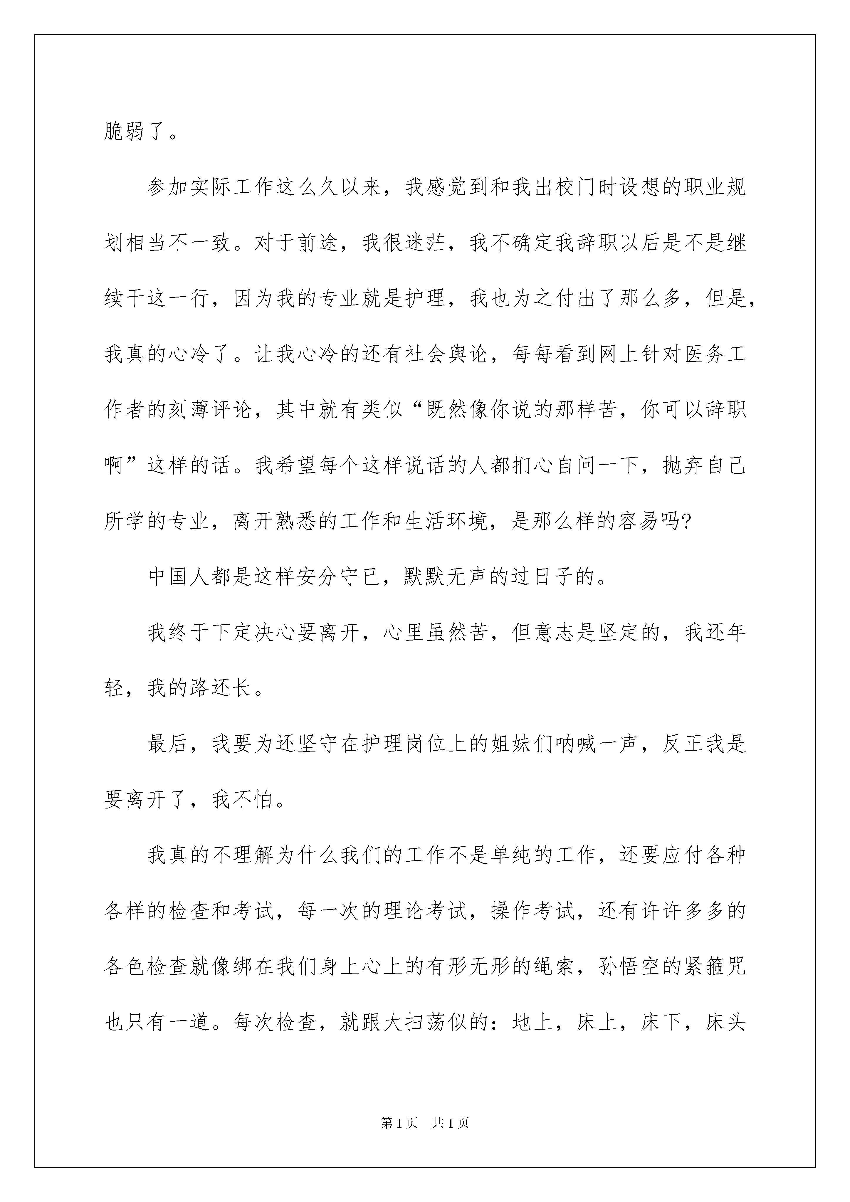 2022护士的辞职报告6篇护士的辞职报告6篇在某个公司做时间长了,我们可能会觉得自己并不适合现有工作岗位,这个时候就要用到辞职报告了。不知道辞职报告里该写什么?以下是我为大家整理的护士的辞职报告6篇,仅供参考,希望能够帮助到大家。护士的辞职报告篇1尊敬的医院领导:您们好,由于本人的各人原因而不能在贵医院工作,所以特提出辞职。来医院已有两个多月,在这我学会了很多,同样也让我知道了什么是团结,在不久相信贵医院在大家的努力下会越来越好。因为带有私事,一些身体状况,很遗憾不能在与大家一起工作了。还望各位领导多多理解,在医院这些天有很多的人和事都是我无法想象的,每个人都是那么的热情,礼貌,做事又是那么的认真。这也就是我想要的那种生活方式,能把赛乐堡当成自己的家,在一起开开心心的。不仅给别人一个好的印象,同样也为自己找到了快乐。如果可以我还是希望再来贵医院上班。全新的打造自己,医院是一个温暖的家。此致敬礼xxxxxx年xx月xx日护士的辞职报告篇2从xx年初至今,进入某某医院工作两年的时间里,得到了某某医院各位同事的多方帮助,我非常感谢某某医院各位同事。在过去的两年里,我在某某医院里工作的很开心,感觉某某医院的气氛就和一个大家庭一样,大家相处的融洽和睦,同时在某某医院里也学会了如何与同事相处,如何与客户建立良好关系等方面的东西。并在某某医院的过去两年里,利用某某医院给予良好学习时间,学习了一些新的东西来充实了自己,并增加自己的一些知识和实践经验。我对于医院两年多的照顾表示真心的感谢!!在经过xx年下半年的时间里,某某医院给予了很好的机会,让自己学习做市场方面的运做,但由于自己缺乏市场等方面的经验,自己没有能很好的为某某医院做好新的市场开发,自己身感有愧医院的两年的培养。由于我个人感觉,我在过去的一段时间里的表现不能让自己感觉满意,感觉有些愧对医院这两年的照顾,自己也感觉自己在过去两年没有给某某医院做过点贡献,也由于自己感觉自己的能力还差的很多,在某某医院的各方面需求上自己能力不够。所以,经过自己慎重考虑,为了自己和医院考虑,自己现向某某医院提出辞职,望领导理解,给予批准。签名:xx年x月x日护士的辞职报告篇3尊敬的领导:您好!怀着十分复杂的心情,我写下这份辞职报告。从我毕业进入本院工作之后,经过认真的学习和辛勤的.工作,我在护理领域学到了很多知识,积累了一定的经验,对此我深表感激。由于我自身能力的不足,近段时间的工作让我觉得力不从心,这次的三基考试和补考也没能通过,我很痛苦。为此,我做了长时间的思考和反省。对于自己所犯的错误,我不会否认;我也明白罚款XX这样的事,对领导来说,是严格考试纪律,罚一儆百。虽然原本没有这样的规定,但是怎么罚,反正是你们说了算,我除了接受还能怎样?我看到过同事在微信上发过的一段话:假如你病倒或者意外死亡,你的家人爱人会天崩地裂,痛不欲生;而你服务的单位会在第一时间找到人替代你,一切运作如常,你没有你自已想象的那么重要。当时我心里想,运转归运转,但是人情总不该如此淡薄吧?在我今天写这封辞职报告的时候,耳边又响起某次领导在全院大会上的讲话“你们不想干的可以辞职,我马上批,外面排着队要进来的多的是......”我相信这句话伤害到的不止是我一个人......促使我辞职的不只是因为考试,还因为在工作中受到病人袭击这样的事除了发生在电视上报纸上之外还发生到了我身上!我开始怀疑这个岗位是否值得我继续坚持?特别是上班时还是会遇见对我动武的这个人,还要象什么事都没发生过一样,继续工作,工作......我真的做不到!我从内心开始觉得这样的工作变成了一种煎熬,可能是我太脆弱了。参加实际工作这么久以来,我感觉到和我出校门时设想的职业规划相当不一致。对于前途,我很迷茫,我不确定我辞职以后是不是继续干这一行,因为我的专业就是护理,我也为之付出了那么多,但是,我真的心冷了。让我心冷的还有社会舆论,每每看到网上针对医务工作者的刻薄评论,其中就有类似“既然像你说的那样苦,你可以辞职啊”这样的话。我希望每个这样说话的人都扪心自问一下,抛弃自己所学的专业,离开熟悉的工作和生活环境,是那么样的容易吗?中国人都是这样安分守已,默默无声的过日子的。我终于下定决心要离开,心里虽然苦,但意志是坚定的,我还年轻,我的路还长。最后,我要为还坚守在护理岗位上的姐妹们呐喊一声,反正我是要离开了,我不怕。我真的不理解为什么我们的工作不是单纯的工作,还要应付各种各样的检查和考试,每一次的理论考试,操作考试,还有许许多多的各色检查就像绑在我们身上心上的有形无形的绳索,孙悟空的紧箍咒也只有一道。每次检查,就跟大扫荡似的: