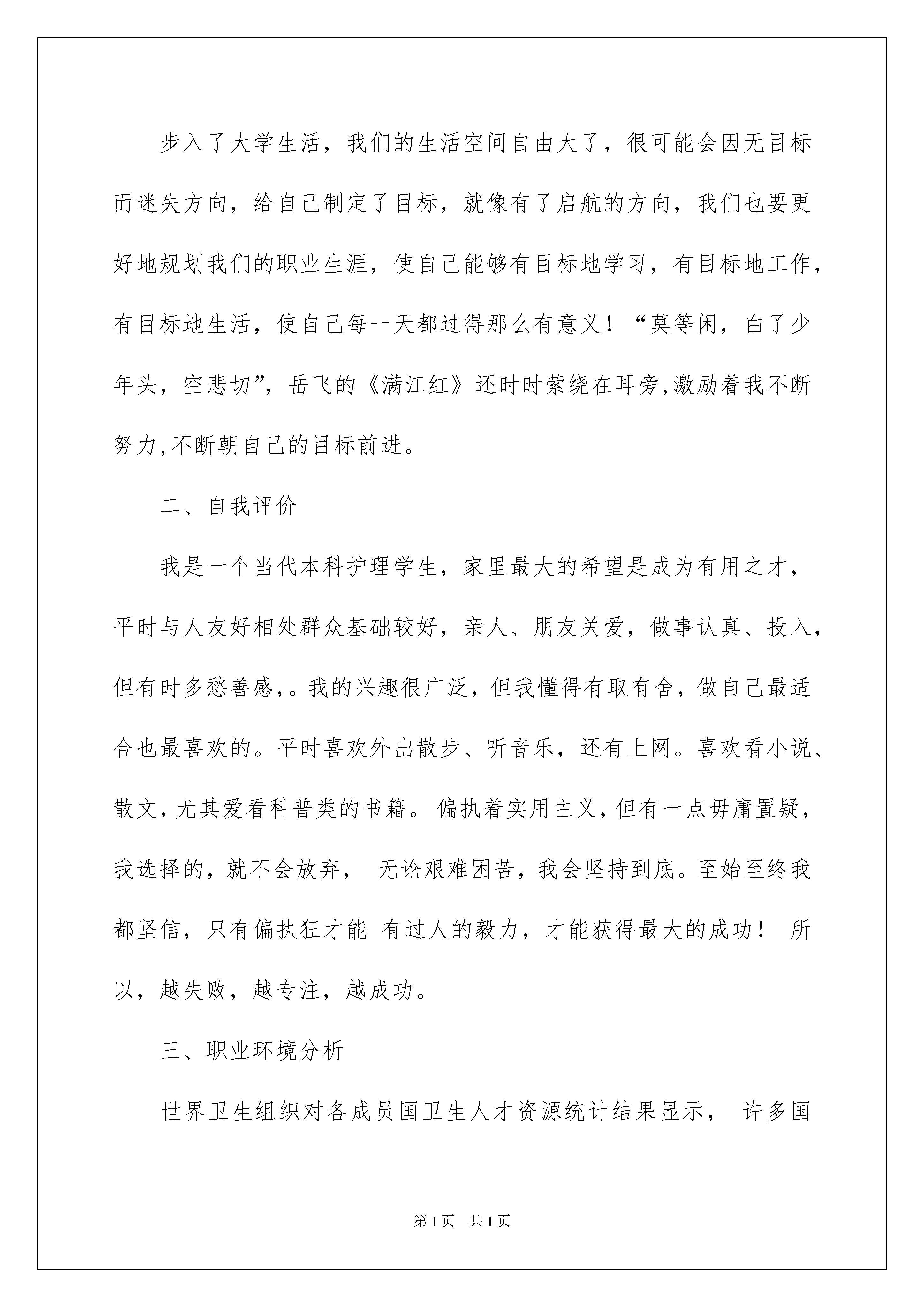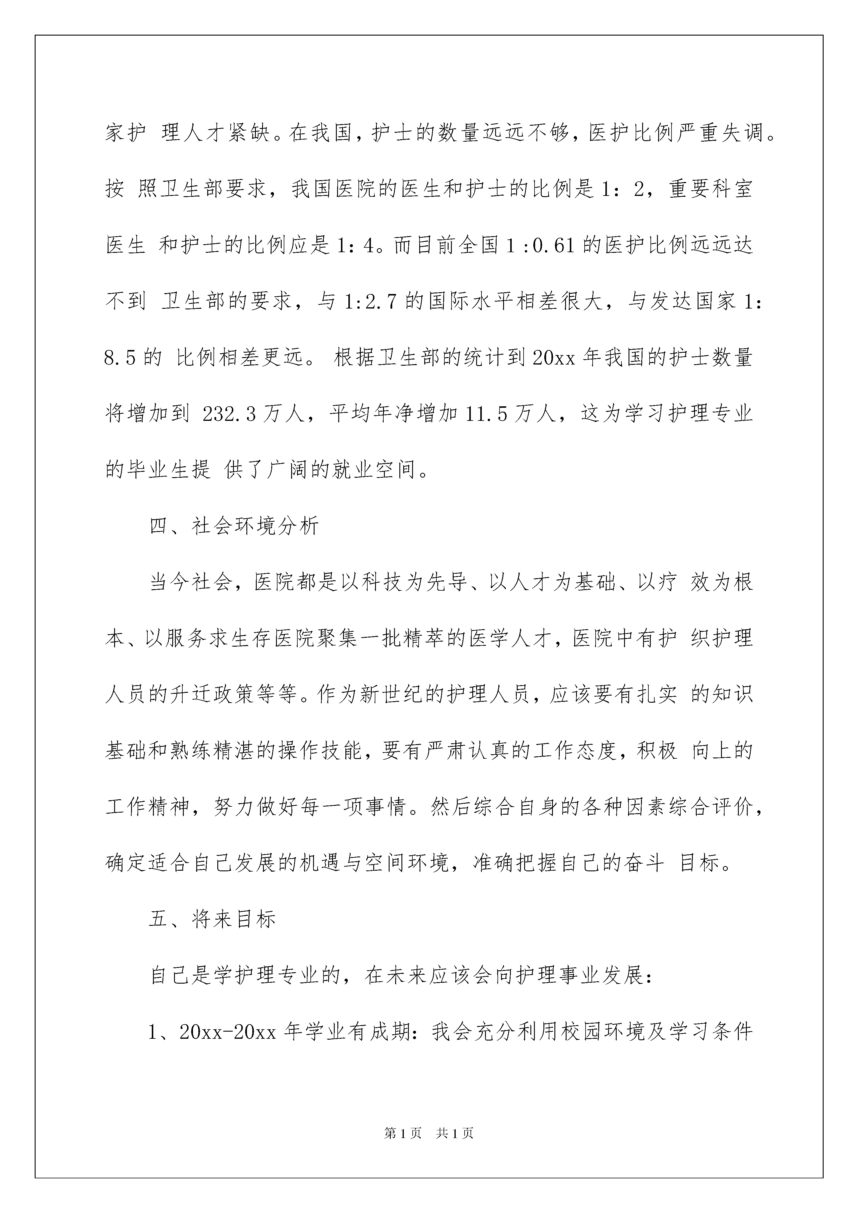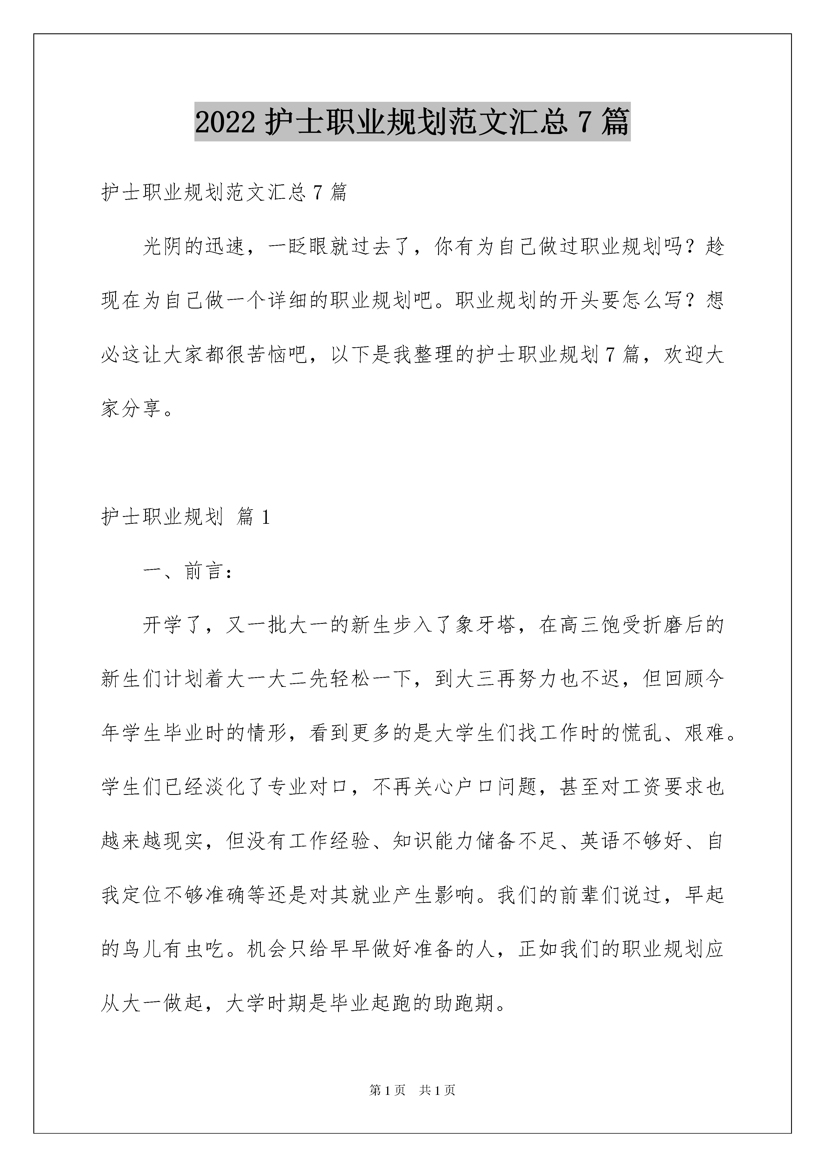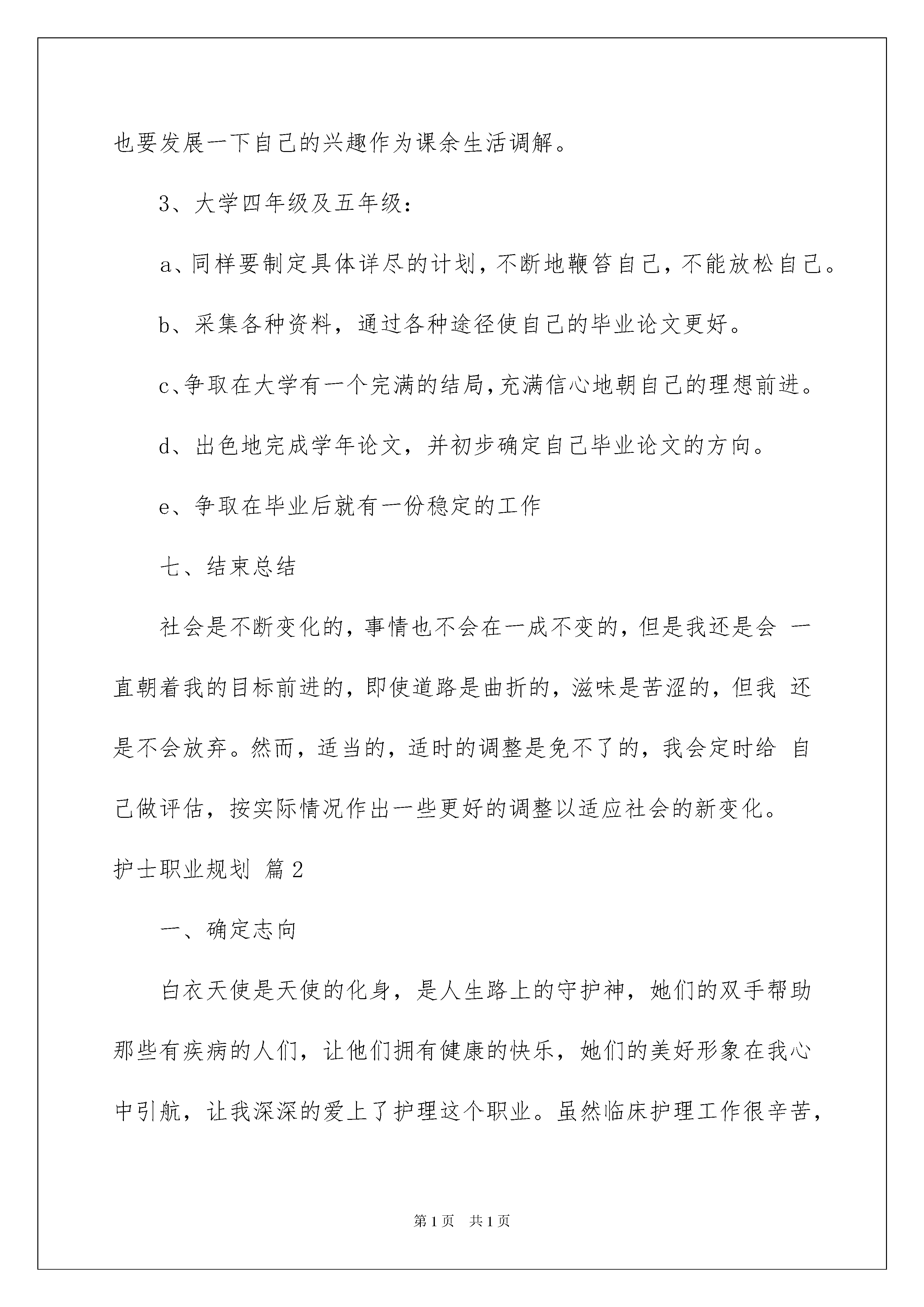 2022护士职业规划范文汇总7篇护士职业规划范文汇总7篇光阴的迅速,一眨眼就过去了,你有为自己做过职业规划吗?趁现在为自己做一个详细的职业规划吧。职业规划的开头要怎么写?想必这让大家都很苦恼吧,以下是我整理的护士职业规划7篇,欢迎大家分享。护士职业规划篇1一、前言:开学了,又一批大一的新生步入了象牙塔,在高三饱受折磨后的新生们计划着大一大二先轻松一下,到大三再努力也不迟,但回顾今年学生毕业时的情形,看到更多的是大学生们找工作时的慌乱、艰难。学生们已经淡化了专业对口,不再关心户口问题,甚至对工资要求也越来越现实,但没有工作经验、知识能力储备不足、英语不够好、自我定位不够准确等还是对其就业产生影响。我们的前辈们说过,早起的鸟儿有虫吃。机会只给早早做好准备的人,正如我们的职业规划应从大一做起,大学时期是毕业起跑的助跑期。步入了大学生活,我们的生活空间自由大了,很可能会因无目标而迷失方向,给自己制定了目标,就像有了启航的方向,我们也要更好地规划我们的职业生涯,使自己能够有目标地学习,有目标地工作,有目标地生活,使自己每一天都过得那么有意义!“莫等闲,白了少年头,空悲切”,岳飞的《满江红》还时时萦绕在耳旁,激励着我不断努力,不断朝自己的目标前进。二、自我评价我是一个当代本科护理学生,家里最大的希望是成为有用之才,平时与人友好相处群众基础较好,亲人、朋友关爱,做事认真、投入,但有时多愁善感,。我的兴趣很广泛,但我懂得有取有舍,做自己最适合也最喜欢的。平时喜欢外出散步、听音乐,还有上网。喜欢看小说、散文,尤其爱看科普类的书籍。偏执着实用主义,但有一点毋庸置疑,我选择的,就不会放弃,无论艰难困苦,我会坚持到底。至始至终我都坚信,只有偏执狂才能有过人的毅力,才能获得最大的成功!所以,越失败,越专注,越成功。三、职业环境分析世界卫生组织对各成员国卫生人才资源统计结果显示,许多国家护理人才紧缺。在我国,护士的数量远远不够,医护比例严重失调。按照卫生部要求,我国医院的医生和护士的比例是1:2,重要科室医生和护士的比例应是1:4。而目前全国1:0.61的医护比例远远达不到卫生部的要求,与1:2.7的国际水平相差很大,与发达国家1:8.5的比例相差更远。根据卫生部的统计到20xx年我国的护士数量将增加到232.3万人,平均年净增加11.5万人,这为学习护理专业的毕业生提供了广阔的就业空间。四、社会环境分析当今社会,医院都是以科技为先导、以人才为基础、以疗效为根本、以服务求生存医院聚集一批精萃的医学人才,医院中有护织护理人员的升迁政策等等。作为新世纪的护理人员,应该要有扎实的知识基础和熟练精湛的操作技能,要有严肃认真的工作态度,积极向上的工作精神,努力做好每一项事情。然后综合自身的各种因素综合评价,确定适合自己发展的机遇与空间环境,准确把握自己的奋斗目标。五、将来目标自己是学护理专业的,在未来应该会向护理事业发展:1、20xx-20xx年学业有成期:我会充分利用校园环境及学习条件优势,认真学好专业知识,培养学习、工作、生活能力,全面提高个人综合素质,并作为就业准备。2、20xx-20xx年熟悉适应期:利用2年左右的时间,经过不断的尝试努力,初步找到合适自身发展的工作环境、岗位。六、大学期间目标及规划我的大学计划是到大学毕业时通过计算机二级,英语四六级考试。当然,能力方面也要得到很大的提升。1、大学二年级:a、认真规划自己的学习计划,主动训练,虚心向老师同学请教。b、认真做好自己的本职工作,和同学们友好相处。c、在生活中认真踏实广交朋友,积累丰富的课外知识。d、认真准备计算机以及英语四、六级考试。2、大学三年级:a、做一份详细的计划,每达到一个目标就满足自己一个愿望,当然也要制定惩罚措施。有压力才会有动力。b、学习、工作要统筹兼顾,不能捡了芝麻掉了西瓜。c、自己的目标要更明确,朝着目标奋斗,达到事半功倍。同时也要发展一下自己的兴趣作为课余生活调解。3、大学四年级及五年级:a、同样要制定具体详尽的计划,不断地鞭笞自己,不能放松自己。b、采集各种资料,通过各种途径使自己的毕业论文更好。c、争取在大学有一个完满的结局,充满信心地朝自己的理想前进。d、出色地完成学年论文,并初步确定自己毕业论文的方向。e、争取在毕业后就有一份稳定的工作七、结束总结社会是不断变化的,事情也不会在一成不变的,但是我还是会一直朝着我的目标前进的,即使道路是曲折的,滋味是苦涩的,但我还是不会放弃。然而,适当的,适时的调整是免不了的,我会定时给自己做评估,按实际情况作出一些更好的调整以适应社会的新变化。护士职业规划篇2一、确定志向白衣天使