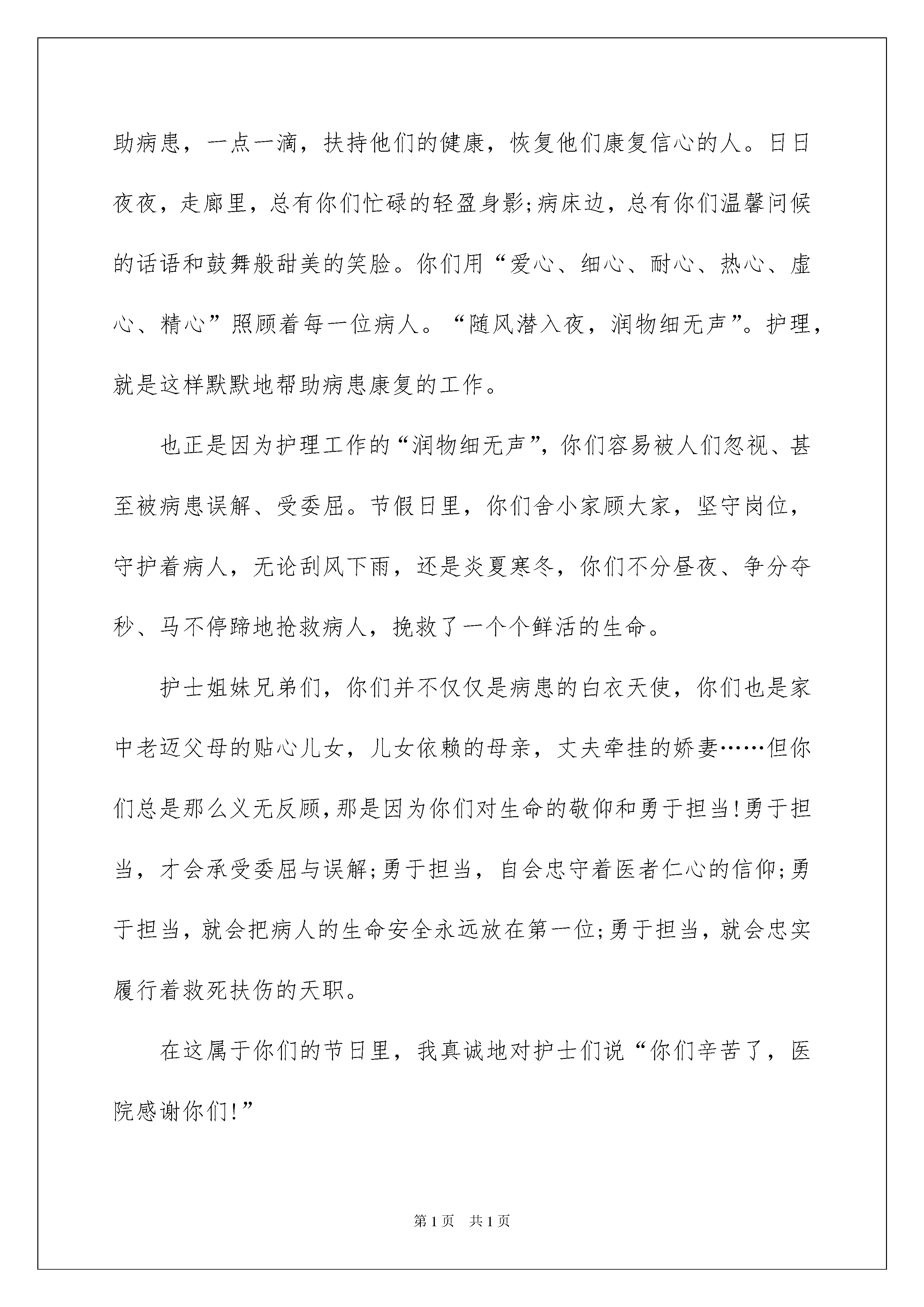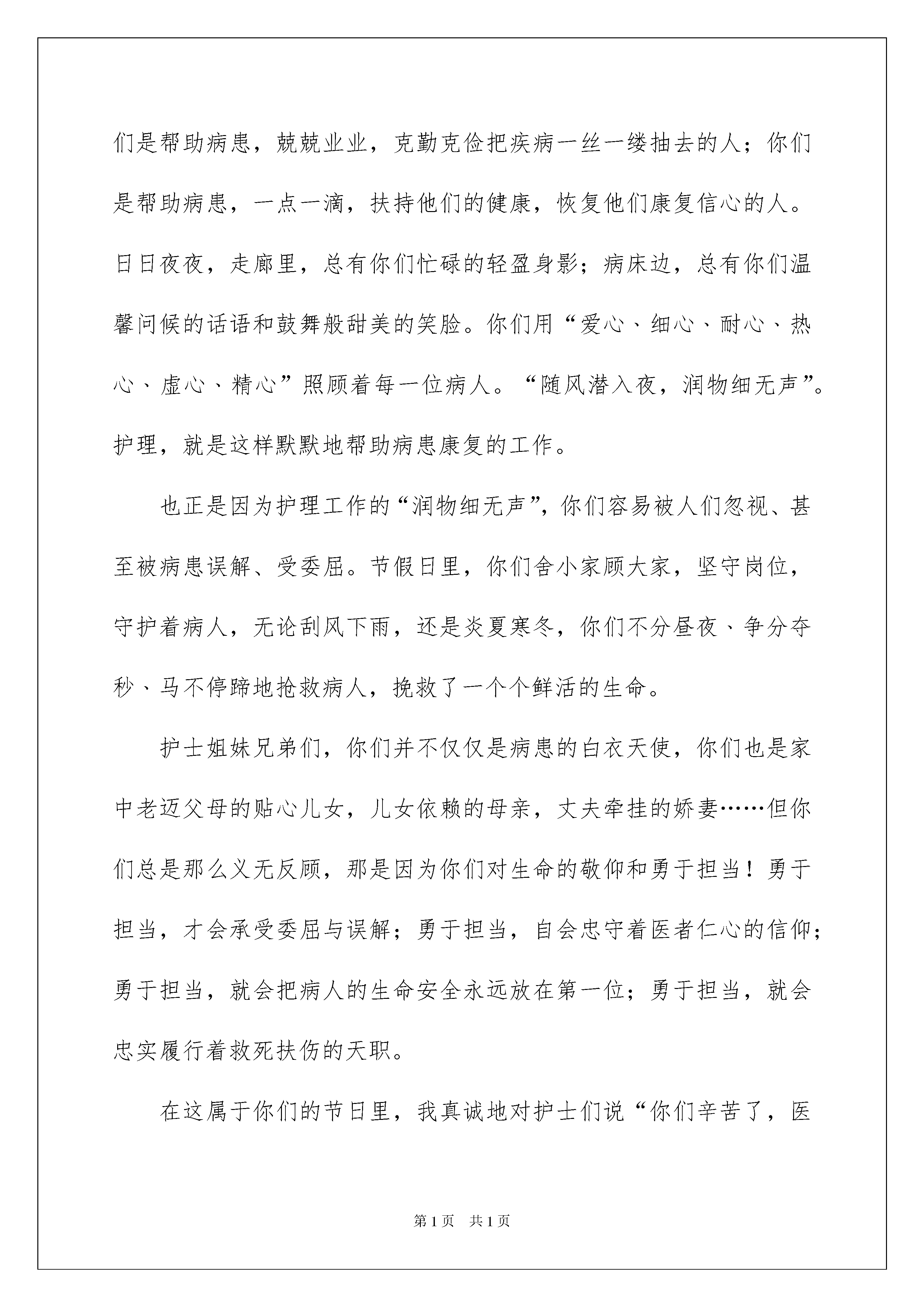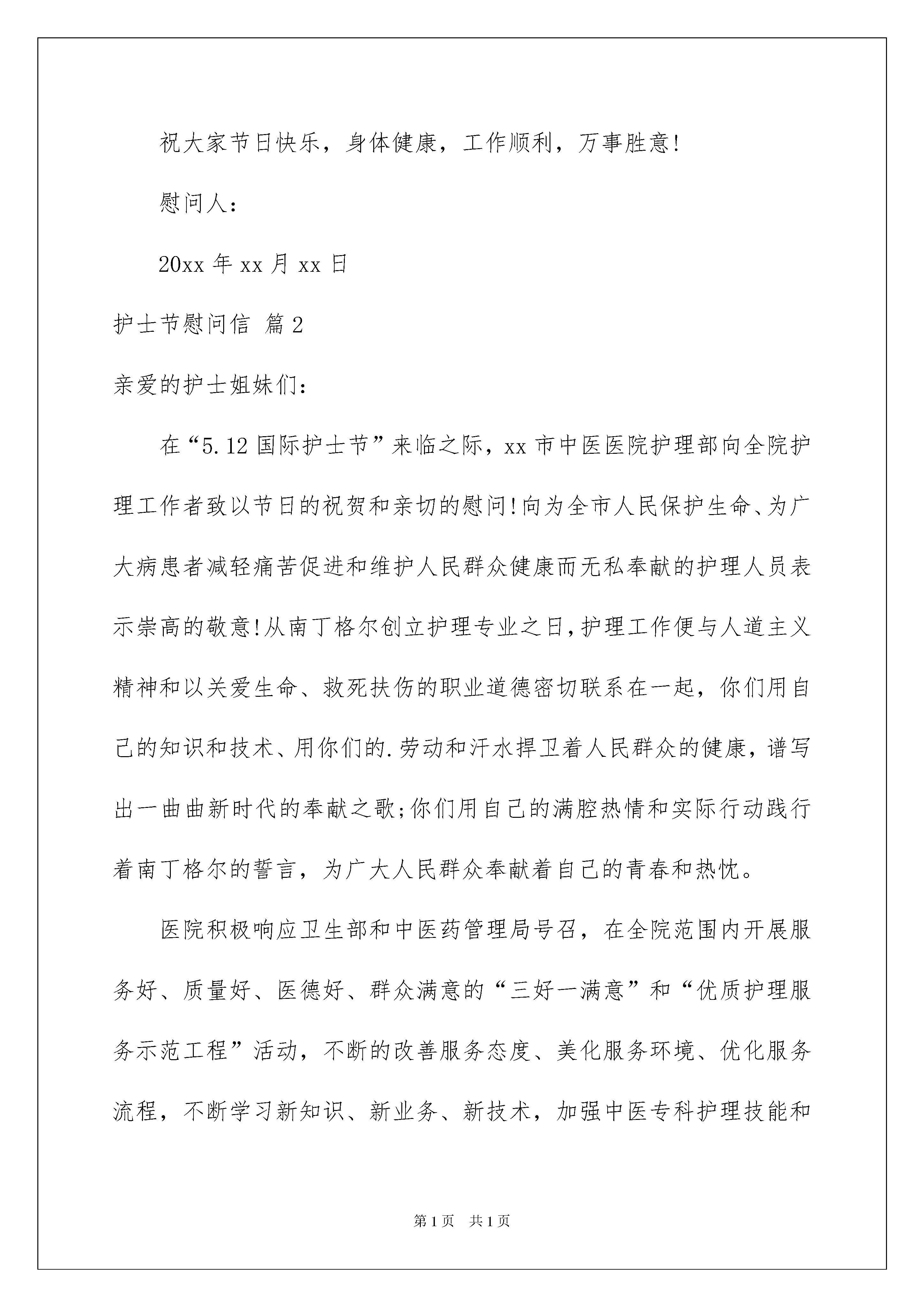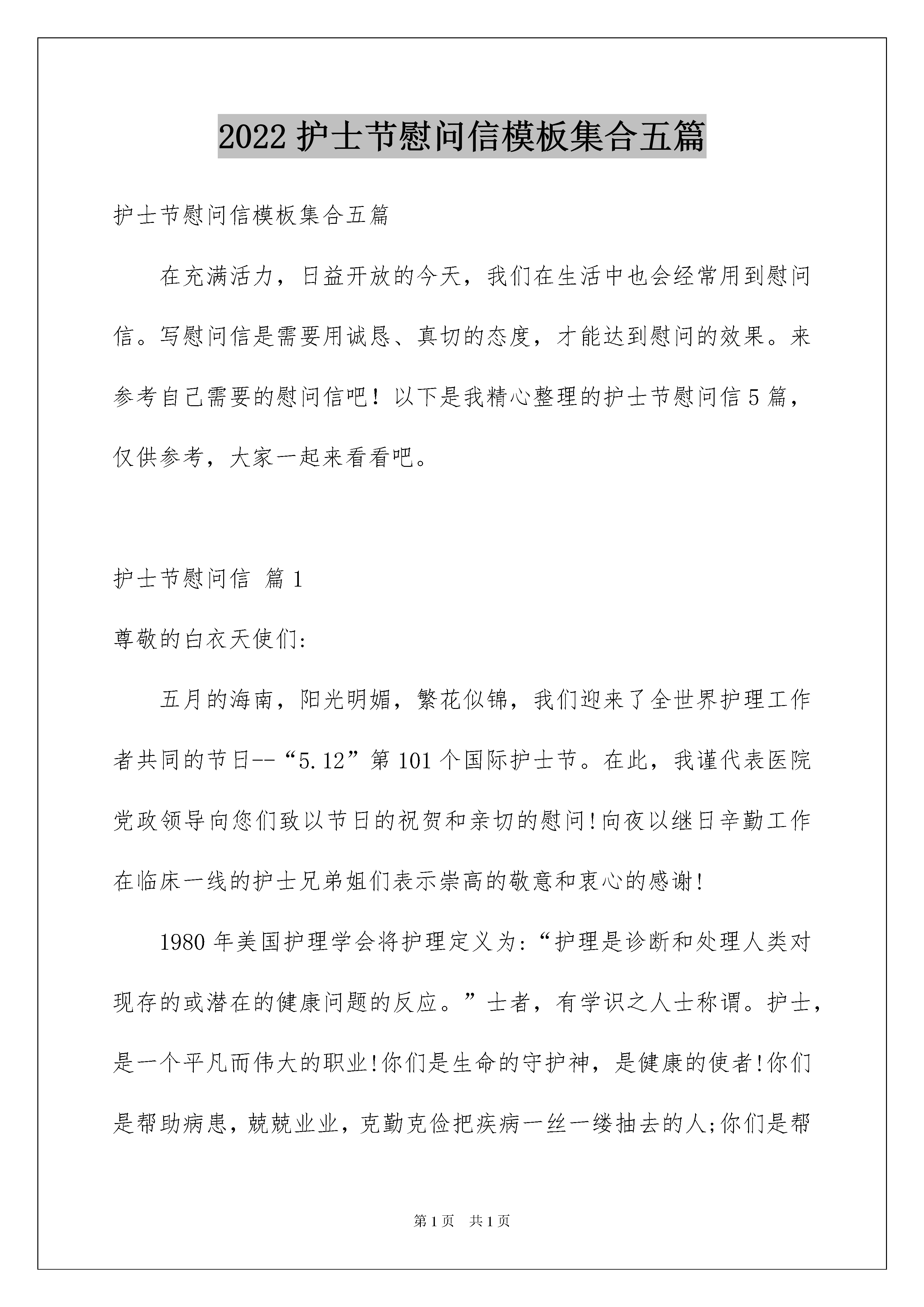 2022护士节慰问信模板集合五篇护士节慰问信模板集合五篇在充满活力,日益开放的今天,我们在生活中也会经常用到慰问信。写慰问信是需要用诚恳、真切的态度,才能达到慰问的效果。来参考自己需要的慰问信吧!以下是我精心整理的护士节慰问信5篇,仅供参考,大家一起来看看吧。护士节慰问信篇1尊敬的白衣天使们:五月的海南,阳光明媚,繁花似锦,我们迎来了全世界护理工作者共同的节日--“5.12”第101个国际护士节。在此,我谨代表医院党政领导向您们致以节日的祝贺和亲切的慰问!向夜以继日辛勤工作在临床一线的护士兄弟姐们表示崇高的敬意和衷心的感谢!1980年美国护理学会将护理定义为:“护理是诊断和处理人类对现存的或潜在的健康问题的反应。”士者,有学识之人士称谓。护士,是一个平凡而伟大的职业!你们是生命的守护神,是健康的使者!你们是帮助病患,兢兢业业,克勤克俭把疾病一丝一缕抽去的人;你们是帮助病患,一点一滴,扶持他们的健康,恢复他们康复信心的人。日日夜夜,走廊里,总有你们忙碌的轻盈身影;病床边,总有你们温馨问候的话语和鼓舞般甜美的笑脸。你们用“爱心、细心、耐心、热心、虚心、精心”照顾着每一位病人。“随风潜入夜,润物细无声”。护理,就是这样默默地帮助病患康复的工作。也正是因为护理工作的“润物细无声”,你们容易被人们忽视、甚至被病患误解、受委屈。节假日里,你们舍小家顾大家,坚守岗位,守护着病人,无论刮风下雨,还是炎夏寒冬,你们不分昼夜、争分夺秒、马不停蹄地抢救病人,挽救了一个个鲜活的生命。护士姐妹兄弟们,你们并不仅仅是病患的白衣天使,你们也是家中老迈父母的贴心儿女,儿女依赖的母亲,丈夫牵挂的娇妻……但你们总是那么义无反顾,那是因为你们对生命的敬仰和勇于担当!勇于担当,才会承受委屈与误解;勇于担当,自会忠守着医者仁心的信仰;勇于担当,就会把病人的生命安全永远放在第一位;勇于担当,就会忠实履行着救死扶伤的天职。在这属于你们的节日里,我真诚地对护士们说“你们辛苦了,医院感谢你们!”祝大家节日快乐,身体健康,工作顺利,万事胜意!慰问人:20xx年xx月xx日护士节慰问信篇2亲爱的护士姐妹们:在“5.12国际护士节”来临之际,xx市中医医院护理部向全院护理工作者致以节日的祝贺和亲切的慰问!向为全市人民保护生命、为广大病患者减轻痛苦促进和维护人民群众健康而无私奉献的护理人员表示崇高的敬意!从南丁格尔创立护理专业之日,护理工作便与人道主义精神和以关爱生命、救死扶伤的职业道德密切联系在一起,你们用自己的知识和技术、用你们的.劳动和汗水捍卫着人民群众的健康,谱写出一曲曲新时代的奉献之歌;你们用自己的满腔热情和实际行动践行着南丁格尔的誓言,为广大人民群众奉献着自己的青春和热忱。医院积极响应卫生部和中医药管理局号召,在全院范围内开展服务好、质量好、医德好、群众满意的“三好一满意”和“优质护理服务示范工程”活动,不断的改善服务态度、美化服务环境、优化服务流程,不断学习新知识、新业务、新技术,加强中医专科护理技能和知识的培训,开展具有中医特色的优质护理模式,将传统理念运用在治疗护理及健康教育的每一个环节。全体护理人员用心护理,用情服务,用一片天使的赤诚之心,积极营造患者满意、政府满意、社会满意的服务氛围,为促进医院的发展,倾注着每一个护理人员的热爱和心血。值此节日之际,千言万语化作一句话:祝福每一位白衣天使节日快乐,工作进步,青春常驻,家庭幸福,万事如意!xx市中医医院护理部护士节慰问信篇3尊敬的白衣天使们:五月的xx,阳光明媚,繁花似锦,我们迎来了全世界护理工作者共同的节日——“5.12”国际护士节。在此,我谨代表护理学会领导向您们致以节日的祝贺和亲切的慰问!向夜以继日辛勤工作在临床一线的护士兄弟姐妹们表示崇高的敬意和衷心的感谢!1980年美国护理学会将护理定义为:“护理是诊断和处理人类对现存的或潜在的健康问题的反应。”士者,有学识之人士称谓。护士,是一个平凡而伟大的职业!你们是生命的守护神,是健康的使者!你们是帮助病患,兢兢业业,克勤克俭把疾病一丝一缕抽去的人;你们是帮助病患,一点一滴,扶持他们的健康,恢复他们康复信心的人。日日夜夜,走廊里,总有你们忙碌的轻盈身影;病床边,总有你们温馨问候的话语和鼓舞般甜美的笑脸。你们用“爱心﹑细心﹑耐心﹑热心﹑虚心﹑精心”照顾着每一位病人。“随风潜入夜,润物细无声”。护理,就是这样默默地帮助病患康复的工作。也正是因为护理工作的“润物细无声”,你们容易被人们忽视、甚至被病患误解、受委屈。节假日里,你们舍小家顾大家,坚守岗位,守护着病人,无论刮风下雨,还是炎夏寒冬,你们不分昼夜﹑争分夺秒﹑马