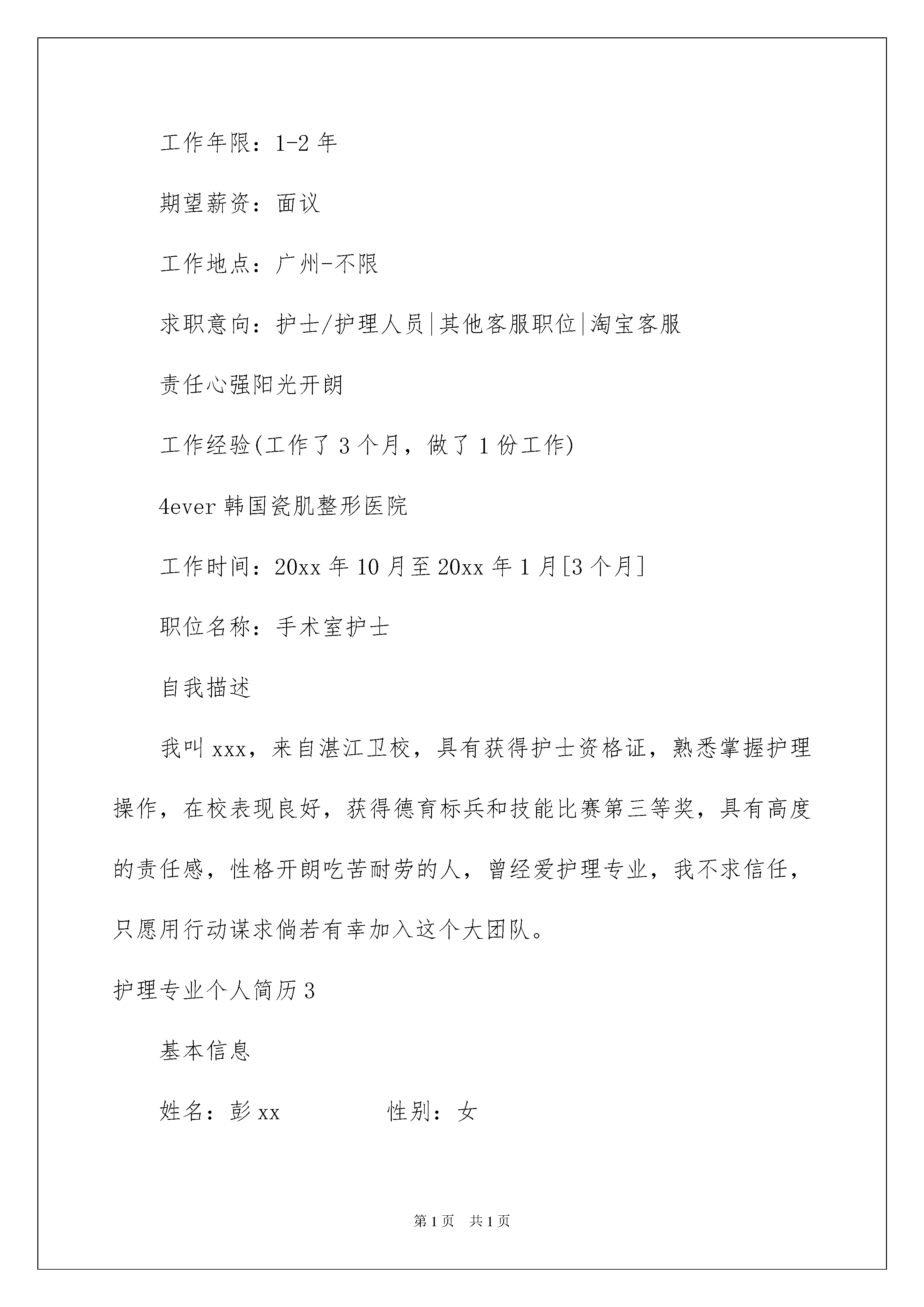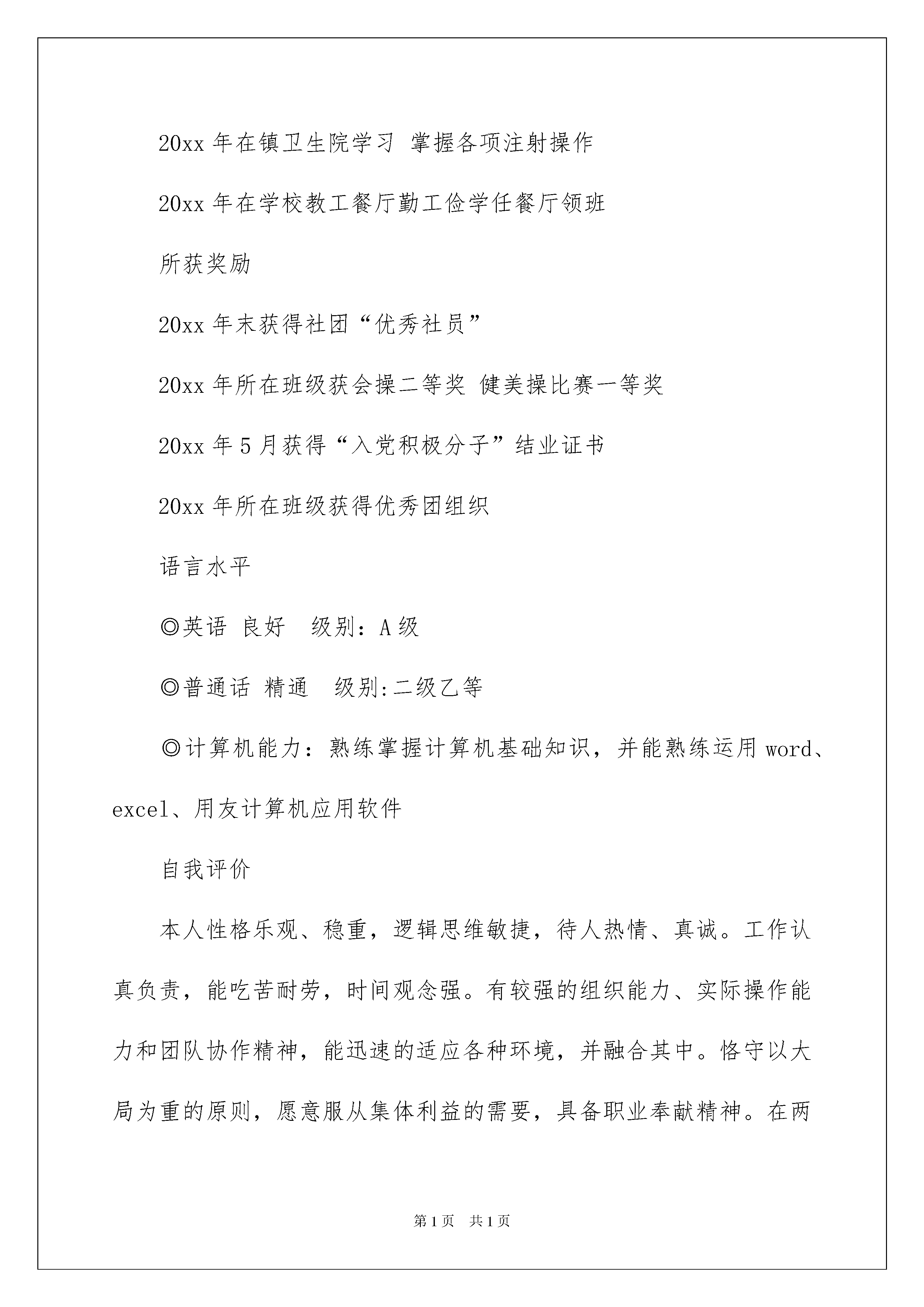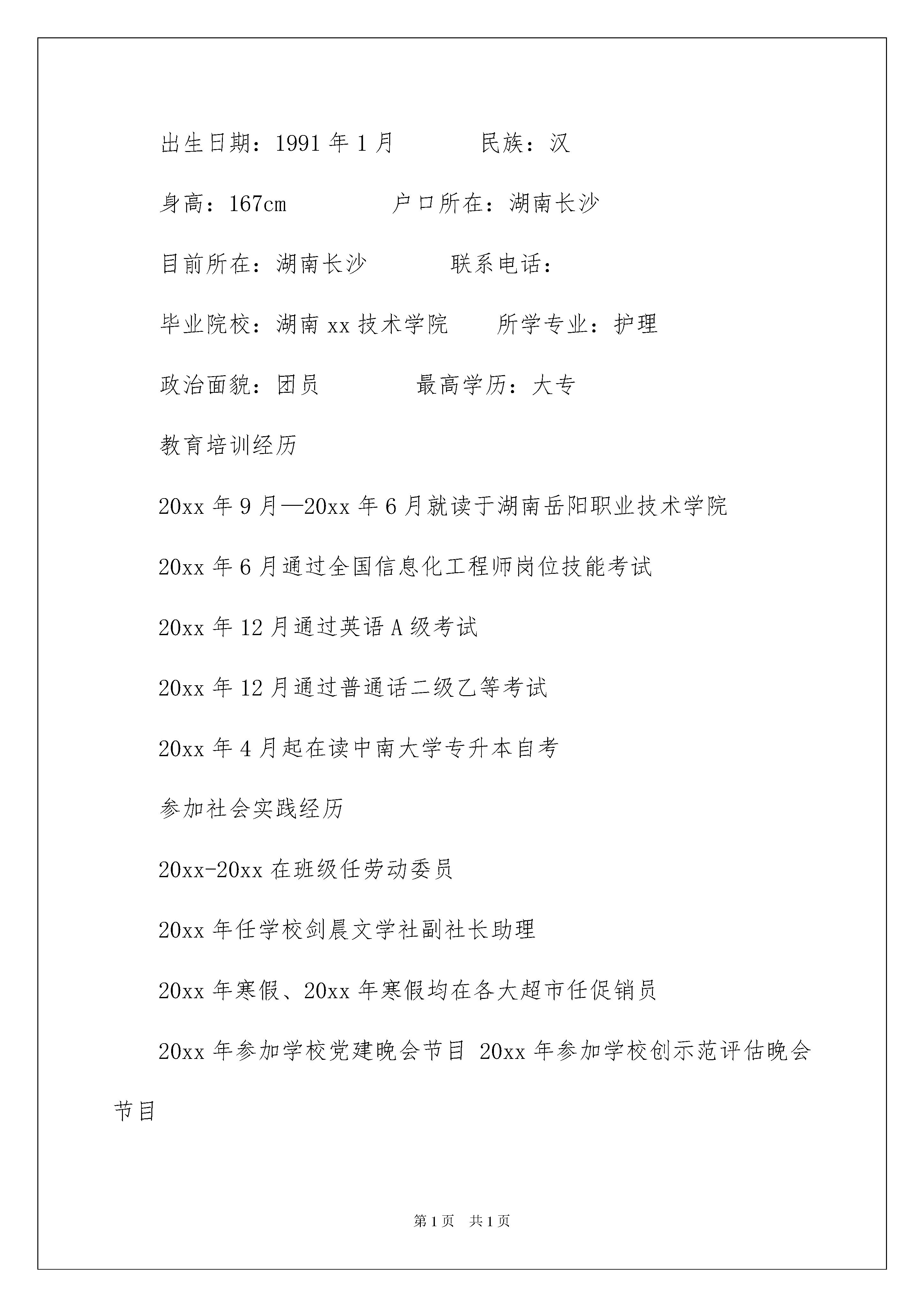 2022护理专业个人简历护理专业个人简历光阴的迅速,一眨眼就过去了,我们找工作的时间就要到来,这时一份好的简历可以起到很好的作用哦。你真的懂得怎么写好简历吗?以下是我为大家整理的护理专业个人简历,欢迎大家借鉴与参考,希望对大家有所帮助。护理专业个人简历1fwdq女23岁学历:大专工作年限:应届毕业生期望薪资:3000-5000元工作地点:广州-白云求职意向:护士/护理人员沟通能力强学习能力强有亲和力责任心强阳光开朗工作经验(工作了6个月,做了1份工作)郑州大学附属郑州市中心医院工作时间:20xx年9月至20xx年3月[6个月]职位名称:实习护士工作内容:帮医生照顾一下病人;注射一下药水;一些护理所需要学的,在这我都基本学会了。教育经历20xx年7月毕业郑州市黄河护理职业技术学院护理专业技能普通话:一般经验:5年自我描述我来自美丽的河南驻马店市,有着北方女孩的阳光开朗,我为人亲和力强;与他人沟通能力也不错;做事情我既有耐心也同时具备细心;在此本人希望在广州能找到一份合适我的工作。护理专业个人简历2fwdq女18岁学历:中专/技校工作年限:1-2年期望薪资:面议工作地点:广州-不限求职意向:护士/护理人员|其他客服职位|淘宝客服责任心强阳光开朗工作经验(工作了3个月,做了1份工作)4ever韩国瓷肌整形医院工作时间:20xx年10月至20xx年1月[3个月]职位名称:手术室护士自我描述我叫xxx,来自湛江卫校,具有获得护士资格证,熟悉掌握护理操作,在校表现良好,获得德育标兵和技能比赛第三等奖,具有高度的责任感,性格开朗吃苦耐劳的人,曾经爱护理专业,我不求信任,只愿用行动谋求倘若有幸加入这个大团队。护理专业个人简历3基本信息姓名:彭xx性别:女出生日期:1991年1月民族:汉身高:167cm户口所在:湖南长沙目前所在:湖南长沙联系电话:毕业院校:湖南xx技术学院所学专业:护理政治面貌:团员最高学历:大专教育培训经历20xx年9月—20xx年6月就读于湖南岳阳职业技术学院20xx年6月通过全国信息化工程师岗位技能考试20xx年12月通过英语A级考试20xx年12月通过普通话二级乙等考试20xx年4月起在读中南大学专升本自考参加社会实践经历20xx-20xx在班级任劳动委员20xx年任学校剑晨文学社副社长助理20xx年寒假、20xx年寒假均在各大超市任促销员20xx年参加学校党建晚会节目20xx年参加学校创示范评估晚会节目20xx年在镇卫生院学习掌握各项注射操作20xx年在学校教工餐厅勤工俭学任餐厅领班所获奖励20xx年末获得社团“优秀社员”20xx年所在班级获会操二等奖健美操比赛一等奖20xx年5月获得“入党积极分子”结业证书20xx年所在班级获得优秀团组织语言水平◎英语良好级别:A级◎普通话精通级别:二级乙等◎计算机能力:熟练掌握计算机基础知识,并能熟练运用word、excel、用友计算机应用软件自我评价本人性格乐观、稳重,逻辑思维敏捷,待人热情、真诚。工作认真负责,能吃苦耐劳,时间观念强。有较强的组织能力、实际操作能力和团队协作精神,能迅速的适应各种环境,并融合其中。恪守以大局为重的原则,愿意服从集体利益的需要,具备职业奉献精神。在两年的理论文化学习过程中积累了很多的基础理论知识,熟悉和掌握了护理基础的有关操做,学习和领悟了护理学中的相关理念,树立了牢固无菌观念。熟练掌握了无菌操作,静脉输液等基本操作。护理专业个人简历4基本信息姓名:性别:女毕业院校:阜阳职业技术学院政治面貌:团员最高学历:大专所修专业:护理人才类型:普通求职毕业日期:20xx年7月求职意向求职类型:全职应聘职位:护士希望工资:月薪[20xx—3000]人民币教育背景20xx年3月至20xx年3月阜阳职业技术学院护理专业20xx年—20xx年学院二等奖学金国家级二等奖学金学院三好学生优秀共青团员20xx年-20xx年实习于南京市中西医结合医院实践经历20xx/6至20xx年3月:在南京市钟山医院实习,实习期间遵守医院各项规章制度,认真完成各项操作。工作积极主动,吃苦耐劳,深得带教老师及病人喜爱。所获奖励20xx-2007曾获国家级励志奖学金20xx-2007曾获优秀共青团员20xx-2007曾获学院三好学生在校期间获得计算机初级证书`英语b级证书自我评价在校期间与同学和睦相处,尊敬师长,乐观开朗,勤奋好学并被选为预备党员。实习期间遵守医院各项规章制度,认真完成各项操作。工作积极主动,吃苦耐劳,深得带教老师及病人喜爱。联系方式联系电话:130****2264联系地址:太原市迎泽西大街护理专业个人简历5王寅(女,