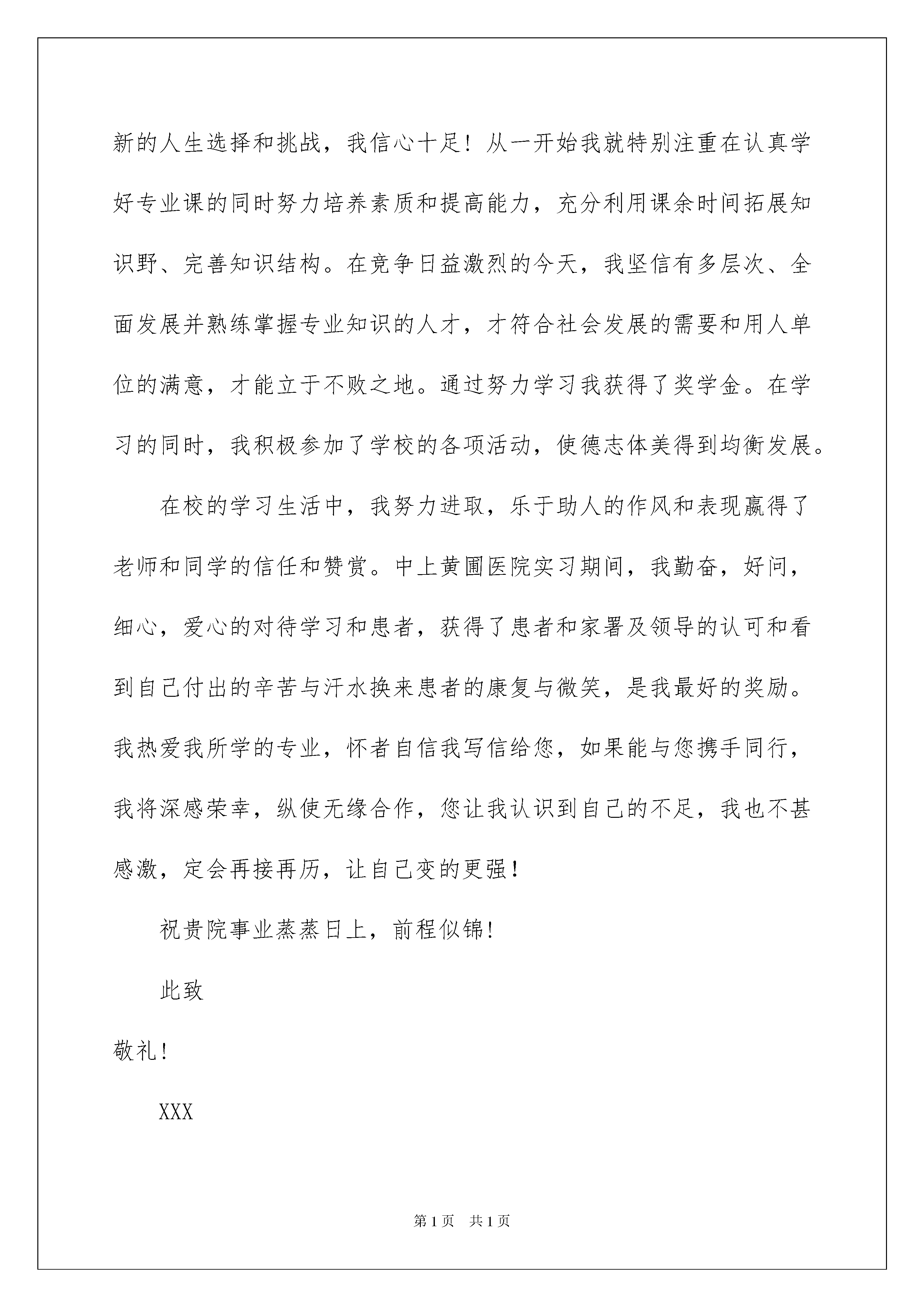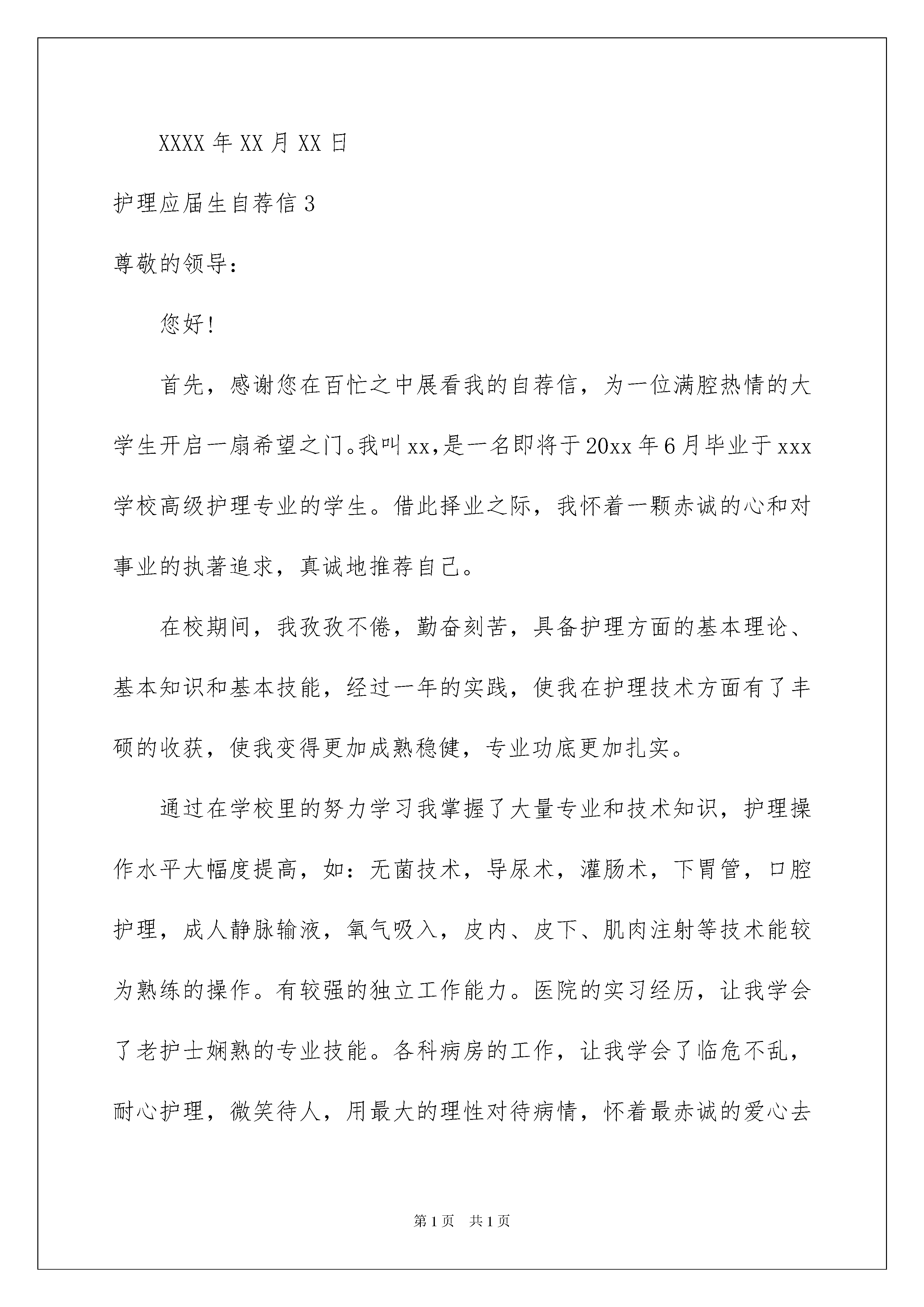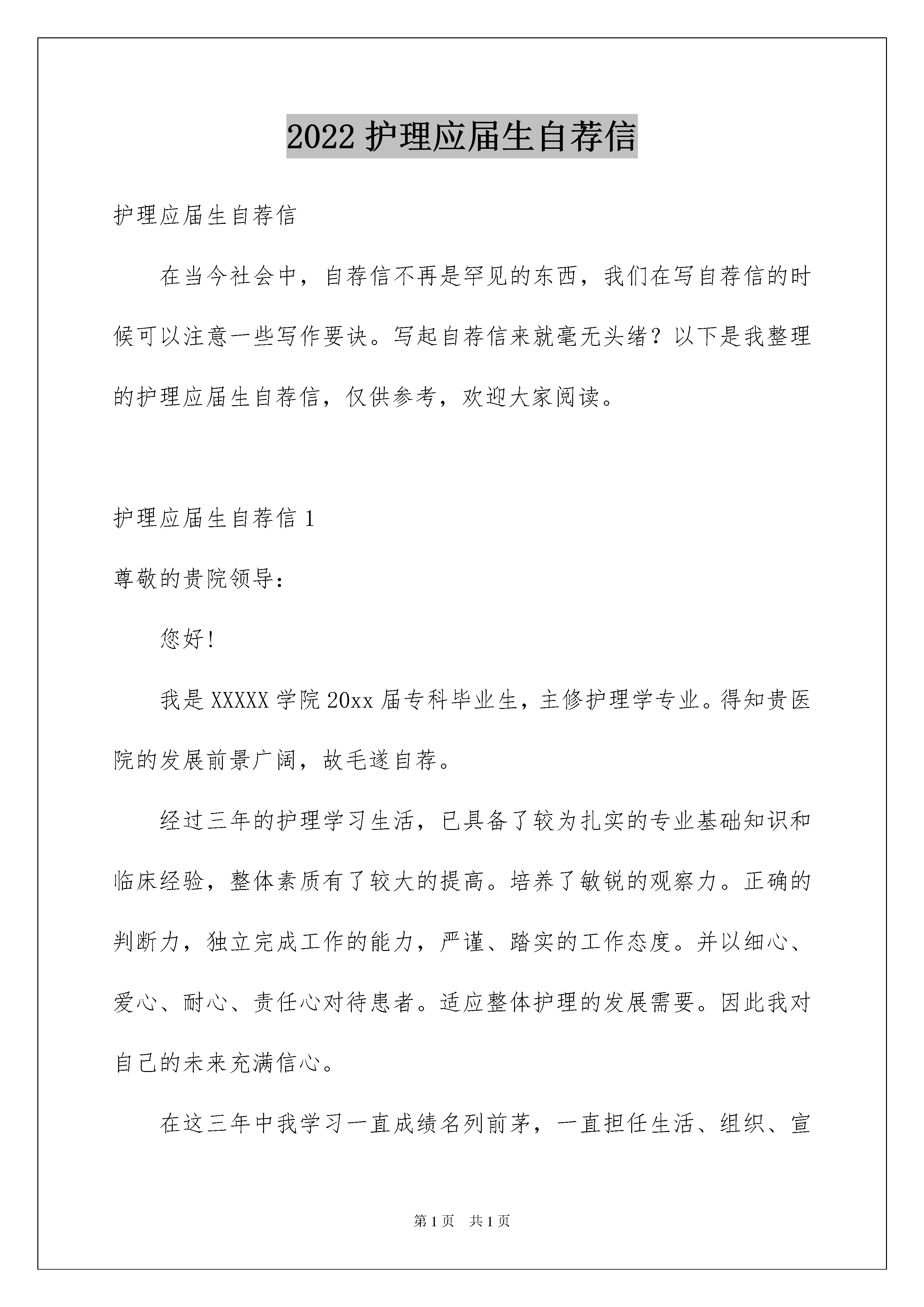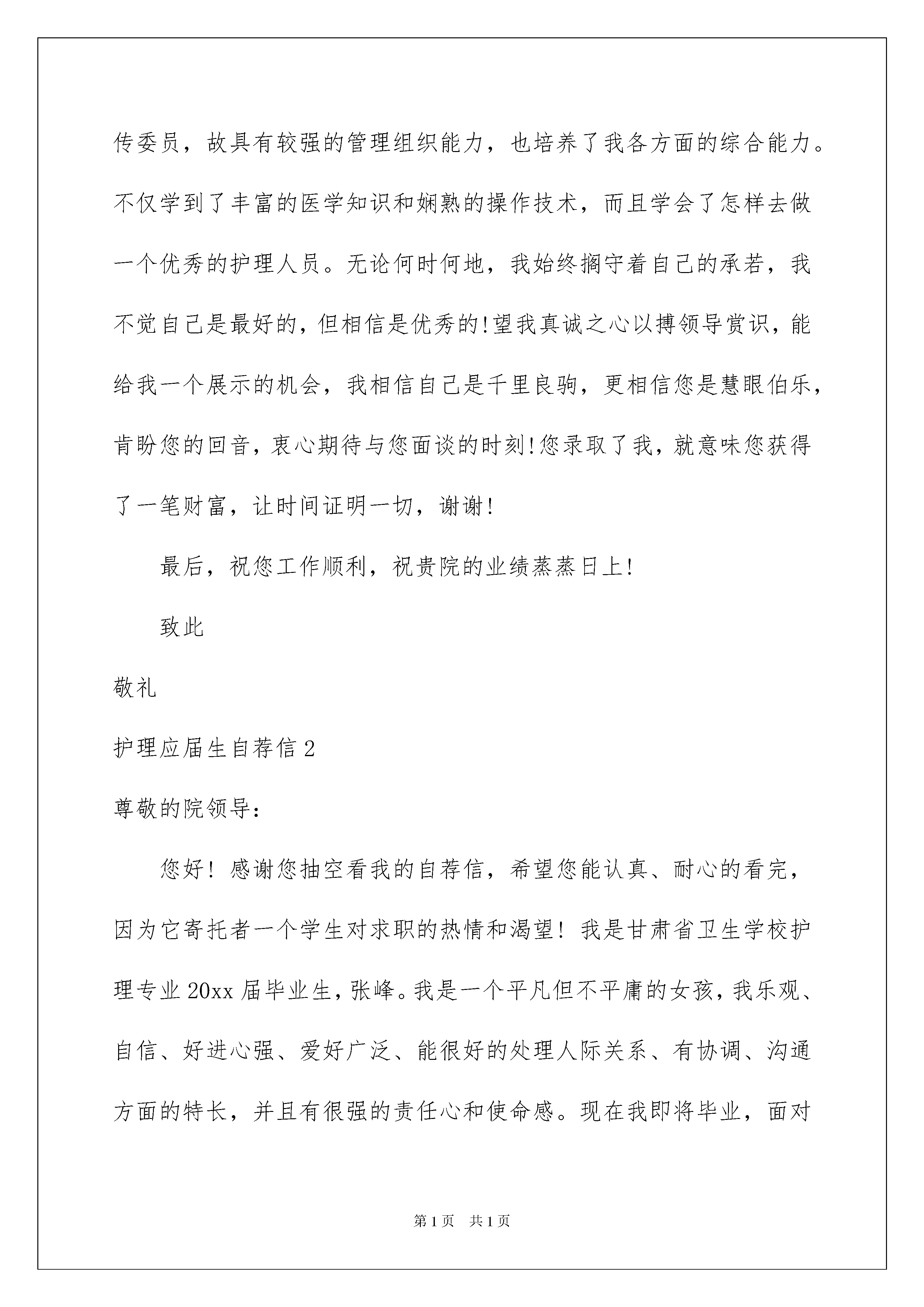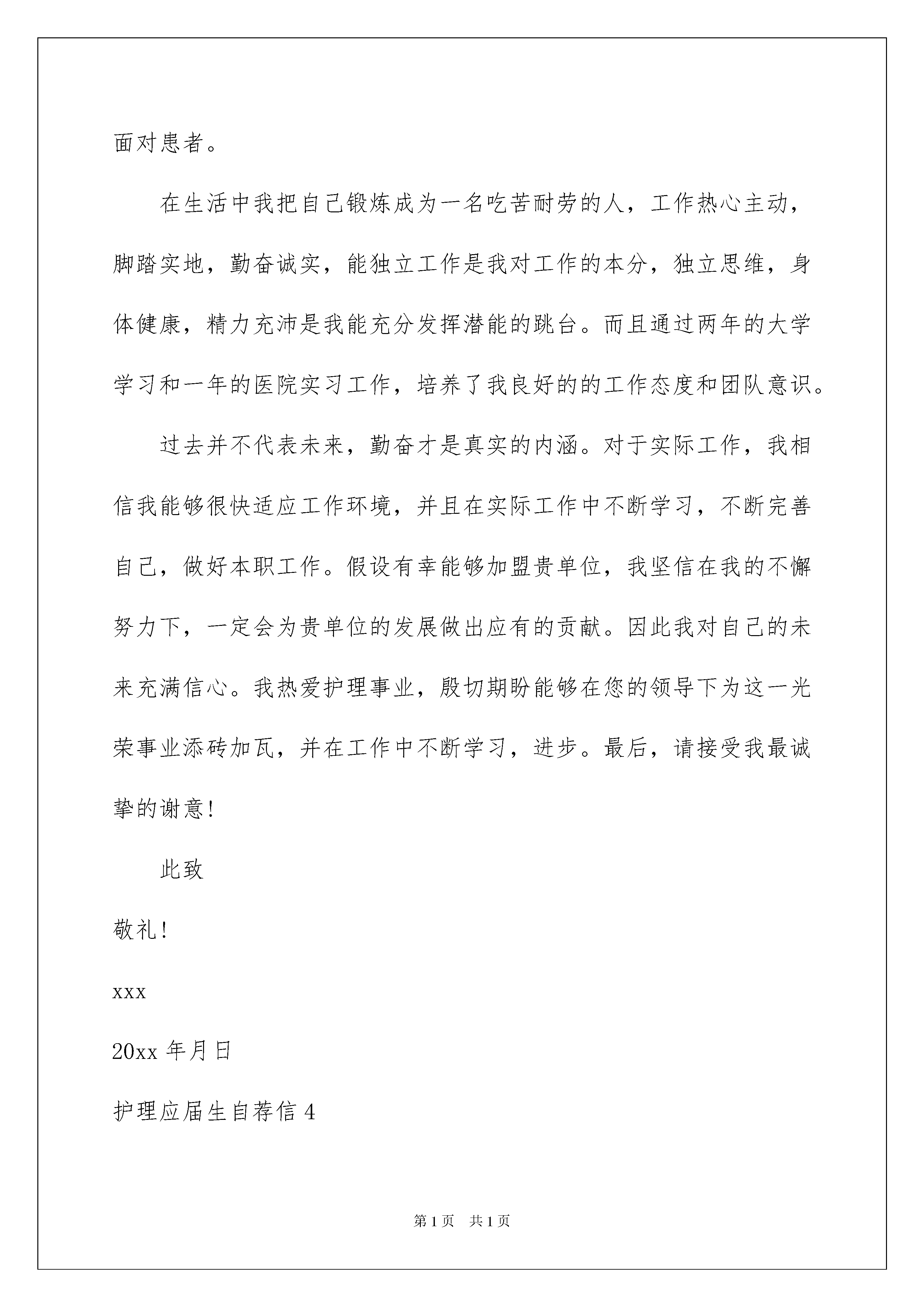 2022护理应届生自荐信护理应届生自荐信在当今社会中,自荐信不再是罕见的东西,我们在写自荐信的时候可以注意一些写作要诀。写起自荐信来就毫无头绪?以下是我整理的护理应届生自荐信,仅供参考,欢迎大家阅读。护理应届生自荐信1尊敬的贵院领导:您好!我是XXXXX学院20xx届专科毕业生,主修护理学专业。得知贵医院的发展前景广阔,故毛遂自荐。经过三年的护理学习生活,已具备了较为扎实的专业基础知识和临床经验,整体素质有了较大的提高。培养了敏锐的观察力。正确的判断力,独立完成工作的能力,严谨、踏实的工作态度。并以细心、爱心、耐心、责任心对待患者。适应整体护理的发展需要。因此我对自己的未来充满信心。在这三年中我学习一直成绩名列前茅,一直担任生活、组织、宣传委员,故具有较强的管理组织能力,也培养了我各方面的综合能力。不仅学到了丰富的医学知识和娴熟的操作技术,而且学会了怎样去做一个优秀的护理人员。无论何时何地,我始终搁守着自己的承若,我不觉自己是最好的,但相信是优秀的!望我真诚之心以搏领导赏识,能给我一个展示的机会,我相信自己是千里良驹,更相信您是慧眼伯乐,肯盼您的回音,衷心期待与您面谈的时刻!您录取了我,就意味您获得了一笔财富,让时间证明一切,谢谢!最后,祝您工作顺利,祝贵院的业绩蒸蒸日上!致此敬礼护理应届生自荐信2尊敬的院领导:您好!感谢您抽空看我的自荐信,希望您能认真、耐心的看完,因为它寄托者一个学生对求职的热情和渴望!我是甘肃省卫生学校护理专业20xx届毕业生,张峰。我是一个平凡但不平庸的女孩,我乐观、自信、好进心强、爱好广泛、能很好的处理人际关系、有协调、沟通方面的特长,并且有很强的责任心和使命感。现在我即将毕业,面对新的人生选择和挑战,我信心十足!从一开始我就特别注重在认真学好专业课的同时努力培养素质和提高能力,充分利用课余时间拓展知识野、完善知识结构。在竞争日益激烈的今天,我坚信有多层次、全面发展并熟练掌握专业知识的人才,才符合社会发展的需要和用人单位的满意,才能立于不败之地。通过努力学习我获得了奖学金。在学习的同时,我积极参加了学校的各项活动,使德志体美得到均衡发展。在校的学习生活中,我努力进取,乐于助人的作风和表现嬴得了老师和同学的信任和赞赏。中上黄圃医院实习期间,我勤奋,好问,细心,爱心的对待学习和患者,获得了患者和家署及领导的认可和看到自己付出的辛苦与汗水换来患者的康复与微笑,是我最好的奖励。我热爱我所学的专业,怀者自信我写信给您,如果能与您携手同行,我将深感荣幸,纵使无缘合作,您让我认识到自己的不足,我也不甚感激,定会再接再历,让自己变的更强!祝贵院事业蒸蒸日上,前程似锦!此致敬礼!XXXXXXX年XX月XX日护理应届生自荐信3尊敬的领导:您好!首先,感谢您在百忙之中展看我的自荐信,为一位满腔热情的大学生开启一扇希望之门。我叫xx,是一名即将于20xx年6月毕业于xxx学校高级护理专业的学生。借此择业之际,我怀着一颗赤诚的心和对事业的执著追求,真诚地推荐自己。在校期间,我孜孜不倦,勤奋刻苦,具备护理方面的基本理论、基本知识和基本技能,经过一年的实践,使我在护理技术方面有了丰硕的收获,使我变得更加成熟稳健,专业功底更加扎实。通过在学校里的努力学习我掌握了大量专业和技术知识,护理操作水平大幅度提高,如:无菌技术,导尿术,灌肠术,下胃管,口腔护理,成人静脉输液,氧气吸入,皮内、皮下、肌肉注射等技术能较为熟练的操作。有较强的独立工作能力。医院的实习经历,让我学会了老护士娴熟的专业技能。各科病房的工作,让我学会了临危不乱,耐心护理,微笑待人,用最大的理性对待病情,怀着最赤诚的爱心去面对患者。在生活中我把自己锻炼成为一名吃苦耐劳的人,工作热心主动,脚踏实地,勤奋诚实,能独立工作是我对工作的本分,独立思维,身体健康,精力充沛是我能充分发挥潜能的跳台。而且通过两年的大学学习和一年的医院实习工作,培养了我良好的的工作态度和团队意识。过去并不代表未来,勤奋才是真实的内涵。对于实际工作,我相信我能够很快适应工作环境,并且在实际工作中不断学习,不断完善自己,做好本职工作。假设有幸能够加盟贵单位,我坚信在我的不懈努力下,一定会为贵单位的发展做出应有的贡献。因此我对自己的未来充满信心。我热爱护理事业,殷切期盼能够在您的领导下为这一光荣事业添砖加瓦,并在工作中不断学习,进步。最后,请接受我最诚挚的谢意!此致敬礼!xxx20xx年月日护理应届生自荐信4尊敬的领导:您好!感谢您在百忙中阅读我的自荐信!我叫xxx,今年33岁,大专学历,初级职称。1994年7月毕业于原南宁地区民族卫生校园护理专业,20x