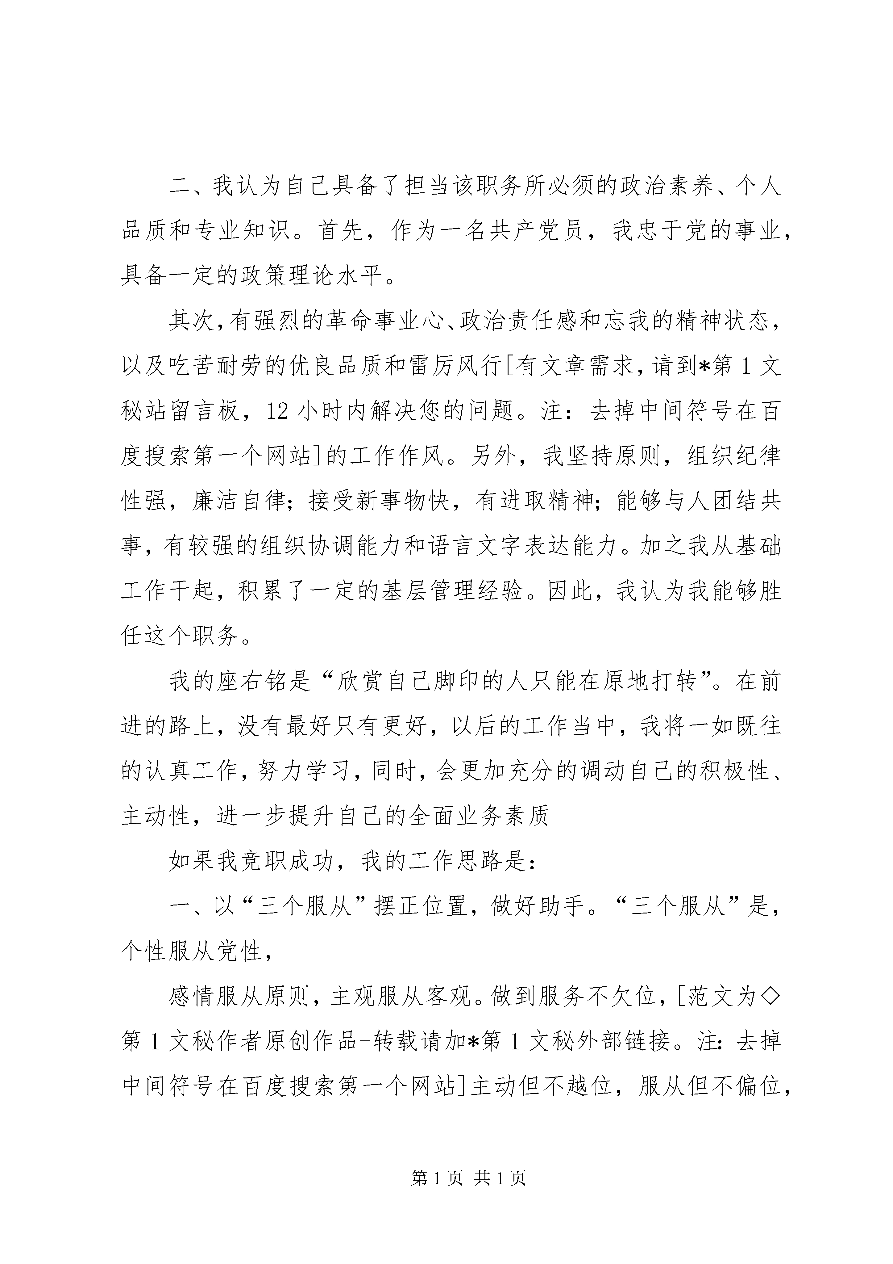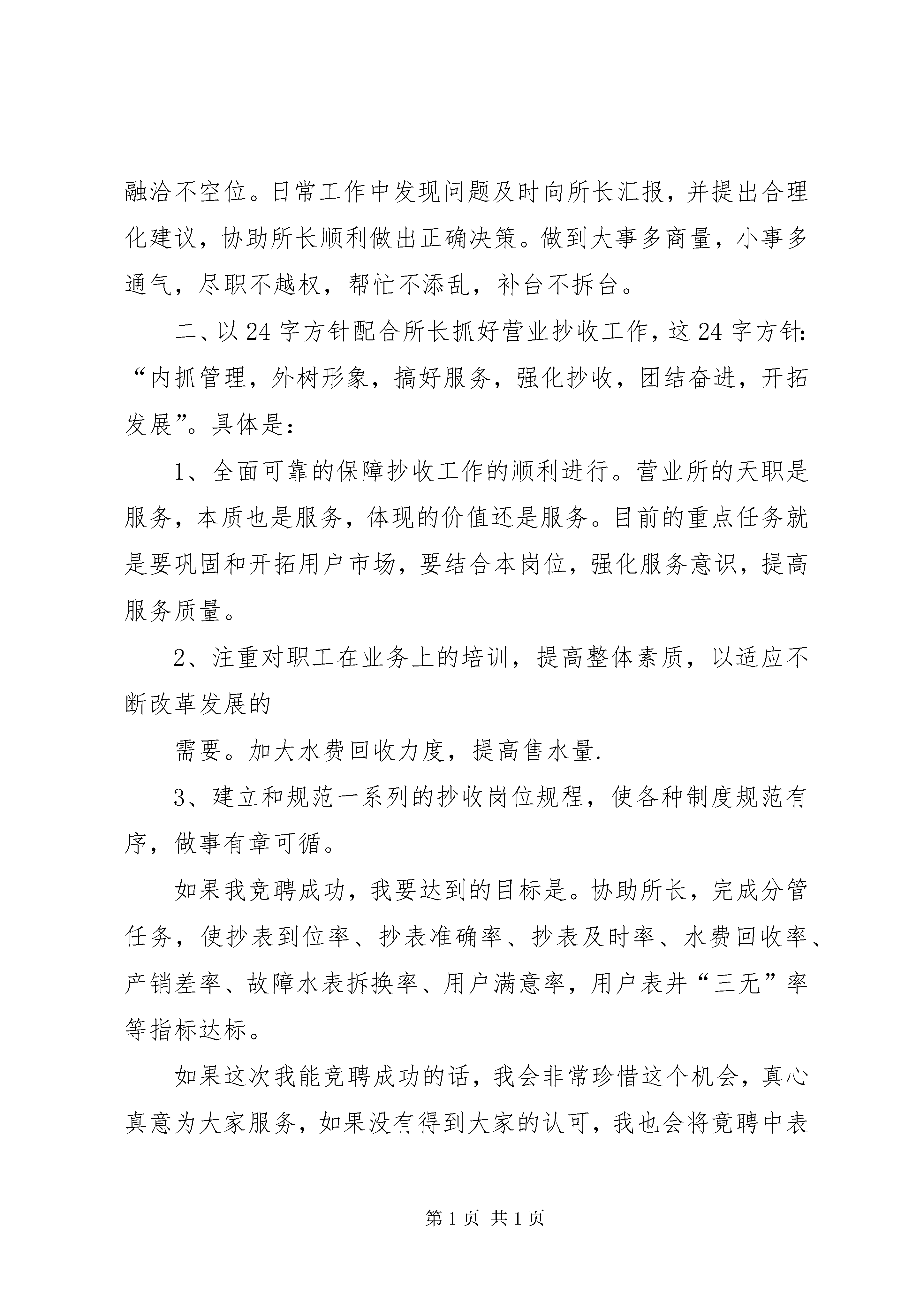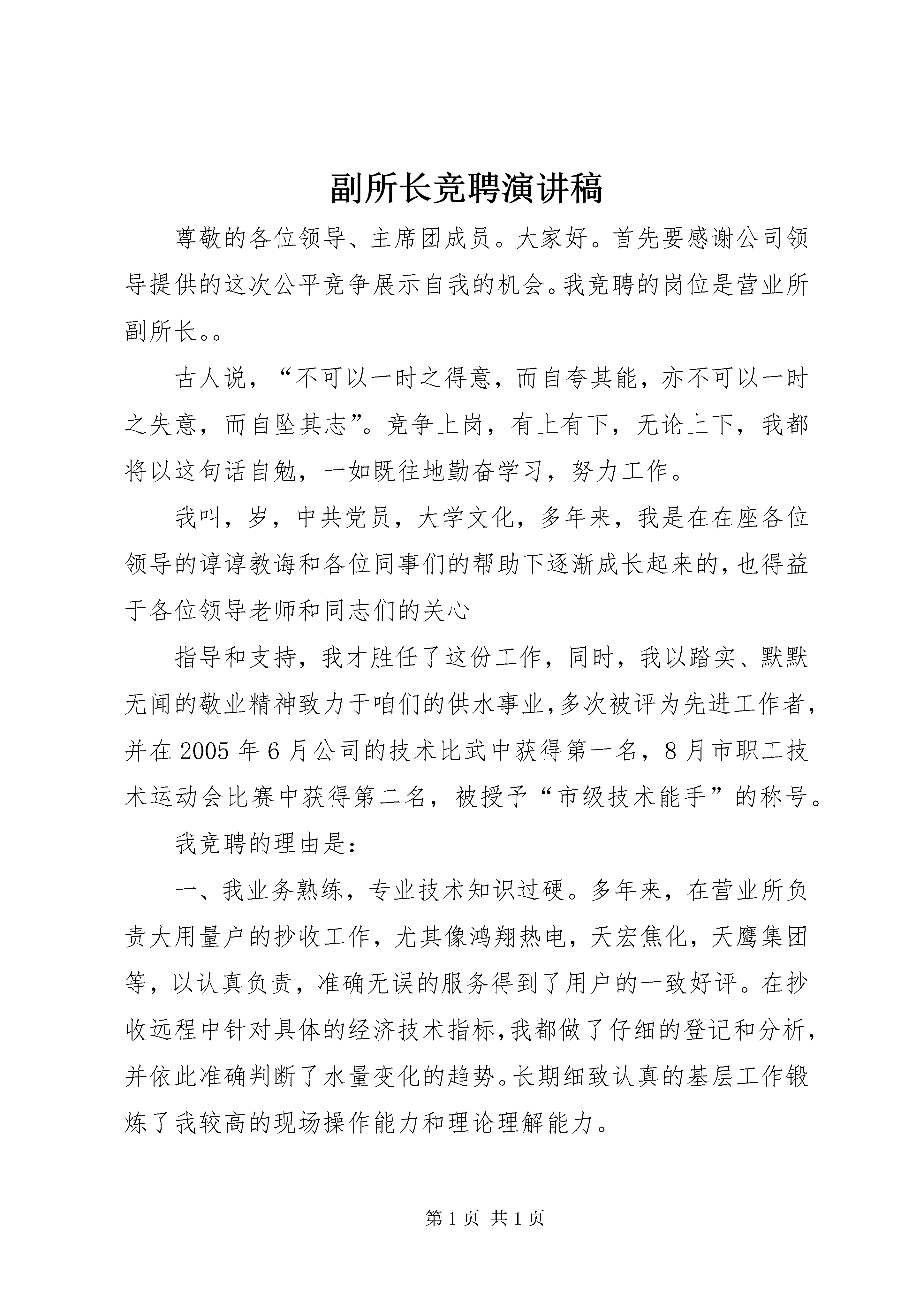 副所长竞聘演讲稿尊敬的各位领导、主席团成员。大家好。首先要感谢公司领导提供的这次公平竞争展示自我的机会。我竞聘的岗位是营业所副所长。。古人说,“不可以一时之得意,而自夸其能,亦不可以一时之失意,而自坠其志”。竞争上岗,有上有下,无论上下,我都将以这句话自勉,一如既往地勤奋学习,努力工作。我叫,岁,中共党员,大学文化,多年来,我是在在座各位领导的谆谆教诲和各位同事们的帮助下逐渐成长起来的,也得益于各位领导老师和同志们的关心指导和支持,我才胜任了这份工作,同时,我以踏实、默默无闻的敬业精神致力于咱们的供水事业,多次被评为先进工作者,并在2005年6月公司的技术比武中获得第一名,8月市职工技术运动会比赛中获得第二名,被授予“市级技术能手”的称号。我竞聘的理由是:一、我业务熟练,专业技术知识过硬。多年来,在营业所负责大用量户的抄收工作,尤其像鸿翔热电,天宏焦化,天鹰集团等,以认真负责,准确无误的服务得到了用户的一致好评。在抄收远程中针对具体的经济技术指标,我都做了仔细的登记和分析,并依此准确判断了水量变化的趋势。长期细致认真的基层工作锻炼了我较高的现场操作能力和理论理解能力。二、我认为自己具备了担当该职务所必须的政治素养、个人品质和专业知识。首先,作为一名共产党员,我忠于党的事业,具备一定的政策理论水平。其次,有强烈的革命事业心、政治责任感和忘我的精神状态,以及吃苦耐劳的优良品质和雷厉风行[有文章需求,请到*第1文秘站留言板,12小时内解决您的问题。注:去掉中间符号在百度搜索第一个网站]的工作作风。另外,我坚持原则,组织纪律性强,廉洁自律;接受新事物快,有进取精神;能够与人团结共事,有较强的组织协调能力和语言文字表达能力。加之我从基础工作干起,积累了一定的基层管理经验。因此,我认为我能够胜任这个职务。我的座右铭是“欣赏自己脚印的人只能在原地打转”。在前进的路上,没有最好只有更好,以后的工作当中,我将一如既往的认真工作,努力学习,同时,会更加充分的调动自己的积极性、主动性,进一步提升自己的全面业务素质如果我竞职成功,我的工作思路是:一、以“三个服从”摆正位置,做好助手。“三个服从”是,个性服从党性,感情服从原则,主观服从客观。做到服务不欠位,[范文为◇第1文秘作者原创作品-转载请加*第1文秘外部链接。注:去掉中间符号在百度搜索第一个网站]主动但不越位,服从但不偏位,融洽不空位。日常工作中发现问题及时向所长汇报,并提出合理化建议,协助所长顺利做出正确决策。做到大事多商量,小事多通气,尽职不越权,帮忙不添乱,补台不拆台。二、以24字方针配合所长抓好营业抄收工作,这24字方针:“内抓管理,外树形象,搞好服务,强化抄收,团结奋进,开拓发展”。具体是:1、全面可靠的保障抄收工作的顺利进行。营业所的天职是服务,本质也是服务,体现的价值还是服务。目前的重点任务就是要巩固和开拓用户市场,要结合本岗位,强化服务意识,提高服务质量。2、注重对职工在业务上的培训,提高整体素质,以适应不断改革发展的需要。加大水费回收力度,提高售水量.3、建立和规范一系列的抄收岗位规程,使各种制度规范有序,做事有章可循。如果我竞聘成功,我要达到的目标是。协助所长,完成分管任务,使抄表到位率、抄表准确率、抄表及时率、水费回收率、产销差率、故障水表拆换率、用户满意率,用户表井“三无”率等指标达标。如果这次我能竞聘成功的话,我会非常珍惜这个机会,真心真意为大家服务,如果没有得到大家的认可,我也会将竟聘中表现出的勇气,带到今后的工作中去。“堂堂正正做人,兢兢业业做事。”做到“我与企业共命运,企业与我同发展”,努力坚守岗位,奉献自己,服务社会,用青春铸就辉煌,用热情抒写人生。。谢谢大家。《营业所副所长竞聘演讲稿》来源营业所副所长竞聘演讲稿