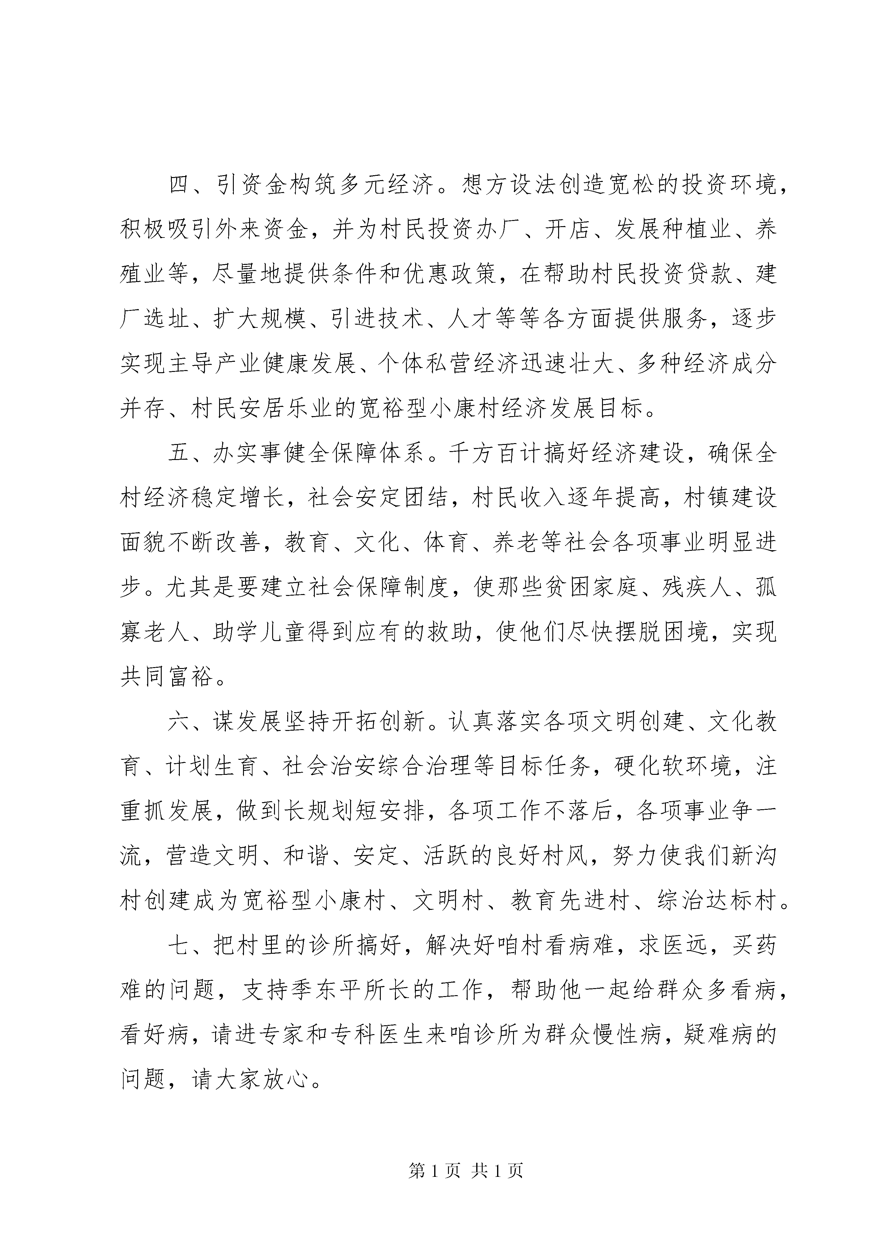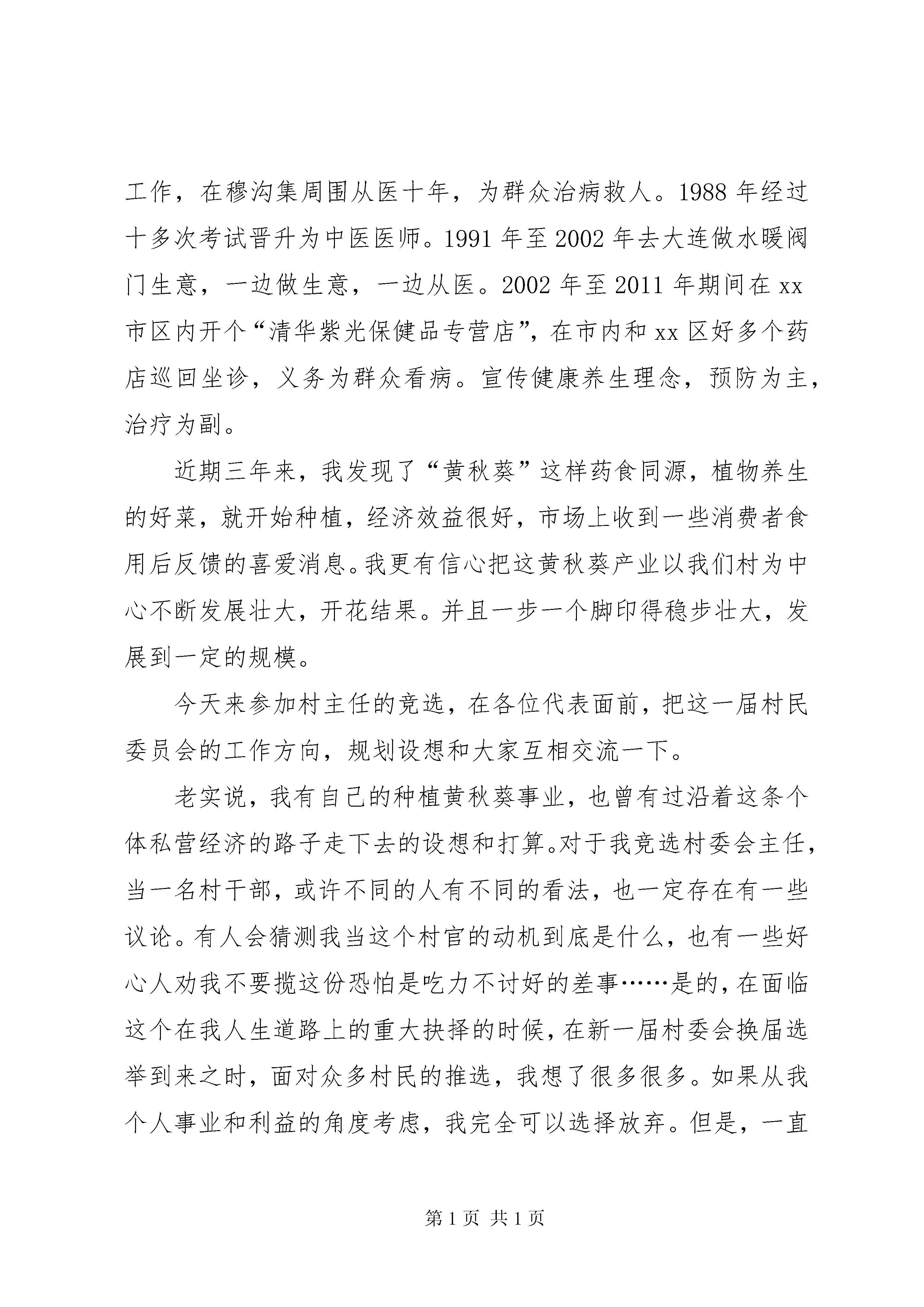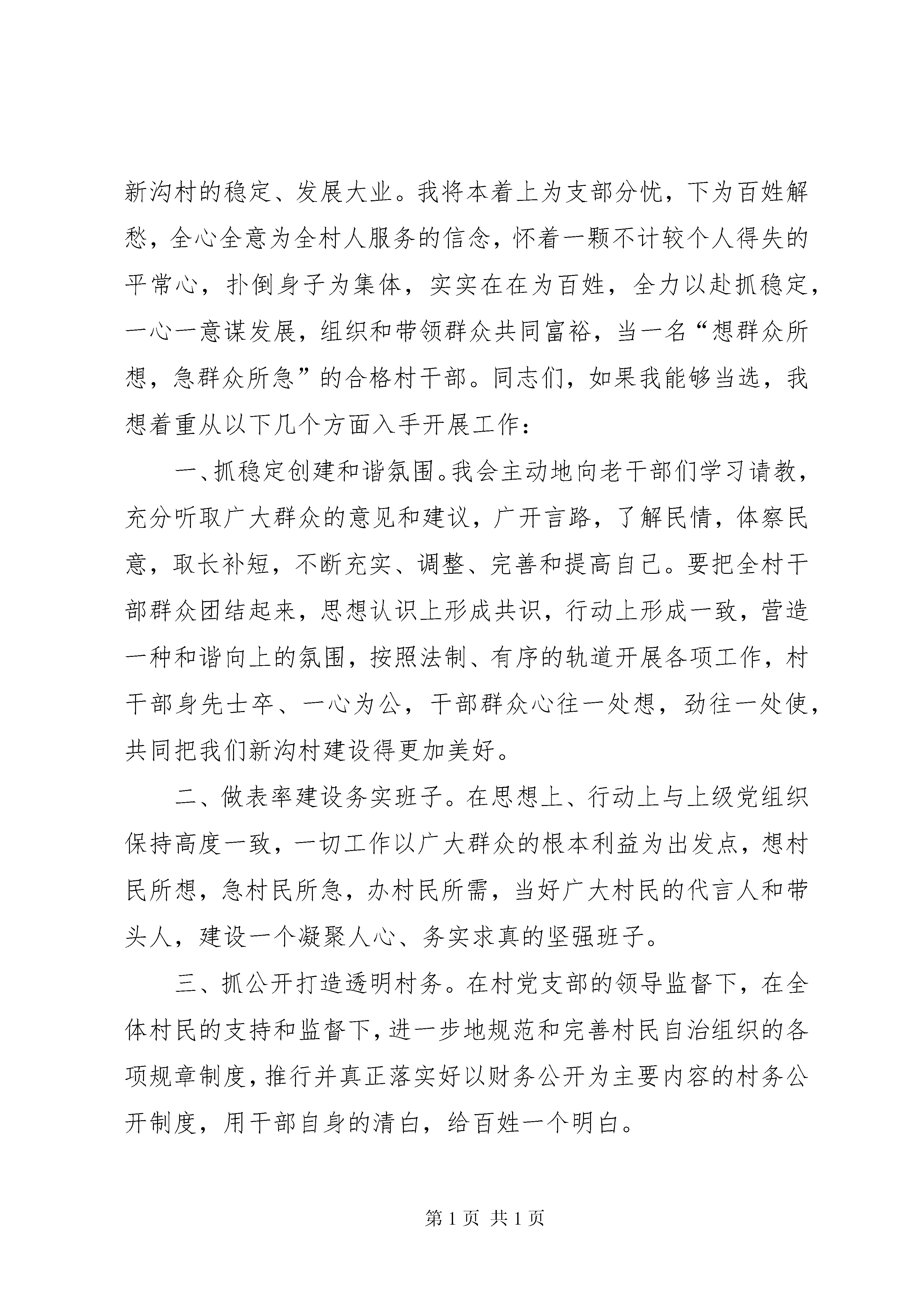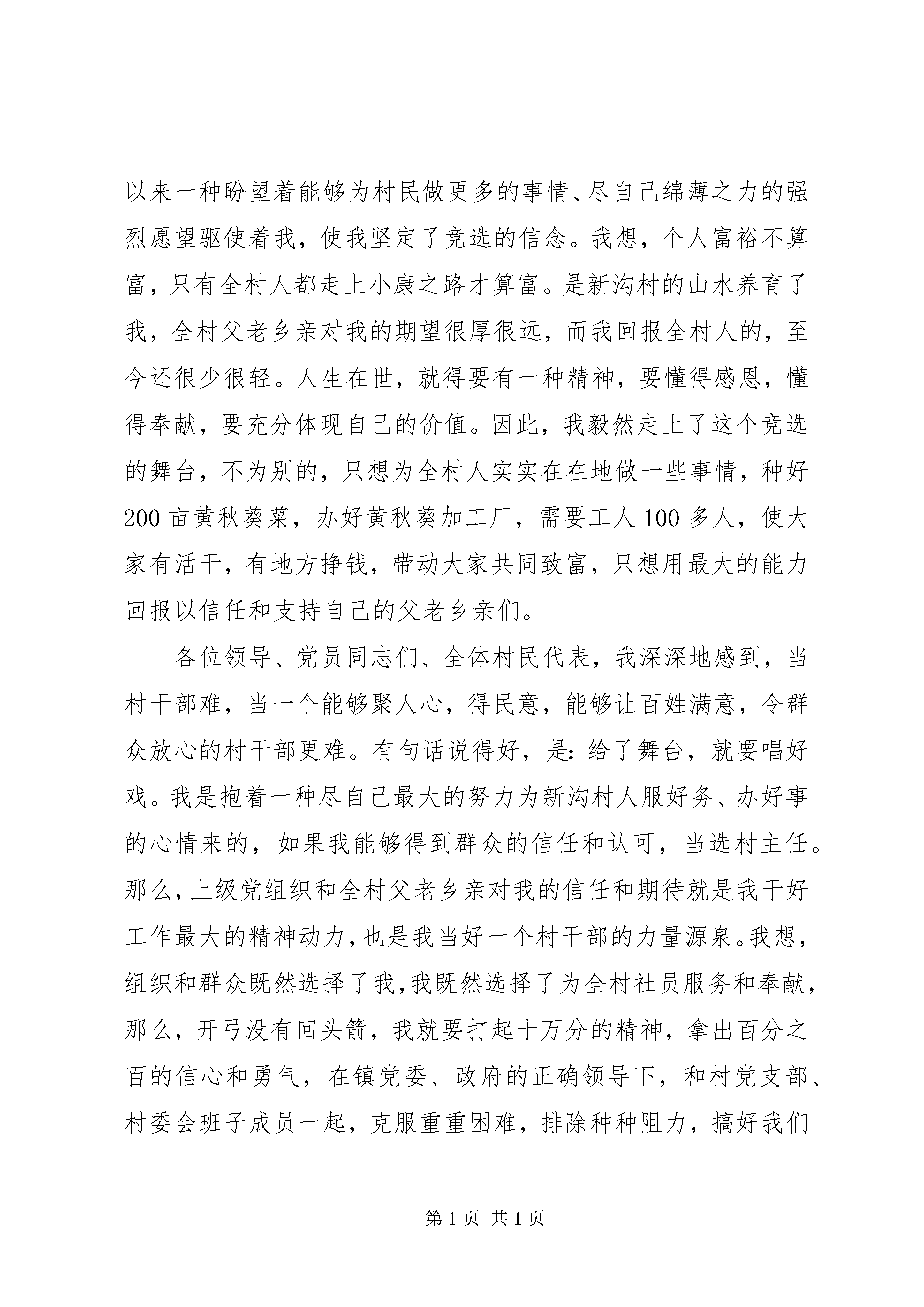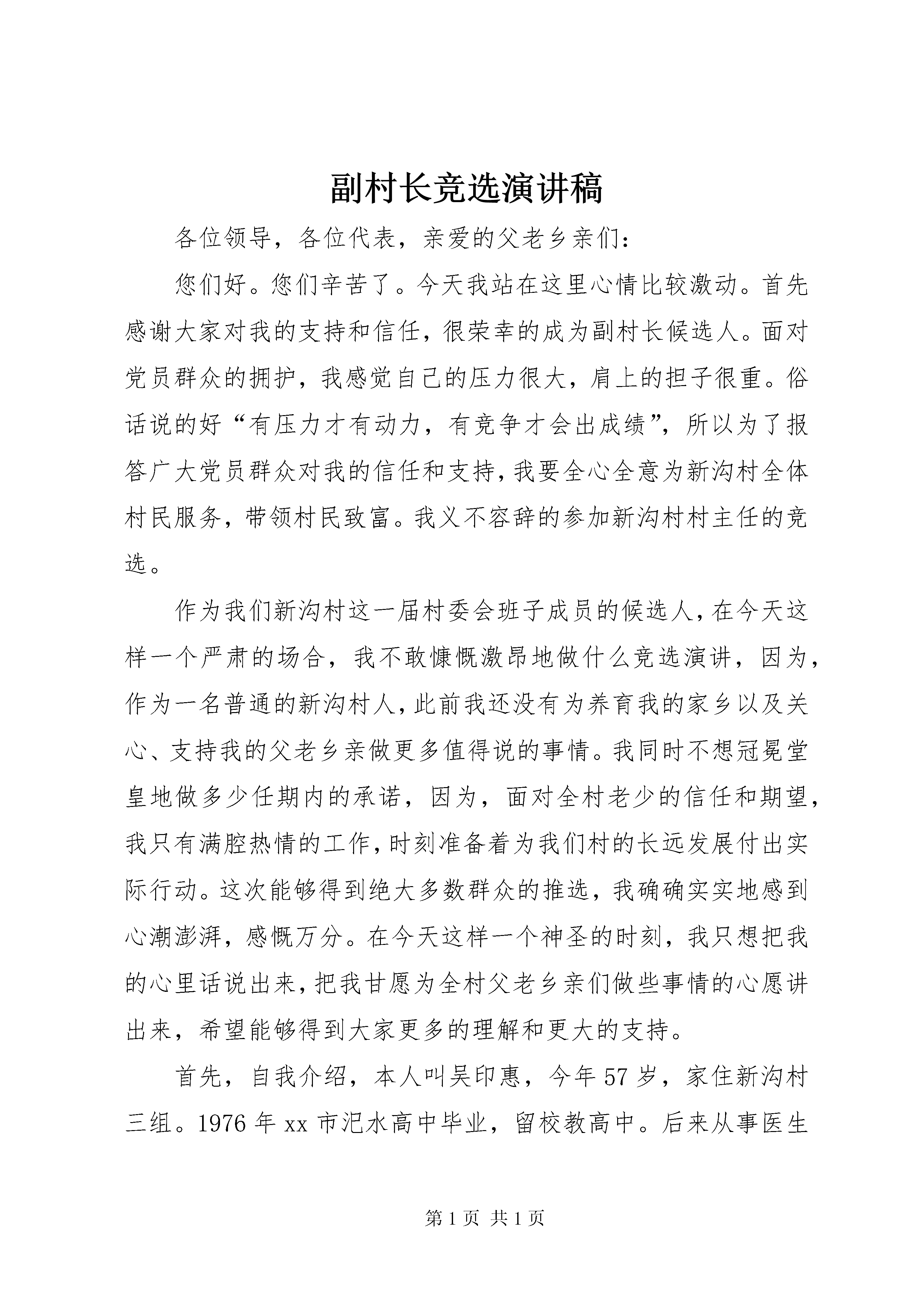 副村长竞选演讲稿各位领导,各位代表,亲爱的父老乡亲们:您们好。您们辛苦了。今天我站在这里心情比较激动。首先感谢大家对我的支持和信任,很荣幸的成为副村长候选人。面对党员群众的拥护,我感觉自己的压力很大,肩上的担子很重。俗话说的好“有压力才有动力,有竞争才会出成绩”,所以为了报答广大党员群众对我的信任和支持,我要全心全意为新沟村全体村民服务,带领村民致富。我义不容辞的参加新沟村村主任的竞选。作为我们新沟村这一届村委会班子成员的候选人,在今天这样一个严肃的场合,我不敢慷慨激昂地做什么竞选演讲,因为,作为一名普通的新沟村人,此前我还没有为养育我的家乡以及关心、支持我的父老乡亲做更多值得说的事情。我同时不想冠冕堂皇地做多少任期内的承诺,因为,面对全村老少的信任和期望,我只有满腔热情的工作,时刻准备着为我们村的长远发展付出实际行动。这次能够得到绝大多数群众的推选,我确确实实地感到心潮澎湃,感慨万分。在今天这样一个神圣的时刻,我只想把我的心里话说出来,把我甘愿为全村父老乡亲们做些事情的心愿讲出来,希望能够得到大家更多的理解和更大的支持。首先,自我介绍,本人叫吴印惠,今年57岁,家住新沟村三组。1976年xx市汜水高中毕业,留校教高中。后来从事医生工作,在穆沟集周围从医十年,为群众治病救人。1988年经过十多次考试晋升为中医医师。1991年至2002年去大连做水暖阀门生意,一边做生意,一边从医。2002年至2011年期间在xx市区内开个“清华紫光保健品专营店”,在市内和xx区好多个药店巡回坐诊,义务为群众看病。宣传健康养生理念,预防为主,治疗为副。近期三年来,我发现了“黄秋葵”这样药食同源,植物养生的好菜,就开始种植,经济效益很好,市场上收到一些消费者食用后反馈的喜爱消息。我更有信心把这黄秋葵产业以我们村为中心不断发展壮大,开花结果。并且一步一个脚印得稳步壮大,发展到一定的规模。今天来参加村主任的竞选,在各位代表面前,把这一届村民委员会的工作方向,规划设想和大家互相交流一下。老实说,我有自己的种植黄秋葵事业,也曾有过沿着这条个体私营经济的路子走下去的设想和打算。对于我竞选村委会主任,当一名村干部,或许不同的人有不同的看法,也一定存在有一些议论。有人会猜测我当这个村官的动机到底是什么,也有一些好心人劝我不要揽这份恐怕是吃力不讨好的差事……是的,在面临这个在我人生道路上的重大抉择的时候,在新一届村委会换届选举到来之时,面对众多村民的推选,我想了很多很多。如果从我个人事业和利益的角度考虑,我完全可以选择放弃。但是,一直以来一种盼望着能够为村民做更多的事情、尽自己绵薄之力的强烈愿望驱使着我,使我坚定了竞选的信念。我想,个人富裕不算富,只有全村人都走上小康之路才算富。是新沟村的山水养育了我,全村父老乡亲对我的期望很厚很远,而我回报全村人的,至今还很少很轻。人生在世,就得要有一种精神,要懂得感恩,懂得奉献,要充分体现自己的价值。因此,我毅然走上了这个竞选的舞台,不为别的,只想为全村人实实在在地做一些事情,种好200亩黄秋葵菜,办好黄秋葵加工厂,需要工人100多人,使大家有活干,有地方挣钱,带动大家共同致富,只想用最大的能力回报以信任和支持自己的父老乡亲们。各位领导、党员同志们、全体村民代表,我深深地感到,当村干部难,当一个能够聚人心,得民意,能够让百姓满意,令群众放心的村干部更难。有句话说得好,是:给了舞台,就要唱好戏。我是抱着一种尽自己最大的努力为新沟村人服好务、办好事的心情来的,如果我能够得到群众的信任和认可,当选村主任。那么,上级党组织和全村父老乡亲对我的信任和期待就是我干好工作最大的精神动力,也是我当好一个村干部的力量源泉。我想,组织和群众既然选择了我,我既然选择了为全村社员服务和奉献,那么,开弓没有回头箭,我就要打起十万分的精神,拿出百分之百的信心和勇气,在镇党委、政府的正确领导下,和村党支部、村委会班子成员一起,克服重重困难,排除种种阻力,搞好我们新沟村的稳定、发展大业。我将本着上为支部分忧,下为百姓解愁,全心全意为全村人服务的信念,怀着一颗不计较个人得失的平常心,扑倒身子为集体,实实在在为百姓,全力以赴抓稳定,一心一意谋发展,组织和带领群众共同富裕,当一名“想群众所想,急群众所急”的合格村干部。同志们,如果我能够当选,我想着重从以下几个方面入手开展工作:一、抓稳定创建和谐氛围。我会主动地向老干部们学习请教,充分听取广大群众的意见和建议,广开言路,了解民情,体察民意,取长补短,不断充实、调整、完善和提高自己。要把全村干部群众团结起来,思想认识上形成共识,行动上形成一致,营造一种和谐向上的氛围,按照法制、有序的轨道开展各项工作,村干部身先士卒、一心为公,干部群众心往一处想,劲往一处使,共同把我们新沟村建设得更加美好。二