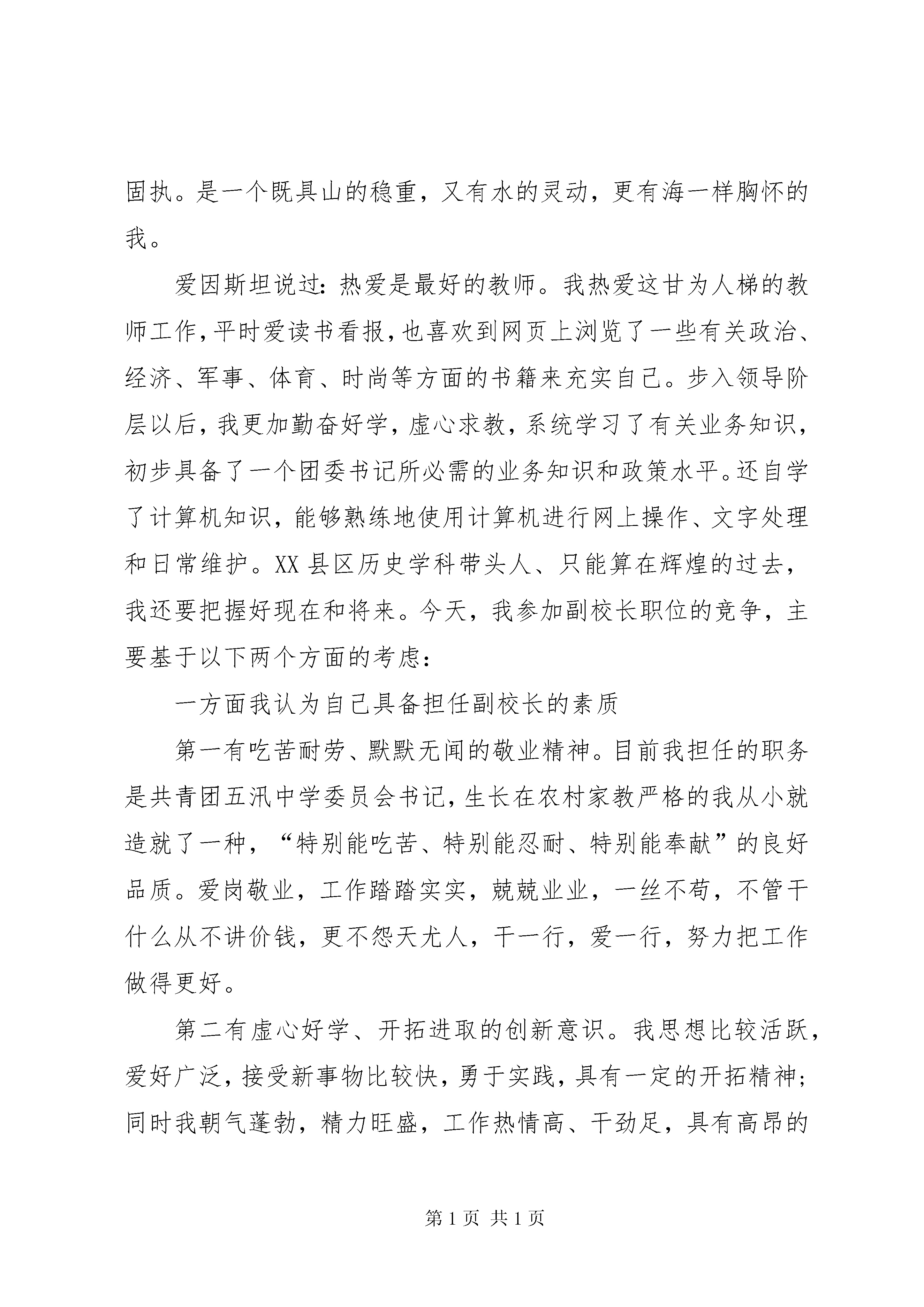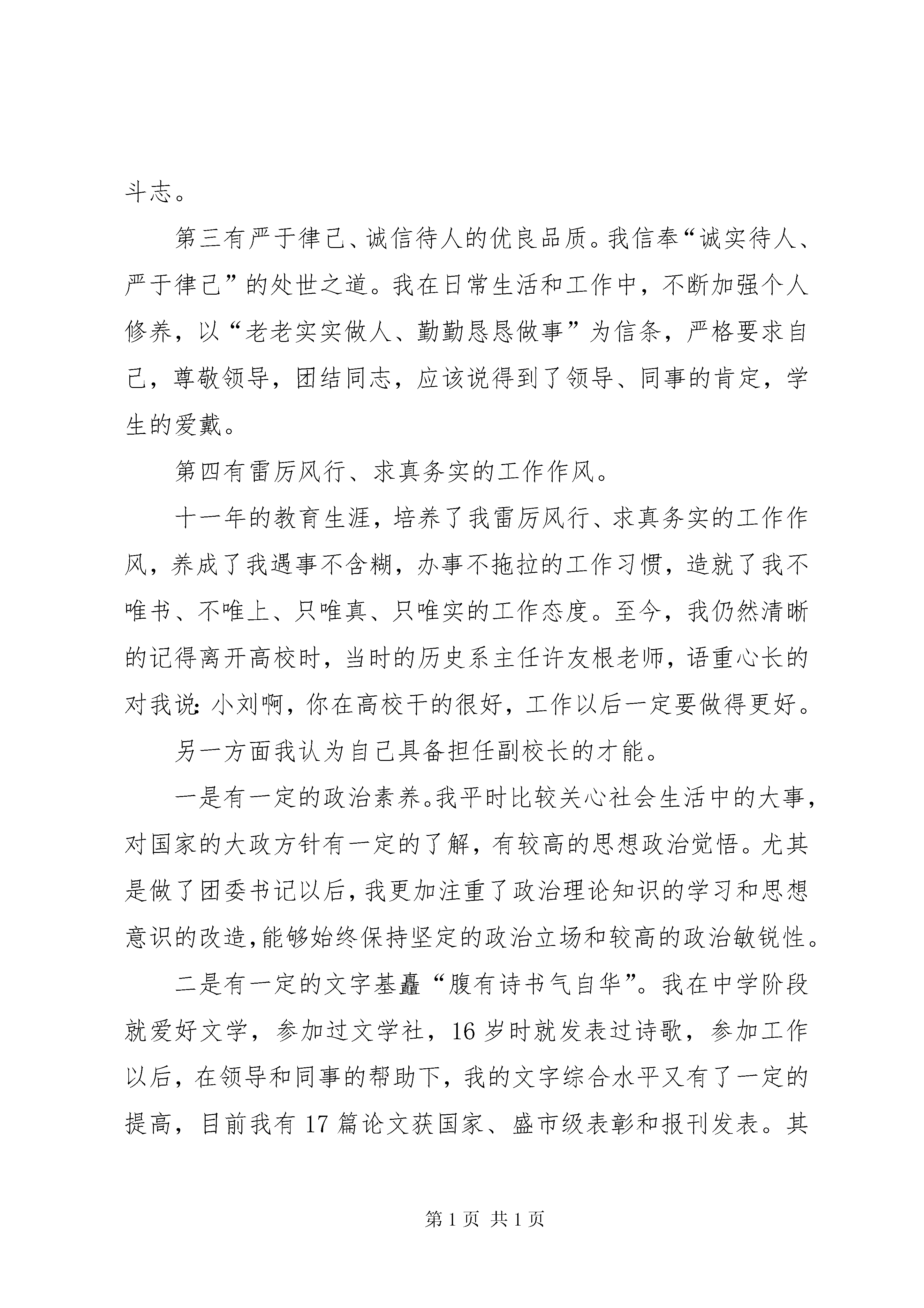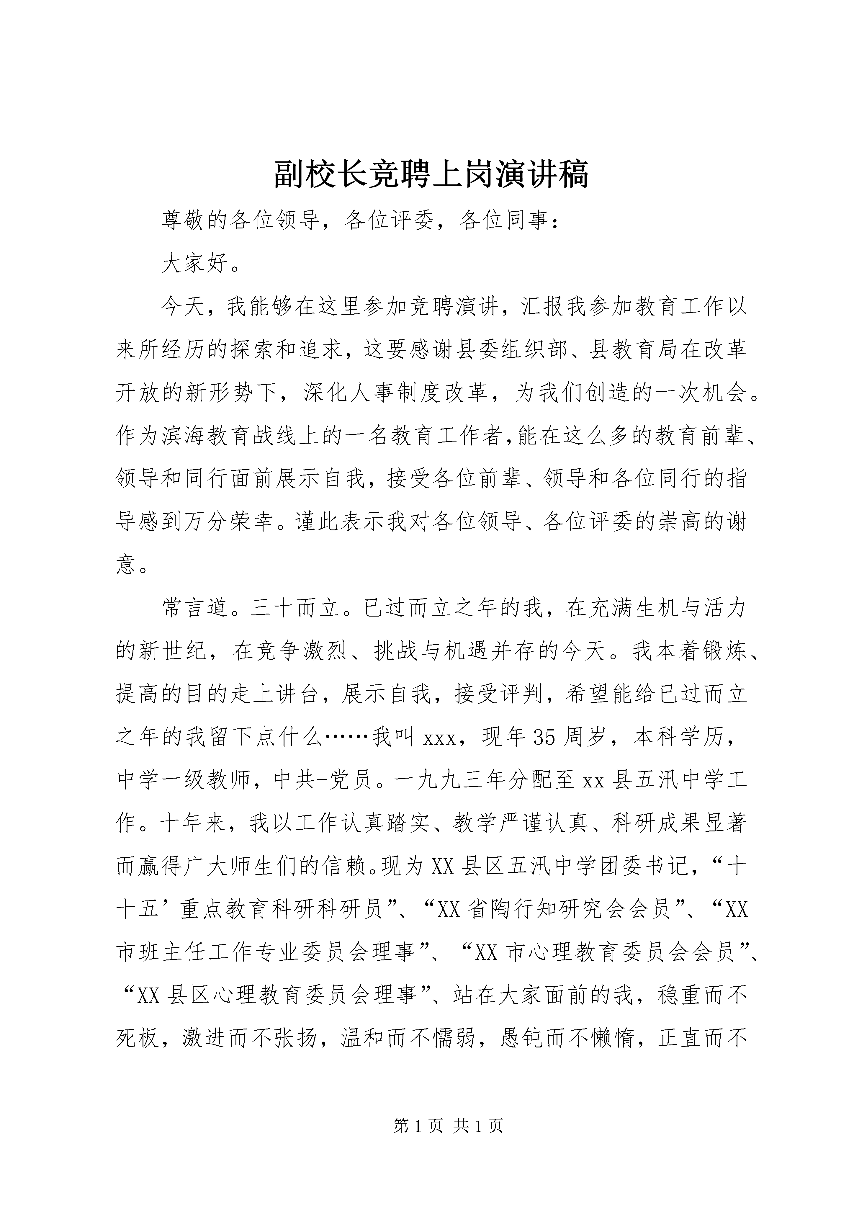副校长竞聘上岗演讲稿尊敬的各位领导,各位评委,各位同事:大家好。今天,我能够在这里参加竞聘演讲,汇报我参加教育工作以来所经历的探索和追求,这要感谢县委组织部、县教育局在改革开放的新形势下,深化人事制度改革,为我们创造的一次机会。作为滨海教育战线上的一名教育工作者,能在这么多的教育前辈、领导和同行面前展示自我,接受各位前辈、领导和各位同行的指导感到万分荣幸。谨此表示我对各位领导、各位评委的崇高的谢意。常言道。三十而立。已过而立之年的我,在充满生机与活力的新世纪,在竞争激烈、挑战与机遇并存的今天。我本着锻炼、提高的目的走上讲台,展示自我,接受评判,希望能给已过而立之年的我留下点什么……我叫xxx,现年35周岁,本科学历,中学一级教师,中共-党员。一九九三年分配至xx县五汛中学工作。十年来,我以工作认真踏实、教学严谨认真、科研成果显著而赢得广大师生们的信赖。现为XX县区五汛中学团委书记,“十十五’重点教育科研科研员”、“XX省陶行知研究会会员”、“XX市班主任工作专业委员会理事”、“XX市心理教育委员会会员”、“XX县区心理教育委员会理事”、站在大家面前的我,稳重而不死板,激进而不张扬,温和而不懦弱,愚钝而不懒惰,正直而不固执。是一个既具山的稳重,又有水的灵动,更有海一样胸怀的我。爱因斯坦说过:热爱是最好的教师。我热爱这甘为人梯的教师工作,平时爱读书看报,也喜欢到网页上浏览了一些有关政治、经济、军事、体育、时尚等方面的书籍来充实自己。步入领导阶层以后,我更加勤奋好学,虚心求教,系统学习了有关业务知识,初步具备了一个团委书记所必需的业务知识和政策水平。还自学了计算机知识,能够熟练地使用计算机进行网上操作、文字处理和日常维护。XX县区历史学科带头人、只能算在辉煌的过去,我还要把握好现在和将来。今天,我参加副校长职位的竞争,主要基于以下两个方面的考虑:一方面我认为自己具备担任副校长的素质第一有吃苦耐劳、默默无闻的敬业精神。目前我担任的职务是共青团五汛中学委员会书记,生长在农村家教严格的我从小就造就了一种,“特别能吃苦、特别能忍耐、特别能奉献”的良好品质。爱岗敬业,工作踏踏实实,兢兢业业,一丝不苟,不管干什么从不讲价钱,更不怨天尤人,干一行,爱一行,努力把工作做得更好。第二有虚心好学、开拓进取的创新意识。我思想比较活跃,爱好广泛,接受新事物比较快,勇于实践,具有一定的开拓精神;同时我朝气蓬勃,精力旺盛,工作热情高、干劲足,具有高昂的斗志。第三有严于律己、诚信待人的优良品质。我信奉“诚实待人、严于律己”的处世之道。我在日常生活和工作中,不断加强个人修养,以“老老实实做人、勤勤恳恳做事”为信条,严格要求自己,尊敬领导,团结同志,应该说得到了领导、同事的肯定,学生的爱戴。第四有雷厉风行、求真务实的工作作风。十一年的教育生涯,培养了我雷厉风行、求真务实的工作作风,养成了我遇事不含糊,办事不拖拉的工作习惯,造就了我不唯书、不唯上、只唯真、只唯实的工作态度。至今,我仍然清晰的记得离开高校时,当时的历史系主任许友根老师,语重心长的对我说:小刘啊,你在高校干的很好,工作以后一定要做得更好。另一方面我认为自己具备担任副校长的才能。一是有一定的政治素养。我平时比较关心社会生活中的大事,对国家的大政方针有一定的了解,有较高的思想政治觉悟。尤其是做了团委书记以后,我更加注重了政治理论知识的学习和思想意识的改造,能够始终保持坚定的政治立场和较高的政治敏锐性。二是有一定的文字基矗“腹有诗书气自华”。我在中学阶段就爱好文学,参加过文学社,16岁时就发表过诗歌,参加工作以后,在领导和同事的帮助下,我的文字综合水平又有了一定的提高,目前我有17篇论文获国家、盛市级表彰和报刊发表。其中我撰写的《历史教学体现时代精神的做法》获国家级教研论文一等奖,《历史教学》、《中学历史教学参考》、《历史知识》等国家级杂志,纷纷来信要求刊登、发表。