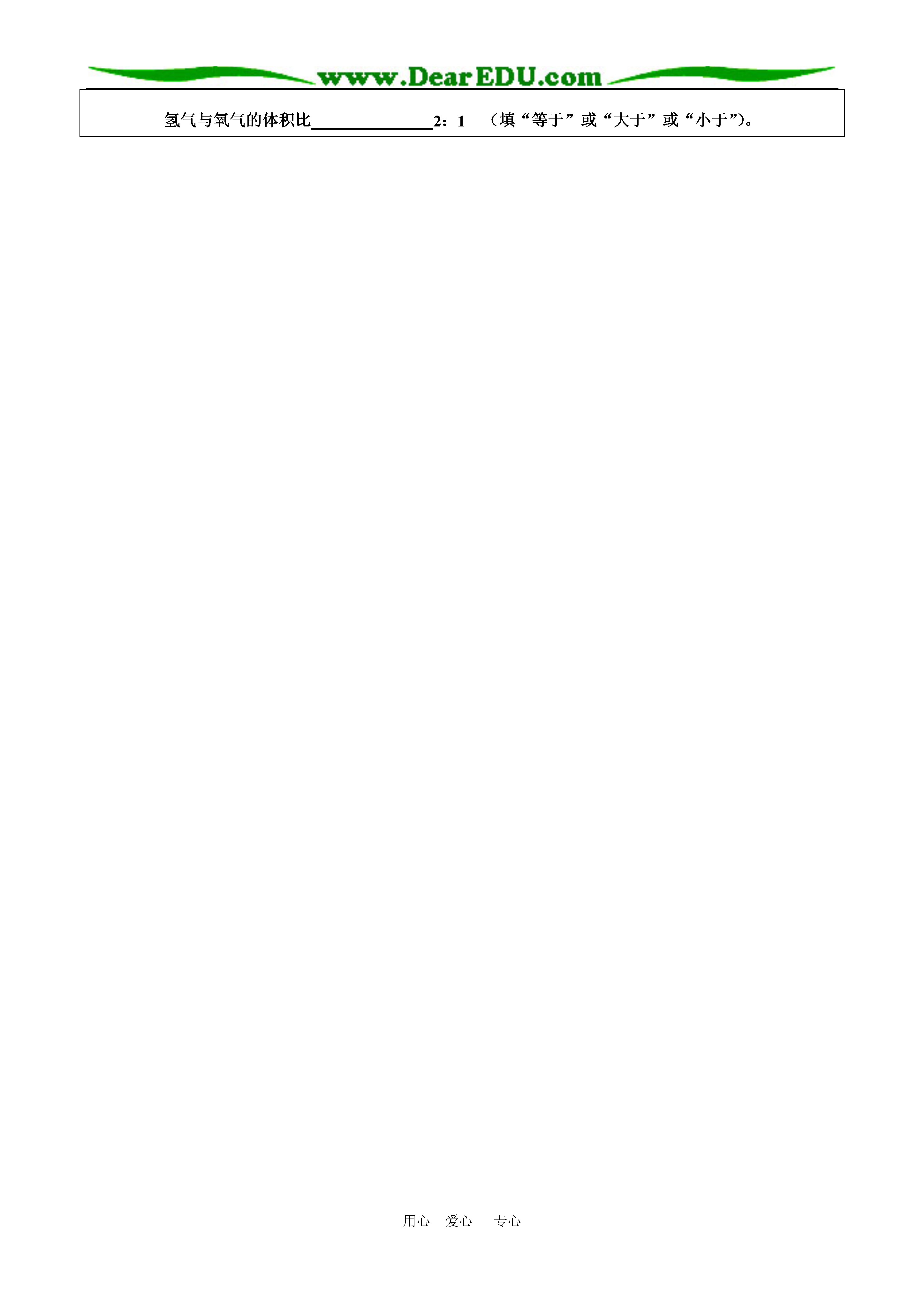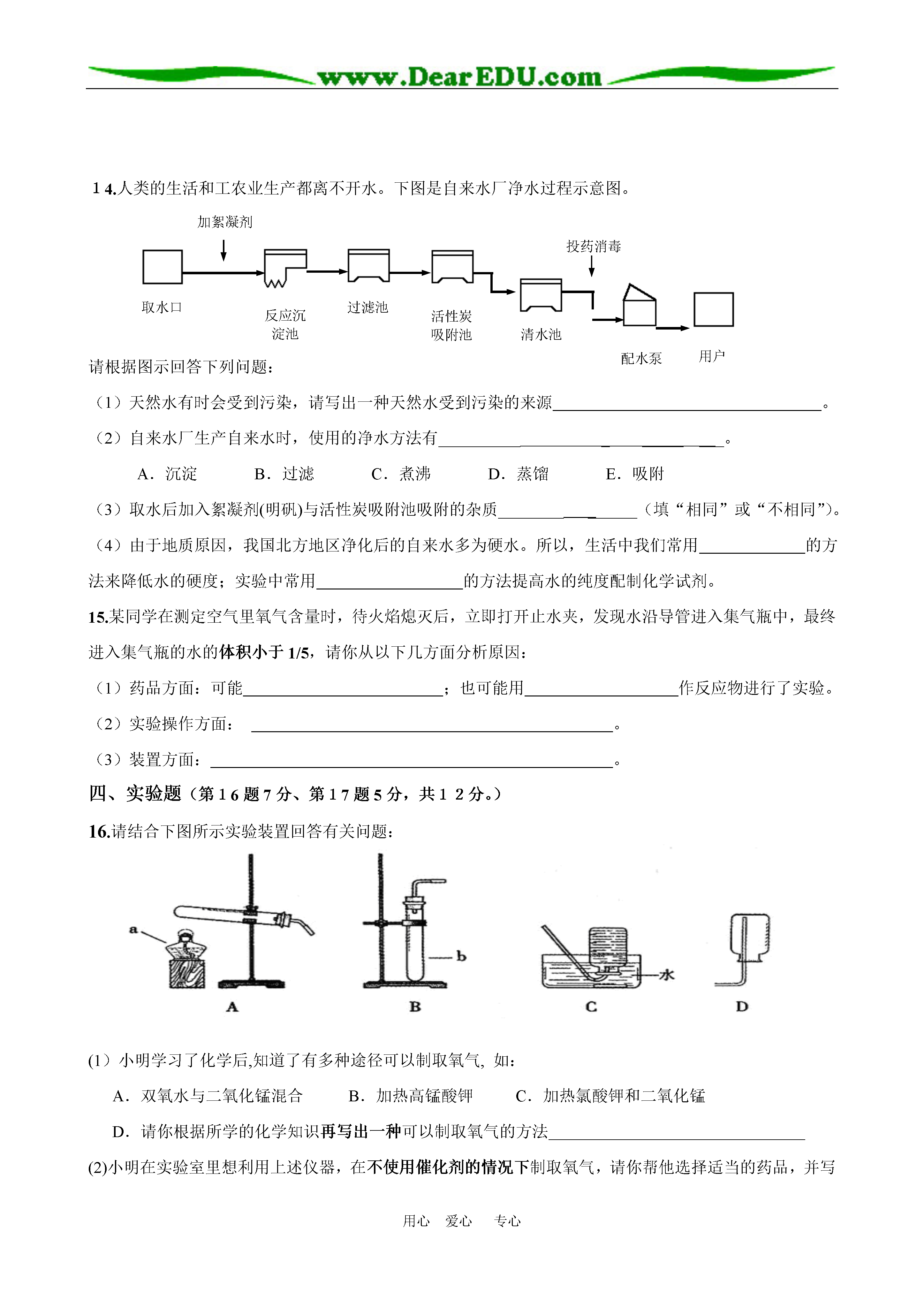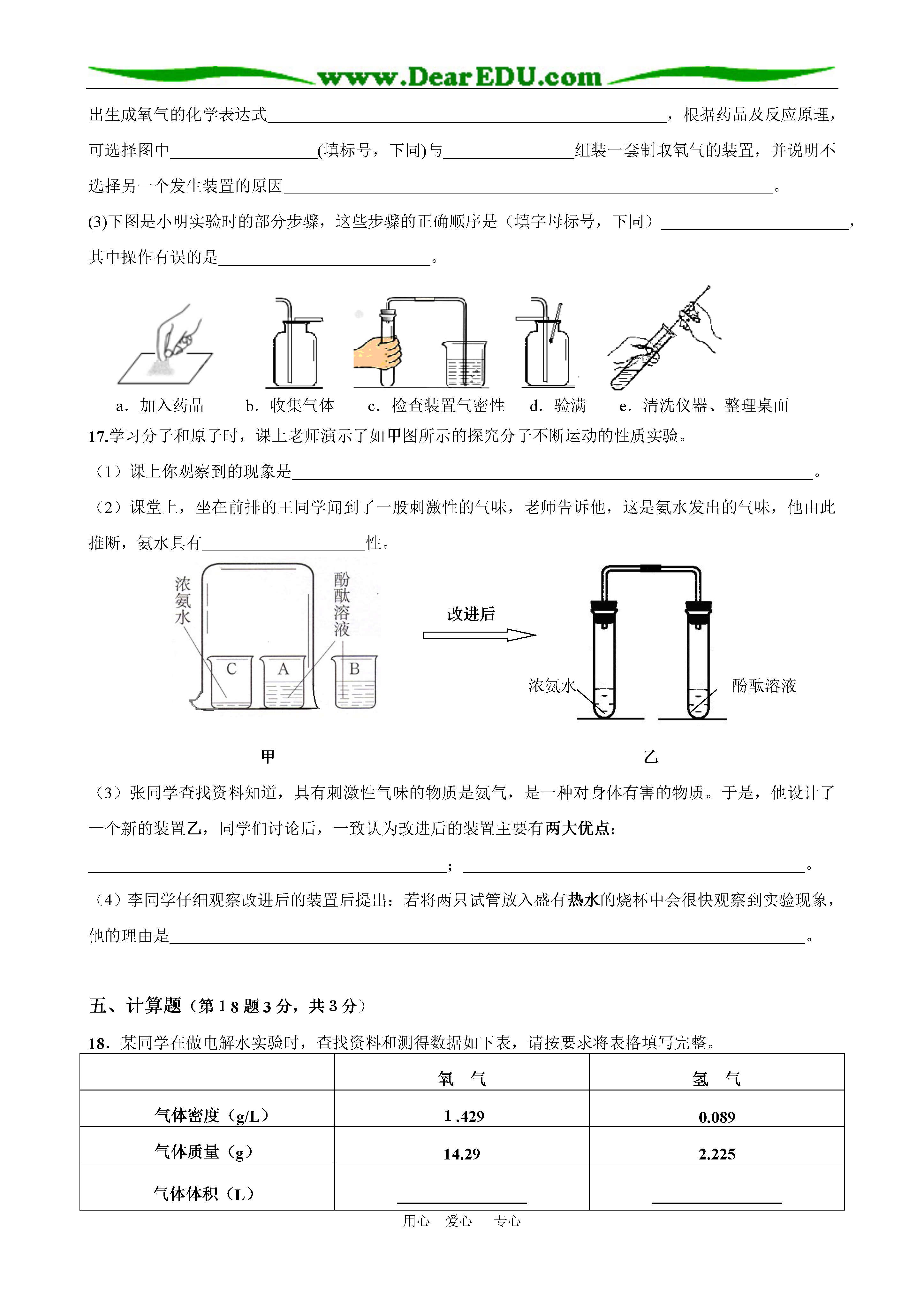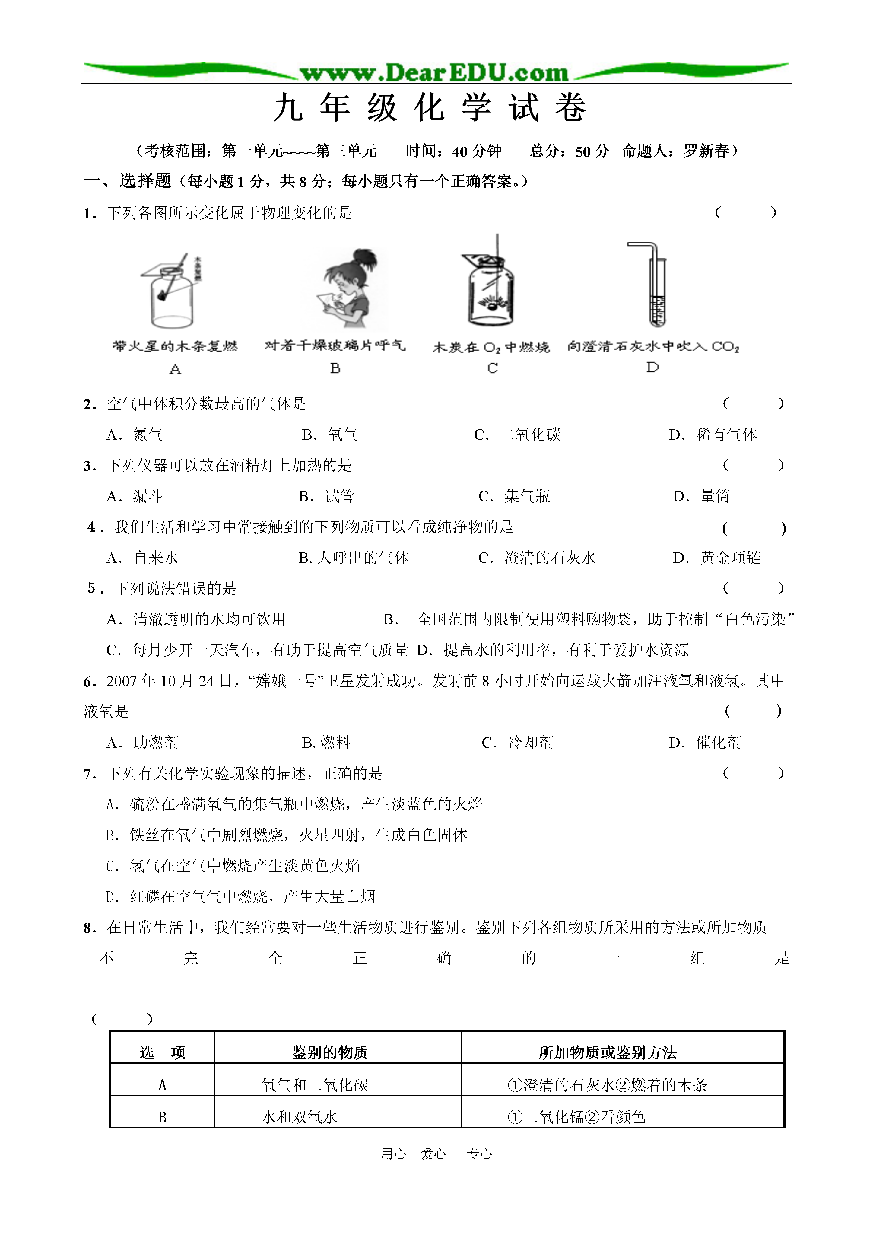 用心爱心专心九年级化学试卷(考核范围:第一单元~~~~第三单元时间:40分钟总分:50分命题人:罗新春)一、选择题(每小题1分,共8分;每小题只有一个正确答案。)1.下列各图所示变化属于物理变化的是()2.空气中体积分数最高的气体是()A.氮气B.氧气C.二氧化碳D.稀有气体3.下列仪器可以放在酒精灯上加热的是()A.漏斗B.试管C.集气瓶D.量筒4.我们生活和学习中常接触到的下列物质可以看成纯净物的是()A.自来水B.人呼出的气体C.澄清的石灰水D.黄金项链5.下列说法错误的是()A.清澈透明的水均可饮用B.全国范围内限制使用塑料购物袋,助于控制“白色污染”C.每月少开一天汽车,有助于提高空气质量D.提高水的利用率,有利于爱护水资源6.2007年10月24日,“嫦娥一号”卫星发射成功。发射前8小时开始向运载火箭加注液氧和液氢。其中液氧是()A.助燃剂B.燃料C.冷却剂D.催化剂7.下列有关化学实验现象的描述,正确的是()A.硫粉在盛满氧气的集气瓶中燃烧,产生淡蓝色的火焰B.铁丝在氧气中剧烈燃烧,火星四射,生成白色固体C.氢气在空气中燃烧产生淡黄色火焰D.红磷在空气气中燃烧,产生大量白烟8.在日常生活中,我们经常要对一些生活物质进行鉴别。鉴别下列各组物质所采用的方法或所加物质不完全正确的一组是()选项鉴别的物质所加物质或鉴别方法A氧气和二氧化碳①澄清的石灰水②燃着的木条B水和双氧水①二氧化锰②看颜色C硬水和软水①肥皂水②滴在玻璃片上烘干D黑醋和酱油①闻气味②尝味道二、填空题(每空1分,共14分。)9.在H、O、H2、O2、H2O四种粒子中,请用符号填写下列各空:①水、水蒸气和冰都是由___________构成的;②当水变成水蒸气时,粒子的间隙变大。③电解水的变化中不变的粒子是。④氢气在氧气中燃烧的变化中被破坏的粒子是。10.绿色植物进行光合作用时,将自然环境中的气态氧化物和水在一定条件下,转化成有机物(淀粉)和一种气态单质,为人类生存提供了原料。这一变化过程中体现了水的(填“物理性质”或“化学性质”)。11.完成下列反应的化学表达式,在括号内注明反应类型(选填“化合反应”或“分解反应”)。(1)实验室常温下制取氧气的反应:;()(2)在空气点燃木炭取暖:;()12.根据下面的规律,回答下列问题:物质的结构物质的性质物质的用途体现体现决定决定(1)空气中的稀有气体化学性质稳定,因此常用作焊接贵重金属的;(2)氢气可作燃料,是因为具有性。(3)氧气用于医疗上抢救危重病人,而臭氧则不能,主要是因为不同。三、简答题(第13题4分、第14题5分、第15题4分,共13分。)13.空气是由多种物质组成的混合物,这些物质大部分由分子构成。(1)空气中的氧气和纯净的氧气的化学性质(填“相同”或“不相同”),其理由是。(2)空气中的氧气和氮气的化学性质(填“相同”或“不相同”),其理由是。14.人类的生活和工农业生产都离不开水。下图是自来水厂净水过程示意图。加絮凝剂投药消毒过滤池取水口清水池活性炭吸附池反应沉淀池用户配水泵请根据图示回答下列问题:(1)天然水有时会受到污染,请写出一种天然水受到污染的来源。(2)自来水厂生产自来水时,使用的净水方法有___________________。A.沉淀B.过滤C.煮沸D.蒸馏E.吸附(3)取水后加入絮凝剂(明矾)与活性炭吸附池吸附的杂质______________(填“相同”或“不相同”)。(4)由于地质原因,我国北方地区净化后的自来水多为硬水。所以,生活中我们常用的方法来降低水的硬度;实验中常用的方法提高水的纯度配制化学试剂。15.某同学在测定空气里氧气含量时,待火焰熄灭后,立即打开止水夹,发现水沿导管进入集气瓶中,最终进入集气瓶的水的体积小于1/5,请你从以下几方面分析原因:(1)药品方面:可能;也可能用作反应物进行了实验。(2)实验操作方面:。(3)装置方面:。四、实验题(第16题7分、第17题5分,共12分。)16.请结合下图所示实验装置回答有关问题:(1)小明学习了化学后,知道了有多种途径可以制取氧气,如:A.双氧水与二氧化锰混合B.加热高锰酸钾C.加热氯酸钾和二氧化锰D.请你根据所学的化学知识再写出一种可以制取氧气的方法(2)小明在实验室里想利用上述仪器,在不使用催化剂的情况下制取氧气,请你帮他选择适当的药品,并写出生成氧气的化学表达式,根据药品及反应原理,可选择图中(填标号,下同)与组装一套制取氧气的装置,并说明不选择另一个发生装置