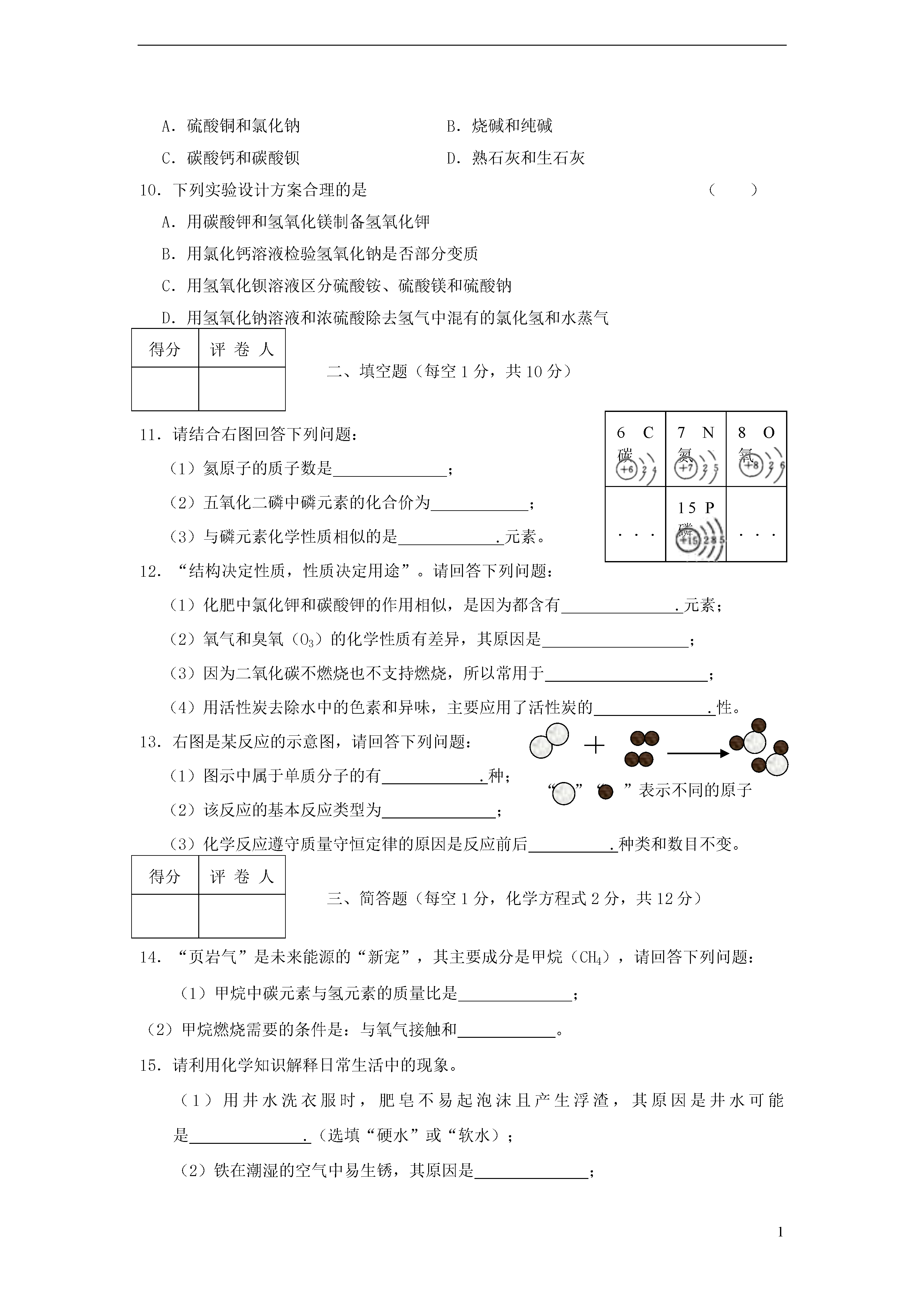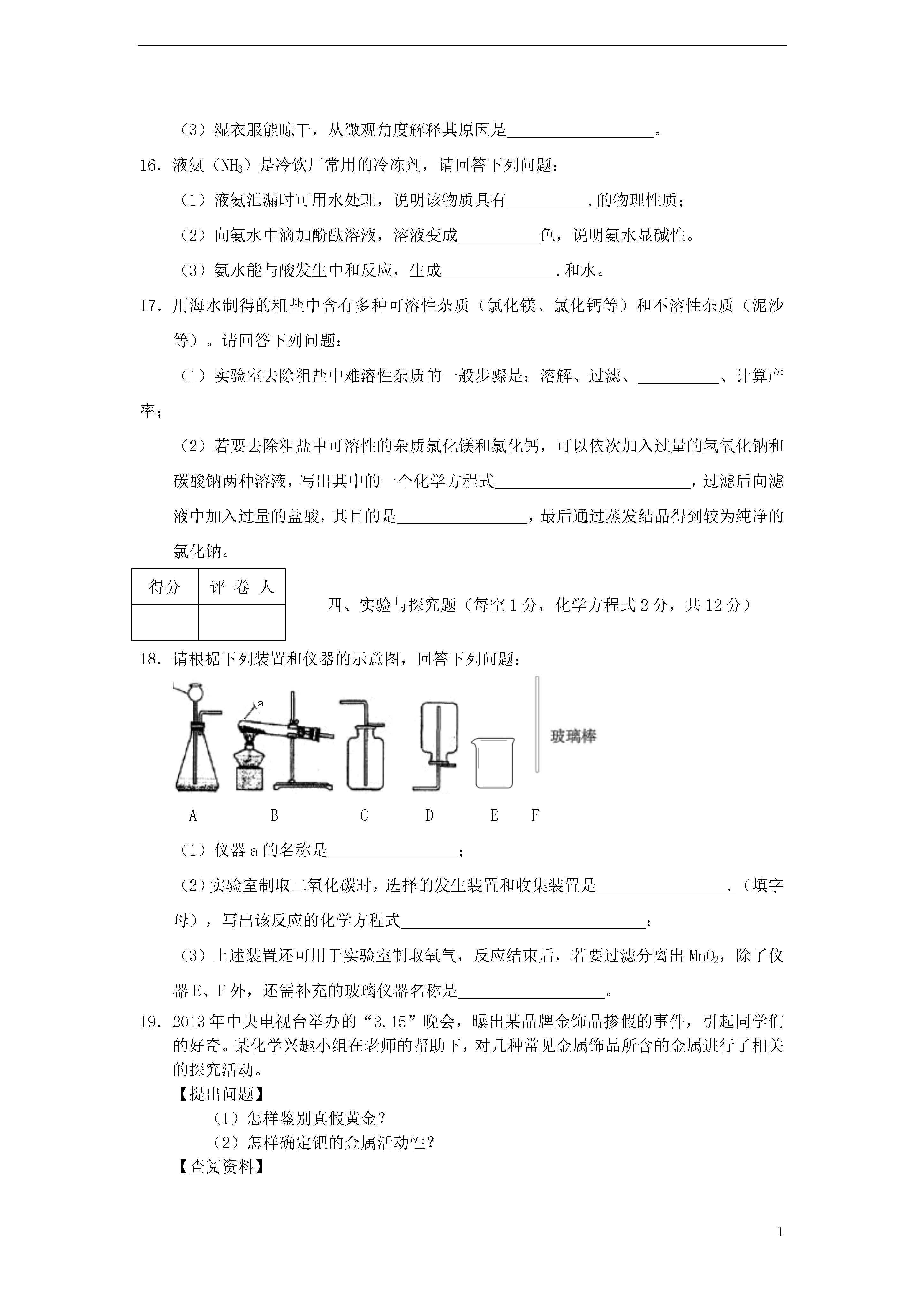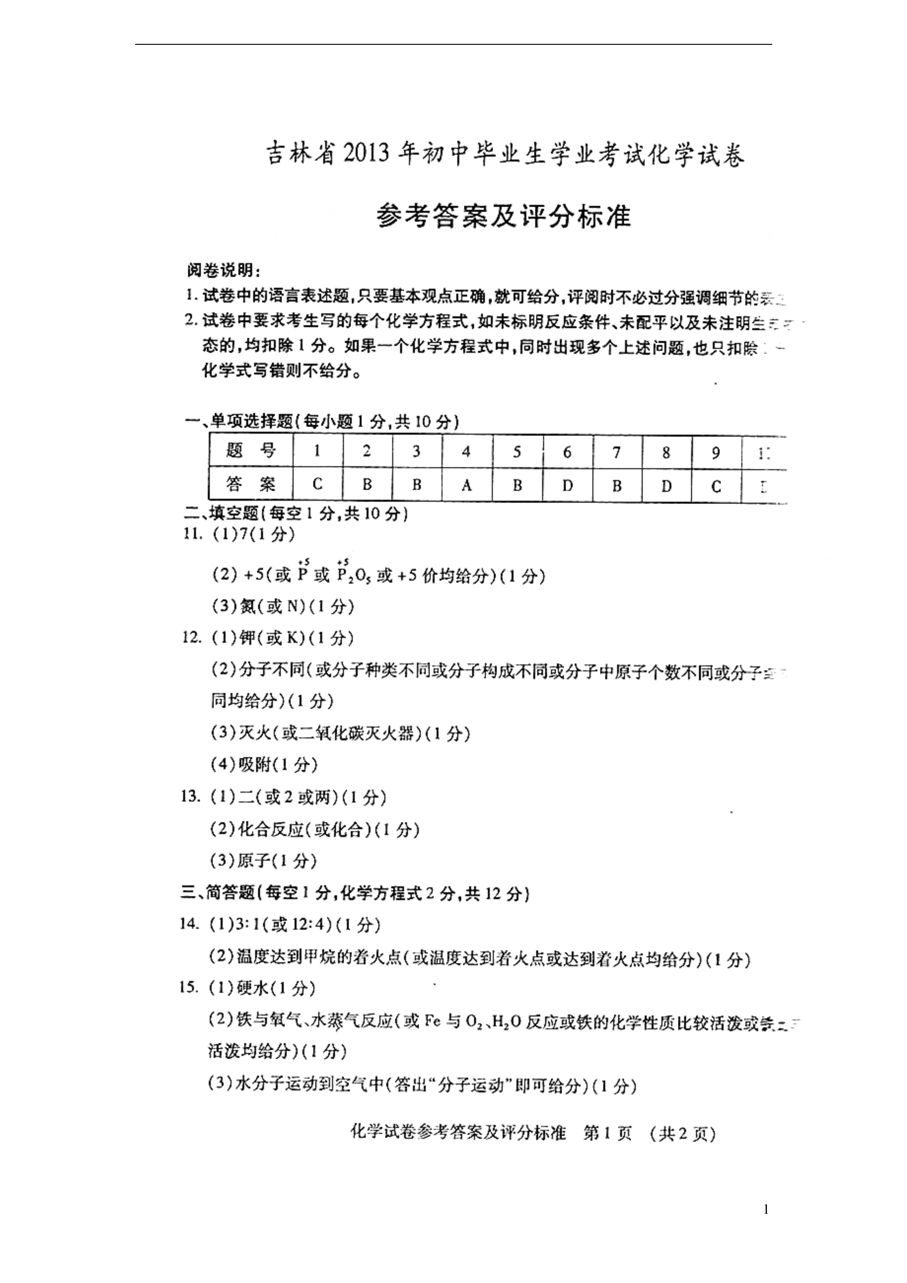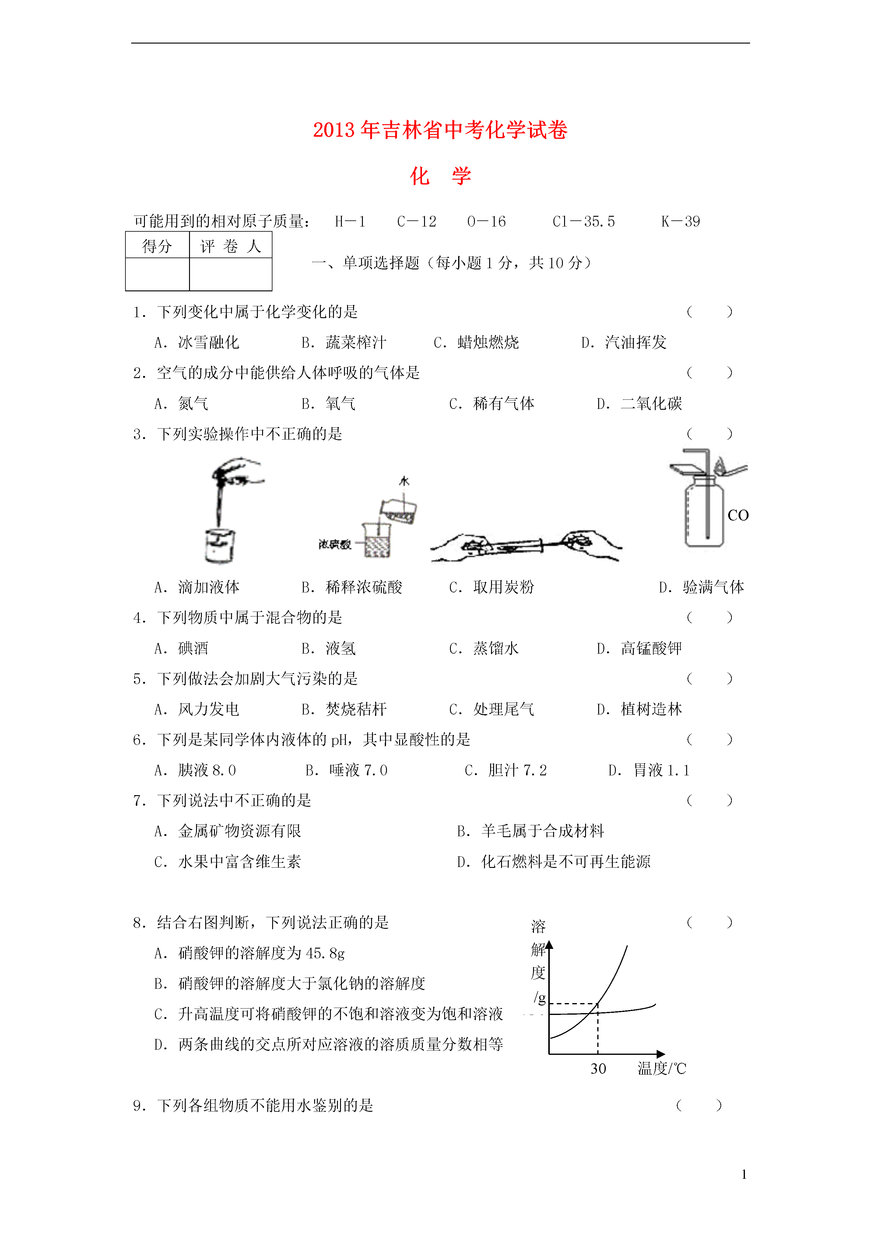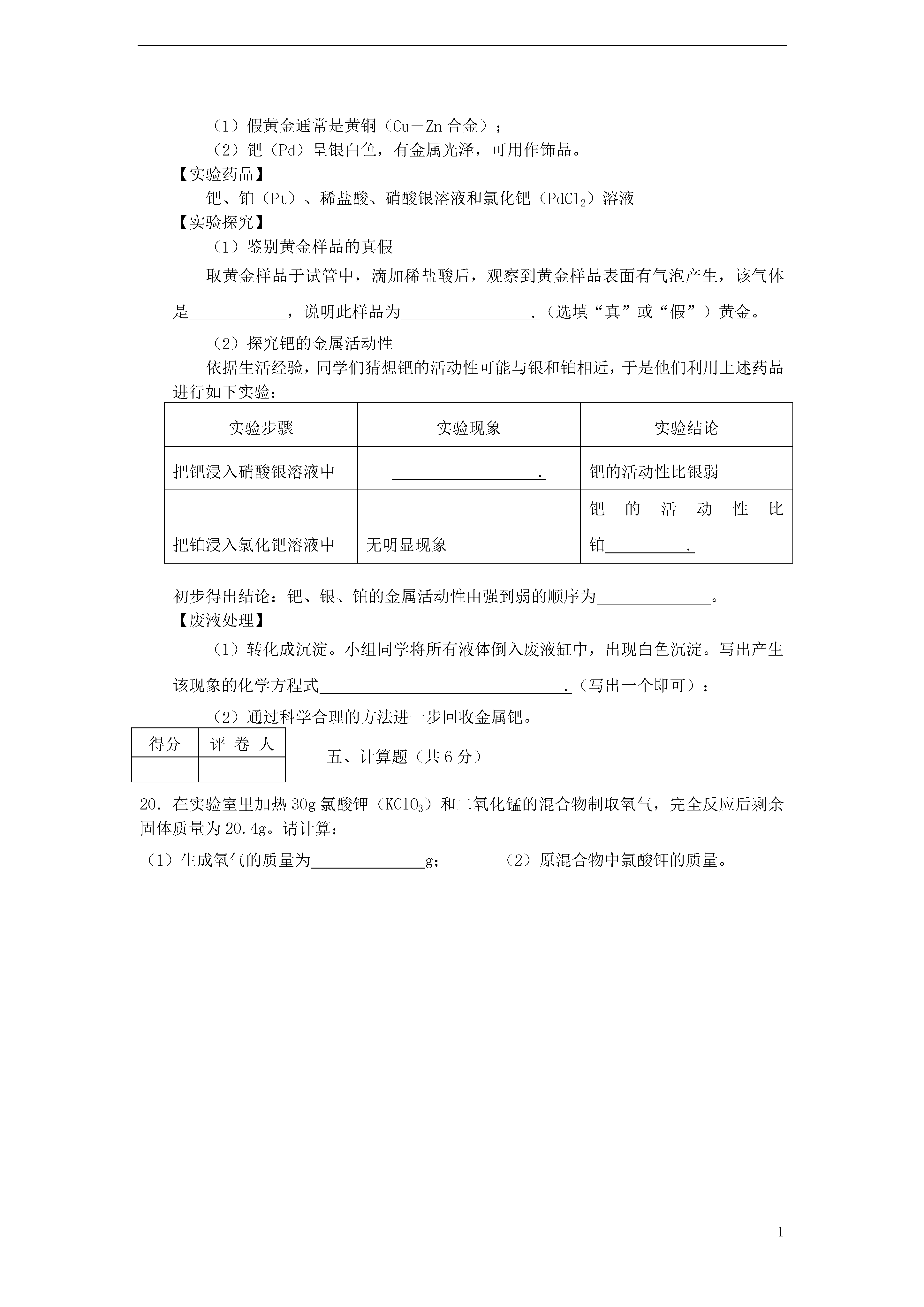 12013年吉林省中考化学试卷化学可能用到的相对原子质量:H-1C-12O-16Cl-35.5K-39得分评卷人一、单项选择题(每小题1分,共10分)1.下列变化中属于化学变化的是()A.冰雪融化B.蔬菜榨汁C.蜡烛燃烧D.汽油挥发2.空气的成分中能供给人体呼吸的气体是()A.氮气B.氧气C.稀有气体D.二氧化碳3.下列实验操作中不正确的是()CO2A.滴加液体B.稀释浓硫酸C.取用炭粉D.验满气体4.下列物质中属于混合物的是()A.碘酒B.液氢C.蒸馏水D.高锰酸钾5.下列做法会加剧大气污染的是()A.风力发电B.焚烧秸杆C.处理尾气D.植树造林6.下列是某同学体内液体的pH,其中显酸性的是()A.胰液8.0B.唾液7.0C.胆汁7.2D.胃液1.17.下列说法中不正确的是()A.金属矿物资源有限B.羊毛属于合成材料C.水果中富含维生素D.化石燃料是不可再生能源30温度/℃溶解度/g45.88.结合右图判断,下列说法正确的是()A.硝酸钾的溶解度为45.8gB.硝酸钾的溶解度大于氯化钠的溶解度C.升高温度可将硝酸钾的不饱和溶液变为饱和溶液D.两条曲线的交点所对应溶液的溶质质量分数相等9.下列各组物质不能用水鉴别的是()A.硫酸铜和氯化钠B.烧碱和纯碱C.碳酸钙和碳酸钡D.熟石灰和生石灰10.下列实验设计方案合理的是()A.用碳酸钾和氢氧化镁制备氢氧化钾B.用氯化钙溶液检验氢氧化钠是否部分变质C.用氢氧化钡溶液区分硫酸铵、硫酸镁和硫酸钠D.用氢氧化钠溶液和浓硫酸除去氢气中混有的氯化氢和水蒸气得分评卷人二、填空题(每空1分,共10分)6C碳7N氮8O氧15P磷........11.请结合右图回答下列问题:(1)氦原子的质子数是;(2)五氧化二磷中磷元素的化合价为;(3)与磷元素化学性质相似的是.元素。12.“结构决定性质,性质决定用途”。请回答下列问题:(1)化肥中氯化钾和碳酸钾的作用相似,是因为都含有.元素;(2)氧气和臭氧(O3)的化学性质有差异,其原因是;(3)因为二氧化碳不燃烧也不支持燃烧,所以常用于;(4)用活性炭去除水中的色素和异味,主要应用了活性炭的.性。“”“”表示不同的原子13.右图是某反应的示意图,请回答下列问题:(1)图示中属于单质分子的有.种;(2)该反应的基本反应类型为;(3)化学反应遵守质量守恒定律的原因是反应前后.种类和数目不变。得分评卷人三、简答题(每空1分,化学方程式2分,共12分)14.“页岩气”是未来能源的“新宠”,其主要成分是甲烷(CH4),请回答下列问题:(1)甲烷中碳元素与氢元素的质量比是;(2)甲烷燃烧需要的条件是:与氧气接触和。15.请利用化学知识解释日常生活中的现象。(1)用井水洗衣服时,肥皂不易起泡沫且产生浮渣,其原因是井水可能是.(选填“硬水”或“软水);(2)铁在潮湿的空气中易生锈,其原因是;(3)湿衣服能晾干,从微观角度解释其原因是。16.液氨(NH3)是冷饮厂常用的冷冻剂,请回答下列问题:(1)液氨泄漏时可用水处理,说明该物质具有.的物理性质;(2)向氨水中滴加酚酞溶液,溶液变成色,说明氨水显碱性。(3)氨水能与酸发生中和反应,生成.和水。17.用海水制得的粗盐中含有多种可溶性杂质(氯化镁、氯化钙等)和不溶性杂质(泥沙等)。请回答下列问题:(1)实验室去除粗盐中难溶性杂质的一般步骤是:溶解、过滤、、计算产率;(2)若要去除粗盐中可溶性的杂质氯化镁和氯化钙,可以依次加入过量的氢氧化钠和碳酸钠两种溶液,写出其中的一个化学方程式,过滤后向滤液中加入过量的盐酸,其目的是,最后通过蒸发结晶得到较为纯净的氯化钠。得分评卷人四、实验与探究题(每空1分,化学方程式2分,共12分)18.请根据下列装置和仪器的示意图,回答下列问题:aABCDEF(1)仪器a的名称是;(2)实验室制取二氧化碳时,选择的发生装置和收集装置是.(填字母),写出该反应的化学方程式;(3)上述装置还可用于实验室制取氧气,反应结束后,若要过滤分离出MnO2,除了仪器E、F外,还需补充的玻璃仪器名称是。19.2013年中央电视台举办的“3.15”晚会,曝出某品牌金饰品掺假的事件,引起同学们的好奇。某化学兴趣小组在老师的帮助下,对几种常见金属饰品所含的金属进行了相关的探究活动。【提出问题】(1)怎样鉴别真假黄金?(2)怎样确定钯的金属活动性?【查阅资料】(1)假黄金通常是黄铜(Cu-Zn合金);(2)钯(Pd)呈银白色,有金属光泽,可用作饰品。【实验药品】钯、铂(Pt)、稀盐酸、硝酸银溶液和氯化钯(PdCl2)溶液