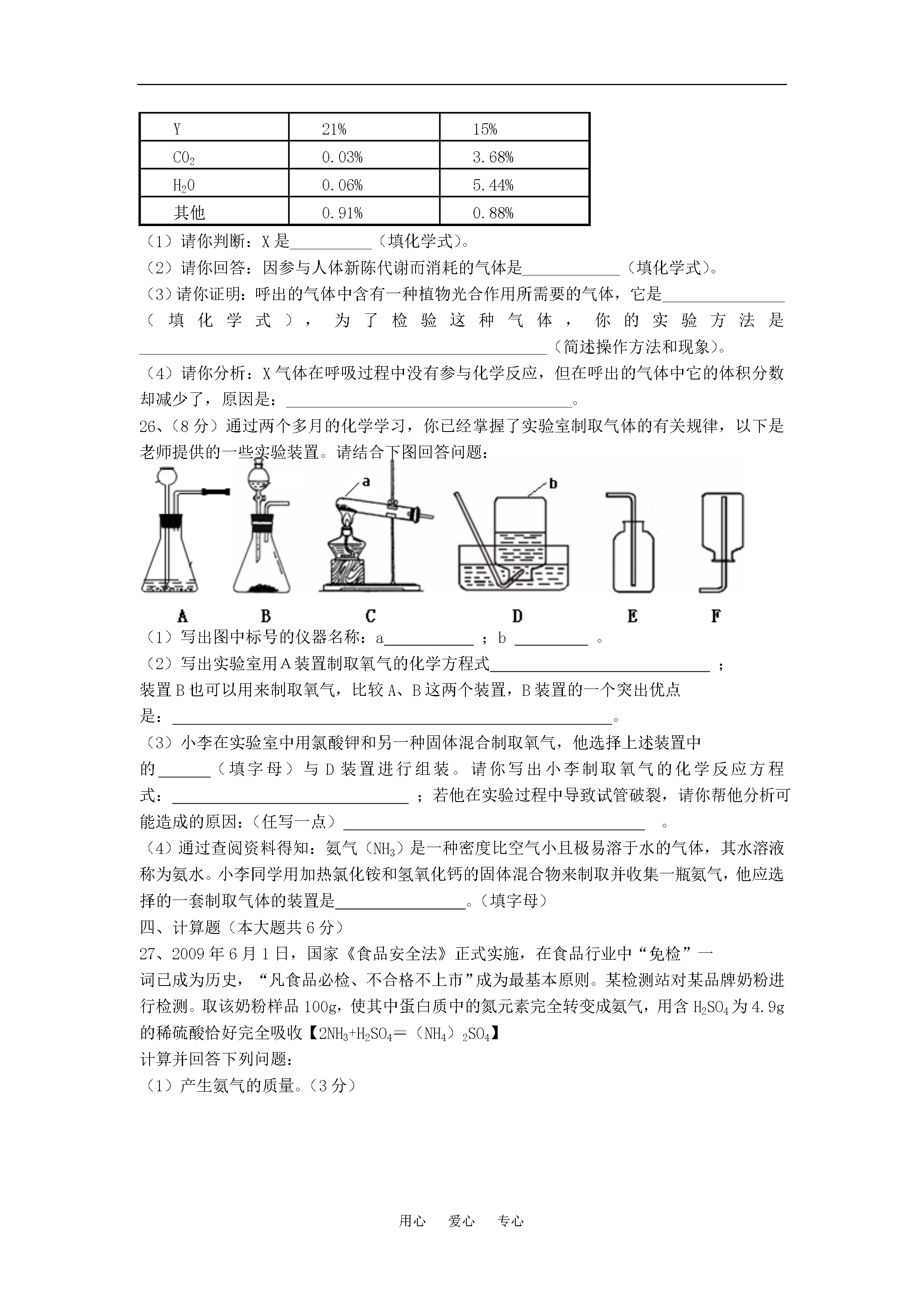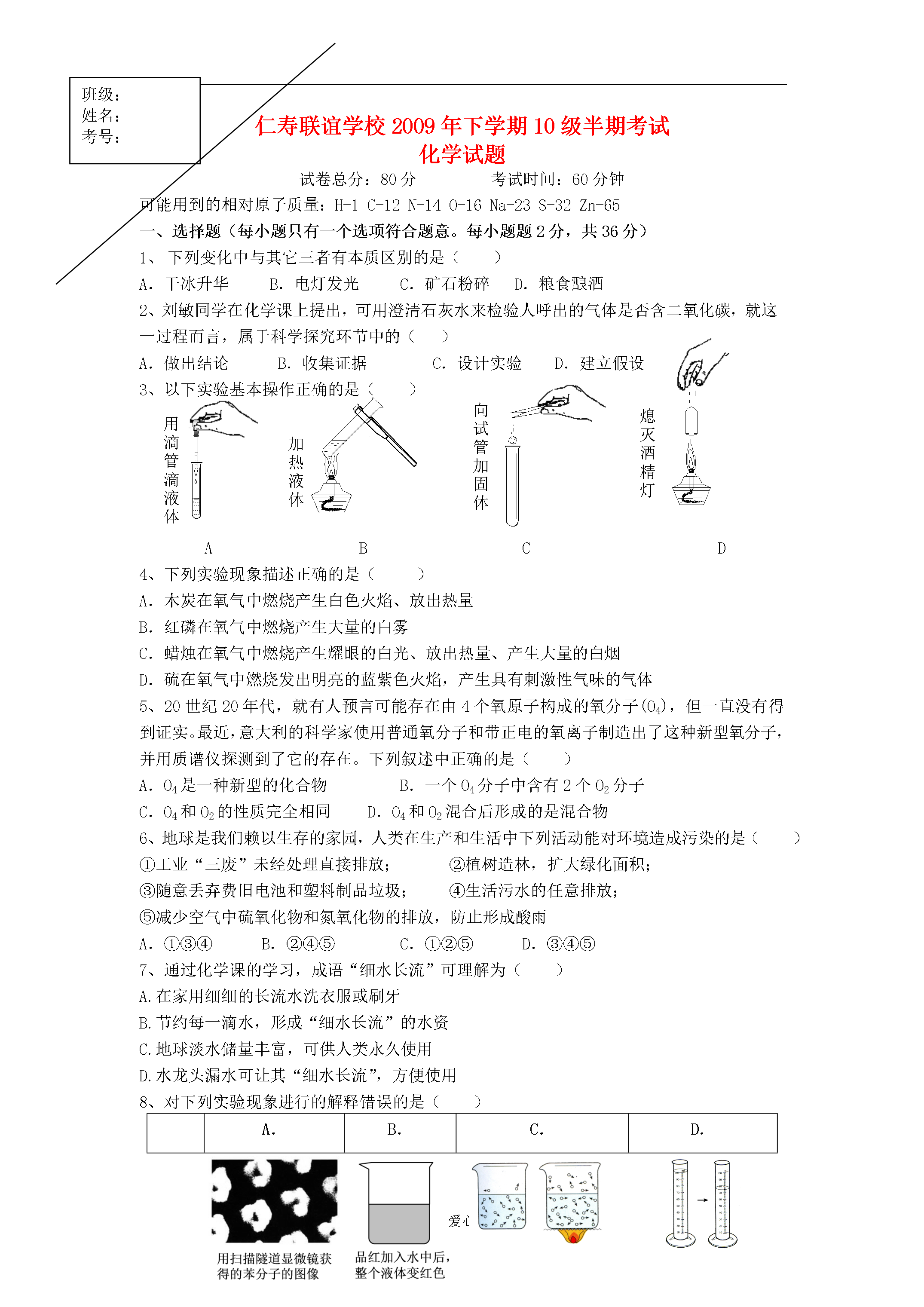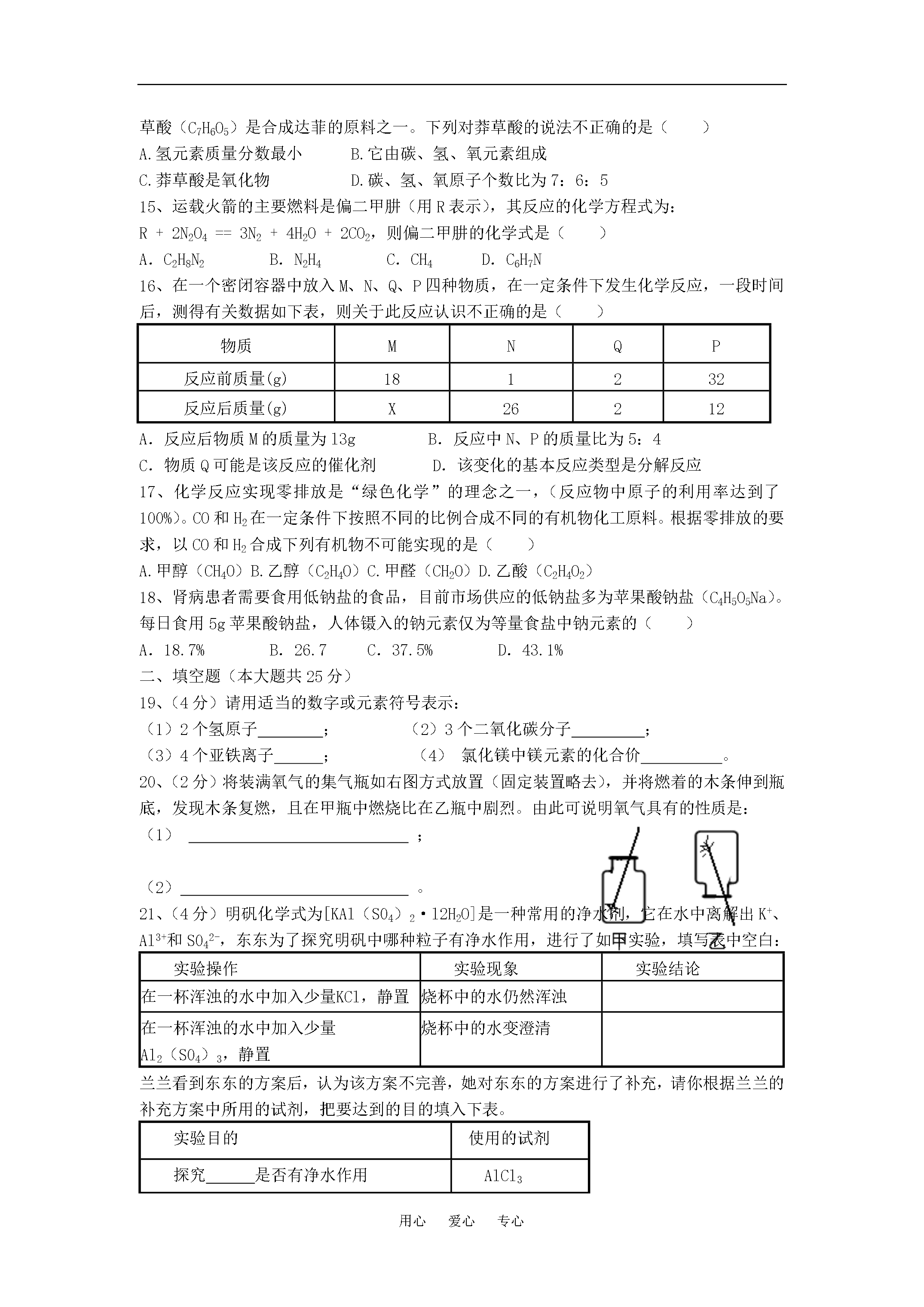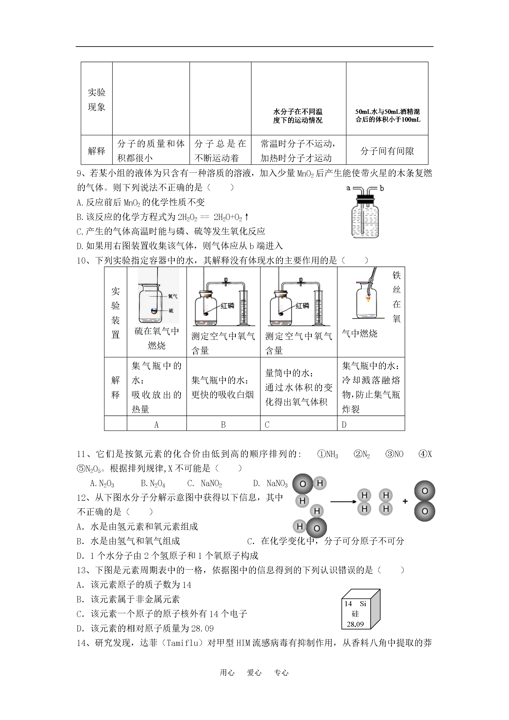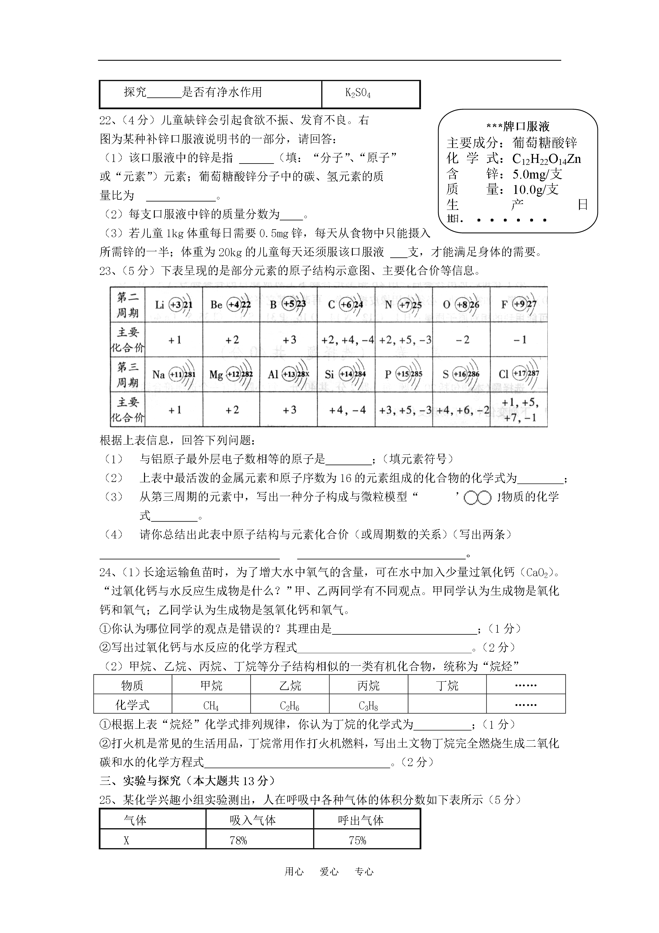 用心爱心专心班级:姓名:考号:仁寿联谊学校2009年下学期10级半期考试化学试题试卷总分:80分考试时间:60分钟可能用到的相对原子质量:H-1C-12N-14O-16Na-23S-32Zn-65一、选择题(每小题只有一个选项符合题意。每小题题2分,共36分)下列变化中与其它三者有本质区别的是()A.干冰升华B.电灯发光C.矿石粉碎D.粮食酿酒熄灭酒精灯2、刘敏同学在化学课上提出,可用澄清石灰水来检验人呼出的气体是否含二氧化碳,就这一过程而言,属于科学探究环节中的()A.做出结论B.收集证据C.设计实验D.建立假设3、以下实验基本操作正确的是()向试管加固体加热液体用滴管滴液体ABCD4、下列实验现象描述正确的是()A.木炭在氧气中燃烧产生白色火焰、放出热量B.红磷在氧气中燃烧产生大量的白雾C.蜡烛在氧气中燃烧产生耀眼的白光、放出热量、产生大量的白烟D.硫在氧气中燃烧发出明亮的蓝紫色火焰,产生具有刺激性气味的气体5、20世纪20年代,就有人预言可能存在由4个氧原子构成的氧分子(O4),但一直没有得到证实。最近,意大利的科学家使用普通氧分子和带正电的氧离子制造出了这种新型氧分子,并用质谱仪探测到了它的存在。下列叙述中正确的是()A.O4是一种新型的化合物B.一个O4分子中含有2个O2分子C.O4和O2的性质完全相同D.O4和O2混合后形成的是混合物学网6、地球是我们赖以生存的家园,人类在生产和生活中下列活动能对环境造成污染的是()①工业“三废”未经处理直接排放;②植树造林,扩大绿化面积;③随意丢弃费旧电池和塑料制品垃圾;④生活污水的任意排放;⑤减少空气中硫氧化物和氮氧化物的排放,防止形成酸雨A.①③④B.②④⑤C.①②⑤D.③④⑤7、通过化学课的学习,成语“细水长流”可理解为()A.在家用细细的长流水洗衣服或刷牙B.节约每一滴水,形成“细水长流”的水资C.地球淡水储量丰富,可供人类永久使用D.水龙头漏水可让其“细水长流”,方便使用8、对下列实验现象进行的解释错误的是()A.B.C.D.实验现象解释分子的质量和体积都很小分子总是在不断运动着常温时分子不运动,加热时分子才运动分子间有间隙9、若某小组的液体为只含有一种溶质的溶液,加入少量MnO2后产生能使带火星的木条复燃的气体。则下列说法不正确的是()A.反应前后MnO2的化学性质不变B.该反应的化学方程式为2H2O2==2H2O+O2↑C.产生的气体高温时能与磷、硫等发生氧化反应D.如果用右图装置收集该气体,则气体应从b端进入10、下列实验指定容器中的水,其解释没有体现水的主要作用的是()实验装置硫在氧气中燃烧测定空气中氧气含量测定空气中氧气含量铁丝在氧气中燃烧解释集气瓶中的水:吸收放出的热量集气瓶中的水:更快的吸收白烟量筒中的水:通过水体积的变化得出氧气体积集气瓶中的水:冷却溅落融熔物,防止集气瓶炸裂ABCD11、它们是按氮元素的化合价由低到高的顺序排列的:①NH3②N2③NO④X⑤N2O5。根据排列规律,X不可能是()A.N2O3B.N2O4C.NaNO2D.NaNO312、从下图水分子分解示意图中获得以下信息,其中不正确的是()A.水是由氢元素和氧元素组成B.水是由氢气和氧气组成C.在化学变化中,分子可分原子不可分D.1个水分子由2个氢原子和1个氧原子构成13、下图是元素周期表中的一格,依据图中的信息得到的下列认识错误的是()14Si硅28.09A.该元素原子的质子数为14B.该元素属于非金属元素C.该元素一个原子的原子核外有14个电子D.该元素的相对原子质量为28.0914、研究发现,达菲(Tamiflu)对甲型HIM流感病毒有抑制作用,从香料八角中提取的莽草酸(C7H6O5)是合成达菲的原料之一。下列对莽草酸的说法不正确的是()A.氢元素质量分数最小B.它由碳、氢、氧元素组成C.莽草酸是氧化物D.碳、氢、氧原子个数比为7:6:515、运载火箭的主要燃料是偏二甲肼(用R表示),其反应的化学方程式为:R+2N2O4==3N2+4H2O+2CO2,则偏二甲肼的化学式是()A.C2H8N2B.N2H4C.CH4D.C6H7N16、在一个密闭容器中放入M、N、Q、P四种物质,在一定条件下发生化学反应,一段时间后,测得有关数据如下表,则关于此反应认识不正确的是()物质MNQP反应前质量(g)181232反应后质量(g)X26212A.反应后物质M的质量为l3gB.反应中N、P的质量比为5:4C.物质Q可能是该反应的催化剂D.该变化的基本反应类型是分解反应17、化学反应实现零排放是“绿色化学”的理念之一,(反应物中原子的利用率达到了100%)。CO和H2在一定条件下按照不同的比例合成不同的有机物化工原料。根据零排放的要求,以CO和H2合成下列有机物不可能实现的是()A.甲醇(CH4O)