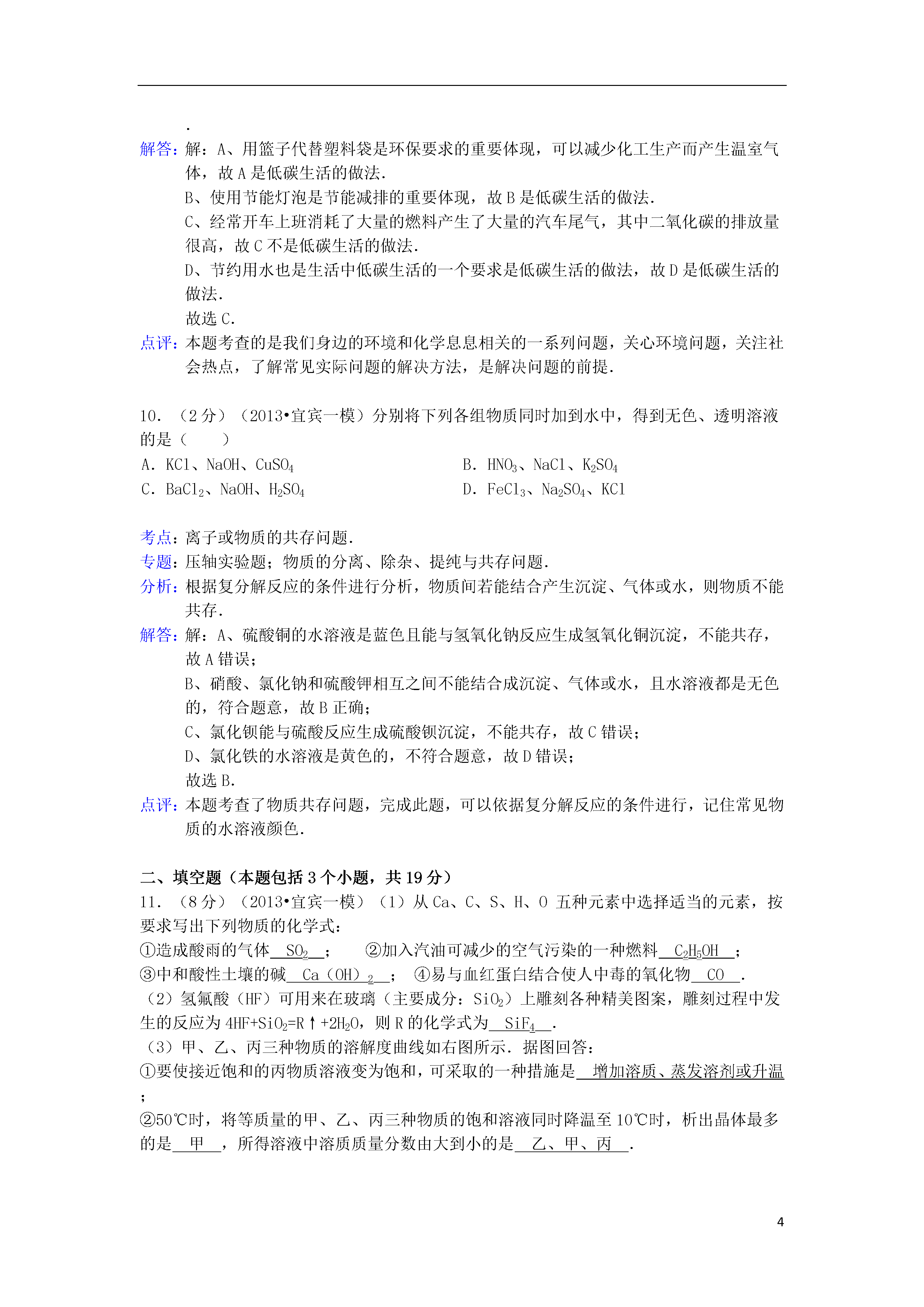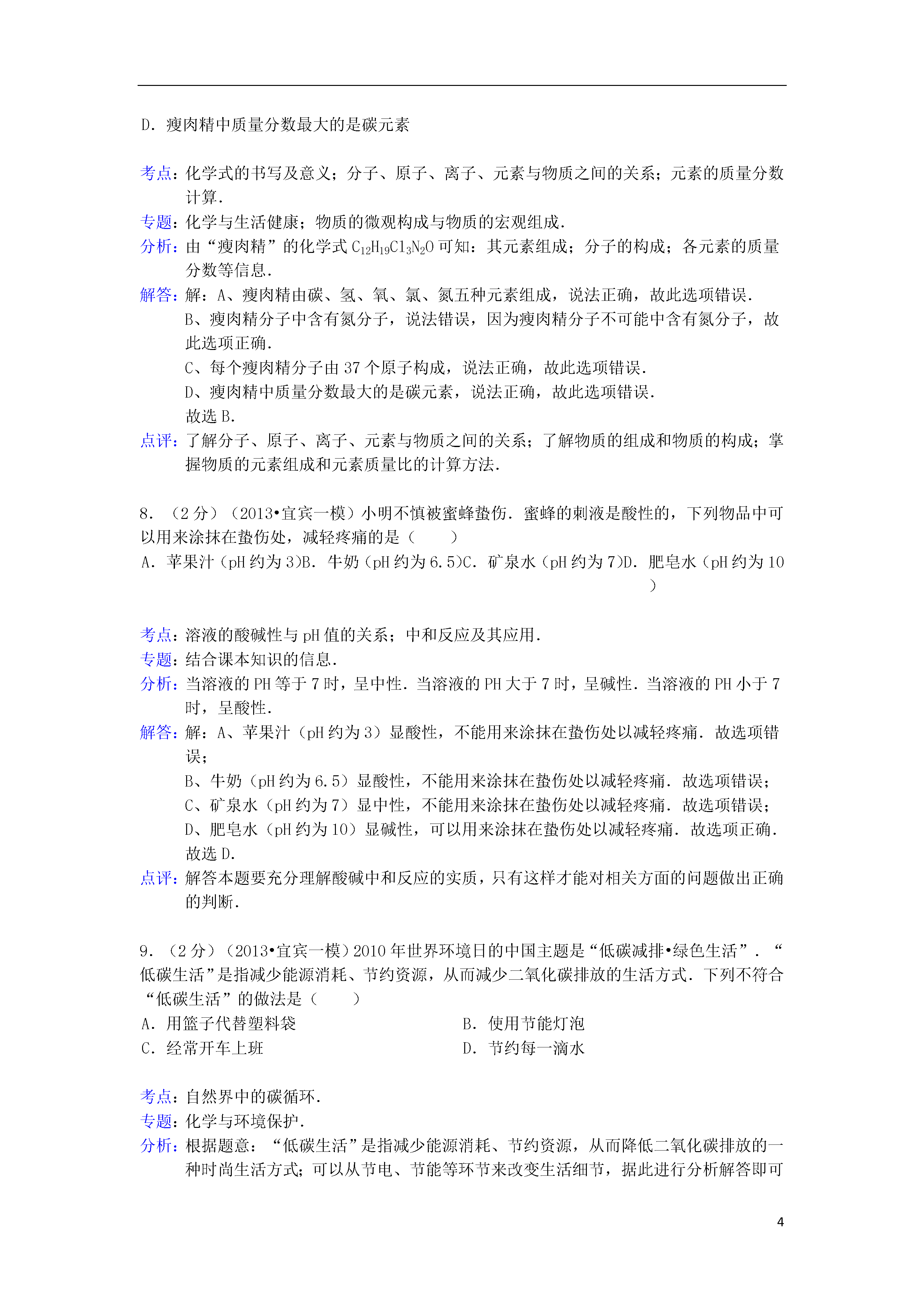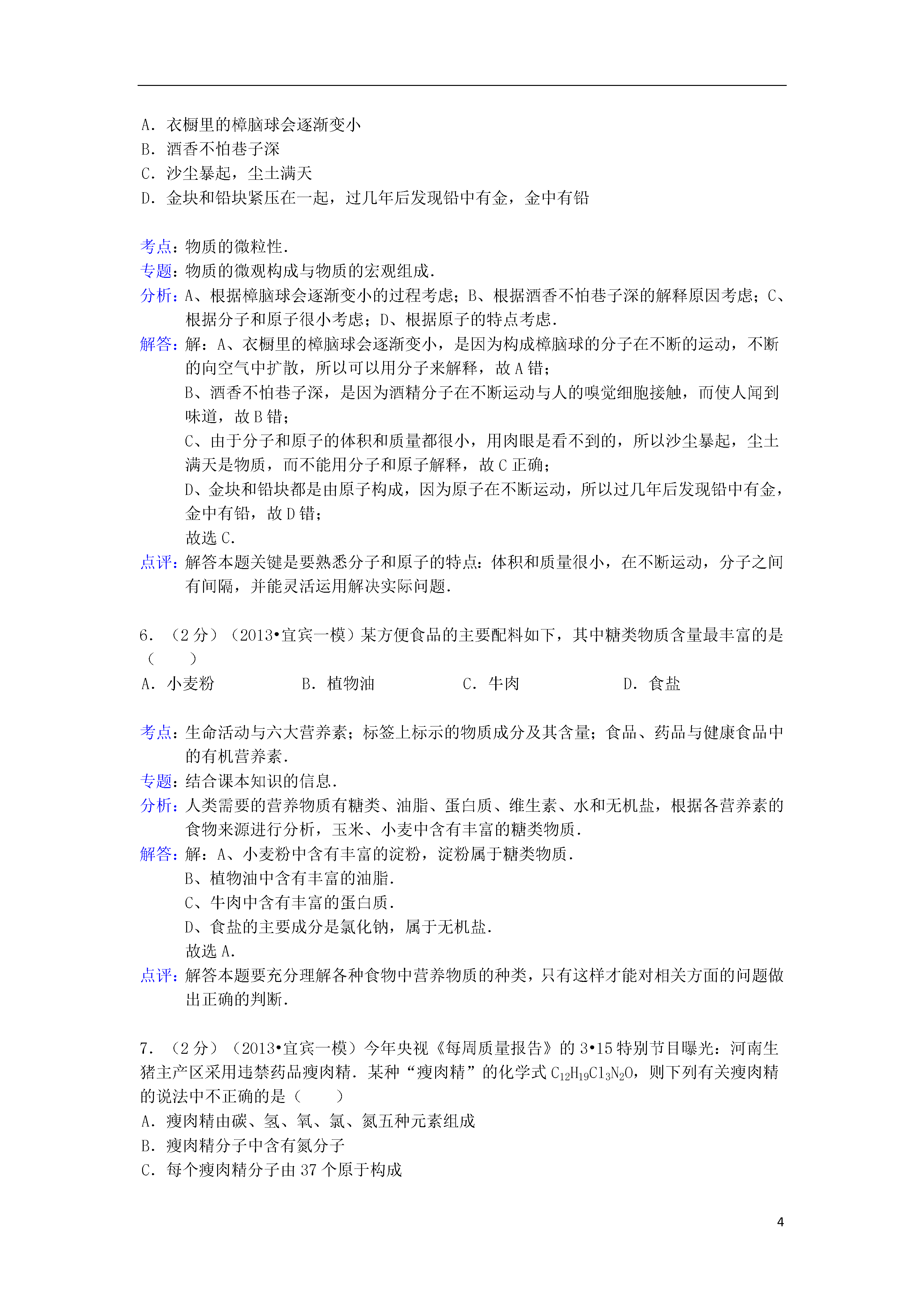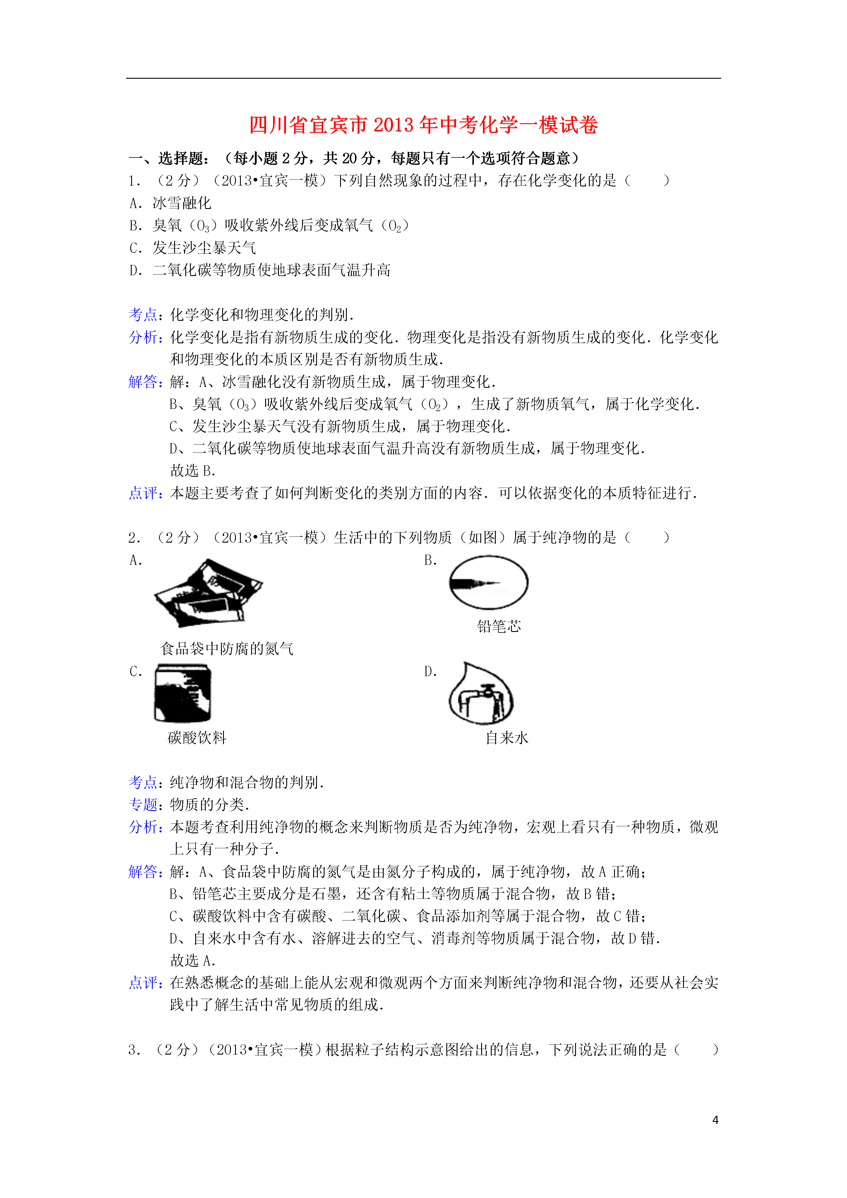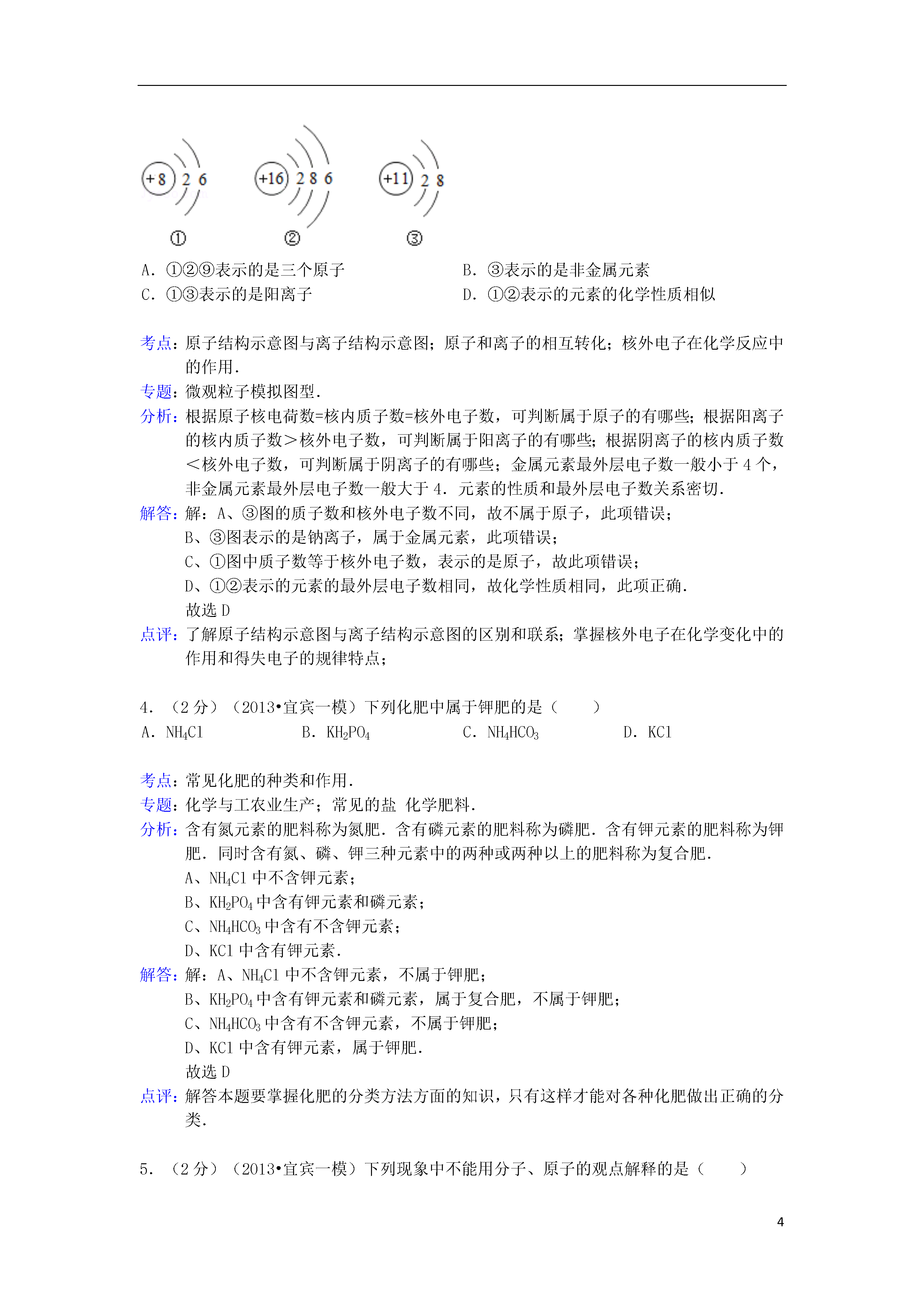 4四川省宜宾市2013年中考化学一模试卷一、选择题:(每小题2分,共20分,每题只有一个选项符合题意)1.(2分)(2013•宜宾一模)下列自然现象的过程中,存在化学变化的是()A.冰雪融化B.臭氧(O3)吸收紫外线后变成氧气(O2)C.发生沙尘暴天气D.二氧化碳等物质使地球表面气温升高考点:化学变化和物理变化的判别.分析:化学变化是指有新物质生成的变化.物理变化是指没有新物质生成的变化.化学变化和物理变化的本质区别是否有新物质生成.解答:解:A、冰雪融化没有新物质生成,属于物理变化.B、臭氧(O3)吸收紫外线后变成氧气(O2),生成了新物质氧气,属于化学变化.C、发生沙尘暴天气没有新物质生成,属于物理变化.D、二氧化碳等物质使地球表面气温升高没有新物质生成,属于物理变化.故选B.点评:本题主要考查了如何判断变化的类别方面的内容.可以依据变化的本质特征进行.2.(2分)(2013•宜宾一模)生活中的下列物质(如图)属于纯净物的是()A.食品袋中防腐的氮气B.铅笔芯C.碳酸饮料D.自来水考点:纯净物和混合物的判别.专题:物质的分类.分析:本题考查利用纯净物的概念来判断物质是否为纯净物,宏观上看只有一种物质,微观上只有一种分子.解答:解:A、食品袋中防腐的氮气是由氮分子构成的,属于纯净物,故A正确;B、铅笔芯主要成分是石墨,还含有粘土等物质属于混合物,故B错;C、碳酸饮料中含有碳酸、二氧化碳、食品添加剂等属于混合物,故C错;D、自来水中含有水、溶解进去的空气、消毒剂等物质属于混合物,故D错.故选A.点评:在熟悉概念的基础上能从宏观和微观两个方面来判断纯净物和混合物,还要从社会实践中了解生活中常见物质的组成.3.(2分)(2013•宜宾一模)根据粒子结构示意图给出的信息,下列说法正确的是()A.①②⑨表示的是三个原子B.③表示的是非金属元素C.①③表示的是阳离子D.①②表示的元素的化学性质相似考点:原子结构示意图与离子结构示意图;原子和离子的相互转化;核外电子在化学反应中的作用.专题:微观粒子模拟图型.分析:根据原子核电荷数=核内质子数=核外电子数,可判断属于原子的有哪些;根据阳离子的核内质子数>核外电子数,可判断属于阳离子的有哪些;根据阴离子的核内质子数<核外电子数,可判断属于阴离子的有哪些;金属元素最外层电子数一般小于4个,非金属元素最外层电子数一般大于4.元素的性质和最外层电子数关系密切.解答:解:A、③图的质子数和核外电子数不同,故不属于原子,此项错误;B、③图表示的是钠离子,属于金属元素,此项错误;C、①图中质子数等于核外电子数,表示的是原子,故此项错误;D、①②表示的元素的最外层电子数相同,故化学性质相同,此项正确.故选D点评:了解原子结构示意图与离子结构示意图的区别和联系;掌握核外电子在化学变化中的作用和得失电子的规律特点;4.(2分)(2013•宜宾一模)下列化肥中属于钾肥的是()A.NH4ClB.KH2PO4C.NH4HCO3D.KCl考点:常见化肥的种类和作用.专题:化学与工农业生产;常见的盐化学肥料.分析:含有氮元素的肥料称为氮肥.含有磷元素的肥料称为磷肥.含有钾元素的肥料称为钾肥.同时含有氮、磷、钾三种元素中的两种或两种以上的肥料称为复合肥.A、NH4Cl中不含钾元素;B、KH2PO4中含有钾元素和磷元素;C、NH4HCO3中含有不含钾元素;D、KCl中含有钾元素.解答:解:A、NH4Cl中不含钾元素,不属于钾肥;B、KH2PO4中含有钾元素和磷元素,属于复合肥,不属于钾肥;C、NH4HCO3中含有不含钾元素,不属于钾肥;D、KCl中含有钾元素,属于钾肥.故选D点评:解答本题要掌握化肥的分类方法方面的知识,只有这样才能对各种化肥做出正确的分类.5.(2分)(2013•宜宾一模)下列现象中不能用分子、原子的观点解释的是()A.衣橱里的樟脑球会逐渐变小B.酒香不怕巷子深C.沙尘暴起,尘土满天D.金块和铅块紧压在一起,过几年后发现铅中有金,金中有铅考点:物质的微粒性.专题:物质的微观构成与物质的宏观组成.分析:A、根据樟脑球会逐渐变小的过程考虑;B、根据酒香不怕巷子深的解释原因考虑;C、根据分子和原子很小考虑;D、根据原子的特点考虑.解答:解:A、衣橱里的樟脑球会逐渐变小,是因为构成樟脑球的分子在不断的运动,不断的向空气中扩散,所以可以用分子来解释,故A错;B、酒香不怕巷子深,是因为酒精分子在不断运动与人的嗅觉细胞接触,而使人闻到味道,故B错;C、由于分子和原子的体积和质量都很小,用肉眼是看不到的,所以沙尘暴起,尘土满天是物质,而不能用分子和原子解释,故C正确;D、金块和铅块都是由原子构成,因为原子在不断运动,所