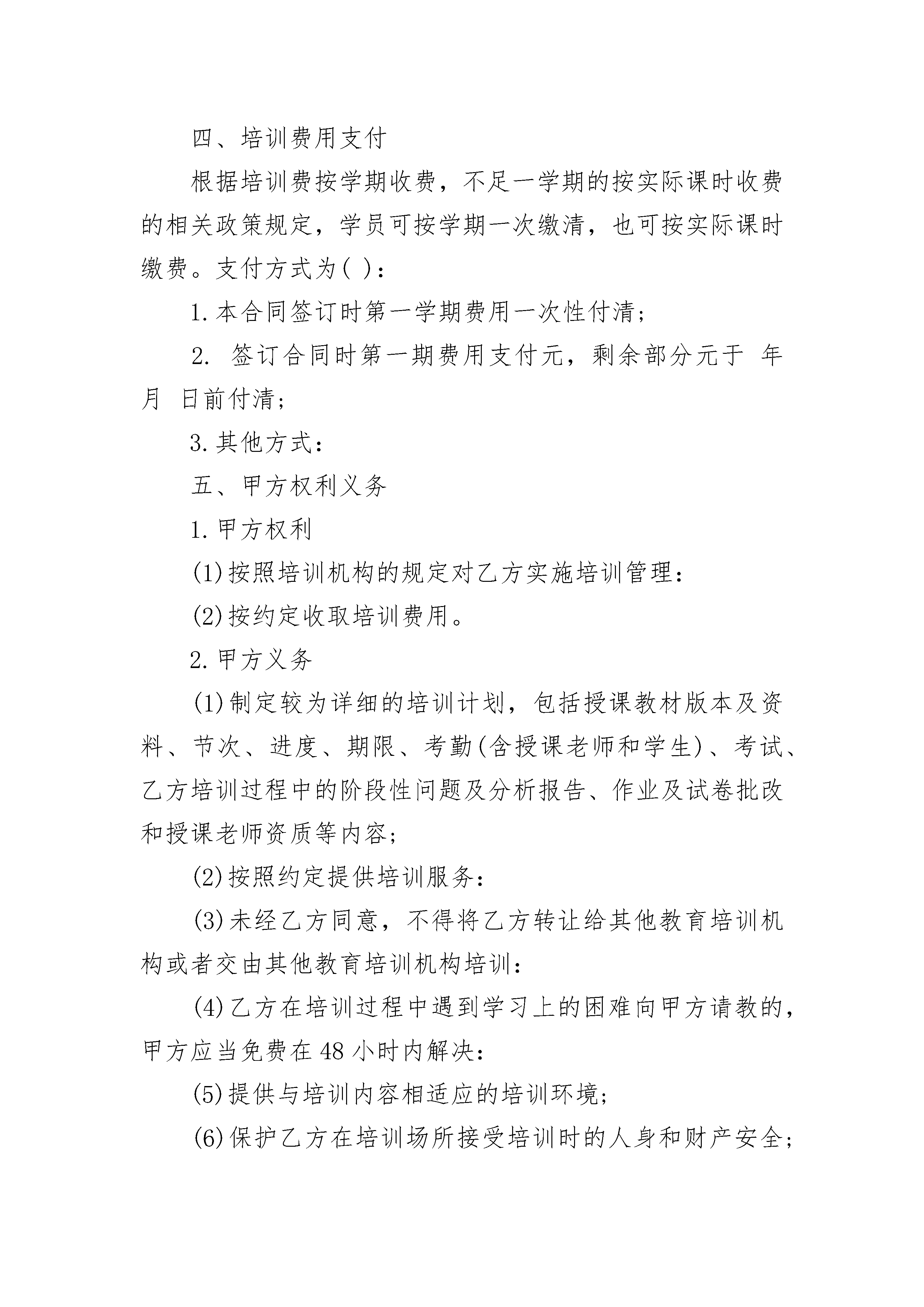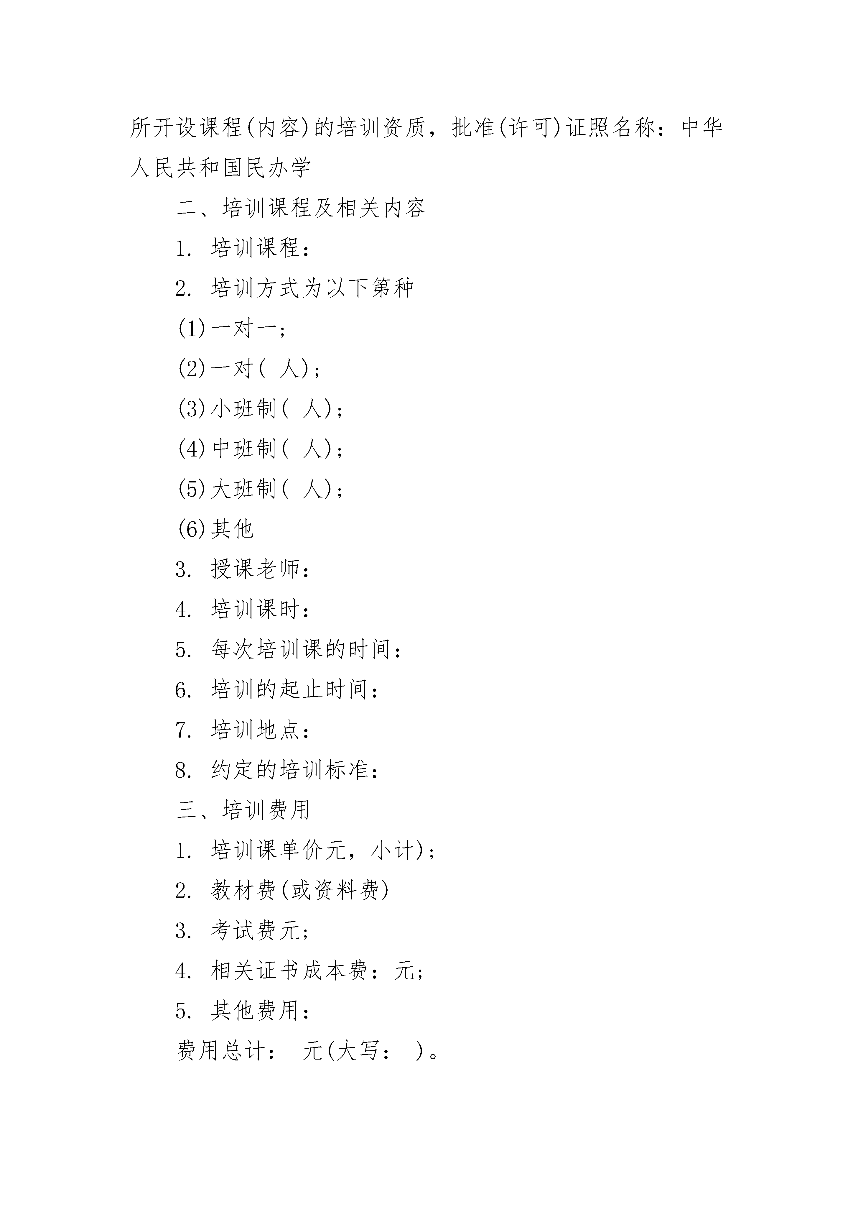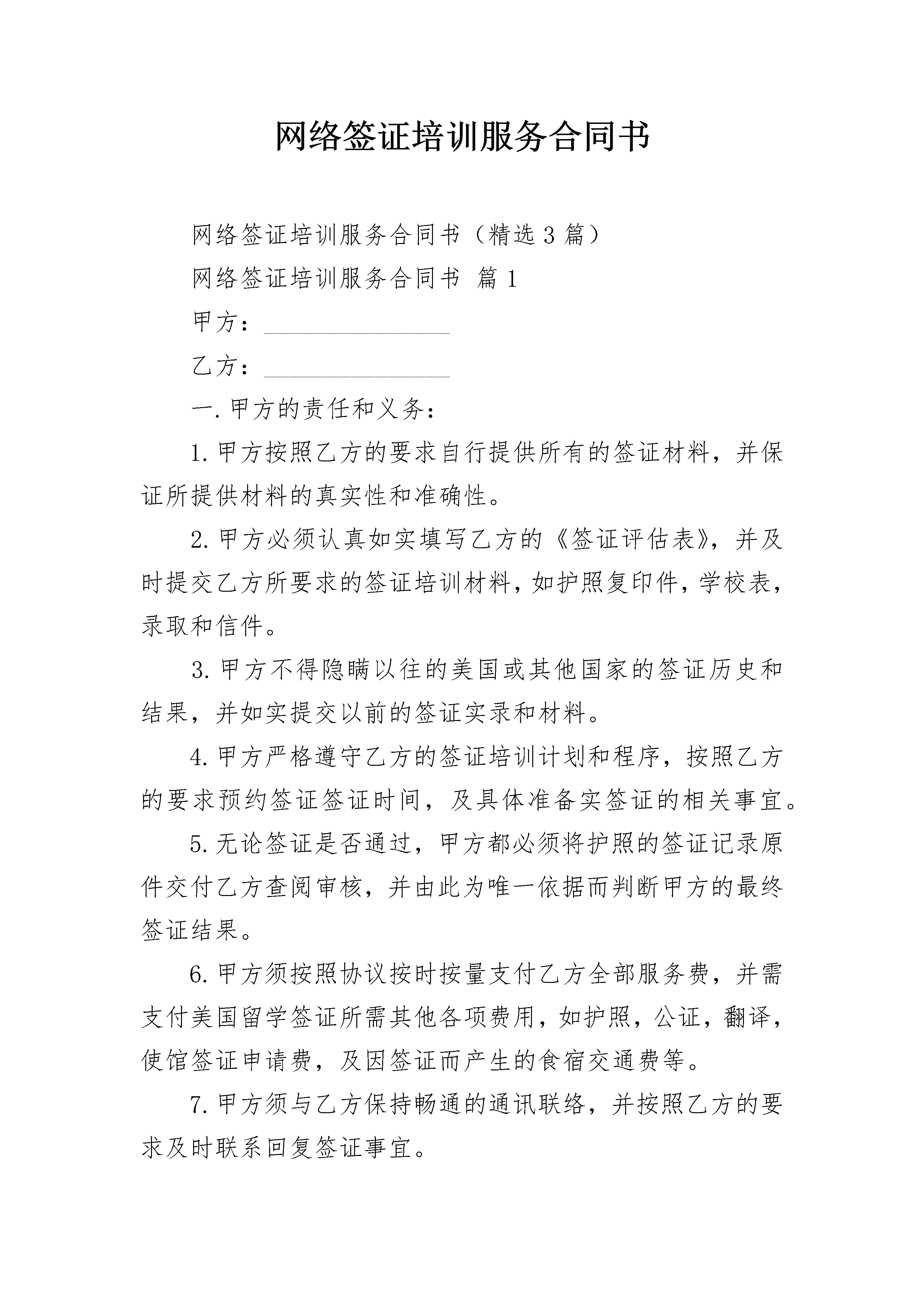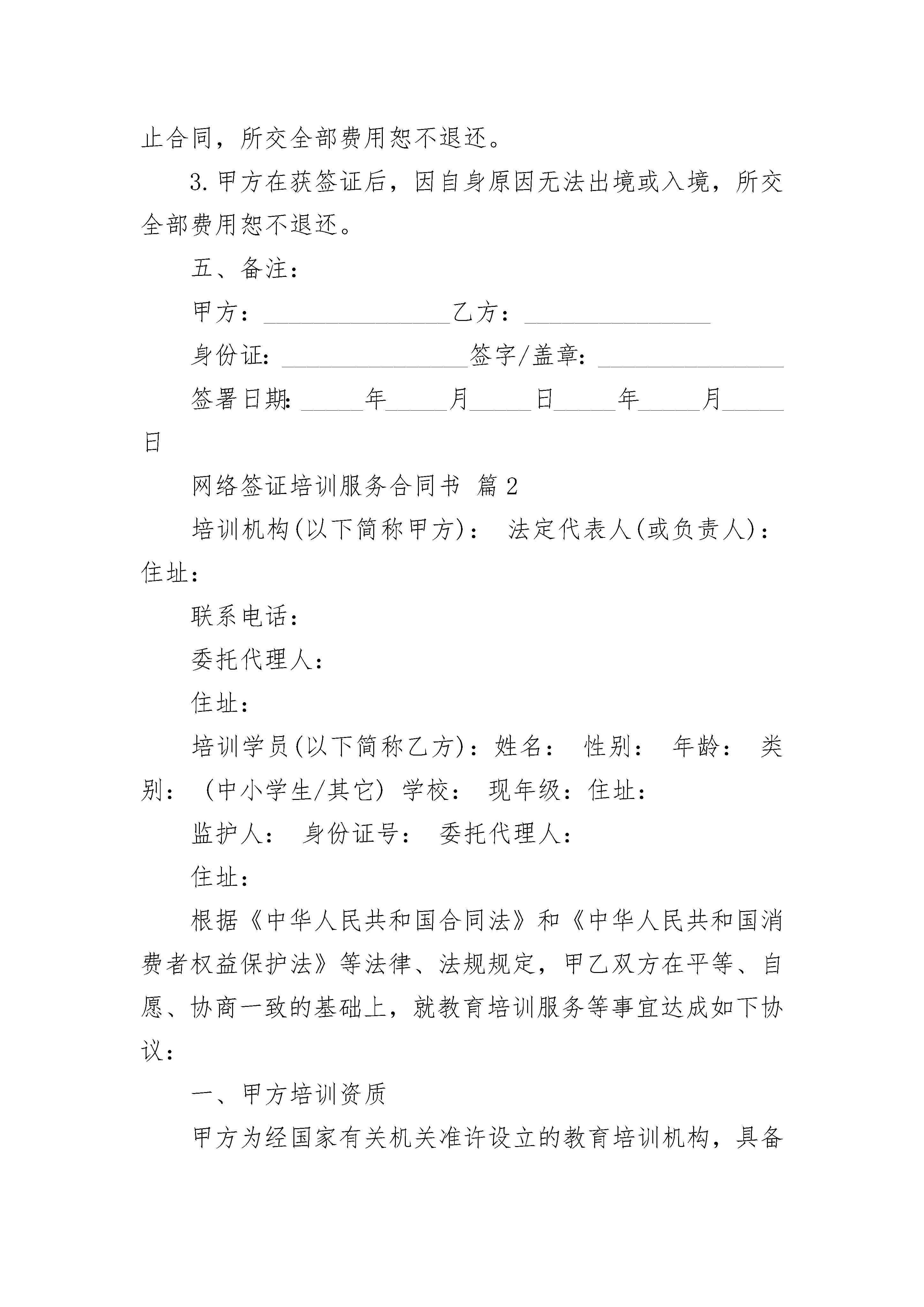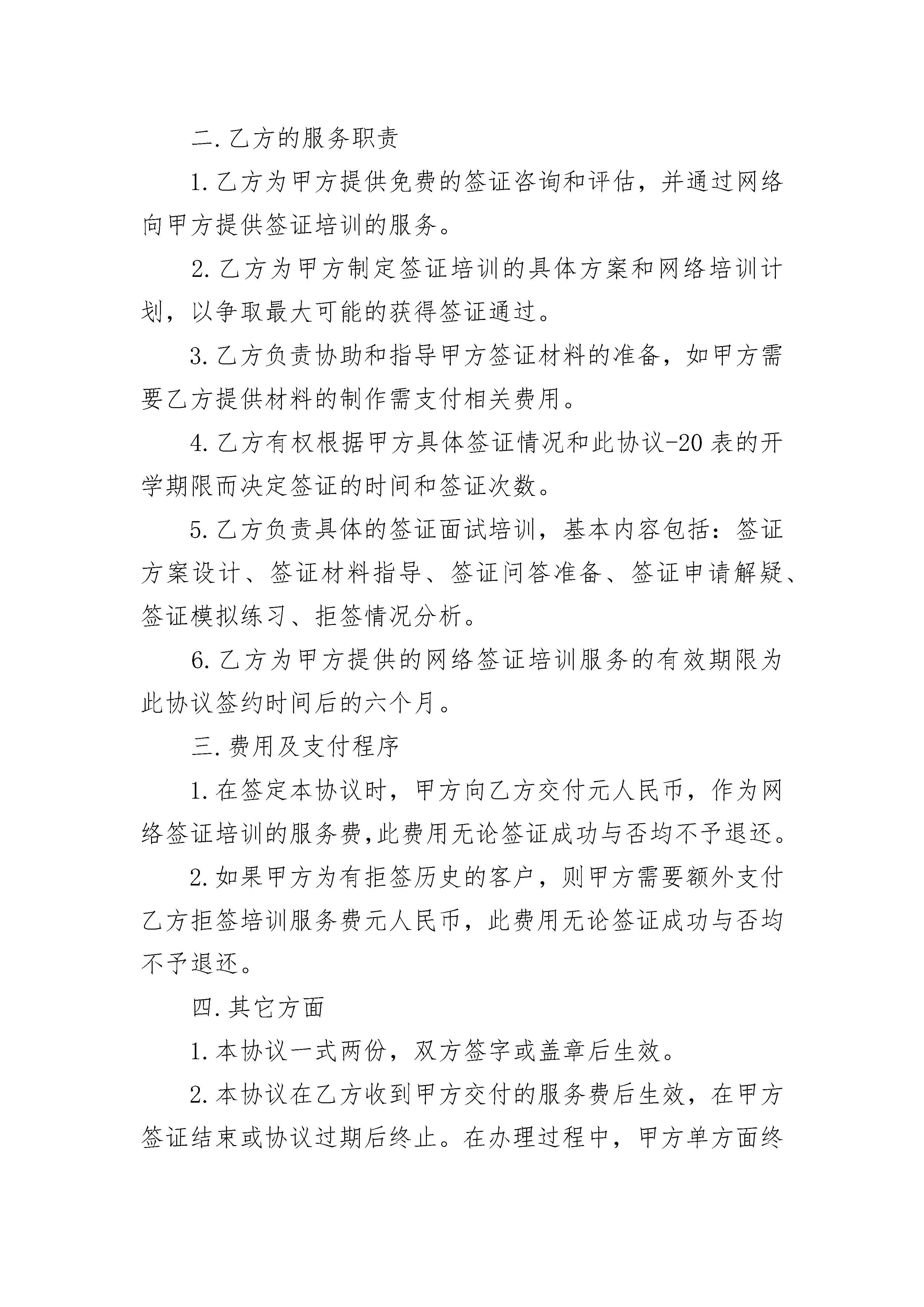 网络签证培训服务合同书网络签证培训服务合同书(精选3篇)网络签证培训服务合同书篇1甲方:_______________乙方:_______________一.甲方的责任和义务:1.甲方按照乙方的要求自行提供所有的签证材料,并保证所提供材料的真实性和准确性。2.甲方必须认真如实填写乙方的《签证评估表》,并及时提交乙方所要求的签证培训材料,如护照复印件,学校表,录取和信件。3.甲方不得隐瞒以往的美国或其他国家的签证历史和结果,并如实提交以前的签证实录和材料。4.甲方严格遵守乙方的签证培训计划和程序,按照乙方的要求预约签证签证时间,及具体准备实签证的相关事宜。5.无论签证是否通过,甲方都必须将护照的签证记录原件交付乙方查阅审核,并由此为唯一依据而判断甲方的最终签证结果。6.甲方须按照协议按时按量支付乙方全部服务费,并需支付美国留学签证所需其他各项费用,如护照,公证,翻译,使馆签证申请费,及因签证而产生的食宿交通费等。7.甲方须与乙方保持畅通的通讯联络,并按照乙方的要求及时联系回复签证事宜。二.乙方的服务职责1.乙方为甲方提供免费的签证咨询和评估,并通过网络向甲方提供签证培训的服务。2.乙方为甲方制定签证培训的具体方案和网络培训计划,以争取最大可能的获得签证通过。3.乙方负责协助和指导甲方签证材料的准备,如甲方需要乙方提供材料的制作需支付相关费用。4.乙方有权根据甲方具体签证情况和此协议-20表的开学期限而决定签证的时间和签证次数。5.乙方负责具体的签证面试培训,基本内容包括:签证方案设计、签证材料指导、签证问答准备、签证申请解疑、签证模拟练习、拒签情况分析。6.乙方为甲方提供的网络签证培训服务的有效期限为此协议签约时间后的六个月。三.费用及支付程序1.在签定本协议时,甲方向乙方交付元人民币,作为网络签证培训的服务费,此费用无论签证成功与否均不予退还。2.如果甲方为有拒签历史的客户,则甲方需要额外支付乙方拒签培训服务费元人民币,此费用无论签证成功与否均不予退还。四.其它方面1.本协议一式两份,双方签字或盖章后生效。2.本协议在乙方收到甲方交付的服务费后生效,在甲方签证结束或协议过期后终止。在办理过程中,甲方单方面终止合同,所交全部费用恕不退还。3.甲方在获签证后,因自身原因无法出境或入境,所交全部费用恕不退还。五、备注:甲方:_______________乙方:_______________身份证:_______________签字/盖章:_______________签署日期:_____年_____月_____日_____年_____月_____日网络签证培训服务合同书篇2培训机构(以下简称甲方):法定代表人(或负责人):住址:联系电话:委托代理人:住址:培训学员(以下简称乙方):姓名:性别:年龄:类别:(中小学生/其它)学校:现年级:住址:监护人:身份证号:委托代理人:住址:根据《中华人民共和国合同法》和《中华人民共和国消费者权益保护法》等法律、法规规定,甲乙双方在平等、自愿、协商一致的基础上,就教育培训服务等事宜达成如下协议:一、甲方培训资质甲方为经国家有关机关准许设立的教育培训机构,具备所开设课程(内容)的培训资质,批准(许可)证照名称:中华人民共和国民办学二、培训课程及相关内容1.培训课程:2.培训方式为以下第种(1)一对一;(2)一对(人);(3)小班制(人);(4)中班制(人);(5)大班制(人);(6)其他3.授课老师:4.培训课时:5.每次培训课的时间:6.培训的起止时间:7.培训地点:8.约定的培训标准:三、培训费用1.培训课单价元,小计);2.教材费(或资料费)3.考试费元;4.相关证书成本费:元;5.其他费用:费用总计:元(大写:)。四、培训费用支付根据培训费按学期收费,不足一学期的按实际课时收费的相关政策规定,学员可按学期一次缴清,也可按实际课时缴费。支付方式为():1.本合同签订时第一学期费用一次性付清;2.签订合同时第一期费用支付元,剩余部分元于年月日前付清;3.其他方式:五、甲方权利义务1.甲方权利(1)按照培训机构的规定对乙方实施培训管理:(2)按约定收取培训费用。2.甲方义务(1)制定较为详细的培训计划,包括授课教材版本及资料、节次、进度、期限、考勤(含授课老师和学生)、考试、乙方培训过程中的阶段性问题及分析报告、作业及试卷批改和授课老师资质等内容;(2)按照约定提供培训服务:(3)未经乙方同意,不得将乙方转让给其他教育培训机构或者交由其他教育培训机构培训:(4)乙方在培训过程中遇到学习上的困难向甲方请教的,甲方应当免费在48小时内解决:(5)提供与培训内容相适应的培训环境;(6)保护乙方在培训场所接受培训时的人身和财产安全;(7)不得跨学期或学年收取培训费用。六、乙方权利义务1.乙方权利(1)