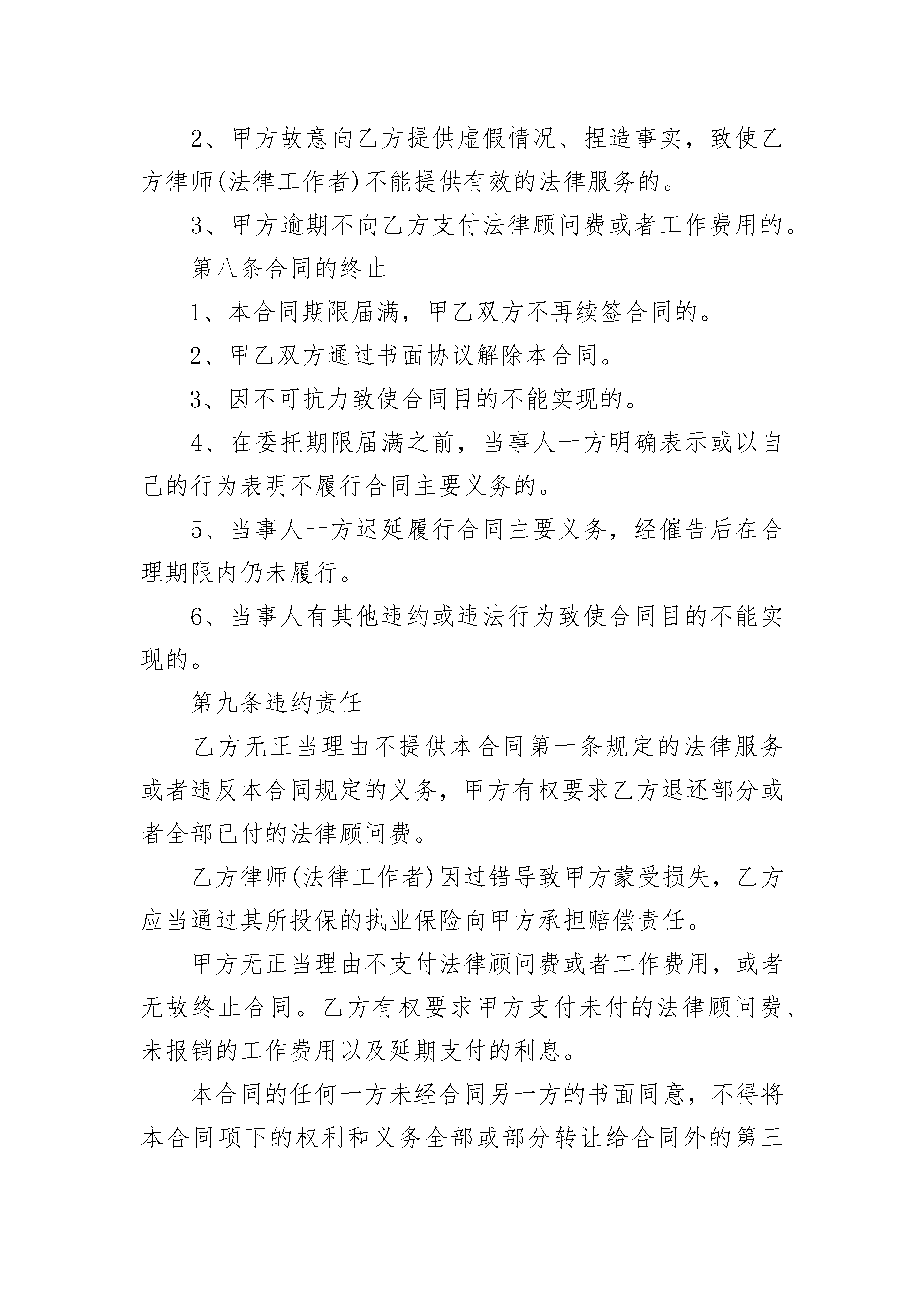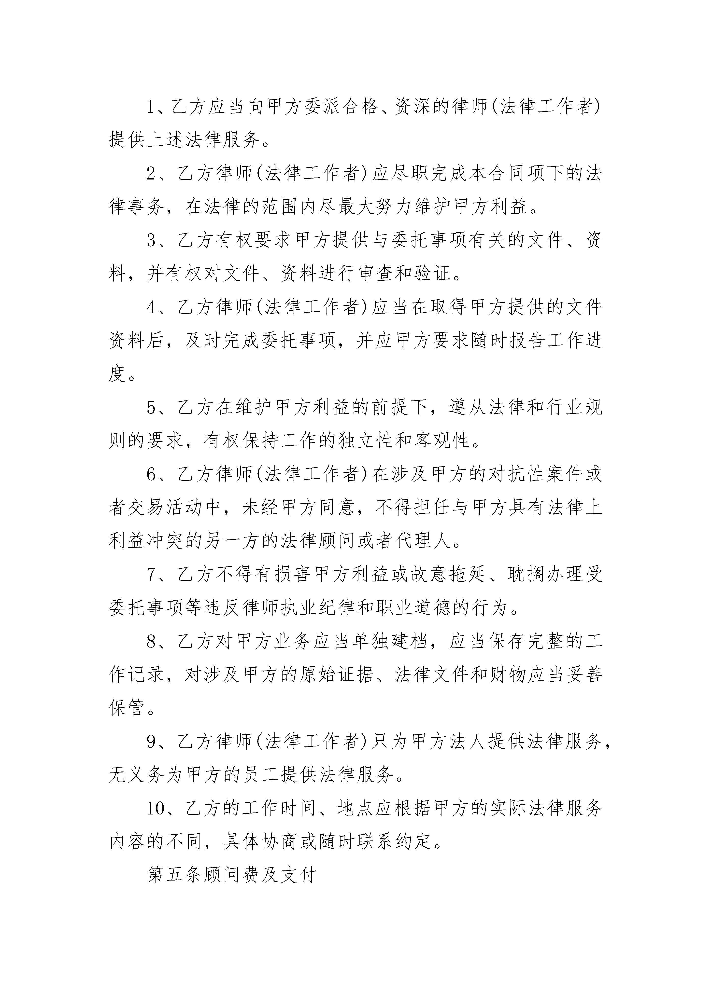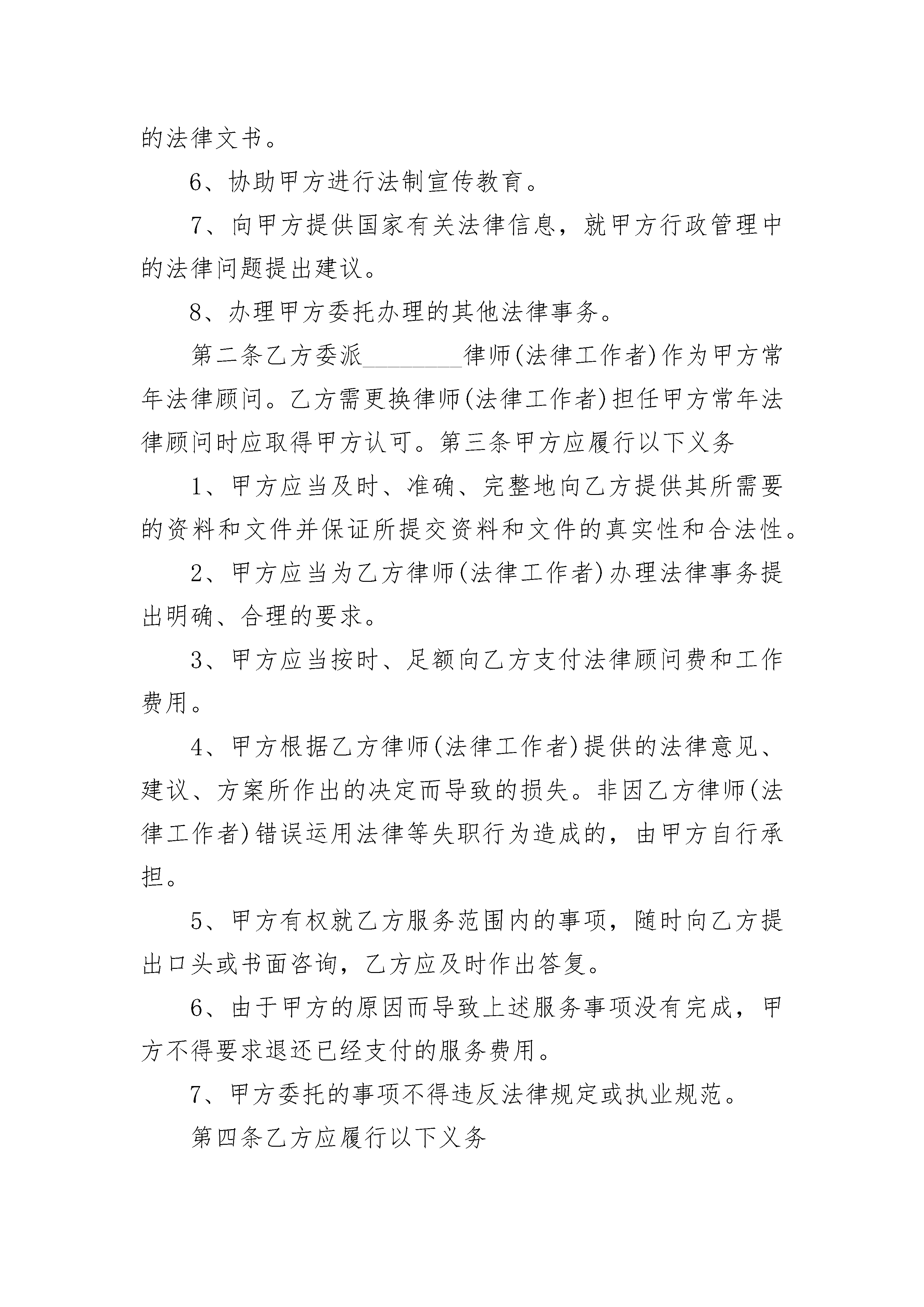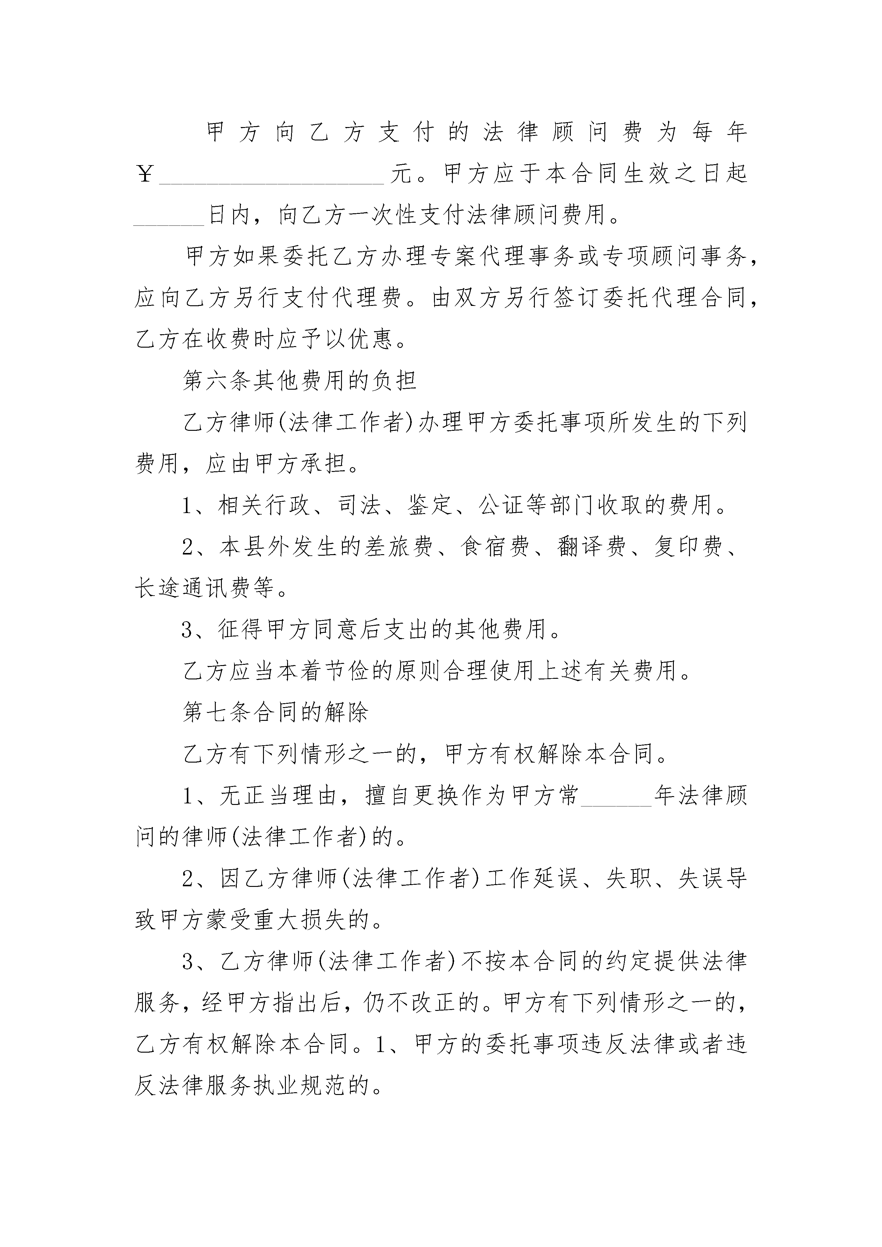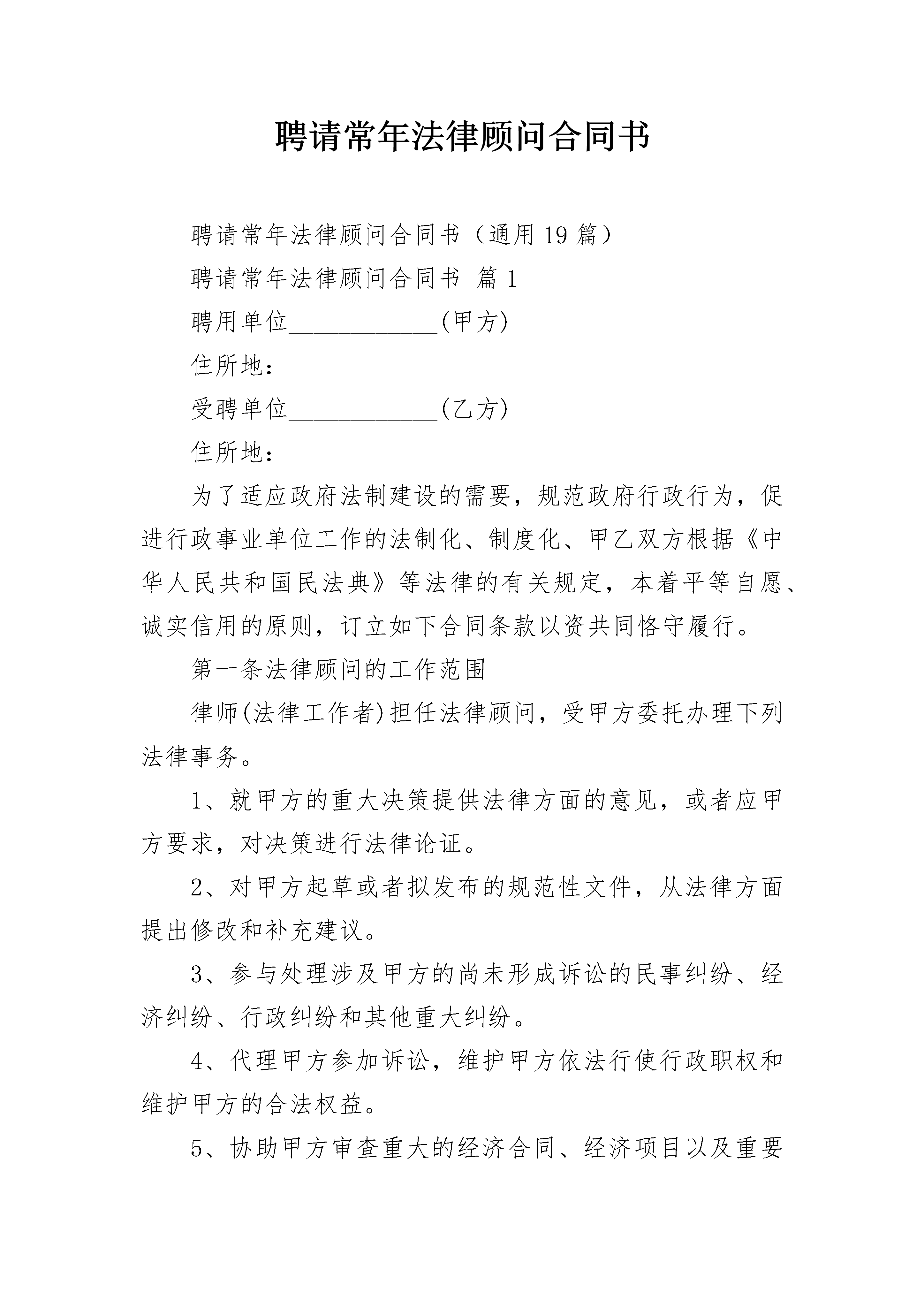 聘请常年法律顾问合同书聘请常年法律顾问合同书(通用19篇)聘请常年法律顾问合同书篇1聘用单位____________(甲方)住所地:__________________受聘单位____________(乙方)住所地:__________________为了适应政府法制建设的需要,规范政府行政行为,促进行政事业单位工作的法制化、制度化、甲乙双方根据《中华人民共和国民法典》等法律的有关规定,本着平等自愿、诚实信用的原则,订立如下合同条款以资共同恪守履行。第一条法律顾问的工作范围律师(法律工作者)担任法律顾问,受甲方委托办理下列法律事务。1、就甲方的重大决策提供法律方面的意见,或者应甲方要求,对决策进行法律论证。2、对甲方起草或者拟发布的规范性文件,从法律方面提出修改和补充建议。3、参与处理涉及甲方的尚未形成诉讼的民事纠纷、经济纠纷、行政纠纷和其他重大纠纷。4、代理甲方参加诉讼,维护甲方依法行使行政职权和维护甲方的合法权益。5、协助甲方审查重大的经济合同、经济项目以及重要的法律文书。6、协助甲方进行法制宣传教育。7、向甲方提供国家有关法律信息,就甲方行政管理中的法律问题提出建议。8、办理甲方委托办理的其他法律事务。第二条乙方委派________律师(法律工作者)作为甲方常年法律顾问。乙方需更换律师(法律工作者)担任甲方常年法律顾问时应取得甲方认可。第三条甲方应履行以下义务1、甲方应当及时、准确、完整地向乙方提供其所需要的资料和文件并保证所提交资料和文件的真实性和合法性。2、甲方应当为乙方律师(法律工作者)办理法律事务提出明确、合理的要求。3、甲方应当按时、足额向乙方支付法律顾问费和工作费用。4、甲方根据乙方律师(法律工作者)提供的法律意见、建议、方案所作出的决定而导致的损失。非因乙方律师(法律工作者)错误运用法律等失职行为造成的,由甲方自行承担。5、甲方有权就乙方服务范围内的事项,随时向乙方提出口头或书面咨询,乙方应及时作出答复。6、由于甲方的原因而导致上述服务事项没有完成,甲方不得要求退还已经支付的服务费用。7、甲方委托的事项不得违反法律规定或执业规范。第四条乙方应履行以下义务1、乙方应当向甲方委派合格、资深的律师(法律工作者)提供上述法律服务。2、乙方律师(法律工作者)应尽职完成本合同项下的法律事务,在法律的范围内尽最大努力维护甲方利益。3、乙方有权要求甲方提供与委托事项有关的文件、资料,并有权对文件、资料进行审查和验证。4、乙方律师(法律工作者)应当在取得甲方提供的文件资料后,及时完成委托事项,并应甲方要求随时报告工作进度。5、乙方在维护甲方利益的前提下,遵从法律和行业规则的要求,有权保持工作的独立性和客观性。6、乙方律师(法律工作者)在涉及甲方的对抗性案件或者交易活动中,未经甲方同意,不得担任与甲方具有法律上利益冲突的另一方的法律顾问或者代理人。7、乙方不得有损害甲方利益或故意拖延、耽搁办理受委托事项等违反律师执业纪律和职业道德的行为。8、乙方对甲方业务应当单独建档,应当保存完整的工作记录,对涉及甲方的原始证据、法律文件和财物应当妥善保管。9、乙方律师(法律工作者)只为甲方法人提供法律服务,无义务为甲方的员工提供法律服务。10、乙方的工作时间、地点应根据甲方的实际法律服务内容的不同,具体协商或随时联系约定。第五条顾问费及支付甲方向乙方支付的法律顾问费为每年¥___________________元。甲方应于本合同生效之日起______日内,向乙方一次性支付法律顾问费用。甲方如果委托乙方办理专案代理事务或专项顾问事务,应向乙方另行支付代理费。由双方另行签订委托代理合同,乙方在收费时应予以优惠。第六条其他费用的负担乙方律师(法律工作者)办理甲方委托事项所发生的下列费用,应由甲方承担。1、相关行政、司法、鉴定、公证等部门收取的费用。2、本县外发生的差旅费、食宿费、翻译费、复印费、长途通讯费等。3、征得甲方同意后支出的其他费用。乙方应当本着节俭的原则合理使用上述有关费用。第七条合同的解除乙方有下列情形之一的,甲方有权解除本合同。1、无正当理由,擅自更换作为甲方常______年法律顾问的律师(法律工作者)的。2、因乙方律师(法律工作者)工作延误、失职、失误导致甲方蒙受重大损失的。3、乙方律师(法律工作者)不按本合同的约定提供法律服务,经甲方指出后,仍不改正的。甲方有下列情形之一的,乙方有权解除本合同。1、甲方的委托事项违反法律或者违反法律服务执业规范的。2、甲方故意向乙方提供虚假情况、捏造事实,致使乙方律师(法律工作者)不能提供有效的法律服务的。3、甲方逾期不向乙方支付法律顾问费或者工作费用的。第八条合同的终止1、本合同期限届满,甲乙双方不再续签合同的。2、甲乙双方通过书面协议解除本合同。3、因不可抗力致使合同目的不能实现的。4、