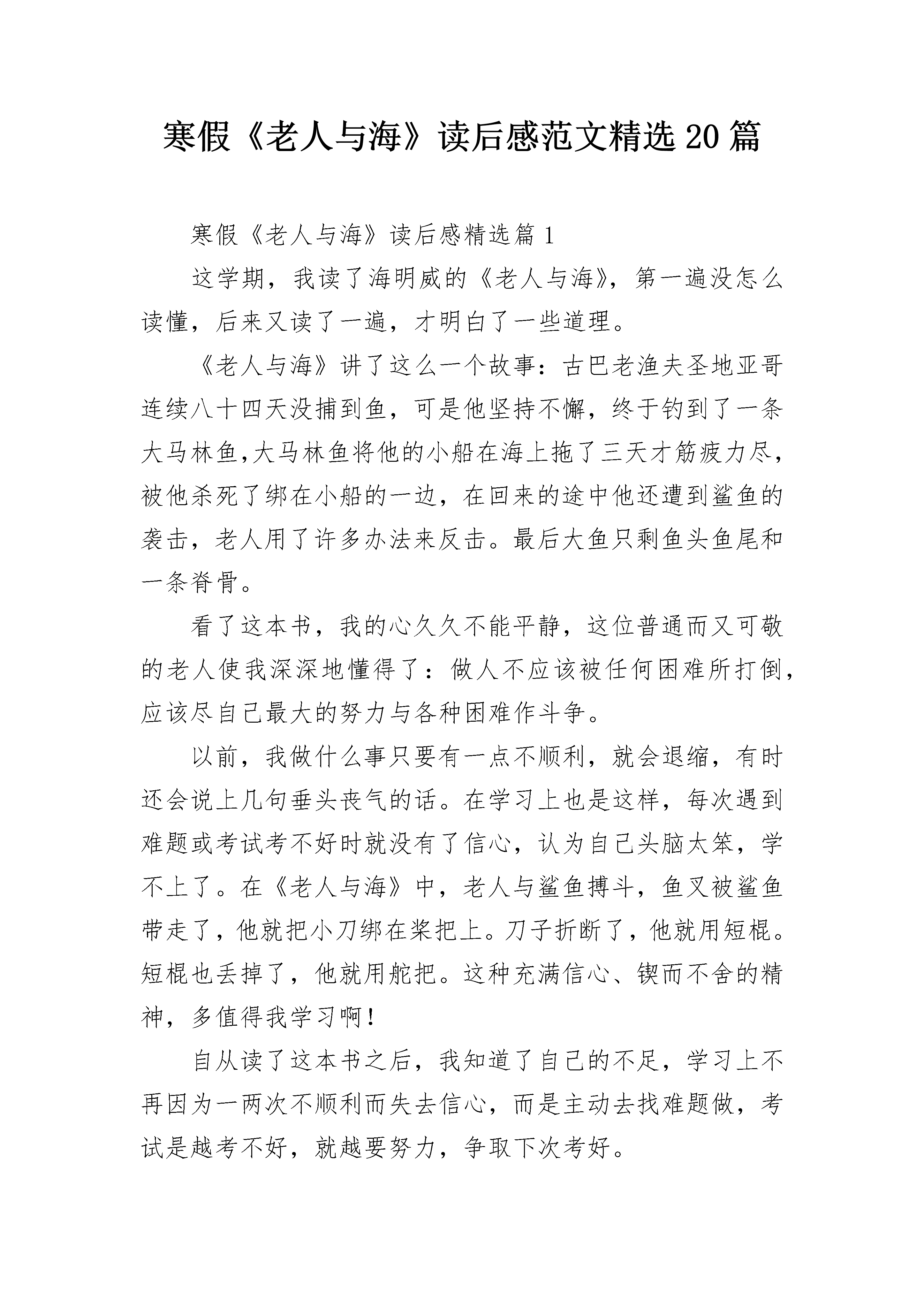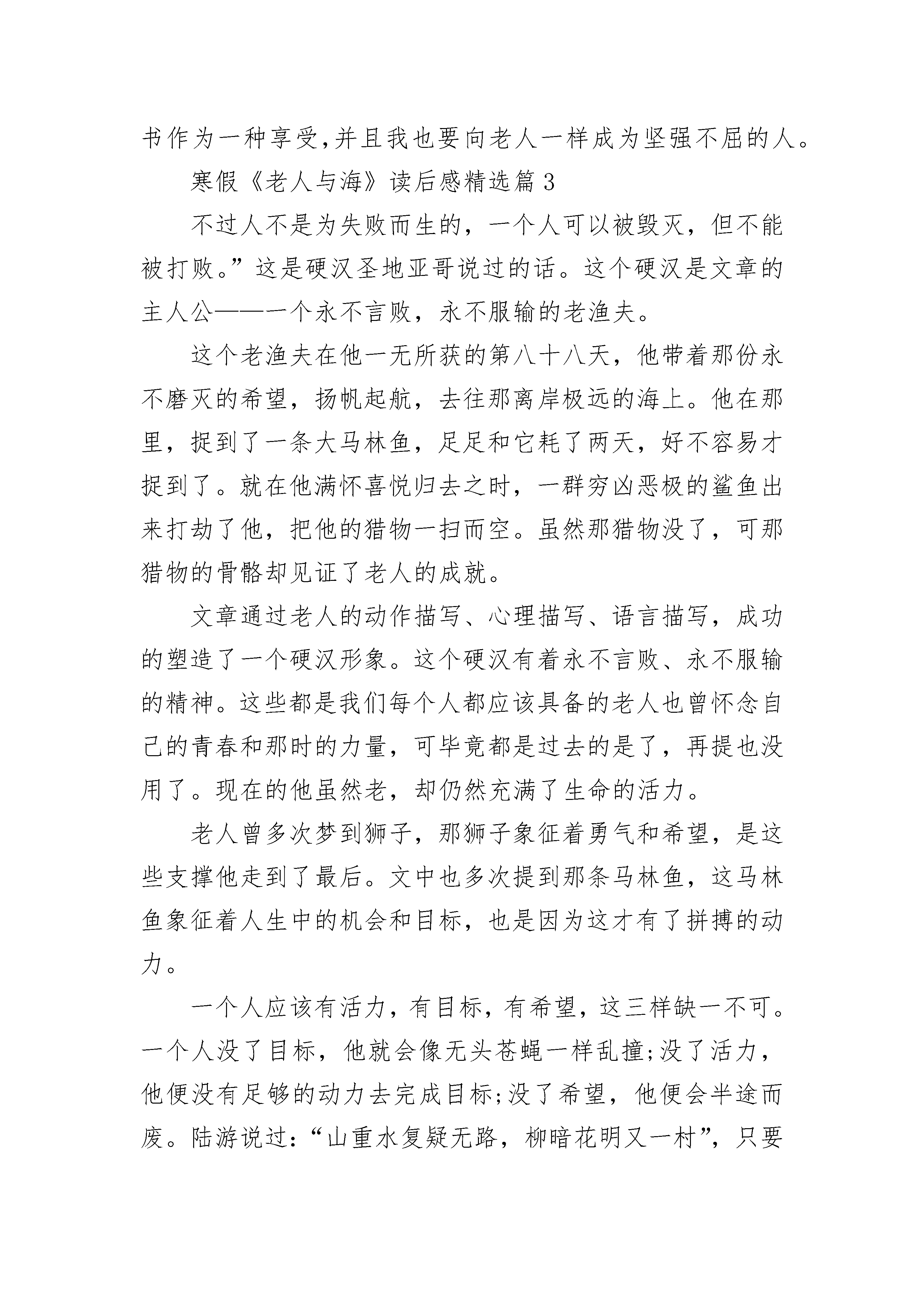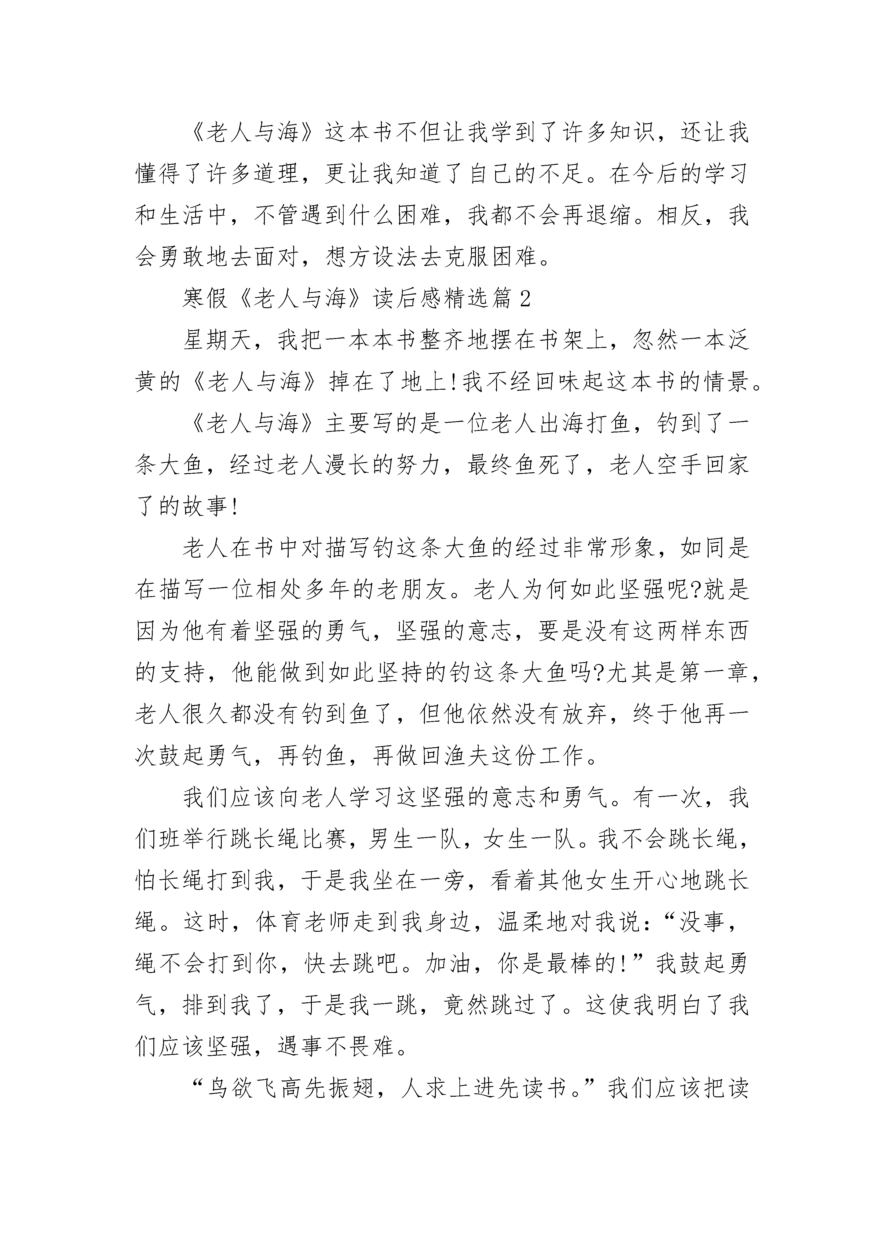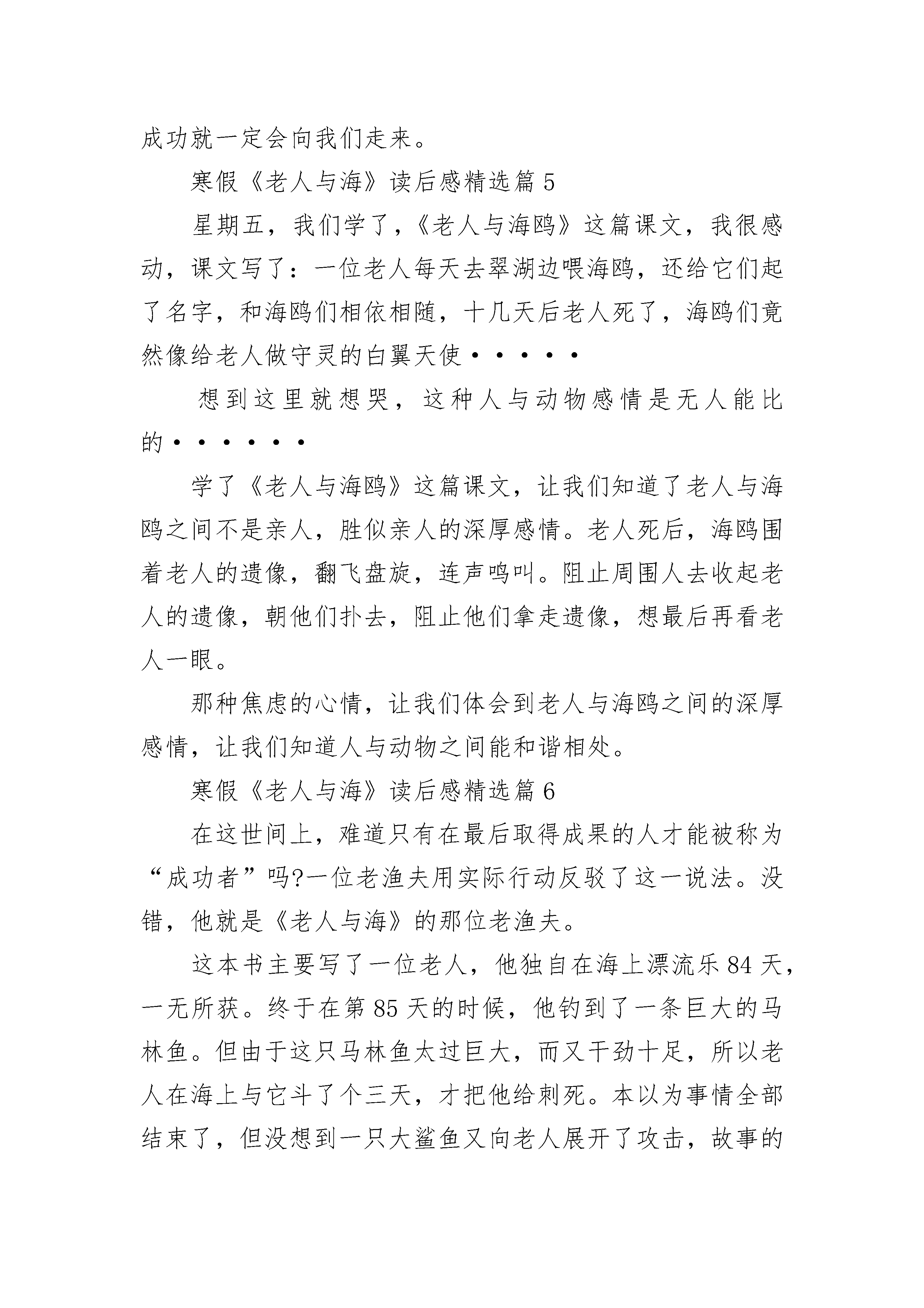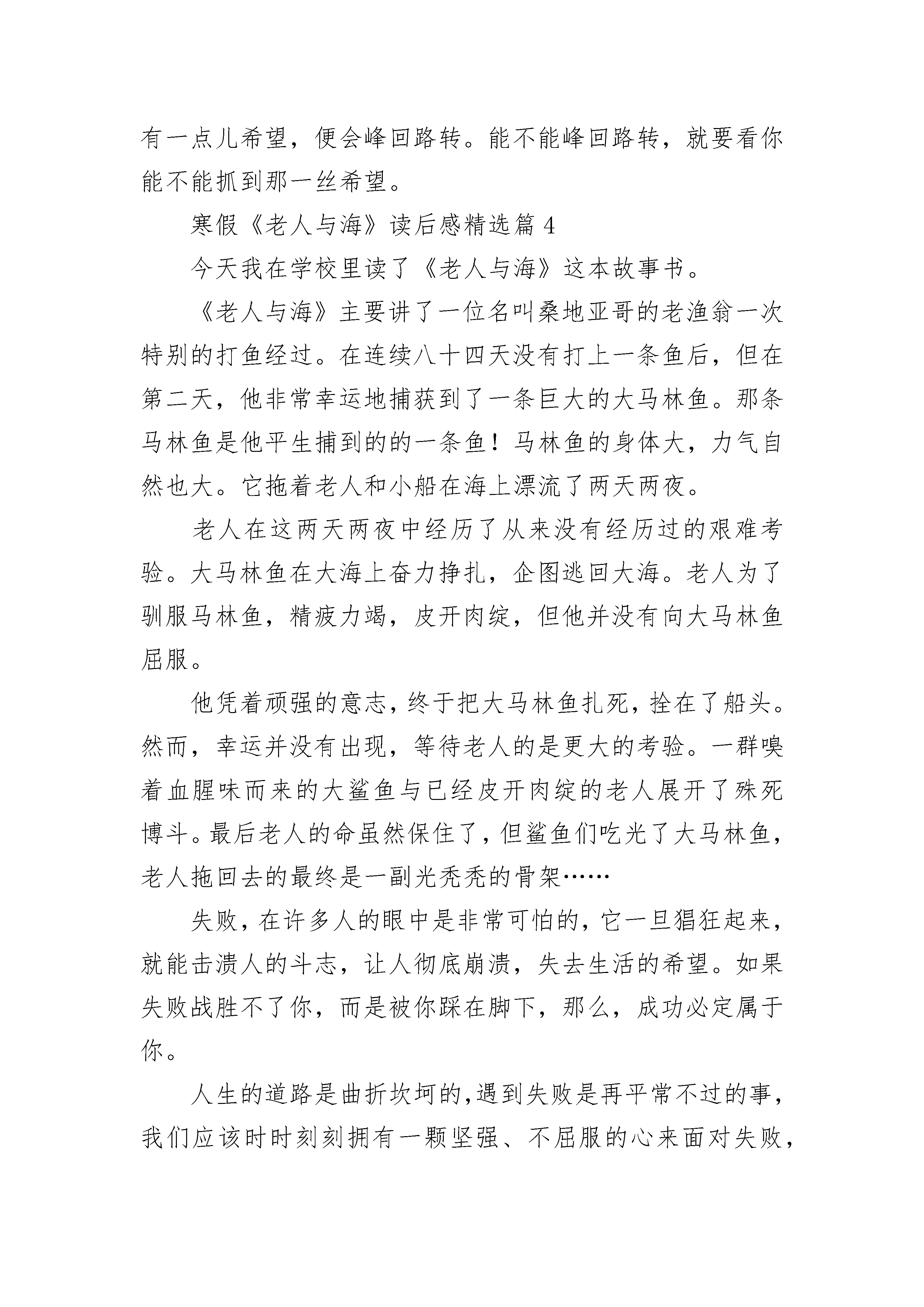 寒假《老人与海》读后感范文精选20篇寒假《老人与海》读后感精选篇1这学期,我读了海明威的《老人与海》,第一遍没怎么读懂,后来又读了一遍,才明白了一些道理。《老人与海》讲了这么一个故事:古巴老渔夫圣地亚哥连续八十四天没捕到鱼,可是他坚持不懈,终于钓到了一条大马林鱼,大马林鱼将他的小船在海上拖了三天才筋疲力尽,被他杀死了绑在小船的一边,在回来的途中他还遭到鲨鱼的袭击,老人用了许多办法来反击。最后大鱼只剩鱼头鱼尾和一条脊骨。看了这本书,我的心久久不能平静,这位普通而又可敬的老人使我深深地懂得了:做人不应该被任何困难所打倒,应该尽自己最大的努力与各种困难作斗争。以前,我做什么事只要有一点不顺利,就会退缩,有时还会说上几句垂头丧气的话。在学习上也是这样,每次遇到难题或考试考不好时就没有了信心,认为自己头脑太笨,学不上了。在《老人与海》中,老人与鲨鱼搏斗,鱼叉被鲨鱼带走了,他就把小刀绑在桨把上。刀子折断了,他就用短棍。短棍也丢掉了,他就用舵把。这种充满信心、锲而不舍的精神,多值得我学习啊!自从读了这本书之后,我知道了自己的不足,学习上不再因为一两次不顺利而失去信心,而是主动去找难题做,考试是越考不好,就越要努力,争取下次考好。《老人与海》这本书不但让我学到了许多知识,还让我懂得了许多道理,更让我知道了自己的不足。在今后的学习和生活中,不管遇到什么困难,我都不会再退缩。相反,我会勇敢地去面对,想方设法去克服困难。寒假《老人与海》读后感精选篇2星期天,我把一本本书整齐地摆在书架上,忽然一本泛黄的《老人与海》掉在了地上!我不经回味起这本书的情景。《老人与海》主要写的是一位老人出海打鱼,钓到了一条大鱼,经过老人漫长的努力,最终鱼死了,老人空手回家了的故事!老人在书中对描写钓这条大鱼的经过非常形象,如同是在描写一位相处多年的老朋友。老人为何如此坚强呢?就是因为他有着坚强的勇气,坚强的意志,要是没有这两样东西的支持,他能做到如此坚持的钓这条大鱼吗?尤其是第一章,老人很久都没有钓到鱼了,但他依然没有放弃,终于他再一次鼓起勇气,再钓鱼,再做回渔夫这份工作。我们应该向老人学习这坚强的意志和勇气。有一次,我们班举行跳长绳比赛,男生一队,女生一队。我不会跳长绳,怕长绳打到我,于是我坐在一旁,看着其他女生开心地跳长绳。这时,体育老师走到我身边,温柔地对我说:“没事,绳不会打到你,快去跳吧。加油,你是最棒的!”我鼓起勇气,排到我了,于是我一跳,竟然跳过了。这使我明白了我们应该坚强,遇事不畏难。“鸟欲飞高先振翅,人求上进先读书。”我们应该把读书作为一种享受,并且我也要向老人一样成为坚强不屈的人。寒假《老人与海》读后感精选篇3不过人不是为失败而生的,一个人可以被毁灭,但不能被打败。”这是硬汉圣地亚哥说过的话。这个硬汉是文章的主人公——一个永不言败,永不服输的老渔夫。这个老渔夫在他一无所获的第八十八天,他带着那份永不磨灭的希望,扬帆起航,去往那离岸极远的海上。他在那里,捉到了一条大马林鱼,足足和它耗了两天,好不容易才捉到了。就在他满怀喜悦归去之时,一群穷凶恶极的鲨鱼出来打劫了他,把他的猎物一扫而空。虽然那猎物没了,可那猎物的骨骼却见证了老人的成就。文章通过老人的动作描写、心理描写、语言描写,成功的塑造了一个硬汉形象。这个硬汉有着永不言败、永不服输的精神。这些都是我们每个人都应该具备的老人也曾怀念自己的青春和那时的力量,可毕竟都是过去的是了,再提也没用了。现在的他虽然老,却仍然充满了生命的活力。老人曾多次梦到狮子,那狮子象征着勇气和希望,是这些支撑他走到了最后。文中也多次提到那条马林鱼,这马林鱼象征着人生中的机会和目标,也是因为这才有了拼搏的动力。一个人应该有活力,有目标,有希望,这三样缺一不可。一个人没了目标,他就会像无头苍蝇一样乱撞;没了活力,他便没有足够的动力去完成目标;没了希望,他便会半途而废。陆游说过:“山重水复疑无路,柳暗花明又一村”,只要有一点儿希望,便会峰回路转。能不能峰回路转,就要看你能不能抓到那一丝希望。寒假《老人与海》读后感精选篇4今天我在学校里读了《老人与海》这本故事书。《老人与海》主要讲了一位名叫桑地亚哥的老渔翁一次特别的打鱼经过。在连续八十四天没有打上一条鱼后,但在第二天,他非常幸运地捕获到了一条巨大的大马林鱼。那条马林鱼是他平生捕到的的一条鱼!马林鱼的身体大,力气自然也大。它拖着老人和小船在海上漂流了两天两夜。老人在这两天两夜中经历了从来没有经历过的艰难考验。大马林鱼在大海上奋力挣扎,企图逃回大海。老人为了驯服马林鱼,精疲力竭,皮开肉绽,但他并没有向大马林鱼屈服。他凭着顽强的意志,终于把大马林鱼扎死,拴在了船头。然而,幸运并没有出现,等待老人的是更大的考验。一群嗅着血腥味而来的大鲨鱼与已经皮开肉绽的老人展开了殊死博斗。最后老人的命虽然保住
