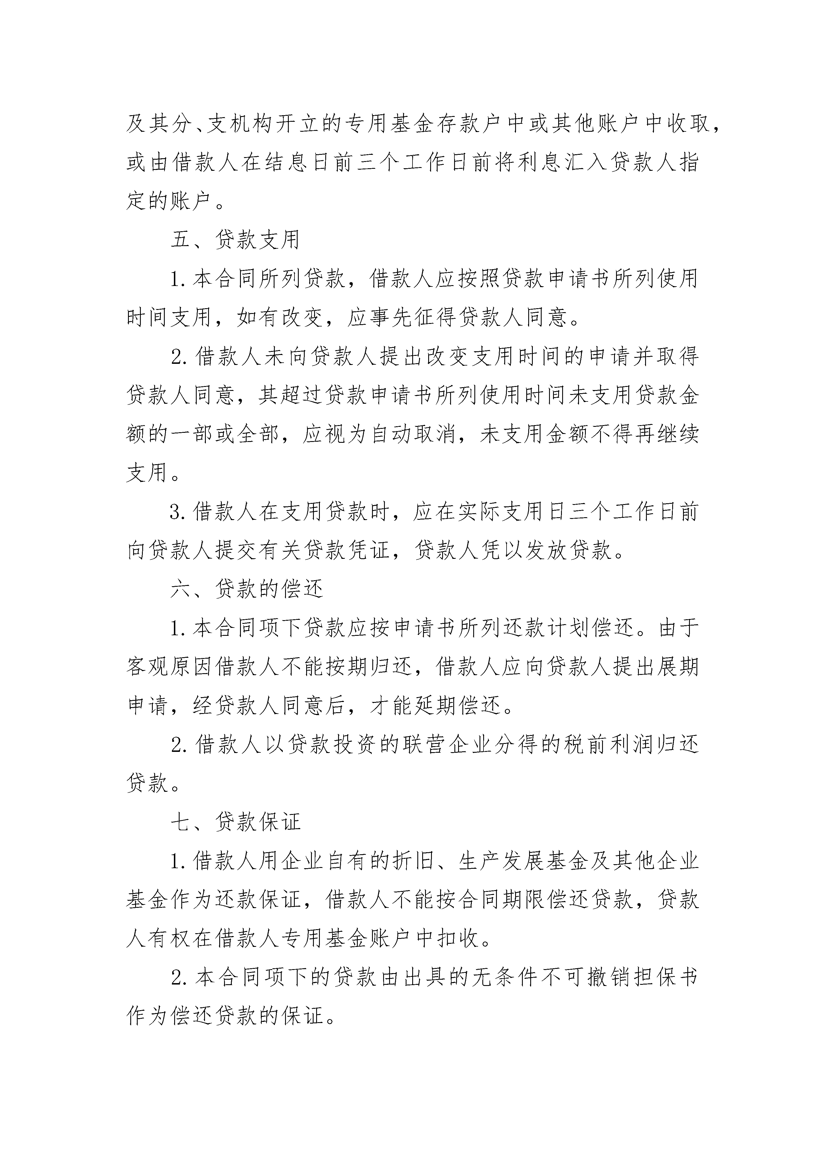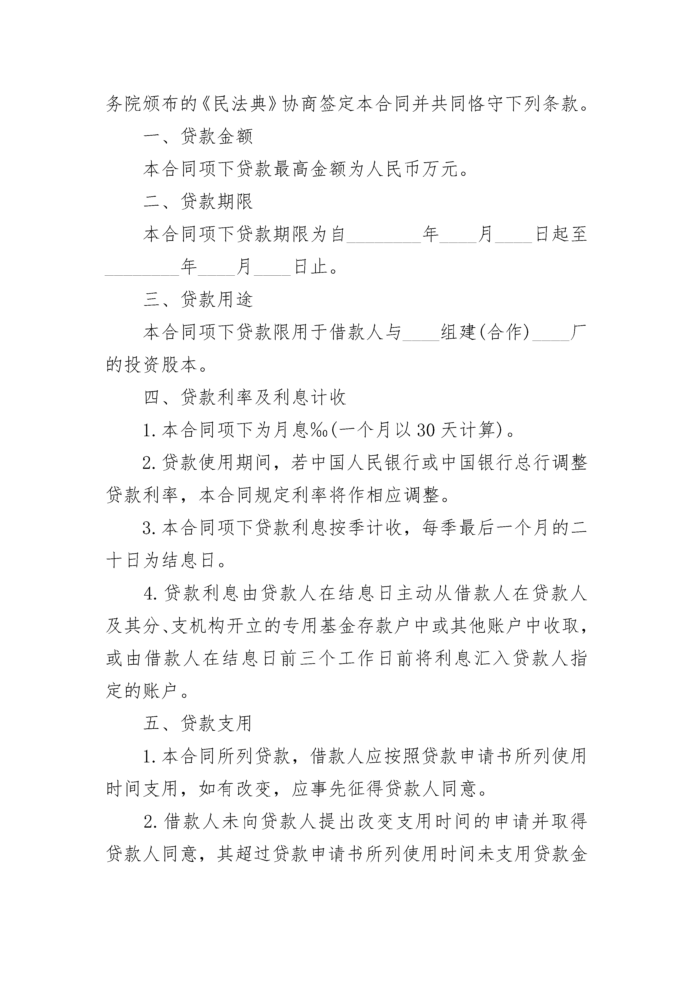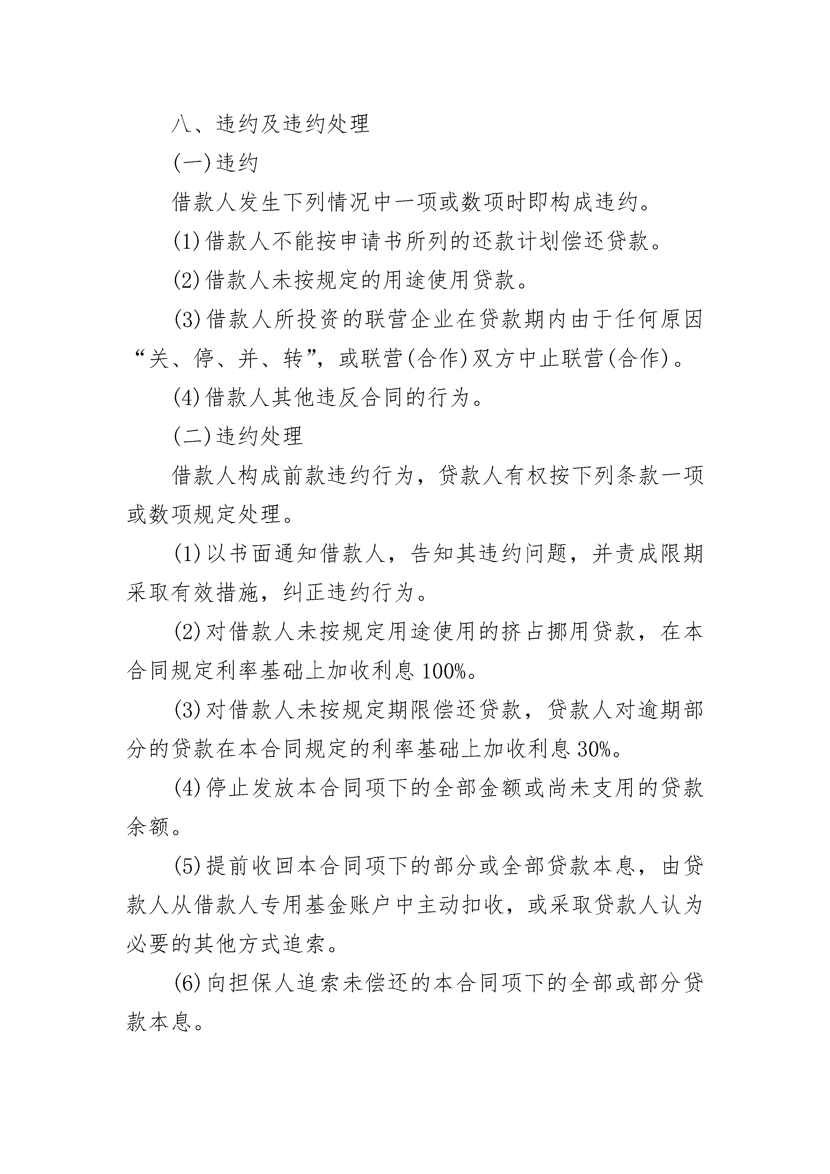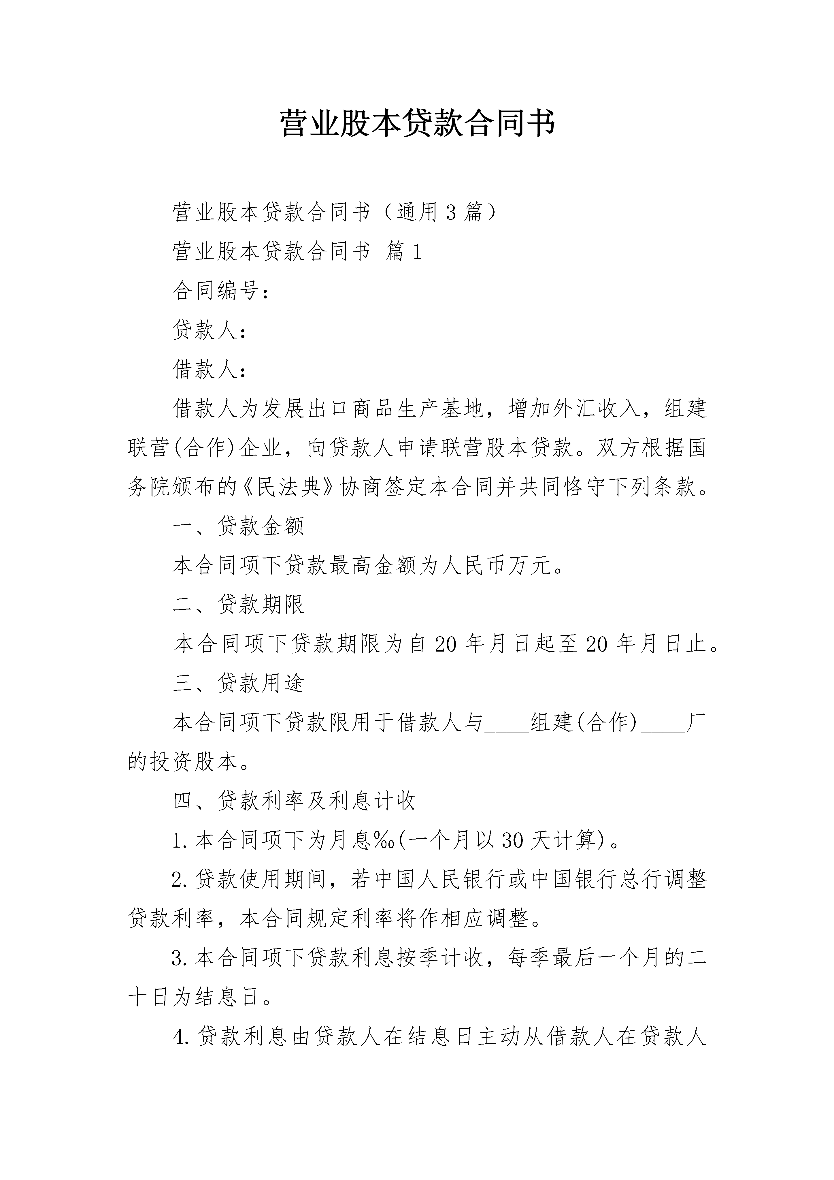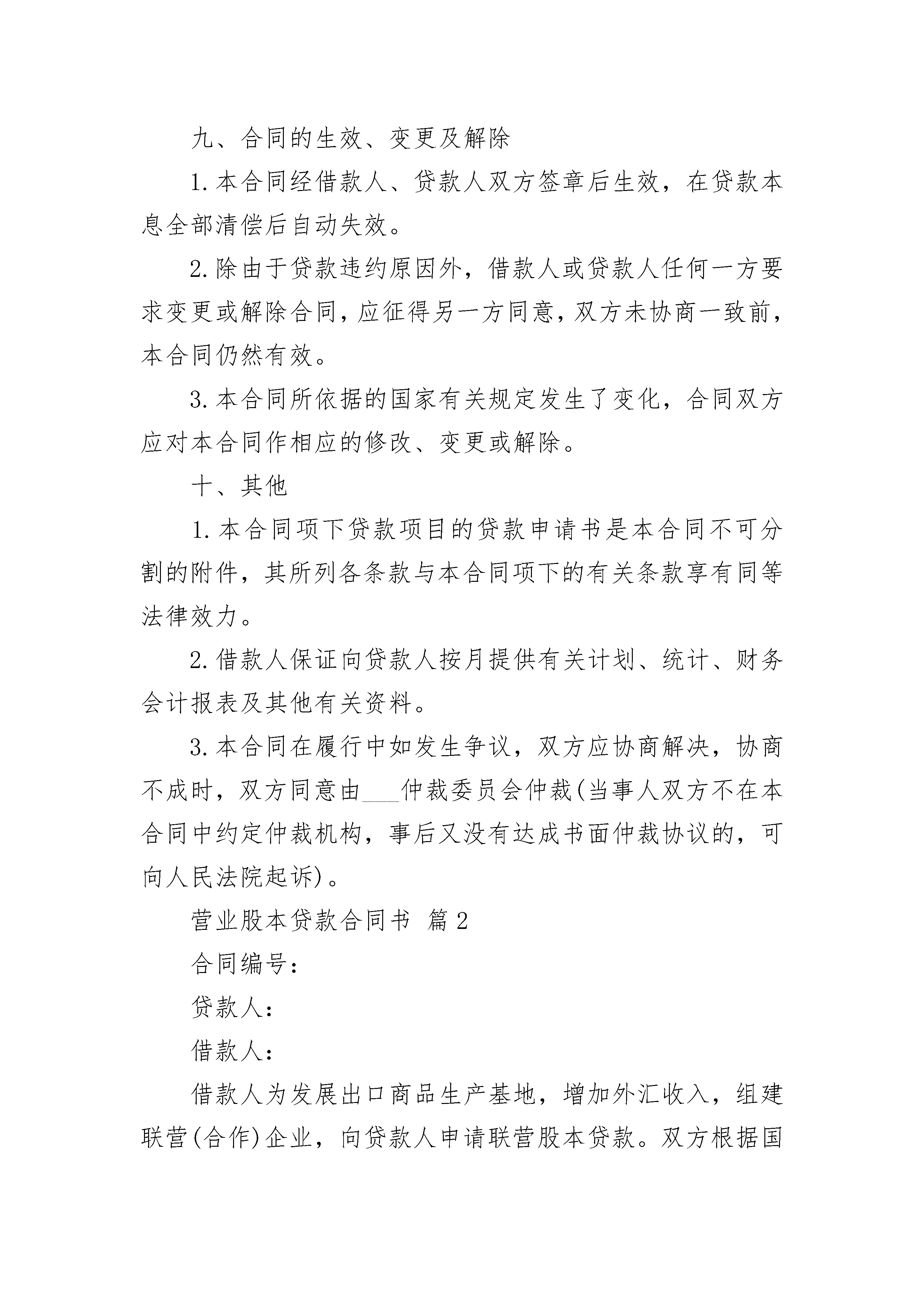 营业股本贷款合同书营业股本贷款合同书(通用3篇)营业股本贷款合同书篇1合同编号:贷款人:借款人:借款人为发展出口商品生产基地,增加外汇收入,组建联营(合作)企业,向贷款人申请联营股本贷款。双方根据国务院颁布的《民法典》协商签定本合同并共同恪守下列条款。一、贷款金额本合同项下贷款最高金额为人民币万元。二、贷款期限本合同项下贷款期限为自20年月日起至20年月日止。三、贷款用途本合同项下贷款限用于借款人与____组建(合作)____厂的投资股本。四、贷款利率及利息计收1.本合同项下为月息‰(一个月以30天计算)。2.贷款使用期间,若中国人民银行或中国银行总行调整贷款利率,本合同规定利率将作相应调整。3.本合同项下贷款利息按季计收,每季最后一个月的二十日为结息日。4.贷款利息由贷款人在结息日主动从借款人在贷款人及其分、支机构开立的专用基金存款户中或其他账户中收取,或由借款人在结息日前三个工作日前将利息汇入贷款人指定的账户。五、贷款支用1.本合同所列贷款,借款人应按照贷款申请书所列使用时间支用,如有改变,应事先征得贷款人同意。2.借款人未向贷款人提出改变支用时间的申请并取得贷款人同意,其超过贷款申请书所列使用时间未支用贷款金额的一部或全部,应视为自动取消,未支用金额不得再继续支用。3.借款人在支用贷款时,应在实际支用日三个工作日前向贷款人提交有关贷款凭证,贷款人凭以发放贷款。六、贷款的偿还1.本合同项下贷款应按申请书所列还款计划偿还。由于客观原因借款人不能按期归还,借款人应向贷款人提出展期申请,经贷款人同意后,才能延期偿还。2.借款人以贷款投资的联营企业分得的税前利润归还贷款。七、贷款保证1.借款人用企业自有的折旧、生产发展基金及其他企业基金作为还款保证,借款人不能按合同期限偿还贷款,贷款人有权在借款人专用基金账户中扣收。2.本合同项下的贷款由出具的无条件不可撤销担保书作为偿还贷款的保证。八、违约及违约处理(一)违约借款人发生下列情况中一项或数项时即构成违约。(1)借款人不能按申请书所列的还款计划偿还贷款。(2)借款人未按规定的用途使用贷款。(3)借款人所投资的联营企业在贷款期内由于任何原因“关、停、并、转”,或联营(合作)双方中止联营(合作)。(4)借款人其他违反合同的行为。(二)违约处理借款人构成前款违约行为,贷款人有权按下列条款一项或数项规定处理。(1)以书面通知借款人,告知其违约问题,并责成限期采取有效措施,纠正违约行为。(2)对借款人未按规定用途使用的挤占挪用贷款,在本合同规定利率基础上加收利息100%。(3)对借款人未按规定期限偿还贷款,贷款人对逾期部分的贷款在本合同规定的利率基础上加收利息30%。(4)停止发放本合同项下的全部金额或尚未支用的贷款余额。(5)提前收回本合同项下的部分或全部贷款本息,由贷款人从借款人专用基金账户中主动扣收,或采取贷款人认为必要的其他方式追索。(6)向担保人追索未偿还的本合同项下的全部或部分贷款本息。九、合同的生效、变更及解除1.本合同经借款人、贷款人双方签章后生效,在贷款本息全部清偿后自动失效。2.除由于贷款违约原因外,借款人或贷款人任何一方要求变更或解除合同,应征得另一方同意,双方未协商一致前,本合同仍然有效。3.本合同所依据的国家有关规定发生了变化,合同双方应对本合同作相应的修改、变更或解除。十、其他1.本合同项下贷款项目的贷款申请书是本合同不可分割的附件,其所列各条款与本合同项下的有关条款享有同等法律效力。2.借款人保证向贷款人按月提供有关计划、统计、财务会计报表及其他有关资料。3.本合同在履行中如发生争议,双方应协商解决,协商不成时,双方同意由___仲裁委员会仲裁(当事人双方不在本合同中约定仲裁机构,事后又没有达成书面仲裁协议的,可向人民法院起诉)。营业股本贷款合同书篇2合同编号:贷款人:借款人:借款人为发展出口商品生产基地,增加外汇收入,组建联营(合作)企业,向贷款人申请联营股本贷款。双方根据国务院颁布的《民法典》协商签定本合同并共同恪守下列条款。一、贷款金额本合同项下贷款最高金额为人民币万元。二、贷款期限本合同项下贷款期限为自________年____月____日起至________年____月____日止。三、贷款用途本合同项下贷款限用于借款人与____组建(合作)____厂的投资股本。四、贷款利率及利息计收1.本合同项下为月息‰(一个月以30天计算)。2.贷款使用期间,若中国人民银行或中国银行总行调整贷款利率,本合同规定利率将作相应调整。3.本合同项下贷款利息按季计收,每季最后一个月的二十日为结息日。4.贷款利息由贷款人在结息日主动从借款人在贷款人及其分、支机构开立的专用基金存款户中或其他账户中收取,或由借款人在结息日前三个工作日前将利息汇入贷款人指定的账户。五、贷款支用1