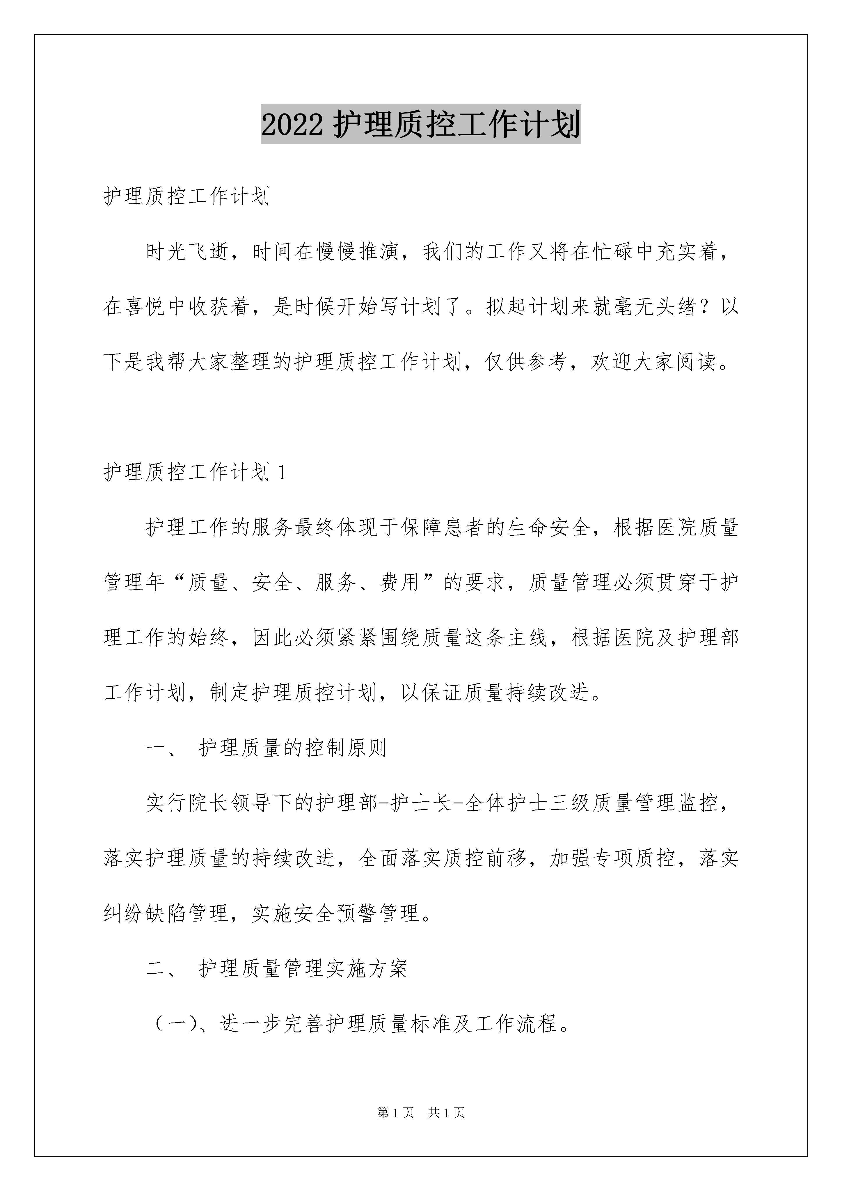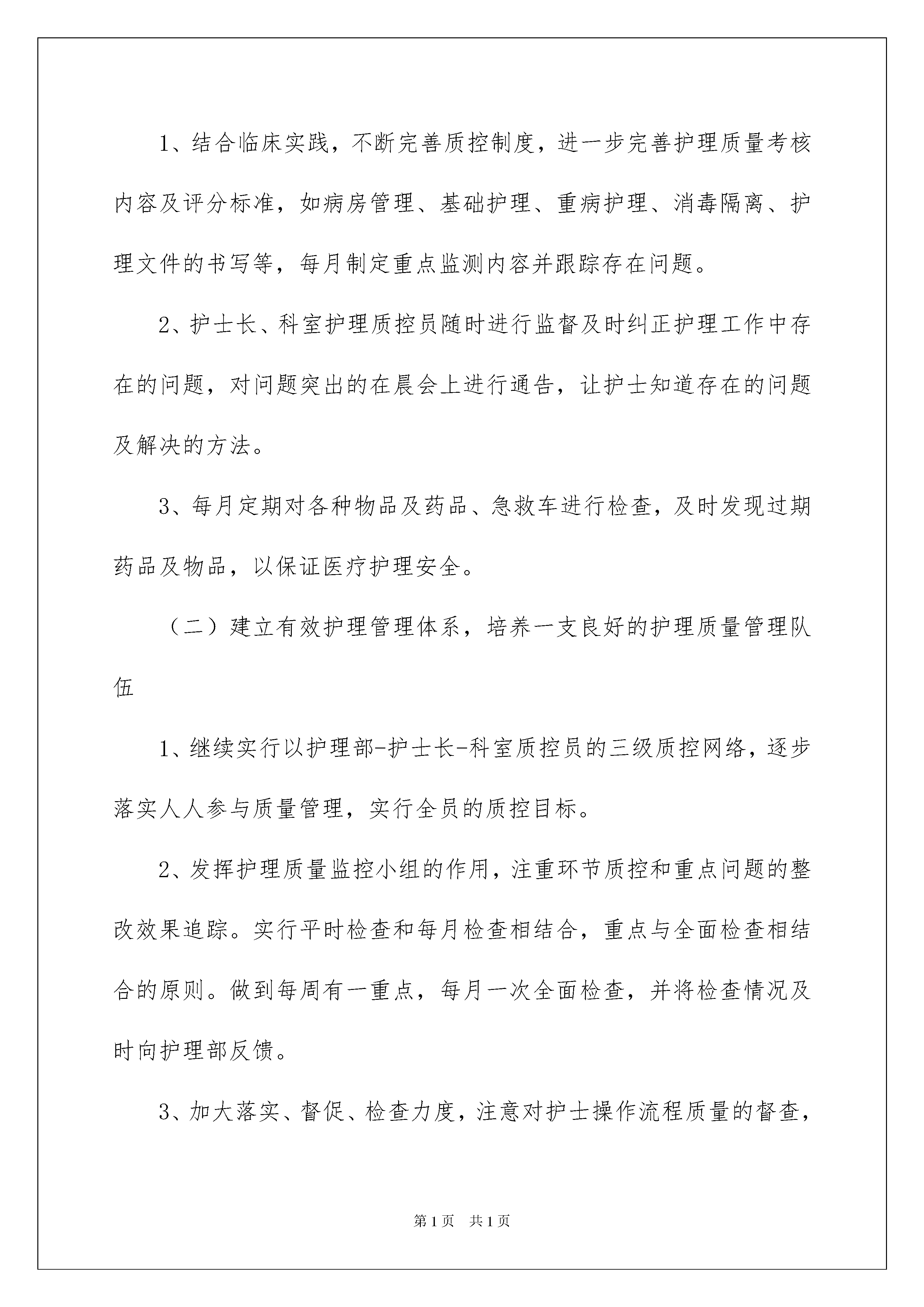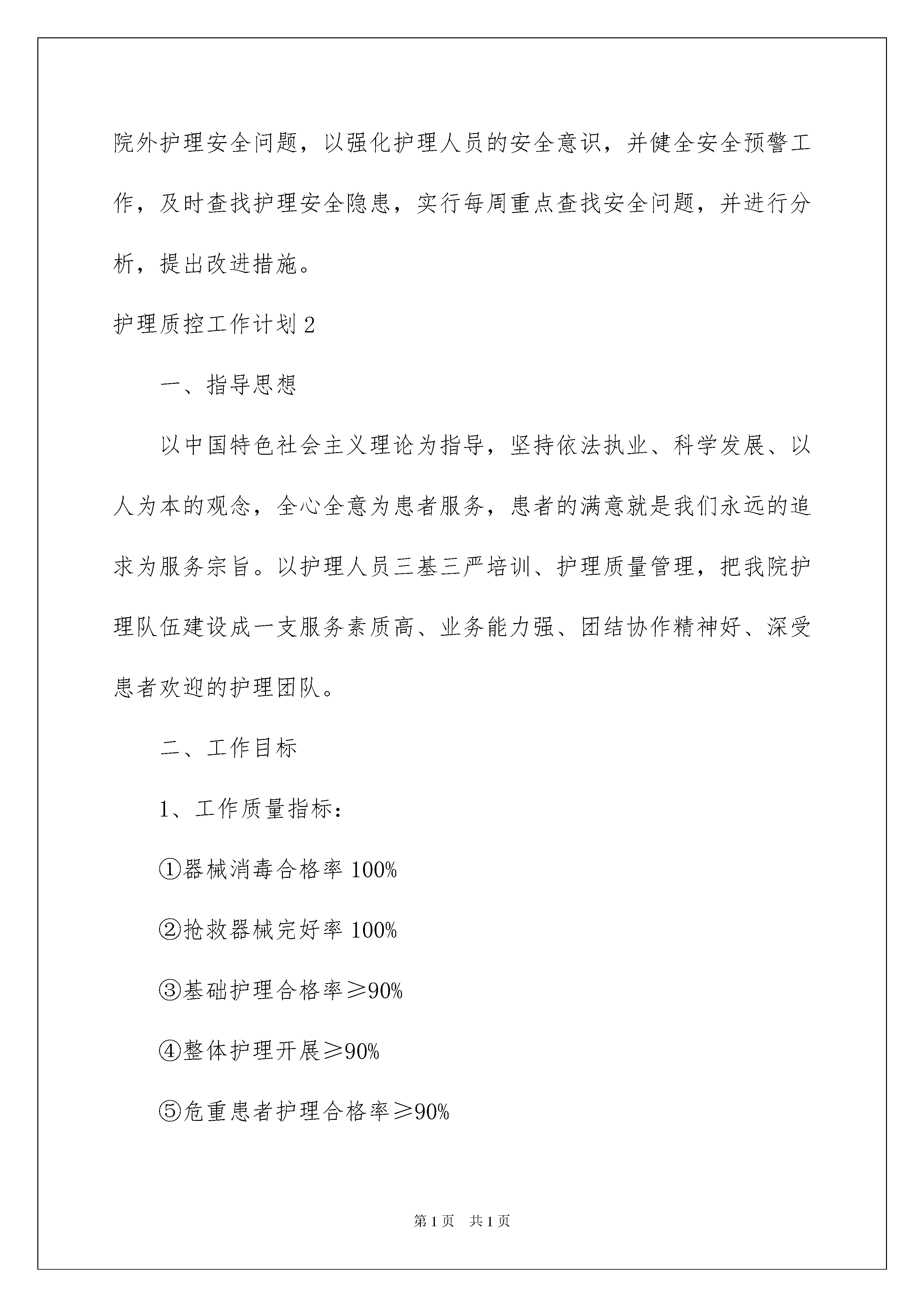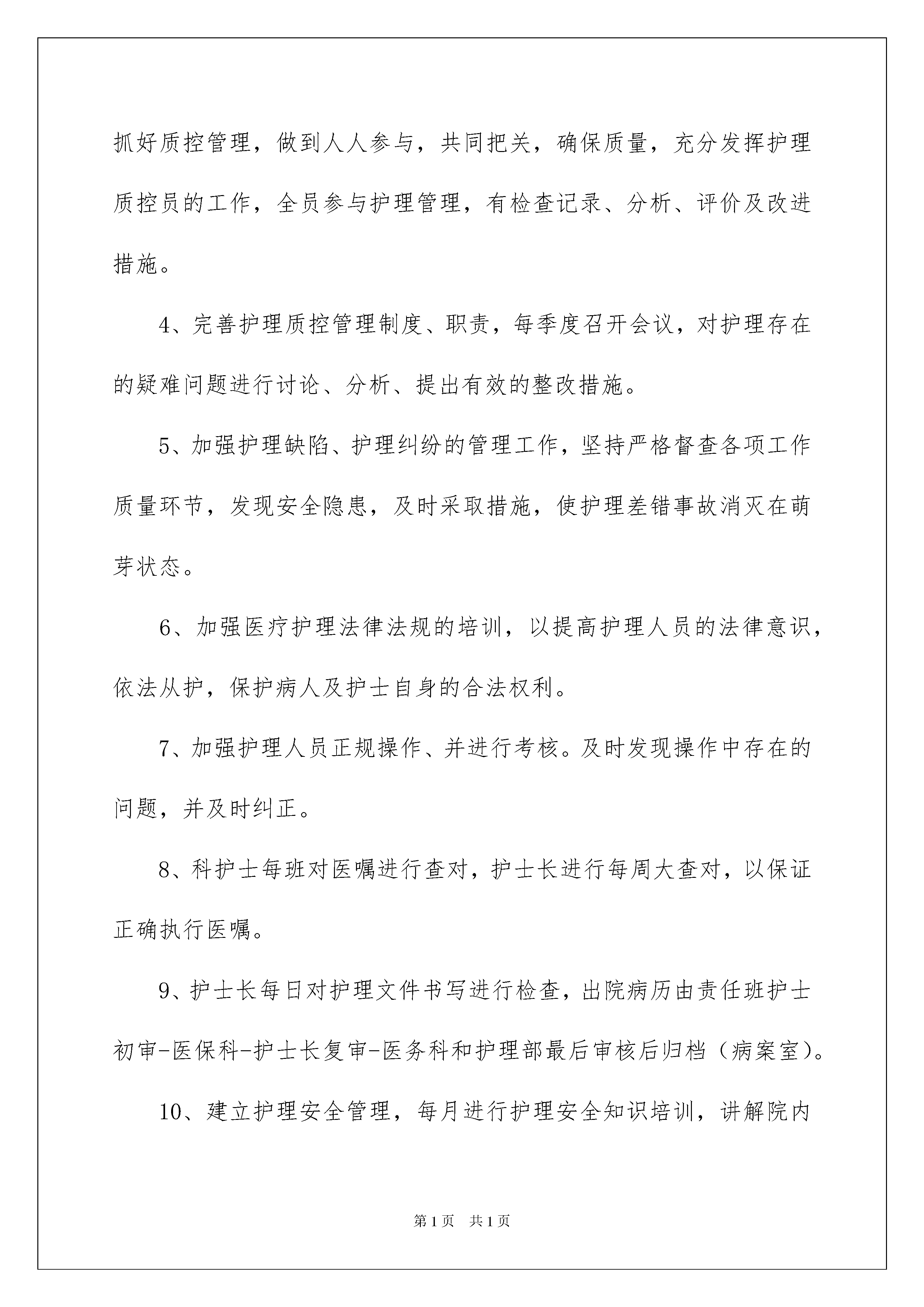 2022护理质控工作计划护理质控工作计划时光飞逝,时间在慢慢推演,我们的工作又将在忙碌中充实着,在喜悦中收获着,是时候开始写计划了。拟起计划来就毫无头绪?以下是我帮大家整理的护理质控工作计划,仅供参考,欢迎大家阅读。护理质控工作计划1护理工作的服务最终体现于保障患者的生命安全,根据医院质量管理年“质量、安全、服务、费用”的要求,质量管理必须贯穿于护理工作的始终,因此必须紧紧围绕质量这条主线,根据医院及护理部工作计划,制定护理质控计划,以保证质量持续改进。一、护理质量的控制原则实行院长领导下的护理部-护士长-全体护士三级质量管理监控,落实护理质量的持续改进,全面落实质控前移,加强专项质控,落实纠纷缺陷管理,实施安全预警管理。二、护理质量管理实施方案(一)、进一步完善护理质量标准及工作流程。1、结合临床实践,不断完善质控制度,进一步完善护理质量考核内容及评分标准,如病房管理、基础护理、重病护理、消毒隔离、护理文件的书写等,每月制定重点监测内容并跟踪存在问题。2、护士长、科室护理质控员随时进行监督及时纠正护理工作中存在的问题,对问题突出的在晨会上进行通告,让护士知道存在的问题及解决的方法。3、每月定期对各种物品及药品、急救车进行检查,及时发现过期药品及物品,以保证医疗护理安全。(二)建立有效护理管理体系,培养一支良好的护理质量管理队伍1、继续实行以护理部-护士长-科室质控员的三级质控网络,逐步落实人人参与质量管理,实行全员的质控目标。2、发挥护理质量监控小组的作用,注重环节质控和重点问题的整改效果追踪。实行平时检查和每月检查相结合,重点与全面检查相结合的原则。做到每周有一重点,每月一次全面检查,并将检查情况及时向护理部反馈。3、加大落实、督促、检查力度,注意对护士操作流程质量的督查,抓好质控管理,做到人人参与,共同把关,确保质量,充分发挥护理质控员的工作,全员参与护理管理,有检查记录、分析、评价及改进措施。4、完善护理质控管理制度、职责,每季度召开会议,对护理存在的疑难问题进行讨论、分析、提出有效的整改措施。5、加强护理缺陷、护理纠纷的管理工作,坚持严格督查各项工作质量环节,发现安全隐患,及时采取措施,使护理差错事故消灭在萌芽状态。6、加强医疗护理法律法规的培训,以提高护理人员的法律意识,依法从护,保护病人及护士自身的合法权利。7、加强护理人员正规操作、并进行考核。及时发现操作中存在的问题,并及时纠正。8、科护士每班对医嘱进行查对,护士长进行每周大查对,以保证正确执行医嘱。9、护士长每日对护理文件书写进行检查,出院病历由责任班护士初审-医保科-护士长复审-医务科和护理部最后审核后归档(病案室)。10、建立护理安全管理,每月进行护理安全知识培训,讲解院内院外护理安全问题,以强化护理人员的安全意识,并健全安全预警工作,及时查找护理安全隐患,实行每周重点查找安全问题,并进行分析,提出改进措施。护理质控工作计划2一、指导思想以中国特色社会主义理论为指导,坚持依法执业、科学发展、以人为本的观念,全心全意为患者服务,患者的满意就是我们永远的追求为服务宗旨。以护理人员三基三严培训、护理质量管理,把我院护理队伍建设成一支服务素质高、业务能力强、团结协作精神好、深受患者欢迎的护理团队。二、工作目标1、工作质量指标:①器械消毒合格率100%②抢救器械完好率100%③基础护理合格率≥90%④整体护理开展≥90%⑤危重患者护理合格率≥90%⑥护理技术操作合格率≥95%⑦年褥疮发生数≤1%⑧护理文件书写合格率≥95%⑨护理事故0⑩卫生管理:病室走廊干净、整洁,玻璃明亮,厕所无异味。2、护理服务:①患者对护理人员满意度≥95%②被服管理:实行护理员专人管理,被服干净无破损,及时更换。三、工作任务1、把改善服务态度、提倡主动微笑服务做为护理工作重要内容之一,抓紧抓好。2、继续抓好护理工作质量与持续改进,把好环节质量关,严格执行“三查、八对、一注意”,把细节管理作为20xx年护理质量管理重点内容之一,认真落实各项规章制度,严格技术操作规程,强化护理人员安全意识,杜绝护理事故发生,把护理差错降低到最低程度。①严格执行长巡查制度,每周巡查,发现问题及时解决。②科内每月组织业务学习、护理查房、质量考评一次,对存在问题,召开质量分析会,查找原因,及时解决。3、强化护理人员的素质以及基本技能训练。①加强长技能培训,使长对25项技术操作熟练掌握,以点带面,带动全科同志,重点科室按照护理部安排组织科室人员进行技术操作培训,使她们熟练掌握本科室常用技术操作技能,努力做好科室工作,具体内容详见业务学习培训计划。②长组织科内人员