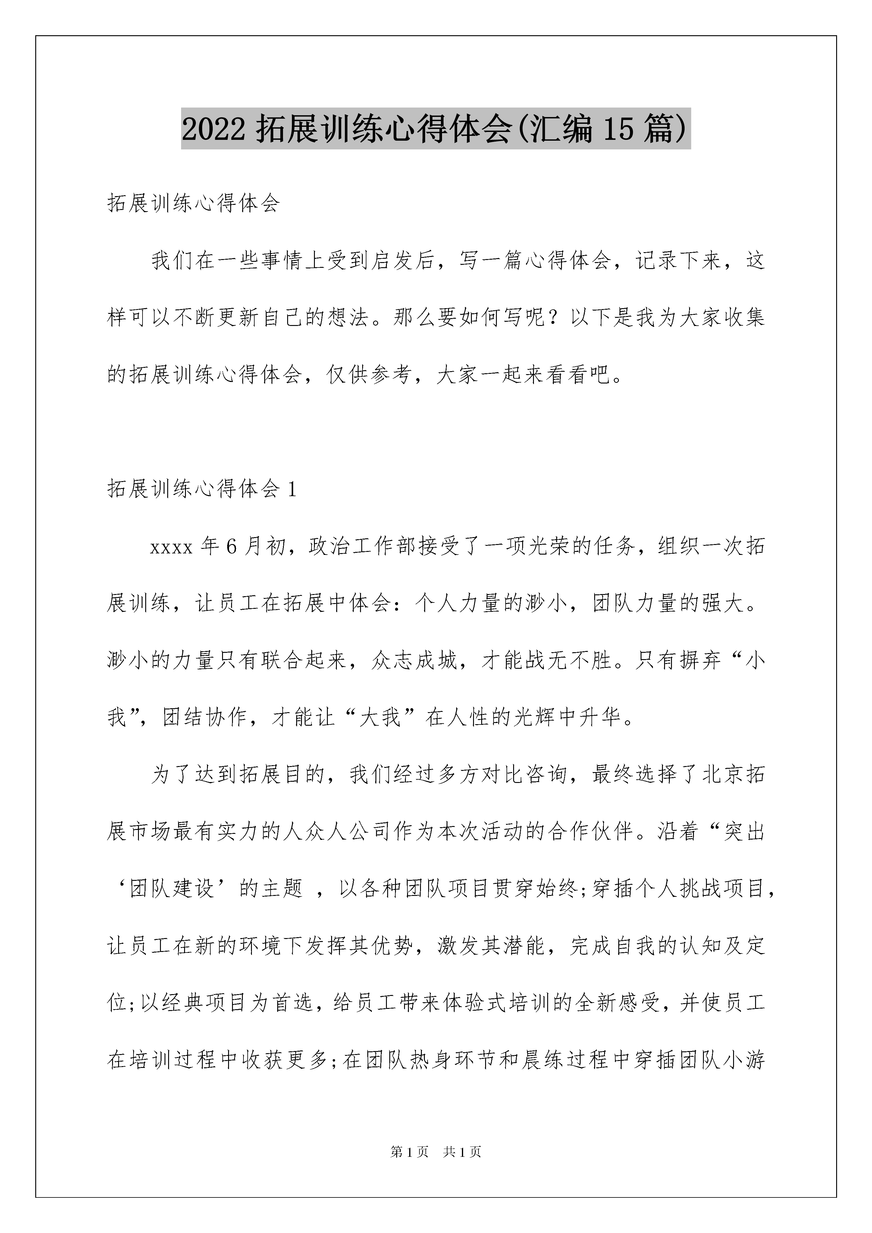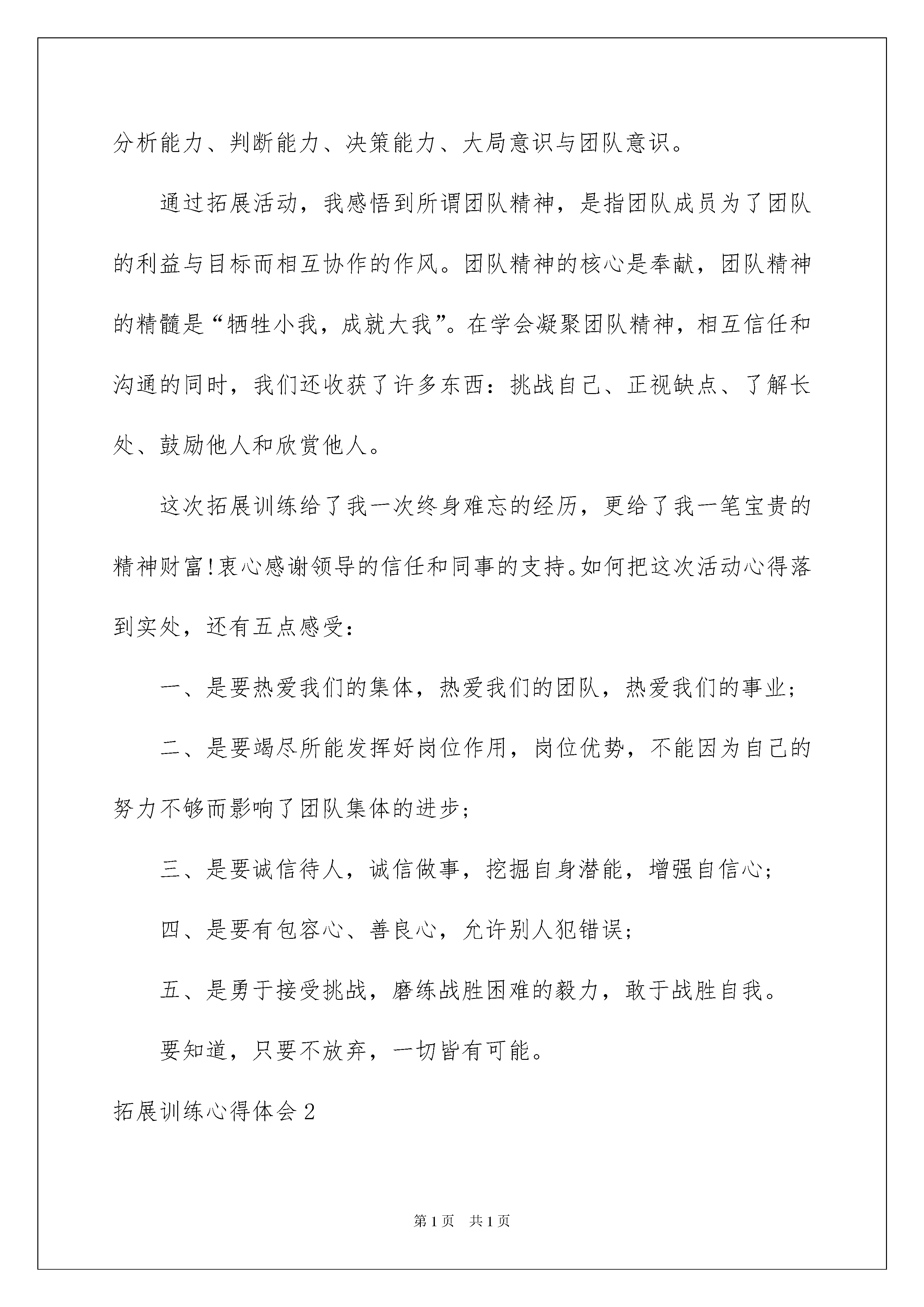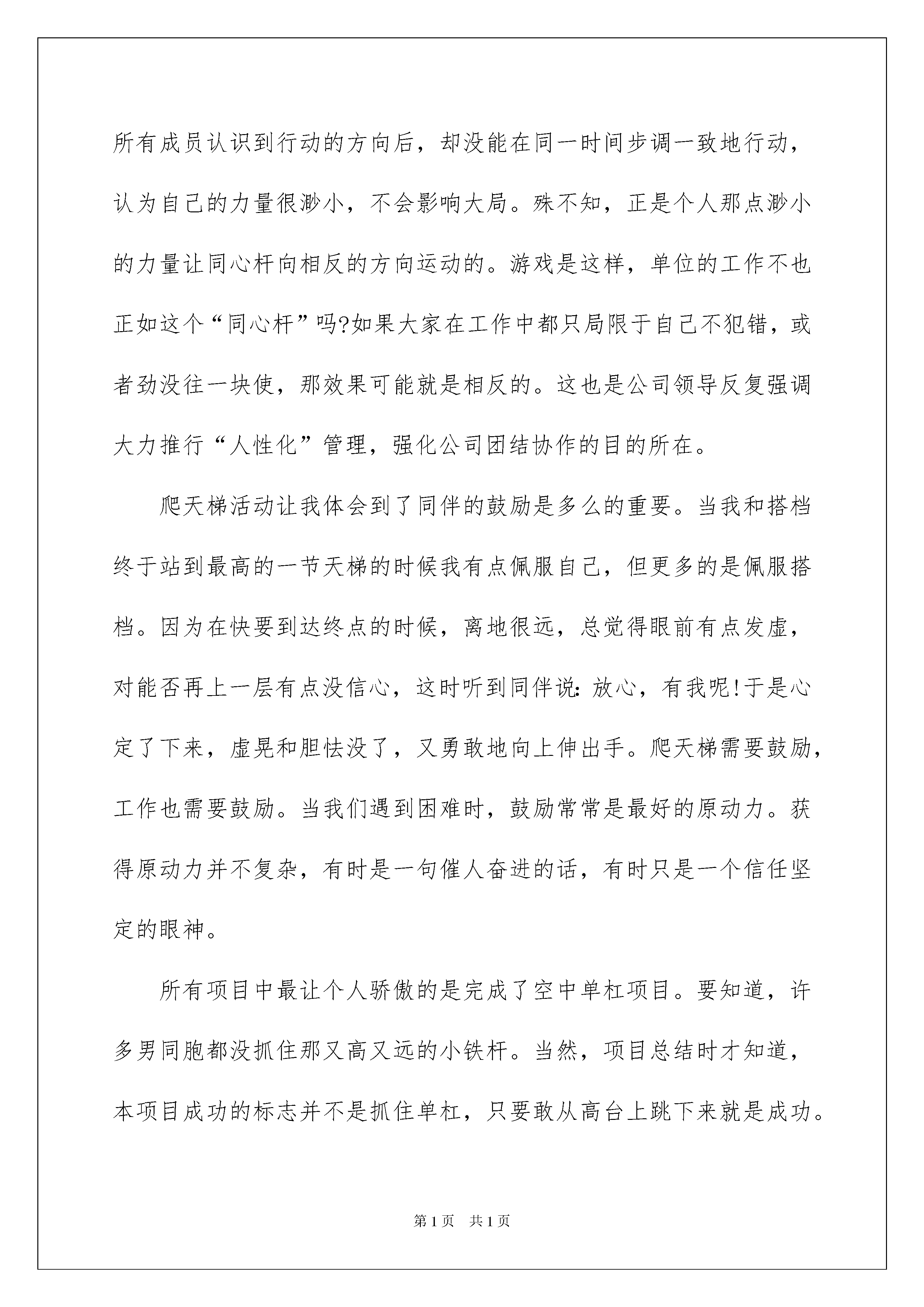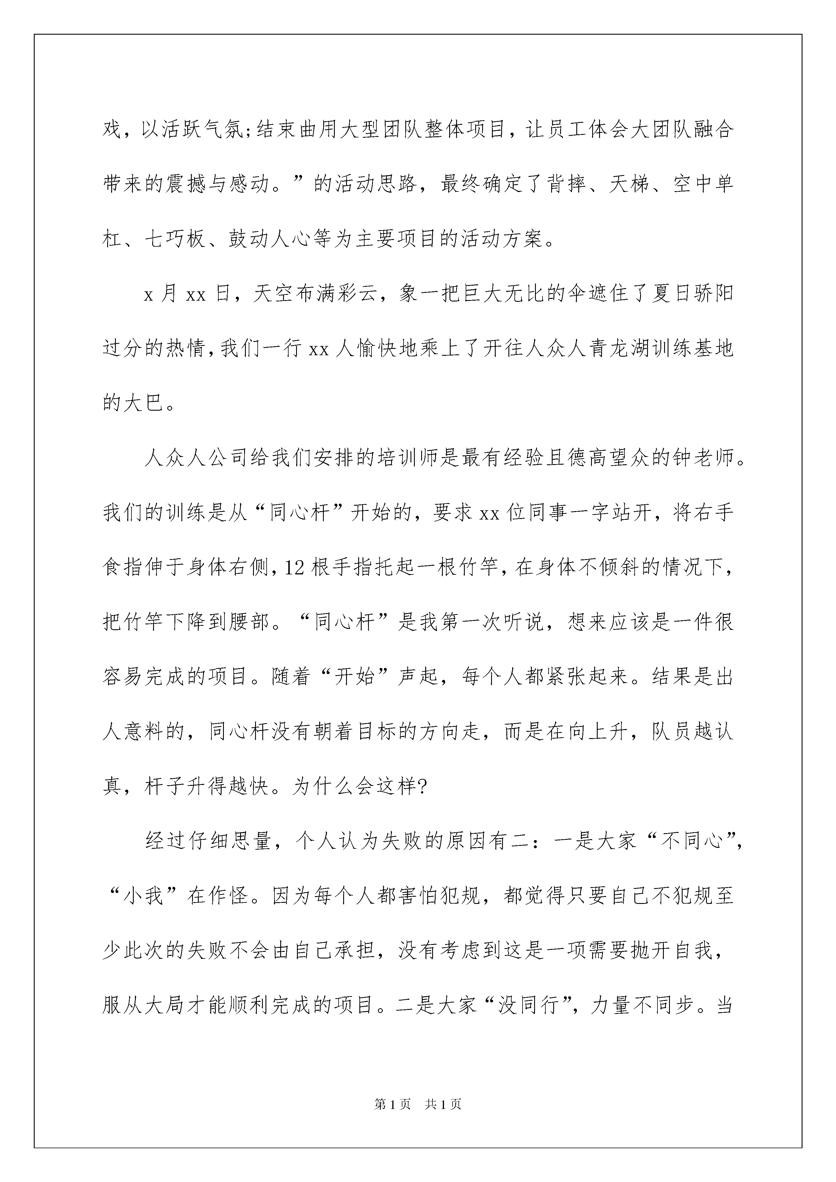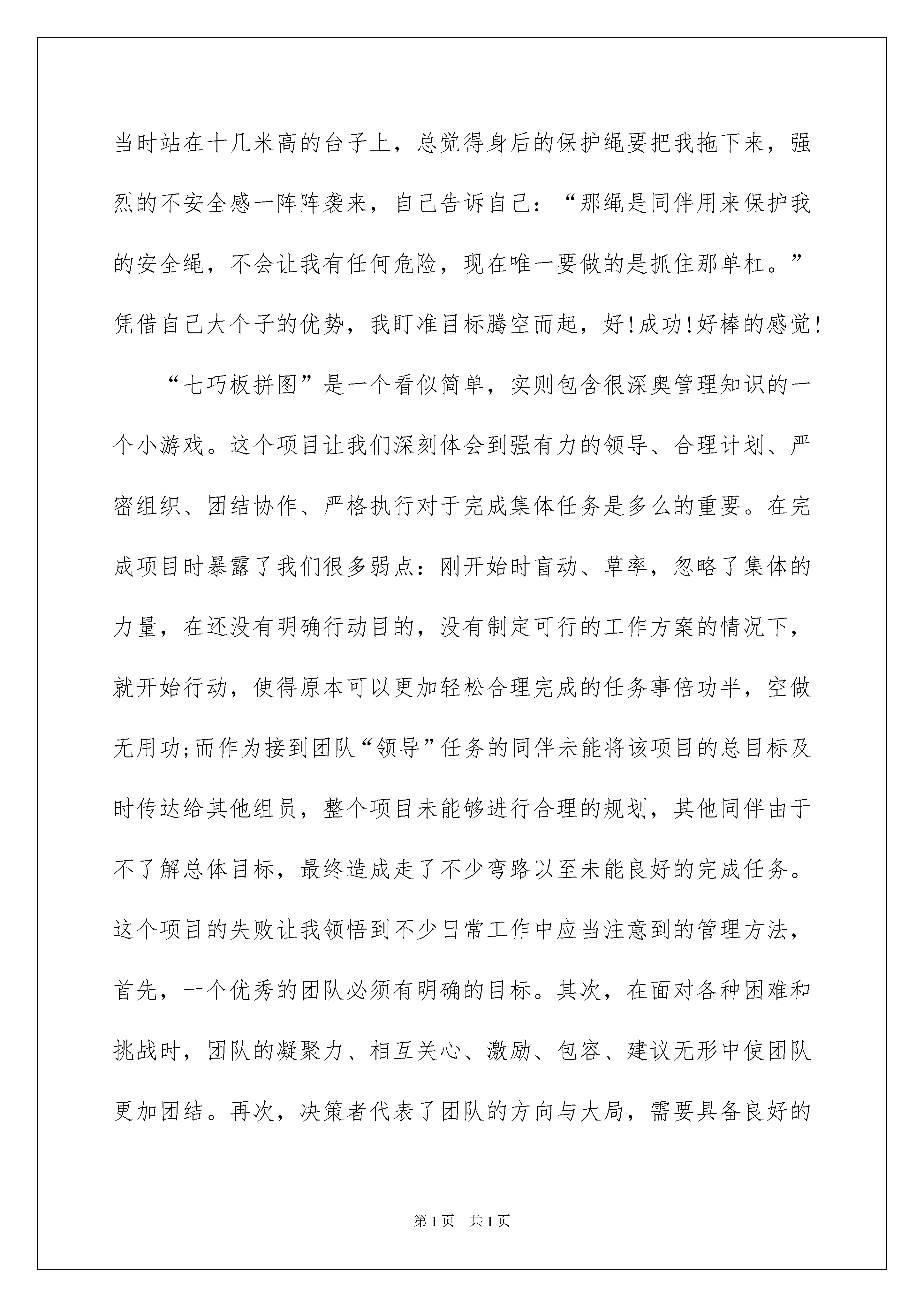 2022拓展训练心得体会(汇编15篇)拓展训练心得体会我们在一些事情上受到启发后,写一篇心得体会,记录下来,这样可以不断更新自己的想法。那么要如何写呢?以下是我为大家收集的拓展训练心得体会,仅供参考,大家一起来看看吧。拓展训练心得体会1xxxx年6月初,政治工作部接受了一项光荣的任务,组织一次拓展训练,让员工在拓展中体会:个人力量的渺小,团队力量的强大。渺小的力量只有联合起来,众志成城,才能战无不胜。只有摒弃“小我”,团结协作,才能让“大我”在人性的光辉中升华。为了达到拓展目的,我们经过多方对比咨询,最终选择了北京拓展市场最有实力的人众人公司作为本次活动的合作伙伴。沿着“突出‘团队建设’的主题,以各种团队项目贯穿始终;穿插个人挑战项目,让员工在新的环境下发挥其优势,激发其潜能,完成自我的认知及定位;以经典项目为首选,给员工带来体验式培训的全新感受,并使员工在培训过程中收获更多;在团队热身环节和晨练过程中穿插团队小游戏,以活跃气氛;结束曲用大型团队整体项目,让员工体会大团队融合带来的震撼与感动。”的活动思路,最终确定了背摔、天梯、空中单杠、七巧板、鼓动人心等为主要项目的活动方案。x月xx日,天空布满彩云,象一把巨大无比的伞遮住了夏日骄阳过分的热情,我们一行xx人愉快地乘上了开往人众人青龙湖训练基地的大巴。人众人公司给我们安排的培训师是最有经验且德高望众的钟老师。我们的训练是从“同心杆”开始的,要求xx位同事一字站开,将右手食指伸于身体右侧,12根手指托起一根竹竿,在身体不倾斜的情况下,把竹竿下降到腰部。“同心杆”是我第一次听说,想来应该是一件很容易完成的项目。随着“开始”声起,每个人都紧张起来。结果是出人意料的,同心杆没有朝着目标的方向走,而是在向上升,队员越认真,杆子升得越快。为什么会这样?经过仔细思量,个人认为失败的原因有二:一是大家“不同心”,“小我”在作怪。因为每个人都害怕犯规,都觉得只要自己不犯规至少此次的失败不会由自己承担,没有考虑到这是一项需要抛开自我,服从大局才能顺利完成的项目。二是大家“没同行”,力量不同步。当所有成员认识到行动的方向后,却没能在同一时间步调一致地行动,认为自己的力量很渺小,不会影响大局。殊不知,正是个人那点渺小的力量让同心杆向相反的方向运动的。游戏是这样,单位的工作不也正如这个“同心杆”吗?如果大家在工作中都只局限于自己不犯错,或者劲没往一块使,那效果可能就是相反的。这也是公司领导反复强调大力推行“人性化”管理,强化公司团结协作的目的所在。爬天梯活动让我体会到了同伴的鼓励是多么的重要。当我和搭档终于站到最高的一节天梯的时候我有点佩服自己,但更多的是佩服搭档。因为在快要到达终点的时候,离地很远,总觉得眼前有点发虚,对能否再上一层有点没信心,这时听到同伴说:放心,有我呢!于是心定了下来,虚晃和胆怯没了,又勇敢地向上伸出手。爬天梯需要鼓励,工作也需要鼓励。当我们遇到困难时,鼓励常常是最好的原动力。获得原动力并不复杂,有时是一句催人奋进的话,有时只是一个信任坚定的眼神。所有项目中最让个人骄傲的是完成了空中单杠项目。要知道,许多男同胞都没抓住那又高又远的小铁杆。当然,项目总结时才知道,本项目成功的标志并不是抓住单杠,只要敢从高台上跳下来就是成功。当时站在十几米高的台子上,总觉得身后的保护绳要把我拖下来,强烈的不安全感一阵阵袭来,自己告诉自己:“那绳是同伴用来保护我的安全绳,不会让我有任何危险,现在唯一要做的是抓住那单杠。”凭借自己大个子的优势,我盯准目标腾空而起,好!成功!好棒的感觉!“七巧板拼图”是一个看似简单,实则包含很深奥管理知识的一个小游戏。这个项目让我们深刻体会到强有力的领导、合理计划、严密组织、团结协作、严格执行对于完成集体任务是多么的重要。在完成项目时暴露了我们很多弱点:刚开始时盲动、草率,忽略了集体的力量,在还没有明确行动目的,没有制定可行的工作方案的情况下,就开始行动,使得原本可以更加轻松合理完成的任务事倍功半,空做无用功;而作为接到团队“领导”任务的同伴未能将该项目的总目标及时传达给其他组员,整个项目未能够进行合理的规划,其他同伴由于不了解总体目标,最终造成走了不少弯路以至未能良好的完成任务。这个项目的失败让我领悟到不少日常工作中应当注意到的管理方法,首先,一个优秀的团队必须有明确的目标。其次,在面对各种困难和挑战时,团队的凝聚力、相互关心、激励、包容、建议无形中使团队更加团结。再次,决策者代表了团队的方向与大局,需要具备良好的分析能力、判断能力、决策能力、大局意识与团队意识。通过拓展活动,我感悟到所谓团队精神,是指团队成员为了