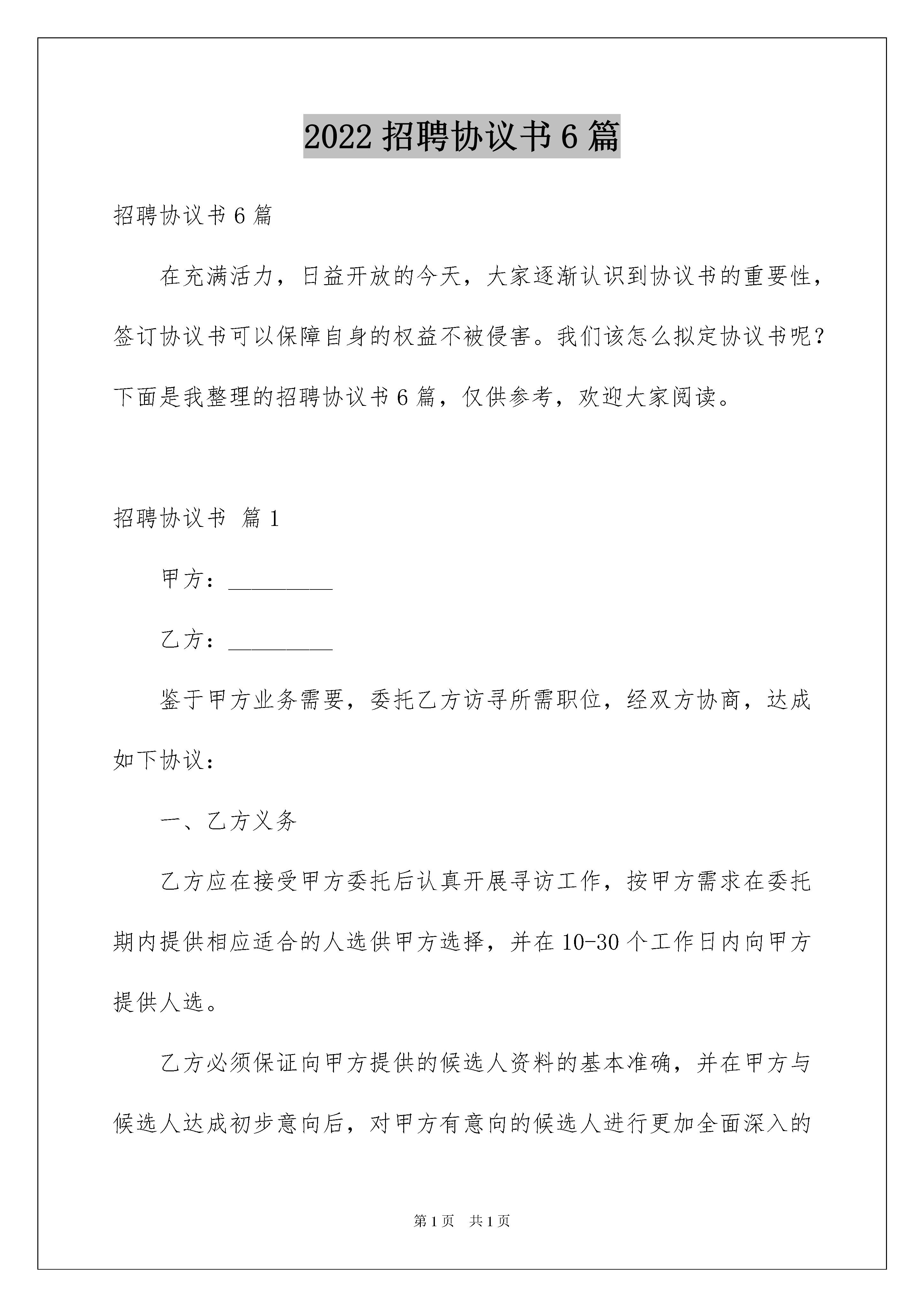 2022招聘协议书6篇招聘协议书6篇在充满活力,日益开放的今天,大家逐渐认识到协议书的重要性,签订协议书可以保障自身的权益不被侵害。我们该怎么拟定协议书呢?下面是我整理的招聘协议书6篇,仅供参考,欢迎大家阅读。招聘协议书篇1甲方:_________乙方:_________鉴于甲方业务需要,委托乙方访寻所需职位,经双方协商,达成如下协议:一、乙方义务乙方应在接受甲方委托后认真开展寻访工作,按甲方需求在委托期内提供相应适合的人选供甲方选择,并在10-30个工作日内向甲方提供人选。乙方必须保证向甲方提供的候选人资料的基本准确,并在甲方与候选人达成初步意向后,对甲方有意向的候选人进行更加全面深入的调查,确保其背景、工作经历、工作业绩的真实性,合法性和准确性。乙方应及时将访寻工作情况及进展与甲方沟通,对寻访过程中可能出现的困难和新问题应及时与甲方协商对策。乙方保证对在合作过程中接触和了解到的甲方任何商业,技术资料及员工信息进行保密,该保密责任在协议因正常原因终止或期满后都继续存在。乙方推荐的人选被甲方录用后,如仍在甲方任职,半年内乙方不得再将此人推荐给另一公司。二、甲方义务甲方应按乙方要求提供所需的职位需求信息,并保证寻猎职位信息的真实性;如在委托期内,寻猎需求有任何更改应及时通知乙方。甲方在收到乙方提交的候选人资料后,应在5个工作日内通知乙方是否要求候选人面试,如果需要,应及时告知面试的时间和地点;或者通知乙方是否需要补充候选人其他方面的资料。甲方在面试完每位候选人后,应尽快告之乙方面试结果,以避免因延误反馈情况而给乙方及候选人带来不便。如甲方准备与乙方所推荐的候选人签定聘用合同,应在5个工作日内将所聘人员职位,年薪等情况以书面形式通知乙方。甲方按照本协议约定向乙方支付服务费。甲方不能利用乙方推荐的人选及资料私下录用候选人。三、服务费支付自签定合同甲方必须在两个工作日内一次性支付委托招聘服务费_________元/月给乙方,以此类推。四、违约责任双方如有一方违约,违约方必须支付给被违约方应付金额的_________倍。五、其他本协议委托服务期限自_________年_________月_________日起至_________年_________月_________日。签订合同之双方均对本合同内容完全了解并无异议。双方将遵守本合同中所有条款。未尽事宜经双方协商一致后可追加补充协议。对本协议的任何修改,更正或放弃,都须书面进行,且经协议双方签字认可。本协议一式二份,甲方两份,乙方一份,经双方单位盖章并双方授权代表签字后生效。委托期满后,双方可以进一步协商续约事宜。甲方(盖章):_________乙方(盖章):_______代表人(签字):_______代表人(签字):_____地址:_________________地址:_______________邮编:_________________邮编:________________________年____月____日_______年____月____日签订地点:_____________签订地点:___________招聘协议书篇2招聘方(简称甲方):受聘方(简称乙方):根据《中华人民共和国劳动法》和有关劳动政策法规,甲乙双方在平等自愿、协商一致的基础上签订本协议。第一条:协议期限协议生效期限为___个月,从____年____月____日起至____年____月____日止。第二条:工作内容1、甲方以招聘形式选择乙方,乙方自愿形式到甲方工作。2、乙方负责餐厅、厨房安全、防火、卫生工作,不得有外人随意出入厨房重地,否则一经发现甲方有权对乙方进行经济处罚。3、乙方负责厨房食品的安全卫生,不得发生食品中毒等事件,如发生食品中毒等事件由乙方负责。卫生防疫部门来检查,如果达不到卫生防疫部门要求,乙方及按要求改正,并对所造成的一切损失承担责任。(硬件设施除外)4、乙方在工作期间应尽职尽责,在菜品,食品花样上不断推陈出新,满足不同顾客的要求。5、乙方努力提高自身素质,在工作中爱护设备、节约能源,避免浪费。做出物美价廉,搭配合理,营养丰富,色、香、味俱全的高品质菜品。第三条:劳动纪律1、甲方应根据《劳动法》和有关规定,制定本酒店各项具体规章制度。2、乙方应遵守国家法律、法规和甲方依法制定的各项规章制度;严格遵守劳动安全卫生,操作规程和工作规范;爱护甲方财产,遵守职业道德保护商业秘密;服从甲方的管理和教育。3、乙方违反劳动纪律,甲方可依据国家法律、法规和本酒店相关规章制度,给予纪律处分、经济处分,直至解除劳动协议。第四条:劳动报酬1、乙方月工资为:_