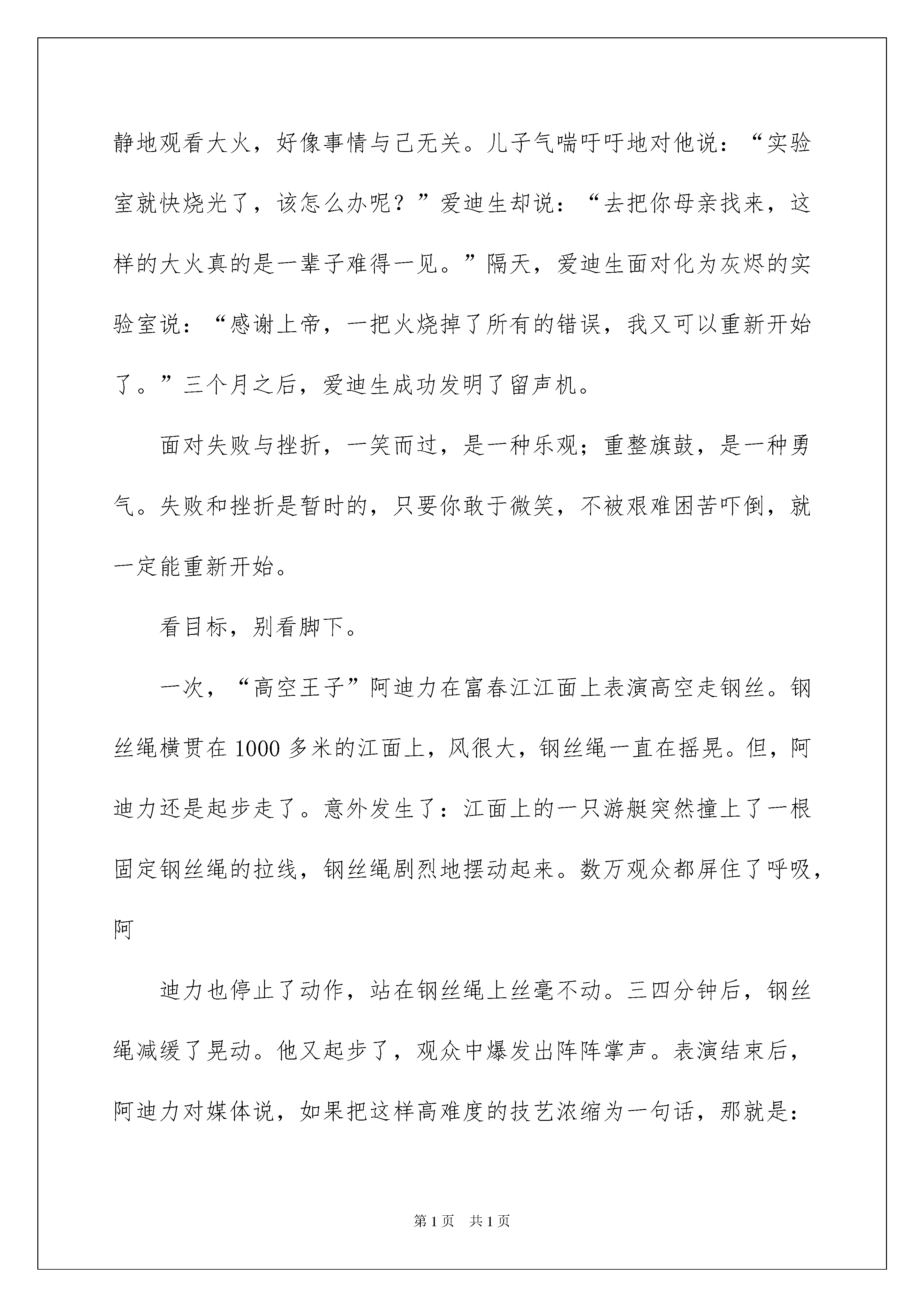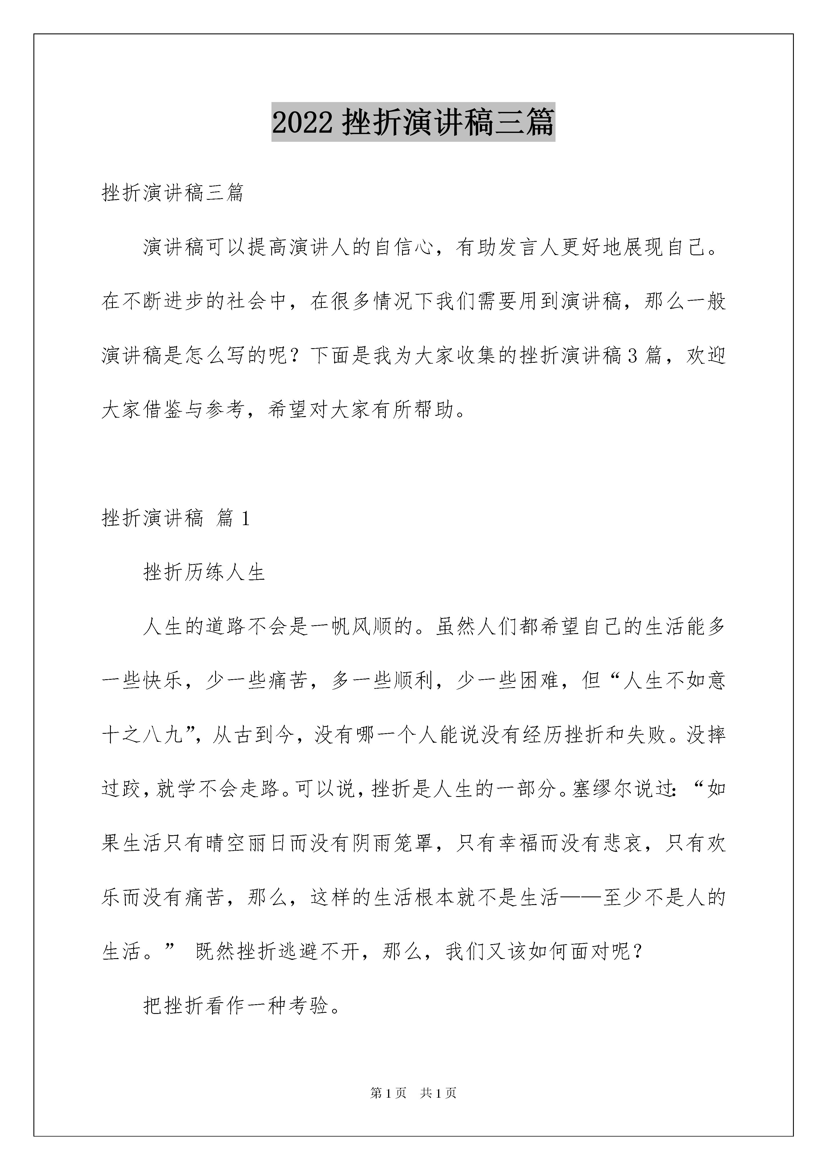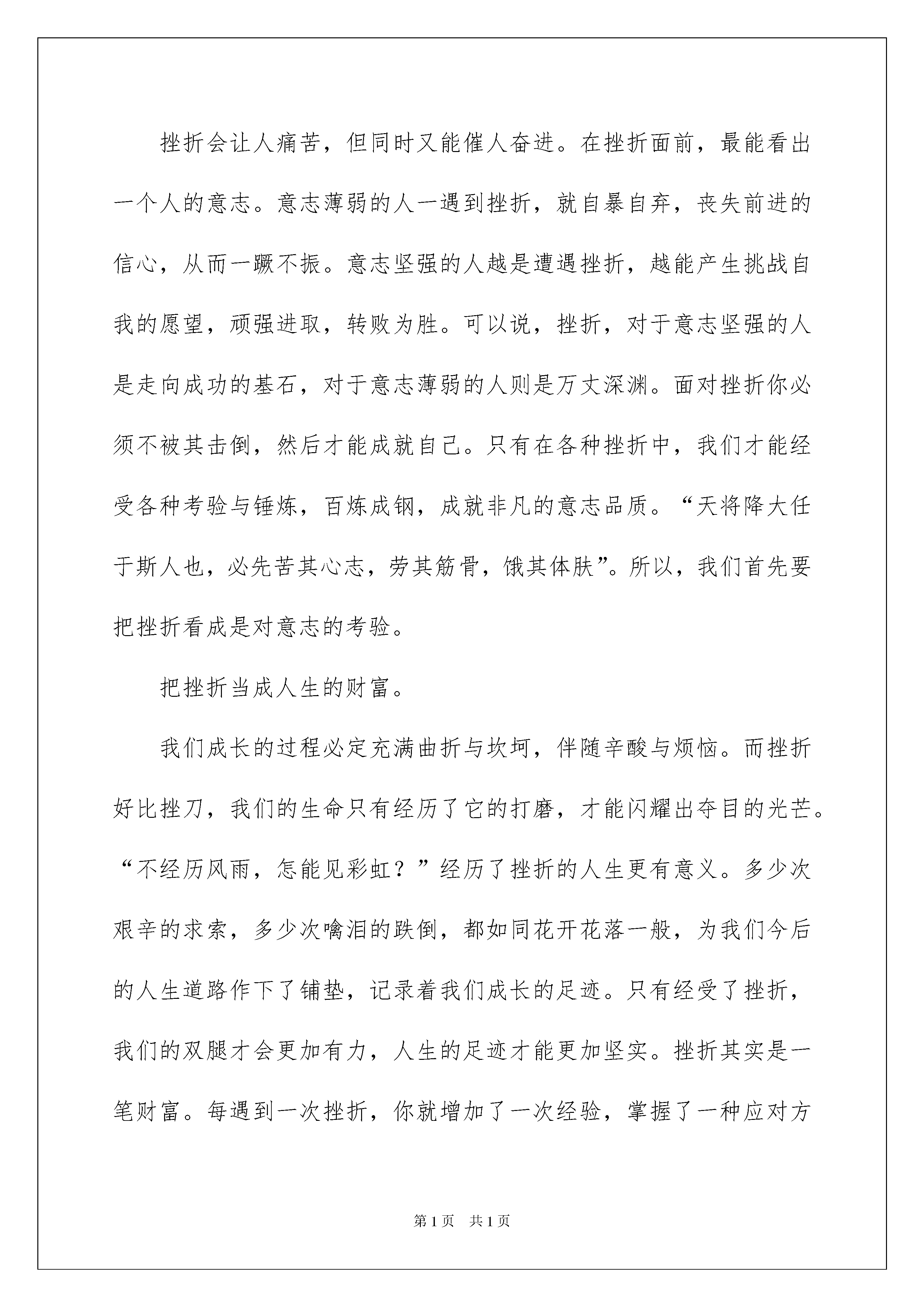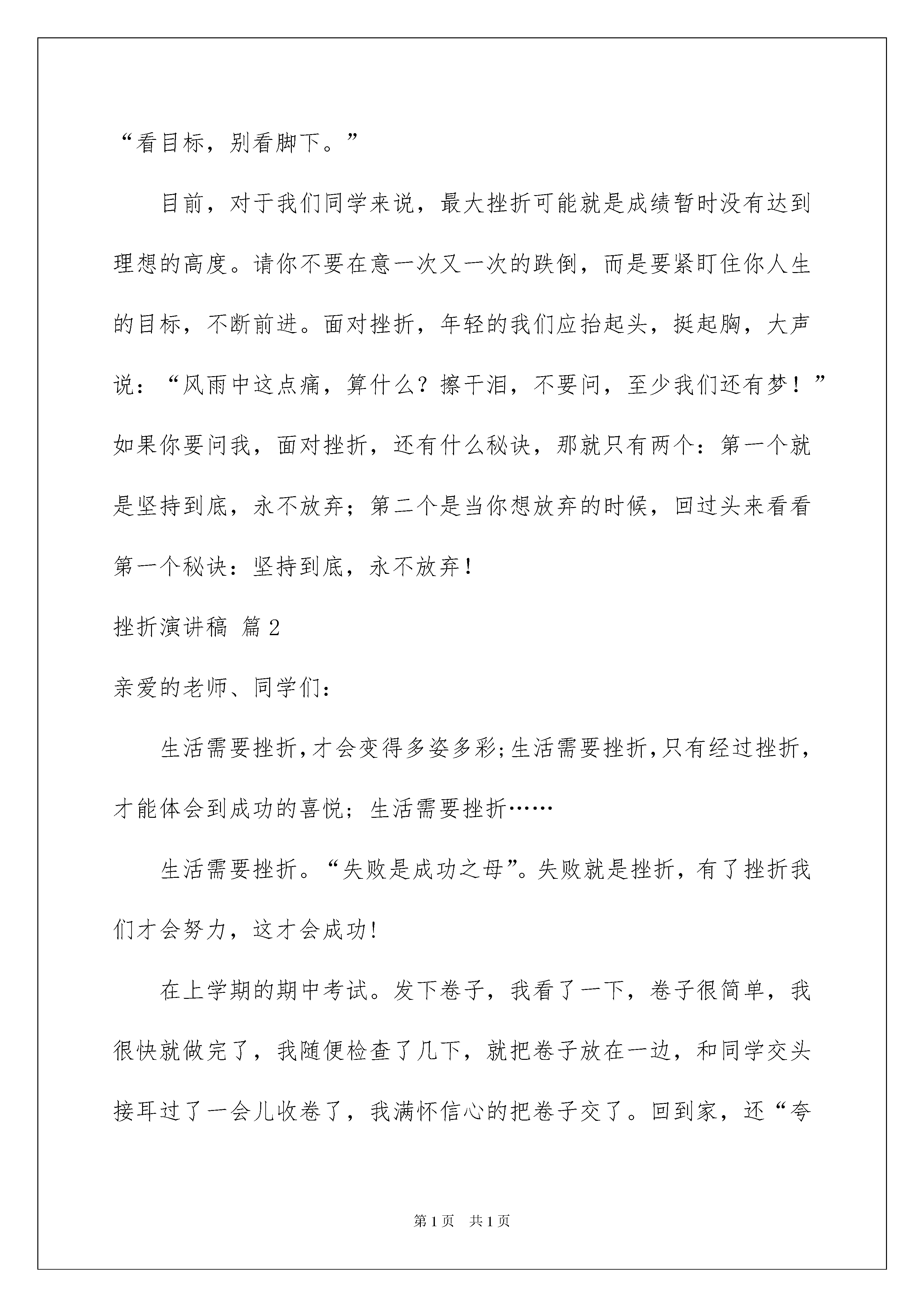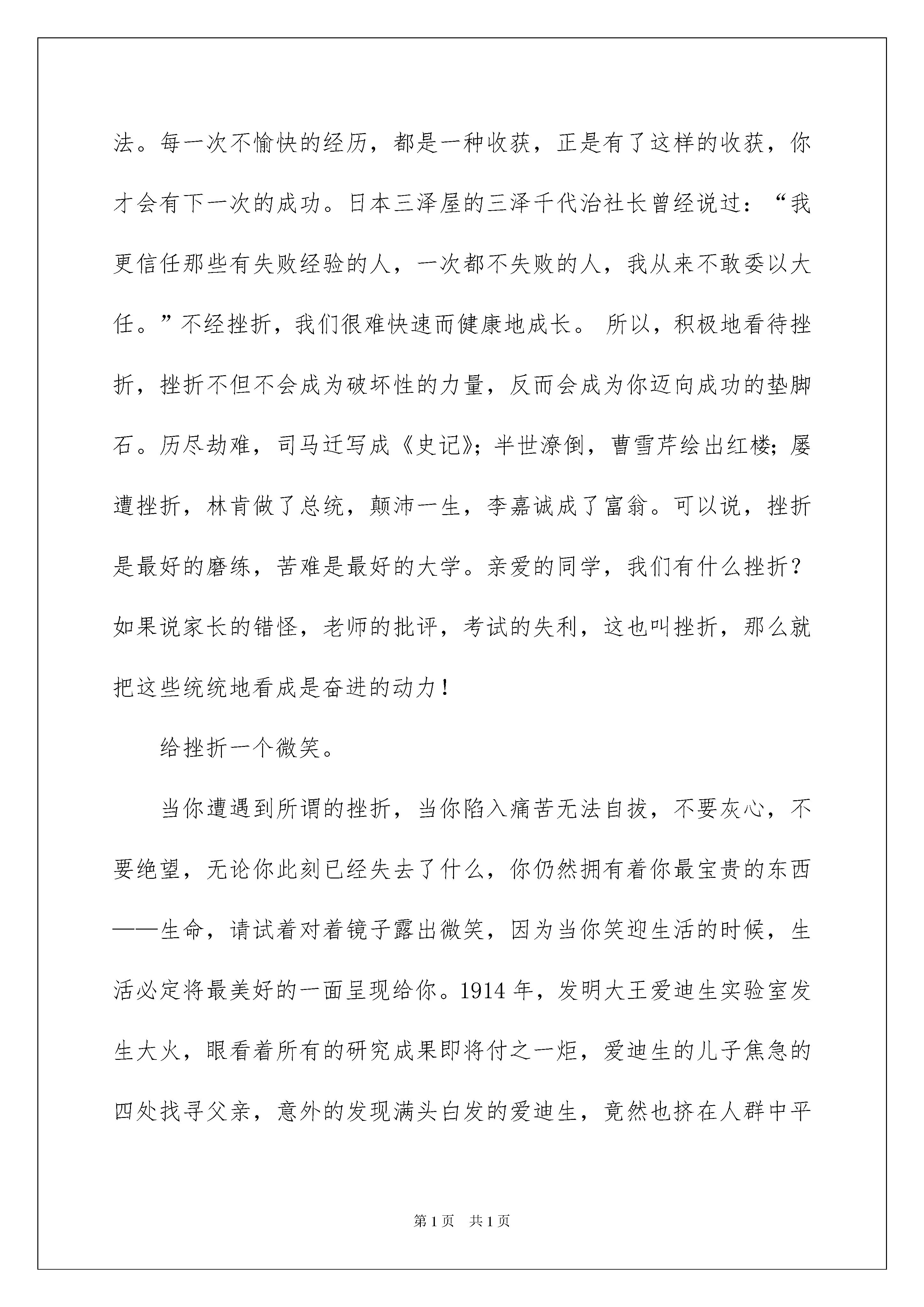 2022挫折演讲稿三篇挫折演讲稿三篇演讲稿可以提高演讲人的自信心,有助发言人更好地展现自己。在不断进步的社会中,在很多情况下我们需要用到演讲稿,那么一般演讲稿是怎么写的呢?下面是我为大家收集的挫折演讲稿3篇,欢迎大家借鉴与参考,希望对大家有所帮助。挫折演讲稿篇1挫折历练人生人生的道路不会是一帆风顺的。虽然人们都希望自己的生活能多一些快乐,少一些痛苦,多一些顺利,少一些困难,但“人生不如意十之八九”,从古到今,没有哪一个人能说没有经历挫折和失败。没摔过跤,就学不会走路。可以说,挫折是人生的一部分。塞缪尔说过:“如果生活只有晴空丽日而没有阴雨笼罩,只有幸福而没有悲哀,只有欢乐而没有痛苦,那么,这样的生活根本就不是生活——至少不是人的生活。”既然挫折逃避不开,那么,我们又该如何面对呢?把挫折看作一种考验。挫折会让人痛苦,但同时又能催人奋进。在挫折面前,最能看出一个人的意志。意志薄弱的人一遇到挫折,就自暴自弃,丧失前进的信心,从而一蹶不振。意志坚强的人越是遭遇挫折,越能产生挑战自我的愿望,顽强进取,转败为胜。可以说,挫折,对于意志坚强的人是走向成功的基石,对于意志薄弱的人则是万丈深渊。面对挫折你必须不被其击倒,然后才能成就自己。只有在各种挫折中,我们才能经受各种考验与锤炼,百炼成钢,成就非凡的意志品质。“天将降大任于斯人也,必先苦其心志,劳其筋骨,饿其体肤”。所以,我们首先要把挫折看成是对意志的考验。把挫折当成人生的财富。我们成长的过程必定充满曲折与坎坷,伴随辛酸与烦恼。而挫折好比挫刀,我们的生命只有经历了它的打磨,才能闪耀出夺目的光芒。“不经历风雨,怎能见彩虹?”经历了挫折的人生更有意义。多少次艰辛的求索,多少次噙泪的跌倒,都如同花开花落一般,为我们今后的人生道路作下了铺垫,记录着我们成长的足迹。只有经受了挫折,我们的双腿才会更加有力,人生的足迹才能更加坚实。挫折其实是一笔财富。每遇到一次挫折,你就增加了一次经验,掌握了一种应对方法。每一次不愉快的经历,都是一种收获,正是有了这样的收获,你才会有下一次的成功。日本三泽屋的三泽千代治社长曾经说过:“我更信任那些有失败经验的人,一次都不失败的人,我从来不敢委以大任。”不经挫折,我们很难快速而健康地成长。所以,积极地看待挫折,挫折不但不会成为破坏性的力量,反而会成为你迈向成功的垫脚石。历尽劫难,司马迁写成《史记》;半世潦倒,曹雪芹绘出红楼;屡遭挫折,林肯做了总统,颠沛一生,李嘉诚成了富翁。可以说,挫折是最好的磨练,苦难是最好的大学。亲爱的同学,我们有什么挫折?如果说家长的错怪,老师的批评,考试的失利,这也叫挫折,那么就把这些统统地看成是奋进的动力!给挫折一个微笑。当你遭遇到所谓的挫折,当你陷入痛苦无法自拔,不要灰心,不要绝望,无论你此刻已经失去了什么,你仍然拥有着你最宝贵的东西——生命,请试着对着镜子露出微笑,因为当你笑迎生活的时候,生活必定将最美好的一面呈现给你。1914年,发明大王爱迪生实验室发生大火,眼看着所有的研究成果即将付之一炬,爱迪生的儿子焦急的四处找寻父亲,意外的发现满头白发的爱迪生,竟然也挤在人群中平静地观看大火,好像事情与己无关。儿子气喘吁吁地对他说:“实验室就快烧光了,该怎么办呢?”爱迪生却说:“去把你母亲找来,这样的大火真的是一辈子难得一见。”隔天,爱迪生面对化为灰烬的实验室说:“感谢上帝,一把火烧掉了所有的错误,我又可以重新开始了。”三个月之后,爱迪生成功发明了留声机。面对失败与挫折,一笑而过,是一种乐观;重整旗鼓,是一种勇气。失败和挫折是暂时的,只要你敢于微笑,不被艰难困苦吓倒,就一定能重新开始。看目标,别看脚下。一次,“高空王子”阿迪力在富春江江面上表演高空走钢丝。钢丝绳横贯在1000多米的江面上,风很大,钢丝绳一直在摇晃。但,阿迪力还是起步走了。意外发生了:江面上的一只游艇突然撞上了一根固定钢丝绳的拉线,钢丝绳剧烈地摆动起来。数万观众都屏住了呼吸,阿迪力也停止了动作,站在钢丝绳上丝毫不动。三四分钟后,钢丝绳减缓了晃动。他又起步了,观众中爆发出阵阵掌声。表演结束后,阿迪力对媒体说,如果把这样高难度的技艺浓缩为一句话,那就是:“看目标,别看脚下。”目前,对于我们同学来说,最大挫折可能就是成绩暂时没有达到理想的高度。请你不要在意一次又一次的跌倒,而是要紧盯住你人生的目标,不断前进。面对挫折,年轻的我们应抬起头,挺起胸,大声说:“风雨中这点痛,算什么?擦干泪,不要问,至少我们还有梦!”如果你要问我,面对挫折,还有什么秘诀,那就只有两个:第一个就是坚持到底,永不放弃;第二个是当你想放弃的时候,回过头来看看第一个秘诀