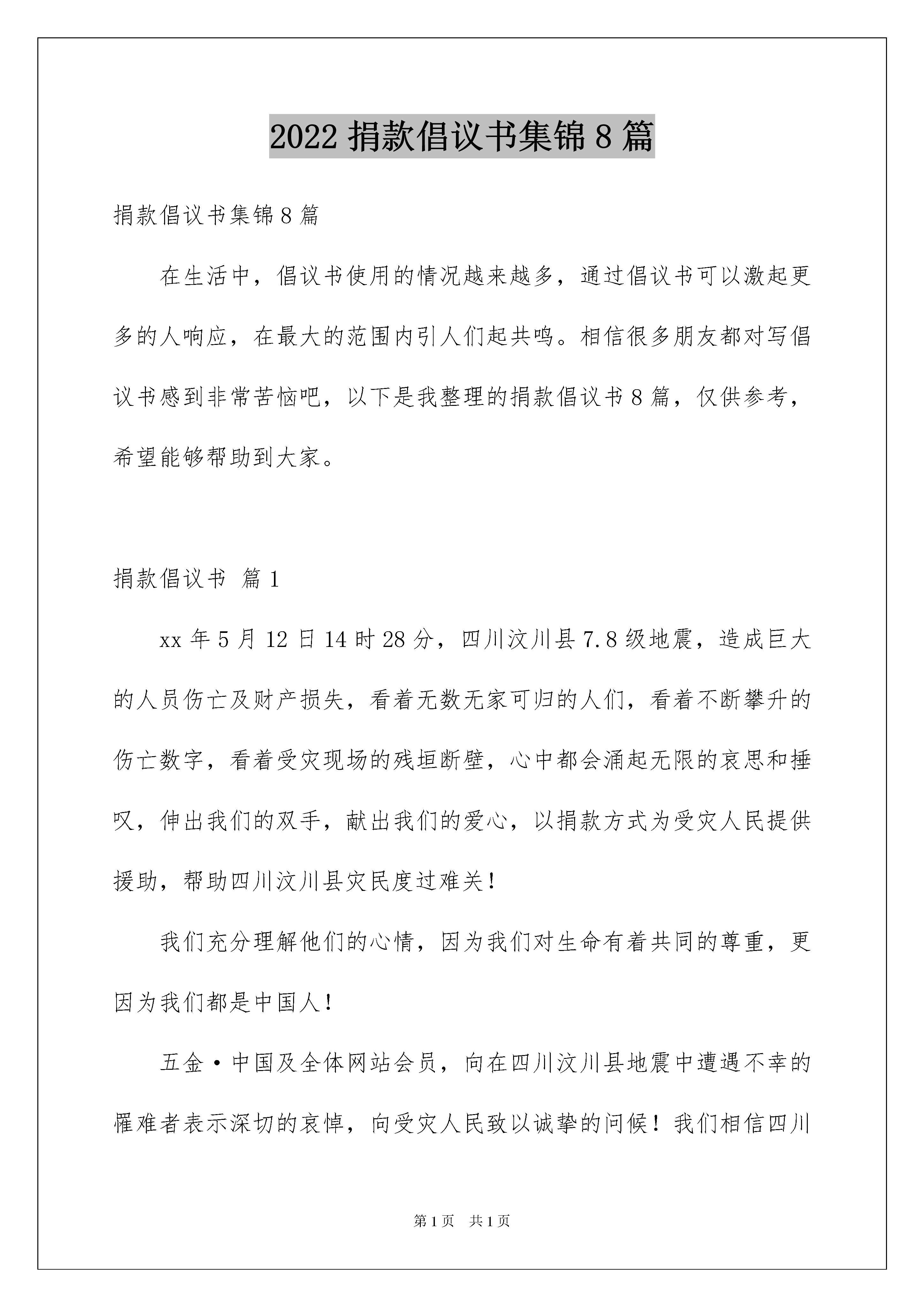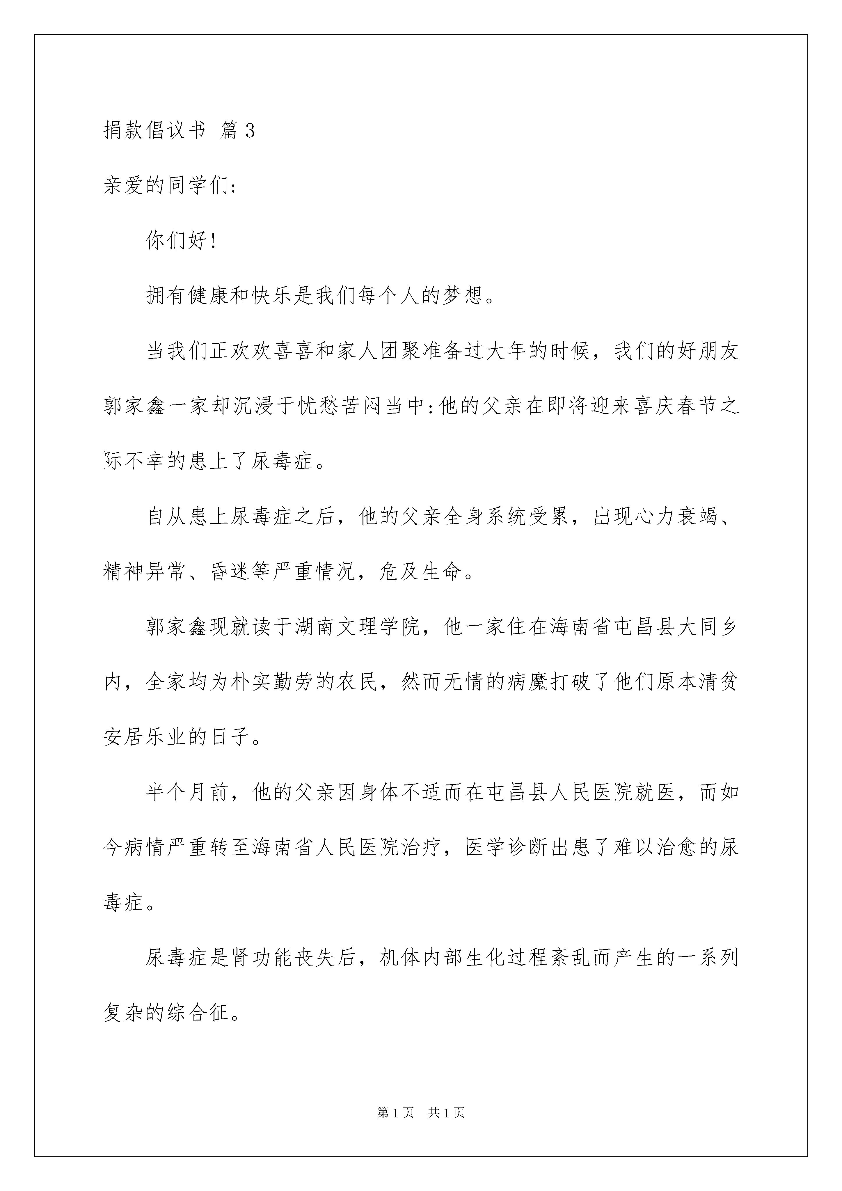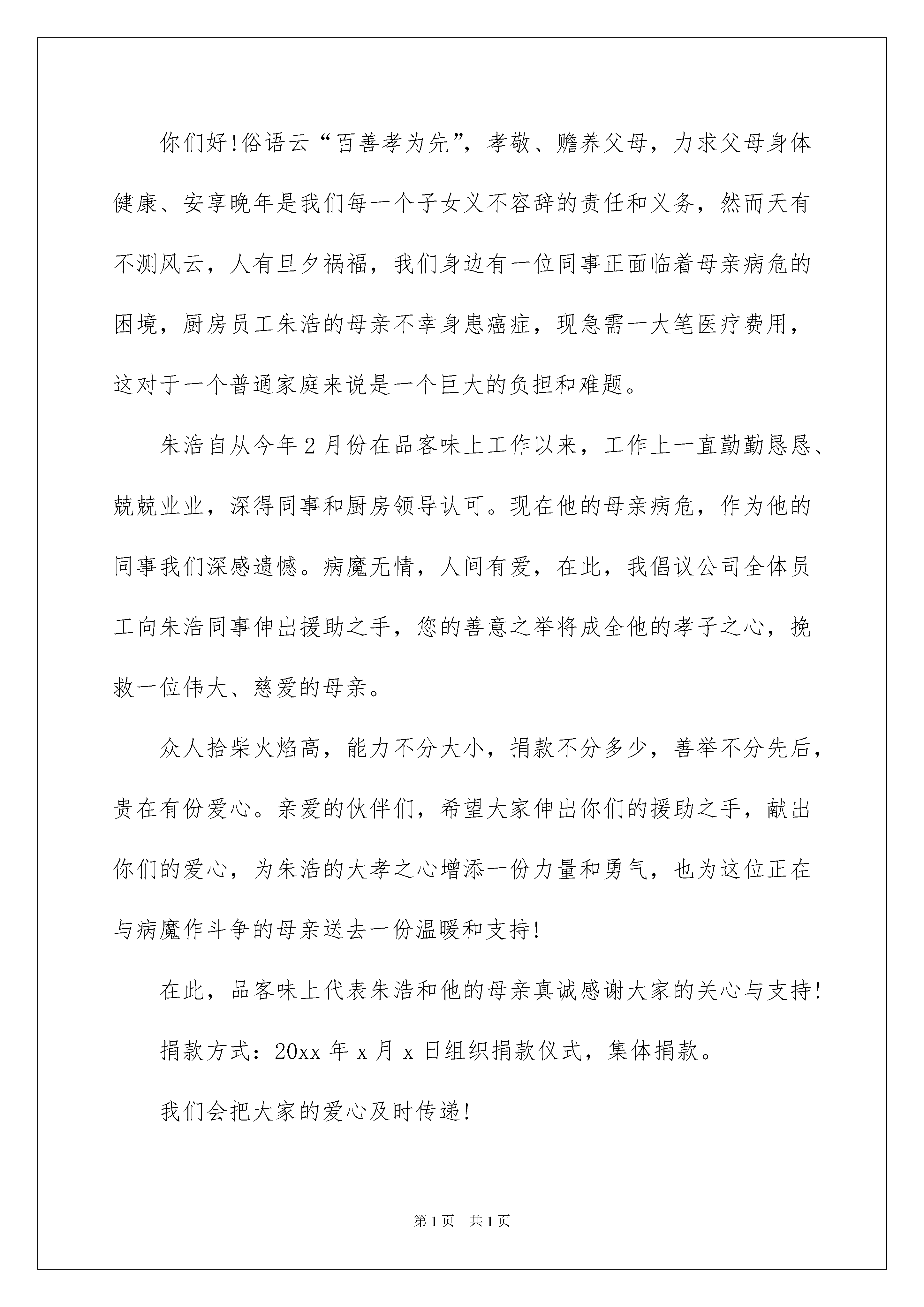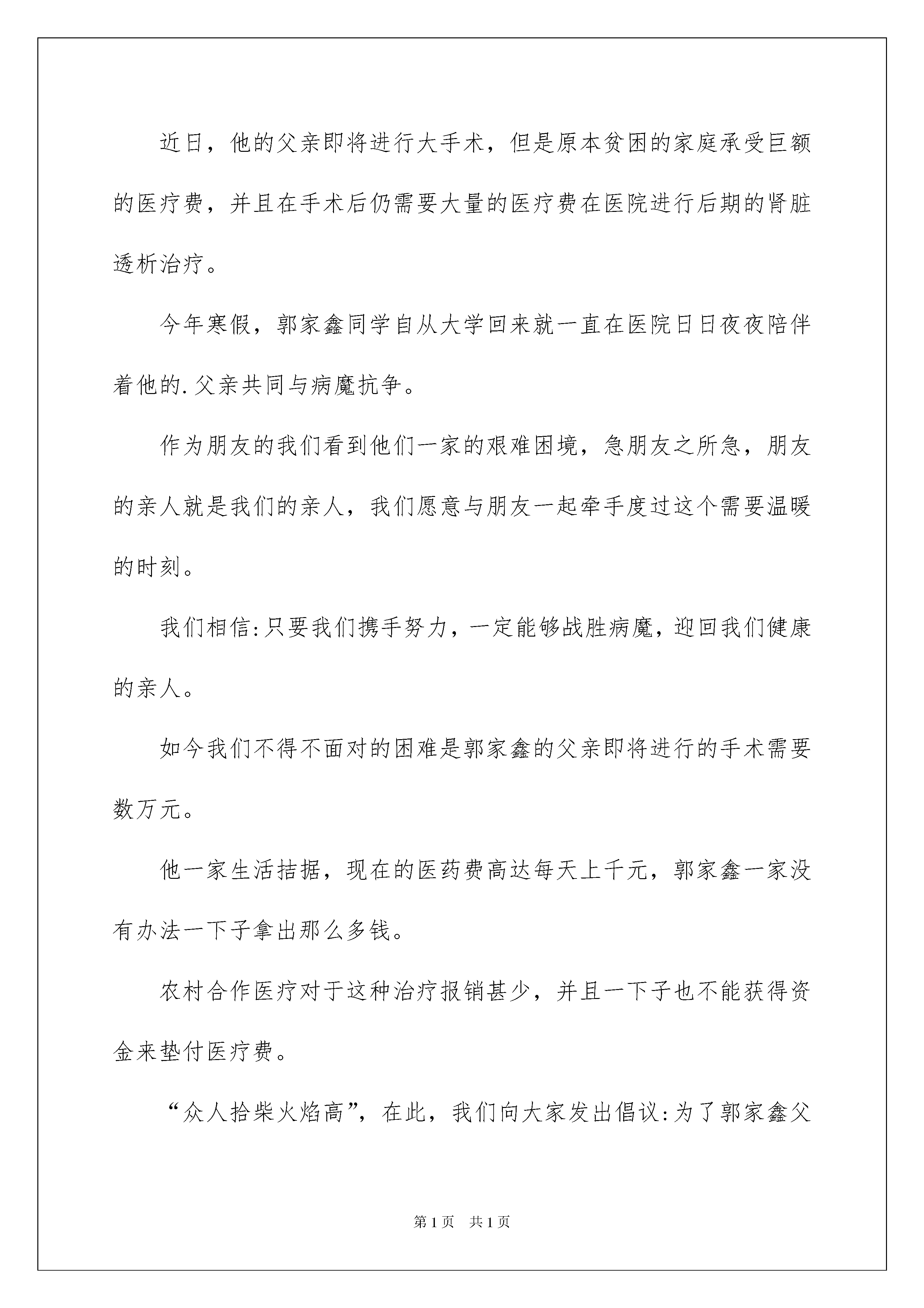 2022捐款倡议书集锦8篇捐款倡议书集锦8篇在生活中,倡议书使用的情况越来越多,通过倡议书可以激起更多的人响应,在最大的范围内引人们起共鸣。相信很多朋友都对写倡议书感到非常苦恼吧,以下是我整理的捐款倡议书8篇,仅供参考,希望能够帮助到大家。捐款倡议书篇1xx年5月12日14时28分,四川汶川县7.8级地震,造成巨大的人员伤亡及财产损失,看着无数无家可归的人们,看着不断攀升的伤亡数字,看着受灾现场的残垣断壁,心中都会涌起无限的哀思和捶叹,伸出我们的双手,献出我们的爱心,以捐款方式为受灾人民提供援助,帮助四川汶川县灾民度过难关!我们充分理解他们的心情,因为我们对生命有着共同的尊重,更因为我们都是中国人!五金·中国及全体网站会员,向在四川汶川县地震中遭遇不幸的罹难者表示深切的哀悼,向受灾人民致以诚挚的问候!我们相信四川汶川县人民一定会战胜这次地震带来的困难,重新建立美好的家园!灾区人民需要我们的无私帮助,灾区人民需要我们的温暖爱心。自然灾害突然其来,地震无情人有情,请伸出我们善待和谐的双手,献出我们善待和谐的爱心,让我们与灾区人民携手同心、众志成城,共渡难关,抗震救灾,早日重建和谐家园!““一方有难,八方支援”,是中华民族的传统美德,看到满目疮痍的灾区,看到摆满遇难群众遗体的广场,我们怎么能无动于衷?为响应各级政府号召帮助灾区群众渡过难关,让我们积极行动起来,向灾区群众伸出援助之手,踊跃捐款,奉献爱心。涓滴之水,终能汇流成河,捐赠不论多少,善举不分先后,只要人人都献出一点爱,哪怕仅仅是一元钱,我们的爱心善举,也一定能够汇成爱的暖流,流进灾区群众的心田,让我们与灾区人民风雨同舟,心手相连,共渡难关!倡议人:日期:20xx年xx月xx日捐款倡议书篇2全体同事们:你们好!俗语云“百善孝为先”,孝敬、赡养父母,力求父母身体健康、安享晚年是我们每一个子女义不容辞的责任和义务,然而天有不测风云,人有旦夕祸福,我们身边有一位同事正面临着母亲病危的困境,厨房员工朱浩的母亲不幸身患癌症,现急需一大笔医疗费用,这对于一个普通家庭来说是一个巨大的负担和难题。朱浩自从今年2月份在品客味上工作以来,工作上一直勤勤恳恳、兢兢业业,深得同事和厨房领导认可。现在他的母亲病危,作为他的同事我们深感遗憾。病魔无情,人间有爱,在此,我倡议公司全体员工向朱浩同事伸出援助之手,您的善意之举将成全他的孝子之心,挽救一位伟大、慈爱的母亲。众人拾柴火焰高,能力不分大小,捐款不分多少,善举不分先后,贵在有份爱心。亲爱的伙伴们,希望大家伸出你们的援助之手,献出你们的爱心,为朱浩的大孝之心增添一份力量和勇气,也为这位正在与病魔作斗争的母亲送去一份温暖和支持!在此,品客味上代表朱浩和他的母亲真诚感谢大家的关心与支持!捐款方式:20xx年x月x日组织捐款仪式,集体捐款。我们会把大家的爱心及时传递!捐款倡议书篇3亲爱的同学们:你们好!拥有健康和快乐是我们每个人的梦想。当我们正欢欢喜喜和家人团聚准备过大年的时候,我们的好朋友郭家鑫一家却沉浸于忧愁苦闷当中:他的父亲在即将迎来喜庆春节之际不幸的患上了尿毒症。自从患上尿毒症之后,他的父亲全身系统受累,出现心力衰竭、精神异常、昏迷等严重情况,危及生命。郭家鑫现就读于湖南文理学院,他一家住在海南省屯昌县大同乡内,全家均为朴实勤劳的农民,然而无情的病魔打破了他们原本清贫安居乐业的日子。半个月前,他的父亲因身体不适而在屯昌县人民医院就医,而如今病情严重转至海南省人民医院治疗,医学诊断出患了难以治愈的尿毒症。尿毒症是肾功能丧失后,机体内部生化过程紊乱而产生的一系列复杂的综合征。近日,他的父亲即将进行大手术,但是原本贫困的家庭承受巨额的医疗费,并且在手术后仍需要大量的医疗费在医院进行后期的肾脏透析治疗。今年寒假,郭家鑫同学自从大学回来就一直在医院日日夜夜陪伴着他的.父亲共同与病魔抗争。作为朋友的我们看到他们一家的艰难困境,急朋友之所急,朋友的亲人就是我们的亲人,我们愿意与朋友一起牵手度过这个需要温暖的时刻。我们相信:只要我们携手努力,一定能够战胜病魔,迎回我们健康的亲人。如今我们不得不面对的困难是郭家鑫的父亲即将进行的手术需要数万元。他一家生活拮据,现在的医药费高达每天上千元,郭家鑫一家没有办法一下子拿出那么多钱。农村合作医疗对于这种治疗报销甚少,并且一下子也不能获得资金来垫付医疗费。“众人拾柴火焰高”,在此,我们向大家发出倡议:为了郭家鑫父亲早日康复,奉献我们自己的一份爱心。快过年了,希望每个人都能过上一个好年,希望每一个家庭都快乐安康。最后祝愿郭家鑫的父亲早日康复,也祝愿大家春节快乐,合家团圆。此致敬