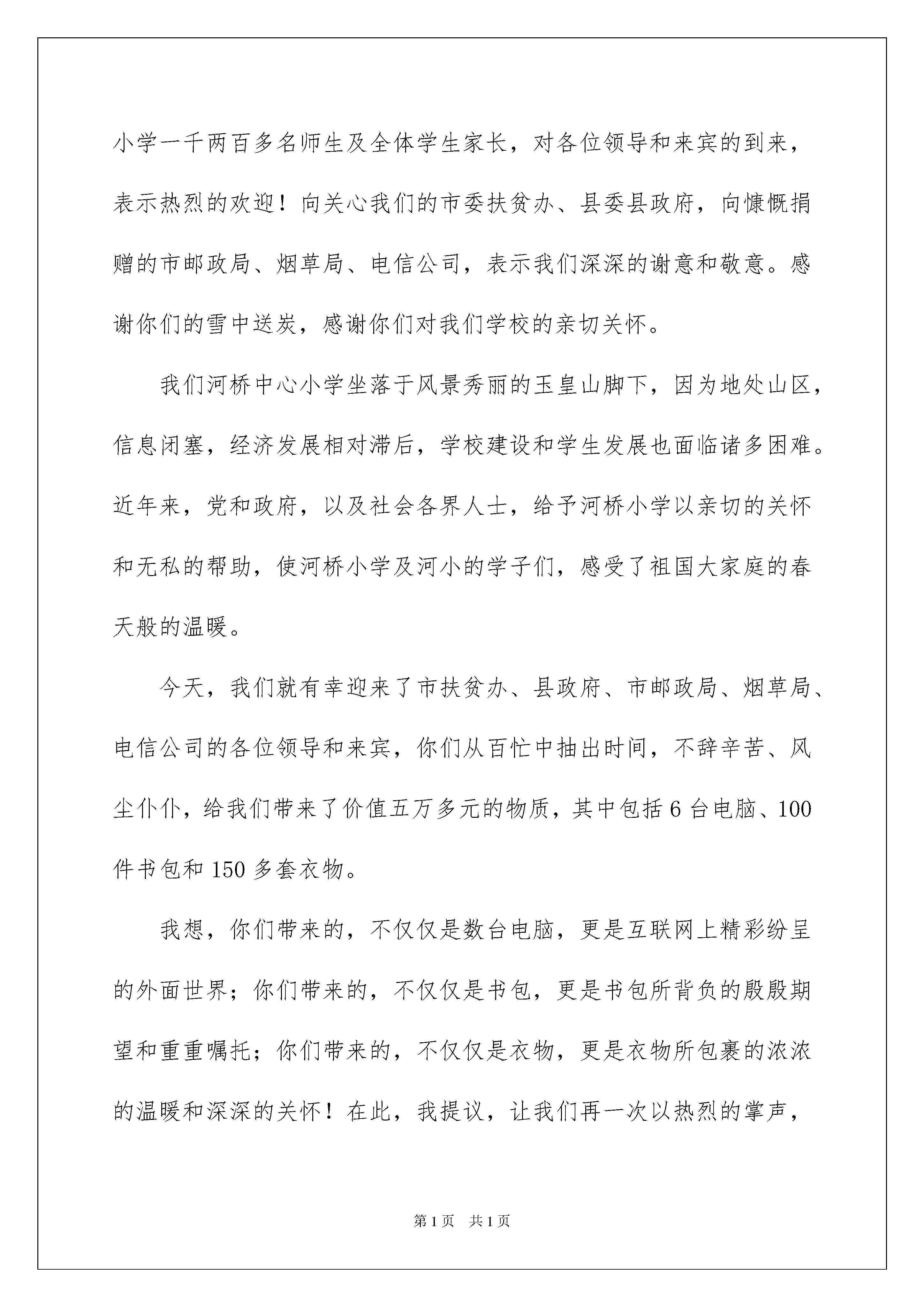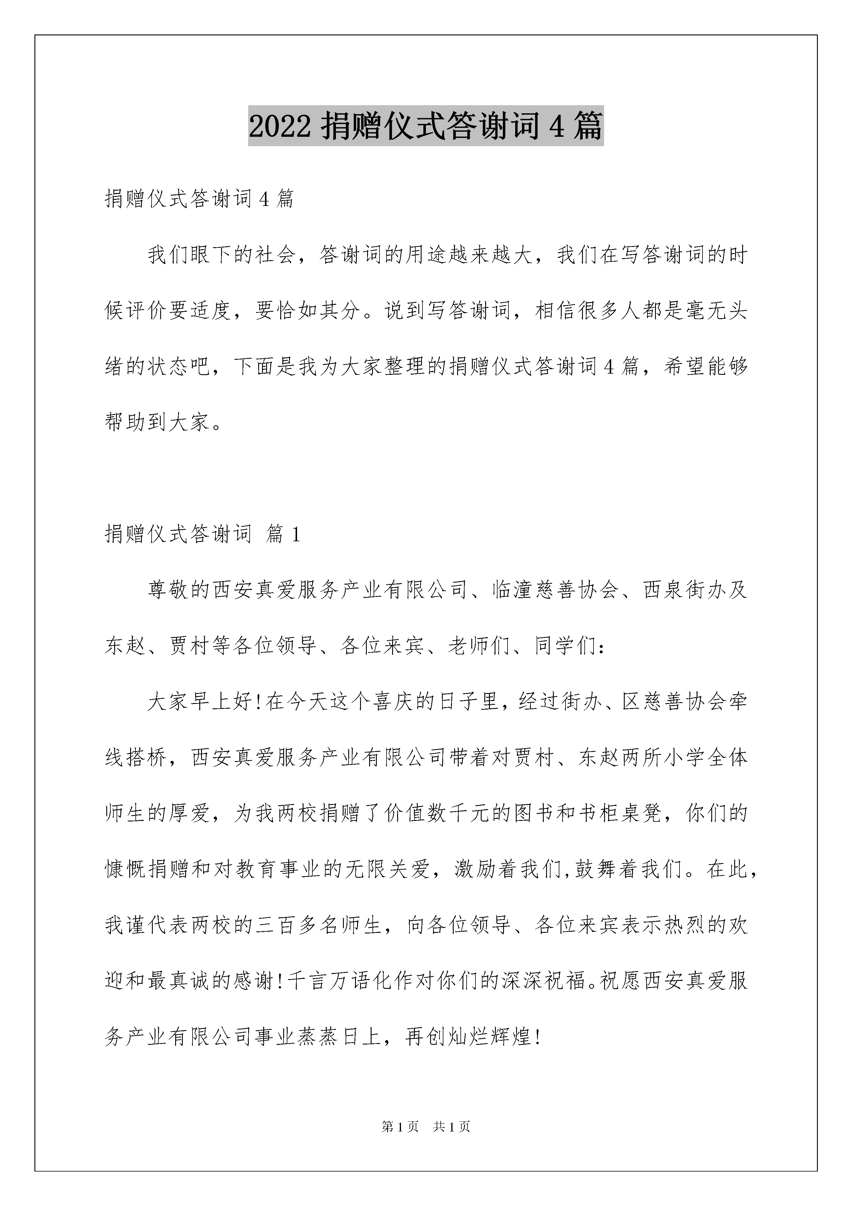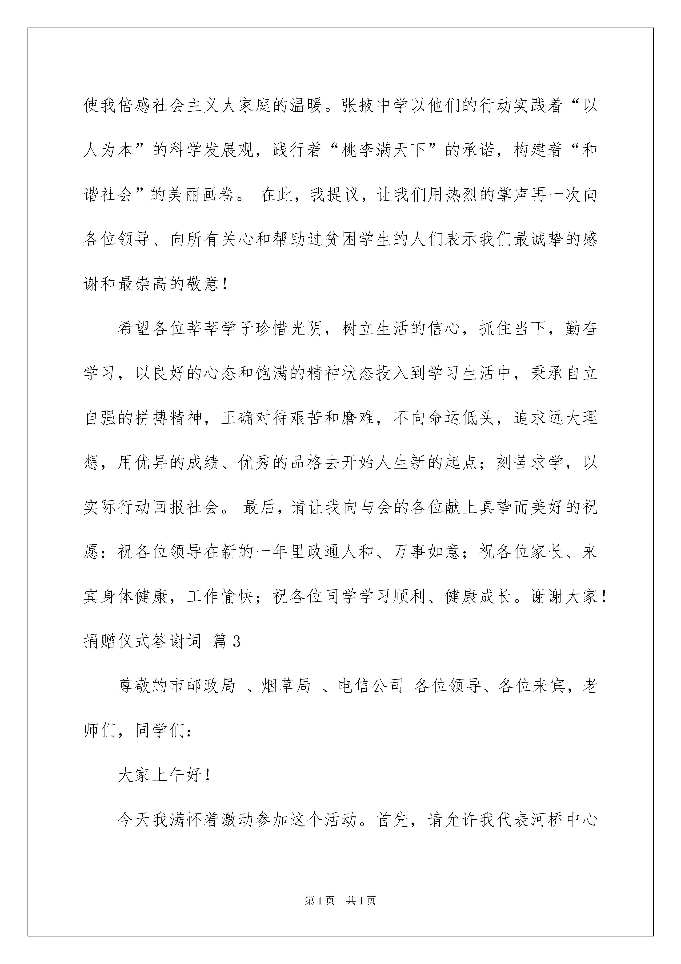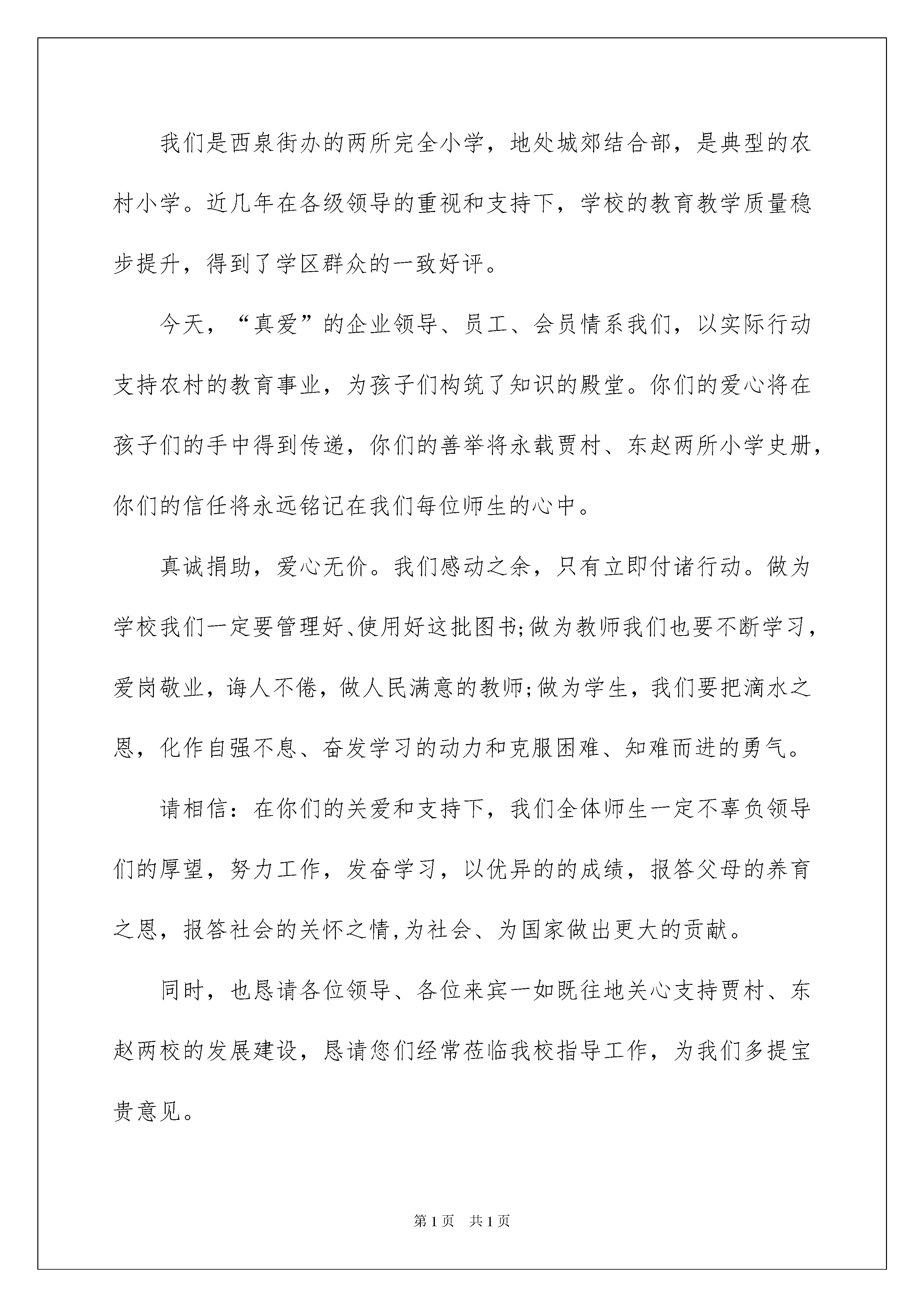 2022捐赠仪式答谢词4篇捐赠仪式答谢词4篇我们眼下的社会,答谢词的用途越来越大,我们在写答谢词的时候评价要适度,要恰如其分。说到写答谢词,相信很多人都是毫无头绪的状态吧,下面是我为大家整理的捐赠仪式答谢词4篇,希望能够帮助到大家。捐赠仪式答谢词篇1尊敬的西安真爱服务产业有限公司、临潼慈善协会、西泉街办及东赵、贾村等各位领导、各位来宾、老师们、同学们:大家早上好!在今天这个喜庆的日子里,经过街办、区慈善协会牵线搭桥,西安真爱服务产业有限公司带着对贾村、东赵两所小学全体师生的厚爱,为我两校捐赠了价值数千元的图书和书柜桌凳,你们的慷慨捐赠和对教育事业的无限关爱,激励着我们,鼓舞着我们。在此,我谨代表两校的三百多名师生,向各位领导、各位来宾表示热烈的欢迎和最真诚的感谢!千言万语化作对你们的深深祝福。祝愿西安真爱服务产业有限公司事业蒸蒸日上,再创灿烂辉煌!我们是西泉街办的两所完全小学,地处城郊结合部,是典型的农村小学。近几年在各级领导的重视和支持下,学校的教育教学质量稳步提升,得到了学区群众的一致好评。今天,“真爱”的企业领导、员工、会员情系我们,以实际行动支持农村的教育事业,为孩子们构筑了知识的殿堂。你们的爱心将在孩子们的手中得到传递,你们的善举将永载贾村、东赵两所小学史册,你们的信任将永远铭记在我们每位师生的心中。真诚捐助,爱心无价。我们感动之余,只有立即付诸行动。做为学校我们一定要管理好、使用好这批图书;做为教师我们也要不断学习,爱岗敬业,诲人不倦,做人民满意的教师;做为学生,我们要把滴水之恩,化作自强不息、奋发学习的动力和克服困难、知难而进的勇气。请相信:在你们的关爱和支持下,我们全体师生一定不辜负领导们的厚望,努力工作,发奋学习,以优异的的成绩,报答父母的养育之恩,报答社会的关怀之情,为社会、为国家做出更大的贡献。同时,也恳请各位领导、各位来宾一如既往地关心支持贾村、东赵两校的发展建设,恳请您们经常莅临我校指导工作,为我们多提宝贵意见。最后,祝愿各位领导、各位来宾工作顺利,身体健康!祝愿我们老师开拓创新,再铸辉煌!祝愿我们亲爱的同学们学习进步,再创佳绩!老师们,同学们,让我们再次以热烈的掌声向关心、支持、帮扶我校发展的西安真爱服务产业有限公司、各位领导和来宾表示最诚挚的敬意与感谢!谢谢大家!捐赠仪式答谢词篇2尊敬的各位领导、家长,亲爱的同学们,大家好!今天是一个很不平凡的日子。在省委、政府“联村联户为民富民”行动的政策环境下,我们非常荣幸的迎来了张掖中学前来捐赠的领导和老师。在此,请允许我代表山寨村人民、山寨小学向张掖中学以及关心支持山寨村、山寨小学发展的单位、领导和爱心人士表示由衷的敬意和诚挚的谢意!山寨村交通不便,由于历史和客观的原因,经济不够发达,还有不少贫困家庭的孩子,难以正常完成学业,他们需要社会的关爱和援助;近年来,在上级党委政府的正确领导下,我们也在不断加大扶贫攻坚力度。今天,张掖中学无偿捐赠给我村小学课桌椅150套,给予我村教育事业新希望,同时也注入了新的生机和活力,使我倍感社会主义大家庭的温暖。张掖中学以他们的行动实践着“以人为本”的科学发展观,践行着“桃李满天下”的承诺,构建着“和谐社会”的美丽画卷。在此,我提议,让我们用热烈的掌声再一次向各位领导、向所有关心和帮助过贫困学生的人们表示我们最诚挚的感谢和最崇高的敬意!希望各位莘莘学子珍惜光阴,树立生活的信心,抓住当下,勤奋学习,以良好的心态和饱满的精神状态投入到学习生活中,秉承自立自强的拼搏精神,正确对待艰苦和磨难,不向命运低头,追求远大理想,用优异的成绩、优秀的品格去开始人生新的起点;刻苦求学,以实际行动回报社会。最后,请让我向与会的各位献上真挚而美好的祝愿:祝各位领导在新的一年里政通人和、万事如意;祝各位家长、来宾身体健康,工作愉快;祝各位同学学习顺利、健康成长。谢谢大家!捐赠仪式答谢词篇3尊敬的市邮政局、烟草局、电信公司各位领导、各位来宾,老师们,同学们:大家上午好!今天我满怀着激动参加这个活动。首先,请允许我代表河桥中心小学一千两百多名师生及全体学生家长,对各位领导和来宾的到来,表示热烈的欢迎!向关心我们的市委扶贫办、县委县政府,向慷慨捐赠的市邮政局、烟草局、电信公司,表示我们深深的谢意和敬意。感谢你们的雪中送炭,感谢你们对我们学校的亲切关怀。我们河桥中心小学坐落于风景秀丽的玉皇山脚下,因为地处山区,信息闭塞,经济发展相对滞后,学校建设和学生发展也面临诸多困难。近年来,党和政府,以及社会各界人士,给予河桥小学以亲切的关怀和无私的帮助,使河桥小学及河小的学子们,感受了祖国大家庭的春天般的温暖。今