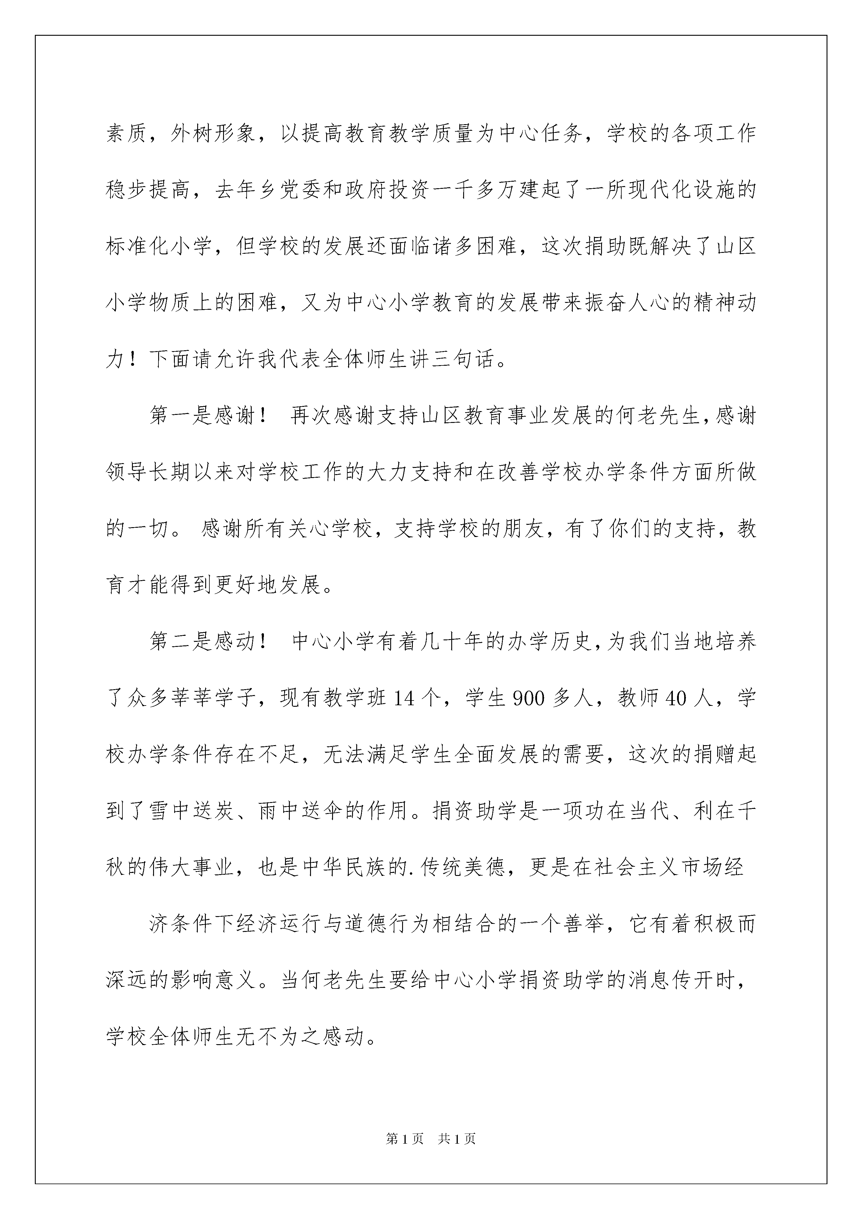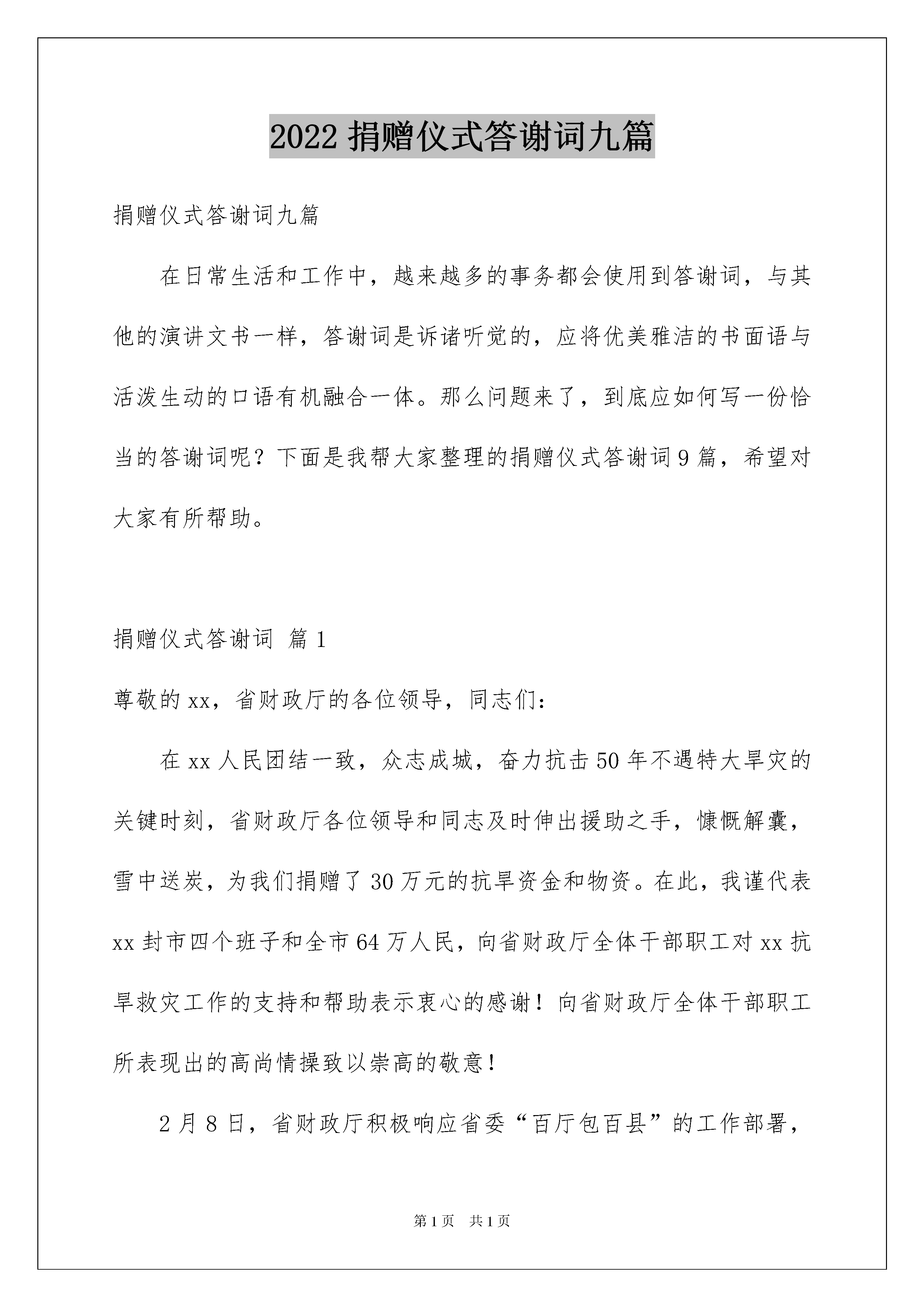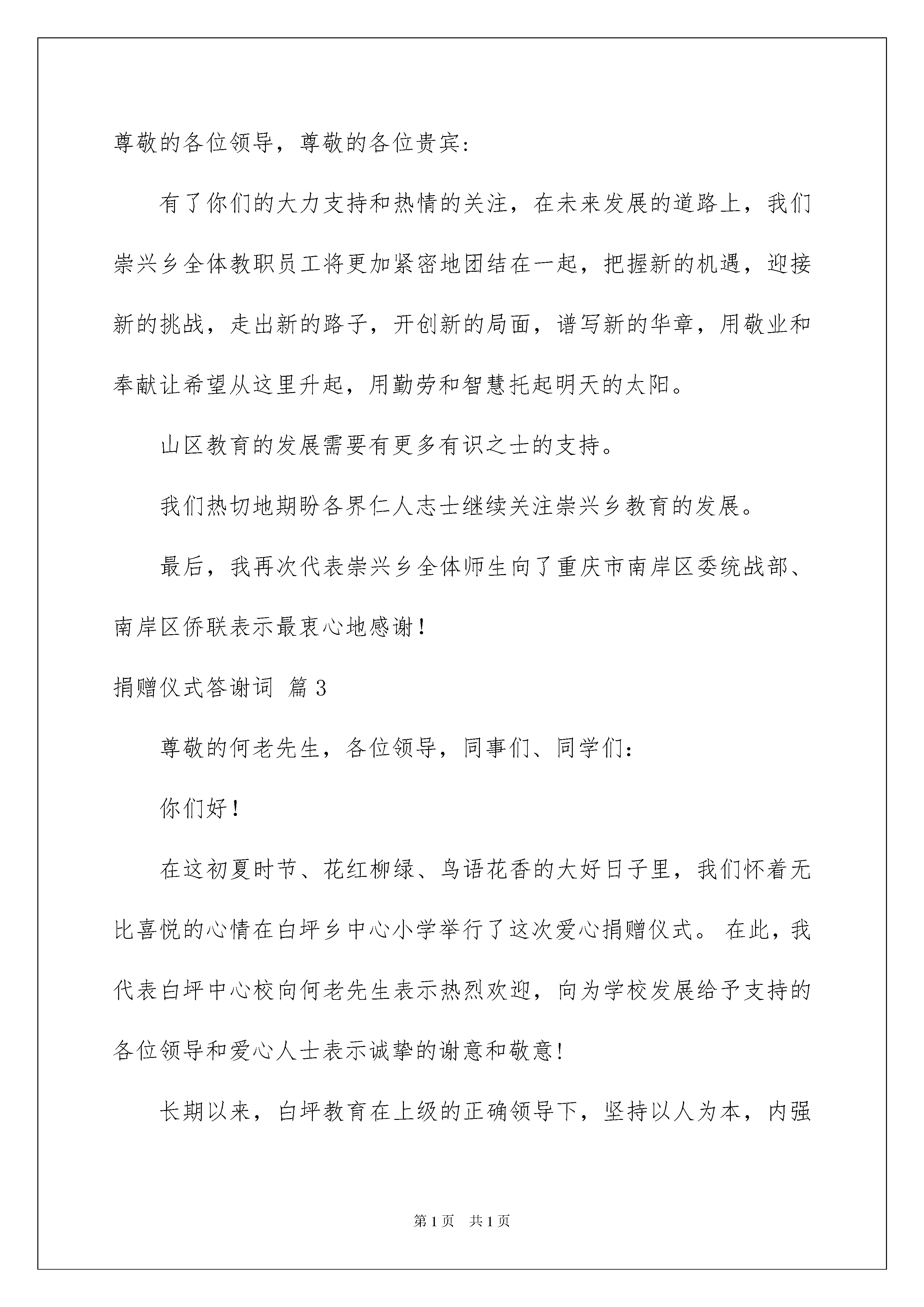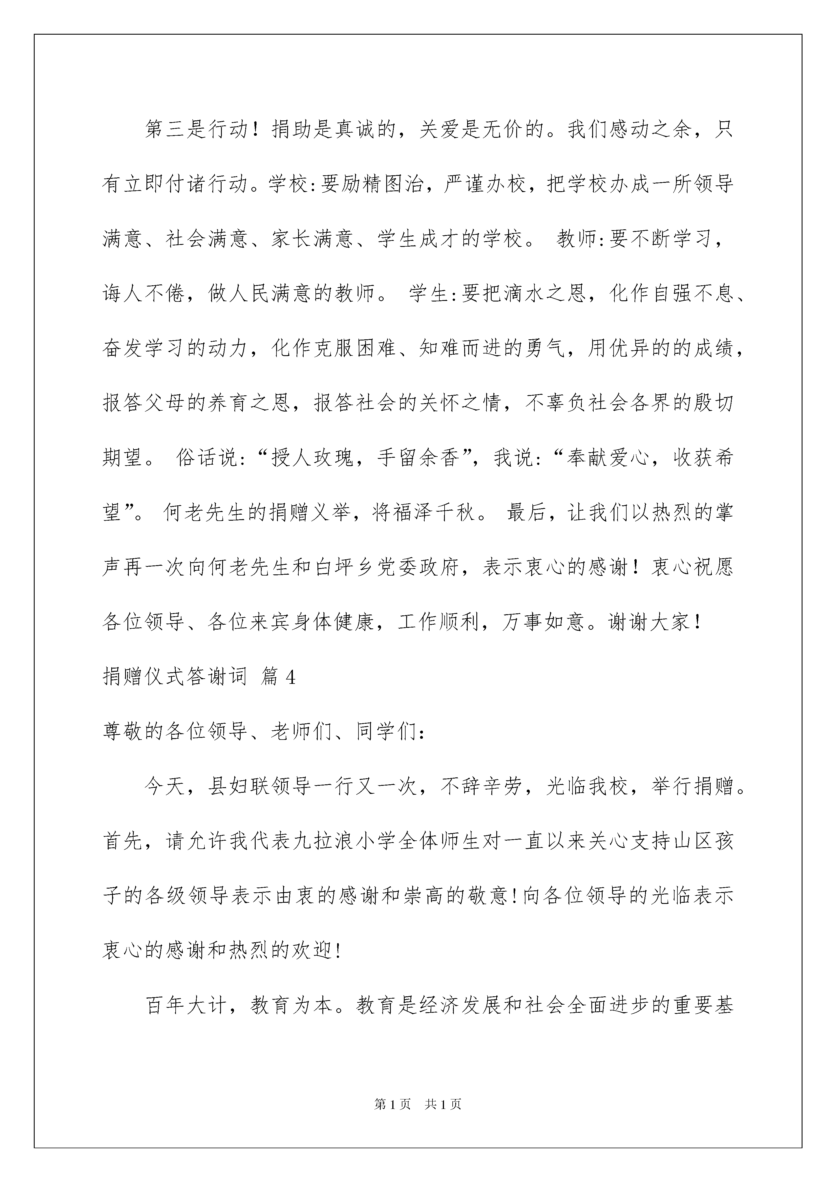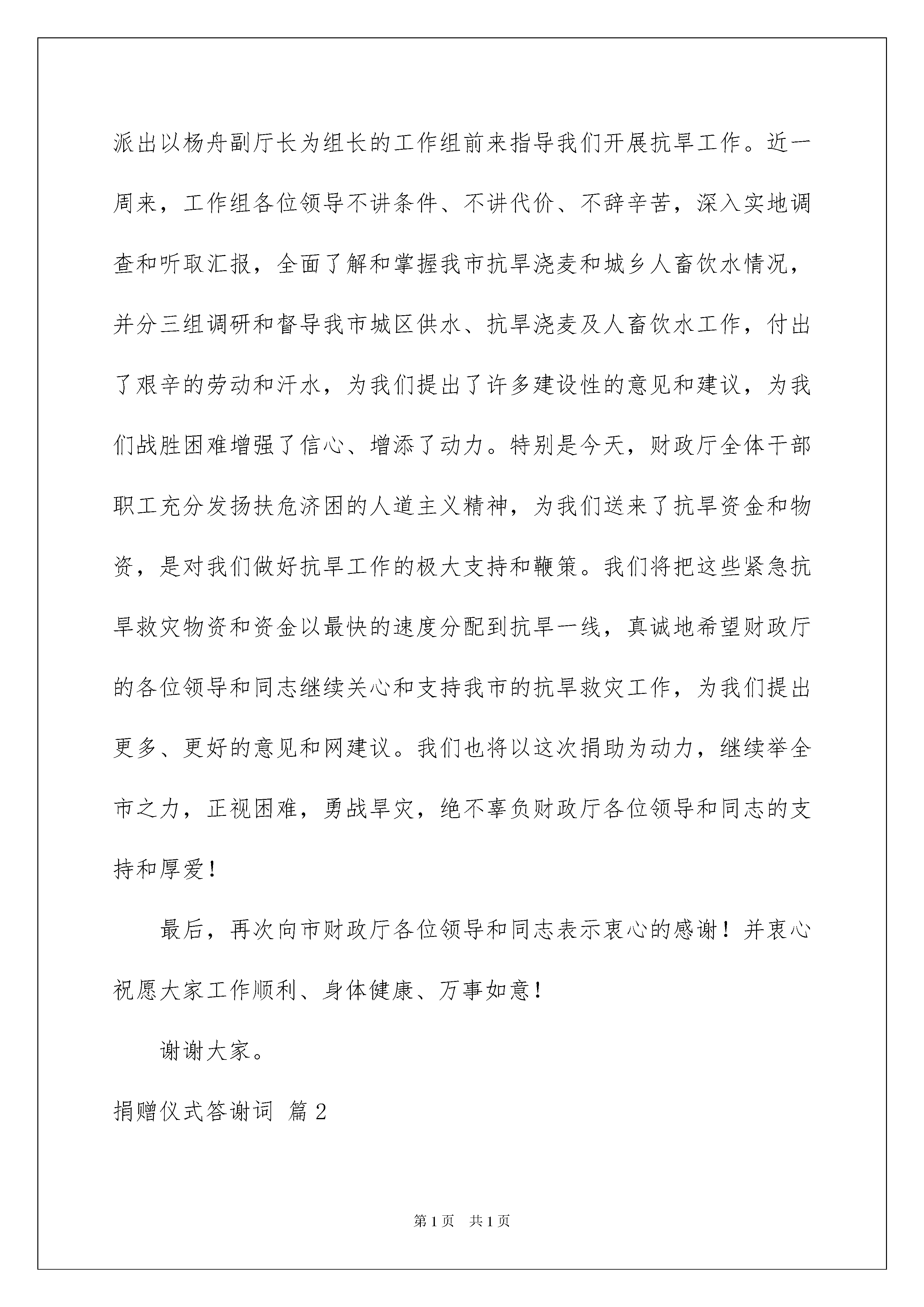 2022捐赠仪式答谢词九篇捐赠仪式答谢词九篇在日常生活和工作中,越来越多的事务都会使用到答谢词,与其他的演讲文书一样,答谢词是诉诸听觉的,应将优美雅洁的书面语与活泼生动的口语有机融合一体。那么问题来了,到底应如何写一份恰当的答谢词呢?下面是我帮大家整理的捐赠仪式答谢词9篇,希望对大家有所帮助。捐赠仪式答谢词篇1尊敬的xx,省财政厅的各位领导,同志们:在xx人民团结一致,众志成城,奋力抗击50年不遇特大旱灾的关键时刻,省财政厅各位领导和同志及时伸出援助之手,慷慨解囊,雪中送炭,为我们捐赠了30万元的抗旱资金和物资。在此,我谨代表xx封市四个班子和全市64万人民,向省财政厅全体干部职工对xx抗旱救灾工作的支持和帮助表示衷心的感谢!向省财政厅全体干部职工所表现出的高尚情操致以崇高的敬意!2月8日,省财政厅积极响应省委“百厅包百县”的工作部署,派出以杨舟副厅长为组长的工作组前来指导我们开展抗旱工作。近一周来,工作组各位领导不讲条件、不讲代价、不辞辛苦,深入实地调查和听取汇报,全面了解和掌握我市抗旱浇麦和城乡人畜饮水情况,并分三组调研和督导我市城区供水、抗旱浇麦及人畜饮水工作,付出了艰辛的劳动和汗水,为我们提出了许多建设性的意见和建议,为我们战胜困难增强了信心、增添了动力。特别是今天,财政厅全体干部职工充分发扬扶危济困的人道主义精神,为我们送来了抗旱资金和物资,是对我们做好抗旱工作的极大支持和鞭策。我们将把这些紧急抗旱救灾物资和资金以最快的速度分配到抗旱一线,真诚地希望财政厅的各位领导和同志继续关心和支持我市的抗旱救灾工作,为我们提出更多、更好的意见和网建议。我们也将以这次捐助为动力,继续举全市之力,正视困难,勇战旱灾,绝不辜负财政厅各位领导和同志的支持和厚爱!最后,再次向市财政厅各位领导和同志表示衷心的感谢!并衷心祝愿大家工作顺利、身体健康、万事如意!谢谢大家。捐赠仪式答谢词篇2尊敬的各位领导,尊敬的各位贵宾:有了你们的大力支持和热情的关注,在未来发展的道路上,我们崇兴乡全体教职员工将更加紧密地团结在一起,把握新的机遇,迎接新的挑战,走出新的路子,开创新的局面,谱写新的华章,用敬业和奉献让希望从这里升起,用勤劳和智慧托起明天的太阳。山区教育的发展需要有更多有识之士的支持。我们热切地期盼各界仁人志士继续关注崇兴乡教育的发展。最后,我再次代表崇兴乡全体师生向了重庆市南岸区委统战部、南岸区侨联表示最衷心地感谢!捐赠仪式答谢词篇3尊敬的何老先生,各位领导,同事们、同学们:你们好!在这初夏时节、花红柳绿、鸟语花香的大好日子里,我们怀着无比喜悦的心情在白坪乡中心小学举行了这次爱心捐赠仪式。在此,我代表白坪中心校向何老先生表示热烈欢迎,向为学校发展给予支持的各位领导和爱心人士表示诚挚的谢意和敬意!长期以来,白坪教育在上级的正确领导下,坚持以人为本,内强素质,外树形象,以提高教育教学质量为中心任务,学校的各项工作稳步提高,去年乡党委和政府投资一千多万建起了一所现代化设施的标准化小学,但学校的发展还面临诸多困难,这次捐助既解决了山区小学物质上的困难,又为中心小学教育的发展带来振奋人心的精神动力!下面请允许我代表全体师生讲三句话。第一是感谢!再次感谢支持山区教育事业发展的何老先生,感谢领导长期以来对学校工作的大力支持和在改善学校办学条件方面所做的一切。感谢所有关心学校,支持学校的朋友,有了你们的支持,教育才能得到更好地发展。第二是感动!中心小学有着几十年的办学历史,为我们当地培养了众多莘莘学子,现有教学班14个,学生900多人,教师40人,学校办学条件存在不足,无法满足学生全面发展的需要,这次的捐赠起到了雪中送炭、雨中送伞的作用。捐资助学是一项功在当代、利在千秋的伟大事业,也是中华民族的.传统美德,更是在社会主义市场经济条件下经济运行与道德行为相结合的一个善举,它有着积极而深远的影响意义。当何老先生要给中心小学捐资助学的消息传开时,学校全体师生无不为之感动。第三是行动!捐助是真诚的,关爱是无价的。我们感动之余,只有立即付诸行动。学校:要励精图治,严谨办校,把学校办成一所领导满意、社会满意、家长满意、学生成才的学校。教师:要不断学习,诲人不倦,做人民满意的教师。学生:要把滴水之恩,化作自强不息、奋发学习的动力,化作克服困难、知难而进的勇气,用优异的的成绩,报答父母的养育之恩,报答社会的关怀之情,不辜负社会各界的殷切期望。俗话说:“授人玫瑰,手留余香”,我说:“奉献爱心,收获希望”。何老先生的捐赠义举,将福泽千秋。最后,让我们以热烈的掌声再一次向何老先生和白坪乡党委政府,表示衷心的感谢!衷心祝愿各位领导