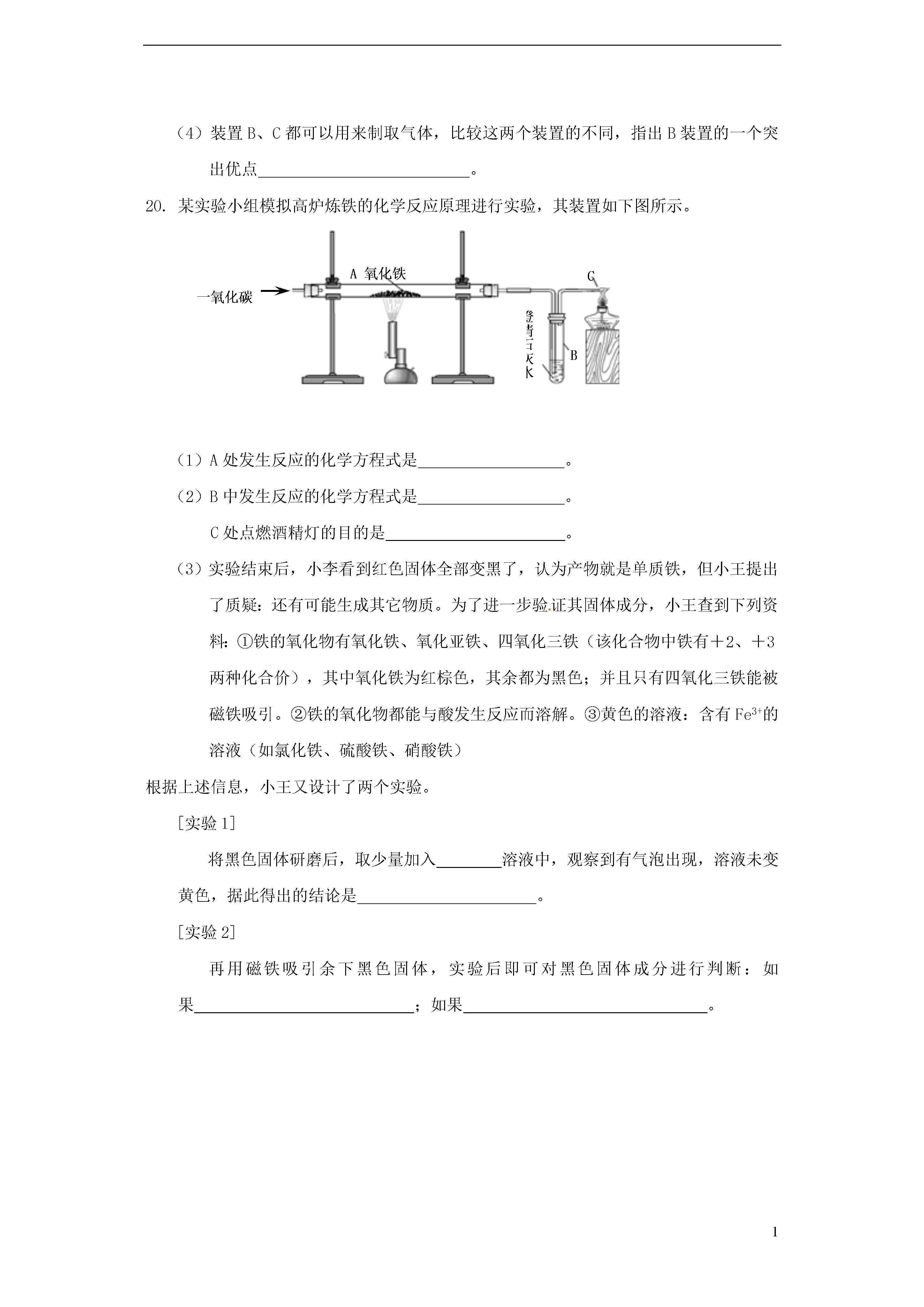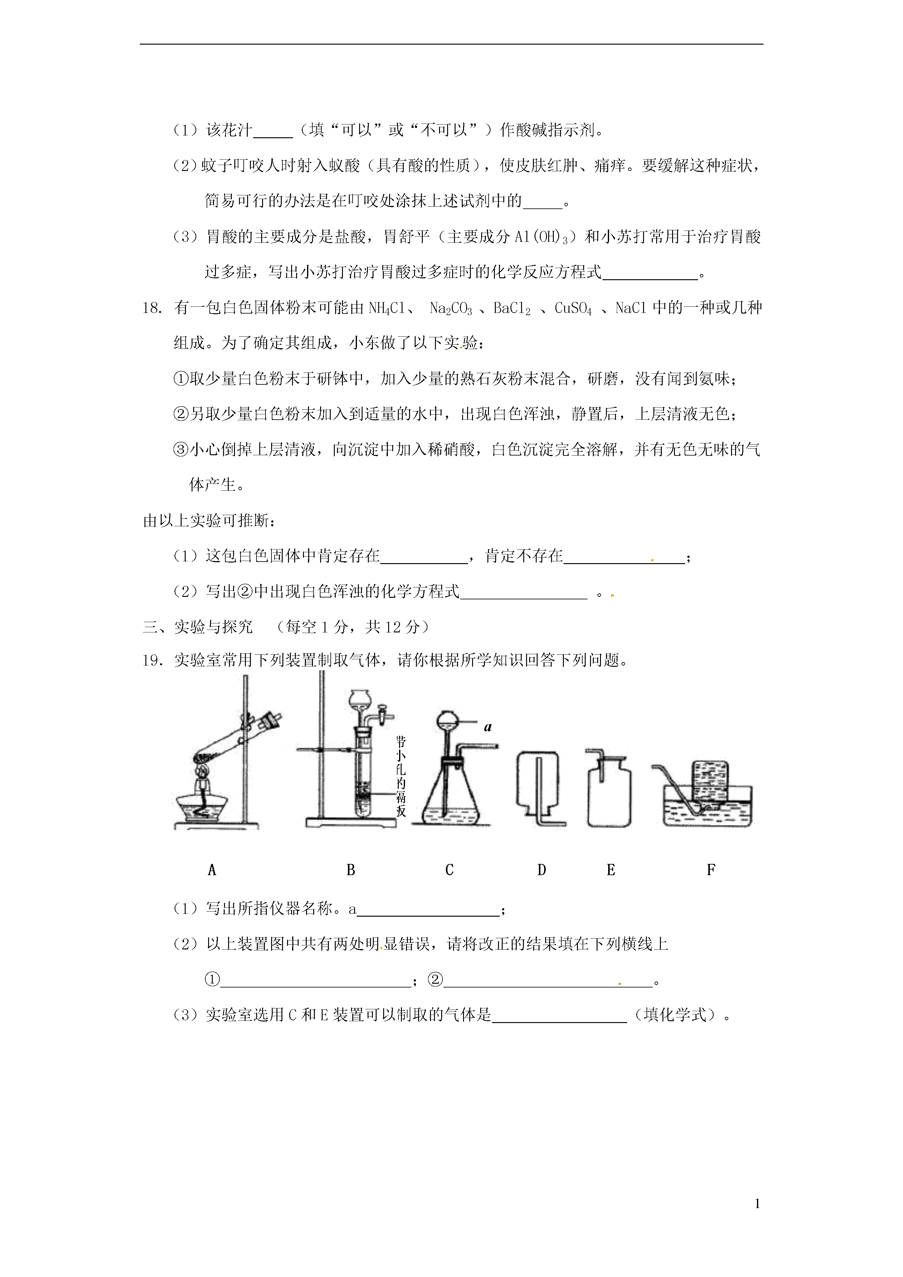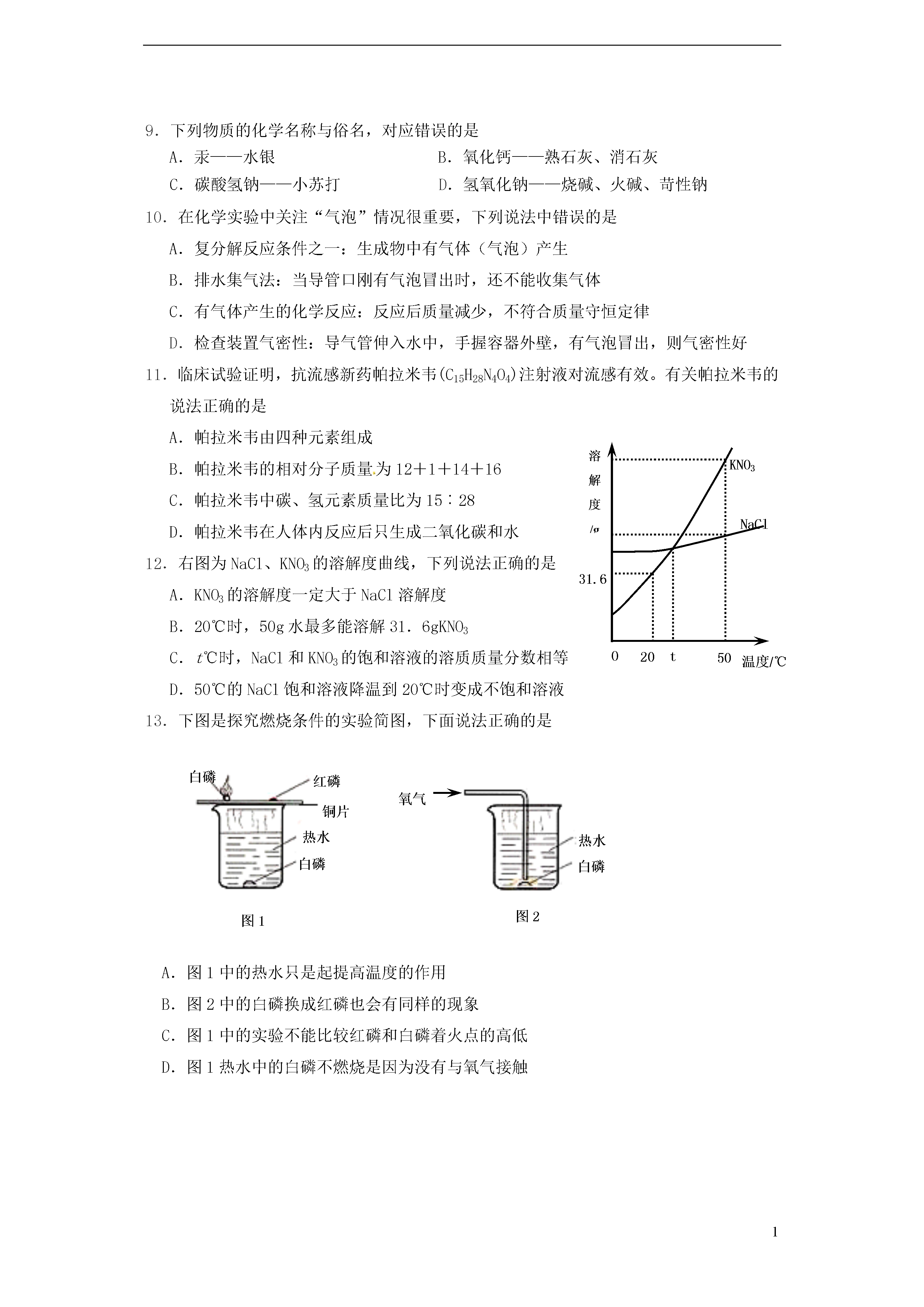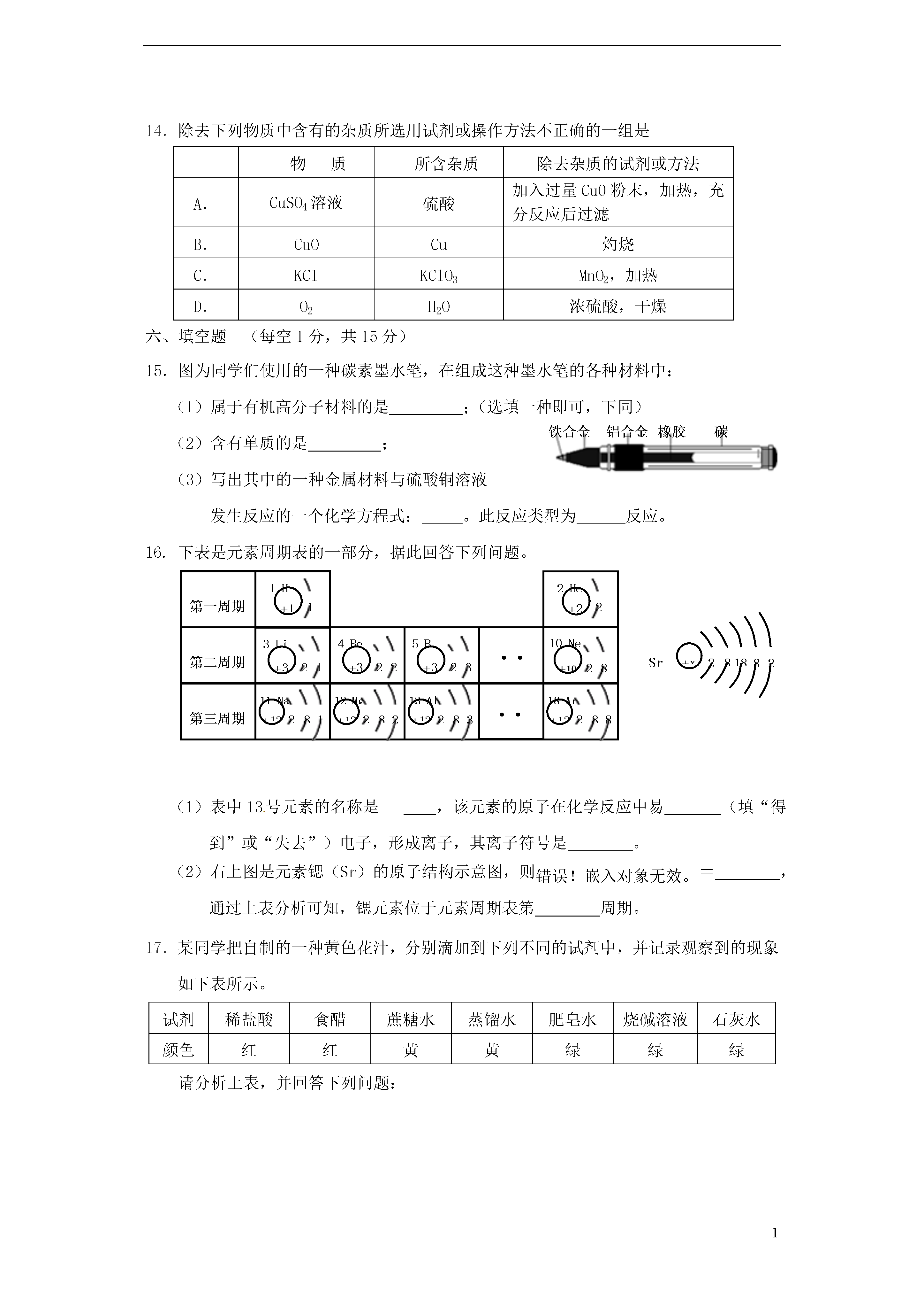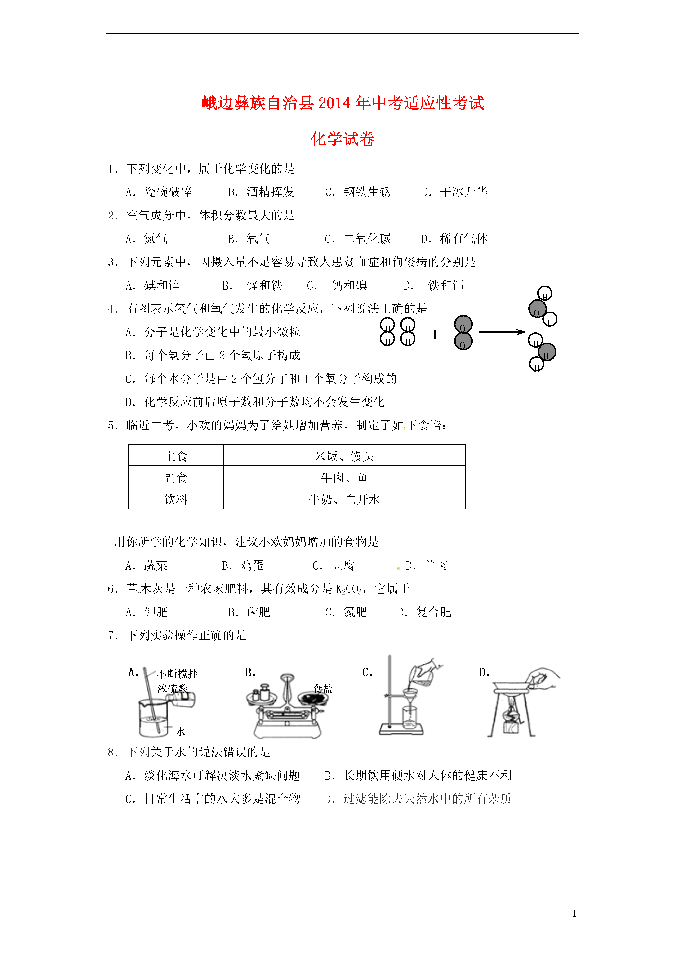 1峨边彝族自治县2014年中考适应性考试化学试卷1.下列变化中,属于化学变化的是A.瓷碗破碎B.酒精挥发C.钢铁生锈D.干冰升华2.空气成分中,体积分数最大的是A.氮气B.氧气C.二氧化碳D.稀有气体3.下列元素中,因摄入量不足容易导致人患贫血症和佝偻病的分别是HHHH+OOOHHHOHA.碘和锌B.锌和铁C.钙和碘D.铁和钙4.右图表示氢气和氧气发生的化学反应,下列说法正确的是A.分子是化学变化中的最小微粒B.每个氢分子由2个氢原子构成C.每个水分子是由2个氢分子和1个氧分子构成的D.化学反应前后原子数和分子数均不会发生变化5.临近中考,小欢的妈妈为了给她增加营养,制定了如下食谱:主食米饭、馒头副食牛肉、鱼饮料牛奶、白开水用你所学的化学知识,建议小欢妈妈增加的食物是A.蔬菜B.鸡蛋C.豆腐D.羊肉6.草木灰是一种农家肥料,其有效成分是K2CO3,它属于A.钾肥B.磷肥C.氮肥D.复合肥7.下列实验操作正确的是A.B.C.D.食盐不断搅拌浓硫酸水8.下列关于水的说法错误的是A.淡化海水可解决淡水紧缺问题B.长期饮用硬水对人体的健康不利C.日常生活中的水大多是混合物D.过滤能除去天然水中的所有杂质9.下列物质的化学名称与俗名,对应错误的是A.汞——水银B.氧化钙——熟石灰、消石灰C.碳酸氢钠——小苏打D.氢氧化钠——烧碱、火碱、苛性钠10.在化学实验中关注“气泡”情况很重要,下列说法中错误的是A.复分解反应条件之一:生成物中有气体(气泡)产生B.排水集气法:当导管口刚有气泡冒出时,还不能收集气体C.有气体产生的化学反应:反应后质量减少,不符合质量守恒定律D.检查装置气密性:导气管伸入水中,手握容器外壁,有气泡冒出,则气密性好11.临床试验证明,抗流感新药帕拉米韦(C15H28N4O4)注射液对流感有效。有关帕拉米韦的说法正确的是NaClKNO3O温度/℃溶解度/g2050t31.6A.帕拉米韦由四种元素组成B.帕拉米韦的相对分子质量为12+1+14+16C.帕拉米韦中碳、氢元素质量比为15︰28D.帕拉米韦在人体内反应后只生成二氧化碳和水12.右图为NaCl、KNO3的溶解度曲线,下列说法正确的是A.KNO3的溶解度一定大于NaCl溶解度B.20℃时,50g水最多能溶解31.6gKNO3C.t℃时,NaCl和KNO3的饱和溶液的溶质质量分数相等D.50℃的NaCl饱和溶液降温到20℃时变成不饱和溶液13.下图是探究燃烧条件的实验简图,下面说法正确的是白磷白磷白磷热水红磷热水氧气铜片图1图2A.图1中的热水只是起提高温度的作用B.图2中的白磷换成红磷也会有同样的现象C.图1中的实验不能比较红磷和白磷着火点的高低D.图1热水中的白磷不燃烧是因为没有与氧气接触14.除去下列物质中含有的杂质所选用试剂或操作方法不正确的一组是物质所含杂质除去杂质的试剂或方法A.CuSO4溶液硫酸加入过量Cu0粉末,加热,充分反应后过滤B.CuOCu灼烧C.KClKClO3MnO2,加热D.O2H2O浓硫酸,干燥六、填空题(每空1分,共15分)15.图为同学们使用的一种碳素墨水笔,在组成这种墨水笔的各种材料中:铁合金铝合金橡胶碳(1)属于有机高分子材料的是;(选填一种即可,下同)(2)含有单质的是;(3)写出其中的一种金属材料与硫酸铜溶液发生反应的一个化学方程式:。此反应类型为反应。16.下表是元素周期表的一部分,据此回答下列问题。18Ar+13288+222He+102810Ne11Na+13281+111H+3213Li12Mg+13282+3224Be13Al+13283+3235B第三周期第二周期第一周期······Sr282+x188(1)表中13号元素的名称是,该元素的原子在化学反应中易(填“得到”或“失去”)电子,形成离子,其离子符号是。(2)右上图是元素锶(Sr)的原子结构示意图,则错误!嵌入对象无效。=,通过上表分析可知,锶元素位于元素周期表第周期。17.某同学把自制的一种黄色花汁,分别滴加到下列不同的试剂中,并记录观察到的现象如下表所示。试剂稀盐酸食醋蔗糖水蒸馏水肥皂水烧碱溶液石灰水颜色红红黄黄绿绿绿请分析上表,并回答下列问题:(1)该花汁(填“可以”或“不可以”)作酸碱指示剂。(2)蚊子叮咬人时射入蚁酸(具有酸的性质),使皮肤红肿、痛痒。要缓解这种症状,简易可行的办