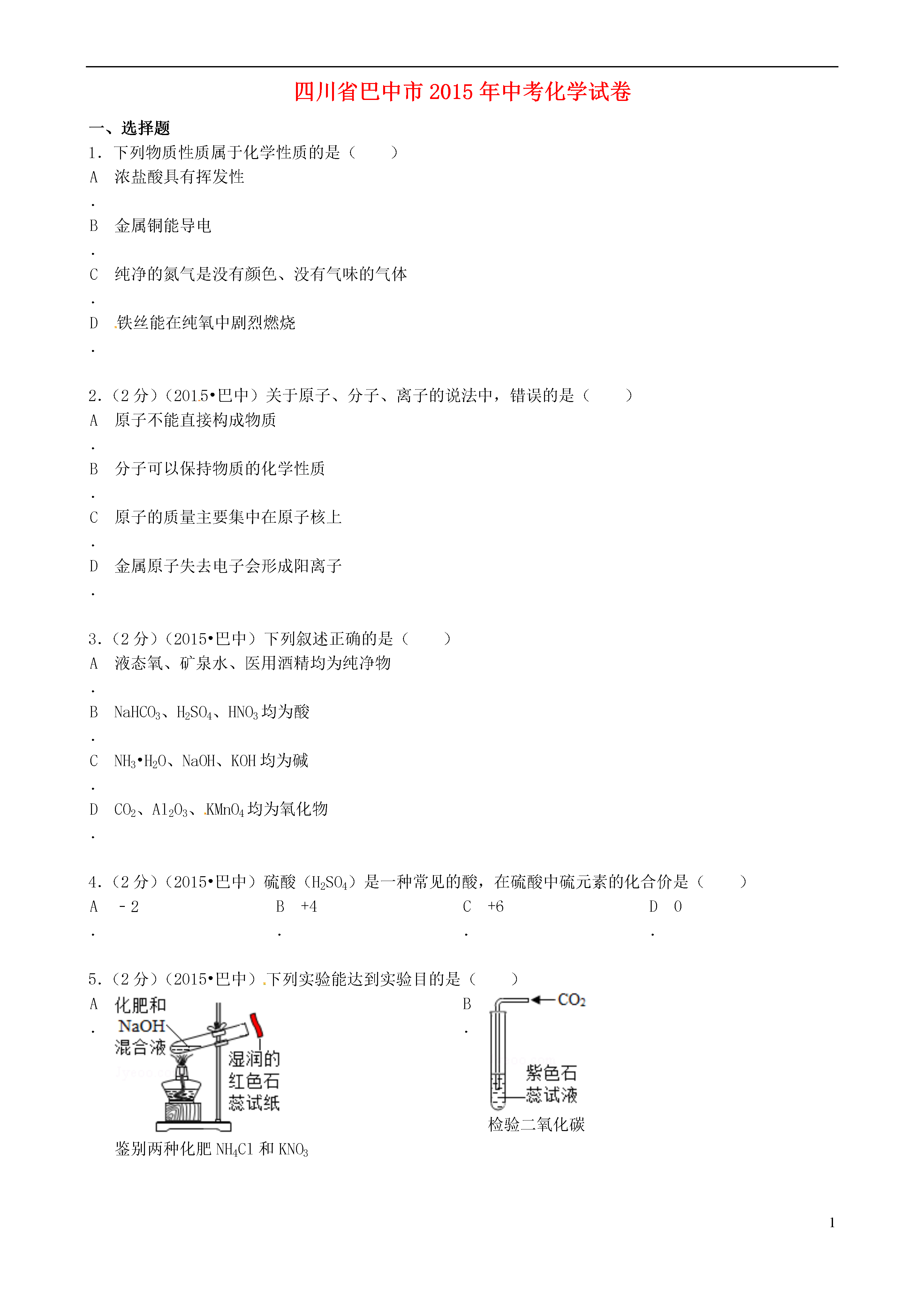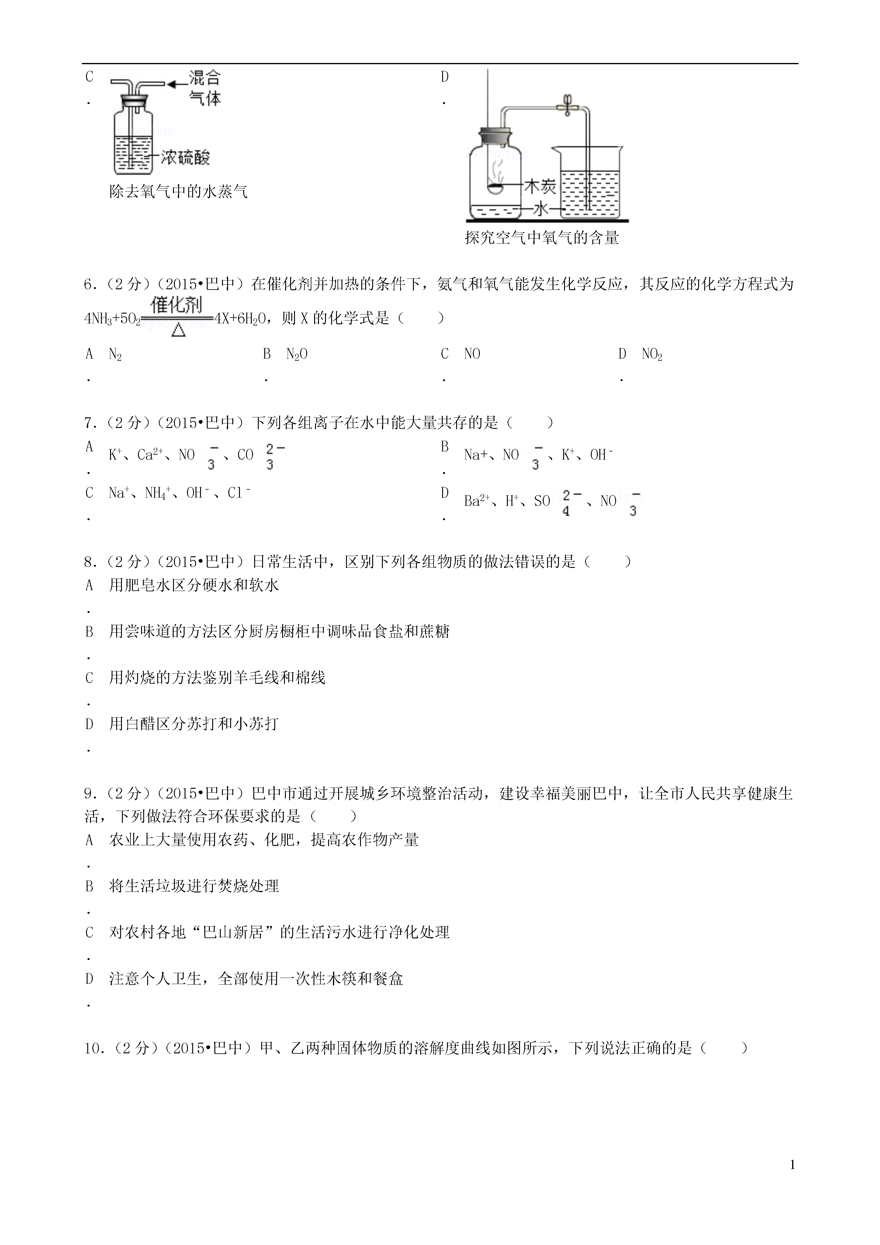 1四川省巴中市2015年中考化学试卷一、选择题1.下列物质性质属于化学性质的是()A.浓盐酸具有挥发性B.金属铜能导电C.纯净的氮气是没有颜色、没有气味的气体D.铁丝能在纯氧中剧烈燃烧2.(2分)(2015•巴中)关于原子、分子、离子的说法中,错误的是()A.原子不能直接构成物质B.分子可以保持物质的化学性质C.原子的质量主要集中在原子核上D.金属原子失去电子会形成阳离子3.(2分)(2015•巴中)下列叙述正确的是()A.液态氧、矿泉水、医用酒精均为纯净物B.NaHCO3、H2SO4、HNO3均为酸C.NH3•H2O、NaOH、KOH均为碱D.CO2、Al2O3、KMnO4均为氧化物4.(2分)(2015•巴中)硫酸(H2SO4)是一种常见的酸,在硫酸中硫元素的化合价是()A.﹣2B.+4C.+6D.05.(2分)(2015•巴中)下列实验能达到实验目的是()A.鉴别两种化肥NH4Cl和KNO3B.检验二氧化碳C.除去氧气中的水蒸气D.探究空气中氧气的含量6.(2分)(2015•巴中)在催化剂并加热的条件下,氨气和氧气能发生化学反应,其反应的化学方程式为4NH3+5O24X+6H2O,则X的化学式是()A.N2B.N2OC.NOD.NO27.(2分)(2015•巴中)下列各组离子在水中能大量共存的是()A.K+、Ca2+、NO、COB.Na+、NO、K+、OH﹣C.Na+、NH4+、OH﹣、Cl﹣D.Ba2+、H+、SO、NO8.(2分)(2015•巴中)日常生活中,区别下列各组物质的做法错误的是()A.用肥皂水区分硬水和软水B.用尝味道的方法区分厨房橱柜中调味品食盐和蔗糖C.用灼烧的方法鉴别羊毛线和棉线D.用白醋区分苏打和小苏打9.(2分)(2015•巴中)巴中市通过开展城乡环境整治活动,建设幸福美丽巴中,让全市人民共享健康生活,下列做法符合环保要求的是()A.农业上大量使用农药、化肥,提高农作物产量B.将生活垃圾进行焚烧处理C.对农村各地“巴山新居”的生活污水进行净化处理D.注意个人卫生,全部使用一次性木筷和餐盒10.(2分)(2015•巴中)甲、乙两种固体物质的溶解度曲线如图所示,下列说法正确的是()A.t2℃时,向100g甲中加入100g水后形成溶液的质量为200gB.t1℃时,甲、乙两种物质的溶解度相等C.甲的溶解度比乙大D.将t2℃时甲、乙的饱和溶液分别降到t1℃时,两溶液的溶质质量分数相等11.(2分)(2015•巴中)下列物质的变化中,只有加酸才能一步实现的是()A.CaCO3→CO2B.Zn→ZnSO4C.CuO→CuCl2D.KOH→KCl12.(2分)(2015•巴中)往AgNO3和Cu(NO3)2的混合溶液中加入一定量的铁粉,充分反应后过滤,向滤渣中加入稀盐酸,有气泡产生.根据上述现象分析,你认为下面结论错误的是()A.滤渣一定有Fe粉B.滤渣一定有Cu粉C.滤液中一定有Fe2+D.滤液中一定有Ag+、Cu2+二、填空题(本题共6个小题,每空1分,共14分)13.(2分)(2015•巴中)请用化学用语填空:(1)地壳中含量最多的金属元素.(2)硬水中的镁离子.14.(2分)(2015•巴中)大蒜中含有一种有效成分辣素“硫化丙烯”,其化学式为C3H6S,能杀菌,具有一定的抗病功能和食疗价值.请从硫化丙烯的化学式中获得的信息写出两条:(1);(2).15.(1分)(2015•巴中)人们在生活中常用方法既可降低水的硬度,又能消毒杀菌.16.(2分)(2015•巴中)如图是元素周期表中某一周期元素的原子结构示意图:(1)氟原子的结构示意图中的X=.(2)硫原子的结构示意图为,图中与其化学性质相似的元素是.17.(4分)(2015•巴中)如图是工业上采用氨碱法生产纯碱的流程图:上述过程的化学原理为:NaCl+NH3+CO2+H2O═NaHCO3+NH4Cl2NaHCO3Na2CO3+H2O+CO2↑请回答下列问题:(1)氨溶于水后会与水反应生成一水合氨(NH3•H20),我们从酸碱反应的角度知道:在用氨碱法生产纯碱过程中,先向饱和食盐水中通入氨气,制成饱和氨盐水,再向其中通过二氧化碳,其原因是.(2)氨盐水吸收二氧化碳后生成的碳酸氢钠和氯化铵,首先结晶析出的物质是碳酸氨钠,其原因是.(3)1926年,我国化学家侯德榜创立了更先进的联合制碱法,即向滤出碳酸钠晶体后的氯化铵溶液中加入食盐,使其中的氯化铵单独结晶析出,用作化肥中肥.同学们看见几株小树叶片变黄,从施肥角度分析,这些小树能否施用该化肥(填“能”或“不能”).18.(3分)(2015•巴中)如图是氢氧化钠溶液和盐酸用滴加方式反应