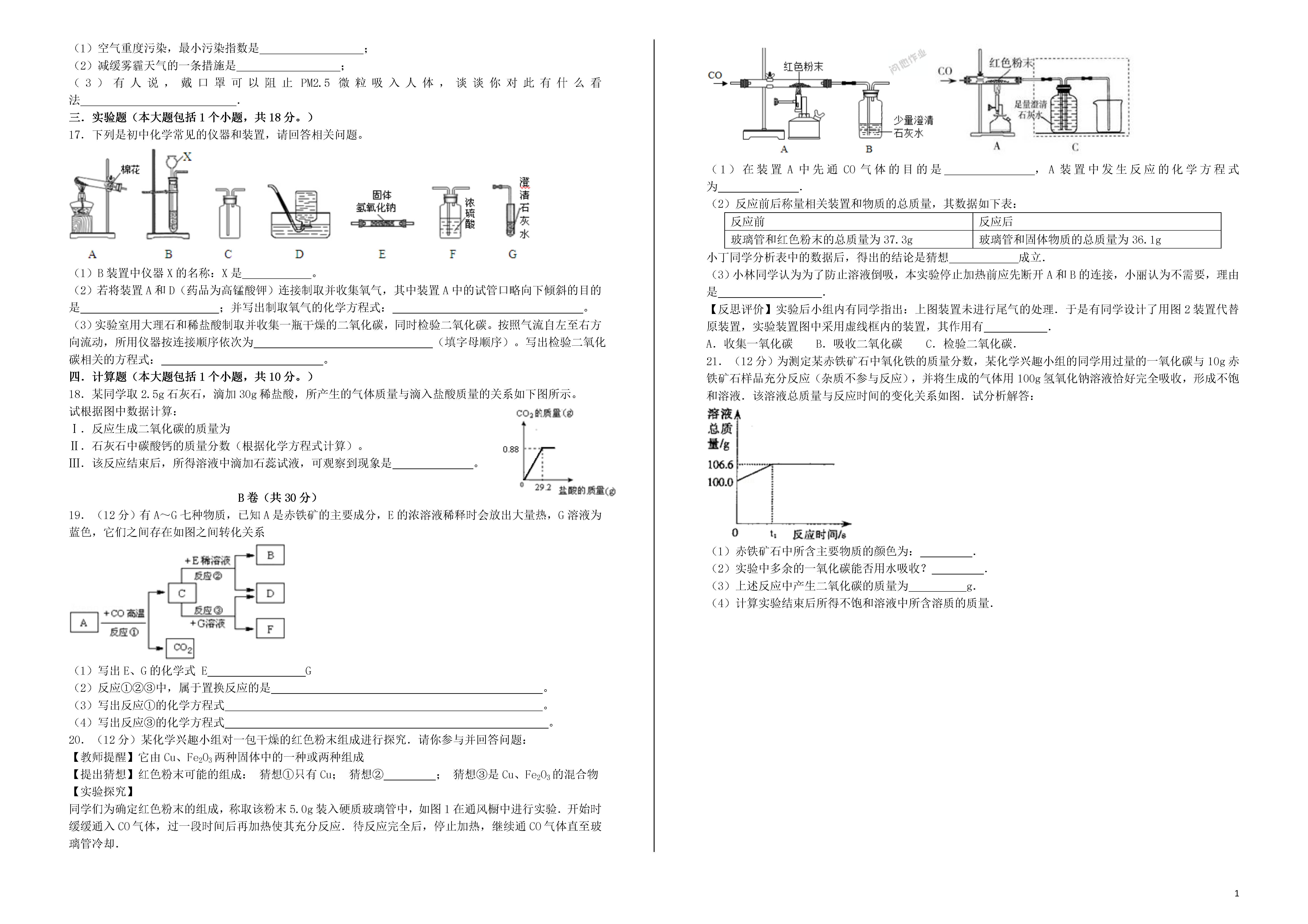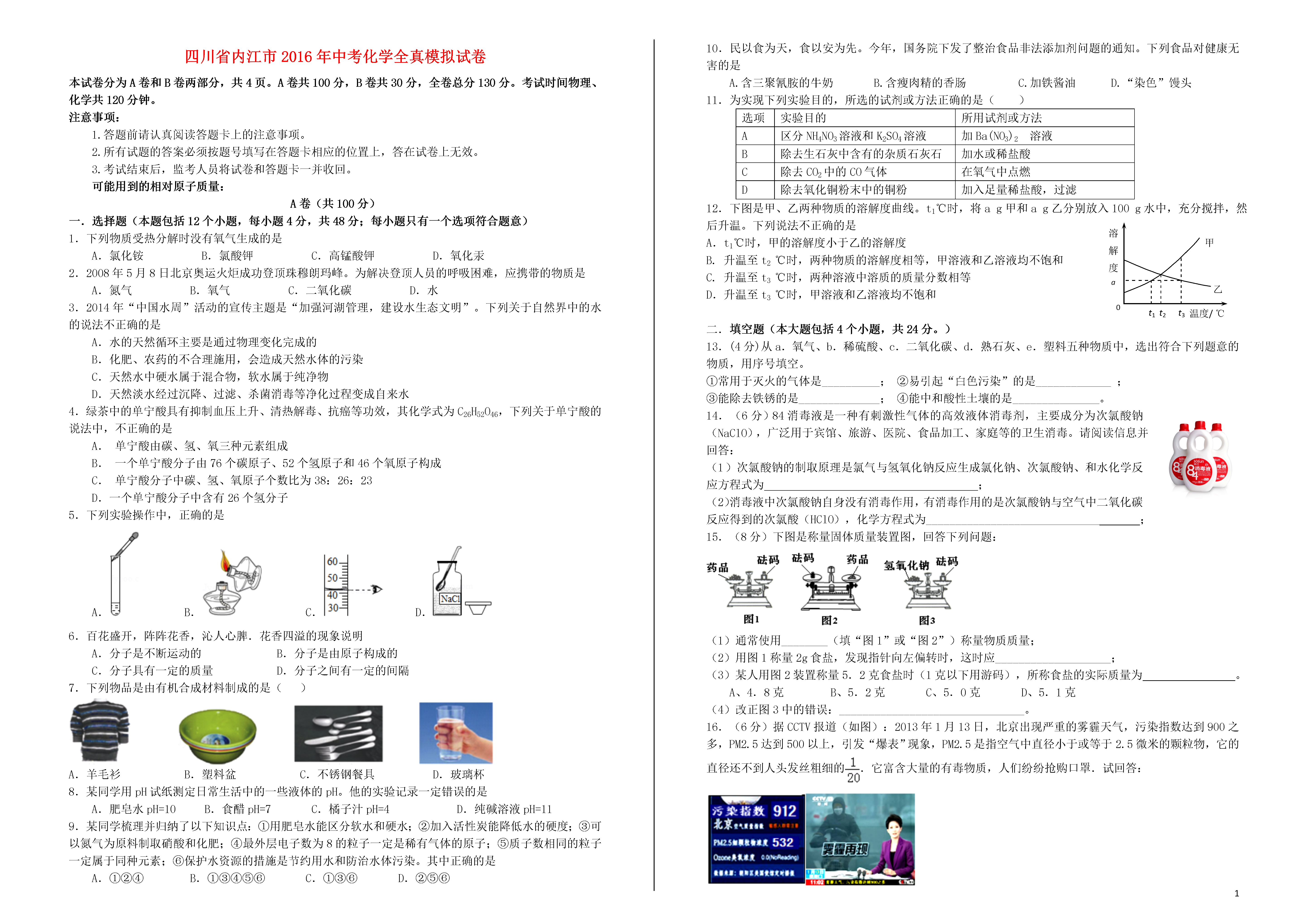 1四川省内江市2016年中考化学全真模拟试卷本试卷分为A卷和B卷两部分,。A卷共100分,B卷共30分,全卷总分130分。考试时间物理、化学共120分钟。注意事项:1.答题前请认真阅读答题卡上的注意事项。2.所有试题的答案必须按题号填写在答题卡相应的位置上,答在试卷上无效。3.考试结束后,监考人员将试卷和答题卡一并收回。可能用到的相对原子质量:A卷(共100分)一.选择题(本题包括12个小题,每小题4分,共48分;每小题只有一个选项符合题意)1.下列物质受热分解时没有氧气生成的是A.氯化铵B.氯酸钾C.高锰酸钾D.氧化汞2.2008年5月8日北京奥运火炬成功登顶珠穆朗玛峰。为解决登顶人员的呼吸困难,应携带的物质是A.氮气B.氧气C.二氧化碳D.水3.2014年“中国水周”活动的宣传主题是“加强河湖管理,建设水生态文明”。下列关于自然界中的水的说法不正确的是A.水的天然循环主要是通过物理变化完成的B.化肥、农药的不合理施用,会造成天然水体的污染C.天然水中硬水属于混合物,软水属于纯净物D.天然淡水经过沉降、过滤、杀菌消毒等净化过程变成自来水4.绿茶中的单宁酸具有抑制血压上升、清热解毒、抗癌等功效,其化学式为C26H52O46,下列关于单宁酸的说法中,不正确的是A.单宁酸由碳、氢、氧三种元素组成B.一个单宁酸分子由76个碳原子、52个氢原子和46个氧原子构成C.单宁酸分子中碳、氢、氧原子个数比为38:26:23D.一个单宁酸分子中含有26个氢分子5.下列实验操作中,正确的是A.B.C.D.6.百花盛开,阵阵花香,沁人心脾.花香四溢的现象说明A.分子是不断运动的B.分子是由原子构成的C.分子具有一定的质量D.分子之间有一定的间隔7.下列物品是由有机合成材料制成的是()A.羊毛衫B.塑料盆C.不锈钢餐具D.玻璃杯8.某同学用pH试纸测定日常生活中的一些液体的pH。他的实验记录一定错误的是A.肥皂水pH=10B.食醋pH=7C.橘子汁pH=4D.纯碱溶液pH=119.某同学梳理并归纳了以下知识点:①用肥皂水能区分软水和硬水;②加入活性炭能降低水的硬度;③可以氮气为原料制取硝酸和化肥;④最外层电子数为8的粒子一定是稀有气体的原子;⑤质子数相同的粒子一定属于同种元素;⑥保护水资源的措施是节约用水和防治水体污染。其中正确的是A.①②④B.①③④⑤⑥C.①③⑥D.②⑤⑥10.民以食为天,食以安为先。今年,国务院下发了整治食品非法添加剂问题的通知。下列食品对健康无害的是A.含三聚氰胺的牛奶B.含瘦肉精的香肠C.加铁酱油D.“染色”馒头11.为实现下列实验目的,所选的试剂或方法正确的是()选项实验目的所用试剂或方法A区分NH4NO3溶液和K2SO4溶液加Ba(NO3)2溶液B除去生石灰中含有的杂质石灰石加水或稀盐酸C除去CO2中的CO气体在氧气中点燃D除去氧化铜粉末中的铜粉加入足量稀盐酸,过滤t1溶解度/g甲温度/℃a乙t2t3012.下图是甲、乙两种物质的溶解度曲线。t1℃时,将ag甲和ag乙分别放入100g水中,充分搅拌,然后升温。下列说法不正确的是A.t1℃时,甲的溶解度小于乙的溶解度B.升温至t2℃时,两种物质的溶解度相等,甲溶液和乙溶液均不饱和C.升温至t3℃时,两种溶液中溶质的质量分数相等D.升温至t3℃时,甲溶液和乙溶液均不饱和填空题(本大题包括4个小题,共24分。)13.(4分)从a.氧气、b.稀硫酸、c.二氧化碳、d.熟石灰、e.塑料五种物质中,选出符合下列题意的物质,用序号填空。①常用于灭火的气体是__________;②易引起“白色污染”的是_____________;③能除去铁锈的是______________;④能中和酸性土壤的是_______________。14.(6分)84消毒液是一种有刺激性气体的高效液体消毒剂,主要成分为次氯酸钠(NaClO),广泛用于宾馆、旅游、医院、食品加工、家庭等的卫生消毒。请阅读信息并回答:(1)次氯酸钠的制取原理是氯气与氢氧化钠反应生成氯化钠、次氯酸钠、和水化学反应方程式为;(2)消毒液中次氯酸钠自身没有消毒作用,有消毒作用的是次氯酸钠与空气中二氧化碳反应得到的次氯酸(HClO),化学方程式为______________________________;15.(8分)下图是称量固体质量装置图,回答下列问题:(1)通常使用________(填“图1”或“图2”)称量物质质量;(2)用图1称量2g食盐,发现指针向左偏转时,这时应____________________;(3)某人用图2装置称量5.2克食盐时(1克以下用游码),所